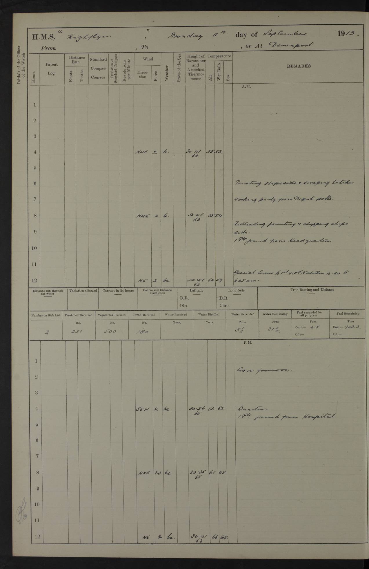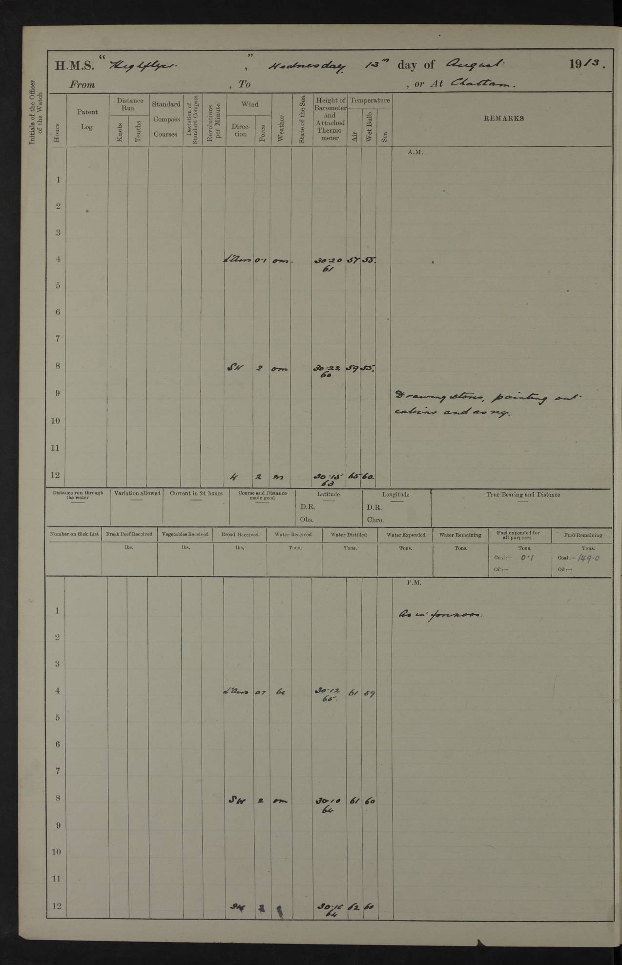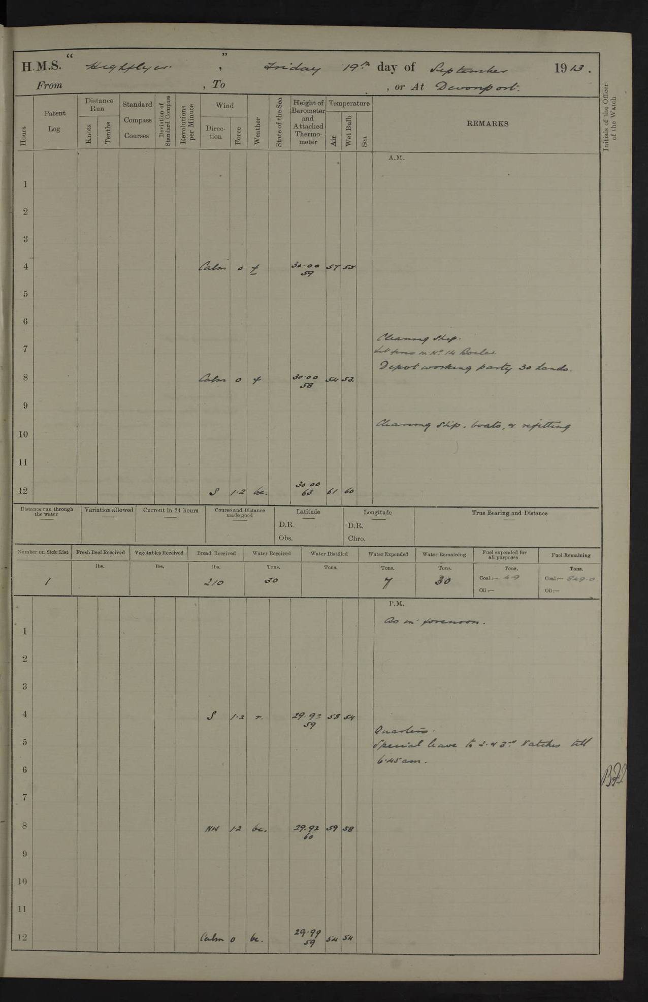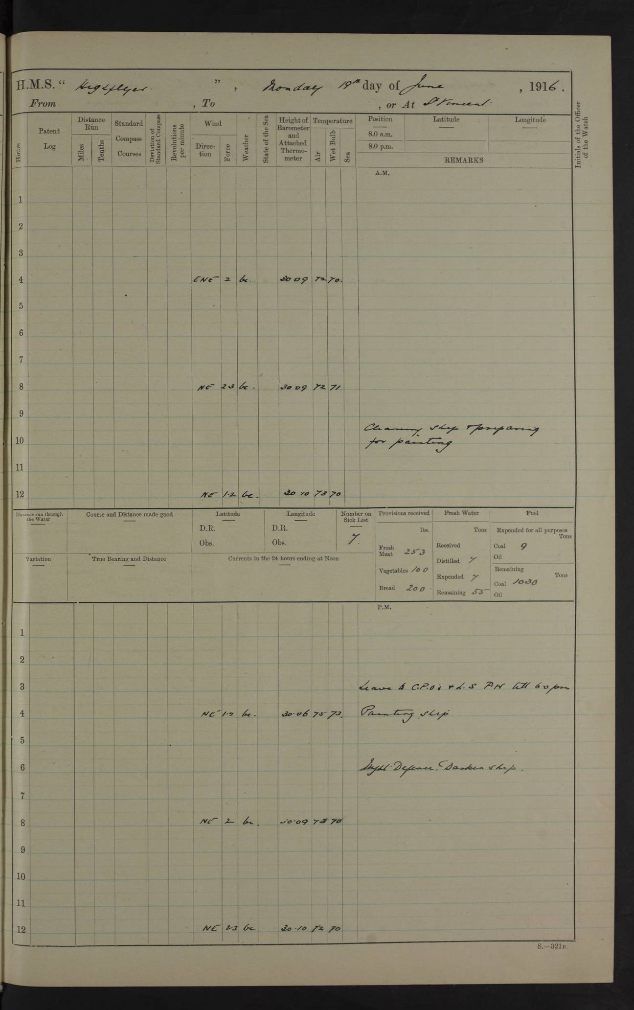 LOGS FOR JUNE 1913 4f960fe6a2fc8e2def000421: (http://s3.amazonaws.com/oldweather/ADM53-44291/ADM 53-44291-004_0.jpg) 14 June 1913 Chatham Lat 51.3855, Long 0.5174 Recommissioned ship. Ship’s company living on board ABOUKIR. 4 watch keepers, 1 PO and 3 AB on board. 4f960fe7a2fc8e2def000422: (http://s3.amazonaws.com/oldweather/ADM53-44291/ADM 53-44291-004_1.jpg) 15 June 1913 Chatham Lat 51.3855, Long 0.5174 [Weather records only.] 4f960fe7a2fc8e2def000423: (http://s3.amazonaws.com/oldweather/ADM53-44291/ADM 53-44291-005_0.jpg) 16 June 1913 Chatham, Lat 51.3855, Long 0.5174 Cleaning the ship. 4f960fe7a2fc8e2def000424: (http://s3.amazonaws.com/oldweather/ADM53-44291/ADM 53-44291-005_1.jpg) 17 June 1913 Chatham Lat 51.40, Long 0.50 2.00pm: Mr. Wright, carpenter, joined ship. 4f960fe8a2fc8e2def000425: (http://s3.amazonaws.com/oldweather/ADM53-44291/ADM 53-44291-006_0.jpg) 18 June 1913 Chatham Lat 51.3855, Long 0.5174 8.30am: BRILLIANT came alongside. 4f960fe8a2fc8e2def000426: (http://s3.amazonaws.com/oldweather/ADM53-44291/ADM 53-44291-006_1.jpg) 19 June 1913 Chatham Lat 51.4, Long 0.5 Hands employed stowing shell rooms and sail rooms. 4f960fe8a2fc8e2def000427: (http://s3.amazonaws.com/oldweather/ADM53-44291/ADM 53-44291-007_0.jpg) 20 June 1913 Chatham Lat 51.3855, Long 0.5174 FORTE secured alongside. 4f960fe9a2fc8e2def000428: (http://s3.amazonaws.com/oldweather/ADM53-44291/ADM 53-44291-007_1.jpg) 21 June 1913 Chatham Lat 51.3855, Long 0.5174 Cleaning ship. 4f960fe9a2fc8e2def000429: (http://s3.amazonaws.com/oldweather/ADM53-44291/ADM 53-44291-008_0.jpg) 22 June 1913 Chatham Lat 51.3855, Long 0.5174 [Weather records only.] 4f960fe9a2fc8e2def00042a: (http://s3.amazonaws.com/oldweather/ADM53-44291/ADM 53-44291-008_1.jpg) 23 June 1913 Chatham Lat 51.3855, Long 0.5174 Dressed ship masthead flags. 4f960feaa2fc8e2def00042b: (http://s3.amazonaws.com/oldweather/ADM53-44291/ADM 53-44291-009_0.jpg) 24 June 1913 Chatham Lat 51.3855, Long 0.5174 Marines at drill. 4f960feaa2fc8e2def00042c: (http://s3.amazonaws.com/oldweather/ADM53-44291/ADM 53-44291-009_1.jpg) 25 June 1913 Chatham Lat 51.3855, Long 0.5174 9.30am: Navy League party visited ship, 250. 4f960feaa2fc8e2def00042d: (http://s3.amazonaws.com/oldweather/ADM53-44291/ADM 53-44291-010_0.jpg) 26 June 1913 Chatham Lat 51.3855, Long 0.5174 Hands cleaning out provision rooms. 4f960feba2fc8e2def00042e: (http://s3.amazonaws.com/oldweather/ADM53-44291/ADM 53-44291-010_1.jpg) 27 June 1913 Chatham Lat 51.3855, Long 0.5174 Half masted colours. 4f960feba2fc8e2def00042f: (http://s3.amazonaws.com/oldweather/ADM53-44291/ADM 53-44291-011_0.jpg) 28 June 1913 Chatham Lat 51.3855, Long 0.5174 Cleaning ship. 4f960feba2fc8e2def000430: (http://s3.amazonaws.com/oldweather/ADM53-44291/ADM 53-44291-011_1.jpg) 29 June 1913 Chatham Lat 51.3855, Long 0.5174 [Weather records only.] 4f960feca2fc8e2def000431: (http://s3.amazonaws.com/oldweather/ADM53-44291/ADM 53-44291-012_0.jpg) 30 June 1913 Chatham Lat 51.3855, Long 0.5174 9.30am: One rating joined from Portsmouth. LOGS FOR JULY 1913 4f960feca2fc8e2def000432: (http://s3.amazonaws.com/oldweather/ADM53-44291/ADM 53-44291-012_1.jpg) 1 July 1913 Chatham Lat 51.3855, Long 0.5174 9.00am: Captain Butler joined ship. 2.30pm: 1 LS joined ship 4f960feca2fc8e2def000433: (http://s3.amazonaws.com/oldweather/ADM53-44291/ADM 53-44291-013_0.jpg) 2 July 1913 Chatham Lat 51.3855, Long 0.5174 Painting out store rooms. 4f960feda2fc8e2def000434: (http://s3.amazonaws.com/oldweather/ADM53-44291/ADM 53-44291-013_1.jpg) 3 July 1913 Chatham Lat 51.3855, Long 0.5174 Painting and scraping. 4f960feda2fc8e2def000435: (http://s3.amazonaws.com/oldweather/ADM53-44291/ADM 53-44291-014_0.jpg) 4 July 1913 Chatham Lat 51.3855, Long 0.5174 Painting and scraping. 4f960feda2fc8e2def000436: (http://s3.amazonaws.com/oldweather/ADM53-44291/ADM 53-44291-014_1.jpg) 5 July 1913 Chatham Lat 51.3855, Long 0.5174 Cleaning up. 4f960feea2fc8e2def000437: (http://s3.amazonaws.com/oldweather/ADM53-44291/ADM 53-44291-015_0.jpg) 6 July 1913 Chatham Lat 51.3855, Long 0.5174 [Weather records only.] 4f960feea2fc8e2def000438: (http://s3.amazonaws.com/oldweather/ADM53-44291/ADM 53-44291-015_1.jpg) 7 July 1913 Chatham Lat 51.3855, Long 0.5174 Painting. 4f960feea2fc8e2def000439: (http://s3.amazonaws.com/oldweather/ADM53-44291/ADM 53-44291-016_0.jpg) 8 July 1913 Chatham Lat 51.3855, Long 0.5174 Hands provisioning ship. 4f960fefa2fc8e2def00043a: (http://s3.amazonaws.com/oldweather/ADM53-44291/ADM 53-44291-016_1.jpg) 9 July 1913 Chatham Lat 51.3855, Long 0.5174 Provisioning ship. 4f960fefa2fc8e2def00043b: (http://s3.amazonaws.com/oldweather/ADM53-44291/ADM 53-44291-017_0.jpg) 10 July 1913 Chatham Lat 51.4, Long 0.5 Hands scraping, chipping & cleaning up generally. 4f960fefa2fc8e2def00043c: (http://s3.amazonaws.com/oldweather/ADM53-44291/ADM 53-44291-017_1.jpg) 11 July 1913 Chatham Lat 51.4, Long 0.5 Preparing ship for going into dock. 4f960fefa2fc8e2def00043d: (http://s3.amazonaws.com/oldweather/ADM53-44291/ADM 53-44291-018_0.jpg) 12 July 1913 Chatham Lat 51.3855, Long 0.5174 10.00am: Commenced docking. 4f960ff0a2fc8e2def00043e: (http://s3.amazonaws.com/oldweather/ADM53-44291/ADM 53-44291-018_1.jpg) 13 July 1913 Chatham Lat 51.3855, Long 0.5174 [Weather records only.] 4f960ff0a2fc8e2def00043f: (http://s3.amazonaws.com/oldweather/ADM53-44291/ADM 53-44291-019_0.jpg) 14 July 1913 Chatham Lat 51.3855, Long 0.5174 1.00pm: Transferred bags and hammocks from ABOUKIR to HIGHFLYER. 4f960ff0a2fc8e2def000440: (http://s3.amazonaws.com/oldweather/ADM53-44291/ADM 53-44291-019_1.jpg) 15 July 1913 Chatham Lat 51.4, Long 0.5 9.00am: Ships’ company transferring bags and hammocks to Depot. 4f960ff1a2fc8e2def000441: (http://s3.amazonaws.com/oldweather/ADM53-44291/ADM 53-44291-020_0.jpg) 16 July 1913 Chatham Lat 51.3855, Long 0.5174 Hands scraping as requisite. 4f960ff1a2fc8e2def000442: (http://s3.amazonaws.com/oldweather/ADM53-44291/ADM 53-44291-020_1.jpg) 17 July 1913 Chatham Lat 51.3855, Long 0.5174 Refitting