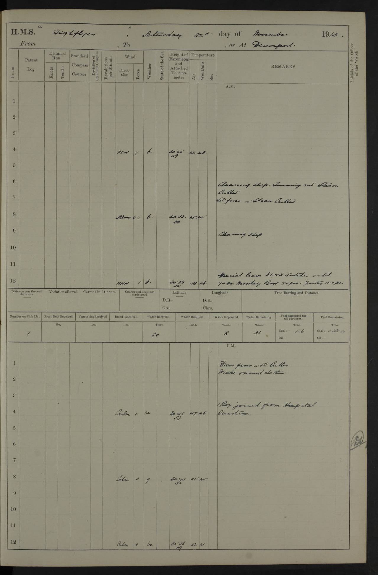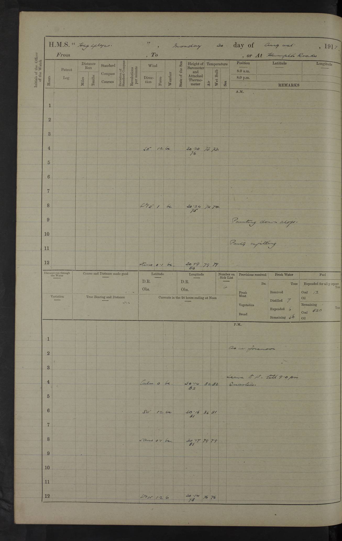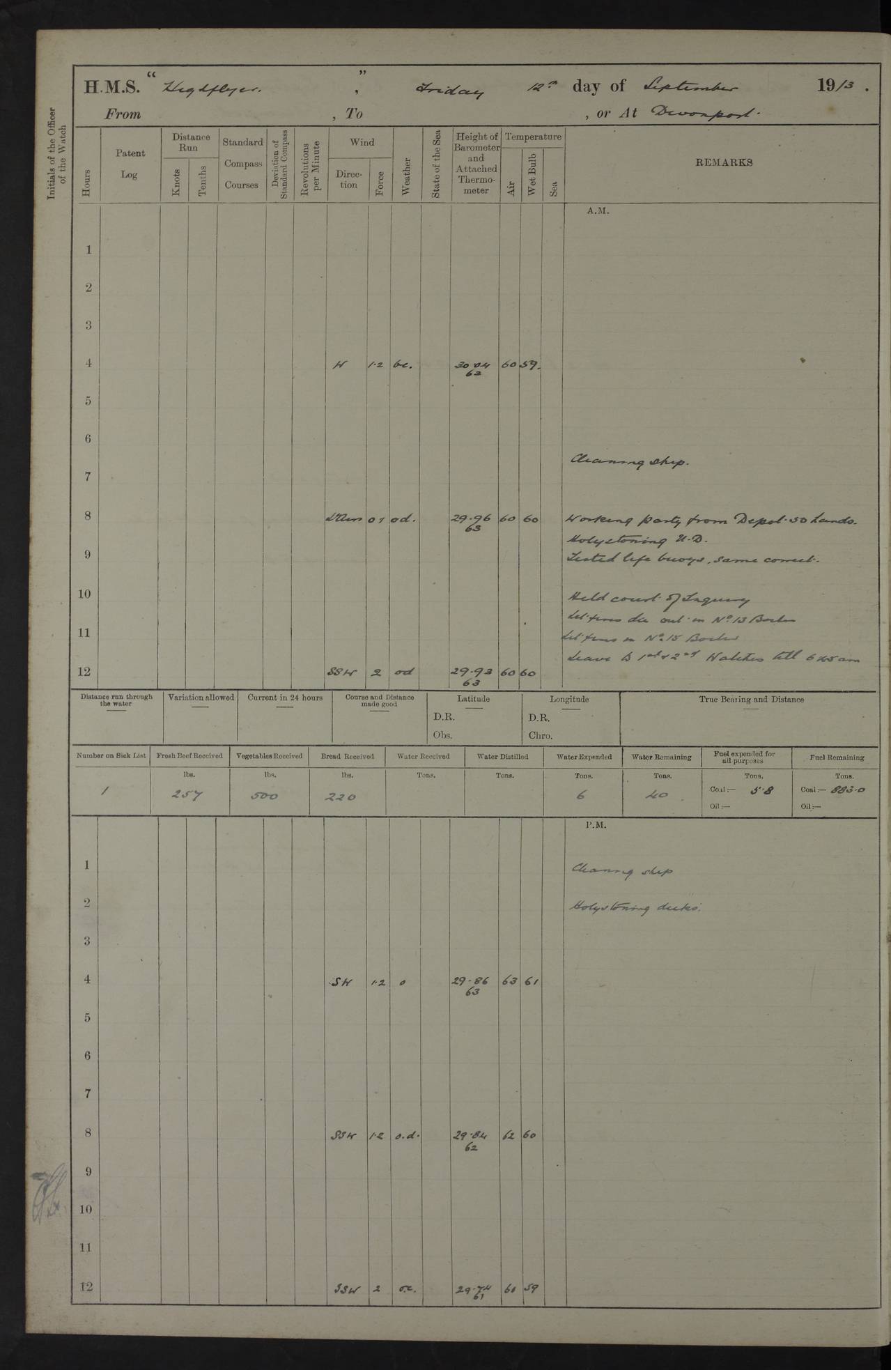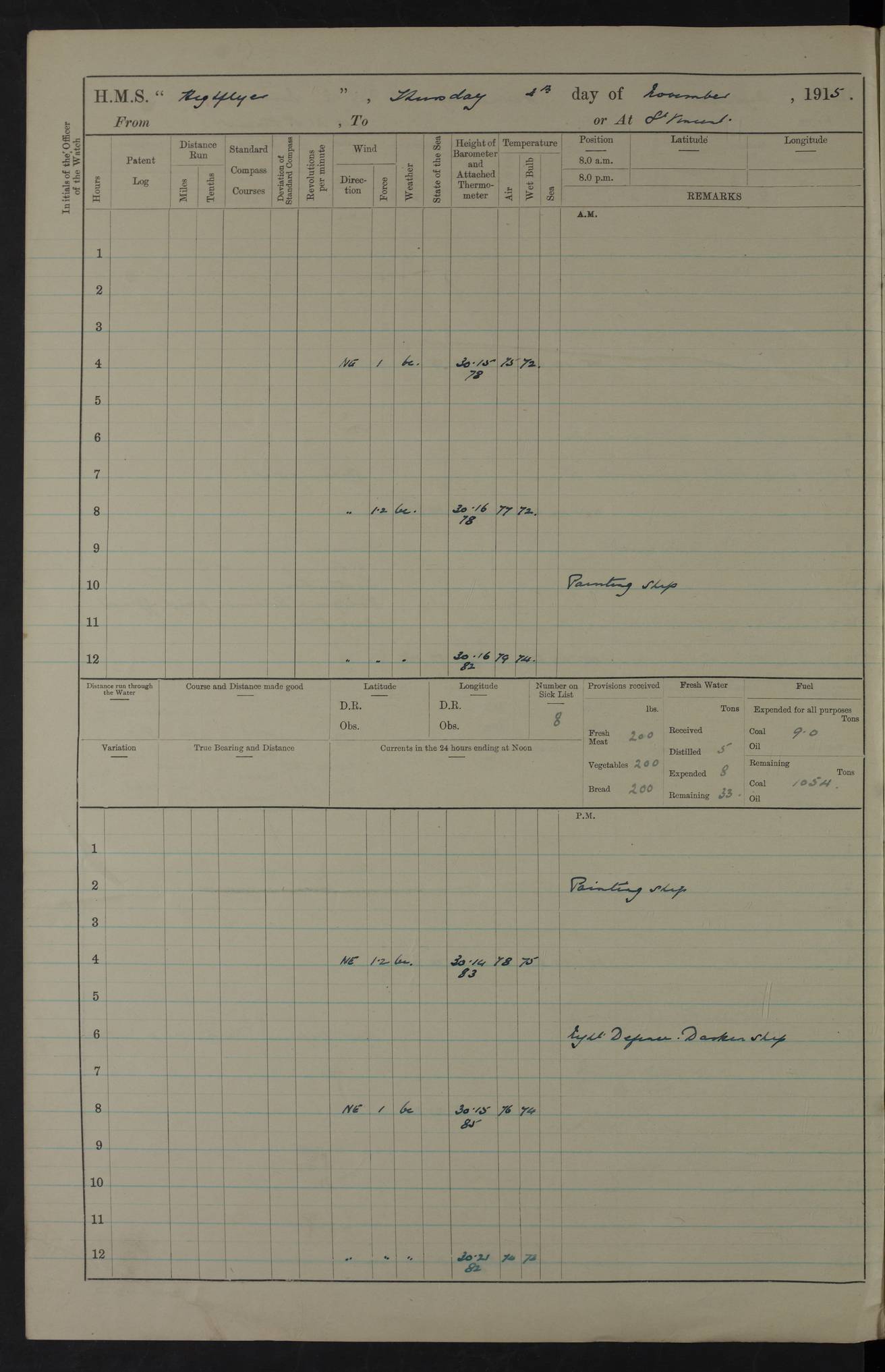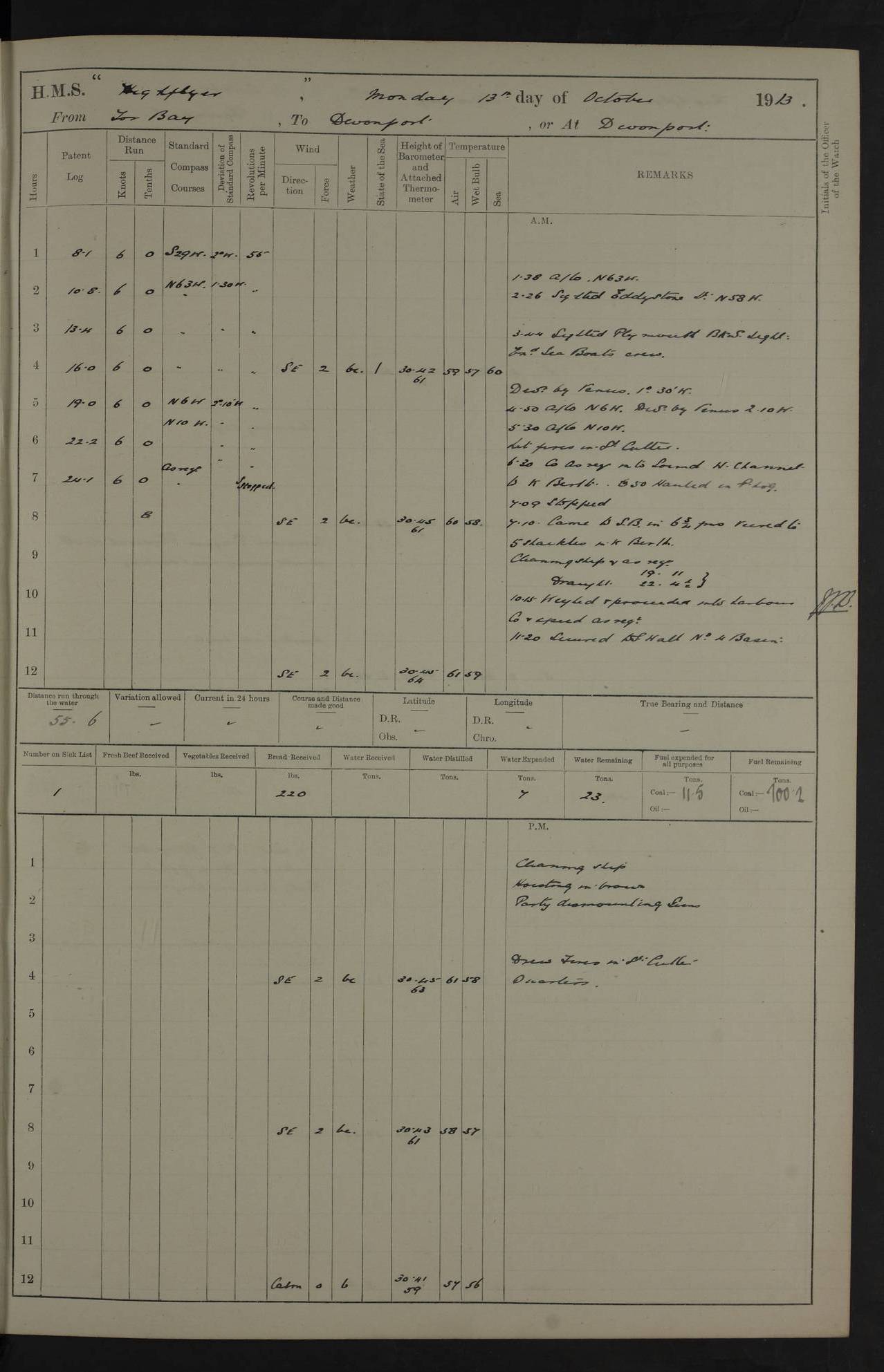 LOGS FOR JUNE 1913 4f960fe6a2fc8e2def000421: (http://s3.amazonaws.com/oldweather/ADM53-44291/ADM 53-44291-004_0.jpg) 14 June 1913 Chatham Lat 51.3855, Long 0.5174 Recommissioned ship. Ship’s company living on board ABOUKIR. 4 watch keepers, 1 PO and 3 AB on board. 4f960fe7a2fc8e2def000422: (http://s3.amazonaws.com/oldweather/ADM53-44291/ADM 53-44291-004_1.jpg) 15 June 1913 Chatham Lat 51.3855, Long 0.5174 [Weather records only.] 4f960fe7a2fc8e2def000423: (http://s3.amazonaws.com/oldweather/ADM53-44291/ADM 53-44291-005_0.jpg) 16 June 1913 Chatham, Lat 51.3855, Long 0.5174 Cleaning the ship. 4f960fe7a2fc8e2def000424: (http://s3.amazonaws.com/oldweather/ADM53-44291/ADM 53-44291-005_1.jpg) 17 June 1913 Chatham Lat 51.40, Long 0.50 2.00pm: Mr. Wright, carpenter, joined ship. 4f960fe8a2fc8e2def000425: (http://s3.amazonaws.com/oldweather/ADM53-44291/ADM 53-44291-006_0.jpg) 18 June 1913 Chatham Lat 51.3855, Long 0.5174 8.30am: BRILLIANT came alongside. 4f960fe8a2fc8e2def000426: (http://s3.amazonaws.com/oldweather/ADM53-44291/ADM 53-44291-006_1.jpg) 19 June 1913 Chatham Lat 51.4, Long 0.5 Hands employed stowing shell rooms and sail rooms. 4f960fe8a2fc8e2def000427: (http://s3.amazonaws.com/oldweather/ADM53-44291/ADM 53-44291-007_0.jpg) 20 June 1913 Chatham Lat 51.3855, Long 0.5174 FORTE secured alongside. 4f960fe9a2fc8e2def000428: (http://s3.amazonaws.com/oldweather/ADM53-44291/ADM 53-44291-007_1.jpg) 21 June 1913 Chatham Lat 51.3855, Long 0.5174 Cleaning ship. 4f960fe9a2fc8e2def000429: (http://s3.amazonaws.com/oldweather/ADM53-44291/ADM 53-44291-008_0.jpg) 22 June 1913 Chatham Lat 51.3855, Long 0.5174 [Weather records only.] 4f960fe9a2fc8e2def00042a: (http://s3.amazonaws.com/oldweather/ADM53-44291/ADM 53-44291-008_1.jpg) 23 June 1913 Chatham Lat 51.3855, Long 0.5174 Dressed ship masthead flags. 4f960feaa2fc8e2def00042b: (http://s3.amazonaws.com/oldweather/ADM53-44291/ADM 53-44291-009_0.jpg) 24 June 1913 Chatham Lat 51.3855, Long 0.5174 Marines at drill. 4f960feaa2fc8e2def00042c: (http://s3.amazonaws.com/oldweather/ADM53-44291/ADM 53-44291-009_1.jpg) 25 June 1913 Chatham Lat 51.3855, Long 0.5174 9.30am: Navy League party visited ship, 250. 4f960feaa2fc8e2def00042d: (http://s3.amazonaws.com/oldweather/ADM53-44291/ADM 53-44291-010_0.jpg) 26 June 1913 Chatham Lat 51.3855, Long 0.5174 Hands cleaning out provision rooms. 4f960feba2fc8e2def00042e: (http://s3.amazonaws.com/oldweather/ADM53-44291/ADM 53-44291-010_1.jpg) 27 June 1913 Chatham Lat 51.3855, Long 0.5174 Half masted colours. 4f960feba2fc8e2def00042f: (http://s3.amazonaws.com/oldweather/ADM53-44291/ADM 53-44291-011_0.jpg) 28 June 1913 Chatham Lat 51.3855, Long 0.5174 Cleaning ship. 4f960feba2fc8e2def000430: (http://s3.amazonaws.com/oldweather/ADM53-44291/ADM 53-44291-011_1.jpg) 29 June 1913 Chatham Lat 51.3855, Long 0.5174 [Weather records only.] 4f960feca2fc8e2def000431: (http://s3.amazonaws.com/oldweather/ADM53-44291/ADM 53-44291-012_0.jpg) 30 June 1913 Chatham Lat 51.3855, Long 0.5174 9.30am: One rating joined from Portsmouth. LOGS FOR JULY 1913 4f960feca2fc8e2def000432: (http://s3.amazonaws.com/oldweather/ADM53-44291/ADM 53-44291-012_1.jpg) 1 July 1913 Chatham Lat 51.3855, Long 0.5174 9.00am: Captain Butler joined ship. 2.30pm: 1 LS joined ship 4f960feca2fc8e2def000433: (http://s3.amazonaws.com/oldweather/ADM53-44291/ADM 53-44291-013_0.jpg) 2 July 1913 Chatham Lat 51.3855, Long 0.5174 Painting out store rooms. 4f960feda2fc8e2def000434: (http://s3.amazonaws.com/oldweather/ADM53-44291/ADM 53-44291-013_1.jpg) 3 July 1913 Chatham Lat 51.3855, Long 0.5174 Painting and scraping. 4f960feda2fc8e2def000435: (http://s3.amazonaws.com/oldweather/ADM53-44291/ADM 53-44291-014_0.jpg) 4 July 1913 Chatham Lat 51.3855, Long 0.5174 Painting and scraping. 4f960feda2fc8e2def000436: (http://s3.amazonaws.com/oldweather/ADM53-44291/ADM 53-44291-014_1.jpg) 5 July 1913 Chatham Lat 51.3855, Long 0.5174 Cleaning up. 4f960feea2fc8e2def000437: (http://s3.amazonaws.com/oldweather/ADM53-44291/ADM 53-44291-015_0.jpg) 6 July 1913 Chatham Lat 51.3855, Long 0.5174 [Weather records only.] 4f960feea2fc8e2def000438: (http://s3.amazonaws.com/oldweather/ADM53-44291/ADM 53-44291-015_1.jpg) 7 July 1913 Chatham Lat 51.3855, Long 0.5174 Painting. 4f960feea2fc8e2def000439: (http://s3.amazonaws.com/oldweather/ADM53-44291/ADM 53-44291-016_0.jpg) 8 July 1913 Chatham Lat 51.3855, Long 0.5174 Hands provisioning ship. 4f960fefa2fc8e2def00043a: (http://s3.amazonaws.com/oldweather/ADM53-44291/ADM 53-44291-016_1.jpg) 9 July 1913 Chatham Lat 51.3855, Long 0.5174 Provisioning ship. 4f960fefa2fc8e2def00043b: (http://s3.amazonaws.com/oldweather/ADM53-44291/ADM 53-44291-017_0.jpg) 10 July 1913 Chatham Lat 51.4, Long 0.5 Hands scraping, chipping & cleaning up generally. 4f960fefa2fc8e2def00043c: (http://s3.amazonaws.com/oldweather/ADM53-44291/ADM 53-44291-017_1.jpg) 11 July 1913 Chatham Lat 51.4, Long 0.5 Preparing ship for going into dock. 4f960fefa2fc8e2def00043d: (http://s3.amazonaws.com/oldweather/ADM53-44291/ADM 53-44291-018_0.jpg) 12 July 1913 Chatham Lat 51.3855, Long 0.5174 10.00am: Commenced docking. 4f960ff0a2fc8e2def00043e: (http://s3.amazonaws.com/oldweather/ADM53-44291/ADM 53-44291-018_1.jpg) 13 July 1913 Chatham Lat 51.3855, Long 0.5174 [Weather records only.] 4f960ff0a2fc8e2def00043f: (http://s3.amazonaws.com/oldweather/ADM53-44291/ADM 53-44291-019_0.jpg) 14 July 1913 Chatham Lat 51.3855, Long 0.5174 1.00pm: Transferred bags and hammocks from ABOUKIR to HIGHFLYER. 4f960ff0a2fc8e2def000440: (http://s3.amazonaws.com/oldweather/ADM53-44291/ADM 53-44291-019_1.jpg) 15 July 1913 Chatham Lat 51.4, Long 0.5 9.00am: Ships’ company transferring bags and hammocks to Depot. 4f960ff1a2fc8e2def000441: (http://s3.amazonaws.com/oldweather/ADM53-44291/ADM 53-44291-020_0.jpg) 16 July 1913 Chatham Lat 51.3855, Long 0.5174 Hands scraping as requisite. 4f960ff1a2fc8e2def000442: (http://s3.amazonaws.com/oldweather/ADM53-44291/ADM 53-44291-020_1.jpg) 17 July 1913 Chatham Lat 51.3855, Long 0.5174 Refitting