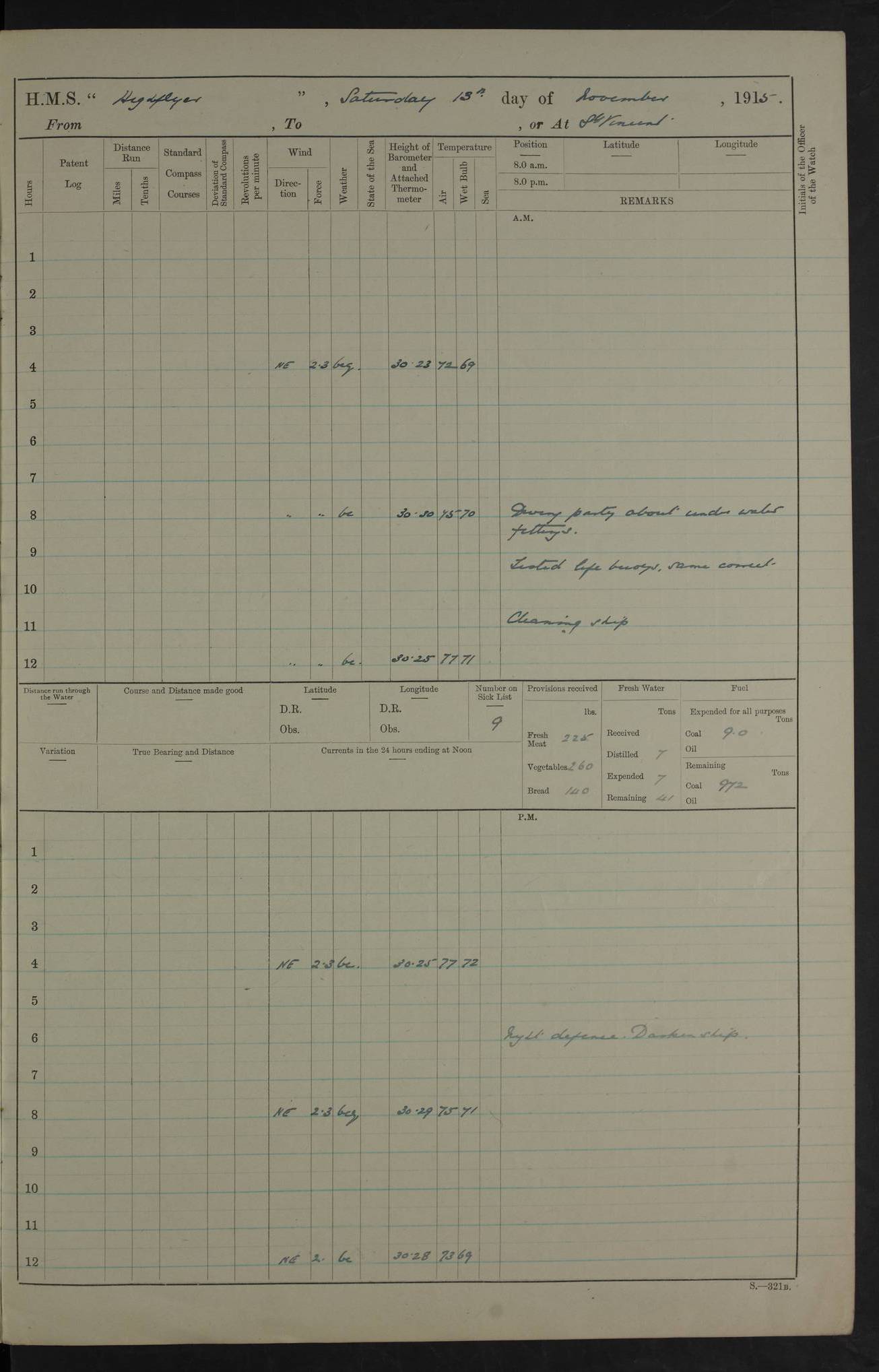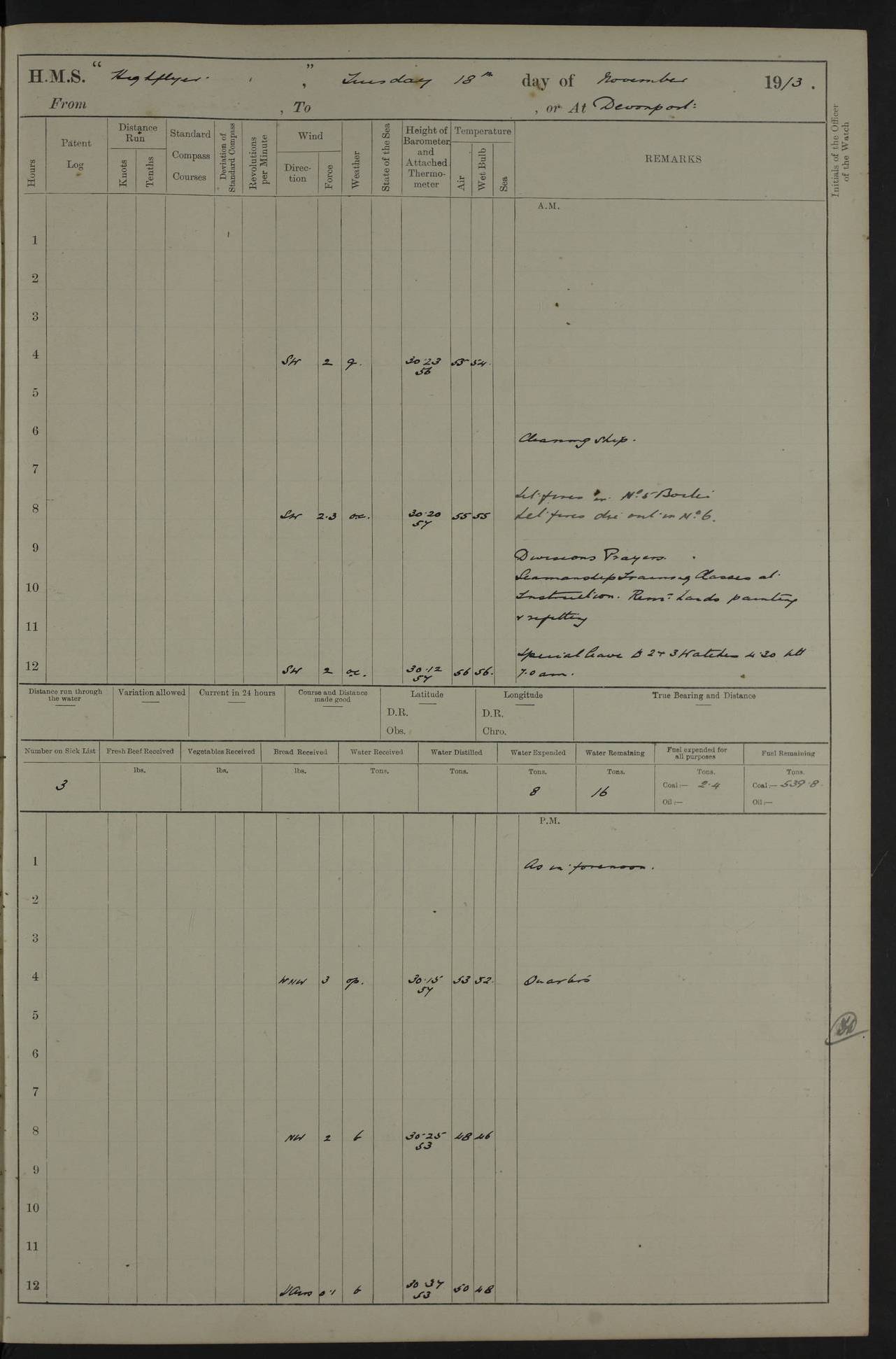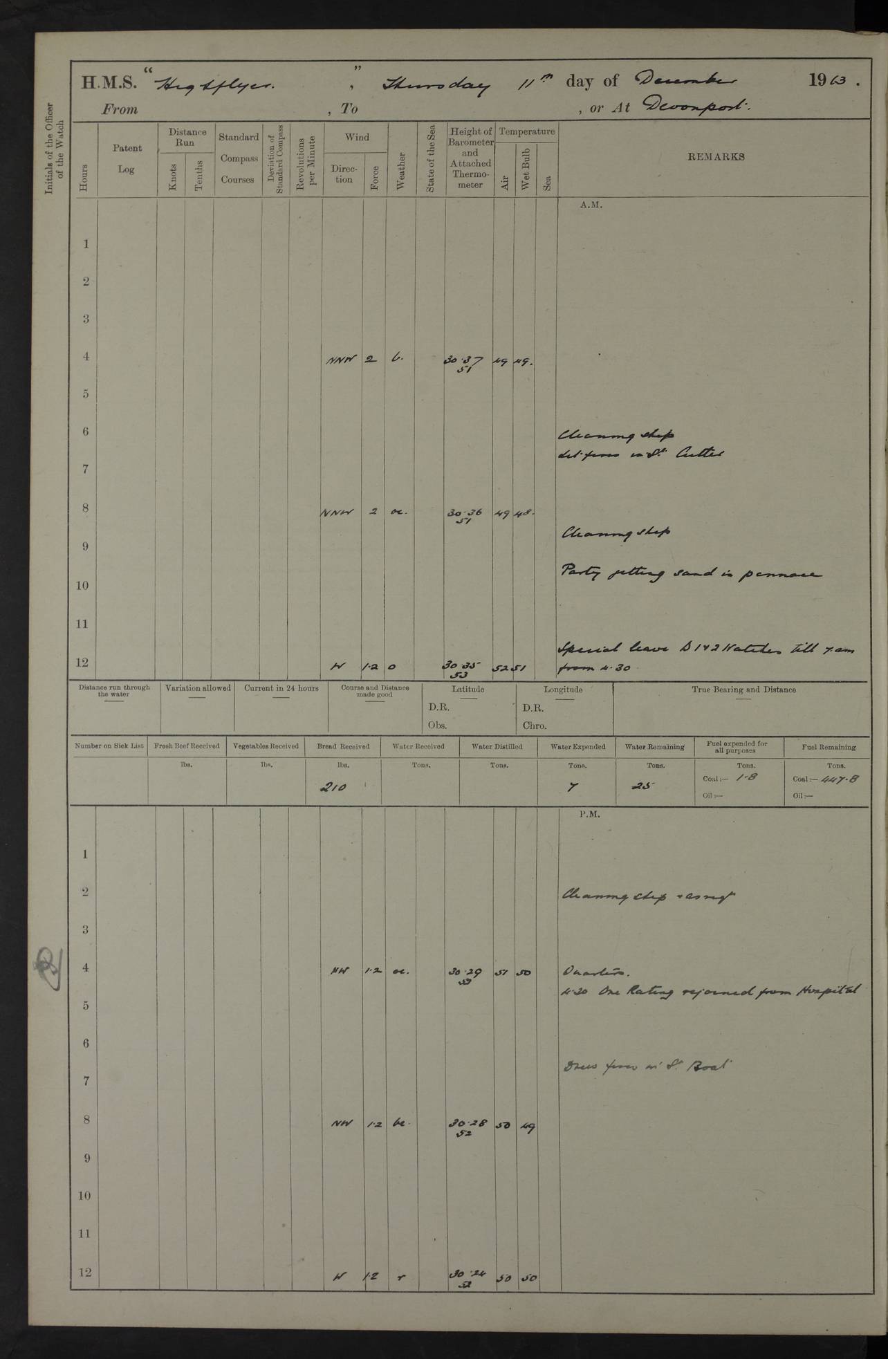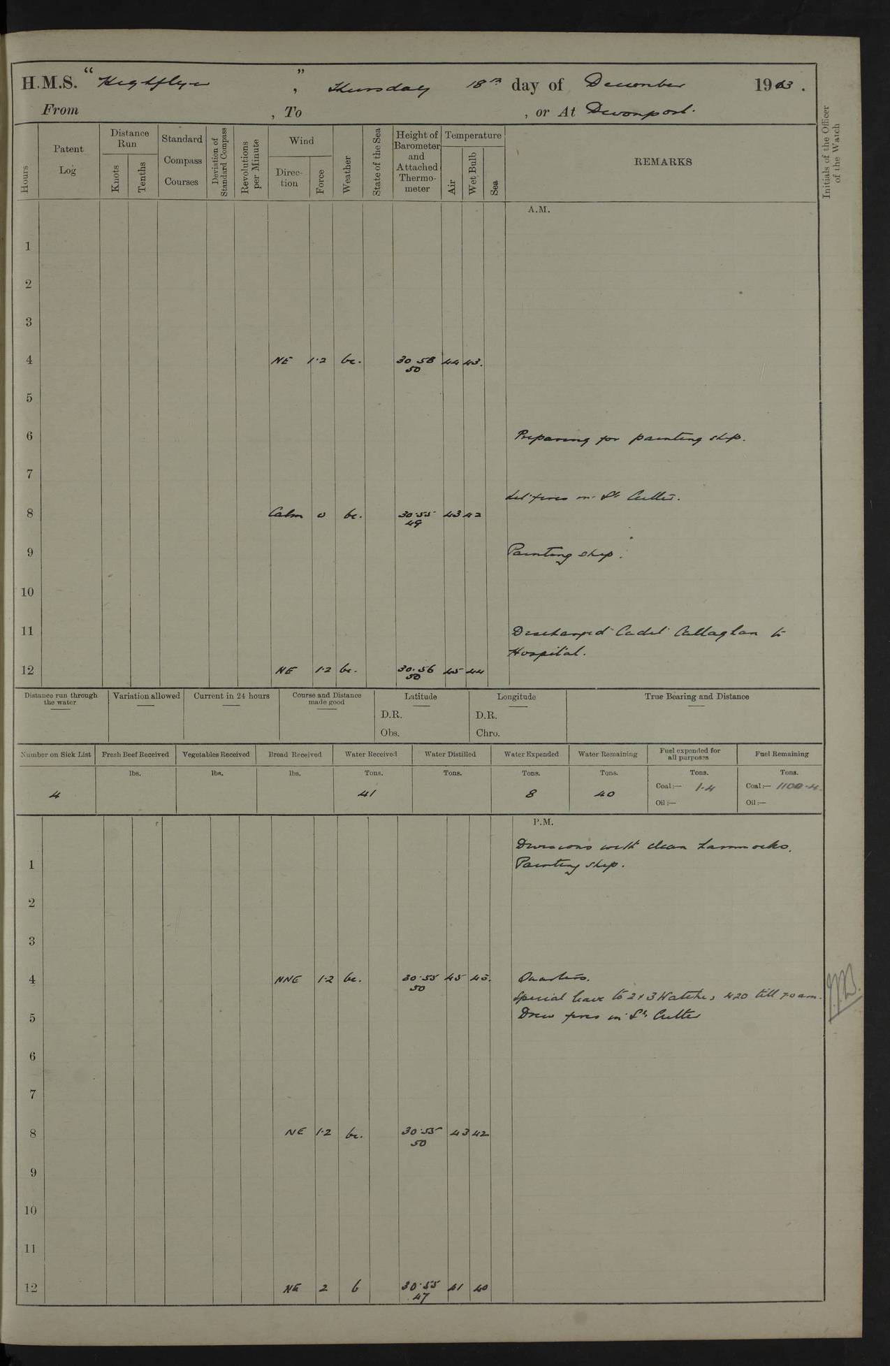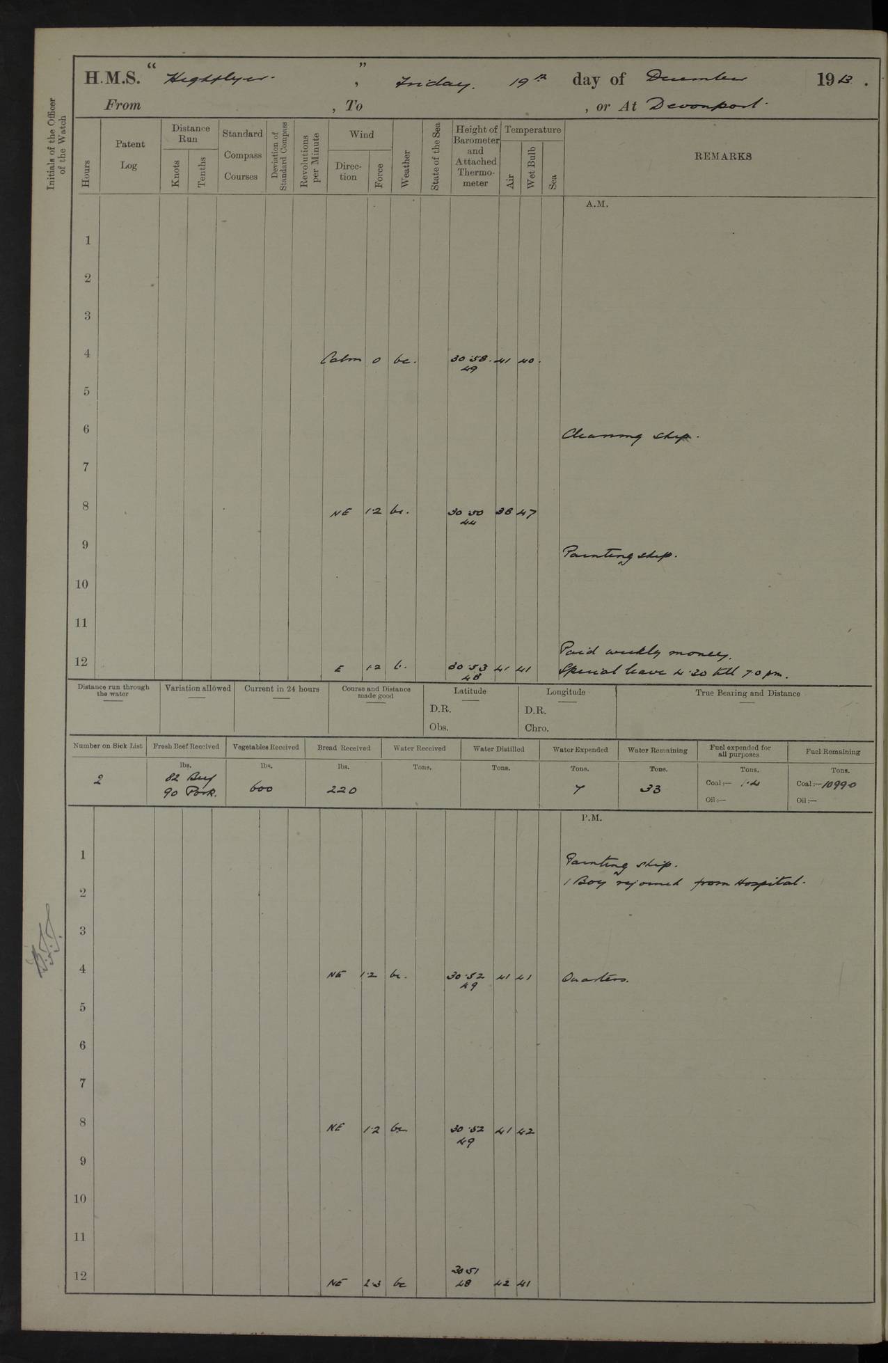 LOGS FOR JUNE 1913 4f960fe6a2fc8e2def000421: (http://s3.amazonaws.com/oldweather/ADM53-44291/ADM 53-44291-004_0.jpg) 14 June 1913 Chatham Lat 51.3855, Long 0.5174 Recommissioned ship. Ship’s company living on board ABOUKIR. 4 watch keepers, 1 PO and 3 AB on board. 4f960fe7a2fc8e2def000422: (http://s3.amazonaws.com/oldweather/ADM53-44291/ADM 53-44291-004_1.jpg) 15 June 1913 Chatham Lat 51.3855, Long 0.5174 [Weather records only.] 4f960fe7a2fc8e2def000423: (http://s3.amazonaws.com/oldweather/ADM53-44291/ADM 53-44291-005_0.jpg) 16 June 1913 Chatham, Lat 51.3855, Long 0.5174 Cleaning the ship. 4f960fe7a2fc8e2def000424: (http://s3.amazonaws.com/oldweather/ADM53-44291/ADM 53-44291-005_1.jpg) 17 June 1913 Chatham Lat 51.40, Long 0.50 2.00pm: Mr. Wright, carpenter, joined ship. 4f960fe8a2fc8e2def000425: (http://s3.amazonaws.com/oldweather/ADM53-44291/ADM 53-44291-006_0.jpg) 18 June 1913 Chatham Lat 51.3855, Long 0.5174 8.30am: BRILLIANT came alongside. 4f960fe8a2fc8e2def000426: (http://s3.amazonaws.com/oldweather/ADM53-44291/ADM 53-44291-006_1.jpg) 19 June 1913 Chatham Lat 51.4, Long 0.5 Hands employed stowing shell rooms and sail rooms. 4f960fe8a2fc8e2def000427: (http://s3.amazonaws.com/oldweather/ADM53-44291/ADM 53-44291-007_0.jpg) 20 June 1913 Chatham Lat 51.3855, Long 0.5174 FORTE secured alongside. 4f960fe9a2fc8e2def000428: (http://s3.amazonaws.com/oldweather/ADM53-44291/ADM 53-44291-007_1.jpg) 21 June 1913 Chatham Lat 51.3855, Long 0.5174 Cleaning ship. 4f960fe9a2fc8e2def000429: (http://s3.amazonaws.com/oldweather/ADM53-44291/ADM 53-44291-008_0.jpg) 22 June 1913 Chatham Lat 51.3855, Long 0.5174 [Weather records only.] 4f960fe9a2fc8e2def00042a: (http://s3.amazonaws.com/oldweather/ADM53-44291/ADM 53-44291-008_1.jpg) 23 June 1913 Chatham Lat 51.3855, Long 0.5174 Dressed ship masthead flags. 4f960feaa2fc8e2def00042b: (http://s3.amazonaws.com/oldweather/ADM53-44291/ADM 53-44291-009_0.jpg) 24 June 1913 Chatham Lat 51.3855, Long 0.5174 Marines at drill. 4f960feaa2fc8e2def00042c: (http://s3.amazonaws.com/oldweather/ADM53-44291/ADM 53-44291-009_1.jpg) 25 June 1913 Chatham Lat 51.3855, Long 0.5174 9.30am: Navy League party visited ship, 250. 4f960feaa2fc8e2def00042d: (http://s3.amazonaws.com/oldweather/ADM53-44291/ADM 53-44291-010_0.jpg) 26 June 1913 Chatham Lat 51.3855, Long 0.5174 Hands cleaning out provision rooms. 4f960feba2fc8e2def00042e: (http://s3.amazonaws.com/oldweather/ADM53-44291/ADM 53-44291-010_1.jpg) 27 June 1913 Chatham Lat 51.3855, Long 0.5174 Half masted colours. 4f960feba2fc8e2def00042f: (http://s3.amazonaws.com/oldweather/ADM53-44291/ADM 53-44291-011_0.jpg) 28 June 1913 Chatham Lat 51.3855, Long 0.5174 Cleaning ship. 4f960feba2fc8e2def000430: (http://s3.amazonaws.com/oldweather/ADM53-44291/ADM 53-44291-011_1.jpg) 29 June 1913 Chatham Lat 51.3855, Long 0.5174 [Weather records only.] 4f960feca2fc8e2def000431: (http://s3.amazonaws.com/oldweather/ADM53-44291/ADM 53-44291-012_0.jpg) 30 June 1913 Chatham Lat 51.3855, Long 0.5174 9.30am: One rating joined from Portsmouth. LOGS FOR JULY 1913 4f960feca2fc8e2def000432: (http://s3.amazonaws.com/oldweather/ADM53-44291/ADM 53-44291-012_1.jpg) 1 July 1913 Chatham Lat 51.3855, Long 0.5174 9.00am: Captain Butler joined ship. 2.30pm: 1 LS joined ship 4f960feca2fc8e2def000433: (http://s3.amazonaws.com/oldweather/ADM53-44291/ADM 53-44291-013_0.jpg) 2 July 1913 Chatham Lat 51.3855, Long 0.5174 Painting out store rooms. 4f960feda2fc8e2def000434: (http://s3.amazonaws.com/oldweather/ADM53-44291/ADM 53-44291-013_1.jpg) 3 July 1913 Chatham Lat 51.3855, Long 0.5174 Painting and scraping. 4f960feda2fc8e2def000435: (http://s3.amazonaws.com/oldweather/ADM53-44291/ADM 53-44291-014_0.jpg) 4 July 1913 Chatham Lat 51.3855, Long 0.5174 Painting and scraping. 4f960feda2fc8e2def000436: (http://s3.amazonaws.com/oldweather/ADM53-44291/ADM 53-44291-014_1.jpg) 5 July 1913 Chatham Lat 51.3855, Long 0.5174 Cleaning up. 4f960feea2fc8e2def000437: (http://s3.amazonaws.com/oldweather/ADM53-44291/ADM 53-44291-015_0.jpg) 6 July 1913 Chatham Lat 51.3855, Long 0.5174 [Weather records only.] 4f960feea2fc8e2def000438: (http://s3.amazonaws.com/oldweather/ADM53-44291/ADM 53-44291-015_1.jpg) 7 July 1913 Chatham Lat 51.3855, Long 0.5174 Painting. 4f960feea2fc8e2def000439: (http://s3.amazonaws.com/oldweather/ADM53-44291/ADM 53-44291-016_0.jpg) 8 July 1913 Chatham Lat 51.3855, Long 0.5174 Hands provisioning ship. 4f960fefa2fc8e2def00043a: (http://s3.amazonaws.com/oldweather/ADM53-44291/ADM 53-44291-016_1.jpg) 9 July 1913 Chatham Lat 51.3855, Long 0.5174 Provisioning ship. 4f960fefa2fc8e2def00043b: (http://s3.amazonaws.com/oldweather/ADM53-44291/ADM 53-44291-017_0.jpg) 10 July 1913 Chatham Lat 51.4, Long 0.5 Hands scraping, chipping & cleaning up generally. 4f960fefa2fc8e2def00043c: (http://s3.amazonaws.com/oldweather/ADM53-44291/ADM 53-44291-017_1.jpg) 11 July 1913 Chatham Lat 51.4, Long 0.5 Preparing ship for going into dock. 4f960fefa2fc8e2def00043d: (http://s3.amazonaws.com/oldweather/ADM53-44291/ADM 53-44291-018_0.jpg) 12 July 1913 Chatham Lat 51.3855, Long 0.5174 10.00am: Commenced docking. 4f960ff0a2fc8e2def00043e: (http://s3.amazonaws.com/oldweather/ADM53-44291/ADM 53-44291-018_1.jpg) 13 July 1913 Chatham Lat 51.3855, Long 0.5174 [Weather records only.] 4f960ff0a2fc8e2def00043f: (http://s3.amazonaws.com/oldweather/ADM53-44291/ADM 53-44291-019_0.jpg) 14 July 1913 Chatham Lat 51.3855, Long 0.5174 1.00pm: Transferred bags and hammocks from ABOUKIR to HIGHFLYER. 4f960ff0a2fc8e2def000440: (http://s3.amazonaws.com/oldweather/ADM53-44291/ADM 53-44291-019_1.jpg) 15 July 1913 Chatham Lat 51.4, Long 0.5 9.00am: Ships’ company transferring bags and hammocks to Depot. 4f960ff1a2fc8e2def000441: (http://s3.amazonaws.com/oldweather/ADM53-44291/ADM 53-44291-020_0.jpg) 16 July 1913 Chatham Lat 51.3855, Long 0.5174 Hands scraping as requisite. 4f960ff1a2fc8e2def000442: (http://s3.amazonaws.com/oldweather/ADM53-44291/ADM 53-44291-020_1.jpg) 17 July 1913 Chatham Lat 51.3855, Long 0.5174 Refitting