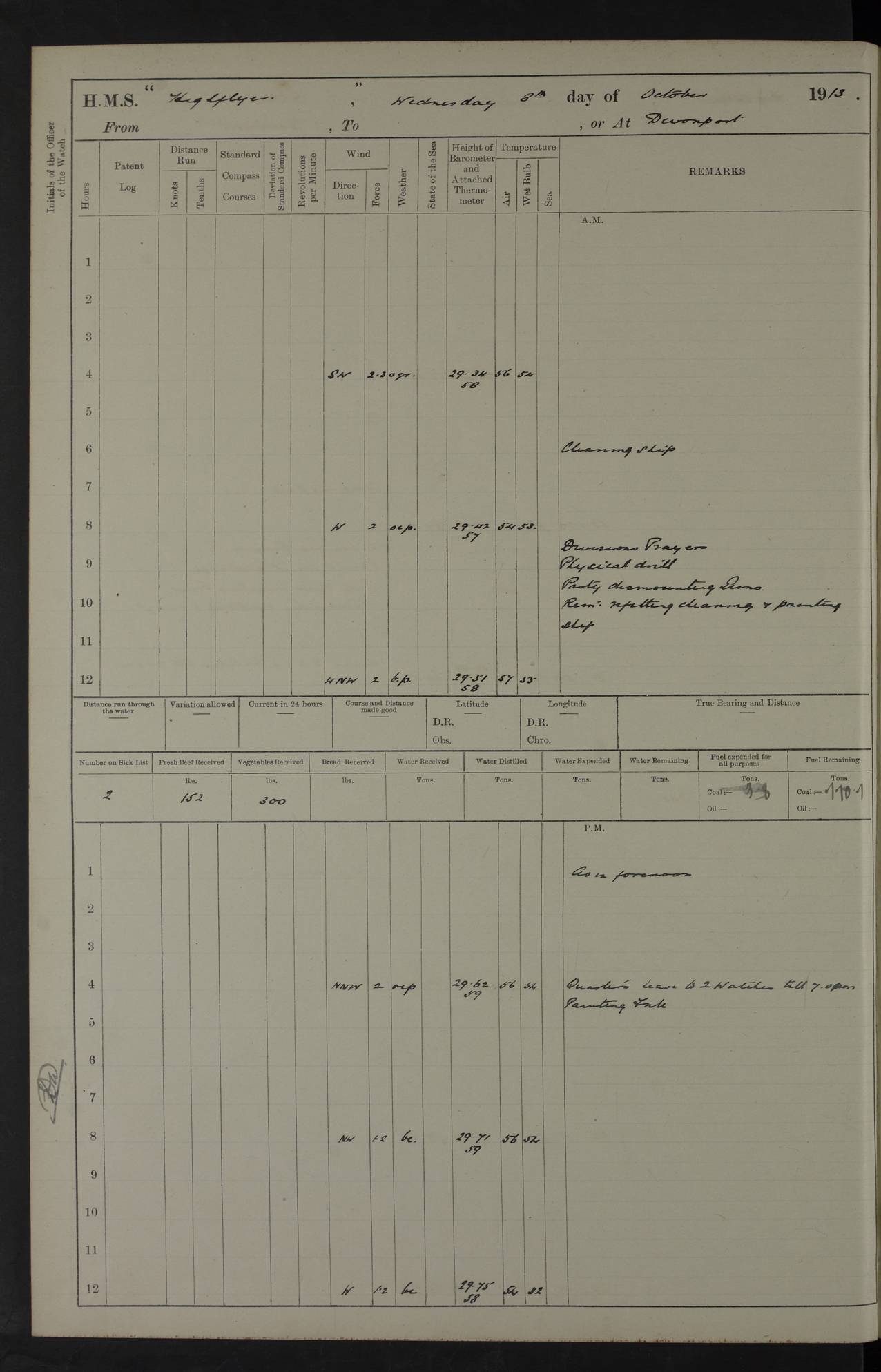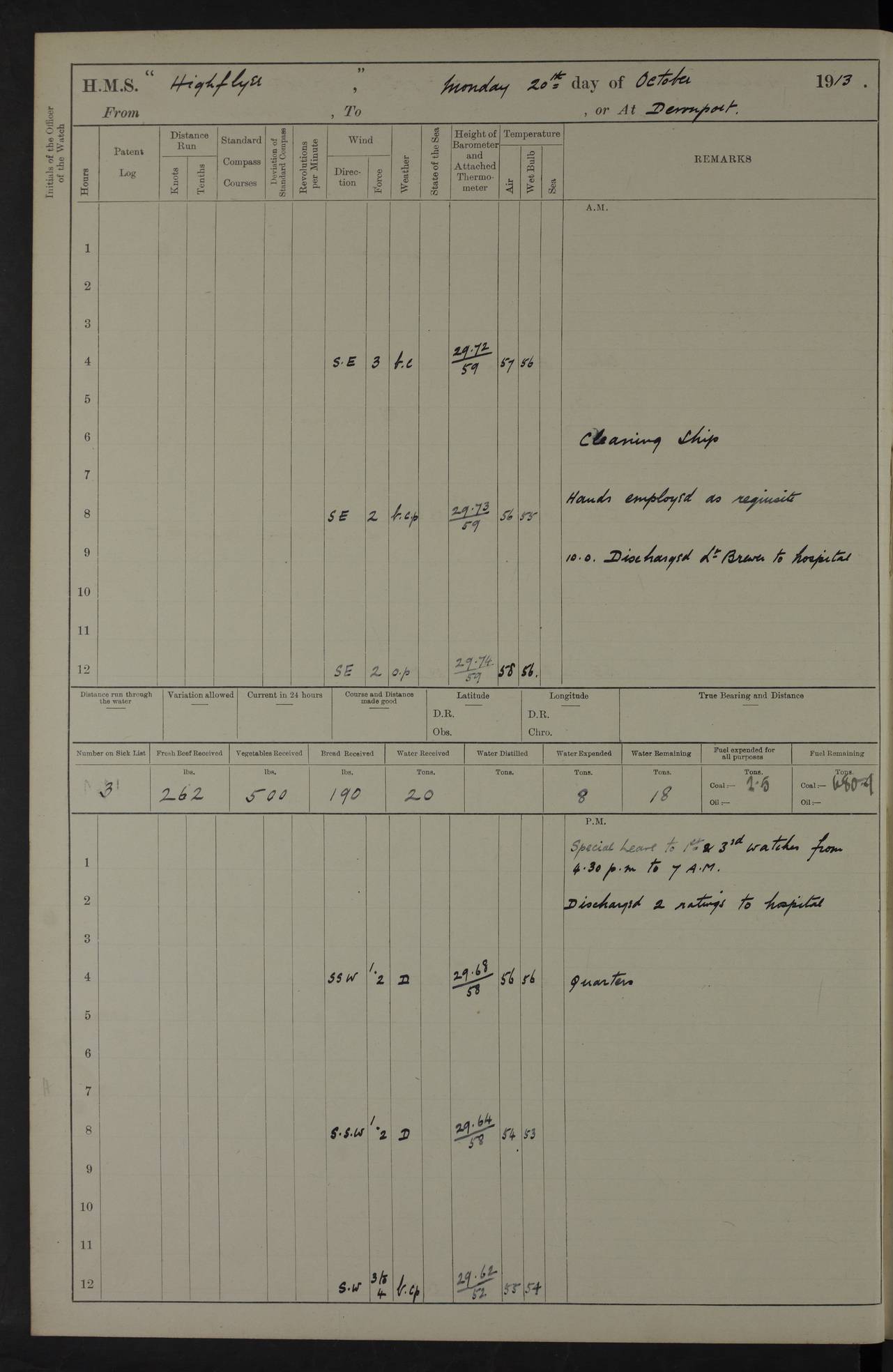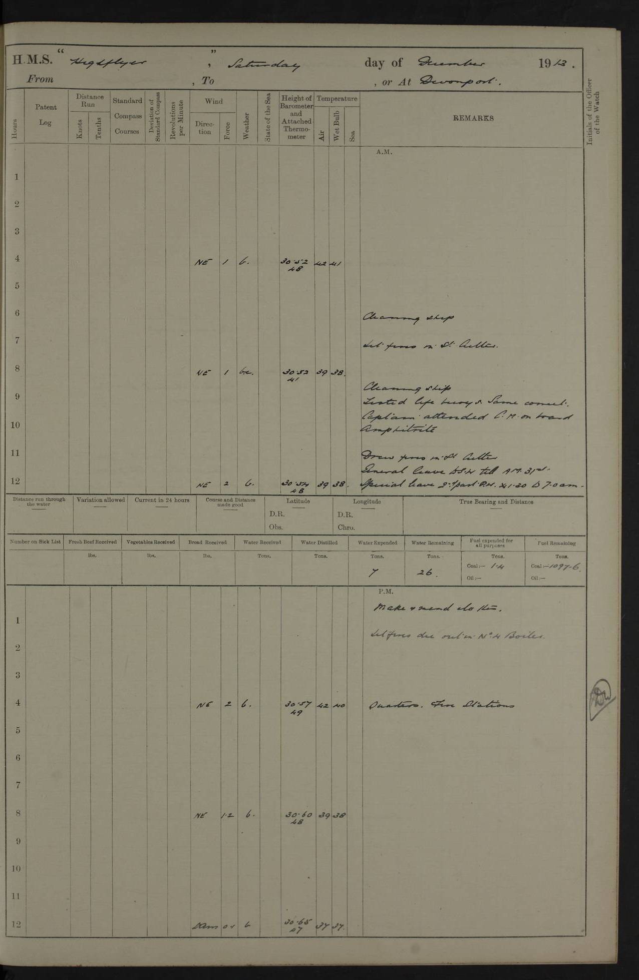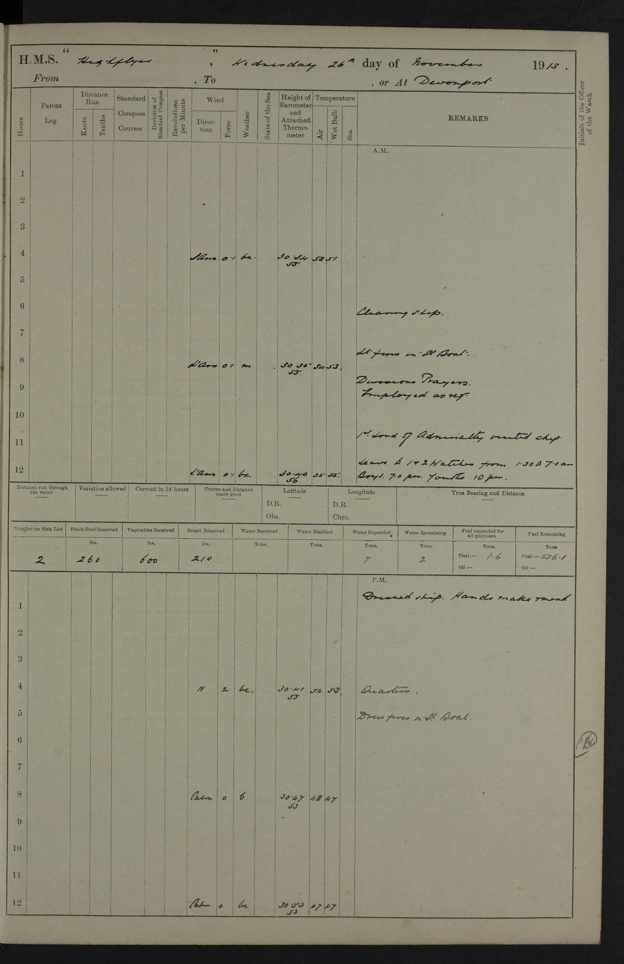 LOGS FOR JUNE 1913 4f960fe6a2fc8e2def000421: (http://s3.amazonaws.com/oldweather/ADM53-44291/ADM 53-44291-004_0.jpg) 14 June 1913 Chatham Lat 51.3855, Long 0.5174 Recommissioned ship. Ship’s company living on board ABOUKIR. 4 watch keepers, 1 PO and 3 AB on board. 4f960fe7a2fc8e2def000422: (http://s3.amazonaws.com/oldweather/ADM53-44291/ADM 53-44291-004_1.jpg) 15 June 1913 Chatham Lat 51.3855, Long 0.5174 [Weather records only.] 4f960fe7a2fc8e2def000423: (http://s3.amazonaws.com/oldweather/ADM53-44291/ADM 53-44291-005_0.jpg) 16 June 1913 Chatham, Lat 51.3855, Long 0.5174 Cleaning the ship. 4f960fe7a2fc8e2def000424: (http://s3.amazonaws.com/oldweather/ADM53-44291/ADM 53-44291-005_1.jpg) 17 June 1913 Chatham Lat 51.40, Long 0.50 2.00pm: Mr. Wright, carpenter, joined ship. 4f960fe8a2fc8e2def000425: (http://s3.amazonaws.com/oldweather/ADM53-44291/ADM 53-44291-006_0.jpg) 18 June 1913 Chatham Lat 51.3855, Long 0.5174 8.30am: BRILLIANT came alongside. 4f960fe8a2fc8e2def000426: (http://s3.amazonaws.com/oldweather/ADM53-44291/ADM 53-44291-006_1.jpg) 19 June 1913 Chatham Lat 51.4, Long 0.5 Hands employed stowing shell rooms and sail rooms. 4f960fe8a2fc8e2def000427: (http://s3.amazonaws.com/oldweather/ADM53-44291/ADM 53-44291-007_0.jpg) 20 June 1913 Chatham Lat 51.3855, Long 0.5174 FORTE secured alongside. 4f960fe9a2fc8e2def000428: (http://s3.amazonaws.com/oldweather/ADM53-44291/ADM 53-44291-007_1.jpg) 21 June 1913 Chatham Lat 51.3855, Long 0.5174 Cleaning ship. 4f960fe9a2fc8e2def000429: (http://s3.amazonaws.com/oldweather/ADM53-44291/ADM 53-44291-008_0.jpg) 22 June 1913 Chatham Lat 51.3855, Long 0.5174 [Weather records only.] 4f960fe9a2fc8e2def00042a: (http://s3.amazonaws.com/oldweather/ADM53-44291/ADM 53-44291-008_1.jpg) 23 June 1913 Chatham Lat 51.3855, Long 0.5174 Dressed ship masthead flags. 4f960feaa2fc8e2def00042b: (http://s3.amazonaws.com/oldweather/ADM53-44291/ADM 53-44291-009_0.jpg) 24 June 1913 Chatham Lat 51.3855, Long 0.5174 Marines at drill. 4f960feaa2fc8e2def00042c: (http://s3.amazonaws.com/oldweather/ADM53-44291/ADM 53-44291-009_1.jpg) 25 June 1913 Chatham Lat 51.3855, Long 0.5174 9.30am: Navy League party visited ship, 250. 4f960feaa2fc8e2def00042d: (http://s3.amazonaws.com/oldweather/ADM53-44291/ADM 53-44291-010_0.jpg) 26 June 1913 Chatham Lat 51.3855, Long 0.5174 Hands cleaning out provision rooms. 4f960feba2fc8e2def00042e: (http://s3.amazonaws.com/oldweather/ADM53-44291/ADM 53-44291-010_1.jpg) 27 June 1913 Chatham Lat 51.3855, Long 0.5174 Half masted colours. 4f960feba2fc8e2def00042f: (http://s3.amazonaws.com/oldweather/ADM53-44291/ADM 53-44291-011_0.jpg) 28 June 1913 Chatham Lat 51.3855, Long 0.5174 Cleaning ship. 4f960feba2fc8e2def000430: (http://s3.amazonaws.com/oldweather/ADM53-44291/ADM 53-44291-011_1.jpg) 29 June 1913 Chatham Lat 51.3855, Long 0.5174 [Weather records only.] 4f960feca2fc8e2def000431: (http://s3.amazonaws.com/oldweather/ADM53-44291/ADM 53-44291-012_0.jpg) 30 June 1913 Chatham Lat 51.3855, Long 0.5174 9.30am: One rating joined from Portsmouth. LOGS FOR JULY 1913 4f960feca2fc8e2def000432: (http://s3.amazonaws.com/oldweather/ADM53-44291/ADM 53-44291-012_1.jpg) 1 July 1913 Chatham Lat 51.3855, Long 0.5174 9.00am: Captain Butler joined ship. 2.30pm: 1 LS joined ship 4f960feca2fc8e2def000433: (http://s3.amazonaws.com/oldweather/ADM53-44291/ADM 53-44291-013_0.jpg) 2 July 1913 Chatham Lat 51.3855, Long 0.5174 Painting out store rooms. 4f960feda2fc8e2def000434: (http://s3.amazonaws.com/oldweather/ADM53-44291/ADM 53-44291-013_1.jpg) 3 July 1913 Chatham Lat 51.3855, Long 0.5174 Painting and scraping. 4f960feda2fc8e2def000435: (http://s3.amazonaws.com/oldweather/ADM53-44291/ADM 53-44291-014_0.jpg) 4 July 1913 Chatham Lat 51.3855, Long 0.5174 Painting and scraping. 4f960feda2fc8e2def000436: (http://s3.amazonaws.com/oldweather/ADM53-44291/ADM 53-44291-014_1.jpg) 5 July 1913 Chatham Lat 51.3855, Long 0.5174 Cleaning up. 4f960feea2fc8e2def000437: (http://s3.amazonaws.com/oldweather/ADM53-44291/ADM 53-44291-015_0.jpg) 6 July 1913 Chatham Lat 51.3855, Long 0.5174 [Weather records only.] 4f960feea2fc8e2def000438: (http://s3.amazonaws.com/oldweather/ADM53-44291/ADM 53-44291-015_1.jpg) 7 July 1913 Chatham Lat 51.3855, Long 0.5174 Painting. 4f960feea2fc8e2def000439: (http://s3.amazonaws.com/oldweather/ADM53-44291/ADM 53-44291-016_0.jpg) 8 July 1913 Chatham Lat 51.3855, Long 0.5174 Hands provisioning ship. 4f960fefa2fc8e2def00043a: (http://s3.amazonaws.com/oldweather/ADM53-44291/ADM 53-44291-016_1.jpg) 9 July 1913 Chatham Lat 51.3855, Long 0.5174 Provisioning ship. 4f960fefa2fc8e2def00043b: (http://s3.amazonaws.com/oldweather/ADM53-44291/ADM 53-44291-017_0.jpg) 10 July 1913 Chatham Lat 51.4, Long 0.5 Hands scraping, chipping & cleaning up generally. 4f960fefa2fc8e2def00043c: (http://s3.amazonaws.com/oldweather/ADM53-44291/ADM 53-44291-017_1.jpg) 11 July 1913 Chatham Lat 51.4, Long 0.5 Preparing ship for going into dock. 4f960fefa2fc8e2def00043d: (http://s3.amazonaws.com/oldweather/ADM53-44291/ADM 53-44291-018_0.jpg) 12 July 1913 Chatham Lat 51.3855, Long 0.5174 10.00am: Commenced docking. 4f960ff0a2fc8e2def00043e: (http://s3.amazonaws.com/oldweather/ADM53-44291/ADM 53-44291-018_1.jpg) 13 July 1913 Chatham Lat 51.3855, Long 0.5174 [Weather records only.] 4f960ff0a2fc8e2def00043f: (http://s3.amazonaws.com/oldweather/ADM53-44291/ADM 53-44291-019_0.jpg) 14 July 1913 Chatham Lat 51.3855, Long 0.5174 1.00pm: Transferred bags and hammocks from ABOUKIR to HIGHFLYER. 4f960ff0a2fc8e2def000440: (http://s3.amazonaws.com/oldweather/ADM53-44291/ADM 53-44291-019_1.jpg) 15 July 1913 Chatham Lat 51.4, Long 0.5 9.00am: Ships’ company transferring bags and hammocks to Depot. 4f960ff1a2fc8e2def000441: (http://s3.amazonaws.com/oldweather/ADM53-44291/ADM 53-44291-020_0.jpg) 16 July 1913 Chatham Lat 51.3855, Long 0.5174 Hands scraping as requisite. 4f960ff1a2fc8e2def000442: (http://s3.amazonaws.com/oldweather/ADM53-44291/ADM 53-44291-020_1.jpg) 17 July 1913 Chatham Lat 51.3855, Long 0.5174 Refitting