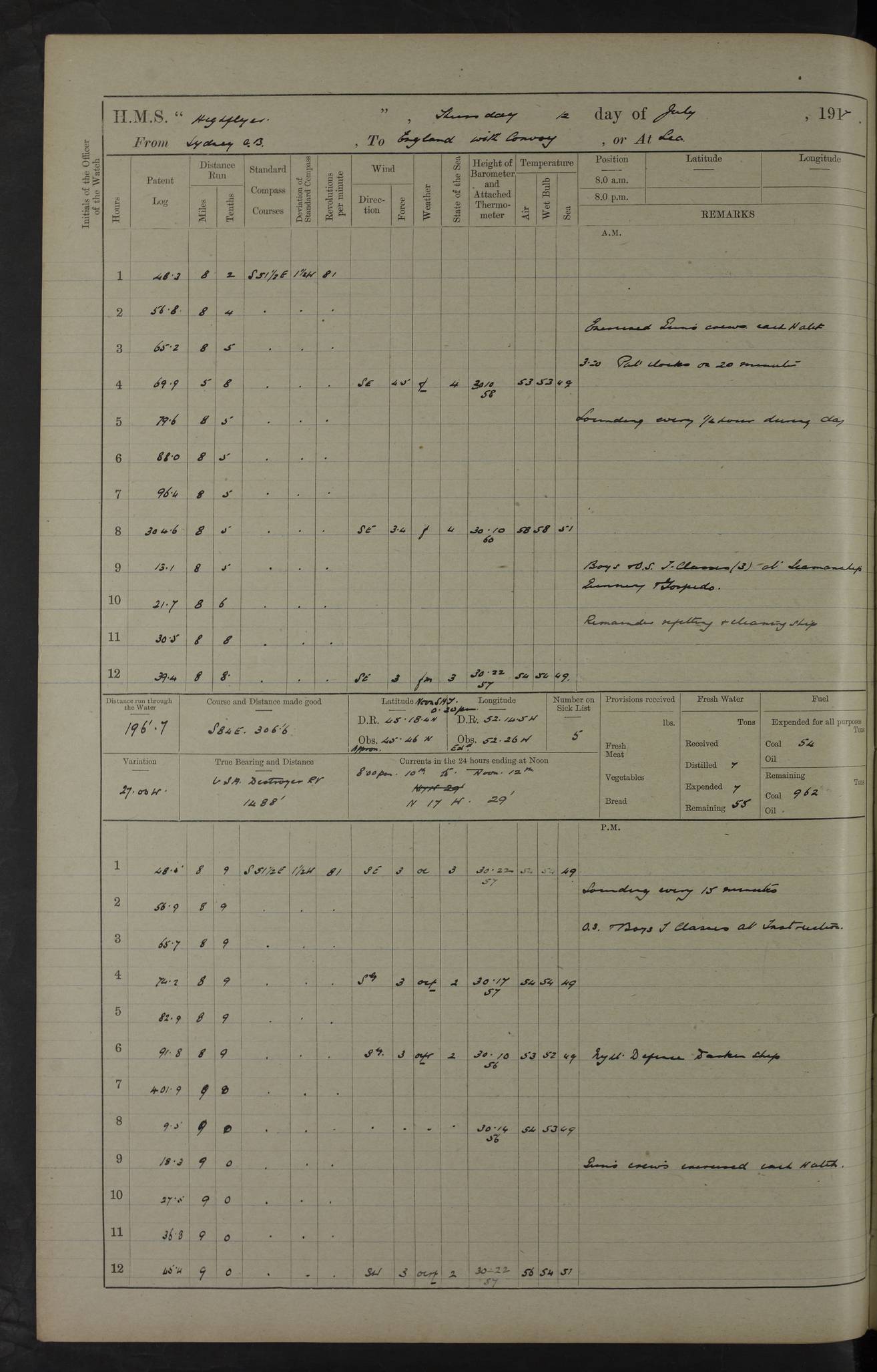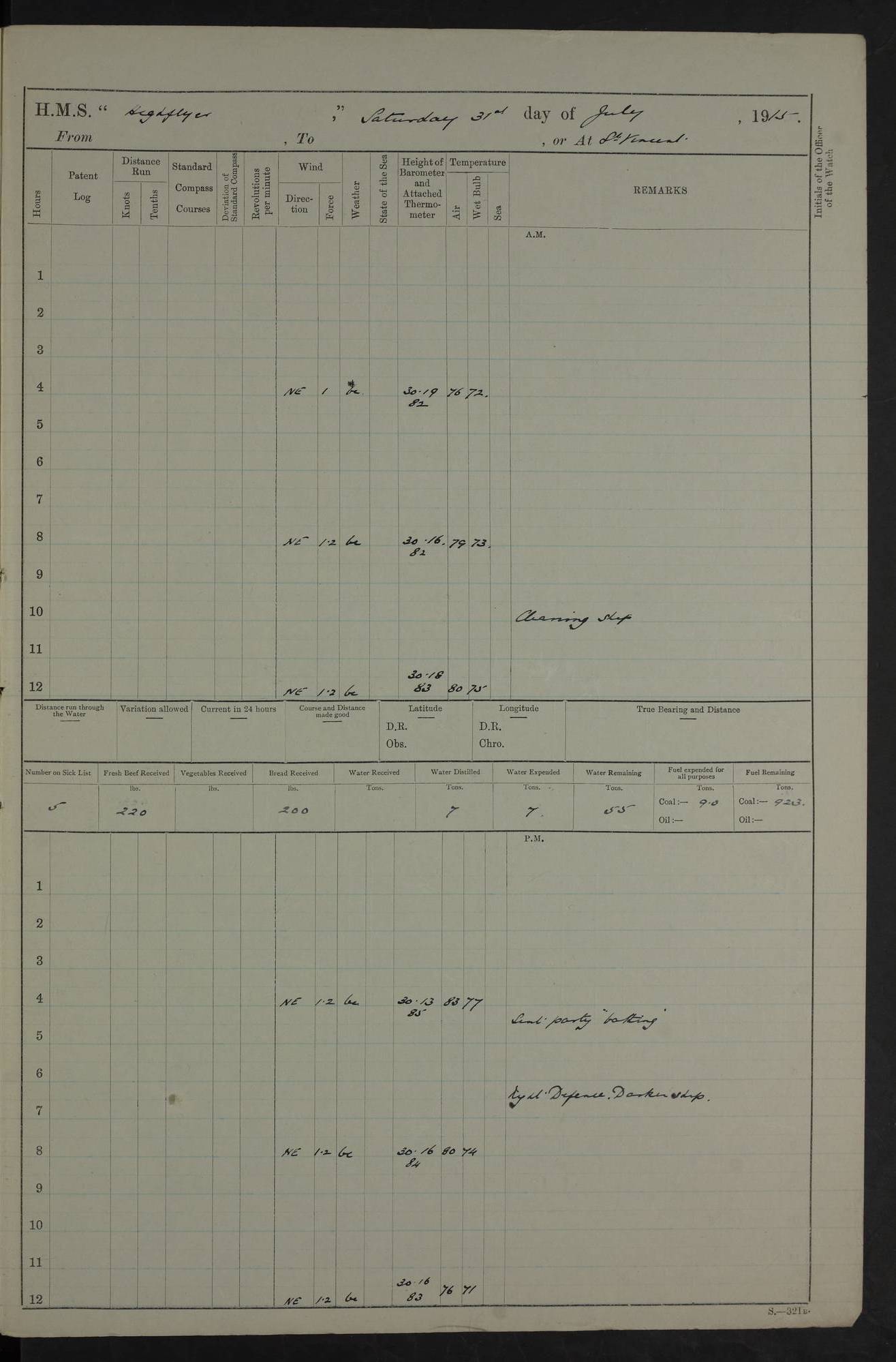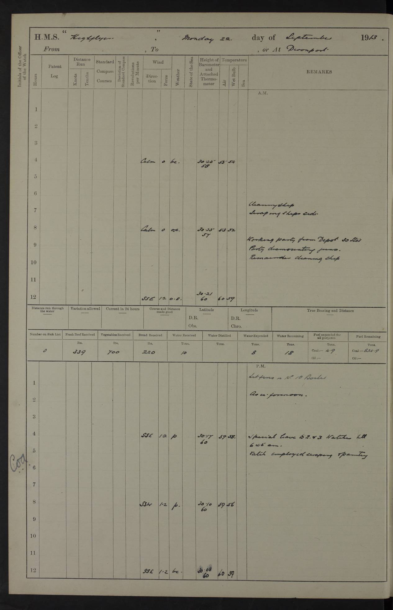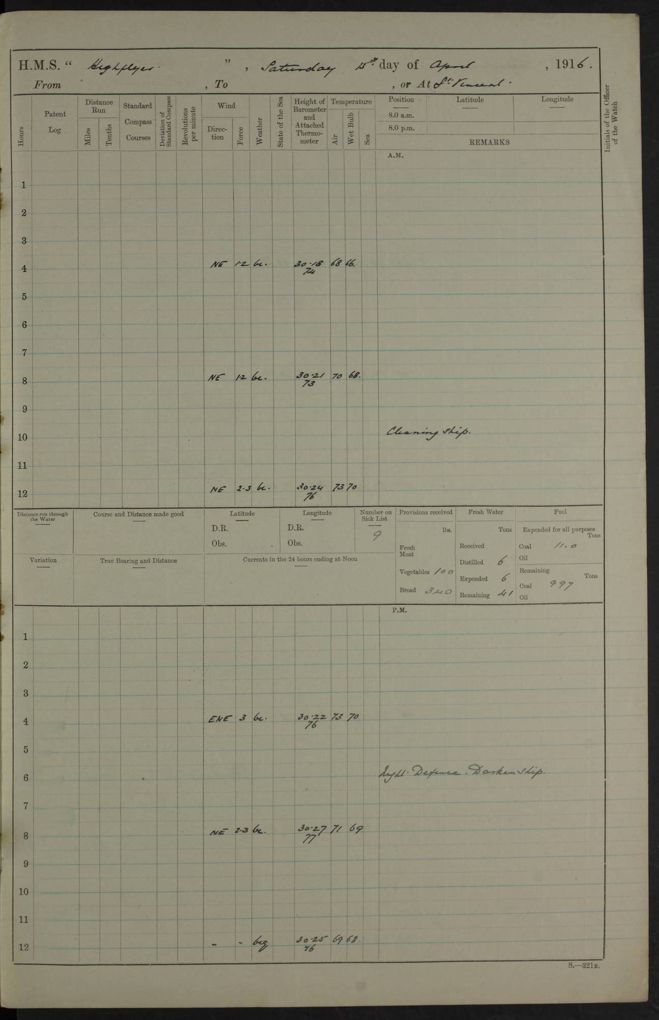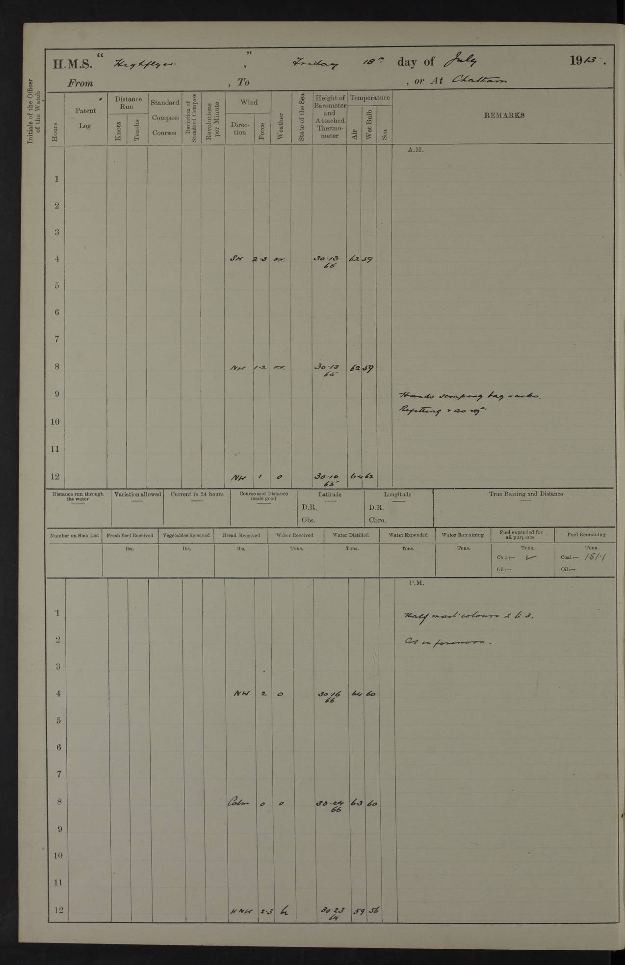 LOGS FOR JUNE 1913 4f960fe6a2fc8e2def000421: (http://s3.amazonaws.com/oldweather/ADM53-44291/ADM 53-44291-004_0.jpg) 14 June 1913 Chatham Lat 51.3855, Long 0.5174 Recommissioned ship. Ship’s company living on board ABOUKIR. 4 watch keepers, 1 PO and 3 AB on board. 4f960fe7a2fc8e2def000422: (http://s3.amazonaws.com/oldweather/ADM53-44291/ADM 53-44291-004_1.jpg) 15 June 1913 Chatham Lat 51.3855, Long 0.5174 [Weather records only.] 4f960fe7a2fc8e2def000423: (http://s3.amazonaws.com/oldweather/ADM53-44291/ADM 53-44291-005_0.jpg) 16 June 1913 Chatham, Lat 51.3855, Long 0.5174 Cleaning the ship. 4f960fe7a2fc8e2def000424: (http://s3.amazonaws.com/oldweather/ADM53-44291/ADM 53-44291-005_1.jpg) 17 June 1913 Chatham Lat 51.40, Long 0.50 2.00pm: Mr. Wright, carpenter, joined ship. 4f960fe8a2fc8e2def000425: (http://s3.amazonaws.com/oldweather/ADM53-44291/ADM 53-44291-006_0.jpg) 18 June 1913 Chatham Lat 51.3855, Long 0.5174 8.30am: BRILLIANT came alongside. 4f960fe8a2fc8e2def000426: (http://s3.amazonaws.com/oldweather/ADM53-44291/ADM 53-44291-006_1.jpg) 19 June 1913 Chatham Lat 51.4, Long 0.5 Hands employed stowing shell rooms and sail rooms. 4f960fe8a2fc8e2def000427: (http://s3.amazonaws.com/oldweather/ADM53-44291/ADM 53-44291-007_0.jpg) 20 June 1913 Chatham Lat 51.3855, Long 0.5174 FORTE secured alongside. 4f960fe9a2fc8e2def000428: (http://s3.amazonaws.com/oldweather/ADM53-44291/ADM 53-44291-007_1.jpg) 21 June 1913 Chatham Lat 51.3855, Long 0.5174 Cleaning ship. 4f960fe9a2fc8e2def000429: (http://s3.amazonaws.com/oldweather/ADM53-44291/ADM 53-44291-008_0.jpg) 22 June 1913 Chatham Lat 51.3855, Long 0.5174 [Weather records only.] 4f960fe9a2fc8e2def00042a: (http://s3.amazonaws.com/oldweather/ADM53-44291/ADM 53-44291-008_1.jpg) 23 June 1913 Chatham Lat 51.3855, Long 0.5174 Dressed ship masthead flags. 4f960feaa2fc8e2def00042b: (http://s3.amazonaws.com/oldweather/ADM53-44291/ADM 53-44291-009_0.jpg) 24 June 1913 Chatham Lat 51.3855, Long 0.5174 Marines at drill. 4f960feaa2fc8e2def00042c: (http://s3.amazonaws.com/oldweather/ADM53-44291/ADM 53-44291-009_1.jpg) 25 June 1913 Chatham Lat 51.3855, Long 0.5174 9.30am: Navy League party visited ship, 250. 4f960feaa2fc8e2def00042d: (http://s3.amazonaws.com/oldweather/ADM53-44291/ADM 53-44291-010_0.jpg) 26 June 1913 Chatham Lat 51.3855, Long 0.5174 Hands cleaning out provision rooms. 4f960feba2fc8e2def00042e: (http://s3.amazonaws.com/oldweather/ADM53-44291/ADM 53-44291-010_1.jpg) 27 June 1913 Chatham Lat 51.3855, Long 0.5174 Half masted colours. 4f960feba2fc8e2def00042f: (http://s3.amazonaws.com/oldweather/ADM53-44291/ADM 53-44291-011_0.jpg) 28 June 1913 Chatham Lat 51.3855, Long 0.5174 Cleaning ship. 4f960feba2fc8e2def000430: (http://s3.amazonaws.com/oldweather/ADM53-44291/ADM 53-44291-011_1.jpg) 29 June 1913 Chatham Lat 51.3855, Long 0.5174 [Weather records only.] 4f960feca2fc8e2def000431: (http://s3.amazonaws.com/oldweather/ADM53-44291/ADM 53-44291-012_0.jpg) 30 June 1913 Chatham Lat 51.3855, Long 0.5174 9.30am: One rating joined from Portsmouth. LOGS FOR JULY 1913 4f960feca2fc8e2def000432: (http://s3.amazonaws.com/oldweather/ADM53-44291/ADM 53-44291-012_1.jpg) 1 July 1913 Chatham Lat 51.3855, Long 0.5174 9.00am: Captain Butler joined ship. 2.30pm: 1 LS joined ship 4f960feca2fc8e2def000433: (http://s3.amazonaws.com/oldweather/ADM53-44291/ADM 53-44291-013_0.jpg) 2 July 1913 Chatham Lat 51.3855, Long 0.5174 Painting out store rooms. 4f960feda2fc8e2def000434: (http://s3.amazonaws.com/oldweather/ADM53-44291/ADM 53-44291-013_1.jpg) 3 July 1913 Chatham Lat 51.3855, Long 0.5174 Painting and scraping. 4f960feda2fc8e2def000435: (http://s3.amazonaws.com/oldweather/ADM53-44291/ADM 53-44291-014_0.jpg) 4 July 1913 Chatham Lat 51.3855, Long 0.5174 Painting and scraping. 4f960feda2fc8e2def000436: (http://s3.amazonaws.com/oldweather/ADM53-44291/ADM 53-44291-014_1.jpg) 5 July 1913 Chatham Lat 51.3855, Long 0.5174 Cleaning up. 4f960feea2fc8e2def000437: (http://s3.amazonaws.com/oldweather/ADM53-44291/ADM 53-44291-015_0.jpg) 6 July 1913 Chatham Lat 51.3855, Long 0.5174 [Weather records only.] 4f960feea2fc8e2def000438: (http://s3.amazonaws.com/oldweather/ADM53-44291/ADM 53-44291-015_1.jpg) 7 July 1913 Chatham Lat 51.3855, Long 0.5174 Painting. 4f960feea2fc8e2def000439: (http://s3.amazonaws.com/oldweather/ADM53-44291/ADM 53-44291-016_0.jpg) 8 July 1913 Chatham Lat 51.3855, Long 0.5174 Hands provisioning ship. 4f960fefa2fc8e2def00043a: (http://s3.amazonaws.com/oldweather/ADM53-44291/ADM 53-44291-016_1.jpg) 9 July 1913 Chatham Lat 51.3855, Long 0.5174 Provisioning ship. 4f960fefa2fc8e2def00043b: (http://s3.amazonaws.com/oldweather/ADM53-44291/ADM 53-44291-017_0.jpg) 10 July 1913 Chatham Lat 51.4, Long 0.5 Hands scraping, chipping & cleaning up generally. 4f960fefa2fc8e2def00043c: (http://s3.amazonaws.com/oldweather/ADM53-44291/ADM 53-44291-017_1.jpg) 11 July 1913 Chatham Lat 51.4, Long 0.5 Preparing ship for going into dock. 4f960fefa2fc8e2def00043d: (http://s3.amazonaws.com/oldweather/ADM53-44291/ADM 53-44291-018_0.jpg) 12 July 1913 Chatham Lat 51.3855, Long 0.5174 10.00am: Commenced docking. 4f960ff0a2fc8e2def00043e: (http://s3.amazonaws.com/oldweather/ADM53-44291/ADM 53-44291-018_1.jpg) 13 July 1913 Chatham Lat 51.3855, Long 0.5174 [Weather records only.] 4f960ff0a2fc8e2def00043f: (http://s3.amazonaws.com/oldweather/ADM53-44291/ADM 53-44291-019_0.jpg) 14 July 1913 Chatham Lat 51.3855, Long 0.5174 1.00pm: Transferred bags and hammocks from ABOUKIR to HIGHFLYER. 4f960ff0a2fc8e2def000440: (http://s3.amazonaws.com/oldweather/ADM53-44291/ADM 53-44291-019_1.jpg) 15 July 1913 Chatham Lat 51.4, Long 0.5 9.00am: Ships’ company transferring bags and hammocks to Depot. 4f960ff1a2fc8e2def000441: (http://s3.amazonaws.com/oldweather/ADM53-44291/ADM 53-44291-020_0.jpg) 16 July 1913 Chatham Lat 51.3855, Long 0.5174 Hands scraping as requisite. 4f960ff1a2fc8e2def000442: (http://s3.amazonaws.com/oldweather/ADM53-44291/ADM 53-44291-020_1.jpg) 17 July 1913 Chatham Lat 51.3855, Long 0.5174 Refitting