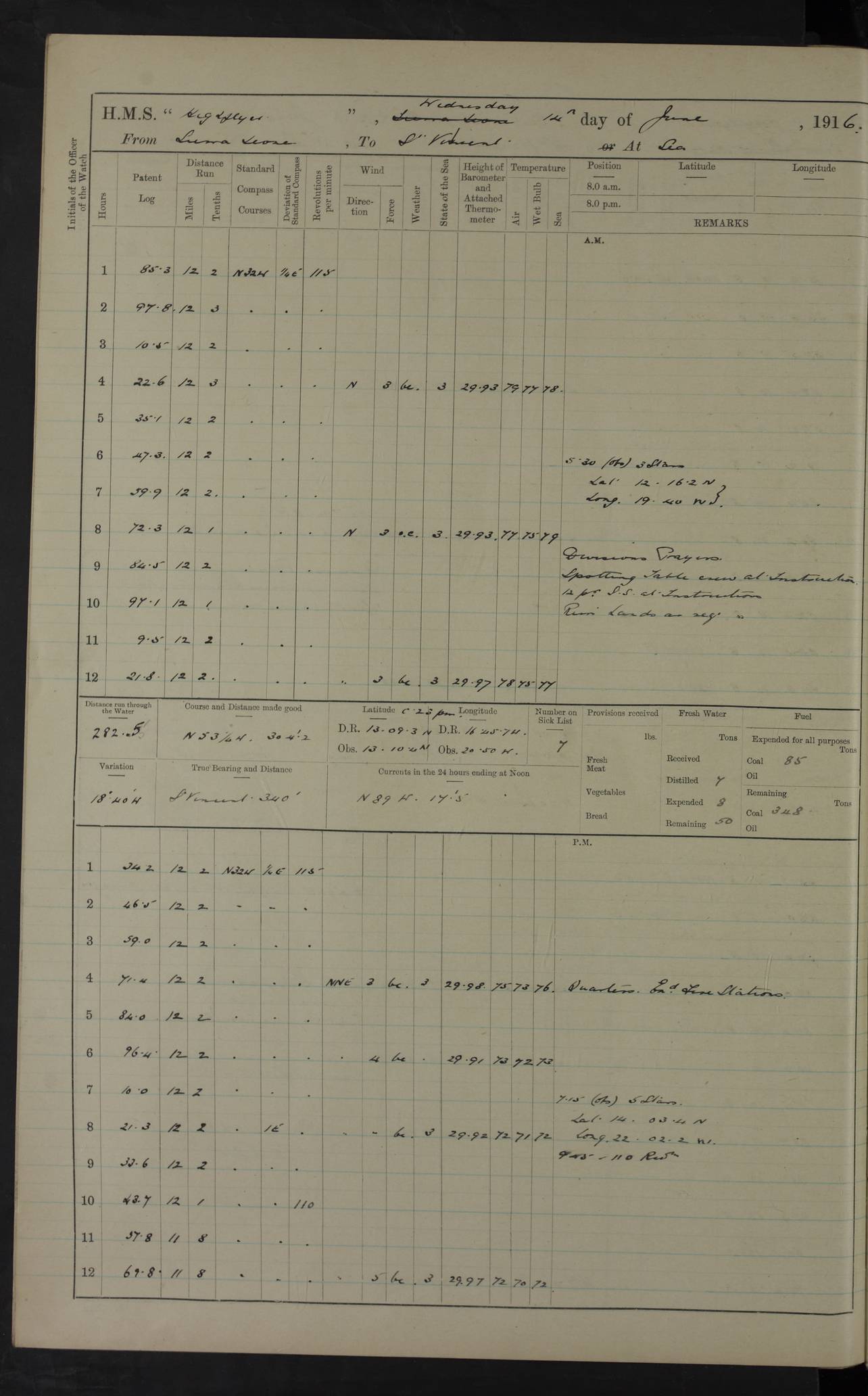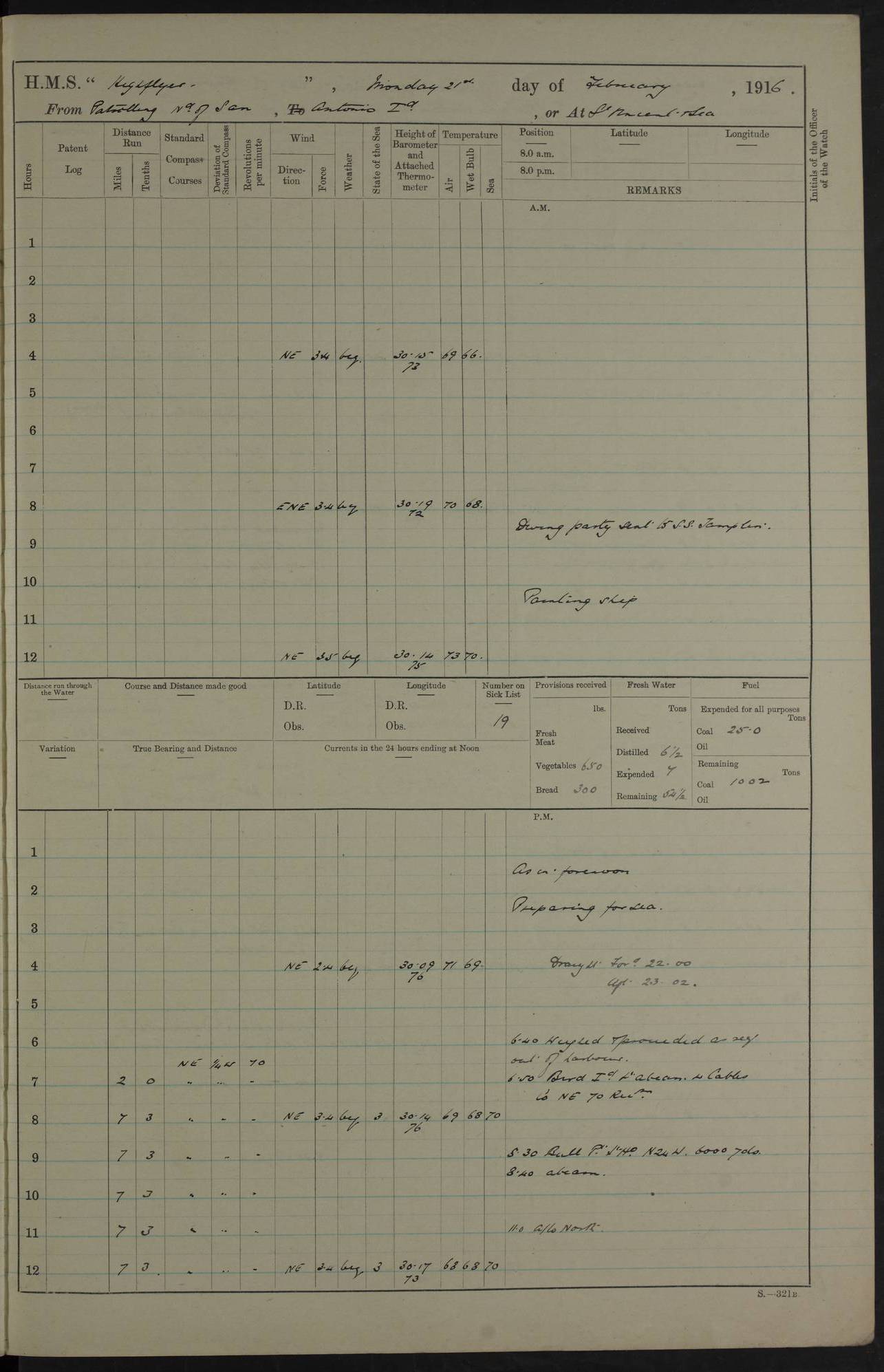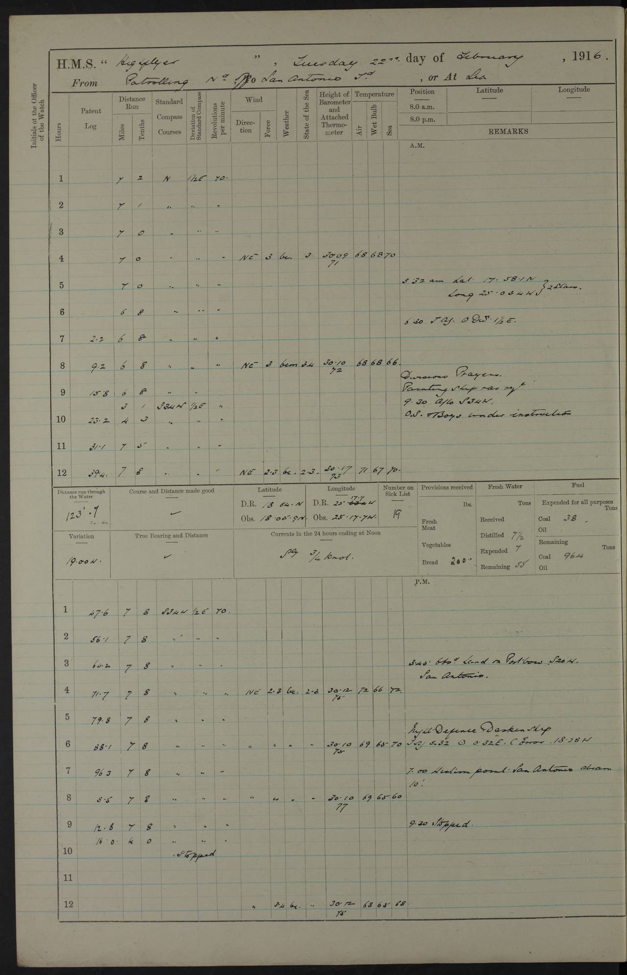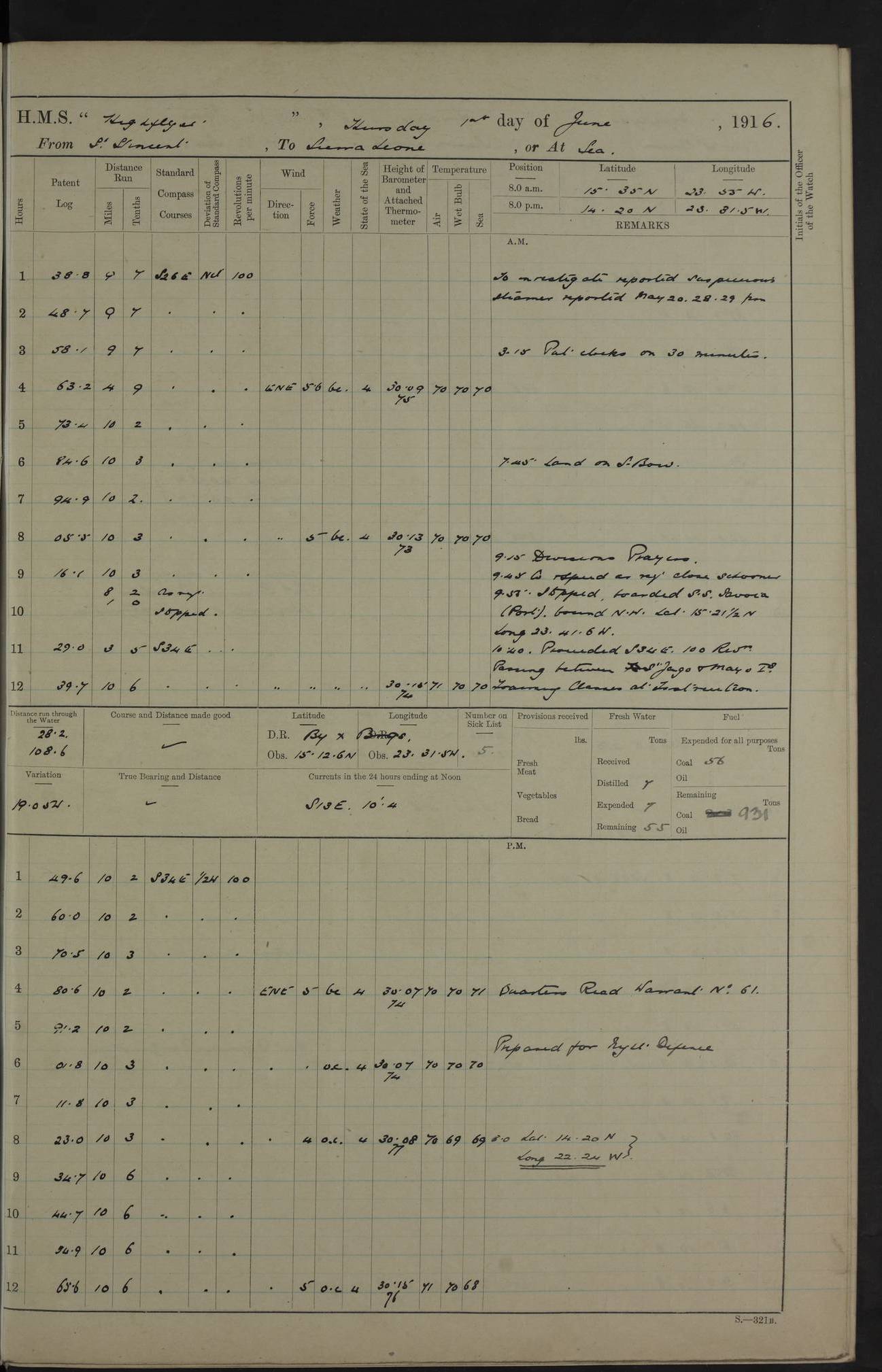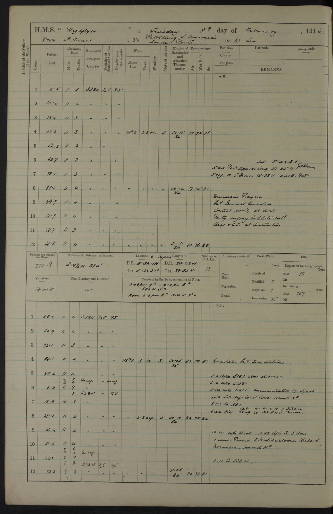 4f961154a2fc8e2def000869: (http://s3.amazonaws.com/oldweather/ADM53-44303/ADM 53-44303-011_0.jpg) 12 February 1916 Patrolling S American trade route to northward Lat 3.9, Long -29.9 7.38am: Stopped, boarded SS REINLAND (Dutch) bound southward Lat 3.13.4N, 30.01W. 4f961155a2fc8e2def00086a: (http://s3.amazonaws.com/oldweather/ADM53-44303/ADM 53-44303-011_1.jpg) 13 February 1916 Patrolling S American trade routes to northward Lat 7.8, Long -28.3 9.00am: Held Divine Service. 4f961155a2fc8e2def00086b: (http://s3.amazonaws.com/oldweather/ADM53-44303/ADM 53-44303-012_0.jpg) 14 February 1916 Patrolling trade routes. to northward Lat 11.4, Long -27.0 9.40am: 90 revs. Course as requisite for aiming rifle practice. 4f961155a2fc8e2def00086c: (http://s3.amazonaws.com/oldweather/ADM53-44303/ADM 53-44303-012_1.jpg) 15 February 1916 Towards Brava Id. Lat 14.2, Long -25.3 9.25am: Stopped, dropped target. Course and speed as requisite to carry out heavy gun practice. 4.00pm: Sighted Brava Id. vis. 1½ miles. Passed W side. 4f961156a2fc8e2def00086d: (http://s3.amazonaws.com/oldweather/ADM53-44303/ADM 53-44303-013_0.jpg) 16 February 1916 St. Vincent Lat 16.8828, Long -25.0106 7.35am: Land ahead visibility 1½’ San Antonio. 8.30am: Course as requisite for entering harbour. 11.00am: Preparing for coaling. 4f961156a2fc8e2def00086e: (http://s3.amazonaws.com/oldweather/ADM53-44303/ADM 53-44303-013_1.jpg) 17 February 1916 St. Vincent Lat 16.8828, Long -25.0106 6.00am: Collier SS PENHALE came alongside. 6.45am: Commenced coaling. 4f961156a2fc8e2def00086f: (http://s3.amazonaws.com/oldweather/ADM53-44303/ADM 53-44303-014_0.jpg) 18 February 1916 St. Vincent Lat 16.8828, Long -25.0106 Cleaning ship. 2.30pm: Drawing new fenders from SS TAMPLIN. 4f961157a2fc8e2def000870: (http://s3.amazonaws.com/oldweather/ADM53-44303/ADM 53-44303-014_1.jpg) 19 February 1916 St. Vincent Lat 16.8828, Long -25.0106 10.30am: Diving party sent to SS TAMPLIN. 4f961157a2fc8e2def000871: (http://s3.amazonaws.com/oldweather/ADM53-44303/ADM 53-44303-015_0.jpg) 20 February 1916 St. Vincent Lat 16.8828, Long -25.0106 7.00am: Sent diving party to TAMPLIN. 4f961157a2fc8e2def000872: (http://s3.amazonaws.com/oldweather/ADM53-44303/ADM 53-44303-015_1.jpg) 21 February 1916 St. Vincent to patrol Lat 16.8828, Long -25.0106 8.30am: Diving party sent to SS TAMPLIN. 6.40pm: Weighed and proceeded as requisite out of harbour. 8.30pm: Bull Point Lt. Ho. N24W, 6000 yds. 4f961158a2fc8e2def000873: (http://s3.amazonaws.com/oldweather/ADM53-44303/ADM 53-44303-016_0.jpg) 22 February 1916 Patrolling northward off San Antonio Id. Lat 18.1, Long -25.3 Painting ship and as requisite. 7.00pm: Western point San Antonio abeam 10’. 4f961158a2fc8e2def000874: (http://s3.amazonaws.com/oldweather/ADM53-44303/ADM 53-44303-016_1.jpg) 23 February 1916 Off San Antonio and St. Vincent to Tarrafal Bay Lat 16.8, Long -25.2 12.00pm: Spoke SS JASON, Brit., bound St. Vincent. 1.12pm: Boarded SS WILLEM VAN DREIL (Dutch) bound St. Vincent. 3.35pm: Stopped, came to with SB, in 33 fathoms. 4f961158a2fc8e2def000875: (http://s3.amazonaws.com/oldweather/ADM53-44303/ADM 53-44303-017_0.jpg) 24 February 1916 Tarrafal Bay, San Antonio Id. to St. Vincent Lat 16.8828, Long -25.0106 9.43 am; Proceeded. Course as requisite to St. Vincent round S end San Antonio 120 revs. 11.17am: Came to with SB in 11 fathoms. 4f961159a2fc8e2def000876: (http://s3.amazonaws.com/oldweather/ADM53-44303/ADM 53-44303-017_1.jpg) 25 February 1916 St. Vincent Lat 16.8828, Long -25.0106 Painting ship. Boys and OS at instruction. Control party at drill. 4f961159a2fc8e2def000877: (http://s3.amazonaws.com/oldweather/ADM53-44303/ADM 53-44303-018_0.jpg) 26 February 1916 St. Vincent Lat 16.8828, Long -25.0106 Cleaning ship. 4f961159a2fc8e2def000878: (http://s3.amazonaws.com/oldweather/ADM53-44303/ADM 53-44303-018_1.jpg) 27 February 1916 St. Vincent Lat 16.8828, Long -25.0106 9.30am: Held Divine Service. 4f96115aa2fc8e2def000879: (http://s3.amazonaws.com/oldweather/ADM53-44303/ADM 53-44303-019_0.jpg) 28 February 1916 St. Vincent Lat 16.8828, Long -25.0106 Boys and OS at instruction. Control party at drill. Remainder preparing for coaling. 2.00pm: Diving party at SS TAMPLIN. 4f96115aa2fc8e2def00087a: (http://s3.amazonaws.com/oldweather/ADM53-44303/ADM 53-44303-019_1.jpg) 29 February 1916 St. Vincent Lat 16.8828, Long -25.0106 7.15am: Commenced coaling from lighter. 8.00am: HMS SWIFTSURE arrived. USS CHESTER arrived. 4f96115aa2fc8e2def00087b: (http://s3.amazonaws.com/oldweather/ADM53-44303/ADM 53-44303-020_0.jpg) 4f96115ba2fc8e2def00087c: (http://s3.amazonaws.com/oldweather/ADM53-44303/ADM 53-44303-020_1.jpg) 4f96115ba2fc8e2def00087d: (http://s3.amazonaws.com/oldweather/ADM53-44303/ADM 53-44303-021_0.jpg) 4f96115ba2fc8e2def00087e: (http://s3.amazonaws.com/oldweather/ADM53-44303/ADM 53-44303-021_1.jpg) LOGS FOR MARCH 1916 4f96115ca2fc8e2def00087f: (http://s3.amazonaws.com/oldweather/ADM53-44304/ADM 53-44304-001_0.jpg) 4f96115ca2fc8e2def000880: (http://s3.amazonaws.com/oldweather/ADM53-44304/ADM 53-44304-001_1.jpg) 4f96115ca2fc8e2def000881: (http://s3.amazonaws.com/oldweather/ADM53-44304/ADM 53-44304-002_0.jpg) 4f96115da2fc8e2def000882: (http://s3.amazonaws.com/oldweather/ADM53-44304/ADM 53-44304-002_1.jpg) 4f96115da2fc8e2def000883: (http://s3.amazonaws.com/oldweather/ADM53-44304/ADM 53-44304-003_0.jpg) 4f96115da2fc8e2def000884: (http://s3.amazonaws.com/oldweather/ADM53-44304/ADM 53-44304-003_1.jpg) 4f96115da2fc8e2def000885: (http://s3.amazonaws.com/oldweather/ADM53-44304/ADM 53-44304-004_0.jpg) 4f96115ea2fc8e2def000886: (http://s3.amazonaws.com/oldweather/ADM53-44304/ADM 53-44304-004_1.jpg) 4f96115ea2fc8e2def000887: (http://s3.amazonaws.com/oldweather/ADM53-44304/ADM 53-44304-005_0.jpg) 4f96115ea2fc8e2def000888: (http://s3.amazonaws.com/oldweather/ADM53-44304/ADM 53-44304-005_1.jpg) 1 March 1916 St. Vincent Lat 16.8828, Long -25.0106 9.30pm: Discharged 1 Officer and 1 Tel. Rating to SS NORTHWAITE. 10.00pm: Surgeon Hobbs joined ship fro