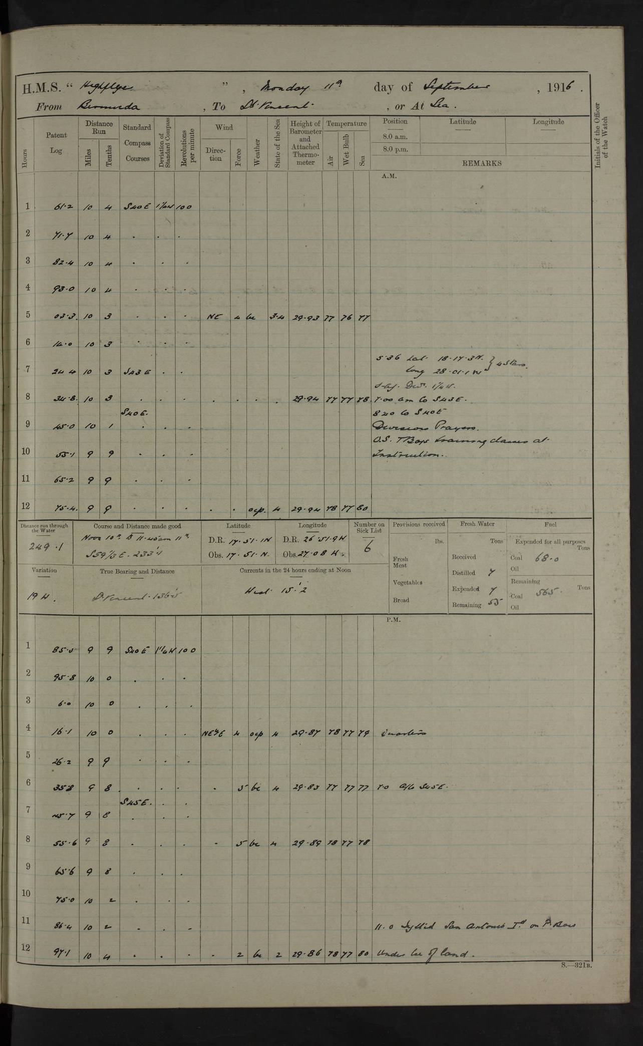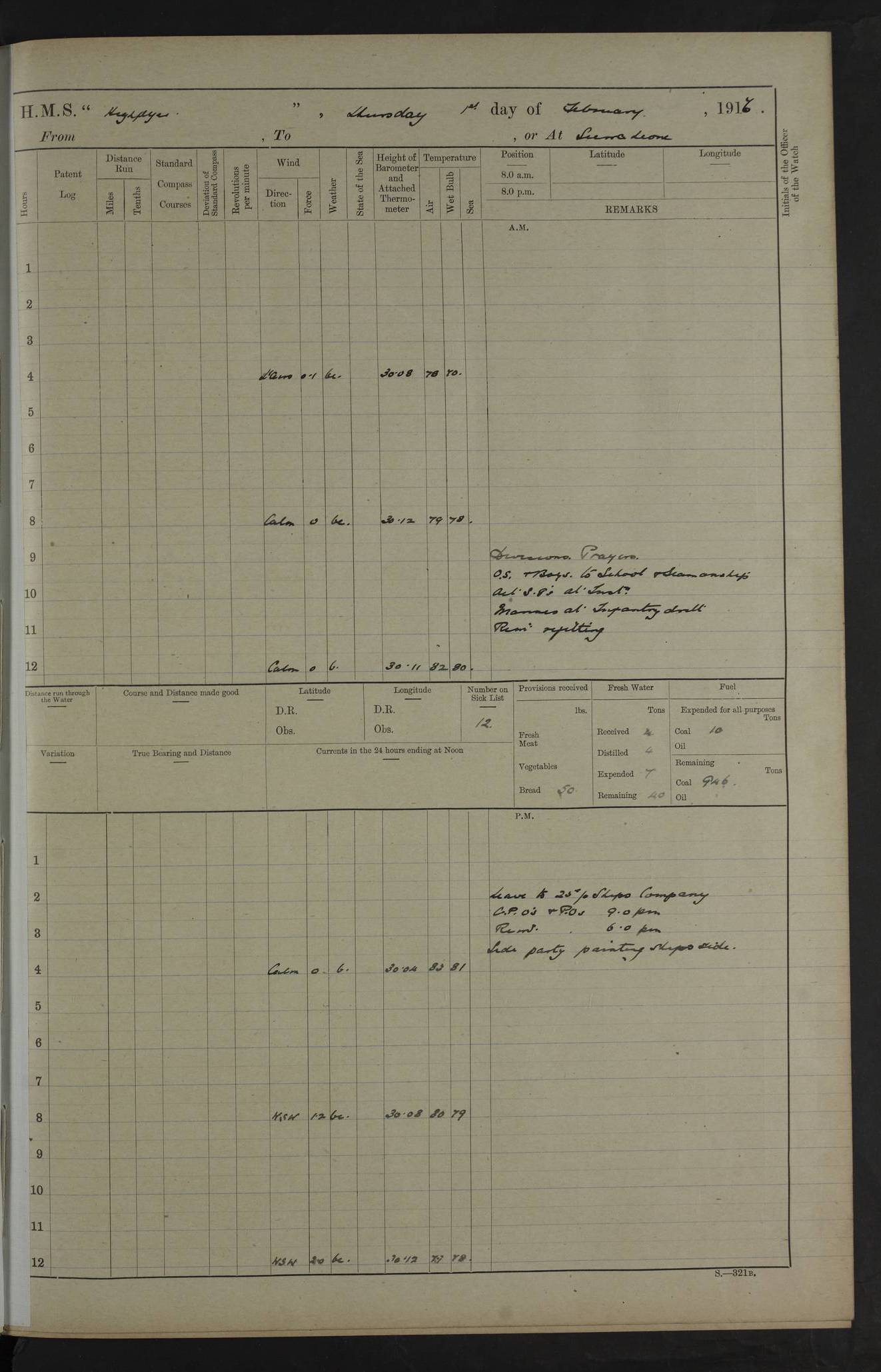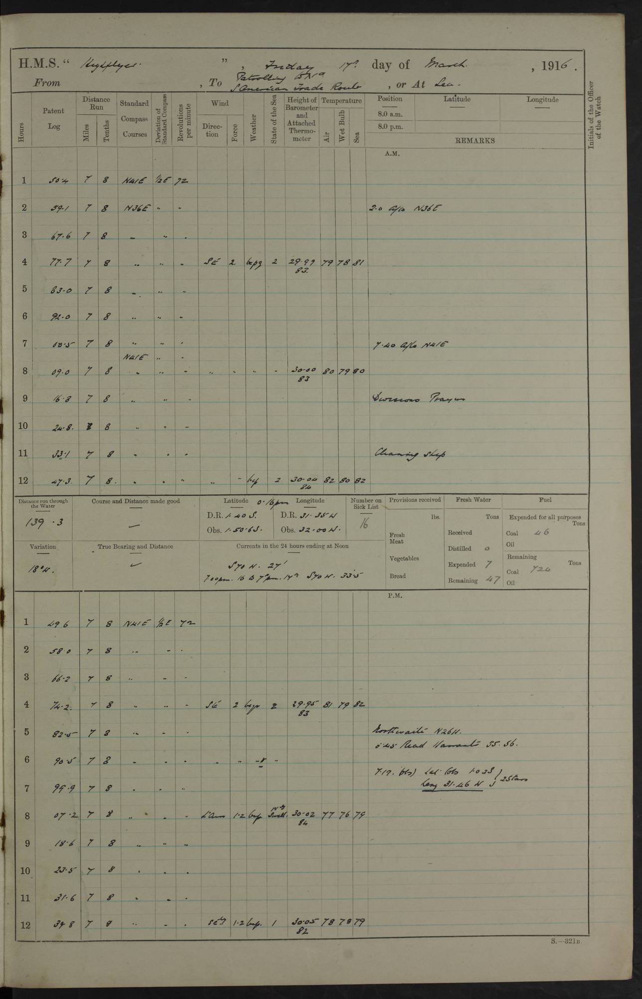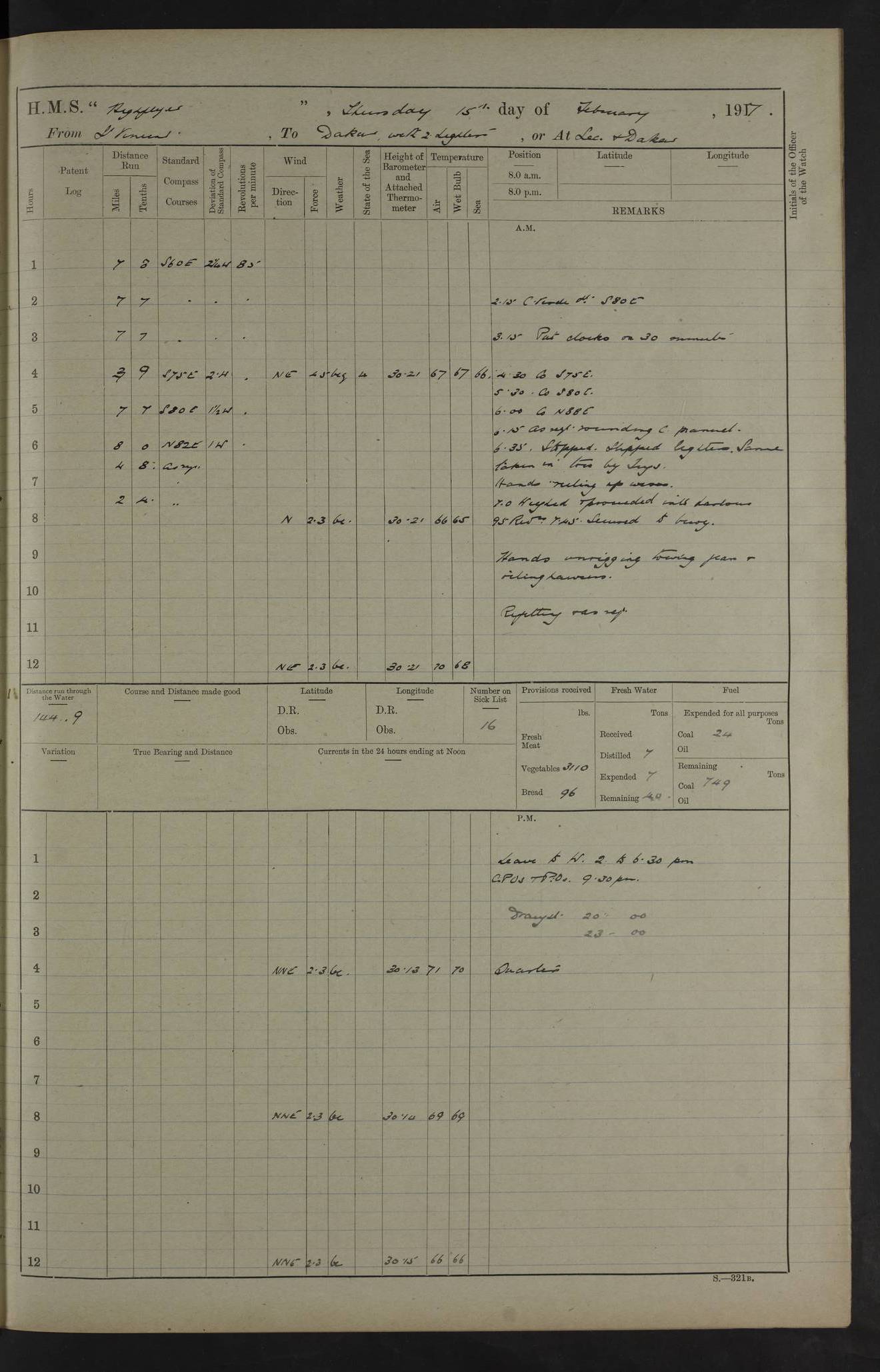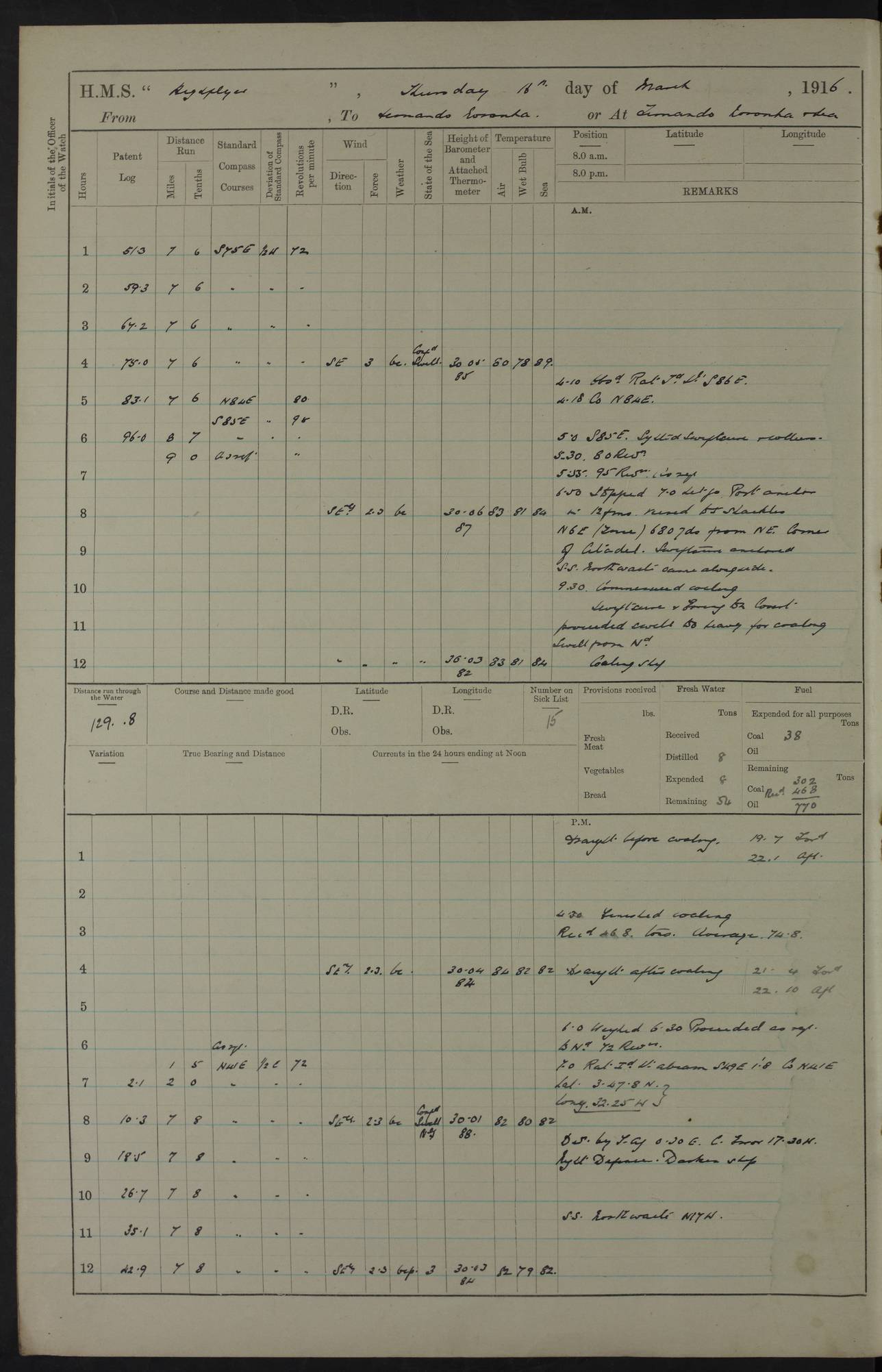 4f961154a2fc8e2def000869: (http://s3.amazonaws.com/oldweather/ADM53-44303/ADM 53-44303-011_0.jpg) 12 February 1916 Patrolling S American trade route to northward Lat 3.9, Long -29.9 7.38am: Stopped, boarded SS REINLAND (Dutch) bound southward Lat 3.13.4N, 30.01W. 4f961155a2fc8e2def00086a: (http://s3.amazonaws.com/oldweather/ADM53-44303/ADM 53-44303-011_1.jpg) 13 February 1916 Patrolling S American trade routes to northward Lat 7.8, Long -28.3 9.00am: Held Divine Service. 4f961155a2fc8e2def00086b: (http://s3.amazonaws.com/oldweather/ADM53-44303/ADM 53-44303-012_0.jpg) 14 February 1916 Patrolling trade routes. to northward Lat 11.4, Long -27.0 9.40am: 90 revs. Course as requisite for aiming rifle practice. 4f961155a2fc8e2def00086c: (http://s3.amazonaws.com/oldweather/ADM53-44303/ADM 53-44303-012_1.jpg) 15 February 1916 Towards Brava Id. Lat 14.2, Long -25.3 9.25am: Stopped, dropped target. Course and speed as requisite to carry out heavy gun practice. 4.00pm: Sighted Brava Id. vis. 1½ miles. Passed W side. 4f961156a2fc8e2def00086d: (http://s3.amazonaws.com/oldweather/ADM53-44303/ADM 53-44303-013_0.jpg) 16 February 1916 St. Vincent Lat 16.8828, Long -25.0106 7.35am: Land ahead visibility 1½’ San Antonio. 8.30am: Course as requisite for entering harbour. 11.00am: Preparing for coaling. 4f961156a2fc8e2def00086e: (http://s3.amazonaws.com/oldweather/ADM53-44303/ADM 53-44303-013_1.jpg) 17 February 1916 St. Vincent Lat 16.8828, Long -25.0106 6.00am: Collier SS PENHALE came alongside. 6.45am: Commenced coaling. 4f961156a2fc8e2def00086f: (http://s3.amazonaws.com/oldweather/ADM53-44303/ADM 53-44303-014_0.jpg) 18 February 1916 St. Vincent Lat 16.8828, Long -25.0106 Cleaning ship. 2.30pm: Drawing new fenders from SS TAMPLIN. 4f961157a2fc8e2def000870: (http://s3.amazonaws.com/oldweather/ADM53-44303/ADM 53-44303-014_1.jpg) 19 February 1916 St. Vincent Lat 16.8828, Long -25.0106 10.30am: Diving party sent to SS TAMPLIN. 4f961157a2fc8e2def000871: (http://s3.amazonaws.com/oldweather/ADM53-44303/ADM 53-44303-015_0.jpg) 20 February 1916 St. Vincent Lat 16.8828, Long -25.0106 7.00am: Sent diving party to TAMPLIN. 4f961157a2fc8e2def000872: (http://s3.amazonaws.com/oldweather/ADM53-44303/ADM 53-44303-015_1.jpg) 21 February 1916 St. Vincent to patrol Lat 16.8828, Long -25.0106 8.30am: Diving party sent to SS TAMPLIN. 6.40pm: Weighed and proceeded as requisite out of harbour. 8.30pm: Bull Point Lt. Ho. N24W, 6000 yds. 4f961158a2fc8e2def000873: (http://s3.amazonaws.com/oldweather/ADM53-44303/ADM 53-44303-016_0.jpg) 22 February 1916 Patrolling northward off San Antonio Id. Lat 18.1, Long -25.3 Painting ship and as requisite. 7.00pm: Western point San Antonio abeam 10’. 4f961158a2fc8e2def000874: (http://s3.amazonaws.com/oldweather/ADM53-44303/ADM 53-44303-016_1.jpg) 23 February 1916 Off San Antonio and St. Vincent to Tarrafal Bay Lat 16.8, Long -25.2 12.00pm: Spoke SS JASON, Brit., bound St. Vincent. 1.12pm: Boarded SS WILLEM VAN DREIL (Dutch) bound St. Vincent. 3.35pm: Stopped, came to with SB, in 33 fathoms. 4f961158a2fc8e2def000875: (http://s3.amazonaws.com/oldweather/ADM53-44303/ADM 53-44303-017_0.jpg) 24 February 1916 Tarrafal Bay, San Antonio Id. to St. Vincent Lat 16.8828, Long -25.0106 9.43 am; Proceeded. Course as requisite to St. Vincent round S end San Antonio 120 revs. 11.17am: Came to with SB in 11 fathoms. 4f961159a2fc8e2def000876: (http://s3.amazonaws.com/oldweather/ADM53-44303/ADM 53-44303-017_1.jpg) 25 February 1916 St. Vincent Lat 16.8828, Long -25.0106 Painting ship. Boys and OS at instruction. Control party at drill. 4f961159a2fc8e2def000877: (http://s3.amazonaws.com/oldweather/ADM53-44303/ADM 53-44303-018_0.jpg) 26 February 1916 St. Vincent Lat 16.8828, Long -25.0106 Cleaning ship. 4f961159a2fc8e2def000878: (http://s3.amazonaws.com/oldweather/ADM53-44303/ADM 53-44303-018_1.jpg) 27 February 1916 St. Vincent Lat 16.8828, Long -25.0106 9.30am: Held Divine Service. 4f96115aa2fc8e2def000879: (http://s3.amazonaws.com/oldweather/ADM53-44303/ADM 53-44303-019_0.jpg) 28 February 1916 St. Vincent Lat 16.8828, Long -25.0106 Boys and OS at instruction. Control party at drill. Remainder preparing for coaling. 2.00pm: Diving party at SS TAMPLIN. 4f96115aa2fc8e2def00087a: (http://s3.amazonaws.com/oldweather/ADM53-44303/ADM 53-44303-019_1.jpg) 29 February 1916 St. Vincent Lat 16.8828, Long -25.0106 7.15am: Commenced coaling from lighter. 8.00am: HMS SWIFTSURE arrived. USS CHESTER arrived. 4f96115aa2fc8e2def00087b: (http://s3.amazonaws.com/oldweather/ADM53-44303/ADM 53-44303-020_0.jpg) 4f96115ba2fc8e2def00087c: (http://s3.amazonaws.com/oldweather/ADM53-44303/ADM 53-44303-020_1.jpg) 4f96115ba2fc8e2def00087d: (http://s3.amazonaws.com/oldweather/ADM53-44303/ADM 53-44303-021_0.jpg) 4f96115ba2fc8e2def00087e: (http://s3.amazonaws.com/oldweather/ADM53-44303/ADM 53-44303-021_1.jpg) LOGS FOR MARCH 1916 4f96115ca2fc8e2def00087f: (http://s3.amazonaws.com/oldweather/ADM53-44304/ADM 53-44304-001_0.jpg) 4f96115ca2fc8e2def000880: (http://s3.amazonaws.com/oldweather/ADM53-44304/ADM 53-44304-001_1.jpg) 4f96115ca2fc8e2def000881: (http://s3.amazonaws.com/oldweather/ADM53-44304/ADM 53-44304-002_0.jpg) 4f96115da2fc8e2def000882: (http://s3.amazonaws.com/oldweather/ADM53-44304/ADM 53-44304-002_1.jpg) 4f96115da2fc8e2def000883: (http://s3.amazonaws.com/oldweather/ADM53-44304/ADM 53-44304-003_0.jpg) 4f96115da2fc8e2def000884: (http://s3.amazonaws.com/oldweather/ADM53-44304/ADM 53-44304-003_1.jpg) 4f96115da2fc8e2def000885: (http://s3.amazonaws.com/oldweather/ADM53-44304/ADM 53-44304-004_0.jpg) 4f96115ea2fc8e2def000886: (http://s3.amazonaws.com/oldweather/ADM53-44304/ADM 53-44304-004_1.jpg) 4f96115ea2fc8e2def000887: (http://s3.amazonaws.com/oldweather/ADM53-44304/ADM 53-44304-005_0.jpg) 4f96115ea2fc8e2def000888: (http://s3.amazonaws.com/oldweather/ADM53-44304/ADM 53-44304-005_1.jpg) 1 March 1916 St. Vincent Lat 16.8828, Long -25.0106 9.30pm: Discharged 1 Officer and 1 Tel. Rating to SS NORTHWAITE. 10.00pm: Surgeon Hobbs joined ship fro