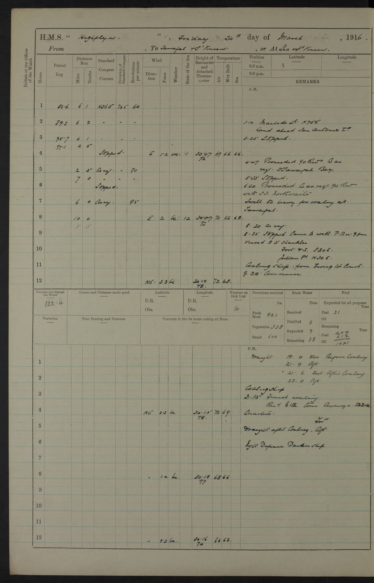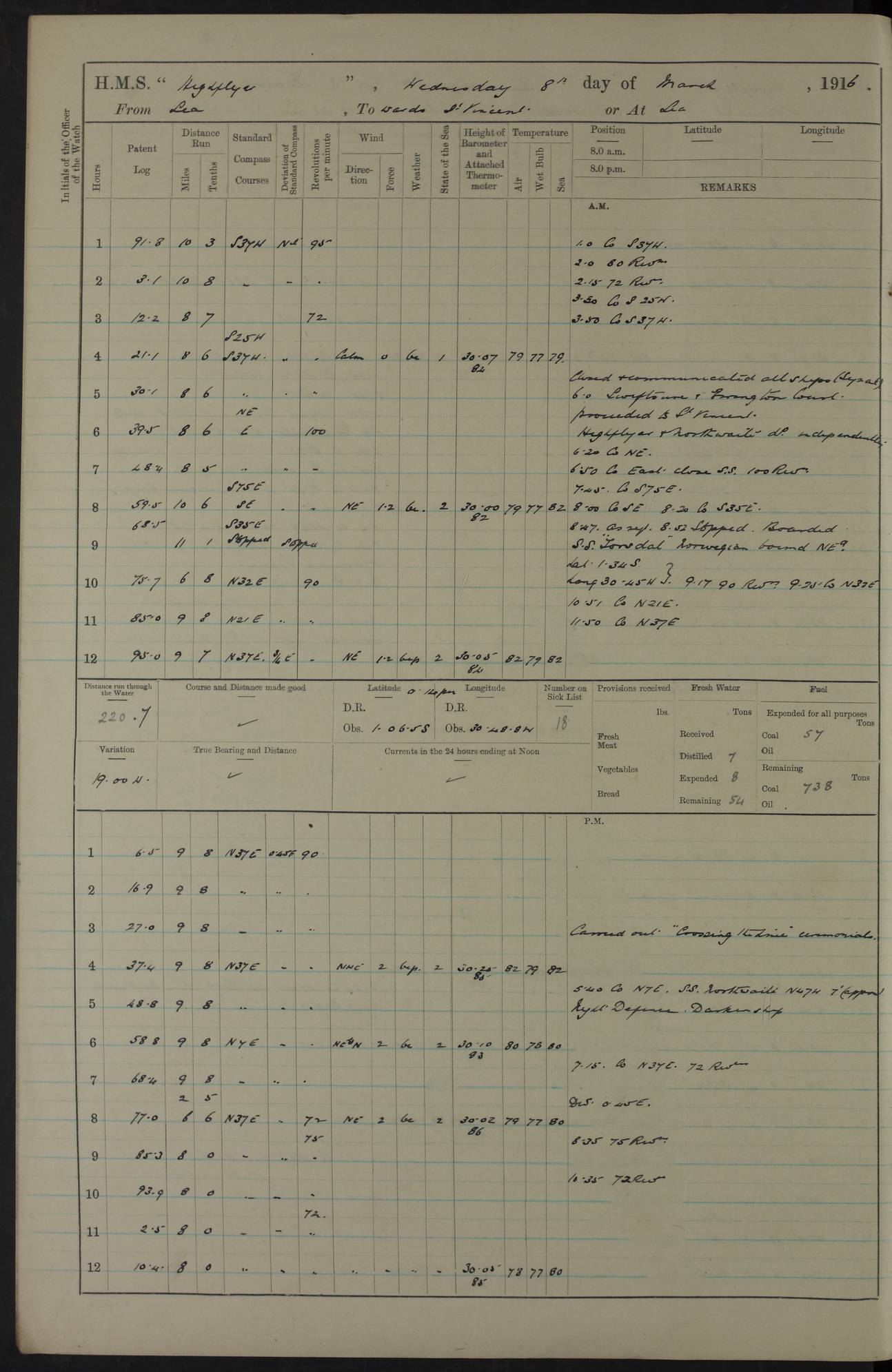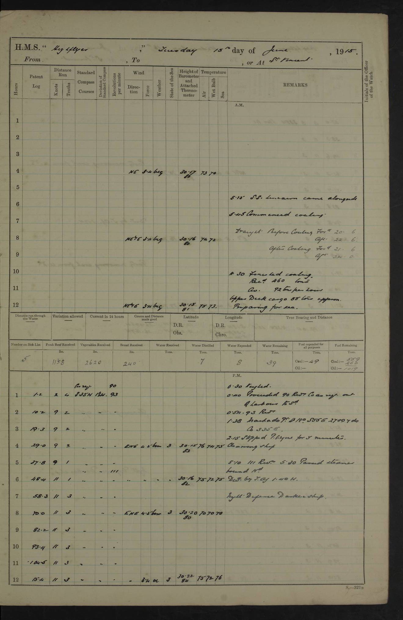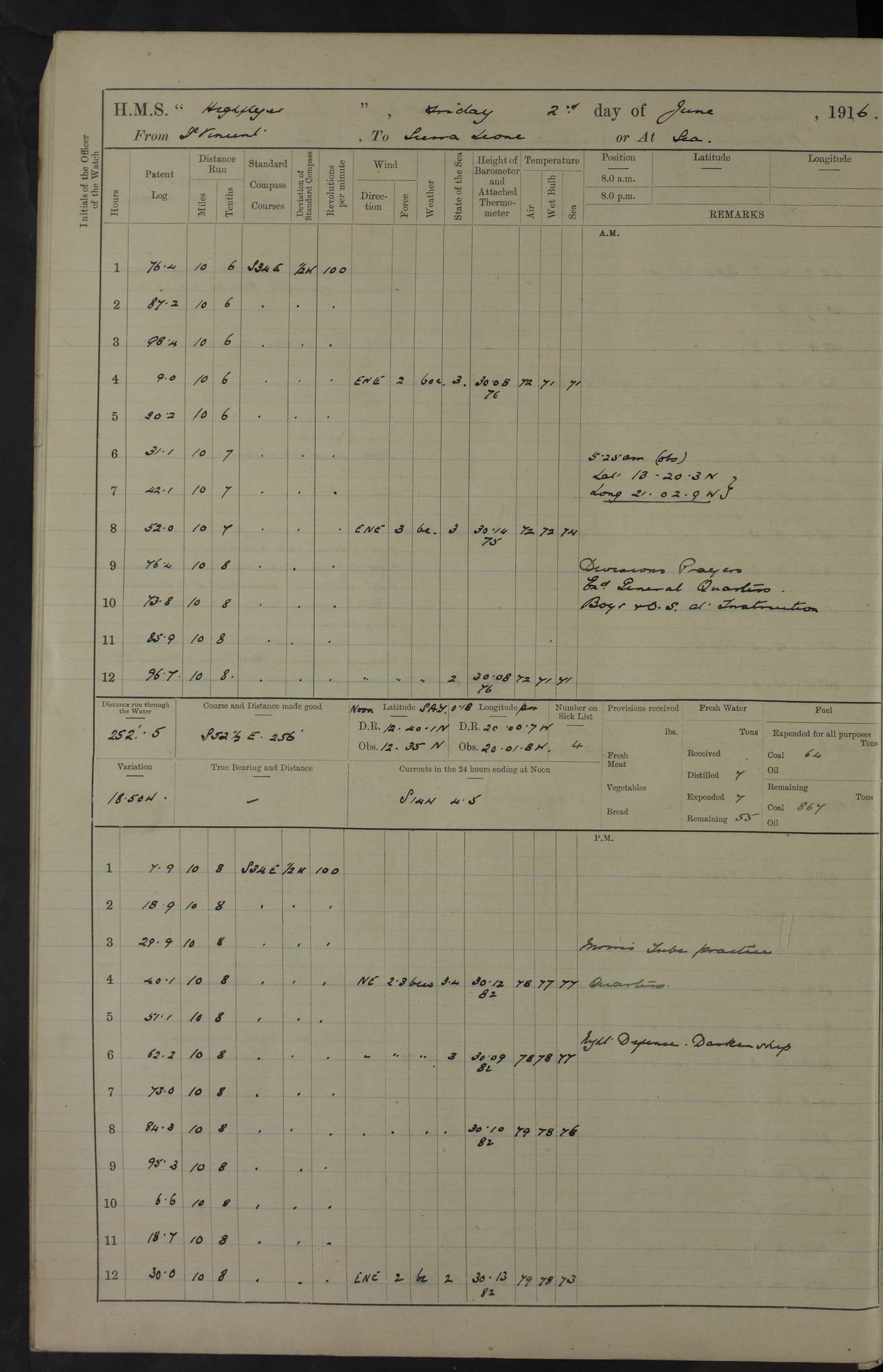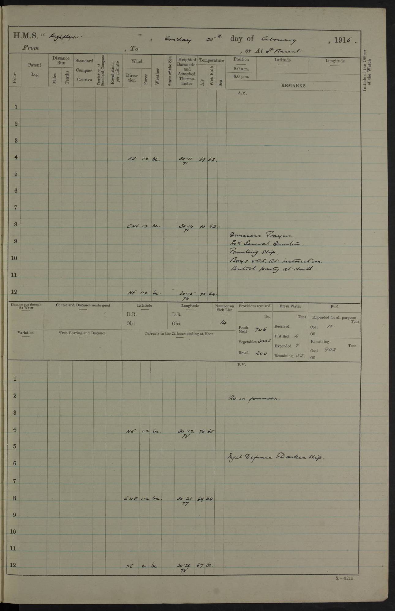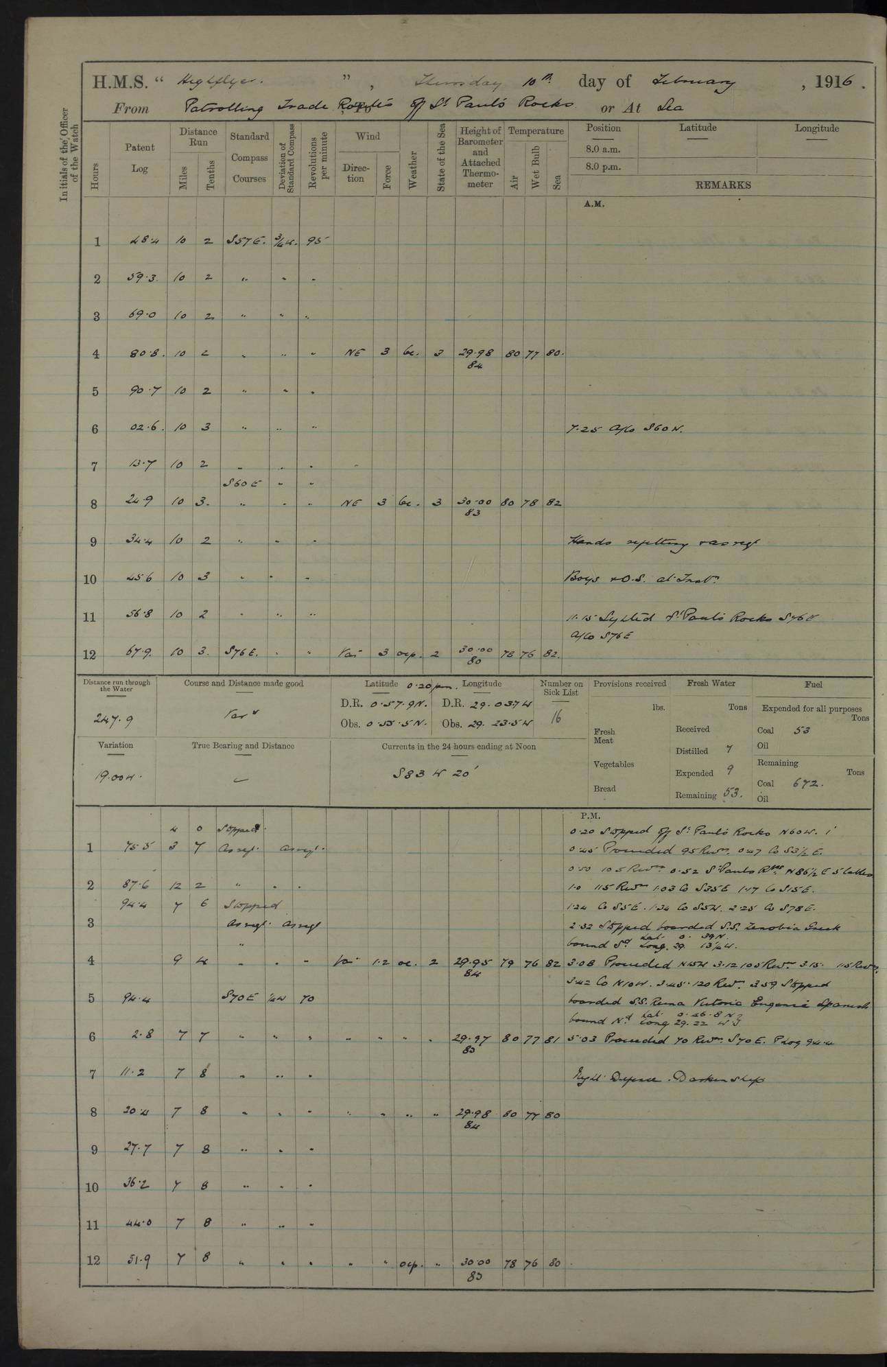 4f961154a2fc8e2def000869: (http://s3.amazonaws.com/oldweather/ADM53-44303/ADM 53-44303-011_0.jpg) 12 February 1916 Patrolling S American trade route to northward Lat 3.9, Long -29.9 7.38am: Stopped, boarded SS REINLAND (Dutch) bound southward Lat 3.13.4N, 30.01W. 4f961155a2fc8e2def00086a: (http://s3.amazonaws.com/oldweather/ADM53-44303/ADM 53-44303-011_1.jpg) 13 February 1916 Patrolling S American trade routes to northward Lat 7.8, Long -28.3 9.00am: Held Divine Service. 4f961155a2fc8e2def00086b: (http://s3.amazonaws.com/oldweather/ADM53-44303/ADM 53-44303-012_0.jpg) 14 February 1916 Patrolling trade routes. to northward Lat 11.4, Long -27.0 9.40am: 90 revs. Course as requisite for aiming rifle practice. 4f961155a2fc8e2def00086c: (http://s3.amazonaws.com/oldweather/ADM53-44303/ADM 53-44303-012_1.jpg) 15 February 1916 Towards Brava Id. Lat 14.2, Long -25.3 9.25am: Stopped, dropped target. Course and speed as requisite to carry out heavy gun practice. 4.00pm: Sighted Brava Id. vis. 1½ miles. Passed W side. 4f961156a2fc8e2def00086d: (http://s3.amazonaws.com/oldweather/ADM53-44303/ADM 53-44303-013_0.jpg) 16 February 1916 St. Vincent Lat 16.8828, Long -25.0106 7.35am: Land ahead visibility 1½’ San Antonio. 8.30am: Course as requisite for entering harbour. 11.00am: Preparing for coaling. 4f961156a2fc8e2def00086e: (http://s3.amazonaws.com/oldweather/ADM53-44303/ADM 53-44303-013_1.jpg) 17 February 1916 St. Vincent Lat 16.8828, Long -25.0106 6.00am: Collier SS PENHALE came alongside. 6.45am: Commenced coaling. 4f961156a2fc8e2def00086f: (http://s3.amazonaws.com/oldweather/ADM53-44303/ADM 53-44303-014_0.jpg) 18 February 1916 St. Vincent Lat 16.8828, Long -25.0106 Cleaning ship. 2.30pm: Drawing new fenders from SS TAMPLIN. 4f961157a2fc8e2def000870: (http://s3.amazonaws.com/oldweather/ADM53-44303/ADM 53-44303-014_1.jpg) 19 February 1916 St. Vincent Lat 16.8828, Long -25.0106 10.30am: Diving party sent to SS TAMPLIN. 4f961157a2fc8e2def000871: (http://s3.amazonaws.com/oldweather/ADM53-44303/ADM 53-44303-015_0.jpg) 20 February 1916 St. Vincent Lat 16.8828, Long -25.0106 7.00am: Sent diving party to TAMPLIN. 4f961157a2fc8e2def000872: (http://s3.amazonaws.com/oldweather/ADM53-44303/ADM 53-44303-015_1.jpg) 21 February 1916 St. Vincent to patrol Lat 16.8828, Long -25.0106 8.30am: Diving party sent to SS TAMPLIN. 6.40pm: Weighed and proceeded as requisite out of harbour. 8.30pm: Bull Point Lt. Ho. N24W, 6000 yds. 4f961158a2fc8e2def000873: (http://s3.amazonaws.com/oldweather/ADM53-44303/ADM 53-44303-016_0.jpg) 22 February 1916 Patrolling northward off San Antonio Id. Lat 18.1, Long -25.3 Painting ship and as requisite. 7.00pm: Western point San Antonio abeam 10’. 4f961158a2fc8e2def000874: (http://s3.amazonaws.com/oldweather/ADM53-44303/ADM 53-44303-016_1.jpg) 23 February 1916 Off San Antonio and St. Vincent to Tarrafal Bay Lat 16.8, Long -25.2 12.00pm: Spoke SS JASON, Brit., bound St. Vincent. 1.12pm: Boarded SS WILLEM VAN DREIL (Dutch) bound St. Vincent. 3.35pm: Stopped, came to with SB, in 33 fathoms. 4f961158a2fc8e2def000875: (http://s3.amazonaws.com/oldweather/ADM53-44303/ADM 53-44303-017_0.jpg) 24 February 1916 Tarrafal Bay, San Antonio Id. to St. Vincent Lat 16.8828, Long -25.0106 9.43 am; Proceeded. Course as requisite to St. Vincent round S end San Antonio 120 revs. 11.17am: Came to with SB in 11 fathoms. 4f961159a2fc8e2def000876: (http://s3.amazonaws.com/oldweather/ADM53-44303/ADM 53-44303-017_1.jpg) 25 February 1916 St. Vincent Lat 16.8828, Long -25.0106 Painting ship. Boys and OS at instruction. Control party at drill. 4f961159a2fc8e2def000877: (http://s3.amazonaws.com/oldweather/ADM53-44303/ADM 53-44303-018_0.jpg) 26 February 1916 St. Vincent Lat 16.8828, Long -25.0106 Cleaning ship. 4f961159a2fc8e2def000878: (http://s3.amazonaws.com/oldweather/ADM53-44303/ADM 53-44303-018_1.jpg) 27 February 1916 St. Vincent Lat 16.8828, Long -25.0106 9.30am: Held Divine Service. 4f96115aa2fc8e2def000879: (http://s3.amazonaws.com/oldweather/ADM53-44303/ADM 53-44303-019_0.jpg) 28 February 1916 St. Vincent Lat 16.8828, Long -25.0106 Boys and OS at instruction. Control party at drill. Remainder preparing for coaling. 2.00pm: Diving party at SS TAMPLIN. 4f96115aa2fc8e2def00087a: (http://s3.amazonaws.com/oldweather/ADM53-44303/ADM 53-44303-019_1.jpg) 29 February 1916 St. Vincent Lat 16.8828, Long -25.0106 7.15am: Commenced coaling from lighter. 8.00am: HMS SWIFTSURE arrived. USS CHESTER arrived. 4f96115aa2fc8e2def00087b: (http://s3.amazonaws.com/oldweather/ADM53-44303/ADM 53-44303-020_0.jpg) 4f96115ba2fc8e2def00087c: (http://s3.amazonaws.com/oldweather/ADM53-44303/ADM 53-44303-020_1.jpg) 4f96115ba2fc8e2def00087d: (http://s3.amazonaws.com/oldweather/ADM53-44303/ADM 53-44303-021_0.jpg) 4f96115ba2fc8e2def00087e: (http://s3.amazonaws.com/oldweather/ADM53-44303/ADM 53-44303-021_1.jpg) LOGS FOR MARCH 1916 4f96115ca2fc8e2def00087f: (http://s3.amazonaws.com/oldweather/ADM53-44304/ADM 53-44304-001_0.jpg) 4f96115ca2fc8e2def000880: (http://s3.amazonaws.com/oldweather/ADM53-44304/ADM 53-44304-001_1.jpg) 4f96115ca2fc8e2def000881: (http://s3.amazonaws.com/oldweather/ADM53-44304/ADM 53-44304-002_0.jpg) 4f96115da2fc8e2def000882: (http://s3.amazonaws.com/oldweather/ADM53-44304/ADM 53-44304-002_1.jpg) 4f96115da2fc8e2def000883: (http://s3.amazonaws.com/oldweather/ADM53-44304/ADM 53-44304-003_0.jpg) 4f96115da2fc8e2def000884: (http://s3.amazonaws.com/oldweather/ADM53-44304/ADM 53-44304-003_1.jpg) 4f96115da2fc8e2def000885: (http://s3.amazonaws.com/oldweather/ADM53-44304/ADM 53-44304-004_0.jpg) 4f96115ea2fc8e2def000886: (http://s3.amazonaws.com/oldweather/ADM53-44304/ADM 53-44304-004_1.jpg) 4f96115ea2fc8e2def000887: (http://s3.amazonaws.com/oldweather/ADM53-44304/ADM 53-44304-005_0.jpg) 4f96115ea2fc8e2def000888: (http://s3.amazonaws.com/oldweather/ADM53-44304/ADM 53-44304-005_1.jpg) 1 March 1916 St. Vincent Lat 16.8828, Long -25.0106 9.30pm: Discharged 1 Officer and 1 Tel. Rating to SS NORTHWAITE. 10.00pm: Surgeon Hobbs joined ship fro