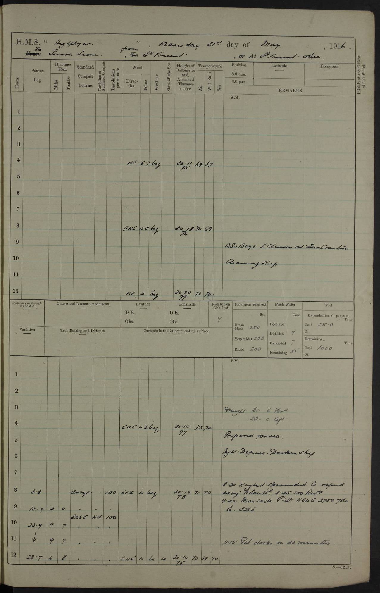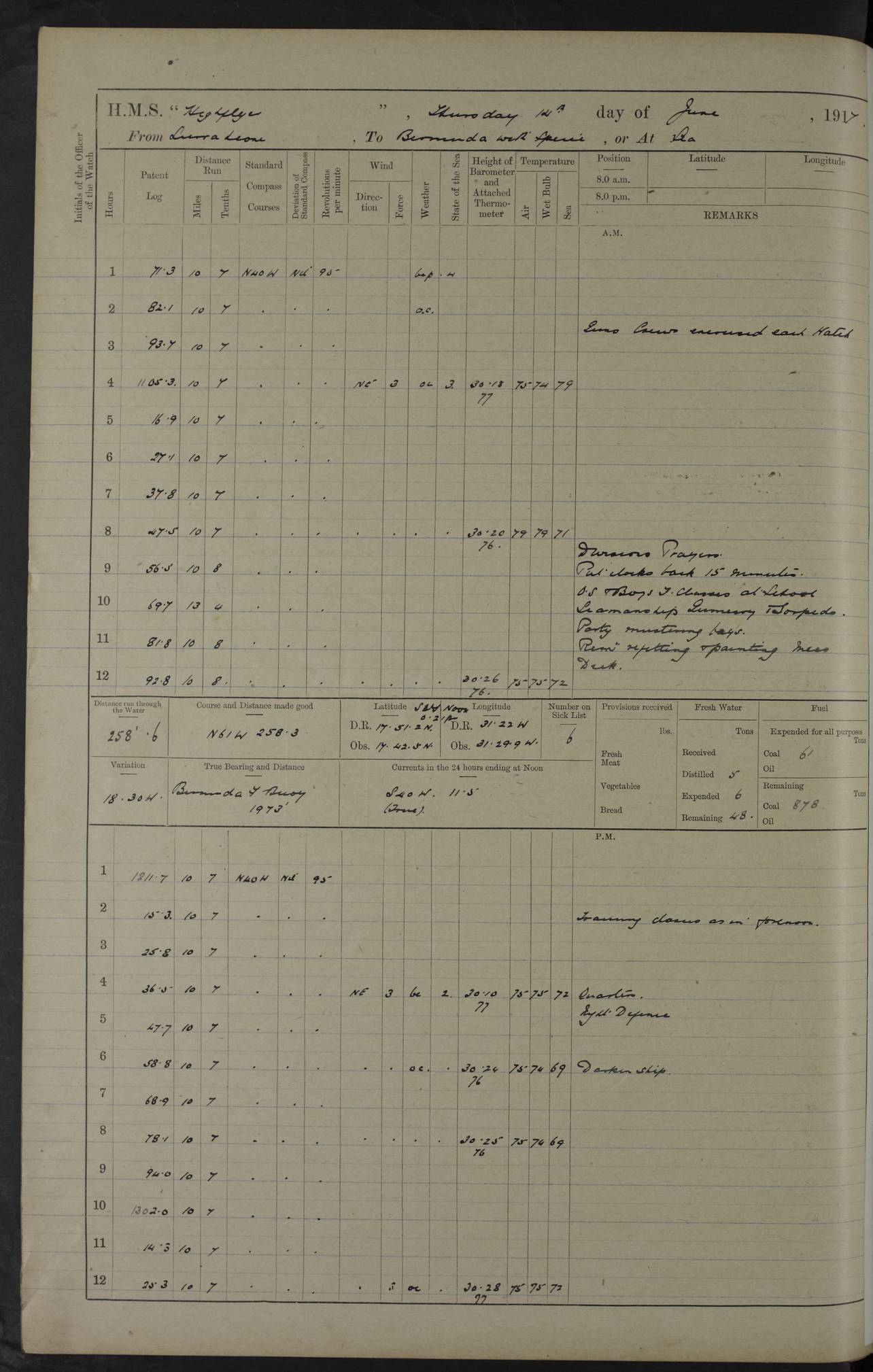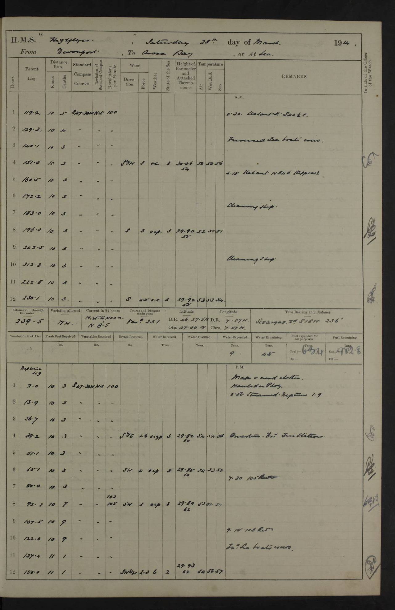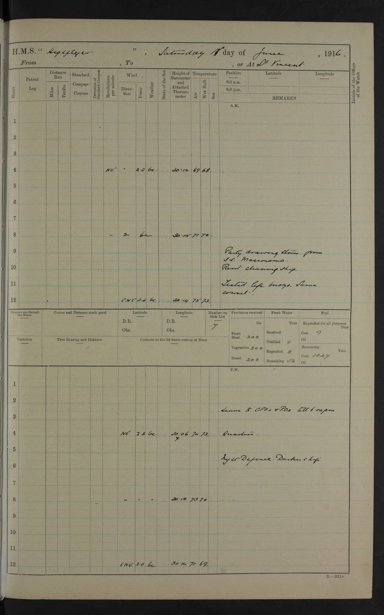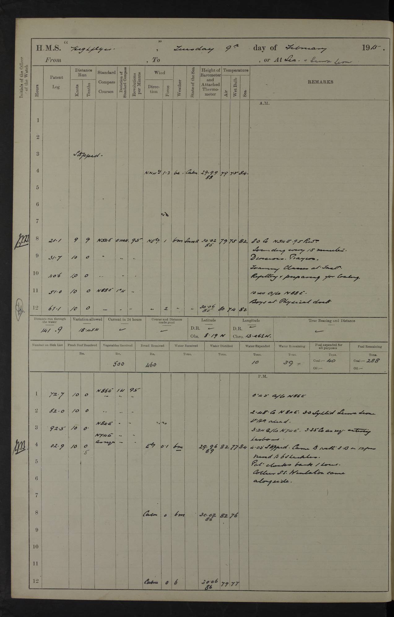 4f961154a2fc8e2def000869: (http://s3.amazonaws.com/oldweather/ADM53-44303/ADM 53-44303-011_0.jpg) 12 February 1916 Patrolling S American trade route to northward Lat 3.9, Long -29.9 7.38am: Stopped, boarded SS REINLAND (Dutch) bound southward Lat 3.13.4N, 30.01W. 4f961155a2fc8e2def00086a: (http://s3.amazonaws.com/oldweather/ADM53-44303/ADM 53-44303-011_1.jpg) 13 February 1916 Patrolling S American trade routes to northward Lat 7.8, Long -28.3 9.00am: Held Divine Service. 4f961155a2fc8e2def00086b: (http://s3.amazonaws.com/oldweather/ADM53-44303/ADM 53-44303-012_0.jpg) 14 February 1916 Patrolling trade routes. to northward Lat 11.4, Long -27.0 9.40am: 90 revs. Course as requisite for aiming rifle practice. 4f961155a2fc8e2def00086c: (http://s3.amazonaws.com/oldweather/ADM53-44303/ADM 53-44303-012_1.jpg) 15 February 1916 Towards Brava Id. Lat 14.2, Long -25.3 9.25am: Stopped, dropped target. Course and speed as requisite to carry out heavy gun practice. 4.00pm: Sighted Brava Id. vis. 1½ miles. Passed W side. 4f961156a2fc8e2def00086d: (http://s3.amazonaws.com/oldweather/ADM53-44303/ADM 53-44303-013_0.jpg) 16 February 1916 St. Vincent Lat 16.8828, Long -25.0106 7.35am: Land ahead visibility 1½’ San Antonio. 8.30am: Course as requisite for entering harbour. 11.00am: Preparing for coaling. 4f961156a2fc8e2def00086e: (http://s3.amazonaws.com/oldweather/ADM53-44303/ADM 53-44303-013_1.jpg) 17 February 1916 St. Vincent Lat 16.8828, Long -25.0106 6.00am: Collier SS PENHALE came alongside. 6.45am: Commenced coaling. 4f961156a2fc8e2def00086f: (http://s3.amazonaws.com/oldweather/ADM53-44303/ADM 53-44303-014_0.jpg) 18 February 1916 St. Vincent Lat 16.8828, Long -25.0106 Cleaning ship. 2.30pm: Drawing new fenders from SS TAMPLIN. 4f961157a2fc8e2def000870: (http://s3.amazonaws.com/oldweather/ADM53-44303/ADM 53-44303-014_1.jpg) 19 February 1916 St. Vincent Lat 16.8828, Long -25.0106 10.30am: Diving party sent to SS TAMPLIN. 4f961157a2fc8e2def000871: (http://s3.amazonaws.com/oldweather/ADM53-44303/ADM 53-44303-015_0.jpg) 20 February 1916 St. Vincent Lat 16.8828, Long -25.0106 7.00am: Sent diving party to TAMPLIN. 4f961157a2fc8e2def000872: (http://s3.amazonaws.com/oldweather/ADM53-44303/ADM 53-44303-015_1.jpg) 21 February 1916 St. Vincent to patrol Lat 16.8828, Long -25.0106 8.30am: Diving party sent to SS TAMPLIN. 6.40pm: Weighed and proceeded as requisite out of harbour. 8.30pm: Bull Point Lt. Ho. N24W, 6000 yds. 4f961158a2fc8e2def000873: (http://s3.amazonaws.com/oldweather/ADM53-44303/ADM 53-44303-016_0.jpg) 22 February 1916 Patrolling northward off San Antonio Id. Lat 18.1, Long -25.3 Painting ship and as requisite. 7.00pm: Western point San Antonio abeam 10’. 4f961158a2fc8e2def000874: (http://s3.amazonaws.com/oldweather/ADM53-44303/ADM 53-44303-016_1.jpg) 23 February 1916 Off San Antonio and St. Vincent to Tarrafal Bay Lat 16.8, Long -25.2 12.00pm: Spoke SS JASON, Brit., bound St. Vincent. 1.12pm: Boarded SS WILLEM VAN DREIL (Dutch) bound St. Vincent. 3.35pm: Stopped, came to with SB, in 33 fathoms. 4f961158a2fc8e2def000875: (http://s3.amazonaws.com/oldweather/ADM53-44303/ADM 53-44303-017_0.jpg) 24 February 1916 Tarrafal Bay, San Antonio Id. to St. Vincent Lat 16.8828, Long -25.0106 9.43 am; Proceeded. Course as requisite to St. Vincent round S end San Antonio 120 revs. 11.17am: Came to with SB in 11 fathoms. 4f961159a2fc8e2def000876: (http://s3.amazonaws.com/oldweather/ADM53-44303/ADM 53-44303-017_1.jpg) 25 February 1916 St. Vincent Lat 16.8828, Long -25.0106 Painting ship. Boys and OS at instruction. Control party at drill. 4f961159a2fc8e2def000877: (http://s3.amazonaws.com/oldweather/ADM53-44303/ADM 53-44303-018_0.jpg) 26 February 1916 St. Vincent Lat 16.8828, Long -25.0106 Cleaning ship. 4f961159a2fc8e2def000878: (http://s3.amazonaws.com/oldweather/ADM53-44303/ADM 53-44303-018_1.jpg) 27 February 1916 St. Vincent Lat 16.8828, Long -25.0106 9.30am: Held Divine Service. 4f96115aa2fc8e2def000879: (http://s3.amazonaws.com/oldweather/ADM53-44303/ADM 53-44303-019_0.jpg) 28 February 1916 St. Vincent Lat 16.8828, Long -25.0106 Boys and OS at instruction. Control party at drill. Remainder preparing for coaling. 2.00pm: Diving party at SS TAMPLIN. 4f96115aa2fc8e2def00087a: (http://s3.amazonaws.com/oldweather/ADM53-44303/ADM 53-44303-019_1.jpg) 29 February 1916 St. Vincent Lat 16.8828, Long -25.0106 7.15am: Commenced coaling from lighter. 8.00am: HMS SWIFTSURE arrived. USS CHESTER arrived. 4f96115aa2fc8e2def00087b: (http://s3.amazonaws.com/oldweather/ADM53-44303/ADM 53-44303-020_0.jpg) 4f96115ba2fc8e2def00087c: (http://s3.amazonaws.com/oldweather/ADM53-44303/ADM 53-44303-020_1.jpg) 4f96115ba2fc8e2def00087d: (http://s3.amazonaws.com/oldweather/ADM53-44303/ADM 53-44303-021_0.jpg) 4f96115ba2fc8e2def00087e: (http://s3.amazonaws.com/oldweather/ADM53-44303/ADM 53-44303-021_1.jpg) LOGS FOR MARCH 1916 4f96115ca2fc8e2def00087f: (http://s3.amazonaws.com/oldweather/ADM53-44304/ADM 53-44304-001_0.jpg) 4f96115ca2fc8e2def000880: (http://s3.amazonaws.com/oldweather/ADM53-44304/ADM 53-44304-001_1.jpg) 4f96115ca2fc8e2def000881: (http://s3.amazonaws.com/oldweather/ADM53-44304/ADM 53-44304-002_0.jpg) 4f96115da2fc8e2def000882: (http://s3.amazonaws.com/oldweather/ADM53-44304/ADM 53-44304-002_1.jpg) 4f96115da2fc8e2def000883: (http://s3.amazonaws.com/oldweather/ADM53-44304/ADM 53-44304-003_0.jpg) 4f96115da2fc8e2def000884: (http://s3.amazonaws.com/oldweather/ADM53-44304/ADM 53-44304-003_1.jpg) 4f96115da2fc8e2def000885: (http://s3.amazonaws.com/oldweather/ADM53-44304/ADM 53-44304-004_0.jpg) 4f96115ea2fc8e2def000886: (http://s3.amazonaws.com/oldweather/ADM53-44304/ADM 53-44304-004_1.jpg) 4f96115ea2fc8e2def000887: (http://s3.amazonaws.com/oldweather/ADM53-44304/ADM 53-44304-005_0.jpg) 4f96115ea2fc8e2def000888: (http://s3.amazonaws.com/oldweather/ADM53-44304/ADM 53-44304-005_1.jpg) 1 March 1916 St. Vincent Lat 16.8828, Long -25.0106 9.30pm: Discharged 1 Officer and 1 Tel. Rating to SS NORTHWAITE. 10.00pm: Surgeon Hobbs joined ship fro