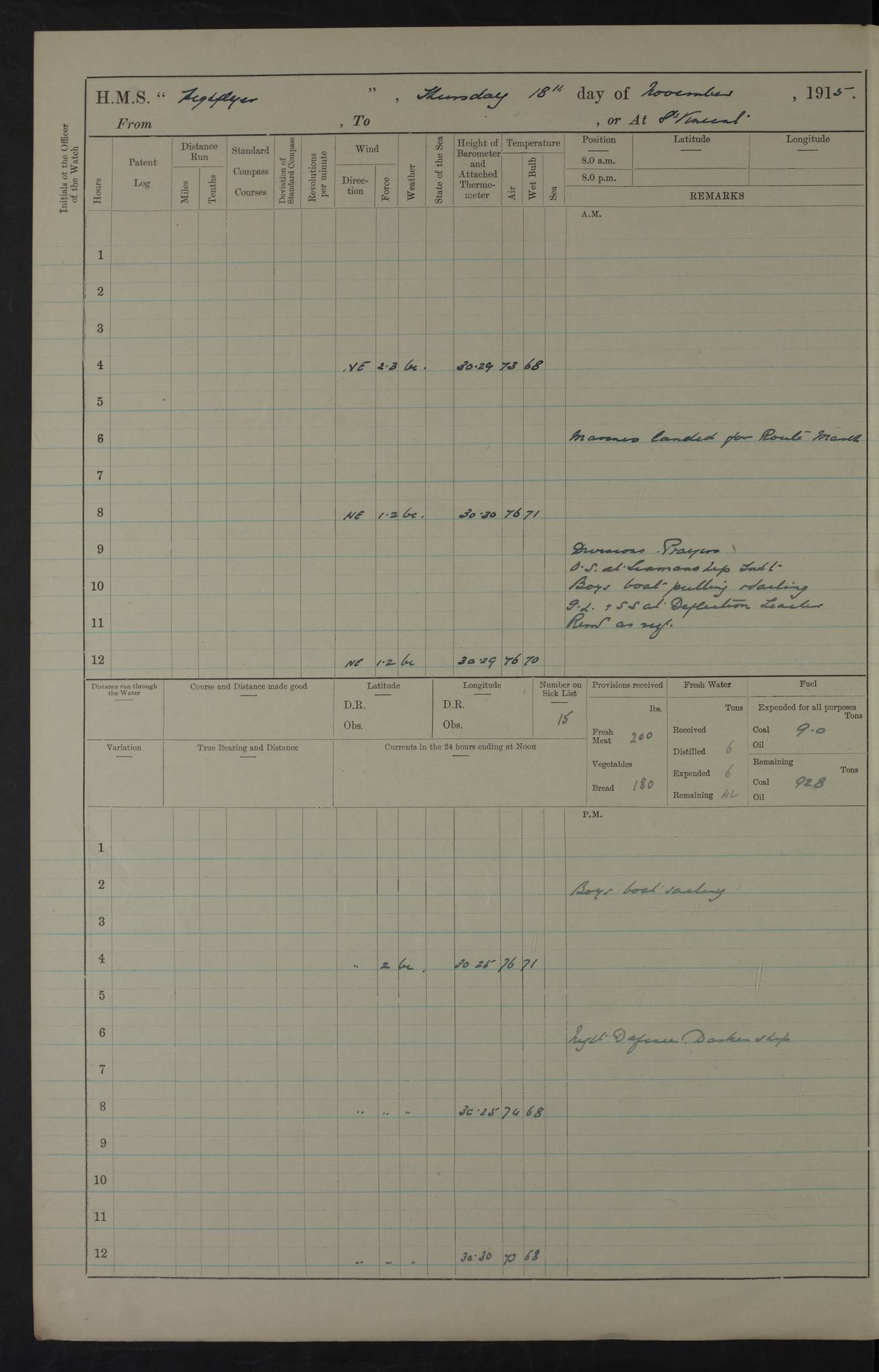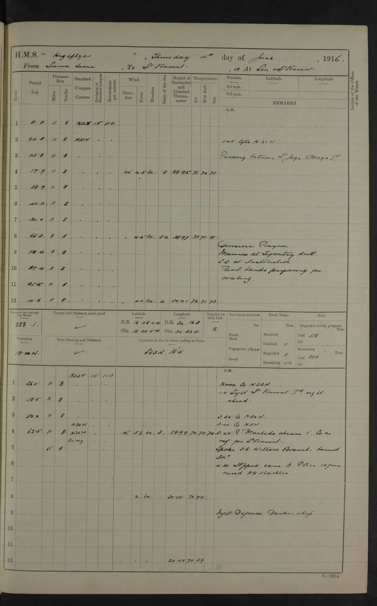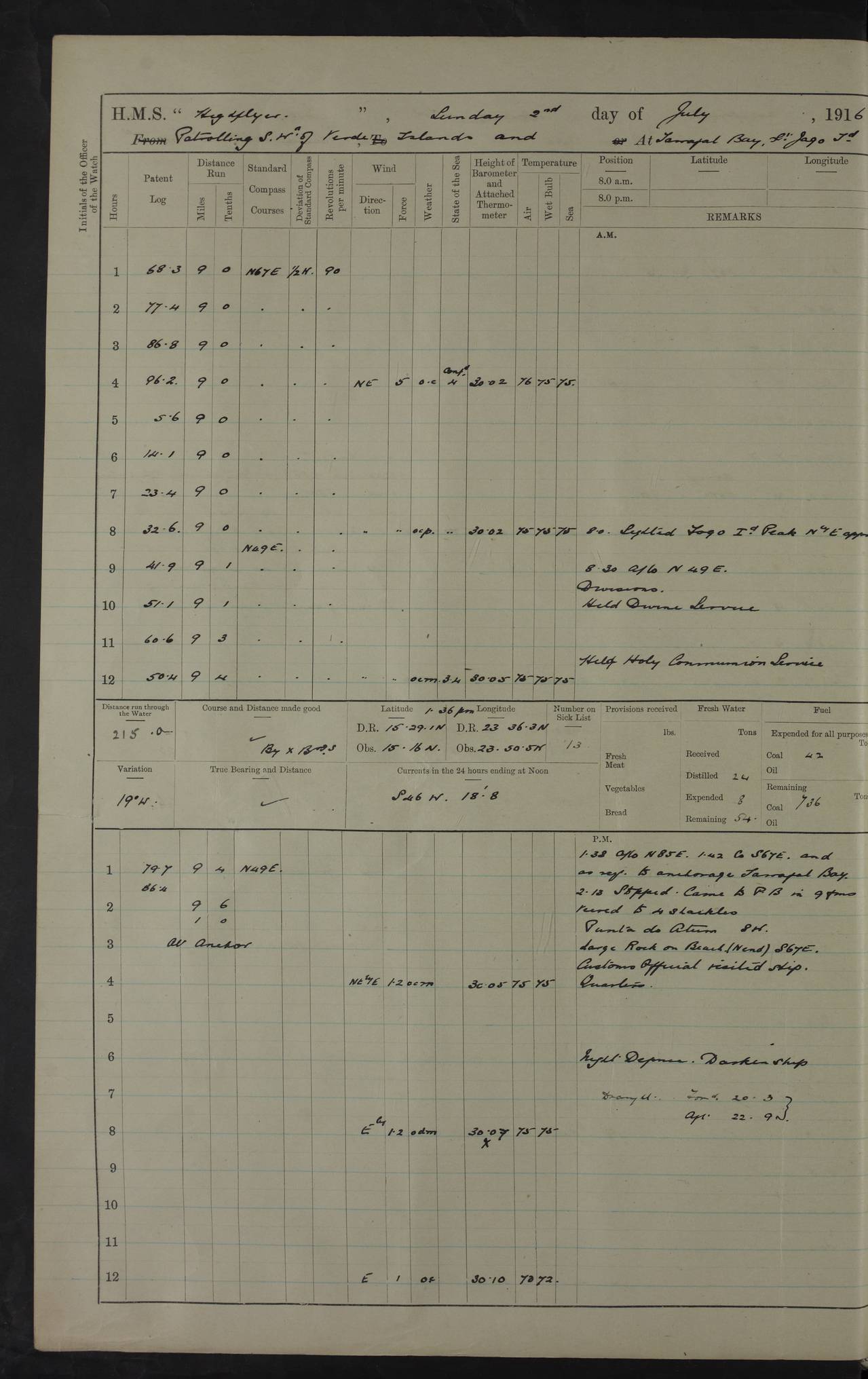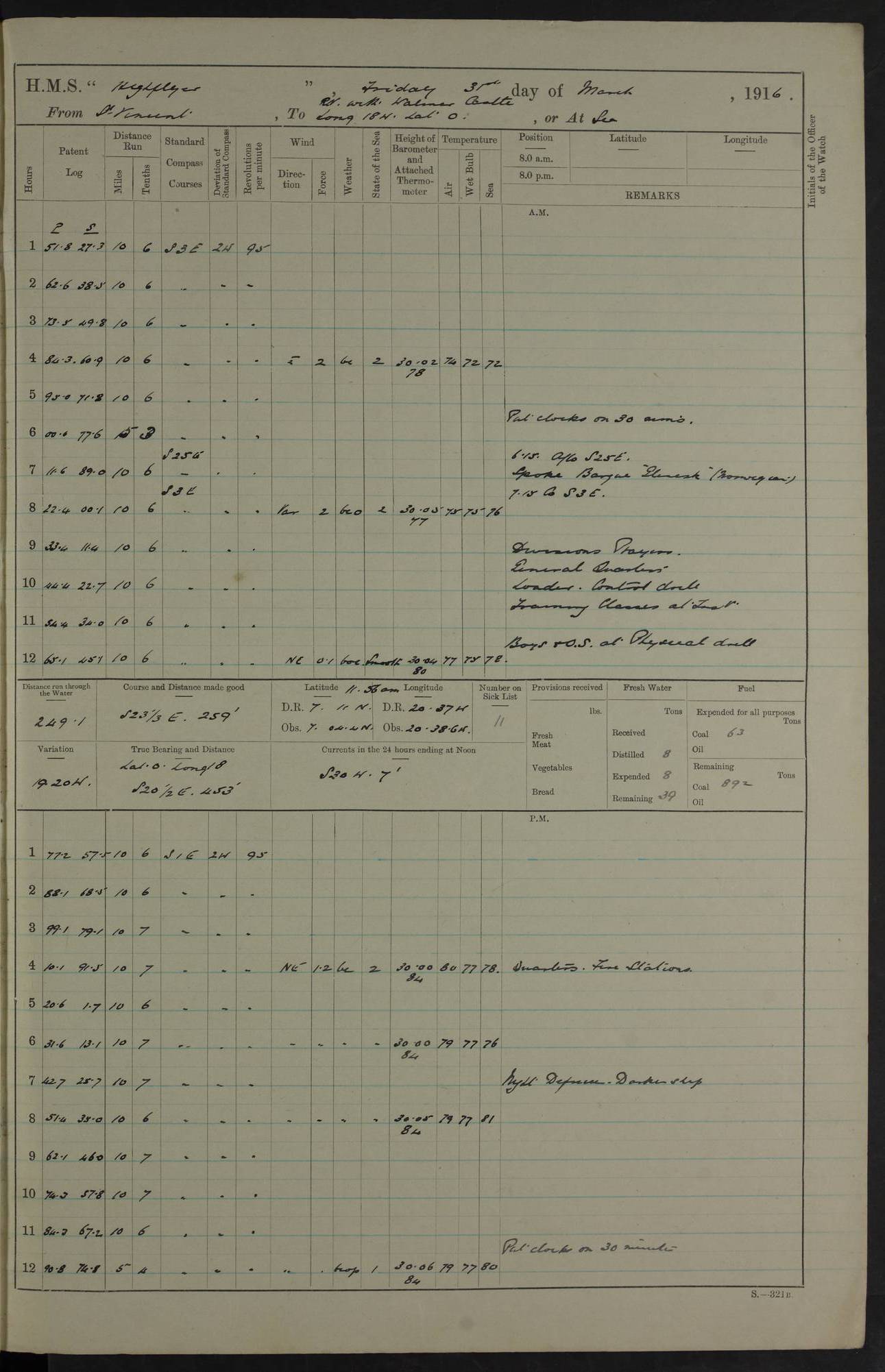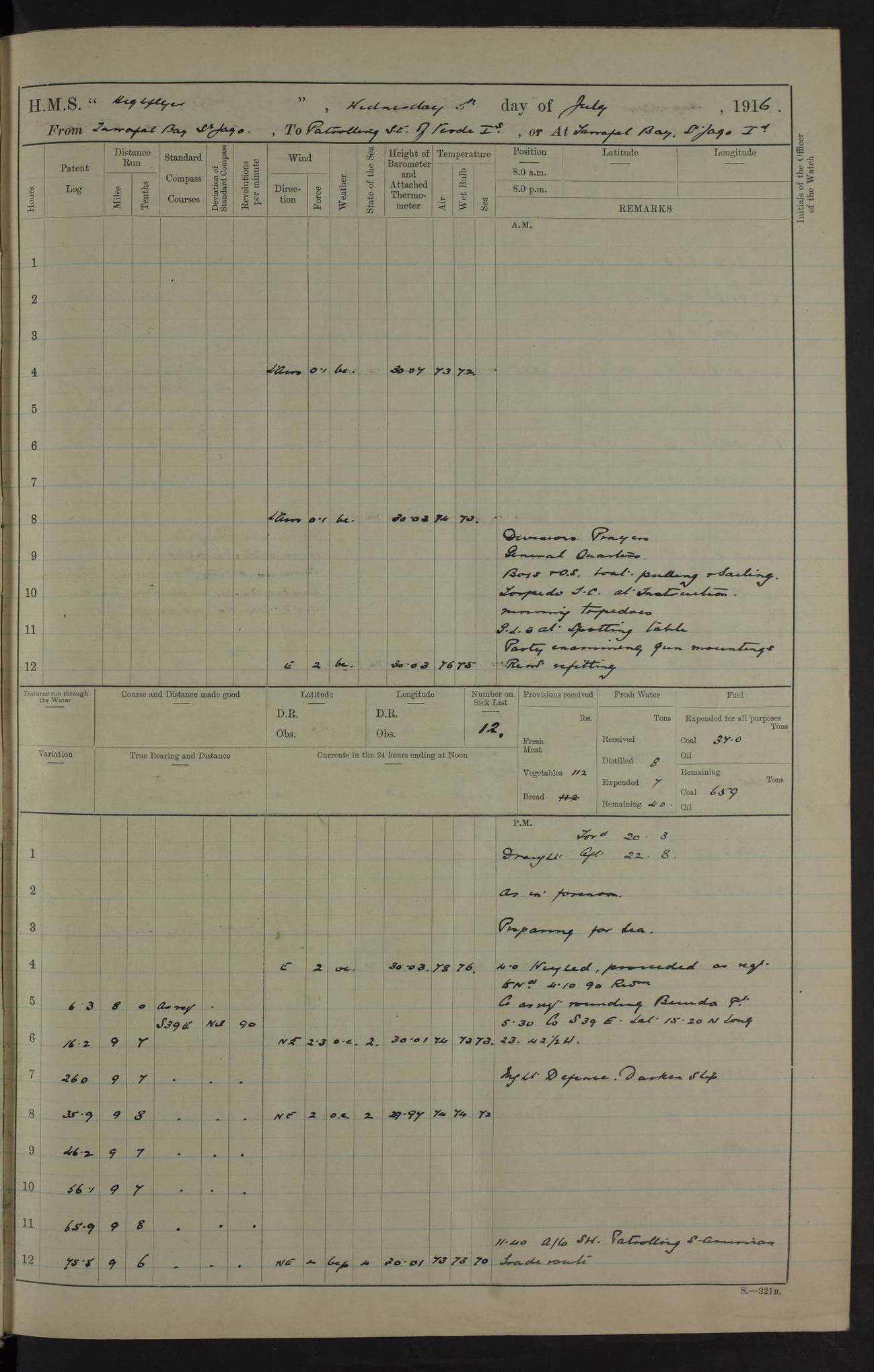 4f961154a2fc8e2def000869: (http://s3.amazonaws.com/oldweather/ADM53-44303/ADM 53-44303-011_0.jpg) 12 February 1916 Patrolling S American trade route to northward Lat 3.9, Long -29.9 7.38am: Stopped, boarded SS REINLAND (Dutch) bound southward Lat 3.13.4N, 30.01W. 4f961155a2fc8e2def00086a: (http://s3.amazonaws.com/oldweather/ADM53-44303/ADM 53-44303-011_1.jpg) 13 February 1916 Patrolling S American trade routes to northward Lat 7.8, Long -28.3 9.00am: Held Divine Service. 4f961155a2fc8e2def00086b: (http://s3.amazonaws.com/oldweather/ADM53-44303/ADM 53-44303-012_0.jpg) 14 February 1916 Patrolling trade routes. to northward Lat 11.4, Long -27.0 9.40am: 90 revs. Course as requisite for aiming rifle practice. 4f961155a2fc8e2def00086c: (http://s3.amazonaws.com/oldweather/ADM53-44303/ADM 53-44303-012_1.jpg) 15 February 1916 Towards Brava Id. Lat 14.2, Long -25.3 9.25am: Stopped, dropped target. Course and speed as requisite to carry out heavy gun practice. 4.00pm: Sighted Brava Id. vis. 1½ miles. Passed W side. 4f961156a2fc8e2def00086d: (http://s3.amazonaws.com/oldweather/ADM53-44303/ADM 53-44303-013_0.jpg) 16 February 1916 St. Vincent Lat 16.8828, Long -25.0106 7.35am: Land ahead visibility 1½’ San Antonio. 8.30am: Course as requisite for entering harbour. 11.00am: Preparing for coaling. 4f961156a2fc8e2def00086e: (http://s3.amazonaws.com/oldweather/ADM53-44303/ADM 53-44303-013_1.jpg) 17 February 1916 St. Vincent Lat 16.8828, Long -25.0106 6.00am: Collier SS PENHALE came alongside. 6.45am: Commenced coaling. 4f961156a2fc8e2def00086f: (http://s3.amazonaws.com/oldweather/ADM53-44303/ADM 53-44303-014_0.jpg) 18 February 1916 St. Vincent Lat 16.8828, Long -25.0106 Cleaning ship. 2.30pm: Drawing new fenders from SS TAMPLIN. 4f961157a2fc8e2def000870: (http://s3.amazonaws.com/oldweather/ADM53-44303/ADM 53-44303-014_1.jpg) 19 February 1916 St. Vincent Lat 16.8828, Long -25.0106 10.30am: Diving party sent to SS TAMPLIN. 4f961157a2fc8e2def000871: (http://s3.amazonaws.com/oldweather/ADM53-44303/ADM 53-44303-015_0.jpg) 20 February 1916 St. Vincent Lat 16.8828, Long -25.0106 7.00am: Sent diving party to TAMPLIN. 4f961157a2fc8e2def000872: (http://s3.amazonaws.com/oldweather/ADM53-44303/ADM 53-44303-015_1.jpg) 21 February 1916 St. Vincent to patrol Lat 16.8828, Long -25.0106 8.30am: Diving party sent to SS TAMPLIN. 6.40pm: Weighed and proceeded as requisite out of harbour. 8.30pm: Bull Point Lt. Ho. N24W, 6000 yds. 4f961158a2fc8e2def000873: (http://s3.amazonaws.com/oldweather/ADM53-44303/ADM 53-44303-016_0.jpg) 22 February 1916 Patrolling northward off San Antonio Id. Lat 18.1, Long -25.3 Painting ship and as requisite. 7.00pm: Western point San Antonio abeam 10’. 4f961158a2fc8e2def000874: (http://s3.amazonaws.com/oldweather/ADM53-44303/ADM 53-44303-016_1.jpg) 23 February 1916 Off San Antonio and St. Vincent to Tarrafal Bay Lat 16.8, Long -25.2 12.00pm: Spoke SS JASON, Brit., bound St. Vincent. 1.12pm: Boarded SS WILLEM VAN DREIL (Dutch) bound St. Vincent. 3.35pm: Stopped, came to with SB, in 33 fathoms. 4f961158a2fc8e2def000875: (http://s3.amazonaws.com/oldweather/ADM53-44303/ADM 53-44303-017_0.jpg) 24 February 1916 Tarrafal Bay, San Antonio Id. to St. Vincent Lat 16.8828, Long -25.0106 9.43 am; Proceeded. Course as requisite to St. Vincent round S end San Antonio 120 revs. 11.17am: Came to with SB in 11 fathoms. 4f961159a2fc8e2def000876: (http://s3.amazonaws.com/oldweather/ADM53-44303/ADM 53-44303-017_1.jpg) 25 February 1916 St. Vincent Lat 16.8828, Long -25.0106 Painting ship. Boys and OS at instruction. Control party at drill. 4f961159a2fc8e2def000877: (http://s3.amazonaws.com/oldweather/ADM53-44303/ADM 53-44303-018_0.jpg) 26 February 1916 St. Vincent Lat 16.8828, Long -25.0106 Cleaning ship. 4f961159a2fc8e2def000878: (http://s3.amazonaws.com/oldweather/ADM53-44303/ADM 53-44303-018_1.jpg) 27 February 1916 St. Vincent Lat 16.8828, Long -25.0106 9.30am: Held Divine Service. 4f96115aa2fc8e2def000879: (http://s3.amazonaws.com/oldweather/ADM53-44303/ADM 53-44303-019_0.jpg) 28 February 1916 St. Vincent Lat 16.8828, Long -25.0106 Boys and OS at instruction. Control party at drill. Remainder preparing for coaling. 2.00pm: Diving party at SS TAMPLIN. 4f96115aa2fc8e2def00087a: (http://s3.amazonaws.com/oldweather/ADM53-44303/ADM 53-44303-019_1.jpg) 29 February 1916 St. Vincent Lat 16.8828, Long -25.0106 7.15am: Commenced coaling from lighter. 8.00am: HMS SWIFTSURE arrived. USS CHESTER arrived. 4f96115aa2fc8e2def00087b: (http://s3.amazonaws.com/oldweather/ADM53-44303/ADM 53-44303-020_0.jpg) 4f96115ba2fc8e2def00087c: (http://s3.amazonaws.com/oldweather/ADM53-44303/ADM 53-44303-020_1.jpg) 4f96115ba2fc8e2def00087d: (http://s3.amazonaws.com/oldweather/ADM53-44303/ADM 53-44303-021_0.jpg) 4f96115ba2fc8e2def00087e: (http://s3.amazonaws.com/oldweather/ADM53-44303/ADM 53-44303-021_1.jpg) LOGS FOR MARCH 1916 4f96115ca2fc8e2def00087f: (http://s3.amazonaws.com/oldweather/ADM53-44304/ADM 53-44304-001_0.jpg) 4f96115ca2fc8e2def000880: (http://s3.amazonaws.com/oldweather/ADM53-44304/ADM 53-44304-001_1.jpg) 4f96115ca2fc8e2def000881: (http://s3.amazonaws.com/oldweather/ADM53-44304/ADM 53-44304-002_0.jpg) 4f96115da2fc8e2def000882: (http://s3.amazonaws.com/oldweather/ADM53-44304/ADM 53-44304-002_1.jpg) 4f96115da2fc8e2def000883: (http://s3.amazonaws.com/oldweather/ADM53-44304/ADM 53-44304-003_0.jpg) 4f96115da2fc8e2def000884: (http://s3.amazonaws.com/oldweather/ADM53-44304/ADM 53-44304-003_1.jpg) 4f96115da2fc8e2def000885: (http://s3.amazonaws.com/oldweather/ADM53-44304/ADM 53-44304-004_0.jpg) 4f96115ea2fc8e2def000886: (http://s3.amazonaws.com/oldweather/ADM53-44304/ADM 53-44304-004_1.jpg) 4f96115ea2fc8e2def000887: (http://s3.amazonaws.com/oldweather/ADM53-44304/ADM 53-44304-005_0.jpg) 4f96115ea2fc8e2def000888: (http://s3.amazonaws.com/oldweather/ADM53-44304/ADM 53-44304-005_1.jpg) 1 March 1916 St. Vincent Lat 16.8828, Long -25.0106 9.30pm: Discharged 1 Officer and 1 Tel. Rating to SS NORTHWAITE. 10.00pm: Surgeon Hobbs joined ship fro