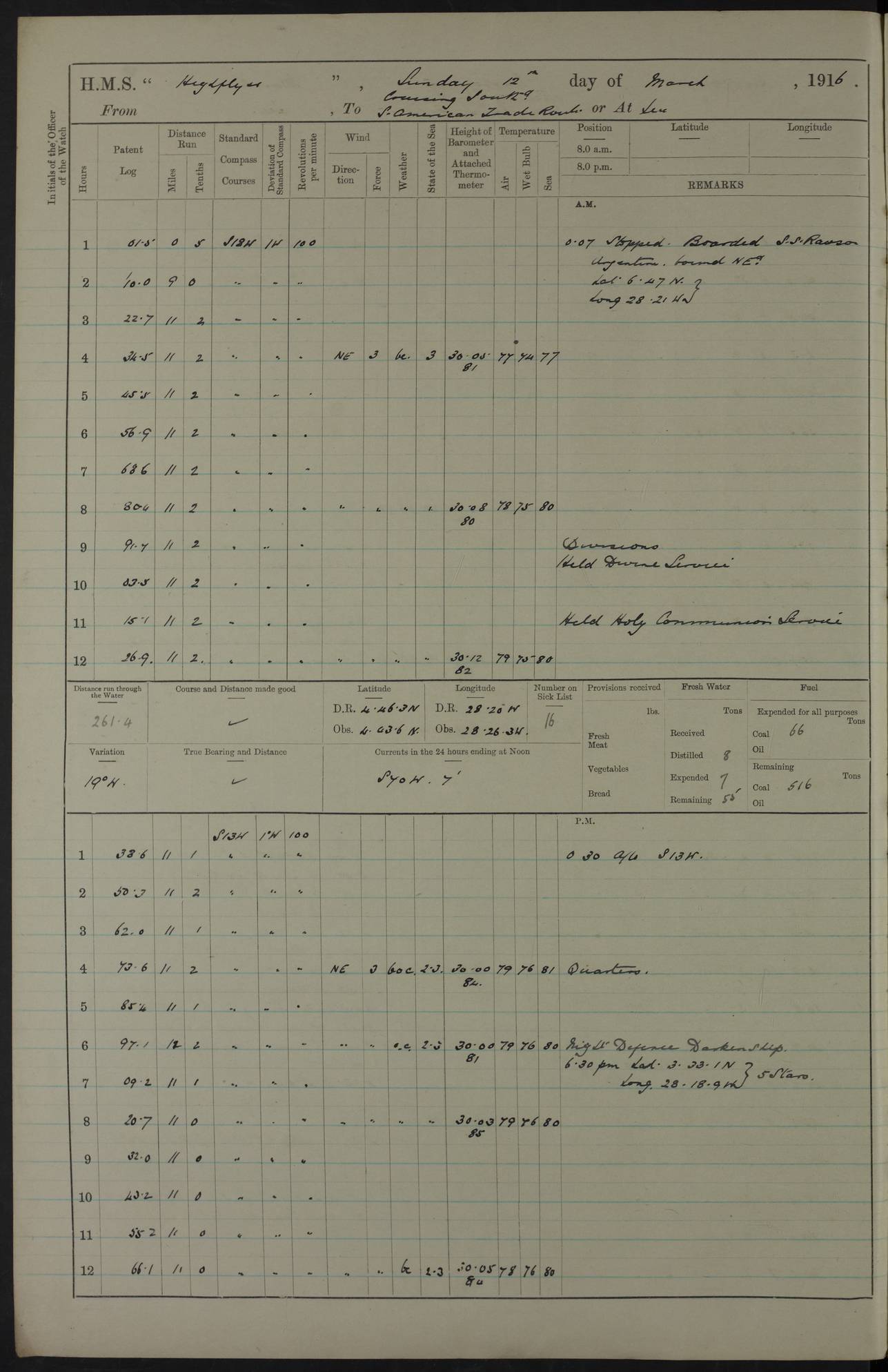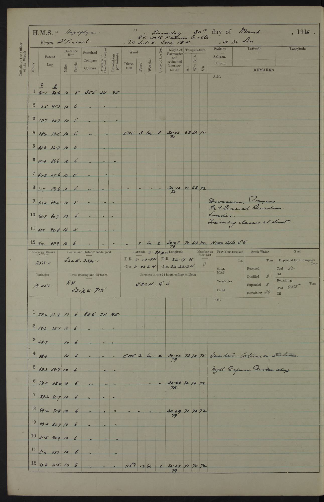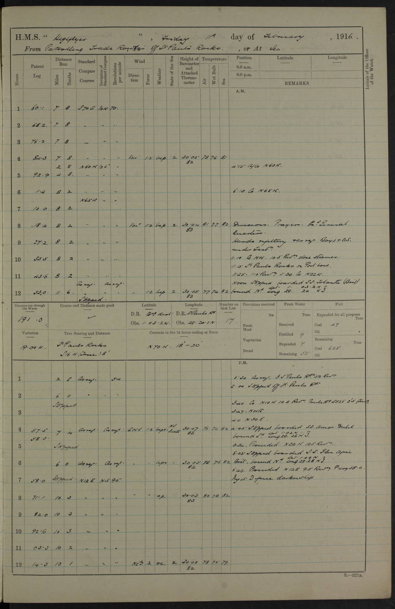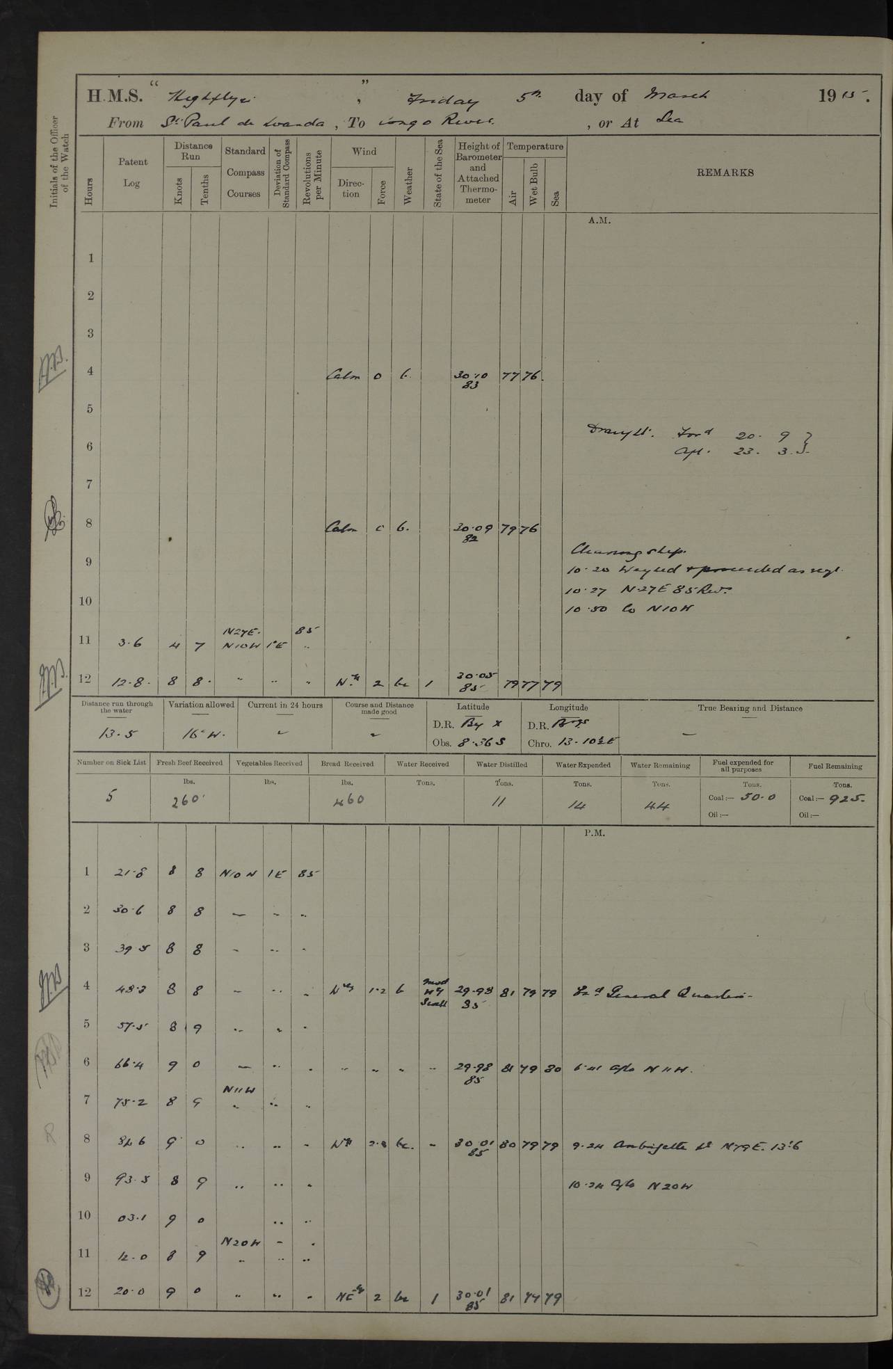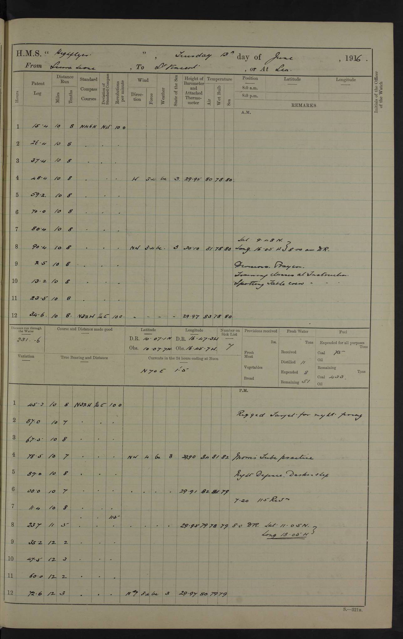 4f961154a2fc8e2def000869: (http://s3.amazonaws.com/oldweather/ADM53-44303/ADM 53-44303-011_0.jpg) 12 February 1916 Patrolling S American trade route to northward Lat 3.9, Long -29.9 7.38am: Stopped, boarded SS REINLAND (Dutch) bound southward Lat 3.13.4N, 30.01W. 4f961155a2fc8e2def00086a: (http://s3.amazonaws.com/oldweather/ADM53-44303/ADM 53-44303-011_1.jpg) 13 February 1916 Patrolling S American trade routes to northward Lat 7.8, Long -28.3 9.00am: Held Divine Service. 4f961155a2fc8e2def00086b: (http://s3.amazonaws.com/oldweather/ADM53-44303/ADM 53-44303-012_0.jpg) 14 February 1916 Patrolling trade routes. to northward Lat 11.4, Long -27.0 9.40am: 90 revs. Course as requisite for aiming rifle practice. 4f961155a2fc8e2def00086c: (http://s3.amazonaws.com/oldweather/ADM53-44303/ADM 53-44303-012_1.jpg) 15 February 1916 Towards Brava Id. Lat 14.2, Long -25.3 9.25am: Stopped, dropped target. Course and speed as requisite to carry out heavy gun practice. 4.00pm: Sighted Brava Id. vis. 1½ miles. Passed W side. 4f961156a2fc8e2def00086d: (http://s3.amazonaws.com/oldweather/ADM53-44303/ADM 53-44303-013_0.jpg) 16 February 1916 St. Vincent Lat 16.8828, Long -25.0106 7.35am: Land ahead visibility 1½’ San Antonio. 8.30am: Course as requisite for entering harbour. 11.00am: Preparing for coaling. 4f961156a2fc8e2def00086e: (http://s3.amazonaws.com/oldweather/ADM53-44303/ADM 53-44303-013_1.jpg) 17 February 1916 St. Vincent Lat 16.8828, Long -25.0106 6.00am: Collier SS PENHALE came alongside. 6.45am: Commenced coaling. 4f961156a2fc8e2def00086f: (http://s3.amazonaws.com/oldweather/ADM53-44303/ADM 53-44303-014_0.jpg) 18 February 1916 St. Vincent Lat 16.8828, Long -25.0106 Cleaning ship. 2.30pm: Drawing new fenders from SS TAMPLIN. 4f961157a2fc8e2def000870: (http://s3.amazonaws.com/oldweather/ADM53-44303/ADM 53-44303-014_1.jpg) 19 February 1916 St. Vincent Lat 16.8828, Long -25.0106 10.30am: Diving party sent to SS TAMPLIN. 4f961157a2fc8e2def000871: (http://s3.amazonaws.com/oldweather/ADM53-44303/ADM 53-44303-015_0.jpg) 20 February 1916 St. Vincent Lat 16.8828, Long -25.0106 7.00am: Sent diving party to TAMPLIN. 4f961157a2fc8e2def000872: (http://s3.amazonaws.com/oldweather/ADM53-44303/ADM 53-44303-015_1.jpg) 21 February 1916 St. Vincent to patrol Lat 16.8828, Long -25.0106 8.30am: Diving party sent to SS TAMPLIN. 6.40pm: Weighed and proceeded as requisite out of harbour. 8.30pm: Bull Point Lt. Ho. N24W, 6000 yds. 4f961158a2fc8e2def000873: (http://s3.amazonaws.com/oldweather/ADM53-44303/ADM 53-44303-016_0.jpg) 22 February 1916 Patrolling northward off San Antonio Id. Lat 18.1, Long -25.3 Painting ship and as requisite. 7.00pm: Western point San Antonio abeam 10’. 4f961158a2fc8e2def000874: (http://s3.amazonaws.com/oldweather/ADM53-44303/ADM 53-44303-016_1.jpg) 23 February 1916 Off San Antonio and St. Vincent to Tarrafal Bay Lat 16.8, Long -25.2 12.00pm: Spoke SS JASON, Brit., bound St. Vincent. 1.12pm: Boarded SS WILLEM VAN DREIL (Dutch) bound St. Vincent. 3.35pm: Stopped, came to with SB, in 33 fathoms. 4f961158a2fc8e2def000875: (http://s3.amazonaws.com/oldweather/ADM53-44303/ADM 53-44303-017_0.jpg) 24 February 1916 Tarrafal Bay, San Antonio Id. to St. Vincent Lat 16.8828, Long -25.0106 9.43 am; Proceeded. Course as requisite to St. Vincent round S end San Antonio 120 revs. 11.17am: Came to with SB in 11 fathoms. 4f961159a2fc8e2def000876: (http://s3.amazonaws.com/oldweather/ADM53-44303/ADM 53-44303-017_1.jpg) 25 February 1916 St. Vincent Lat 16.8828, Long -25.0106 Painting ship. Boys and OS at instruction. Control party at drill. 4f961159a2fc8e2def000877: (http://s3.amazonaws.com/oldweather/ADM53-44303/ADM 53-44303-018_0.jpg) 26 February 1916 St. Vincent Lat 16.8828, Long -25.0106 Cleaning ship. 4f961159a2fc8e2def000878: (http://s3.amazonaws.com/oldweather/ADM53-44303/ADM 53-44303-018_1.jpg) 27 February 1916 St. Vincent Lat 16.8828, Long -25.0106 9.30am: Held Divine Service. 4f96115aa2fc8e2def000879: (http://s3.amazonaws.com/oldweather/ADM53-44303/ADM 53-44303-019_0.jpg) 28 February 1916 St. Vincent Lat 16.8828, Long -25.0106 Boys and OS at instruction. Control party at drill. Remainder preparing for coaling. 2.00pm: Diving party at SS TAMPLIN. 4f96115aa2fc8e2def00087a: (http://s3.amazonaws.com/oldweather/ADM53-44303/ADM 53-44303-019_1.jpg) 29 February 1916 St. Vincent Lat 16.8828, Long -25.0106 7.15am: Commenced coaling from lighter. 8.00am: HMS SWIFTSURE arrived. USS CHESTER arrived. 4f96115aa2fc8e2def00087b: (http://s3.amazonaws.com/oldweather/ADM53-44303/ADM 53-44303-020_0.jpg) 4f96115ba2fc8e2def00087c: (http://s3.amazonaws.com/oldweather/ADM53-44303/ADM 53-44303-020_1.jpg) 4f96115ba2fc8e2def00087d: (http://s3.amazonaws.com/oldweather/ADM53-44303/ADM 53-44303-021_0.jpg) 4f96115ba2fc8e2def00087e: (http://s3.amazonaws.com/oldweather/ADM53-44303/ADM 53-44303-021_1.jpg) LOGS FOR MARCH 1916 4f96115ca2fc8e2def00087f: (http://s3.amazonaws.com/oldweather/ADM53-44304/ADM 53-44304-001_0.jpg) 4f96115ca2fc8e2def000880: (http://s3.amazonaws.com/oldweather/ADM53-44304/ADM 53-44304-001_1.jpg) 4f96115ca2fc8e2def000881: (http://s3.amazonaws.com/oldweather/ADM53-44304/ADM 53-44304-002_0.jpg) 4f96115da2fc8e2def000882: (http://s3.amazonaws.com/oldweather/ADM53-44304/ADM 53-44304-002_1.jpg) 4f96115da2fc8e2def000883: (http://s3.amazonaws.com/oldweather/ADM53-44304/ADM 53-44304-003_0.jpg) 4f96115da2fc8e2def000884: (http://s3.amazonaws.com/oldweather/ADM53-44304/ADM 53-44304-003_1.jpg) 4f96115da2fc8e2def000885: (http://s3.amazonaws.com/oldweather/ADM53-44304/ADM 53-44304-004_0.jpg) 4f96115ea2fc8e2def000886: (http://s3.amazonaws.com/oldweather/ADM53-44304/ADM 53-44304-004_1.jpg) 4f96115ea2fc8e2def000887: (http://s3.amazonaws.com/oldweather/ADM53-44304/ADM 53-44304-005_0.jpg) 4f96115ea2fc8e2def000888: (http://s3.amazonaws.com/oldweather/ADM53-44304/ADM 53-44304-005_1.jpg) 1 March 1916 St. Vincent Lat 16.8828, Long -25.0106 9.30pm: Discharged 1 Officer and 1 Tel. Rating to SS NORTHWAITE. 10.00pm: Surgeon Hobbs joined ship fro