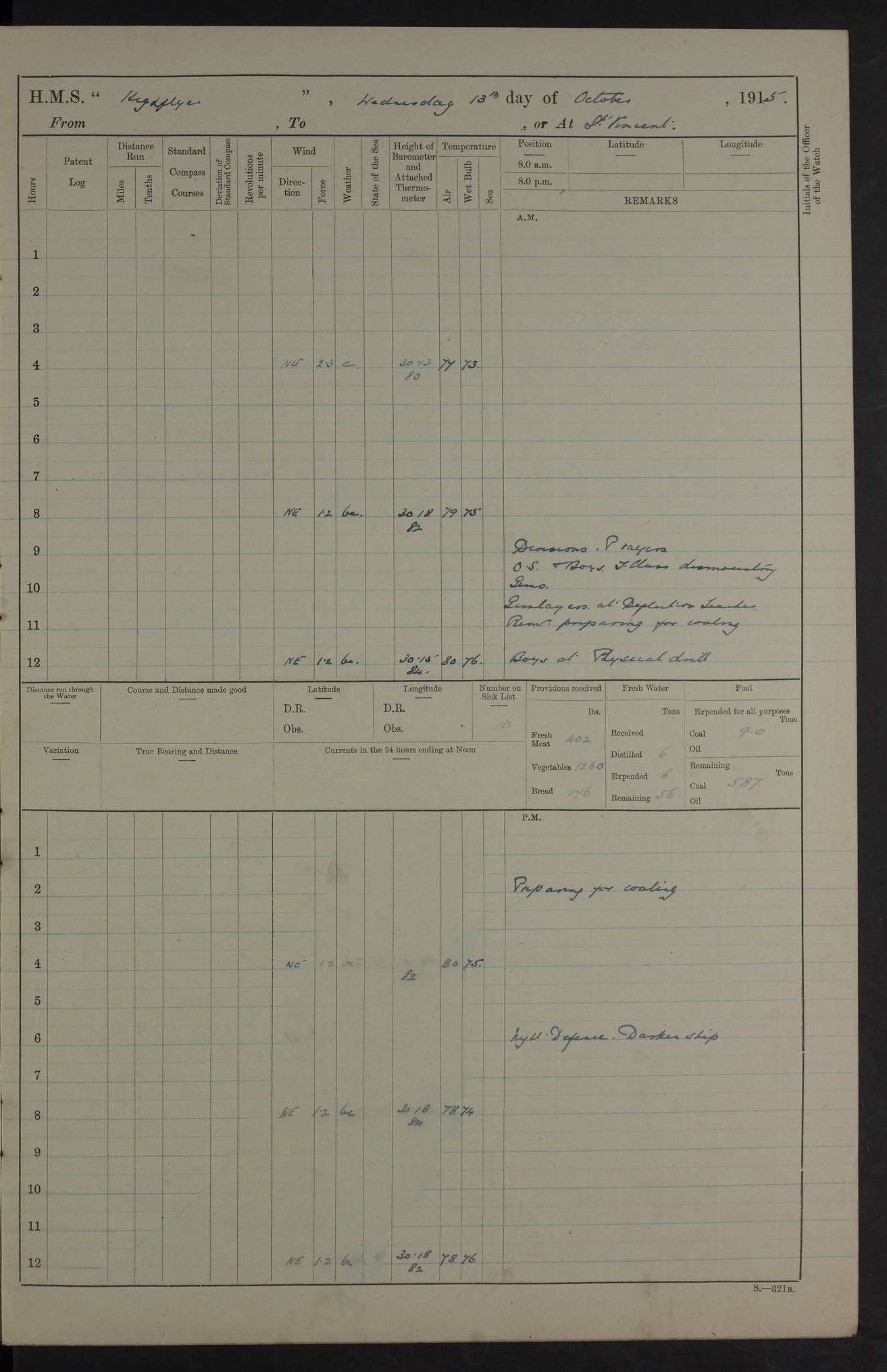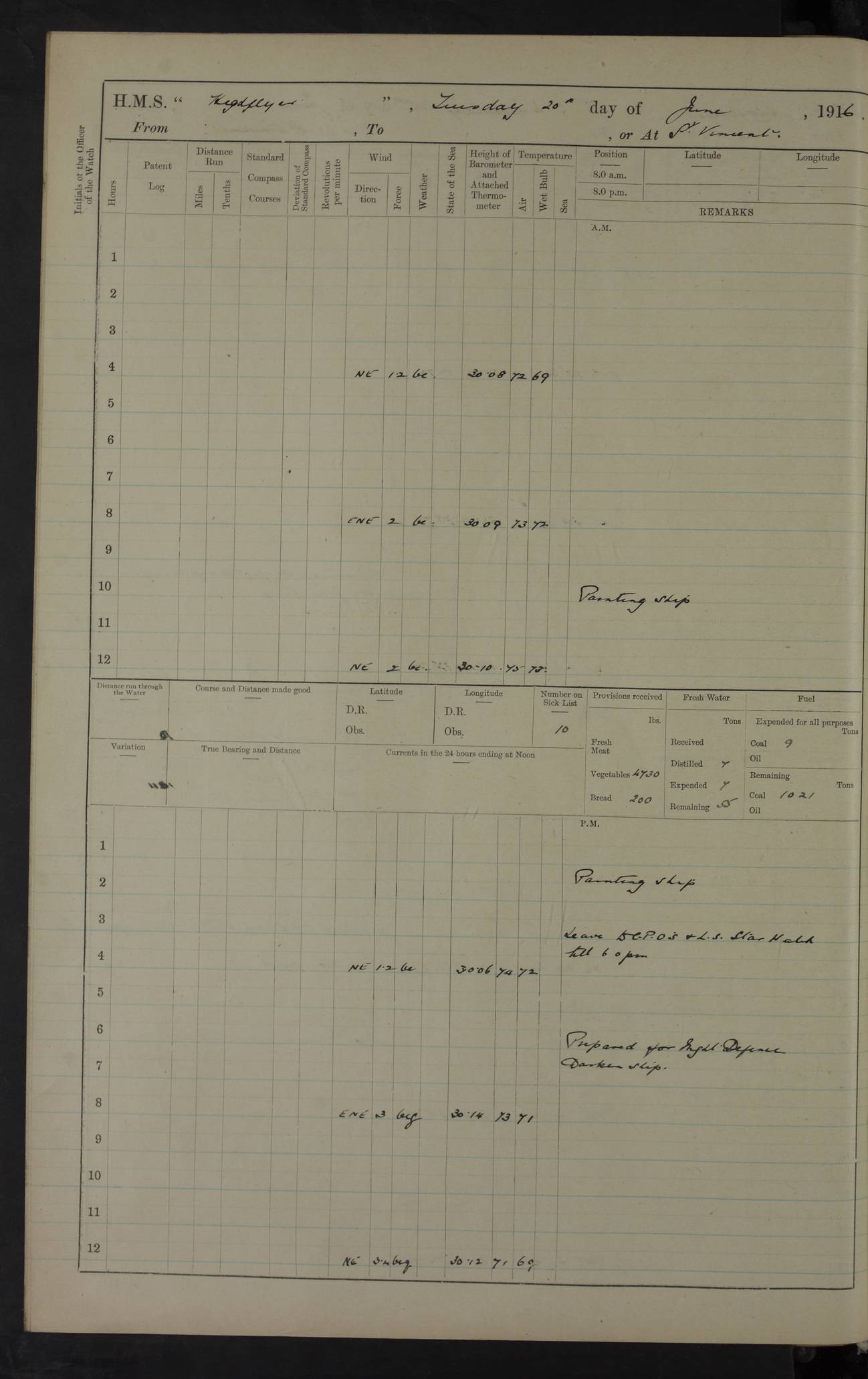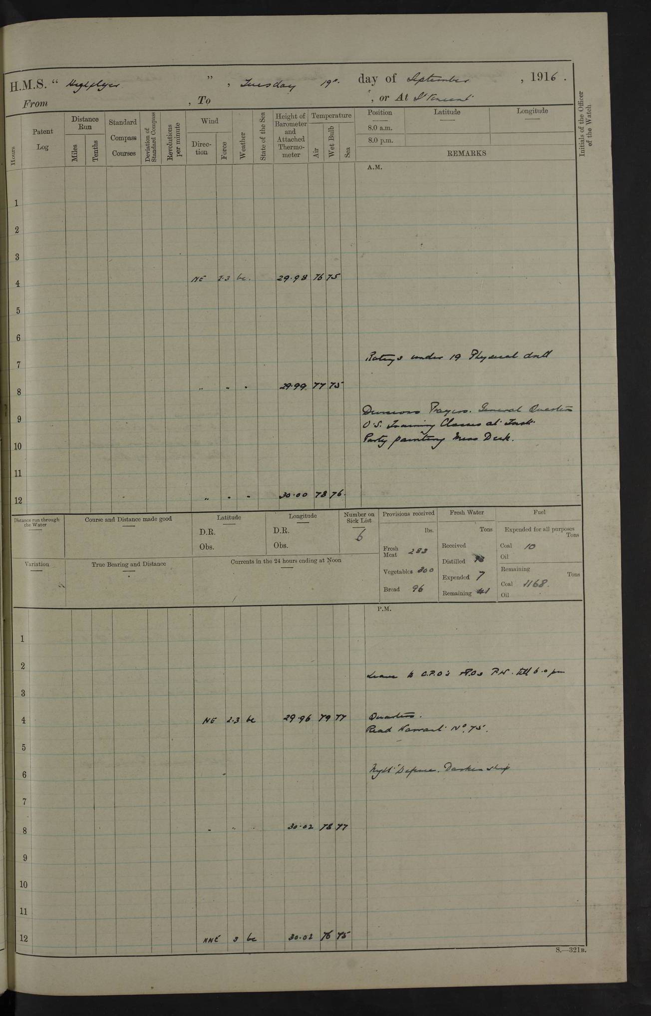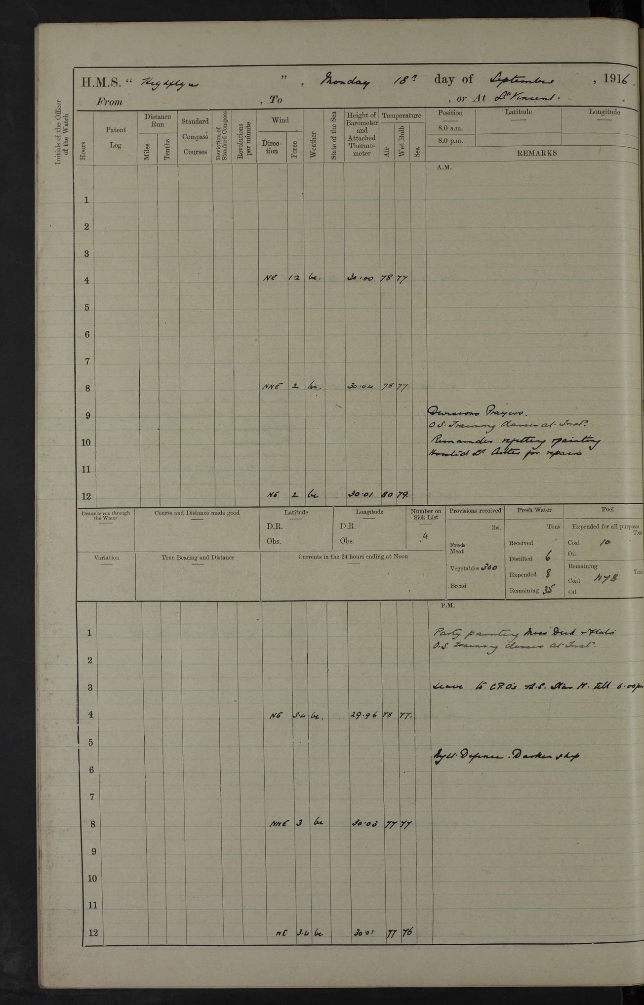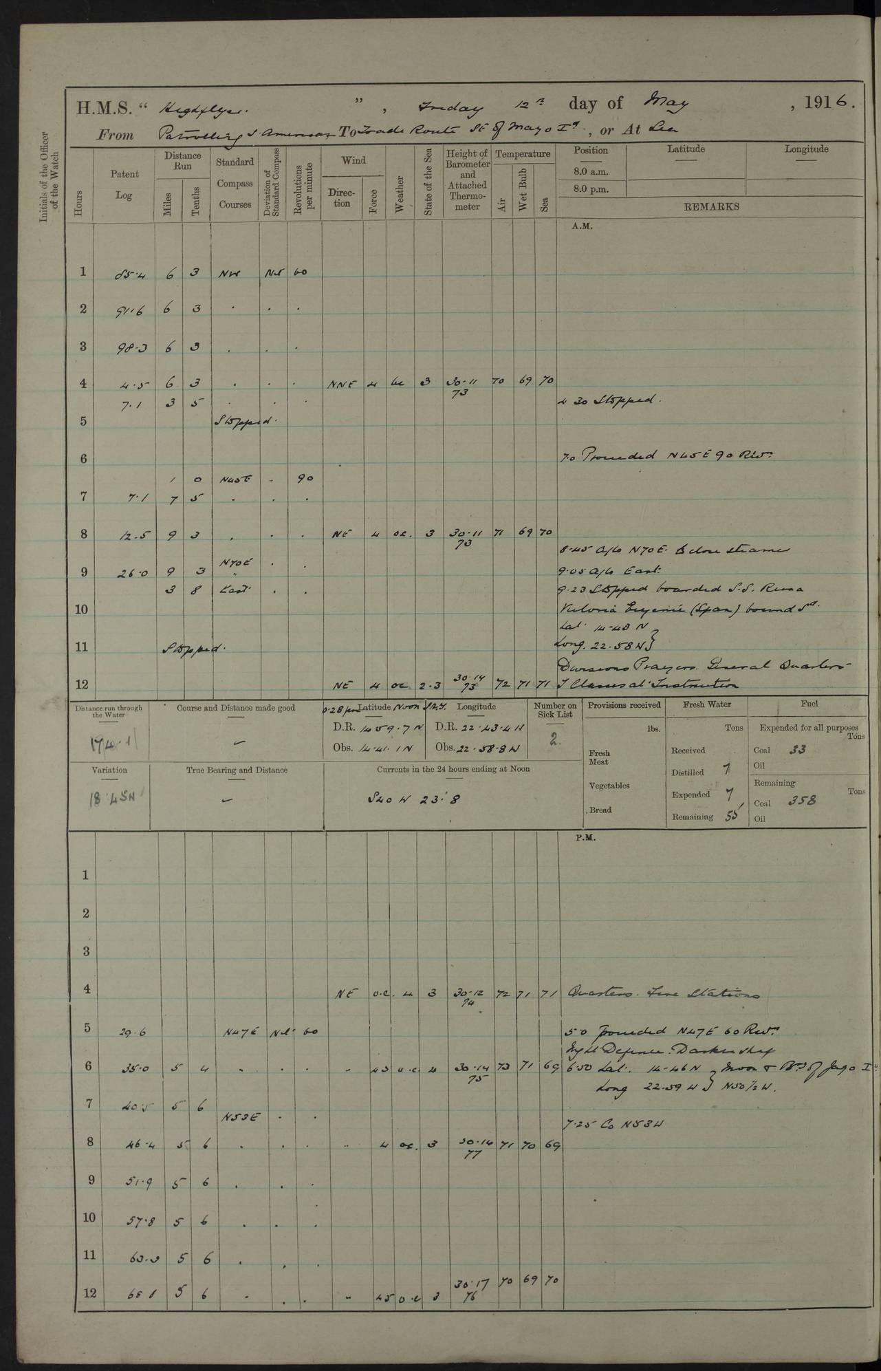 4f961154a2fc8e2def000869: (http://s3.amazonaws.com/oldweather/ADM53-44303/ADM 53-44303-011_0.jpg) 12 February 1916 Patrolling S American trade route to northward Lat 3.9, Long -29.9 7.38am: Stopped, boarded SS REINLAND (Dutch) bound southward Lat 3.13.4N, 30.01W. 4f961155a2fc8e2def00086a: (http://s3.amazonaws.com/oldweather/ADM53-44303/ADM 53-44303-011_1.jpg) 13 February 1916 Patrolling S American trade routes to northward Lat 7.8, Long -28.3 9.00am: Held Divine Service. 4f961155a2fc8e2def00086b: (http://s3.amazonaws.com/oldweather/ADM53-44303/ADM 53-44303-012_0.jpg) 14 February 1916 Patrolling trade routes. to northward Lat 11.4, Long -27.0 9.40am: 90 revs. Course as requisite for aiming rifle practice. 4f961155a2fc8e2def00086c: (http://s3.amazonaws.com/oldweather/ADM53-44303/ADM 53-44303-012_1.jpg) 15 February 1916 Towards Brava Id. Lat 14.2, Long -25.3 9.25am: Stopped, dropped target. Course and speed as requisite to carry out heavy gun practice. 4.00pm: Sighted Brava Id. vis. 1½ miles. Passed W side. 4f961156a2fc8e2def00086d: (http://s3.amazonaws.com/oldweather/ADM53-44303/ADM 53-44303-013_0.jpg) 16 February 1916 St. Vincent Lat 16.8828, Long -25.0106 7.35am: Land ahead visibility 1½’ San Antonio. 8.30am: Course as requisite for entering harbour. 11.00am: Preparing for coaling. 4f961156a2fc8e2def00086e: (http://s3.amazonaws.com/oldweather/ADM53-44303/ADM 53-44303-013_1.jpg) 17 February 1916 St. Vincent Lat 16.8828, Long -25.0106 6.00am: Collier SS PENHALE came alongside. 6.45am: Commenced coaling. 4f961156a2fc8e2def00086f: (http://s3.amazonaws.com/oldweather/ADM53-44303/ADM 53-44303-014_0.jpg) 18 February 1916 St. Vincent Lat 16.8828, Long -25.0106 Cleaning ship. 2.30pm: Drawing new fenders from SS TAMPLIN. 4f961157a2fc8e2def000870: (http://s3.amazonaws.com/oldweather/ADM53-44303/ADM 53-44303-014_1.jpg) 19 February 1916 St. Vincent Lat 16.8828, Long -25.0106 10.30am: Diving party sent to SS TAMPLIN. 4f961157a2fc8e2def000871: (http://s3.amazonaws.com/oldweather/ADM53-44303/ADM 53-44303-015_0.jpg) 20 February 1916 St. Vincent Lat 16.8828, Long -25.0106 7.00am: Sent diving party to TAMPLIN. 4f961157a2fc8e2def000872: (http://s3.amazonaws.com/oldweather/ADM53-44303/ADM 53-44303-015_1.jpg) 21 February 1916 St. Vincent to patrol Lat 16.8828, Long -25.0106 8.30am: Diving party sent to SS TAMPLIN. 6.40pm: Weighed and proceeded as requisite out of harbour. 8.30pm: Bull Point Lt. Ho. N24W, 6000 yds. 4f961158a2fc8e2def000873: (http://s3.amazonaws.com/oldweather/ADM53-44303/ADM 53-44303-016_0.jpg) 22 February 1916 Patrolling northward off San Antonio Id. Lat 18.1, Long -25.3 Painting ship and as requisite. 7.00pm: Western point San Antonio abeam 10’. 4f961158a2fc8e2def000874: (http://s3.amazonaws.com/oldweather/ADM53-44303/ADM 53-44303-016_1.jpg) 23 February 1916 Off San Antonio and St. Vincent to Tarrafal Bay Lat 16.8, Long -25.2 12.00pm: Spoke SS JASON, Brit., bound St. Vincent. 1.12pm: Boarded SS WILLEM VAN DREIL (Dutch) bound St. Vincent. 3.35pm: Stopped, came to with SB, in 33 fathoms. 4f961158a2fc8e2def000875: (http://s3.amazonaws.com/oldweather/ADM53-44303/ADM 53-44303-017_0.jpg) 24 February 1916 Tarrafal Bay, San Antonio Id. to St. Vincent Lat 16.8828, Long -25.0106 9.43 am; Proceeded. Course as requisite to St. Vincent round S end San Antonio 120 revs. 11.17am: Came to with SB in 11 fathoms. 4f961159a2fc8e2def000876: (http://s3.amazonaws.com/oldweather/ADM53-44303/ADM 53-44303-017_1.jpg) 25 February 1916 St. Vincent Lat 16.8828, Long -25.0106 Painting ship. Boys and OS at instruction. Control party at drill. 4f961159a2fc8e2def000877: (http://s3.amazonaws.com/oldweather/ADM53-44303/ADM 53-44303-018_0.jpg) 26 February 1916 St. Vincent Lat 16.8828, Long -25.0106 Cleaning ship. 4f961159a2fc8e2def000878: (http://s3.amazonaws.com/oldweather/ADM53-44303/ADM 53-44303-018_1.jpg) 27 February 1916 St. Vincent Lat 16.8828, Long -25.0106 9.30am: Held Divine Service. 4f96115aa2fc8e2def000879: (http://s3.amazonaws.com/oldweather/ADM53-44303/ADM 53-44303-019_0.jpg) 28 February 1916 St. Vincent Lat 16.8828, Long -25.0106 Boys and OS at instruction. Control party at drill. Remainder preparing for coaling. 2.00pm: Diving party at SS TAMPLIN. 4f96115aa2fc8e2def00087a: (http://s3.amazonaws.com/oldweather/ADM53-44303/ADM 53-44303-019_1.jpg) 29 February 1916 St. Vincent Lat 16.8828, Long -25.0106 7.15am: Commenced coaling from lighter. 8.00am: HMS SWIFTSURE arrived. USS CHESTER arrived. 4f96115aa2fc8e2def00087b: (http://s3.amazonaws.com/oldweather/ADM53-44303/ADM 53-44303-020_0.jpg) 4f96115ba2fc8e2def00087c: (http://s3.amazonaws.com/oldweather/ADM53-44303/ADM 53-44303-020_1.jpg) 4f96115ba2fc8e2def00087d: (http://s3.amazonaws.com/oldweather/ADM53-44303/ADM 53-44303-021_0.jpg) 4f96115ba2fc8e2def00087e: (http://s3.amazonaws.com/oldweather/ADM53-44303/ADM 53-44303-021_1.jpg) LOGS FOR MARCH 1916 4f96115ca2fc8e2def00087f: (http://s3.amazonaws.com/oldweather/ADM53-44304/ADM 53-44304-001_0.jpg) 4f96115ca2fc8e2def000880: (http://s3.amazonaws.com/oldweather/ADM53-44304/ADM 53-44304-001_1.jpg) 4f96115ca2fc8e2def000881: (http://s3.amazonaws.com/oldweather/ADM53-44304/ADM 53-44304-002_0.jpg) 4f96115da2fc8e2def000882: (http://s3.amazonaws.com/oldweather/ADM53-44304/ADM 53-44304-002_1.jpg) 4f96115da2fc8e2def000883: (http://s3.amazonaws.com/oldweather/ADM53-44304/ADM 53-44304-003_0.jpg) 4f96115da2fc8e2def000884: (http://s3.amazonaws.com/oldweather/ADM53-44304/ADM 53-44304-003_1.jpg) 4f96115da2fc8e2def000885: (http://s3.amazonaws.com/oldweather/ADM53-44304/ADM 53-44304-004_0.jpg) 4f96115ea2fc8e2def000886: (http://s3.amazonaws.com/oldweather/ADM53-44304/ADM 53-44304-004_1.jpg) 4f96115ea2fc8e2def000887: (http://s3.amazonaws.com/oldweather/ADM53-44304/ADM 53-44304-005_0.jpg) 4f96115ea2fc8e2def000888: (http://s3.amazonaws.com/oldweather/ADM53-44304/ADM 53-44304-005_1.jpg) 1 March 1916 St. Vincent Lat 16.8828, Long -25.0106 9.30pm: Discharged 1 Officer and 1 Tel. Rating to SS NORTHWAITE. 10.00pm: Surgeon Hobbs joined ship fro