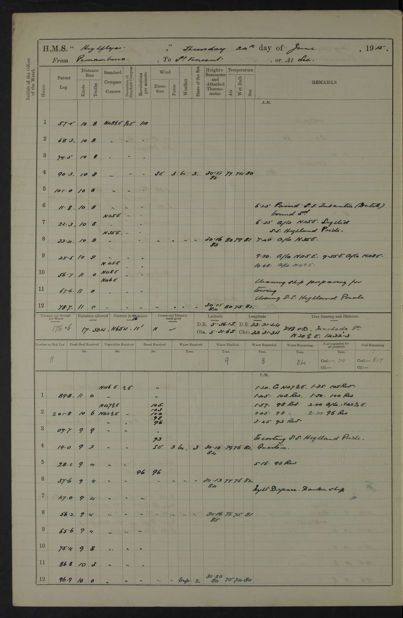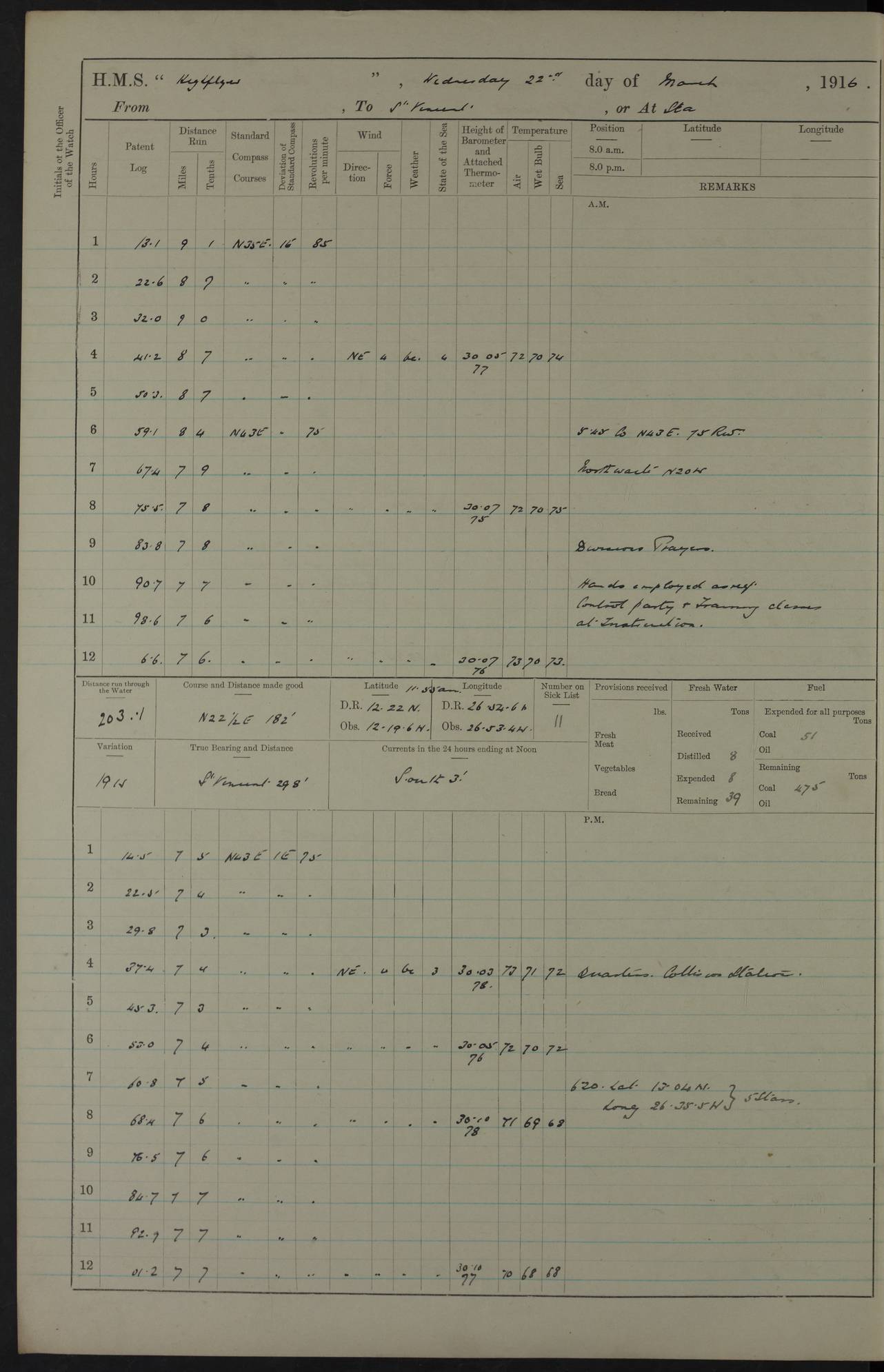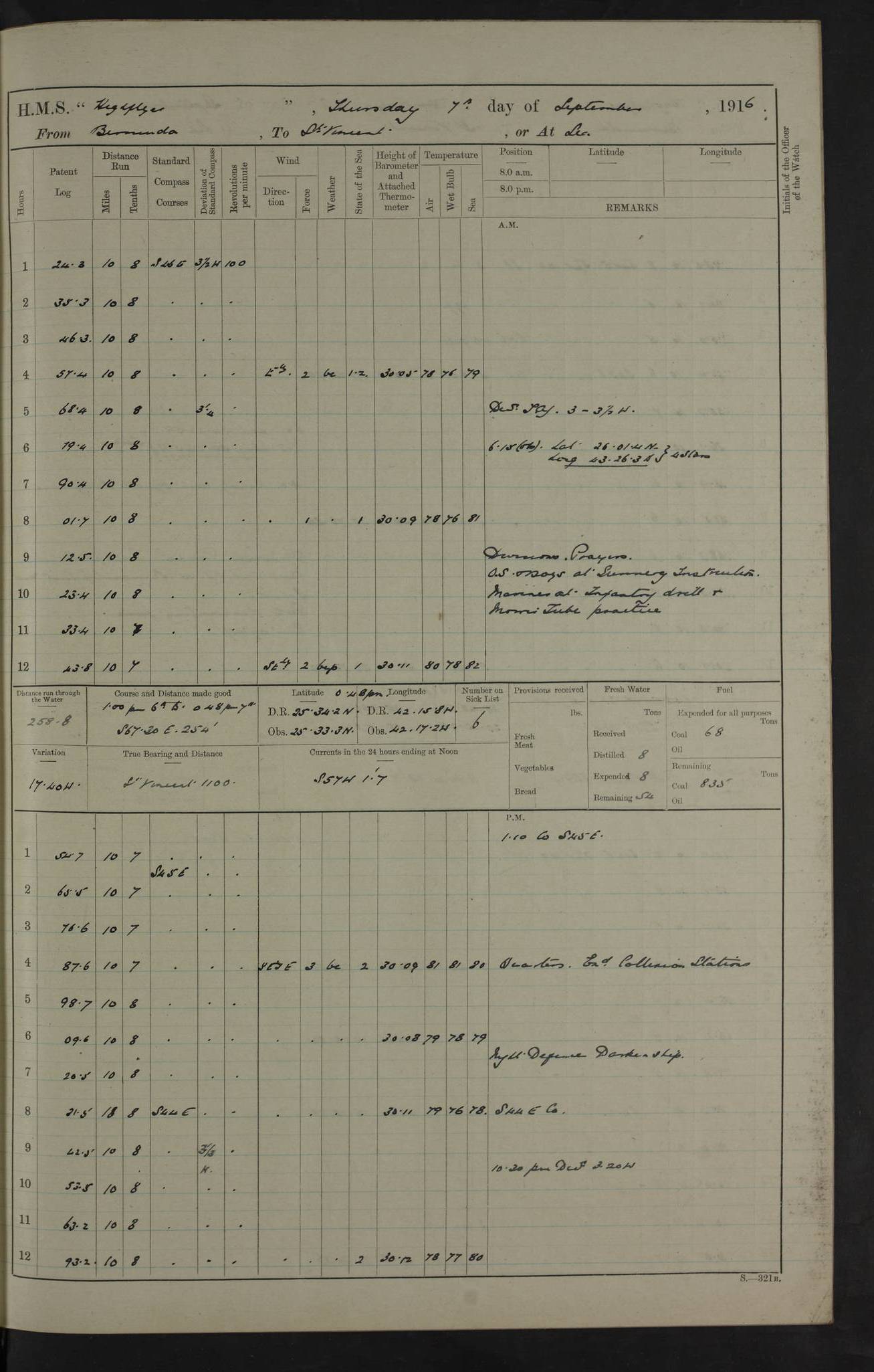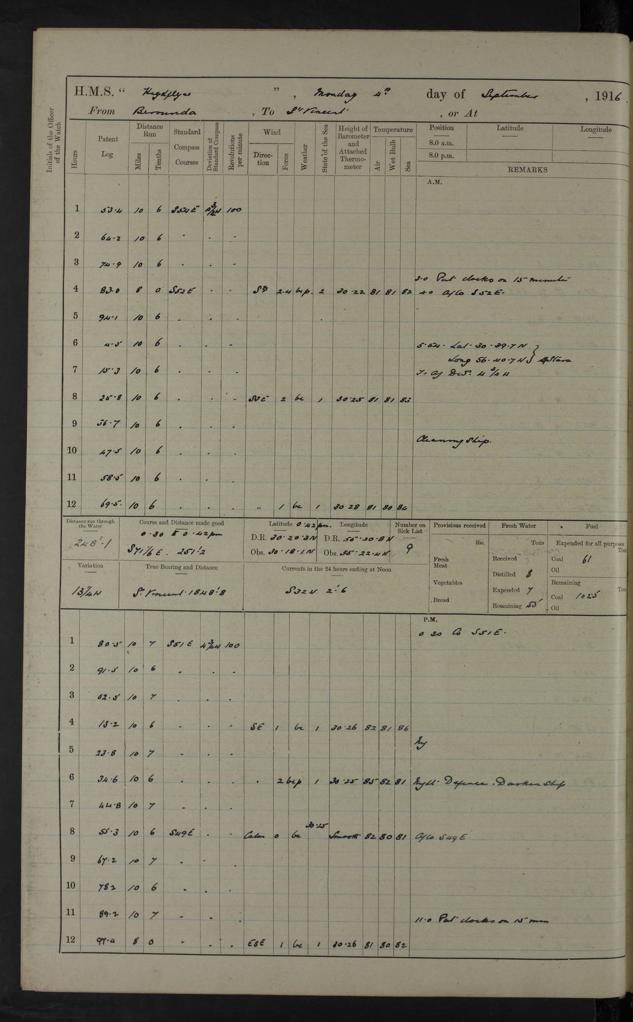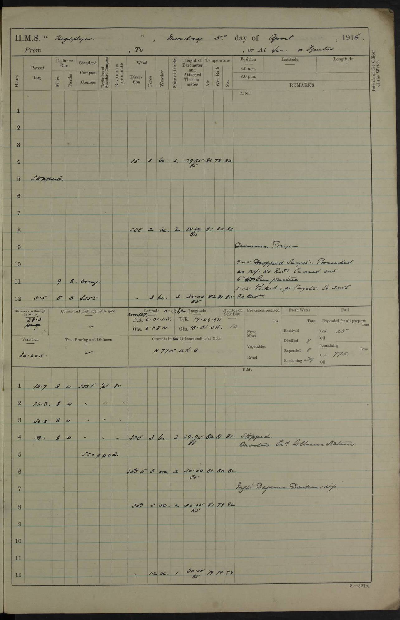 4f961154a2fc8e2def000869: (http://s3.amazonaws.com/oldweather/ADM53-44303/ADM 53-44303-011_0.jpg) 12 February 1916 Patrolling S American trade route to northward Lat 3.9, Long -29.9 7.38am: Stopped, boarded SS REINLAND (Dutch) bound southward Lat 3.13.4N, 30.01W. 4f961155a2fc8e2def00086a: (http://s3.amazonaws.com/oldweather/ADM53-44303/ADM 53-44303-011_1.jpg) 13 February 1916 Patrolling S American trade routes to northward Lat 7.8, Long -28.3 9.00am: Held Divine Service. 4f961155a2fc8e2def00086b: (http://s3.amazonaws.com/oldweather/ADM53-44303/ADM 53-44303-012_0.jpg) 14 February 1916 Patrolling trade routes. to northward Lat 11.4, Long -27.0 9.40am: 90 revs. Course as requisite for aiming rifle practice. 4f961155a2fc8e2def00086c: (http://s3.amazonaws.com/oldweather/ADM53-44303/ADM 53-44303-012_1.jpg) 15 February 1916 Towards Brava Id. Lat 14.2, Long -25.3 9.25am: Stopped, dropped target. Course and speed as requisite to carry out heavy gun practice. 4.00pm: Sighted Brava Id. vis. 1½ miles. Passed W side. 4f961156a2fc8e2def00086d: (http://s3.amazonaws.com/oldweather/ADM53-44303/ADM 53-44303-013_0.jpg) 16 February 1916 St. Vincent Lat 16.8828, Long -25.0106 7.35am: Land ahead visibility 1½’ San Antonio. 8.30am: Course as requisite for entering harbour. 11.00am: Preparing for coaling. 4f961156a2fc8e2def00086e: (http://s3.amazonaws.com/oldweather/ADM53-44303/ADM 53-44303-013_1.jpg) 17 February 1916 St. Vincent Lat 16.8828, Long -25.0106 6.00am: Collier SS PENHALE came alongside. 6.45am: Commenced coaling. 4f961156a2fc8e2def00086f: (http://s3.amazonaws.com/oldweather/ADM53-44303/ADM 53-44303-014_0.jpg) 18 February 1916 St. Vincent Lat 16.8828, Long -25.0106 Cleaning ship. 2.30pm: Drawing new fenders from SS TAMPLIN. 4f961157a2fc8e2def000870: (http://s3.amazonaws.com/oldweather/ADM53-44303/ADM 53-44303-014_1.jpg) 19 February 1916 St. Vincent Lat 16.8828, Long -25.0106 10.30am: Diving party sent to SS TAMPLIN. 4f961157a2fc8e2def000871: (http://s3.amazonaws.com/oldweather/ADM53-44303/ADM 53-44303-015_0.jpg) 20 February 1916 St. Vincent Lat 16.8828, Long -25.0106 7.00am: Sent diving party to TAMPLIN. 4f961157a2fc8e2def000872: (http://s3.amazonaws.com/oldweather/ADM53-44303/ADM 53-44303-015_1.jpg) 21 February 1916 St. Vincent to patrol Lat 16.8828, Long -25.0106 8.30am: Diving party sent to SS TAMPLIN. 6.40pm: Weighed and proceeded as requisite out of harbour. 8.30pm: Bull Point Lt. Ho. N24W, 6000 yds. 4f961158a2fc8e2def000873: (http://s3.amazonaws.com/oldweather/ADM53-44303/ADM 53-44303-016_0.jpg) 22 February 1916 Patrolling northward off San Antonio Id. Lat 18.1, Long -25.3 Painting ship and as requisite. 7.00pm: Western point San Antonio abeam 10’. 4f961158a2fc8e2def000874: (http://s3.amazonaws.com/oldweather/ADM53-44303/ADM 53-44303-016_1.jpg) 23 February 1916 Off San Antonio and St. Vincent to Tarrafal Bay Lat 16.8, Long -25.2 12.00pm: Spoke SS JASON, Brit., bound St. Vincent. 1.12pm: Boarded SS WILLEM VAN DREIL (Dutch) bound St. Vincent. 3.35pm: Stopped, came to with SB, in 33 fathoms. 4f961158a2fc8e2def000875: (http://s3.amazonaws.com/oldweather/ADM53-44303/ADM 53-44303-017_0.jpg) 24 February 1916 Tarrafal Bay, San Antonio Id. to St. Vincent Lat 16.8828, Long -25.0106 9.43 am; Proceeded. Course as requisite to St. Vincent round S end San Antonio 120 revs. 11.17am: Came to with SB in 11 fathoms. 4f961159a2fc8e2def000876: (http://s3.amazonaws.com/oldweather/ADM53-44303/ADM 53-44303-017_1.jpg) 25 February 1916 St. Vincent Lat 16.8828, Long -25.0106 Painting ship. Boys and OS at instruction. Control party at drill. 4f961159a2fc8e2def000877: (http://s3.amazonaws.com/oldweather/ADM53-44303/ADM 53-44303-018_0.jpg) 26 February 1916 St. Vincent Lat 16.8828, Long -25.0106 Cleaning ship. 4f961159a2fc8e2def000878: (http://s3.amazonaws.com/oldweather/ADM53-44303/ADM 53-44303-018_1.jpg) 27 February 1916 St. Vincent Lat 16.8828, Long -25.0106 9.30am: Held Divine Service. 4f96115aa2fc8e2def000879: (http://s3.amazonaws.com/oldweather/ADM53-44303/ADM 53-44303-019_0.jpg) 28 February 1916 St. Vincent Lat 16.8828, Long -25.0106 Boys and OS at instruction. Control party at drill. Remainder preparing for coaling. 2.00pm: Diving party at SS TAMPLIN. 4f96115aa2fc8e2def00087a: (http://s3.amazonaws.com/oldweather/ADM53-44303/ADM 53-44303-019_1.jpg) 29 February 1916 St. Vincent Lat 16.8828, Long -25.0106 7.15am: Commenced coaling from lighter. 8.00am: HMS SWIFTSURE arrived. USS CHESTER arrived. 4f96115aa2fc8e2def00087b: (http://s3.amazonaws.com/oldweather/ADM53-44303/ADM 53-44303-020_0.jpg) 4f96115ba2fc8e2def00087c: (http://s3.amazonaws.com/oldweather/ADM53-44303/ADM 53-44303-020_1.jpg) 4f96115ba2fc8e2def00087d: (http://s3.amazonaws.com/oldweather/ADM53-44303/ADM 53-44303-021_0.jpg) 4f96115ba2fc8e2def00087e: (http://s3.amazonaws.com/oldweather/ADM53-44303/ADM 53-44303-021_1.jpg) LOGS FOR MARCH 1916 4f96115ca2fc8e2def00087f: (http://s3.amazonaws.com/oldweather/ADM53-44304/ADM 53-44304-001_0.jpg) 4f96115ca2fc8e2def000880: (http://s3.amazonaws.com/oldweather/ADM53-44304/ADM 53-44304-001_1.jpg) 4f96115ca2fc8e2def000881: (http://s3.amazonaws.com/oldweather/ADM53-44304/ADM 53-44304-002_0.jpg) 4f96115da2fc8e2def000882: (http://s3.amazonaws.com/oldweather/ADM53-44304/ADM 53-44304-002_1.jpg) 4f96115da2fc8e2def000883: (http://s3.amazonaws.com/oldweather/ADM53-44304/ADM 53-44304-003_0.jpg) 4f96115da2fc8e2def000884: (http://s3.amazonaws.com/oldweather/ADM53-44304/ADM 53-44304-003_1.jpg) 4f96115da2fc8e2def000885: (http://s3.amazonaws.com/oldweather/ADM53-44304/ADM 53-44304-004_0.jpg) 4f96115ea2fc8e2def000886: (http://s3.amazonaws.com/oldweather/ADM53-44304/ADM 53-44304-004_1.jpg) 4f96115ea2fc8e2def000887: (http://s3.amazonaws.com/oldweather/ADM53-44304/ADM 53-44304-005_0.jpg) 4f96115ea2fc8e2def000888: (http://s3.amazonaws.com/oldweather/ADM53-44304/ADM 53-44304-005_1.jpg) 1 March 1916 St. Vincent Lat 16.8828, Long -25.0106 9.30pm: Discharged 1 Officer and 1 Tel. Rating to SS NORTHWAITE. 10.00pm: Surgeon Hobbs joined ship fro