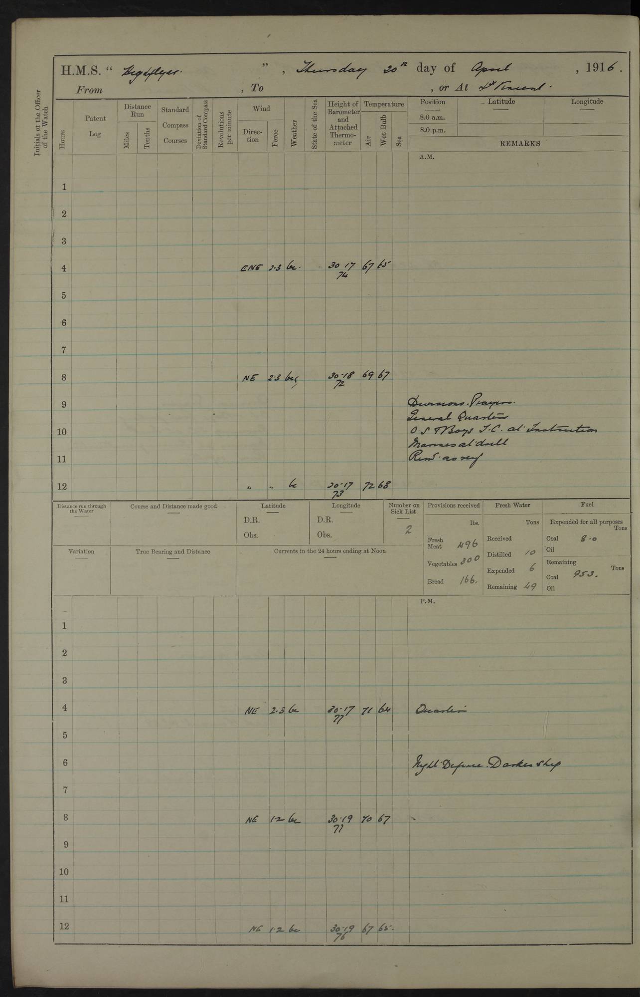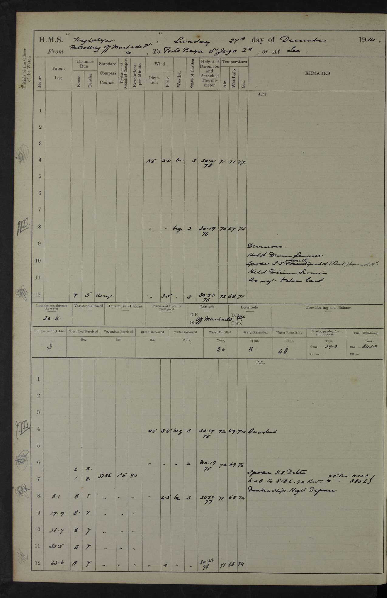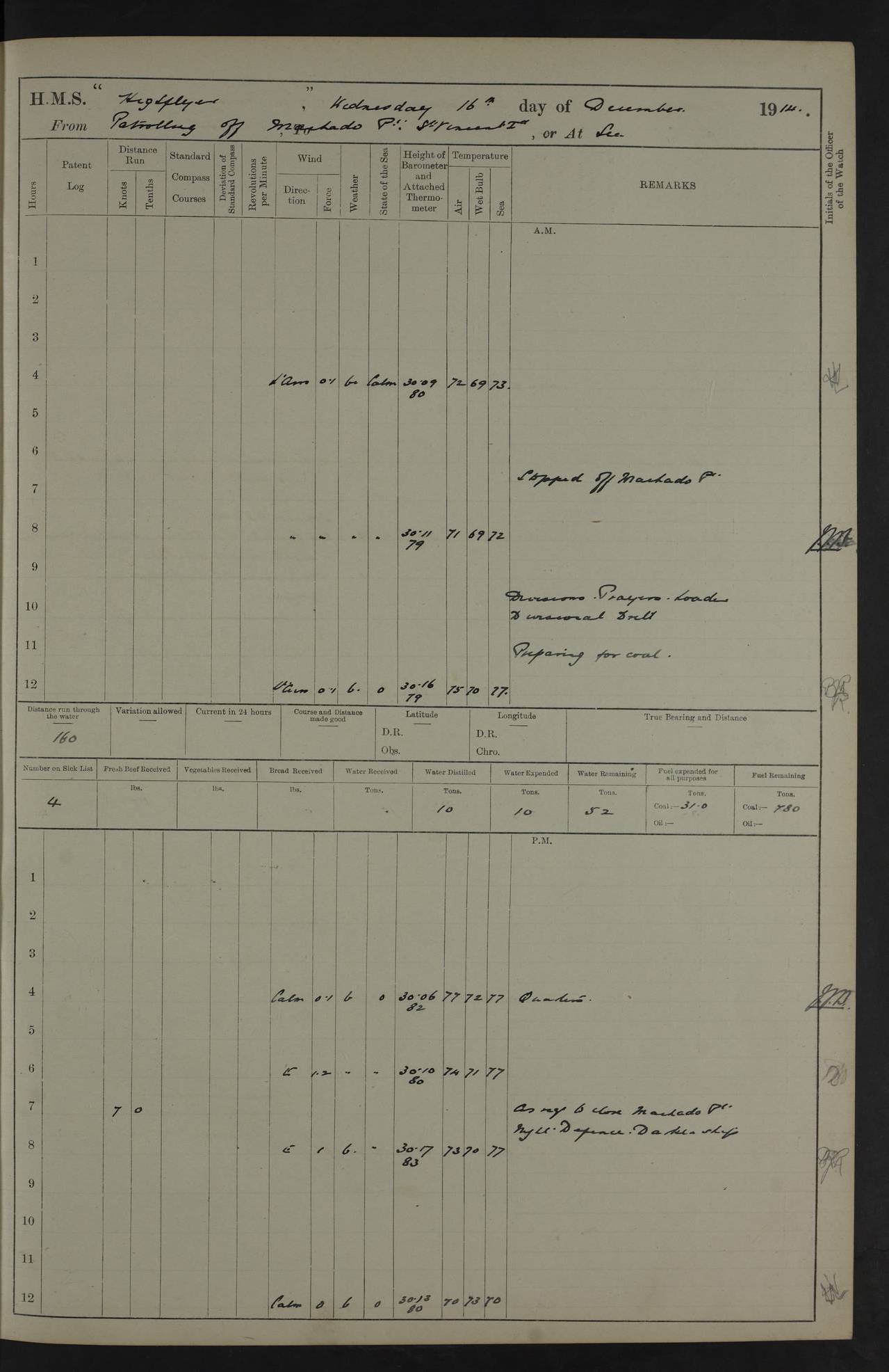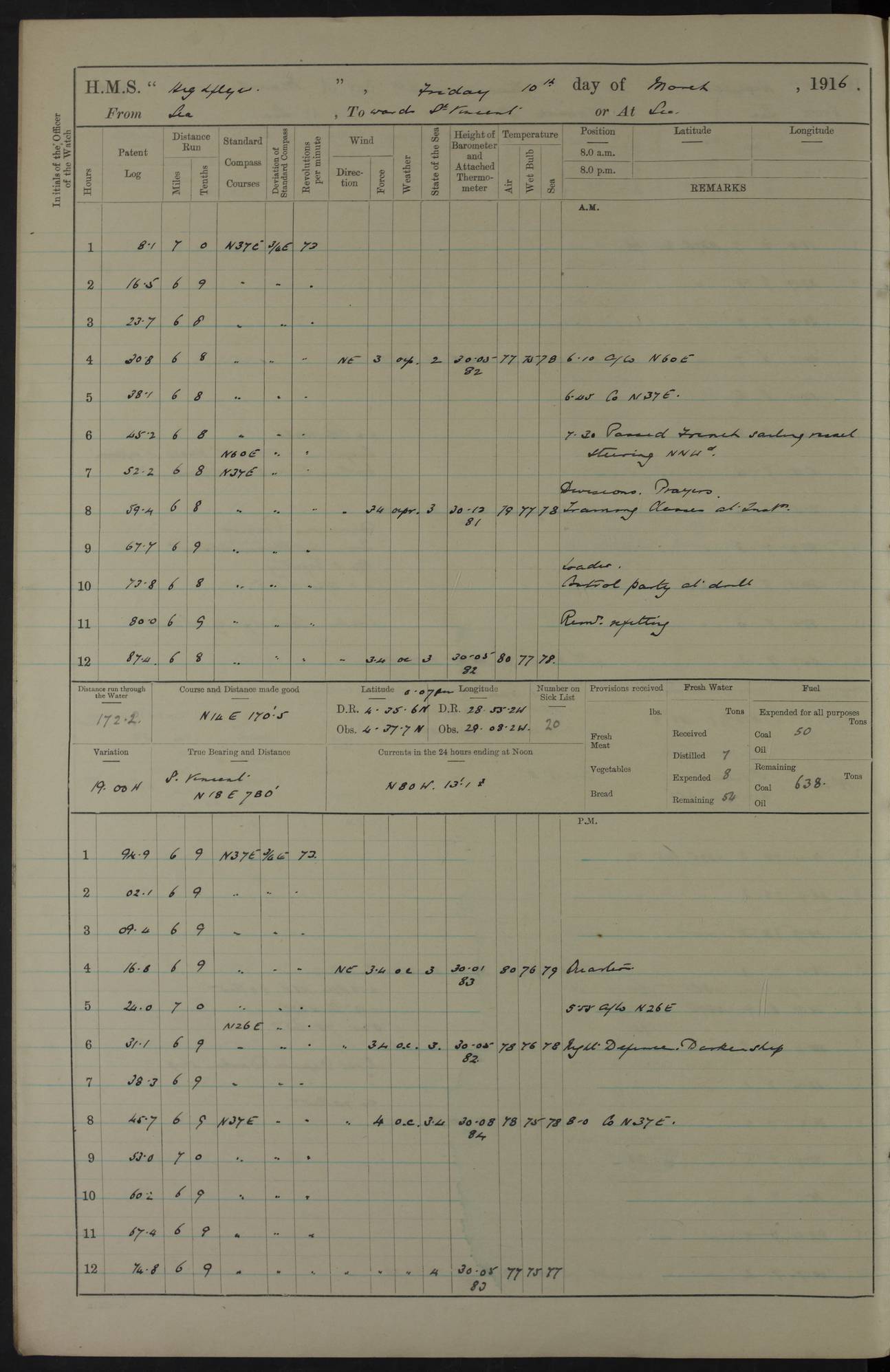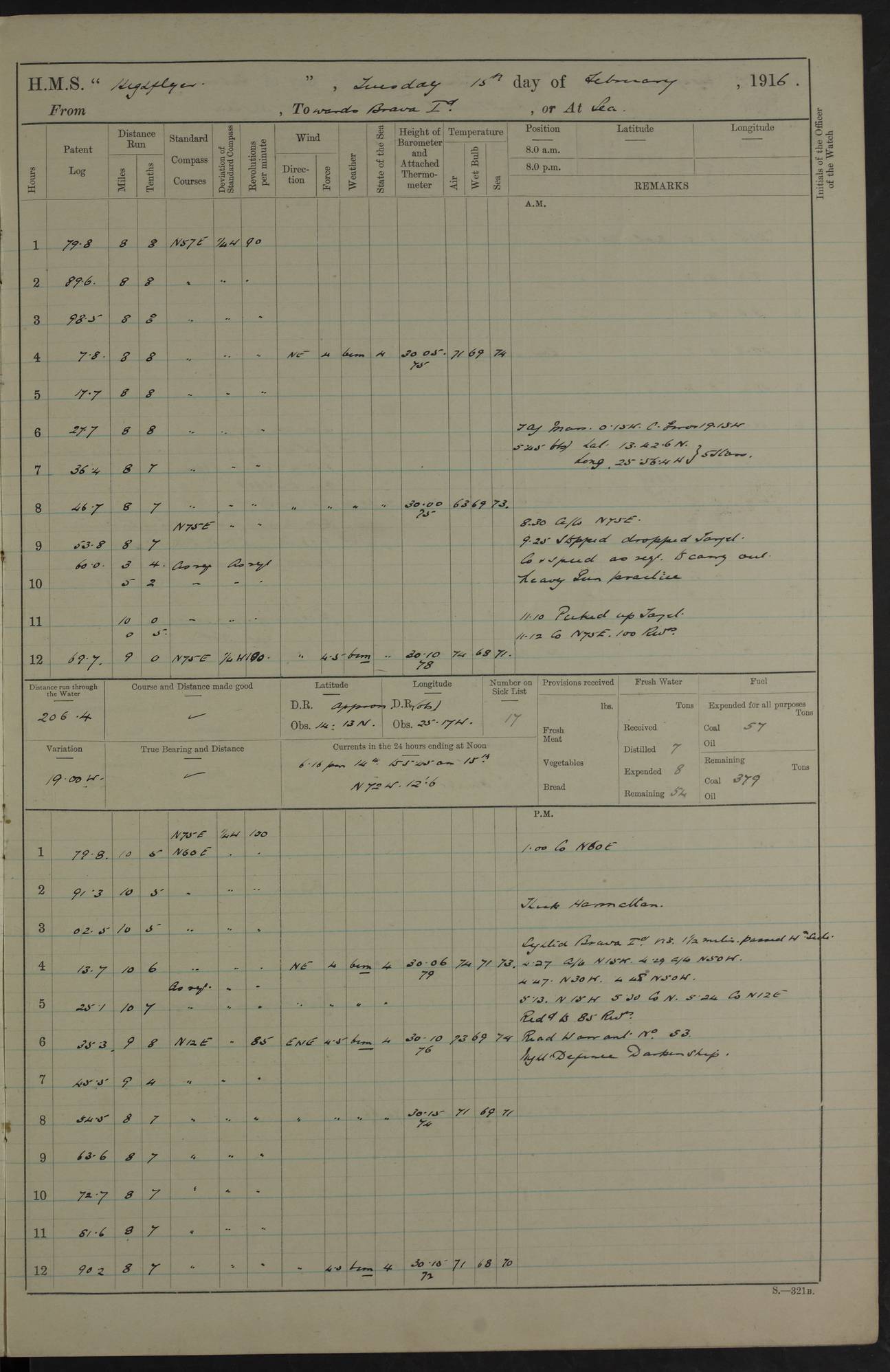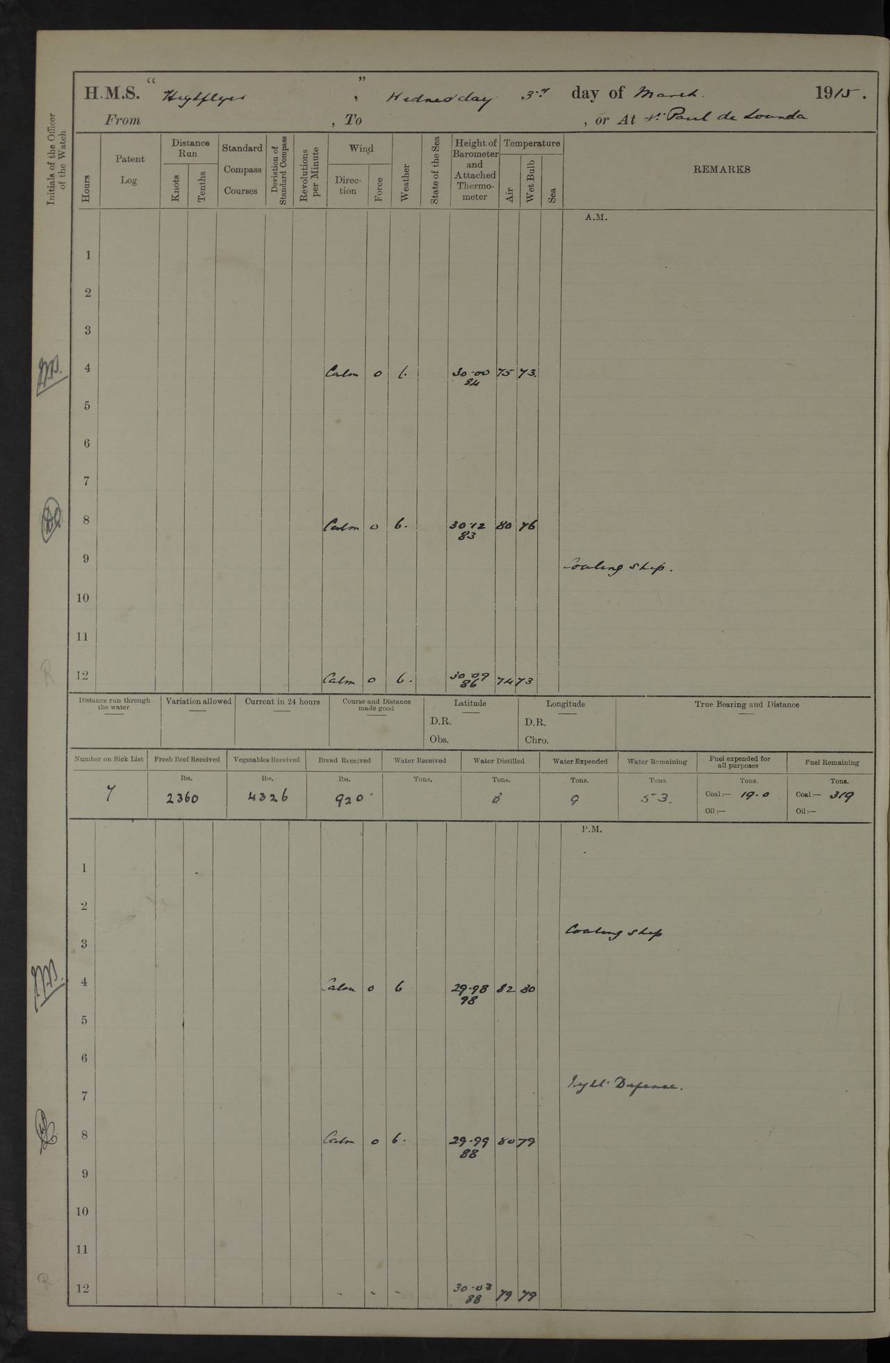 4f961154a2fc8e2def000869: (http://s3.amazonaws.com/oldweather/ADM53-44303/ADM 53-44303-011_0.jpg) 12 February 1916 Patrolling S American trade route to northward Lat 3.9, Long -29.9 7.38am: Stopped, boarded SS REINLAND (Dutch) bound southward Lat 3.13.4N, 30.01W. 4f961155a2fc8e2def00086a: (http://s3.amazonaws.com/oldweather/ADM53-44303/ADM 53-44303-011_1.jpg) 13 February 1916 Patrolling S American trade routes to northward Lat 7.8, Long -28.3 9.00am: Held Divine Service. 4f961155a2fc8e2def00086b: (http://s3.amazonaws.com/oldweather/ADM53-44303/ADM 53-44303-012_0.jpg) 14 February 1916 Patrolling trade routes. to northward Lat 11.4, Long -27.0 9.40am: 90 revs. Course as requisite for aiming rifle practice. 4f961155a2fc8e2def00086c: (http://s3.amazonaws.com/oldweather/ADM53-44303/ADM 53-44303-012_1.jpg) 15 February 1916 Towards Brava Id. Lat 14.2, Long -25.3 9.25am: Stopped, dropped target. Course and speed as requisite to carry out heavy gun practice. 4.00pm: Sighted Brava Id. vis. 1½ miles. Passed W side. 4f961156a2fc8e2def00086d: (http://s3.amazonaws.com/oldweather/ADM53-44303/ADM 53-44303-013_0.jpg) 16 February 1916 St. Vincent Lat 16.8828, Long -25.0106 7.35am: Land ahead visibility 1½’ San Antonio. 8.30am: Course as requisite for entering harbour. 11.00am: Preparing for coaling. 4f961156a2fc8e2def00086e: (http://s3.amazonaws.com/oldweather/ADM53-44303/ADM 53-44303-013_1.jpg) 17 February 1916 St. Vincent Lat 16.8828, Long -25.0106 6.00am: Collier SS PENHALE came alongside. 6.45am: Commenced coaling. 4f961156a2fc8e2def00086f: (http://s3.amazonaws.com/oldweather/ADM53-44303/ADM 53-44303-014_0.jpg) 18 February 1916 St. Vincent Lat 16.8828, Long -25.0106 Cleaning ship. 2.30pm: Drawing new fenders from SS TAMPLIN. 4f961157a2fc8e2def000870: (http://s3.amazonaws.com/oldweather/ADM53-44303/ADM 53-44303-014_1.jpg) 19 February 1916 St. Vincent Lat 16.8828, Long -25.0106 10.30am: Diving party sent to SS TAMPLIN. 4f961157a2fc8e2def000871: (http://s3.amazonaws.com/oldweather/ADM53-44303/ADM 53-44303-015_0.jpg) 20 February 1916 St. Vincent Lat 16.8828, Long -25.0106 7.00am: Sent diving party to TAMPLIN. 4f961157a2fc8e2def000872: (http://s3.amazonaws.com/oldweather/ADM53-44303/ADM 53-44303-015_1.jpg) 21 February 1916 St. Vincent to patrol Lat 16.8828, Long -25.0106 8.30am: Diving party sent to SS TAMPLIN. 6.40pm: Weighed and proceeded as requisite out of harbour. 8.30pm: Bull Point Lt. Ho. N24W, 6000 yds. 4f961158a2fc8e2def000873: (http://s3.amazonaws.com/oldweather/ADM53-44303/ADM 53-44303-016_0.jpg) 22 February 1916 Patrolling northward off San Antonio Id. Lat 18.1, Long -25.3 Painting ship and as requisite. 7.00pm: Western point San Antonio abeam 10’. 4f961158a2fc8e2def000874: (http://s3.amazonaws.com/oldweather/ADM53-44303/ADM 53-44303-016_1.jpg) 23 February 1916 Off San Antonio and St. Vincent to Tarrafal Bay Lat 16.8, Long -25.2 12.00pm: Spoke SS JASON, Brit., bound St. Vincent. 1.12pm: Boarded SS WILLEM VAN DREIL (Dutch) bound St. Vincent. 3.35pm: Stopped, came to with SB, in 33 fathoms. 4f961158a2fc8e2def000875: (http://s3.amazonaws.com/oldweather/ADM53-44303/ADM 53-44303-017_0.jpg) 24 February 1916 Tarrafal Bay, San Antonio Id. to St. Vincent Lat 16.8828, Long -25.0106 9.43 am; Proceeded. Course as requisite to St. Vincent round S end San Antonio 120 revs. 11.17am: Came to with SB in 11 fathoms. 4f961159a2fc8e2def000876: (http://s3.amazonaws.com/oldweather/ADM53-44303/ADM 53-44303-017_1.jpg) 25 February 1916 St. Vincent Lat 16.8828, Long -25.0106 Painting ship. Boys and OS at instruction. Control party at drill. 4f961159a2fc8e2def000877: (http://s3.amazonaws.com/oldweather/ADM53-44303/ADM 53-44303-018_0.jpg) 26 February 1916 St. Vincent Lat 16.8828, Long -25.0106 Cleaning ship. 4f961159a2fc8e2def000878: (http://s3.amazonaws.com/oldweather/ADM53-44303/ADM 53-44303-018_1.jpg) 27 February 1916 St. Vincent Lat 16.8828, Long -25.0106 9.30am: Held Divine Service. 4f96115aa2fc8e2def000879: (http://s3.amazonaws.com/oldweather/ADM53-44303/ADM 53-44303-019_0.jpg) 28 February 1916 St. Vincent Lat 16.8828, Long -25.0106 Boys and OS at instruction. Control party at drill. Remainder preparing for coaling. 2.00pm: Diving party at SS TAMPLIN. 4f96115aa2fc8e2def00087a: (http://s3.amazonaws.com/oldweather/ADM53-44303/ADM 53-44303-019_1.jpg) 29 February 1916 St. Vincent Lat 16.8828, Long -25.0106 7.15am: Commenced coaling from lighter. 8.00am: HMS SWIFTSURE arrived. USS CHESTER arrived. 4f96115aa2fc8e2def00087b: (http://s3.amazonaws.com/oldweather/ADM53-44303/ADM 53-44303-020_0.jpg) 4f96115ba2fc8e2def00087c: (http://s3.amazonaws.com/oldweather/ADM53-44303/ADM 53-44303-020_1.jpg) 4f96115ba2fc8e2def00087d: (http://s3.amazonaws.com/oldweather/ADM53-44303/ADM 53-44303-021_0.jpg) 4f96115ba2fc8e2def00087e: (http://s3.amazonaws.com/oldweather/ADM53-44303/ADM 53-44303-021_1.jpg) LOGS FOR MARCH 1916 4f96115ca2fc8e2def00087f: (http://s3.amazonaws.com/oldweather/ADM53-44304/ADM 53-44304-001_0.jpg) 4f96115ca2fc8e2def000880: (http://s3.amazonaws.com/oldweather/ADM53-44304/ADM 53-44304-001_1.jpg) 4f96115ca2fc8e2def000881: (http://s3.amazonaws.com/oldweather/ADM53-44304/ADM 53-44304-002_0.jpg) 4f96115da2fc8e2def000882: (http://s3.amazonaws.com/oldweather/ADM53-44304/ADM 53-44304-002_1.jpg) 4f96115da2fc8e2def000883: (http://s3.amazonaws.com/oldweather/ADM53-44304/ADM 53-44304-003_0.jpg) 4f96115da2fc8e2def000884: (http://s3.amazonaws.com/oldweather/ADM53-44304/ADM 53-44304-003_1.jpg) 4f96115da2fc8e2def000885: (http://s3.amazonaws.com/oldweather/ADM53-44304/ADM 53-44304-004_0.jpg) 4f96115ea2fc8e2def000886: (http://s3.amazonaws.com/oldweather/ADM53-44304/ADM 53-44304-004_1.jpg) 4f96115ea2fc8e2def000887: (http://s3.amazonaws.com/oldweather/ADM53-44304/ADM 53-44304-005_0.jpg) 4f96115ea2fc8e2def000888: (http://s3.amazonaws.com/oldweather/ADM53-44304/ADM 53-44304-005_1.jpg) 1 March 1916 St. Vincent Lat 16.8828, Long -25.0106 9.30pm: Discharged 1 Officer and 1 Tel. Rating to SS NORTHWAITE. 10.00pm: Surgeon Hobbs joined ship fro