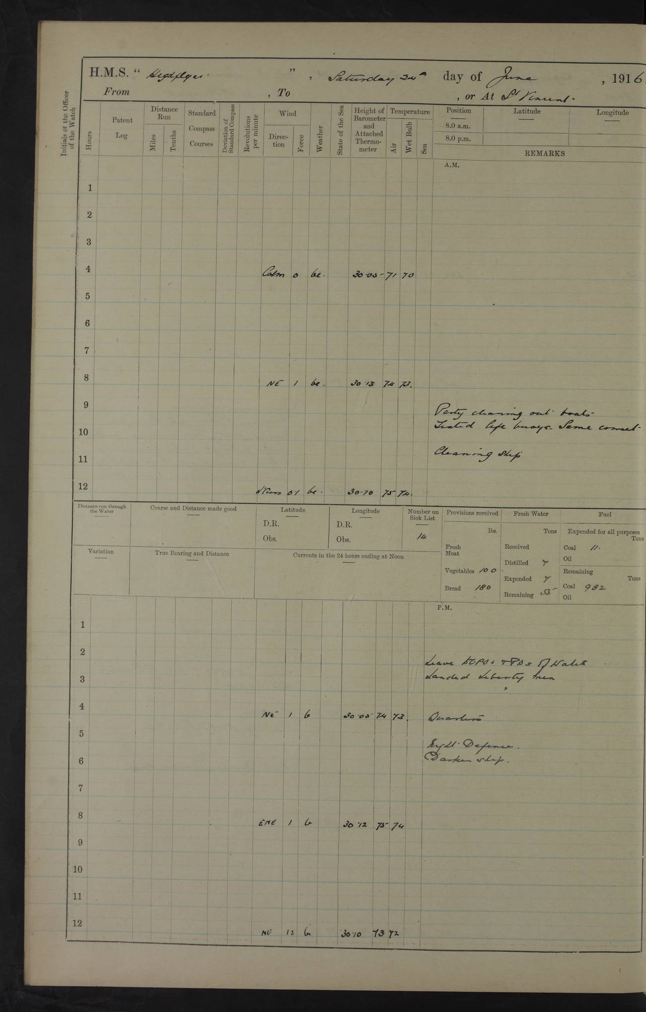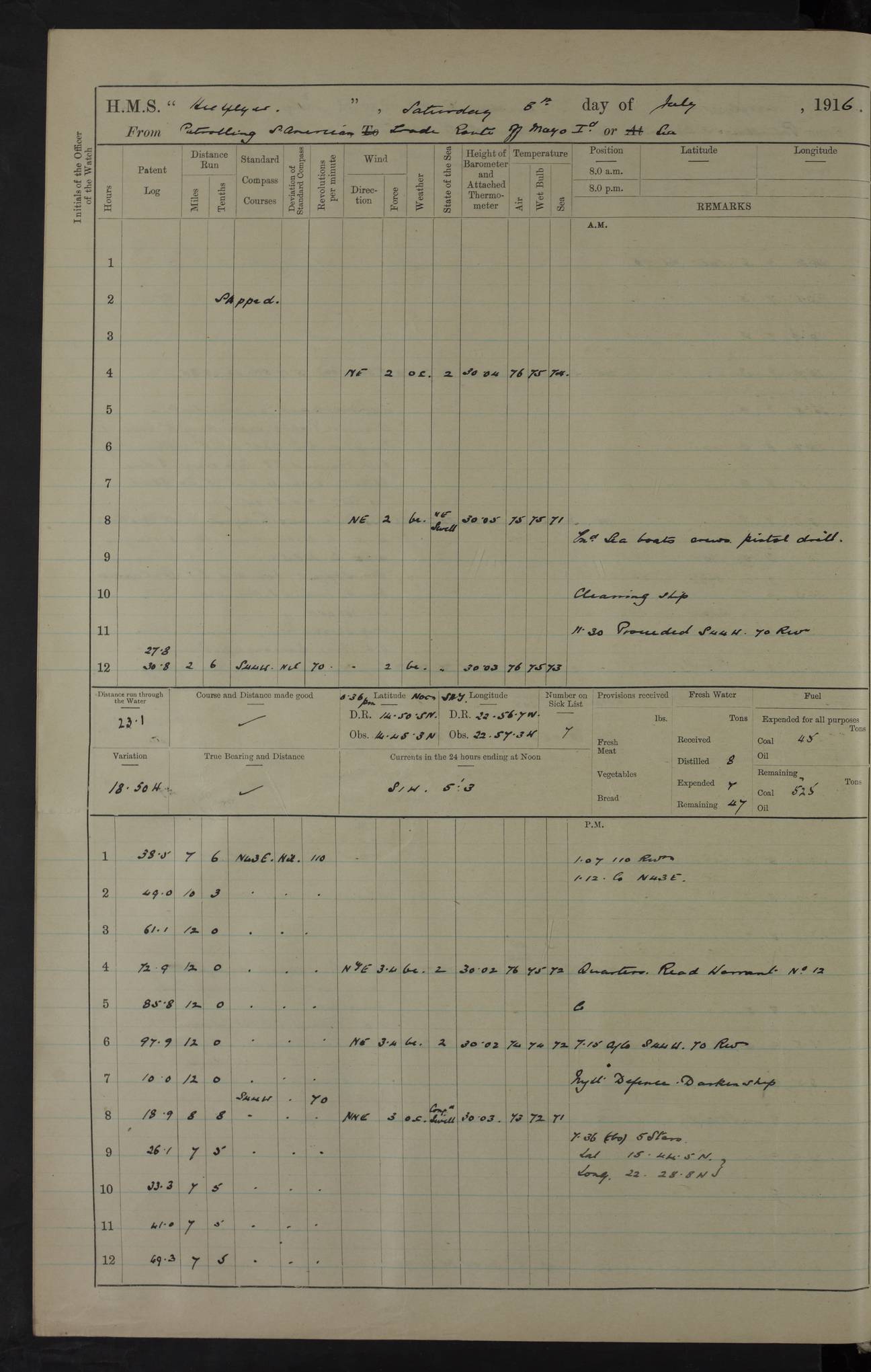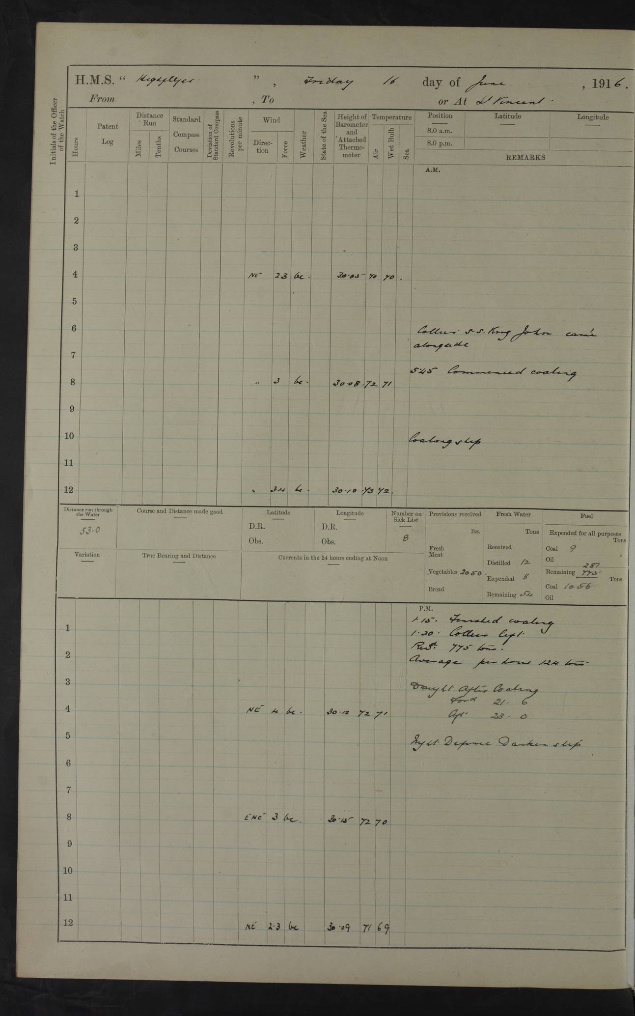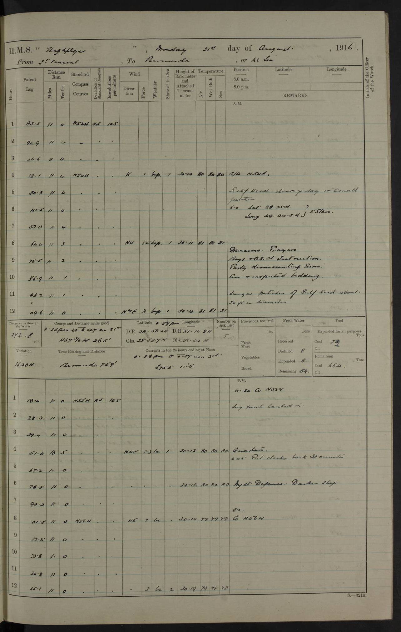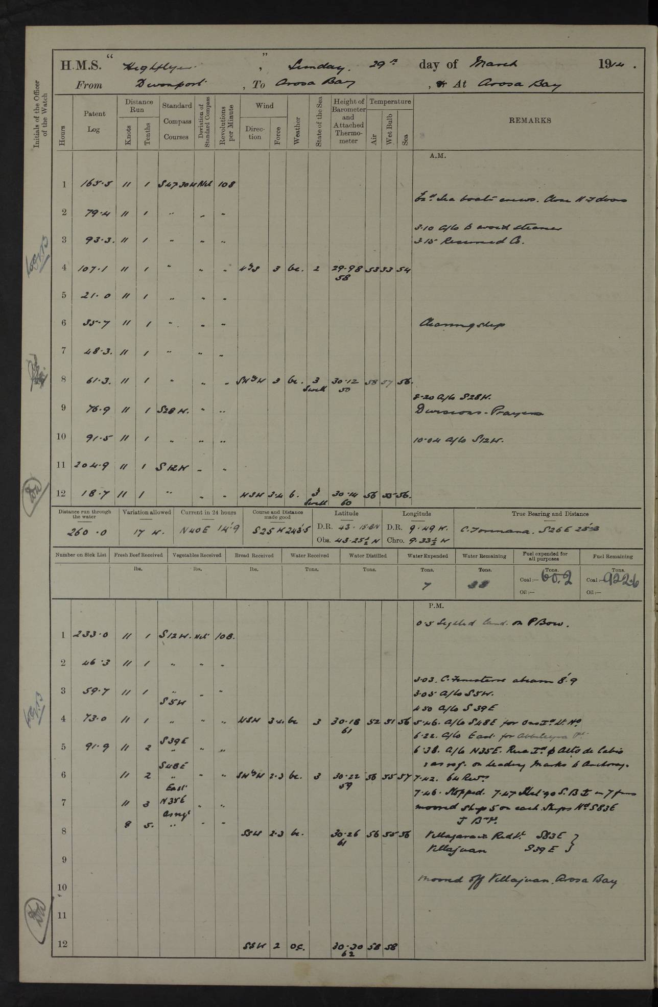 4f961154a2fc8e2def000869: (http://s3.amazonaws.com/oldweather/ADM53-44303/ADM 53-44303-011_0.jpg) 12 February 1916 Patrolling S American trade route to northward Lat 3.9, Long -29.9 7.38am: Stopped, boarded SS REINLAND (Dutch) bound southward Lat 3.13.4N, 30.01W. 4f961155a2fc8e2def00086a: (http://s3.amazonaws.com/oldweather/ADM53-44303/ADM 53-44303-011_1.jpg) 13 February 1916 Patrolling S American trade routes to northward Lat 7.8, Long -28.3 9.00am: Held Divine Service. 4f961155a2fc8e2def00086b: (http://s3.amazonaws.com/oldweather/ADM53-44303/ADM 53-44303-012_0.jpg) 14 February 1916 Patrolling trade routes. to northward Lat 11.4, Long -27.0 9.40am: 90 revs. Course as requisite for aiming rifle practice. 4f961155a2fc8e2def00086c: (http://s3.amazonaws.com/oldweather/ADM53-44303/ADM 53-44303-012_1.jpg) 15 February 1916 Towards Brava Id. Lat 14.2, Long -25.3 9.25am: Stopped, dropped target. Course and speed as requisite to carry out heavy gun practice. 4.00pm: Sighted Brava Id. vis. 1½ miles. Passed W side. 4f961156a2fc8e2def00086d: (http://s3.amazonaws.com/oldweather/ADM53-44303/ADM 53-44303-013_0.jpg) 16 February 1916 St. Vincent Lat 16.8828, Long -25.0106 7.35am: Land ahead visibility 1½’ San Antonio. 8.30am: Course as requisite for entering harbour. 11.00am: Preparing for coaling. 4f961156a2fc8e2def00086e: (http://s3.amazonaws.com/oldweather/ADM53-44303/ADM 53-44303-013_1.jpg) 17 February 1916 St. Vincent Lat 16.8828, Long -25.0106 6.00am: Collier SS PENHALE came alongside. 6.45am: Commenced coaling. 4f961156a2fc8e2def00086f: (http://s3.amazonaws.com/oldweather/ADM53-44303/ADM 53-44303-014_0.jpg) 18 February 1916 St. Vincent Lat 16.8828, Long -25.0106 Cleaning ship. 2.30pm: Drawing new fenders from SS TAMPLIN. 4f961157a2fc8e2def000870: (http://s3.amazonaws.com/oldweather/ADM53-44303/ADM 53-44303-014_1.jpg) 19 February 1916 St. Vincent Lat 16.8828, Long -25.0106 10.30am: Diving party sent to SS TAMPLIN. 4f961157a2fc8e2def000871: (http://s3.amazonaws.com/oldweather/ADM53-44303/ADM 53-44303-015_0.jpg) 20 February 1916 St. Vincent Lat 16.8828, Long -25.0106 7.00am: Sent diving party to TAMPLIN. 4f961157a2fc8e2def000872: (http://s3.amazonaws.com/oldweather/ADM53-44303/ADM 53-44303-015_1.jpg) 21 February 1916 St. Vincent to patrol Lat 16.8828, Long -25.0106 8.30am: Diving party sent to SS TAMPLIN. 6.40pm: Weighed and proceeded as requisite out of harbour. 8.30pm: Bull Point Lt. Ho. N24W, 6000 yds. 4f961158a2fc8e2def000873: (http://s3.amazonaws.com/oldweather/ADM53-44303/ADM 53-44303-016_0.jpg) 22 February 1916 Patrolling northward off San Antonio Id. Lat 18.1, Long -25.3 Painting ship and as requisite. 7.00pm: Western point San Antonio abeam 10’. 4f961158a2fc8e2def000874: (http://s3.amazonaws.com/oldweather/ADM53-44303/ADM 53-44303-016_1.jpg) 23 February 1916 Off San Antonio and St. Vincent to Tarrafal Bay Lat 16.8, Long -25.2 12.00pm: Spoke SS JASON, Brit., bound St. Vincent. 1.12pm: Boarded SS WILLEM VAN DREIL (Dutch) bound St. Vincent. 3.35pm: Stopped, came to with SB, in 33 fathoms. 4f961158a2fc8e2def000875: (http://s3.amazonaws.com/oldweather/ADM53-44303/ADM 53-44303-017_0.jpg) 24 February 1916 Tarrafal Bay, San Antonio Id. to St. Vincent Lat 16.8828, Long -25.0106 9.43 am; Proceeded. Course as requisite to St. Vincent round S end San Antonio 120 revs. 11.17am: Came to with SB in 11 fathoms. 4f961159a2fc8e2def000876: (http://s3.amazonaws.com/oldweather/ADM53-44303/ADM 53-44303-017_1.jpg) 25 February 1916 St. Vincent Lat 16.8828, Long -25.0106 Painting ship. Boys and OS at instruction. Control party at drill. 4f961159a2fc8e2def000877: (http://s3.amazonaws.com/oldweather/ADM53-44303/ADM 53-44303-018_0.jpg) 26 February 1916 St. Vincent Lat 16.8828, Long -25.0106 Cleaning ship. 4f961159a2fc8e2def000878: (http://s3.amazonaws.com/oldweather/ADM53-44303/ADM 53-44303-018_1.jpg) 27 February 1916 St. Vincent Lat 16.8828, Long -25.0106 9.30am: Held Divine Service. 4f96115aa2fc8e2def000879: (http://s3.amazonaws.com/oldweather/ADM53-44303/ADM 53-44303-019_0.jpg) 28 February 1916 St. Vincent Lat 16.8828, Long -25.0106 Boys and OS at instruction. Control party at drill. Remainder preparing for coaling. 2.00pm: Diving party at SS TAMPLIN. 4f96115aa2fc8e2def00087a: (http://s3.amazonaws.com/oldweather/ADM53-44303/ADM 53-44303-019_1.jpg) 29 February 1916 St. Vincent Lat 16.8828, Long -25.0106 7.15am: Commenced coaling from lighter. 8.00am: HMS SWIFTSURE arrived. USS CHESTER arrived. 4f96115aa2fc8e2def00087b: (http://s3.amazonaws.com/oldweather/ADM53-44303/ADM 53-44303-020_0.jpg) 4f96115ba2fc8e2def00087c: (http://s3.amazonaws.com/oldweather/ADM53-44303/ADM 53-44303-020_1.jpg) 4f96115ba2fc8e2def00087d: (http://s3.amazonaws.com/oldweather/ADM53-44303/ADM 53-44303-021_0.jpg) 4f96115ba2fc8e2def00087e: (http://s3.amazonaws.com/oldweather/ADM53-44303/ADM 53-44303-021_1.jpg) LOGS FOR MARCH 1916 4f96115ca2fc8e2def00087f: (http://s3.amazonaws.com/oldweather/ADM53-44304/ADM 53-44304-001_0.jpg) 4f96115ca2fc8e2def000880: (http://s3.amazonaws.com/oldweather/ADM53-44304/ADM 53-44304-001_1.jpg) 4f96115ca2fc8e2def000881: (http://s3.amazonaws.com/oldweather/ADM53-44304/ADM 53-44304-002_0.jpg) 4f96115da2fc8e2def000882: (http://s3.amazonaws.com/oldweather/ADM53-44304/ADM 53-44304-002_1.jpg) 4f96115da2fc8e2def000883: (http://s3.amazonaws.com/oldweather/ADM53-44304/ADM 53-44304-003_0.jpg) 4f96115da2fc8e2def000884: (http://s3.amazonaws.com/oldweather/ADM53-44304/ADM 53-44304-003_1.jpg) 4f96115da2fc8e2def000885: (http://s3.amazonaws.com/oldweather/ADM53-44304/ADM 53-44304-004_0.jpg) 4f96115ea2fc8e2def000886: (http://s3.amazonaws.com/oldweather/ADM53-44304/ADM 53-44304-004_1.jpg) 4f96115ea2fc8e2def000887: (http://s3.amazonaws.com/oldweather/ADM53-44304/ADM 53-44304-005_0.jpg) 4f96115ea2fc8e2def000888: (http://s3.amazonaws.com/oldweather/ADM53-44304/ADM 53-44304-005_1.jpg) 1 March 1916 St. Vincent Lat 16.8828, Long -25.0106 9.30pm: Discharged 1 Officer and 1 Tel. Rating to SS NORTHWAITE. 10.00pm: Surgeon Hobbs joined ship fro