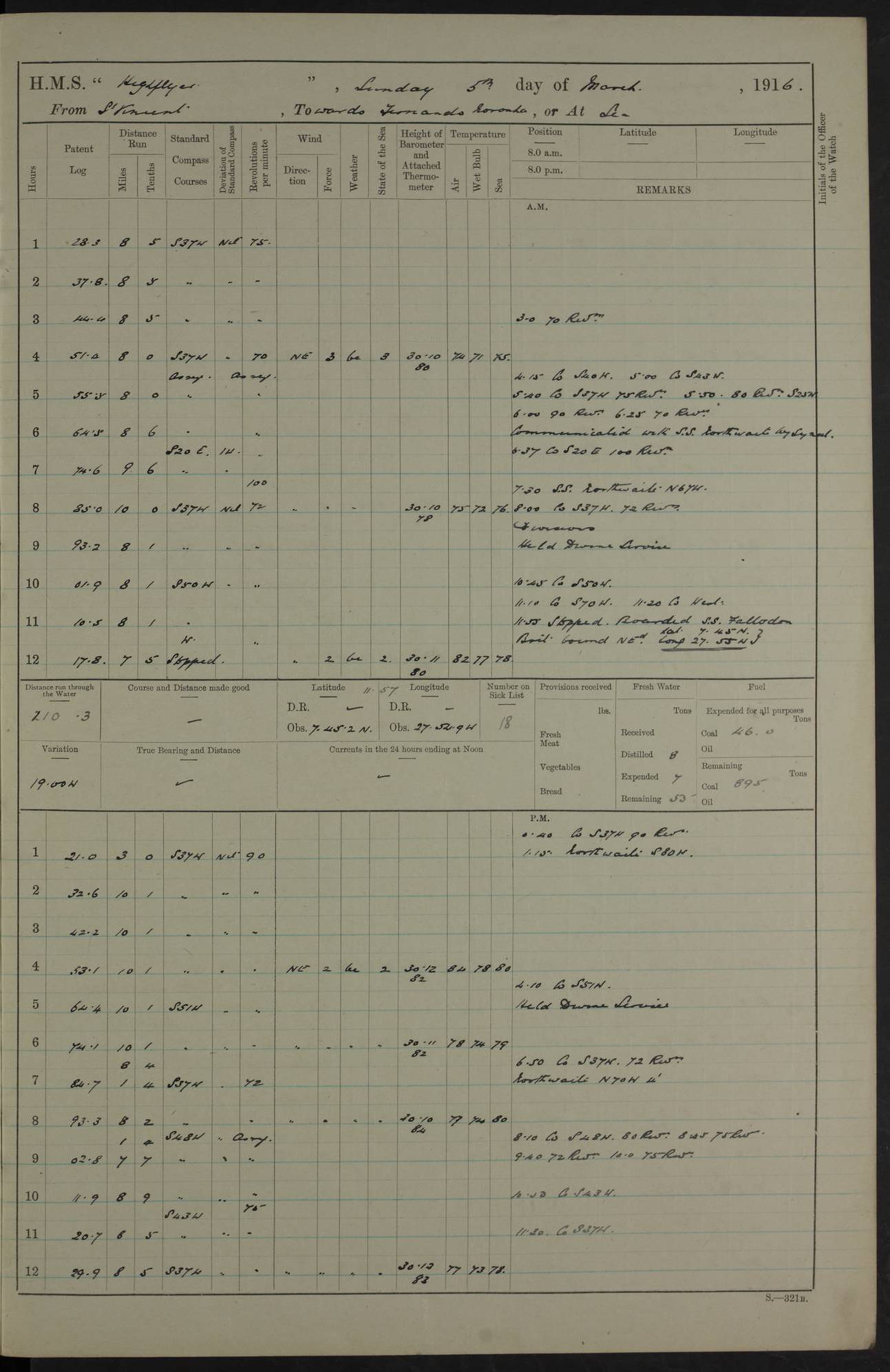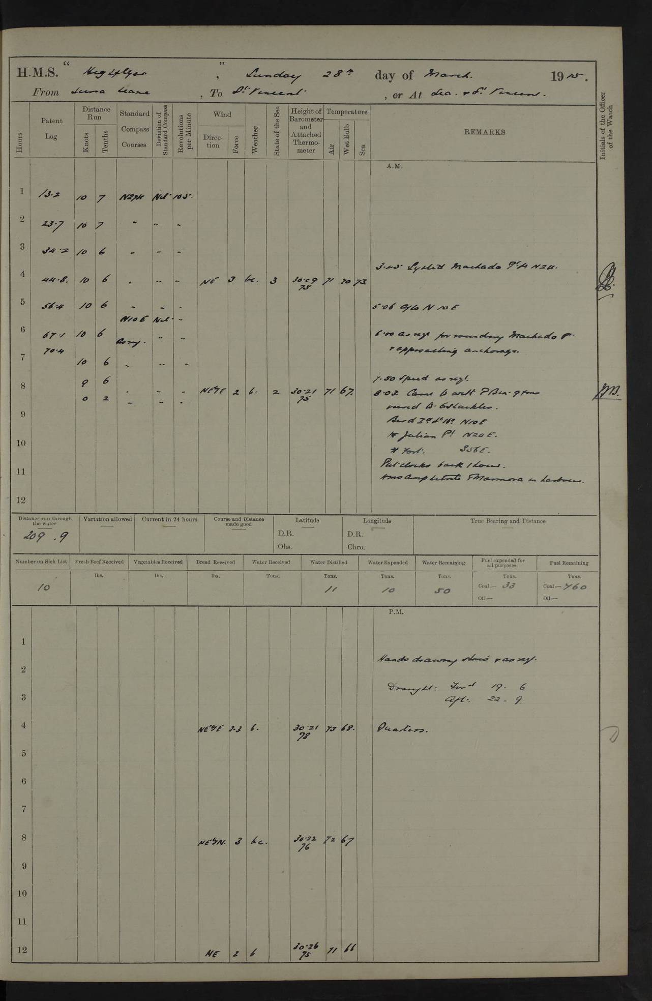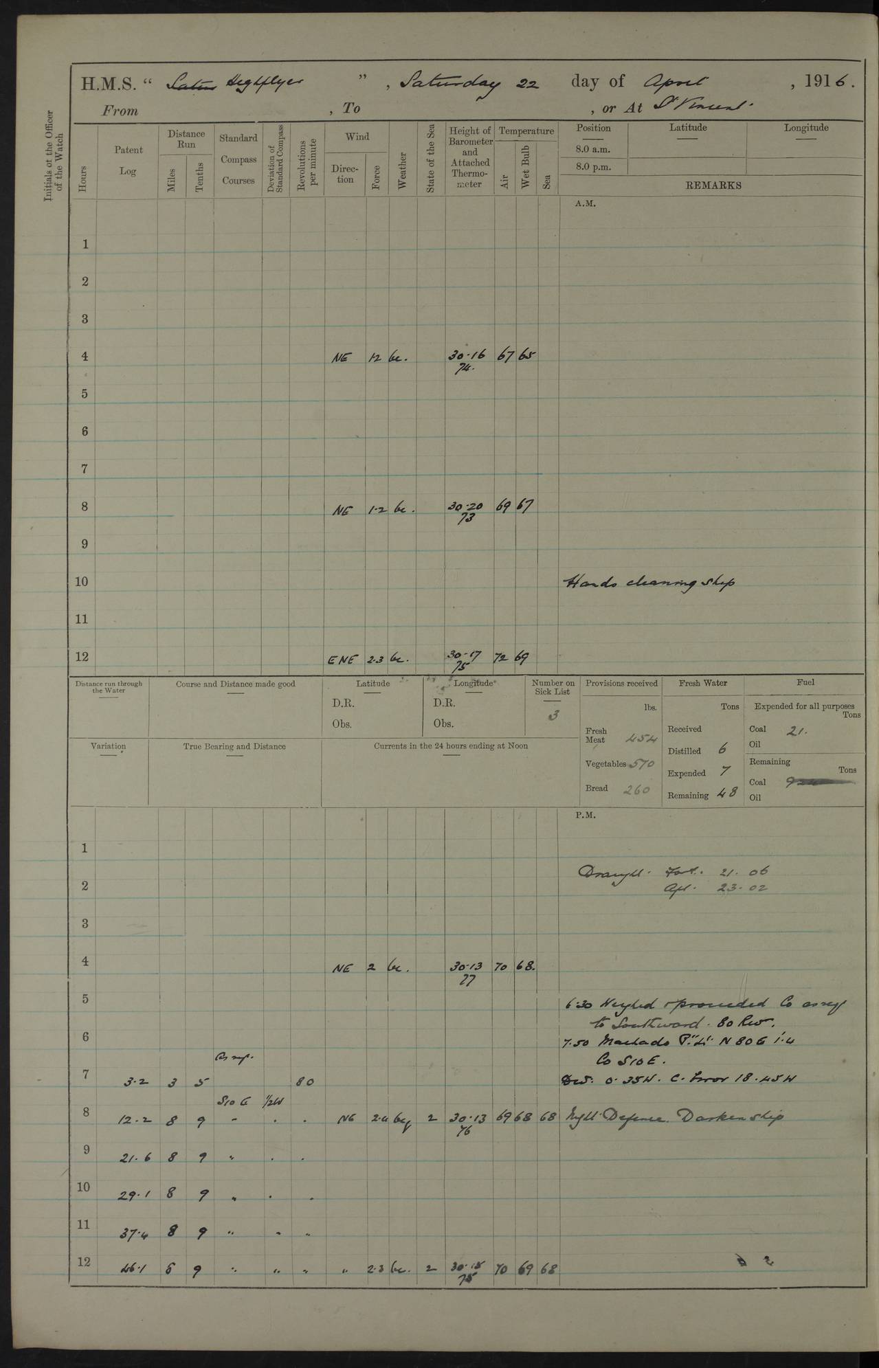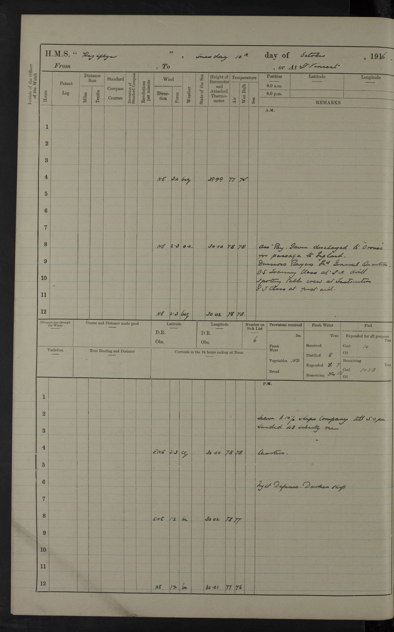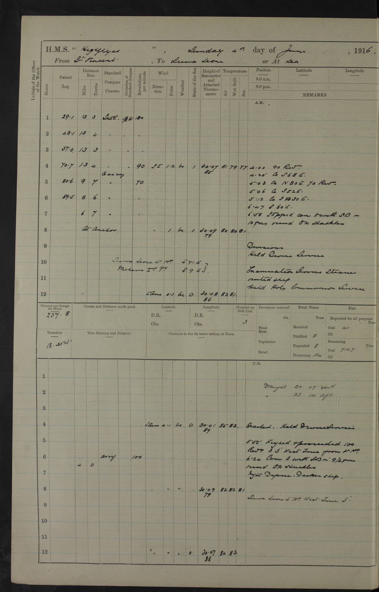 4f961154a2fc8e2def000869: (http://s3.amazonaws.com/oldweather/ADM53-44303/ADM 53-44303-011_0.jpg) 12 February 1916 Patrolling S American trade route to northward Lat 3.9, Long -29.9 7.38am: Stopped, boarded SS REINLAND (Dutch) bound southward Lat 3.13.4N, 30.01W. 4f961155a2fc8e2def00086a: (http://s3.amazonaws.com/oldweather/ADM53-44303/ADM 53-44303-011_1.jpg) 13 February 1916 Patrolling S American trade routes to northward Lat 7.8, Long -28.3 9.00am: Held Divine Service. 4f961155a2fc8e2def00086b: (http://s3.amazonaws.com/oldweather/ADM53-44303/ADM 53-44303-012_0.jpg) 14 February 1916 Patrolling trade routes. to northward Lat 11.4, Long -27.0 9.40am: 90 revs. Course as requisite for aiming rifle practice. 4f961155a2fc8e2def00086c: (http://s3.amazonaws.com/oldweather/ADM53-44303/ADM 53-44303-012_1.jpg) 15 February 1916 Towards Brava Id. Lat 14.2, Long -25.3 9.25am: Stopped, dropped target. Course and speed as requisite to carry out heavy gun practice. 4.00pm: Sighted Brava Id. vis. 1½ miles. Passed W side. 4f961156a2fc8e2def00086d: (http://s3.amazonaws.com/oldweather/ADM53-44303/ADM 53-44303-013_0.jpg) 16 February 1916 St. Vincent Lat 16.8828, Long -25.0106 7.35am: Land ahead visibility 1½’ San Antonio. 8.30am: Course as requisite for entering harbour. 11.00am: Preparing for coaling. 4f961156a2fc8e2def00086e: (http://s3.amazonaws.com/oldweather/ADM53-44303/ADM 53-44303-013_1.jpg) 17 February 1916 St. Vincent Lat 16.8828, Long -25.0106 6.00am: Collier SS PENHALE came alongside. 6.45am: Commenced coaling. 4f961156a2fc8e2def00086f: (http://s3.amazonaws.com/oldweather/ADM53-44303/ADM 53-44303-014_0.jpg) 18 February 1916 St. Vincent Lat 16.8828, Long -25.0106 Cleaning ship. 2.30pm: Drawing new fenders from SS TAMPLIN. 4f961157a2fc8e2def000870: (http://s3.amazonaws.com/oldweather/ADM53-44303/ADM 53-44303-014_1.jpg) 19 February 1916 St. Vincent Lat 16.8828, Long -25.0106 10.30am: Diving party sent to SS TAMPLIN. 4f961157a2fc8e2def000871: (http://s3.amazonaws.com/oldweather/ADM53-44303/ADM 53-44303-015_0.jpg) 20 February 1916 St. Vincent Lat 16.8828, Long -25.0106 7.00am: Sent diving party to TAMPLIN. 4f961157a2fc8e2def000872: (http://s3.amazonaws.com/oldweather/ADM53-44303/ADM 53-44303-015_1.jpg) 21 February 1916 St. Vincent to patrol Lat 16.8828, Long -25.0106 8.30am: Diving party sent to SS TAMPLIN. 6.40pm: Weighed and proceeded as requisite out of harbour. 8.30pm: Bull Point Lt. Ho. N24W, 6000 yds. 4f961158a2fc8e2def000873: (http://s3.amazonaws.com/oldweather/ADM53-44303/ADM 53-44303-016_0.jpg) 22 February 1916 Patrolling northward off San Antonio Id. Lat 18.1, Long -25.3 Painting ship and as requisite. 7.00pm: Western point San Antonio abeam 10’. 4f961158a2fc8e2def000874: (http://s3.amazonaws.com/oldweather/ADM53-44303/ADM 53-44303-016_1.jpg) 23 February 1916 Off San Antonio and St. Vincent to Tarrafal Bay Lat 16.8, Long -25.2 12.00pm: Spoke SS JASON, Brit., bound St. Vincent. 1.12pm: Boarded SS WILLEM VAN DREIL (Dutch) bound St. Vincent. 3.35pm: Stopped, came to with SB, in 33 fathoms. 4f961158a2fc8e2def000875: (http://s3.amazonaws.com/oldweather/ADM53-44303/ADM 53-44303-017_0.jpg) 24 February 1916 Tarrafal Bay, San Antonio Id. to St. Vincent Lat 16.8828, Long -25.0106 9.43 am; Proceeded. Course as requisite to St. Vincent round S end San Antonio 120 revs. 11.17am: Came to with SB in 11 fathoms. 4f961159a2fc8e2def000876: (http://s3.amazonaws.com/oldweather/ADM53-44303/ADM 53-44303-017_1.jpg) 25 February 1916 St. Vincent Lat 16.8828, Long -25.0106 Painting ship. Boys and OS at instruction. Control party at drill. 4f961159a2fc8e2def000877: (http://s3.amazonaws.com/oldweather/ADM53-44303/ADM 53-44303-018_0.jpg) 26 February 1916 St. Vincent Lat 16.8828, Long -25.0106 Cleaning ship. 4f961159a2fc8e2def000878: (http://s3.amazonaws.com/oldweather/ADM53-44303/ADM 53-44303-018_1.jpg) 27 February 1916 St. Vincent Lat 16.8828, Long -25.0106 9.30am: Held Divine Service. 4f96115aa2fc8e2def000879: (http://s3.amazonaws.com/oldweather/ADM53-44303/ADM 53-44303-019_0.jpg) 28 February 1916 St. Vincent Lat 16.8828, Long -25.0106 Boys and OS at instruction. Control party at drill. Remainder preparing for coaling. 2.00pm: Diving party at SS TAMPLIN. 4f96115aa2fc8e2def00087a: (http://s3.amazonaws.com/oldweather/ADM53-44303/ADM 53-44303-019_1.jpg) 29 February 1916 St. Vincent Lat 16.8828, Long -25.0106 7.15am: Commenced coaling from lighter. 8.00am: HMS SWIFTSURE arrived. USS CHESTER arrived. 4f96115aa2fc8e2def00087b: (http://s3.amazonaws.com/oldweather/ADM53-44303/ADM 53-44303-020_0.jpg) 4f96115ba2fc8e2def00087c: (http://s3.amazonaws.com/oldweather/ADM53-44303/ADM 53-44303-020_1.jpg) 4f96115ba2fc8e2def00087d: (http://s3.amazonaws.com/oldweather/ADM53-44303/ADM 53-44303-021_0.jpg) 4f96115ba2fc8e2def00087e: (http://s3.amazonaws.com/oldweather/ADM53-44303/ADM 53-44303-021_1.jpg) LOGS FOR MARCH 1916 4f96115ca2fc8e2def00087f: (http://s3.amazonaws.com/oldweather/ADM53-44304/ADM 53-44304-001_0.jpg) 4f96115ca2fc8e2def000880: (http://s3.amazonaws.com/oldweather/ADM53-44304/ADM 53-44304-001_1.jpg) 4f96115ca2fc8e2def000881: (http://s3.amazonaws.com/oldweather/ADM53-44304/ADM 53-44304-002_0.jpg) 4f96115da2fc8e2def000882: (http://s3.amazonaws.com/oldweather/ADM53-44304/ADM 53-44304-002_1.jpg) 4f96115da2fc8e2def000883: (http://s3.amazonaws.com/oldweather/ADM53-44304/ADM 53-44304-003_0.jpg) 4f96115da2fc8e2def000884: (http://s3.amazonaws.com/oldweather/ADM53-44304/ADM 53-44304-003_1.jpg) 4f96115da2fc8e2def000885: (http://s3.amazonaws.com/oldweather/ADM53-44304/ADM 53-44304-004_0.jpg) 4f96115ea2fc8e2def000886: (http://s3.amazonaws.com/oldweather/ADM53-44304/ADM 53-44304-004_1.jpg) 4f96115ea2fc8e2def000887: (http://s3.amazonaws.com/oldweather/ADM53-44304/ADM 53-44304-005_0.jpg) 4f96115ea2fc8e2def000888: (http://s3.amazonaws.com/oldweather/ADM53-44304/ADM 53-44304-005_1.jpg) 1 March 1916 St. Vincent Lat 16.8828, Long -25.0106 9.30pm: Discharged 1 Officer and 1 Tel. Rating to SS NORTHWAITE. 10.00pm: Surgeon Hobbs joined ship fro