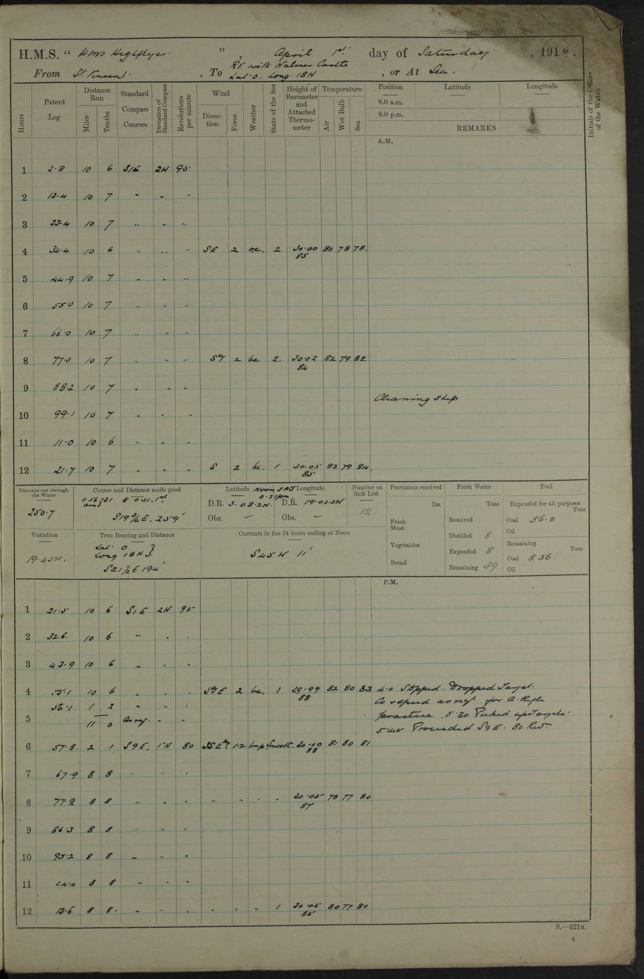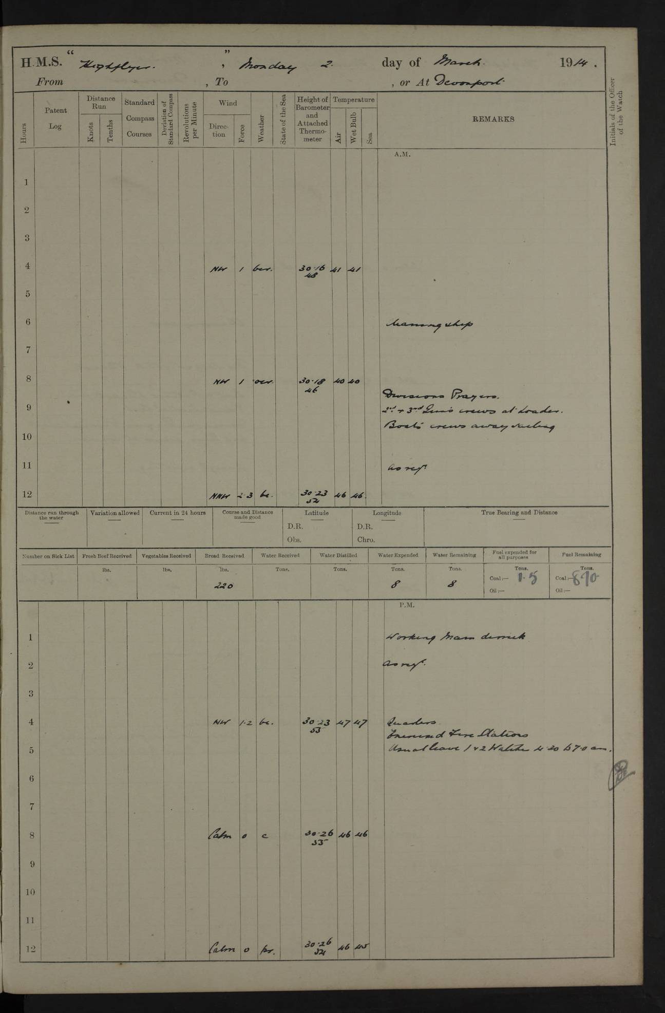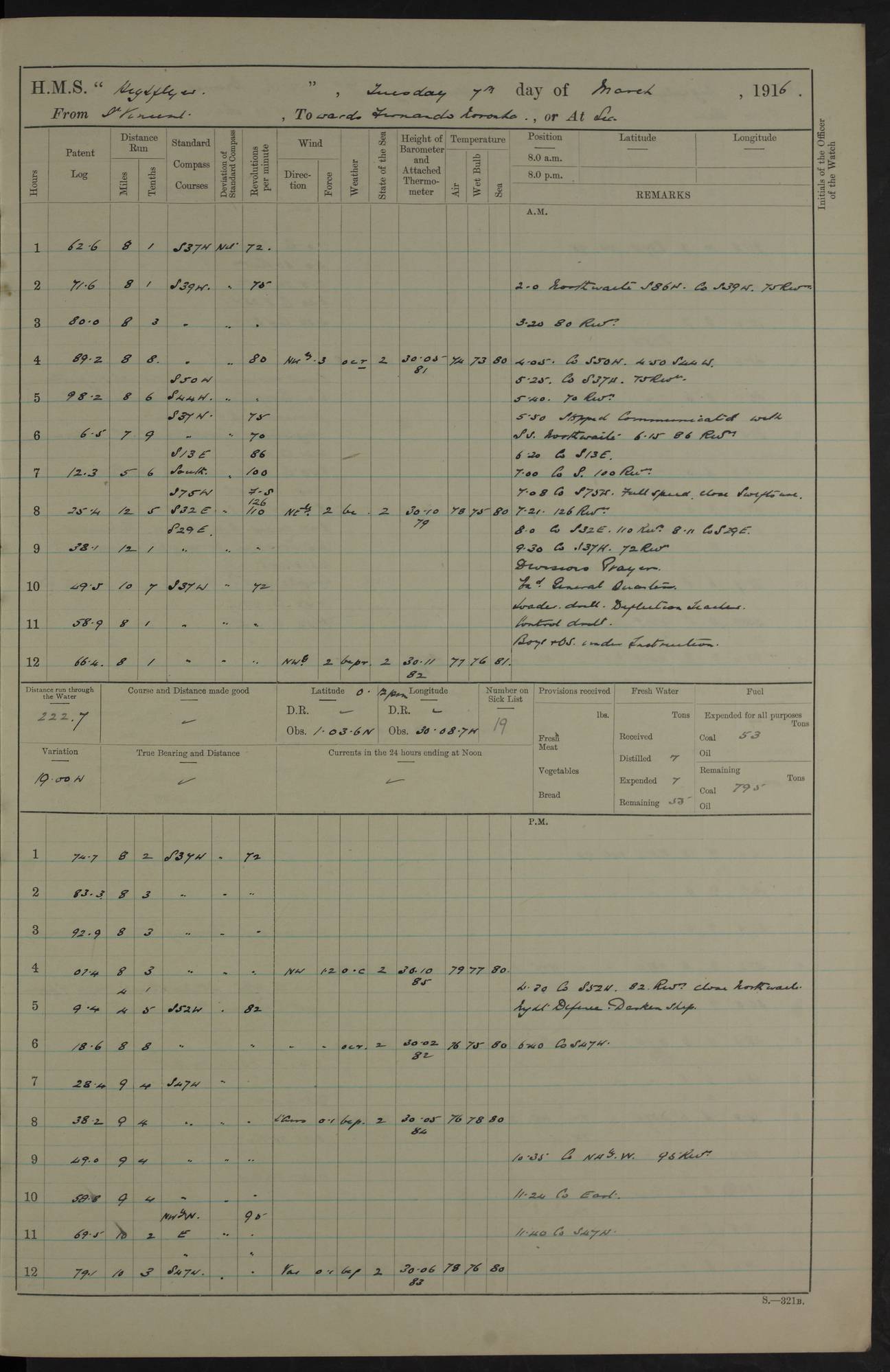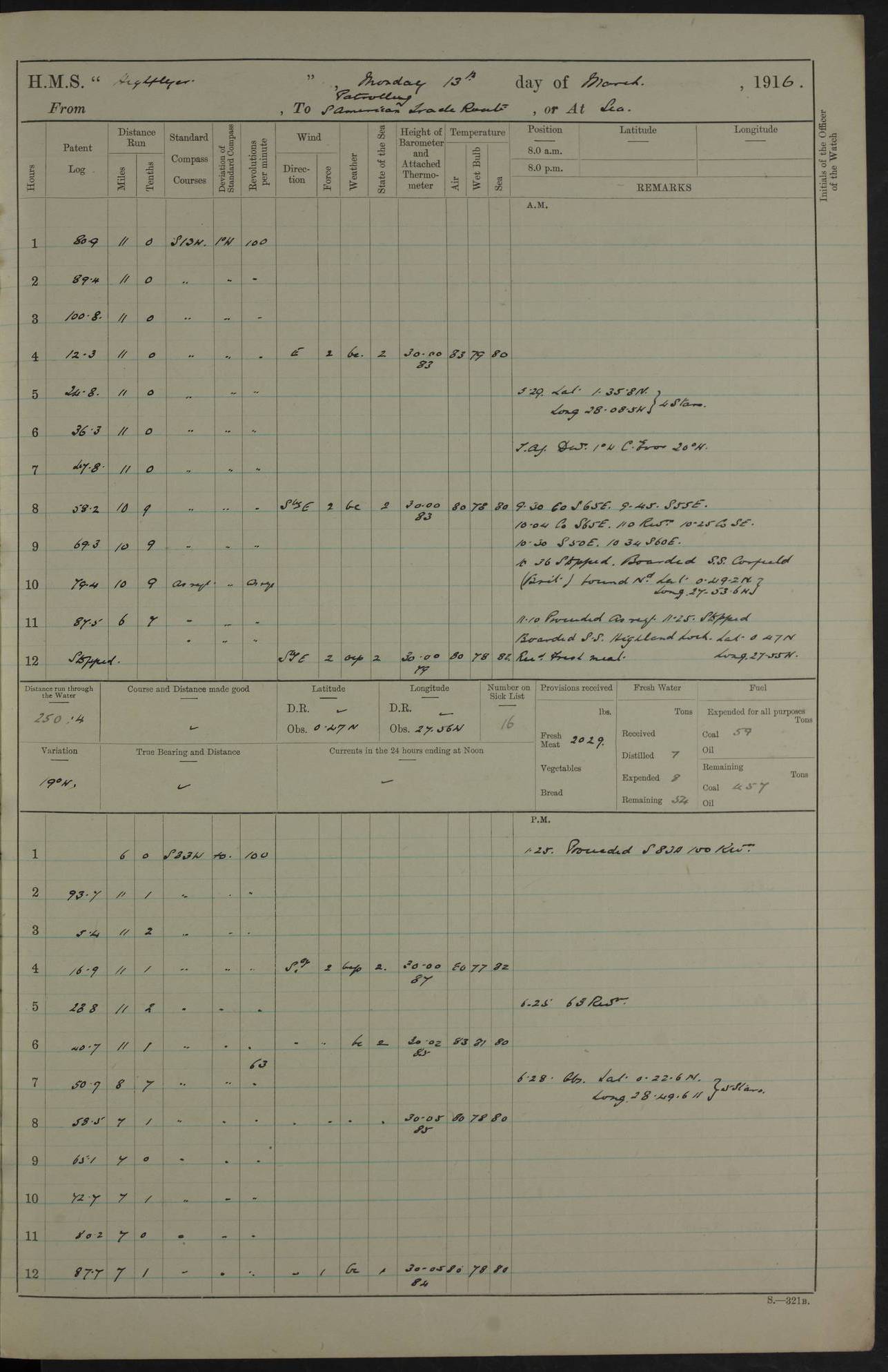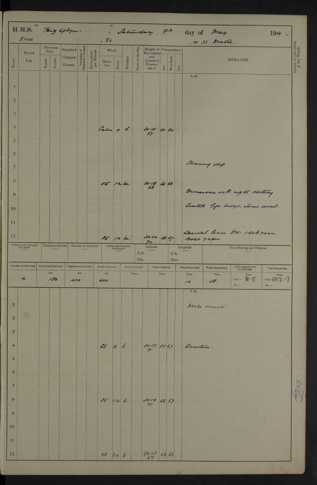 4f961154a2fc8e2def000869: (http://s3.amazonaws.com/oldweather/ADM53-44303/ADM 53-44303-011_0.jpg) 12 February 1916 Patrolling S American trade route to northward Lat 3.9, Long -29.9 7.38am: Stopped, boarded SS REINLAND (Dutch) bound southward Lat 3.13.4N, 30.01W. 4f961155a2fc8e2def00086a: (http://s3.amazonaws.com/oldweather/ADM53-44303/ADM 53-44303-011_1.jpg) 13 February 1916 Patrolling S American trade routes to northward Lat 7.8, Long -28.3 9.00am: Held Divine Service. 4f961155a2fc8e2def00086b: (http://s3.amazonaws.com/oldweather/ADM53-44303/ADM 53-44303-012_0.jpg) 14 February 1916 Patrolling trade routes. to northward Lat 11.4, Long -27.0 9.40am: 90 revs. Course as requisite for aiming rifle practice. 4f961155a2fc8e2def00086c: (http://s3.amazonaws.com/oldweather/ADM53-44303/ADM 53-44303-012_1.jpg) 15 February 1916 Towards Brava Id. Lat 14.2, Long -25.3 9.25am: Stopped, dropped target. Course and speed as requisite to carry out heavy gun practice. 4.00pm: Sighted Brava Id. vis. 1½ miles. Passed W side. 4f961156a2fc8e2def00086d: (http://s3.amazonaws.com/oldweather/ADM53-44303/ADM 53-44303-013_0.jpg) 16 February 1916 St. Vincent Lat 16.8828, Long -25.0106 7.35am: Land ahead visibility 1½’ San Antonio. 8.30am: Course as requisite for entering harbour. 11.00am: Preparing for coaling. 4f961156a2fc8e2def00086e: (http://s3.amazonaws.com/oldweather/ADM53-44303/ADM 53-44303-013_1.jpg) 17 February 1916 St. Vincent Lat 16.8828, Long -25.0106 6.00am: Collier SS PENHALE came alongside. 6.45am: Commenced coaling. 4f961156a2fc8e2def00086f: (http://s3.amazonaws.com/oldweather/ADM53-44303/ADM 53-44303-014_0.jpg) 18 February 1916 St. Vincent Lat 16.8828, Long -25.0106 Cleaning ship. 2.30pm: Drawing new fenders from SS TAMPLIN. 4f961157a2fc8e2def000870: (http://s3.amazonaws.com/oldweather/ADM53-44303/ADM 53-44303-014_1.jpg) 19 February 1916 St. Vincent Lat 16.8828, Long -25.0106 10.30am: Diving party sent to SS TAMPLIN. 4f961157a2fc8e2def000871: (http://s3.amazonaws.com/oldweather/ADM53-44303/ADM 53-44303-015_0.jpg) 20 February 1916 St. Vincent Lat 16.8828, Long -25.0106 7.00am: Sent diving party to TAMPLIN. 4f961157a2fc8e2def000872: (http://s3.amazonaws.com/oldweather/ADM53-44303/ADM 53-44303-015_1.jpg) 21 February 1916 St. Vincent to patrol Lat 16.8828, Long -25.0106 8.30am: Diving party sent to SS TAMPLIN. 6.40pm: Weighed and proceeded as requisite out of harbour. 8.30pm: Bull Point Lt. Ho. N24W, 6000 yds. 4f961158a2fc8e2def000873: (http://s3.amazonaws.com/oldweather/ADM53-44303/ADM 53-44303-016_0.jpg) 22 February 1916 Patrolling northward off San Antonio Id. Lat 18.1, Long -25.3 Painting ship and as requisite. 7.00pm: Western point San Antonio abeam 10’. 4f961158a2fc8e2def000874: (http://s3.amazonaws.com/oldweather/ADM53-44303/ADM 53-44303-016_1.jpg) 23 February 1916 Off San Antonio and St. Vincent to Tarrafal Bay Lat 16.8, Long -25.2 12.00pm: Spoke SS JASON, Brit., bound St. Vincent. 1.12pm: Boarded SS WILLEM VAN DREIL (Dutch) bound St. Vincent. 3.35pm: Stopped, came to with SB, in 33 fathoms. 4f961158a2fc8e2def000875: (http://s3.amazonaws.com/oldweather/ADM53-44303/ADM 53-44303-017_0.jpg) 24 February 1916 Tarrafal Bay, San Antonio Id. to St. Vincent Lat 16.8828, Long -25.0106 9.43 am; Proceeded. Course as requisite to St. Vincent round S end San Antonio 120 revs. 11.17am: Came to with SB in 11 fathoms. 4f961159a2fc8e2def000876: (http://s3.amazonaws.com/oldweather/ADM53-44303/ADM 53-44303-017_1.jpg) 25 February 1916 St. Vincent Lat 16.8828, Long -25.0106 Painting ship. Boys and OS at instruction. Control party at drill. 4f961159a2fc8e2def000877: (http://s3.amazonaws.com/oldweather/ADM53-44303/ADM 53-44303-018_0.jpg) 26 February 1916 St. Vincent Lat 16.8828, Long -25.0106 Cleaning ship. 4f961159a2fc8e2def000878: (http://s3.amazonaws.com/oldweather/ADM53-44303/ADM 53-44303-018_1.jpg) 27 February 1916 St. Vincent Lat 16.8828, Long -25.0106 9.30am: Held Divine Service. 4f96115aa2fc8e2def000879: (http://s3.amazonaws.com/oldweather/ADM53-44303/ADM 53-44303-019_0.jpg) 28 February 1916 St. Vincent Lat 16.8828, Long -25.0106 Boys and OS at instruction. Control party at drill. Remainder preparing for coaling. 2.00pm: Diving party at SS TAMPLIN. 4f96115aa2fc8e2def00087a: (http://s3.amazonaws.com/oldweather/ADM53-44303/ADM 53-44303-019_1.jpg) 29 February 1916 St. Vincent Lat 16.8828, Long -25.0106 7.15am: Commenced coaling from lighter. 8.00am: HMS SWIFTSURE arrived. USS CHESTER arrived. 4f96115aa2fc8e2def00087b: (http://s3.amazonaws.com/oldweather/ADM53-44303/ADM 53-44303-020_0.jpg) 4f96115ba2fc8e2def00087c: (http://s3.amazonaws.com/oldweather/ADM53-44303/ADM 53-44303-020_1.jpg) 4f96115ba2fc8e2def00087d: (http://s3.amazonaws.com/oldweather/ADM53-44303/ADM 53-44303-021_0.jpg) 4f96115ba2fc8e2def00087e: (http://s3.amazonaws.com/oldweather/ADM53-44303/ADM 53-44303-021_1.jpg) LOGS FOR MARCH 1916 4f96115ca2fc8e2def00087f: (http://s3.amazonaws.com/oldweather/ADM53-44304/ADM 53-44304-001_0.jpg) 4f96115ca2fc8e2def000880: (http://s3.amazonaws.com/oldweather/ADM53-44304/ADM 53-44304-001_1.jpg) 4f96115ca2fc8e2def000881: (http://s3.amazonaws.com/oldweather/ADM53-44304/ADM 53-44304-002_0.jpg) 4f96115da2fc8e2def000882: (http://s3.amazonaws.com/oldweather/ADM53-44304/ADM 53-44304-002_1.jpg) 4f96115da2fc8e2def000883: (http://s3.amazonaws.com/oldweather/ADM53-44304/ADM 53-44304-003_0.jpg) 4f96115da2fc8e2def000884: (http://s3.amazonaws.com/oldweather/ADM53-44304/ADM 53-44304-003_1.jpg) 4f96115da2fc8e2def000885: (http://s3.amazonaws.com/oldweather/ADM53-44304/ADM 53-44304-004_0.jpg) 4f96115ea2fc8e2def000886: (http://s3.amazonaws.com/oldweather/ADM53-44304/ADM 53-44304-004_1.jpg) 4f96115ea2fc8e2def000887: (http://s3.amazonaws.com/oldweather/ADM53-44304/ADM 53-44304-005_0.jpg) 4f96115ea2fc8e2def000888: (http://s3.amazonaws.com/oldweather/ADM53-44304/ADM 53-44304-005_1.jpg) 1 March 1916 St. Vincent Lat 16.8828, Long -25.0106 9.30pm: Discharged 1 Officer and 1 Tel. Rating to SS NORTHWAITE. 10.00pm: Surgeon Hobbs joined ship fro
