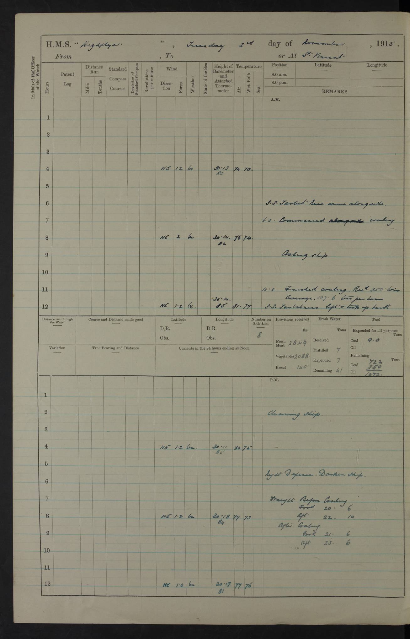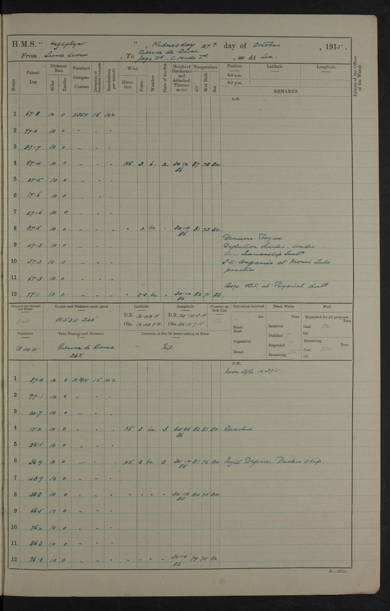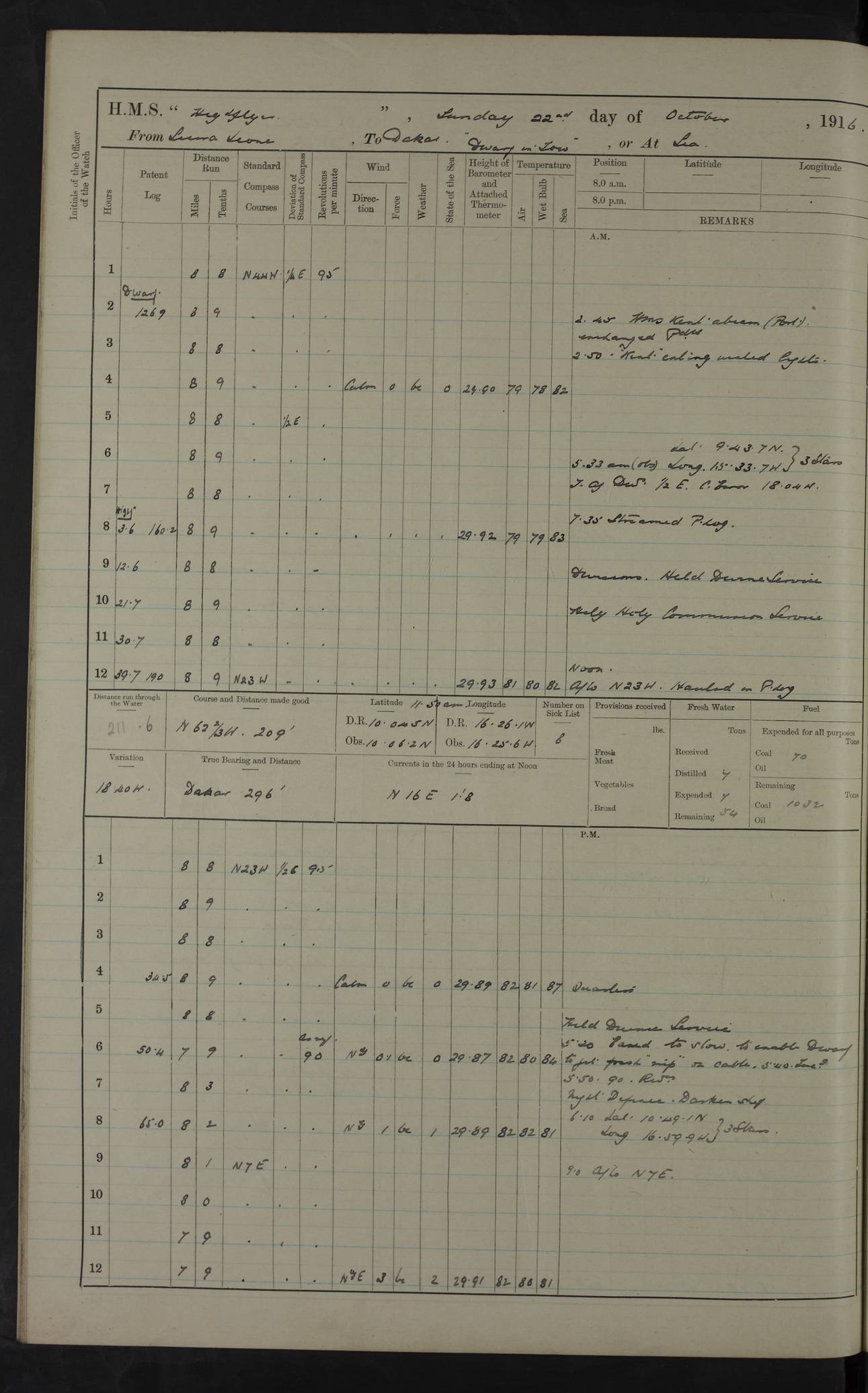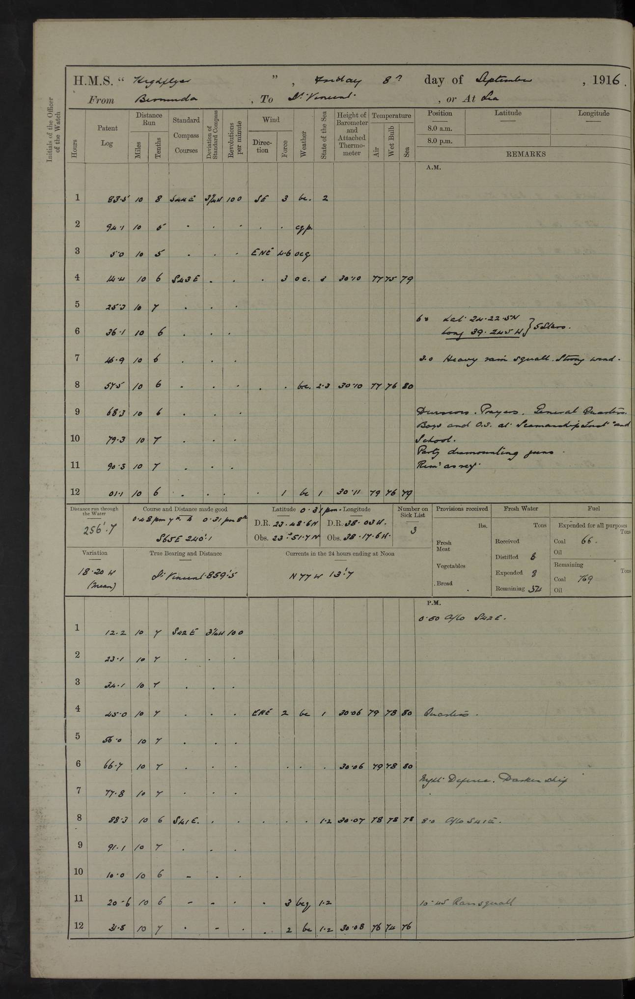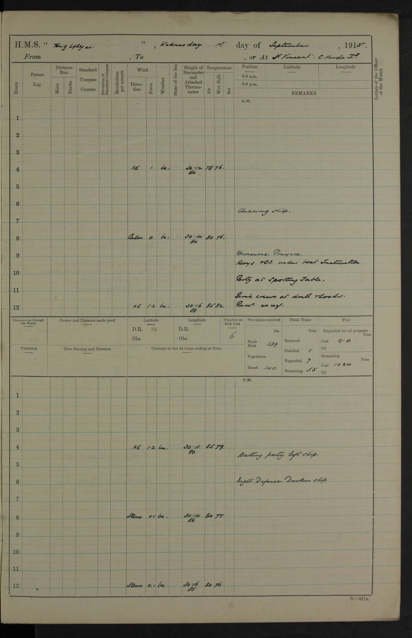 4f961154a2fc8e2def000869: (http://s3.amazonaws.com/oldweather/ADM53-44303/ADM 53-44303-011_0.jpg) 12 February 1916 Patrolling S American trade route to northward Lat 3.9, Long -29.9 7.38am: Stopped, boarded SS REINLAND (Dutch) bound southward Lat 3.13.4N, 30.01W. 4f961155a2fc8e2def00086a: (http://s3.amazonaws.com/oldweather/ADM53-44303/ADM 53-44303-011_1.jpg) 13 February 1916 Patrolling S American trade routes to northward Lat 7.8, Long -28.3 9.00am: Held Divine Service. 4f961155a2fc8e2def00086b: (http://s3.amazonaws.com/oldweather/ADM53-44303/ADM 53-44303-012_0.jpg) 14 February 1916 Patrolling trade routes. to northward Lat 11.4, Long -27.0 9.40am: 90 revs. Course as requisite for aiming rifle practice. 4f961155a2fc8e2def00086c: (http://s3.amazonaws.com/oldweather/ADM53-44303/ADM 53-44303-012_1.jpg) 15 February 1916 Towards Brava Id. Lat 14.2, Long -25.3 9.25am: Stopped, dropped target. Course and speed as requisite to carry out heavy gun practice. 4.00pm: Sighted Brava Id. vis. 1½ miles. Passed W side. 4f961156a2fc8e2def00086d: (http://s3.amazonaws.com/oldweather/ADM53-44303/ADM 53-44303-013_0.jpg) 16 February 1916 St. Vincent Lat 16.8828, Long -25.0106 7.35am: Land ahead visibility 1½’ San Antonio. 8.30am: Course as requisite for entering harbour. 11.00am: Preparing for coaling. 4f961156a2fc8e2def00086e: (http://s3.amazonaws.com/oldweather/ADM53-44303/ADM 53-44303-013_1.jpg) 17 February 1916 St. Vincent Lat 16.8828, Long -25.0106 6.00am: Collier SS PENHALE came alongside. 6.45am: Commenced coaling. 4f961156a2fc8e2def00086f: (http://s3.amazonaws.com/oldweather/ADM53-44303/ADM 53-44303-014_0.jpg) 18 February 1916 St. Vincent Lat 16.8828, Long -25.0106 Cleaning ship. 2.30pm: Drawing new fenders from SS TAMPLIN. 4f961157a2fc8e2def000870: (http://s3.amazonaws.com/oldweather/ADM53-44303/ADM 53-44303-014_1.jpg) 19 February 1916 St. Vincent Lat 16.8828, Long -25.0106 10.30am: Diving party sent to SS TAMPLIN. 4f961157a2fc8e2def000871: (http://s3.amazonaws.com/oldweather/ADM53-44303/ADM 53-44303-015_0.jpg) 20 February 1916 St. Vincent Lat 16.8828, Long -25.0106 7.00am: Sent diving party to TAMPLIN. 4f961157a2fc8e2def000872: (http://s3.amazonaws.com/oldweather/ADM53-44303/ADM 53-44303-015_1.jpg) 21 February 1916 St. Vincent to patrol Lat 16.8828, Long -25.0106 8.30am: Diving party sent to SS TAMPLIN. 6.40pm: Weighed and proceeded as requisite out of harbour. 8.30pm: Bull Point Lt. Ho. N24W, 6000 yds. 4f961158a2fc8e2def000873: (http://s3.amazonaws.com/oldweather/ADM53-44303/ADM 53-44303-016_0.jpg) 22 February 1916 Patrolling northward off San Antonio Id. Lat 18.1, Long -25.3 Painting ship and as requisite. 7.00pm: Western point San Antonio abeam 10’. 4f961158a2fc8e2def000874: (http://s3.amazonaws.com/oldweather/ADM53-44303/ADM 53-44303-016_1.jpg) 23 February 1916 Off San Antonio and St. Vincent to Tarrafal Bay Lat 16.8, Long -25.2 12.00pm: Spoke SS JASON, Brit., bound St. Vincent. 1.12pm: Boarded SS WILLEM VAN DREIL (Dutch) bound St. Vincent. 3.35pm: Stopped, came to with SB, in 33 fathoms. 4f961158a2fc8e2def000875: (http://s3.amazonaws.com/oldweather/ADM53-44303/ADM 53-44303-017_0.jpg) 24 February 1916 Tarrafal Bay, San Antonio Id. to St. Vincent Lat 16.8828, Long -25.0106 9.43 am; Proceeded. Course as requisite to St. Vincent round S end San Antonio 120 revs. 11.17am: Came to with SB in 11 fathoms. 4f961159a2fc8e2def000876: (http://s3.amazonaws.com/oldweather/ADM53-44303/ADM 53-44303-017_1.jpg) 25 February 1916 St. Vincent Lat 16.8828, Long -25.0106 Painting ship. Boys and OS at instruction. Control party at drill. 4f961159a2fc8e2def000877: (http://s3.amazonaws.com/oldweather/ADM53-44303/ADM 53-44303-018_0.jpg) 26 February 1916 St. Vincent Lat 16.8828, Long -25.0106 Cleaning ship. 4f961159a2fc8e2def000878: (http://s3.amazonaws.com/oldweather/ADM53-44303/ADM 53-44303-018_1.jpg) 27 February 1916 St. Vincent Lat 16.8828, Long -25.0106 9.30am: Held Divine Service. 4f96115aa2fc8e2def000879: (http://s3.amazonaws.com/oldweather/ADM53-44303/ADM 53-44303-019_0.jpg) 28 February 1916 St. Vincent Lat 16.8828, Long -25.0106 Boys and OS at instruction. Control party at drill. Remainder preparing for coaling. 2.00pm: Diving party at SS TAMPLIN. 4f96115aa2fc8e2def00087a: (http://s3.amazonaws.com/oldweather/ADM53-44303/ADM 53-44303-019_1.jpg) 29 February 1916 St. Vincent Lat 16.8828, Long -25.0106 7.15am: Commenced coaling from lighter. 8.00am: HMS SWIFTSURE arrived. USS CHESTER arrived. 4f96115aa2fc8e2def00087b: (http://s3.amazonaws.com/oldweather/ADM53-44303/ADM 53-44303-020_0.jpg) 4f96115ba2fc8e2def00087c: (http://s3.amazonaws.com/oldweather/ADM53-44303/ADM 53-44303-020_1.jpg) 4f96115ba2fc8e2def00087d: (http://s3.amazonaws.com/oldweather/ADM53-44303/ADM 53-44303-021_0.jpg) 4f96115ba2fc8e2def00087e: (http://s3.amazonaws.com/oldweather/ADM53-44303/ADM 53-44303-021_1.jpg) LOGS FOR MARCH 1916 4f96115ca2fc8e2def00087f: (http://s3.amazonaws.com/oldweather/ADM53-44304/ADM 53-44304-001_0.jpg) 4f96115ca2fc8e2def000880: (http://s3.amazonaws.com/oldweather/ADM53-44304/ADM 53-44304-001_1.jpg) 4f96115ca2fc8e2def000881: (http://s3.amazonaws.com/oldweather/ADM53-44304/ADM 53-44304-002_0.jpg) 4f96115da2fc8e2def000882: (http://s3.amazonaws.com/oldweather/ADM53-44304/ADM 53-44304-002_1.jpg) 4f96115da2fc8e2def000883: (http://s3.amazonaws.com/oldweather/ADM53-44304/ADM 53-44304-003_0.jpg) 4f96115da2fc8e2def000884: (http://s3.amazonaws.com/oldweather/ADM53-44304/ADM 53-44304-003_1.jpg) 4f96115da2fc8e2def000885: (http://s3.amazonaws.com/oldweather/ADM53-44304/ADM 53-44304-004_0.jpg) 4f96115ea2fc8e2def000886: (http://s3.amazonaws.com/oldweather/ADM53-44304/ADM 53-44304-004_1.jpg) 4f96115ea2fc8e2def000887: (http://s3.amazonaws.com/oldweather/ADM53-44304/ADM 53-44304-005_0.jpg) 4f96115ea2fc8e2def000888: (http://s3.amazonaws.com/oldweather/ADM53-44304/ADM 53-44304-005_1.jpg) 1 March 1916 St. Vincent Lat 16.8828, Long -25.0106 9.30pm: Discharged 1 Officer and 1 Tel. Rating to SS NORTHWAITE. 10.00pm: Surgeon Hobbs joined ship fro