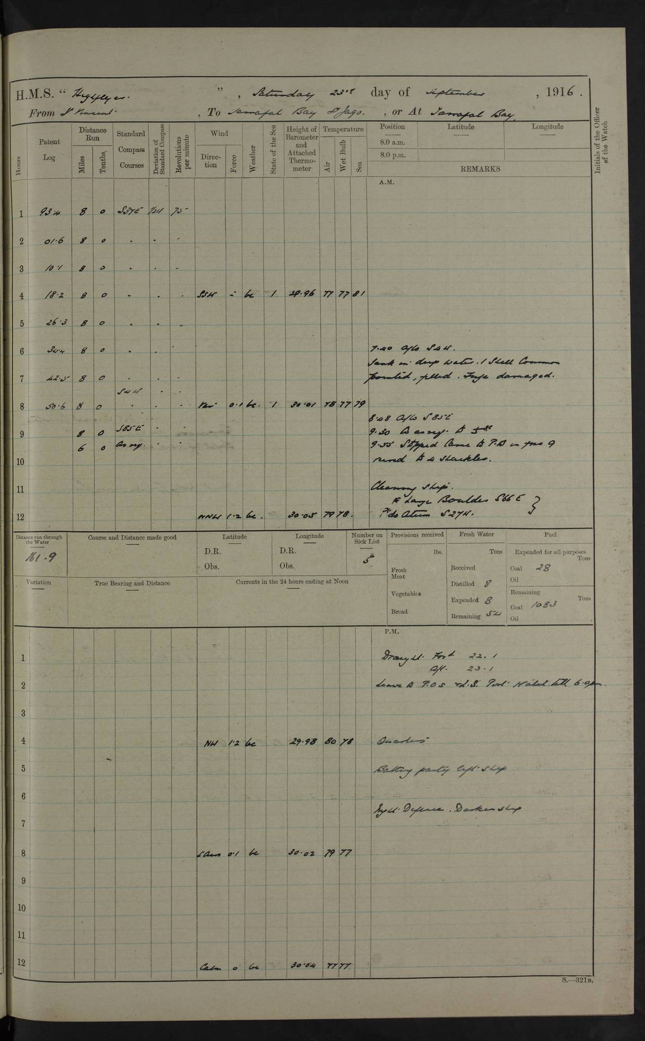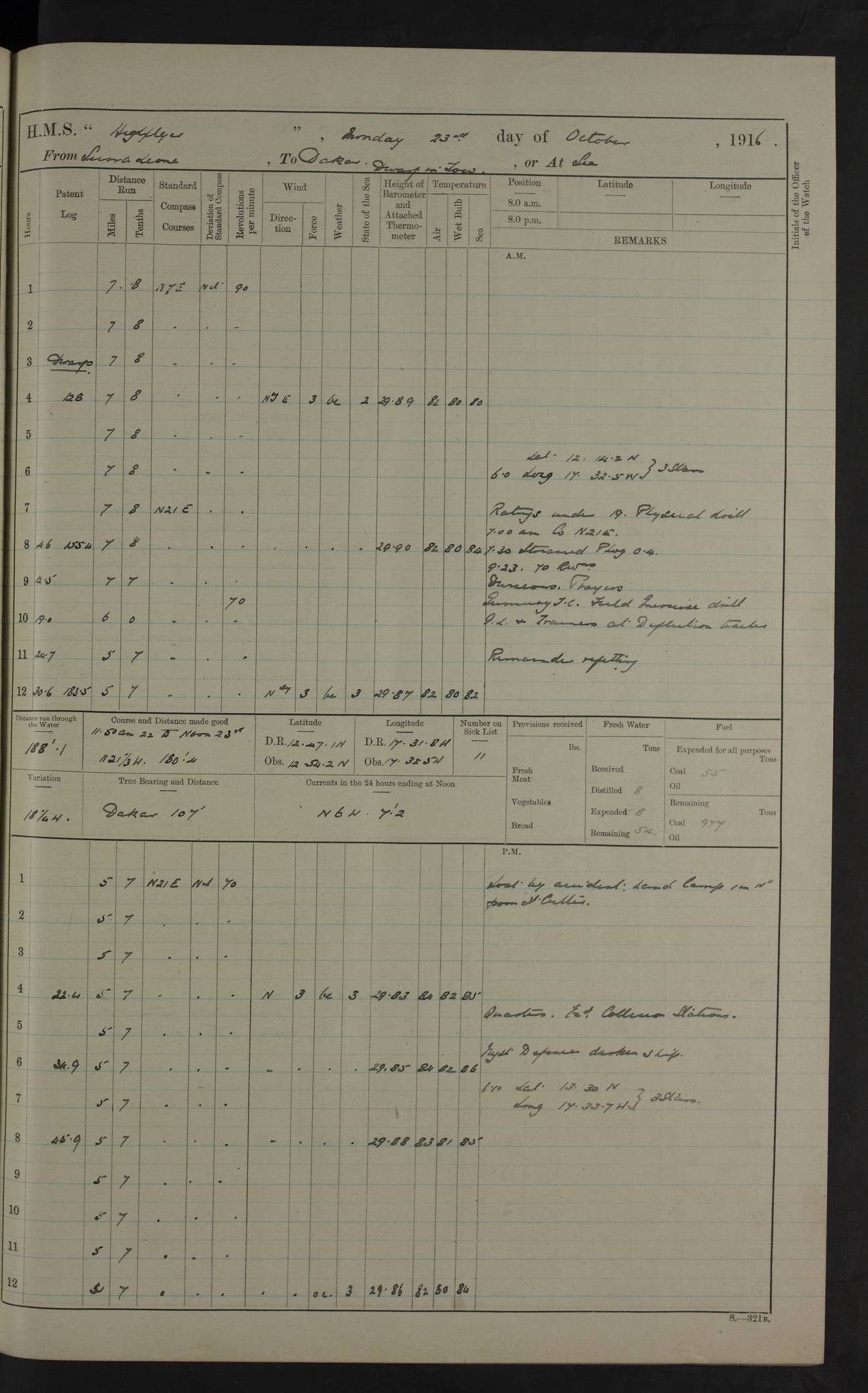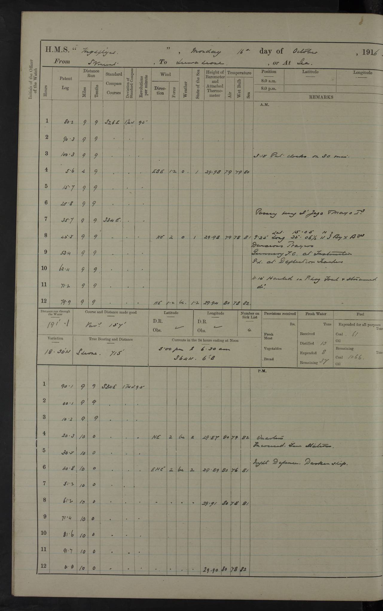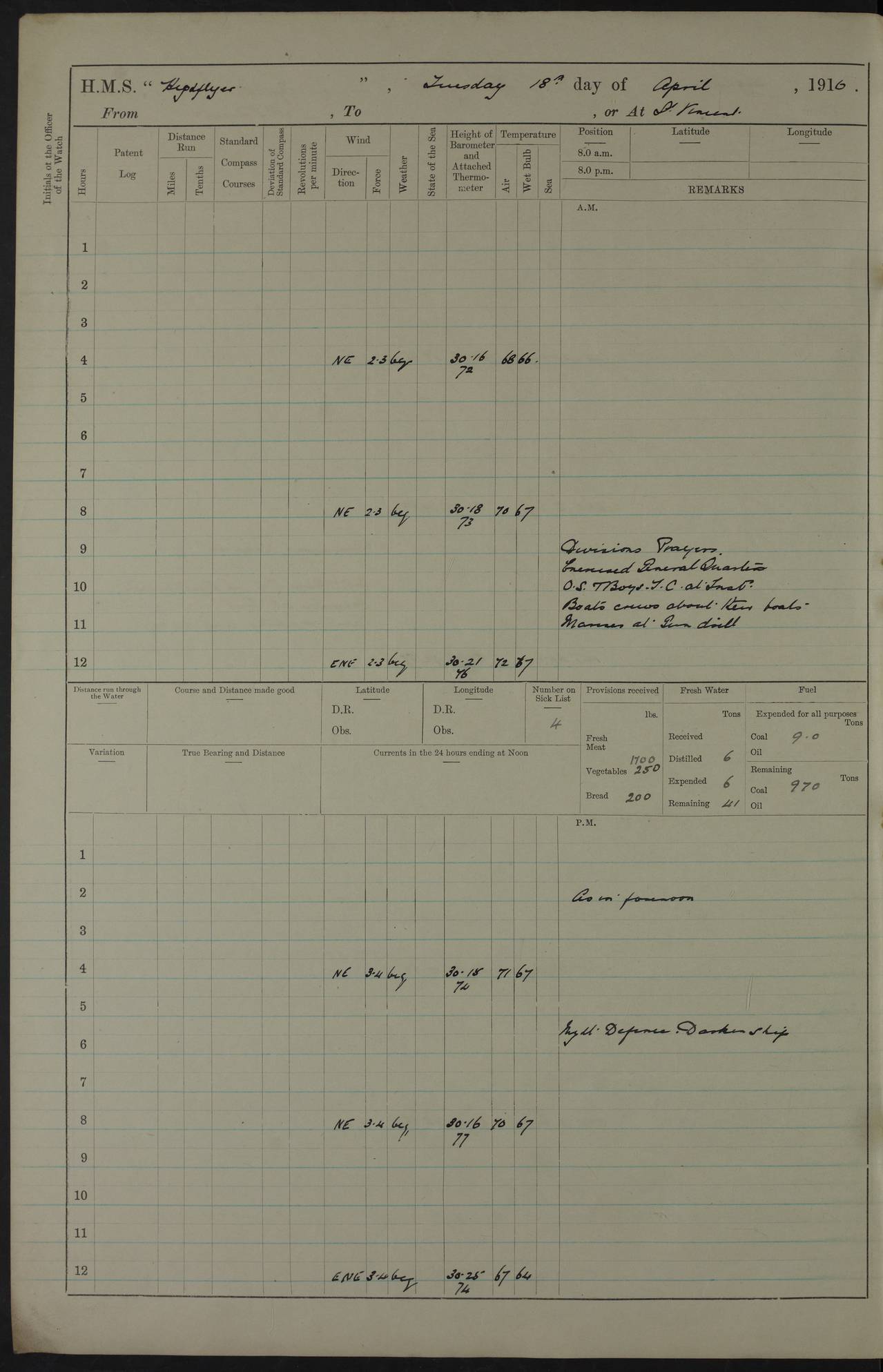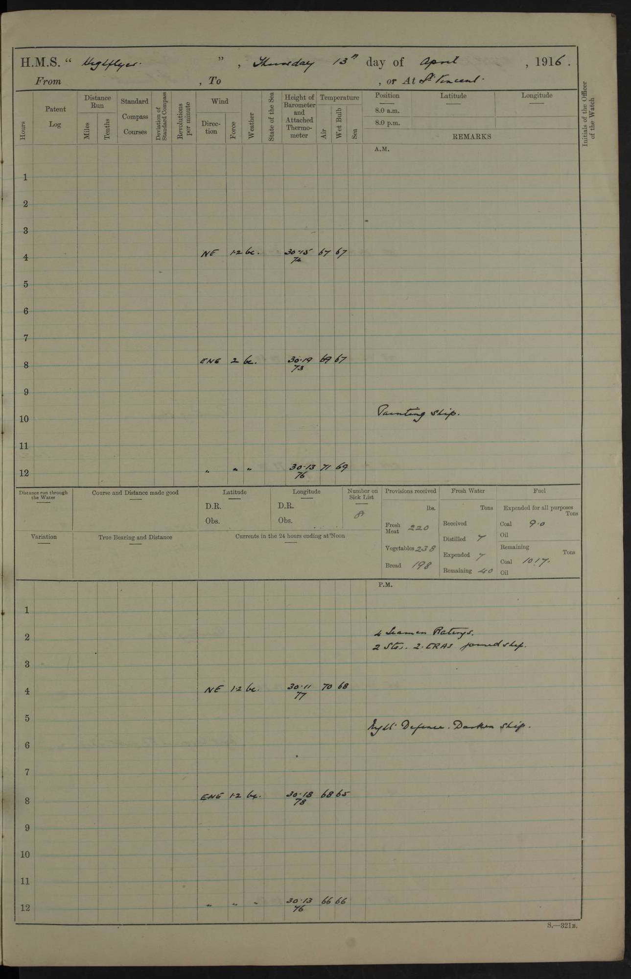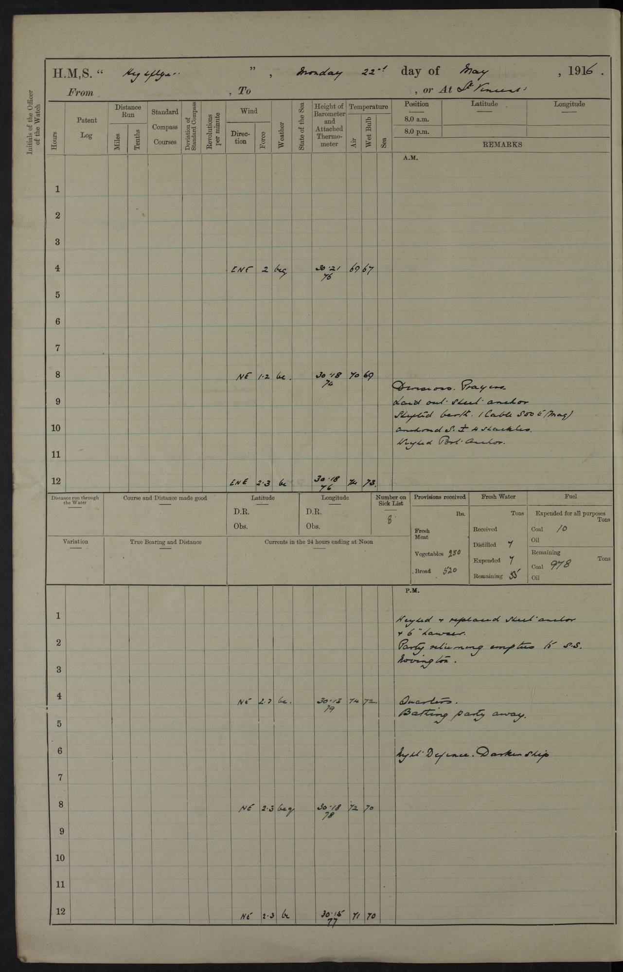 4f961154a2fc8e2def000869: (http://s3.amazonaws.com/oldweather/ADM53-44303/ADM 53-44303-011_0.jpg) 12 February 1916 Patrolling S American trade route to northward Lat 3.9, Long -29.9 7.38am: Stopped, boarded SS REINLAND (Dutch) bound southward Lat 3.13.4N, 30.01W. 4f961155a2fc8e2def00086a: (http://s3.amazonaws.com/oldweather/ADM53-44303/ADM 53-44303-011_1.jpg) 13 February 1916 Patrolling S American trade routes to northward Lat 7.8, Long -28.3 9.00am: Held Divine Service. 4f961155a2fc8e2def00086b: (http://s3.amazonaws.com/oldweather/ADM53-44303/ADM 53-44303-012_0.jpg) 14 February 1916 Patrolling trade routes. to northward Lat 11.4, Long -27.0 9.40am: 90 revs. Course as requisite for aiming rifle practice. 4f961155a2fc8e2def00086c: (http://s3.amazonaws.com/oldweather/ADM53-44303/ADM 53-44303-012_1.jpg) 15 February 1916 Towards Brava Id. Lat 14.2, Long -25.3 9.25am: Stopped, dropped target. Course and speed as requisite to carry out heavy gun practice. 4.00pm: Sighted Brava Id. vis. 1½ miles. Passed W side. 4f961156a2fc8e2def00086d: (http://s3.amazonaws.com/oldweather/ADM53-44303/ADM 53-44303-013_0.jpg) 16 February 1916 St. Vincent Lat 16.8828, Long -25.0106 7.35am: Land ahead visibility 1½’ San Antonio. 8.30am: Course as requisite for entering harbour. 11.00am: Preparing for coaling. 4f961156a2fc8e2def00086e: (http://s3.amazonaws.com/oldweather/ADM53-44303/ADM 53-44303-013_1.jpg) 17 February 1916 St. Vincent Lat 16.8828, Long -25.0106 6.00am: Collier SS PENHALE came alongside. 6.45am: Commenced coaling. 4f961156a2fc8e2def00086f: (http://s3.amazonaws.com/oldweather/ADM53-44303/ADM 53-44303-014_0.jpg) 18 February 1916 St. Vincent Lat 16.8828, Long -25.0106 Cleaning ship. 2.30pm: Drawing new fenders from SS TAMPLIN. 4f961157a2fc8e2def000870: (http://s3.amazonaws.com/oldweather/ADM53-44303/ADM 53-44303-014_1.jpg) 19 February 1916 St. Vincent Lat 16.8828, Long -25.0106 10.30am: Diving party sent to SS TAMPLIN. 4f961157a2fc8e2def000871: (http://s3.amazonaws.com/oldweather/ADM53-44303/ADM 53-44303-015_0.jpg) 20 February 1916 St. Vincent Lat 16.8828, Long -25.0106 7.00am: Sent diving party to TAMPLIN. 4f961157a2fc8e2def000872: (http://s3.amazonaws.com/oldweather/ADM53-44303/ADM 53-44303-015_1.jpg) 21 February 1916 St. Vincent to patrol Lat 16.8828, Long -25.0106 8.30am: Diving party sent to SS TAMPLIN. 6.40pm: Weighed and proceeded as requisite out of harbour. 8.30pm: Bull Point Lt. Ho. N24W, 6000 yds. 4f961158a2fc8e2def000873: (http://s3.amazonaws.com/oldweather/ADM53-44303/ADM 53-44303-016_0.jpg) 22 February 1916 Patrolling northward off San Antonio Id. Lat 18.1, Long -25.3 Painting ship and as requisite. 7.00pm: Western point San Antonio abeam 10’. 4f961158a2fc8e2def000874: (http://s3.amazonaws.com/oldweather/ADM53-44303/ADM 53-44303-016_1.jpg) 23 February 1916 Off San Antonio and St. Vincent to Tarrafal Bay Lat 16.8, Long -25.2 12.00pm: Spoke SS JASON, Brit., bound St. Vincent. 1.12pm: Boarded SS WILLEM VAN DREIL (Dutch) bound St. Vincent. 3.35pm: Stopped, came to with SB, in 33 fathoms. 4f961158a2fc8e2def000875: (http://s3.amazonaws.com/oldweather/ADM53-44303/ADM 53-44303-017_0.jpg) 24 February 1916 Tarrafal Bay, San Antonio Id. to St. Vincent Lat 16.8828, Long -25.0106 9.43 am; Proceeded. Course as requisite to St. Vincent round S end San Antonio 120 revs. 11.17am: Came to with SB in 11 fathoms. 4f961159a2fc8e2def000876: (http://s3.amazonaws.com/oldweather/ADM53-44303/ADM 53-44303-017_1.jpg) 25 February 1916 St. Vincent Lat 16.8828, Long -25.0106 Painting ship. Boys and OS at instruction. Control party at drill. 4f961159a2fc8e2def000877: (http://s3.amazonaws.com/oldweather/ADM53-44303/ADM 53-44303-018_0.jpg) 26 February 1916 St. Vincent Lat 16.8828, Long -25.0106 Cleaning ship. 4f961159a2fc8e2def000878: (http://s3.amazonaws.com/oldweather/ADM53-44303/ADM 53-44303-018_1.jpg) 27 February 1916 St. Vincent Lat 16.8828, Long -25.0106 9.30am: Held Divine Service. 4f96115aa2fc8e2def000879: (http://s3.amazonaws.com/oldweather/ADM53-44303/ADM 53-44303-019_0.jpg) 28 February 1916 St. Vincent Lat 16.8828, Long -25.0106 Boys and OS at instruction. Control party at drill. Remainder preparing for coaling. 2.00pm: Diving party at SS TAMPLIN. 4f96115aa2fc8e2def00087a: (http://s3.amazonaws.com/oldweather/ADM53-44303/ADM 53-44303-019_1.jpg) 29 February 1916 St. Vincent Lat 16.8828, Long -25.0106 7.15am: Commenced coaling from lighter. 8.00am: HMS SWIFTSURE arrived. USS CHESTER arrived. 4f96115aa2fc8e2def00087b: (http://s3.amazonaws.com/oldweather/ADM53-44303/ADM 53-44303-020_0.jpg) 4f96115ba2fc8e2def00087c: (http://s3.amazonaws.com/oldweather/ADM53-44303/ADM 53-44303-020_1.jpg) 4f96115ba2fc8e2def00087d: (http://s3.amazonaws.com/oldweather/ADM53-44303/ADM 53-44303-021_0.jpg) 4f96115ba2fc8e2def00087e: (http://s3.amazonaws.com/oldweather/ADM53-44303/ADM 53-44303-021_1.jpg) LOGS FOR MARCH 1916 4f96115ca2fc8e2def00087f: (http://s3.amazonaws.com/oldweather/ADM53-44304/ADM 53-44304-001_0.jpg) 4f96115ca2fc8e2def000880: (http://s3.amazonaws.com/oldweather/ADM53-44304/ADM 53-44304-001_1.jpg) 4f96115ca2fc8e2def000881: (http://s3.amazonaws.com/oldweather/ADM53-44304/ADM 53-44304-002_0.jpg) 4f96115da2fc8e2def000882: (http://s3.amazonaws.com/oldweather/ADM53-44304/ADM 53-44304-002_1.jpg) 4f96115da2fc8e2def000883: (http://s3.amazonaws.com/oldweather/ADM53-44304/ADM 53-44304-003_0.jpg) 4f96115da2fc8e2def000884: (http://s3.amazonaws.com/oldweather/ADM53-44304/ADM 53-44304-003_1.jpg) 4f96115da2fc8e2def000885: (http://s3.amazonaws.com/oldweather/ADM53-44304/ADM 53-44304-004_0.jpg) 4f96115ea2fc8e2def000886: (http://s3.amazonaws.com/oldweather/ADM53-44304/ADM 53-44304-004_1.jpg) 4f96115ea2fc8e2def000887: (http://s3.amazonaws.com/oldweather/ADM53-44304/ADM 53-44304-005_0.jpg) 4f96115ea2fc8e2def000888: (http://s3.amazonaws.com/oldweather/ADM53-44304/ADM 53-44304-005_1.jpg) 1 March 1916 St. Vincent Lat 16.8828, Long -25.0106 9.30pm: Discharged 1 Officer and 1 Tel. Rating to SS NORTHWAITE. 10.00pm: Surgeon Hobbs joined ship fro