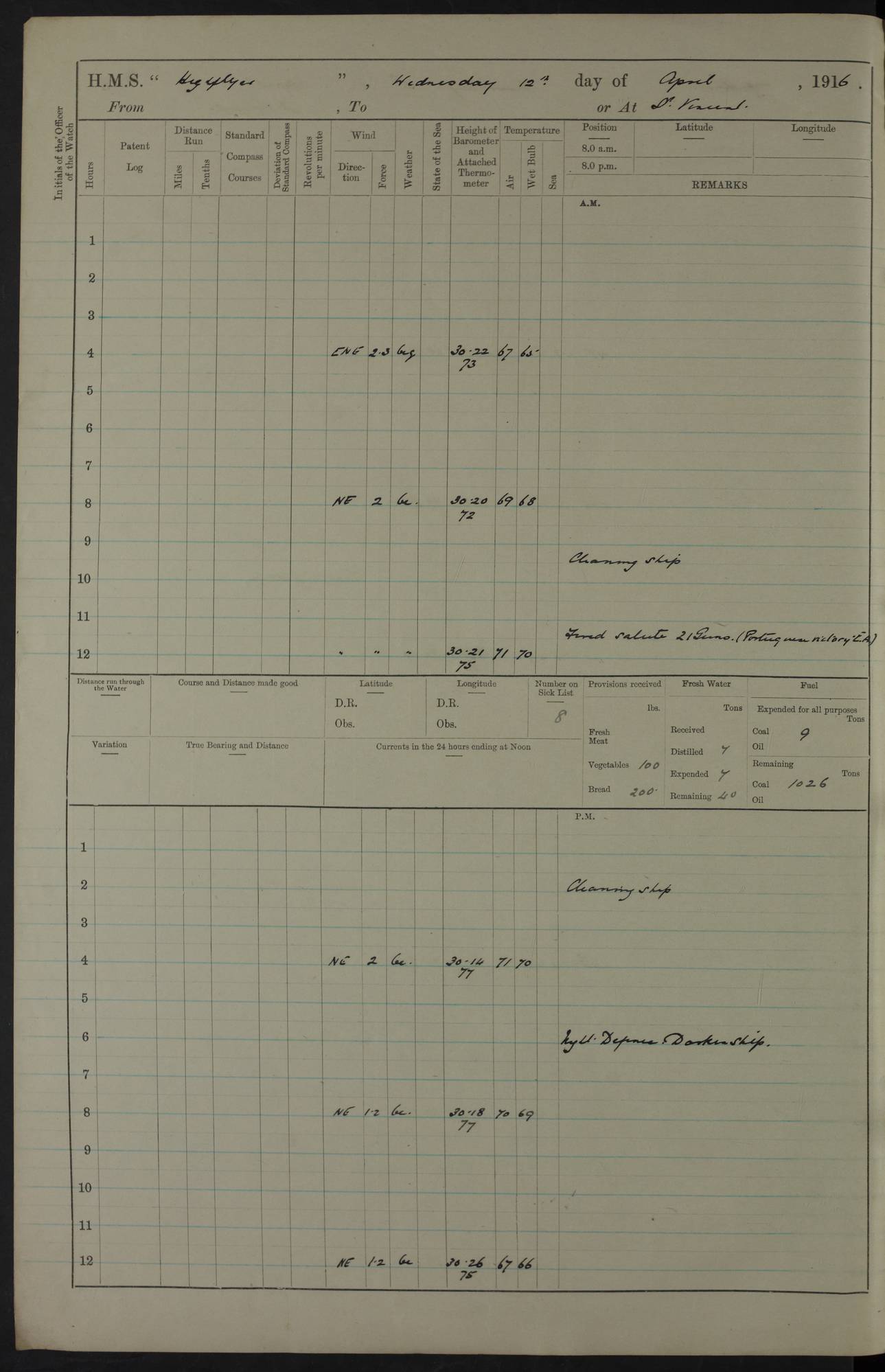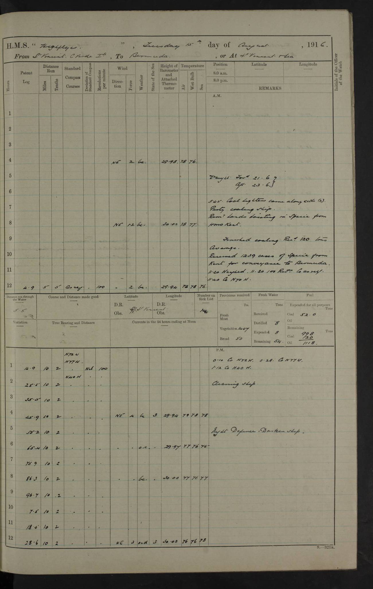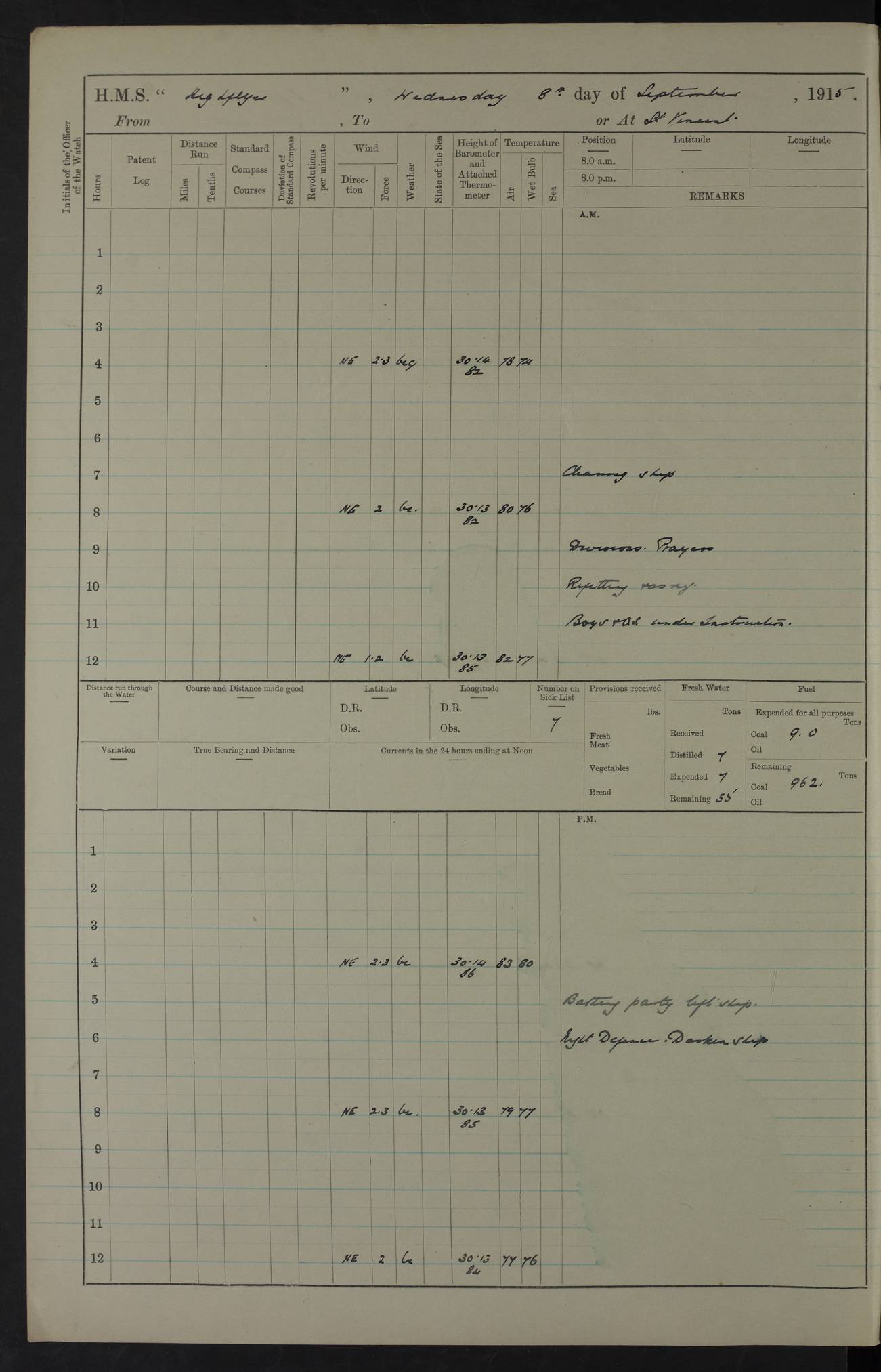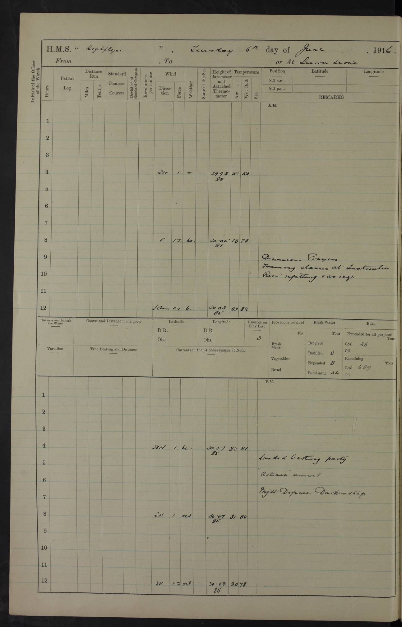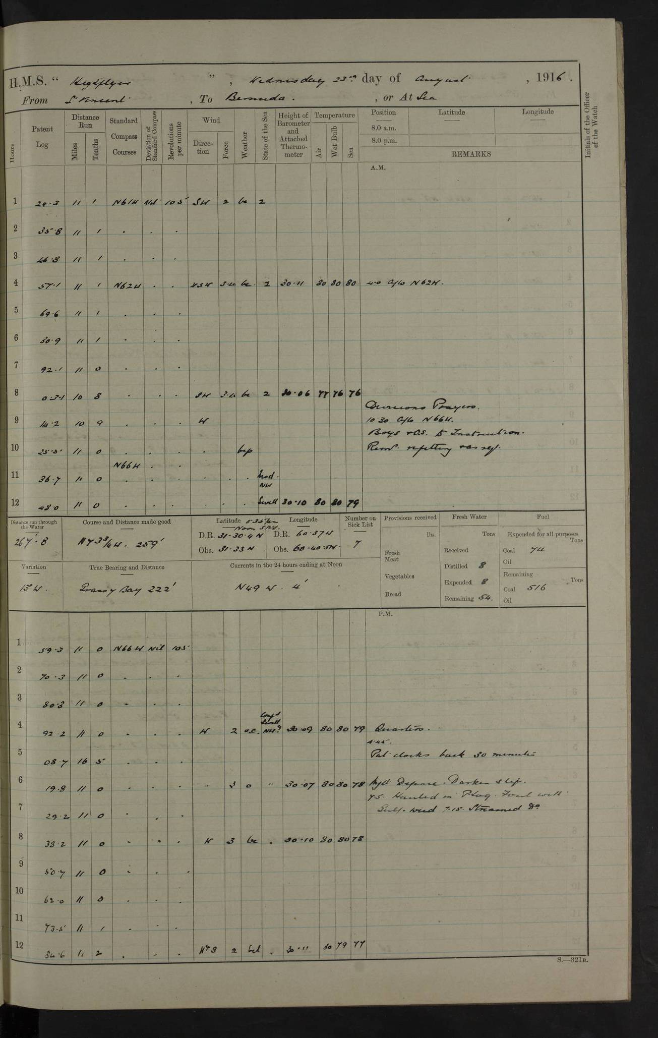 4f961154a2fc8e2def000869: (http://s3.amazonaws.com/oldweather/ADM53-44303/ADM 53-44303-011_0.jpg) 12 February 1916 Patrolling S American trade route to northward Lat 3.9, Long -29.9 7.38am: Stopped, boarded SS REINLAND (Dutch) bound southward Lat 3.13.4N, 30.01W. 4f961155a2fc8e2def00086a: (http://s3.amazonaws.com/oldweather/ADM53-44303/ADM 53-44303-011_1.jpg) 13 February 1916 Patrolling S American trade routes to northward Lat 7.8, Long -28.3 9.00am: Held Divine Service. 4f961155a2fc8e2def00086b: (http://s3.amazonaws.com/oldweather/ADM53-44303/ADM 53-44303-012_0.jpg) 14 February 1916 Patrolling trade routes. to northward Lat 11.4, Long -27.0 9.40am: 90 revs. Course as requisite for aiming rifle practice. 4f961155a2fc8e2def00086c: (http://s3.amazonaws.com/oldweather/ADM53-44303/ADM 53-44303-012_1.jpg) 15 February 1916 Towards Brava Id. Lat 14.2, Long -25.3 9.25am: Stopped, dropped target. Course and speed as requisite to carry out heavy gun practice. 4.00pm: Sighted Brava Id. vis. 1½ miles. Passed W side. 4f961156a2fc8e2def00086d: (http://s3.amazonaws.com/oldweather/ADM53-44303/ADM 53-44303-013_0.jpg) 16 February 1916 St. Vincent Lat 16.8828, Long -25.0106 7.35am: Land ahead visibility 1½’ San Antonio. 8.30am: Course as requisite for entering harbour. 11.00am: Preparing for coaling. 4f961156a2fc8e2def00086e: (http://s3.amazonaws.com/oldweather/ADM53-44303/ADM 53-44303-013_1.jpg) 17 February 1916 St. Vincent Lat 16.8828, Long -25.0106 6.00am: Collier SS PENHALE came alongside. 6.45am: Commenced coaling. 4f961156a2fc8e2def00086f: (http://s3.amazonaws.com/oldweather/ADM53-44303/ADM 53-44303-014_0.jpg) 18 February 1916 St. Vincent Lat 16.8828, Long -25.0106 Cleaning ship. 2.30pm: Drawing new fenders from SS TAMPLIN. 4f961157a2fc8e2def000870: (http://s3.amazonaws.com/oldweather/ADM53-44303/ADM 53-44303-014_1.jpg) 19 February 1916 St. Vincent Lat 16.8828, Long -25.0106 10.30am: Diving party sent to SS TAMPLIN. 4f961157a2fc8e2def000871: (http://s3.amazonaws.com/oldweather/ADM53-44303/ADM 53-44303-015_0.jpg) 20 February 1916 St. Vincent Lat 16.8828, Long -25.0106 7.00am: Sent diving party to TAMPLIN. 4f961157a2fc8e2def000872: (http://s3.amazonaws.com/oldweather/ADM53-44303/ADM 53-44303-015_1.jpg) 21 February 1916 St. Vincent to patrol Lat 16.8828, Long -25.0106 8.30am: Diving party sent to SS TAMPLIN. 6.40pm: Weighed and proceeded as requisite out of harbour. 8.30pm: Bull Point Lt. Ho. N24W, 6000 yds. 4f961158a2fc8e2def000873: (http://s3.amazonaws.com/oldweather/ADM53-44303/ADM 53-44303-016_0.jpg) 22 February 1916 Patrolling northward off San Antonio Id. Lat 18.1, Long -25.3 Painting ship and as requisite. 7.00pm: Western point San Antonio abeam 10’. 4f961158a2fc8e2def000874: (http://s3.amazonaws.com/oldweather/ADM53-44303/ADM 53-44303-016_1.jpg) 23 February 1916 Off San Antonio and St. Vincent to Tarrafal Bay Lat 16.8, Long -25.2 12.00pm: Spoke SS JASON, Brit., bound St. Vincent. 1.12pm: Boarded SS WILLEM VAN DREIL (Dutch) bound St. Vincent. 3.35pm: Stopped, came to with SB, in 33 fathoms. 4f961158a2fc8e2def000875: (http://s3.amazonaws.com/oldweather/ADM53-44303/ADM 53-44303-017_0.jpg) 24 February 1916 Tarrafal Bay, San Antonio Id. to St. Vincent Lat 16.8828, Long -25.0106 9.43 am; Proceeded. Course as requisite to St. Vincent round S end San Antonio 120 revs. 11.17am: Came to with SB in 11 fathoms. 4f961159a2fc8e2def000876: (http://s3.amazonaws.com/oldweather/ADM53-44303/ADM 53-44303-017_1.jpg) 25 February 1916 St. Vincent Lat 16.8828, Long -25.0106 Painting ship. Boys and OS at instruction. Control party at drill. 4f961159a2fc8e2def000877: (http://s3.amazonaws.com/oldweather/ADM53-44303/ADM 53-44303-018_0.jpg) 26 February 1916 St. Vincent Lat 16.8828, Long -25.0106 Cleaning ship. 4f961159a2fc8e2def000878: (http://s3.amazonaws.com/oldweather/ADM53-44303/ADM 53-44303-018_1.jpg) 27 February 1916 St. Vincent Lat 16.8828, Long -25.0106 9.30am: Held Divine Service. 4f96115aa2fc8e2def000879: (http://s3.amazonaws.com/oldweather/ADM53-44303/ADM 53-44303-019_0.jpg) 28 February 1916 St. Vincent Lat 16.8828, Long -25.0106 Boys and OS at instruction. Control party at drill. Remainder preparing for coaling. 2.00pm: Diving party at SS TAMPLIN. 4f96115aa2fc8e2def00087a: (http://s3.amazonaws.com/oldweather/ADM53-44303/ADM 53-44303-019_1.jpg) 29 February 1916 St. Vincent Lat 16.8828, Long -25.0106 7.15am: Commenced coaling from lighter. 8.00am: HMS SWIFTSURE arrived. USS CHESTER arrived. 4f96115aa2fc8e2def00087b: (http://s3.amazonaws.com/oldweather/ADM53-44303/ADM 53-44303-020_0.jpg) 4f96115ba2fc8e2def00087c: (http://s3.amazonaws.com/oldweather/ADM53-44303/ADM 53-44303-020_1.jpg) 4f96115ba2fc8e2def00087d: (http://s3.amazonaws.com/oldweather/ADM53-44303/ADM 53-44303-021_0.jpg) 4f96115ba2fc8e2def00087e: (http://s3.amazonaws.com/oldweather/ADM53-44303/ADM 53-44303-021_1.jpg) LOGS FOR MARCH 1916 4f96115ca2fc8e2def00087f: (http://s3.amazonaws.com/oldweather/ADM53-44304/ADM 53-44304-001_0.jpg) 4f96115ca2fc8e2def000880: (http://s3.amazonaws.com/oldweather/ADM53-44304/ADM 53-44304-001_1.jpg) 4f96115ca2fc8e2def000881: (http://s3.amazonaws.com/oldweather/ADM53-44304/ADM 53-44304-002_0.jpg) 4f96115da2fc8e2def000882: (http://s3.amazonaws.com/oldweather/ADM53-44304/ADM 53-44304-002_1.jpg) 4f96115da2fc8e2def000883: (http://s3.amazonaws.com/oldweather/ADM53-44304/ADM 53-44304-003_0.jpg) 4f96115da2fc8e2def000884: (http://s3.amazonaws.com/oldweather/ADM53-44304/ADM 53-44304-003_1.jpg) 4f96115da2fc8e2def000885: (http://s3.amazonaws.com/oldweather/ADM53-44304/ADM 53-44304-004_0.jpg) 4f96115ea2fc8e2def000886: (http://s3.amazonaws.com/oldweather/ADM53-44304/ADM 53-44304-004_1.jpg) 4f96115ea2fc8e2def000887: (http://s3.amazonaws.com/oldweather/ADM53-44304/ADM 53-44304-005_0.jpg) 4f96115ea2fc8e2def000888: (http://s3.amazonaws.com/oldweather/ADM53-44304/ADM 53-44304-005_1.jpg) 1 March 1916 St. Vincent Lat 16.8828, Long -25.0106 9.30pm: Discharged 1 Officer and 1 Tel. Rating to SS NORTHWAITE. 10.00pm: Surgeon Hobbs joined ship fro