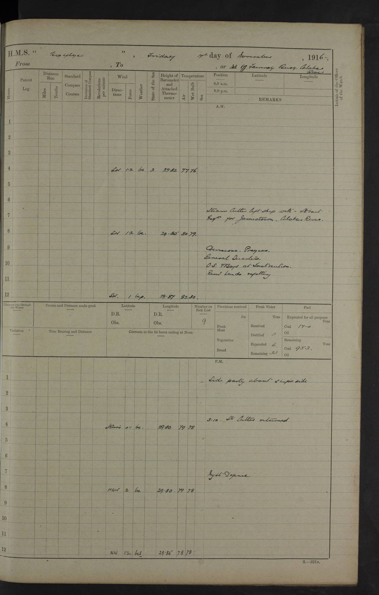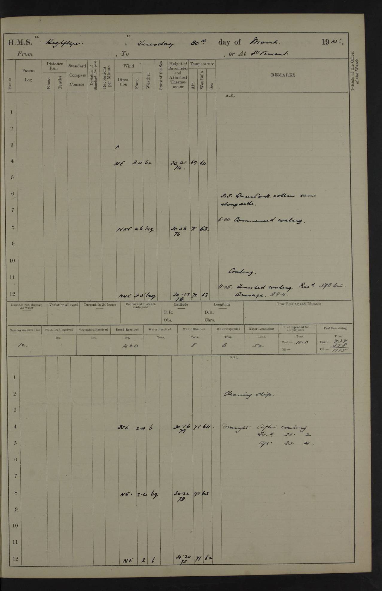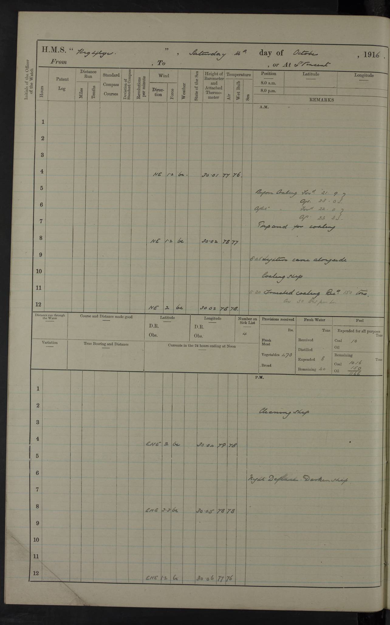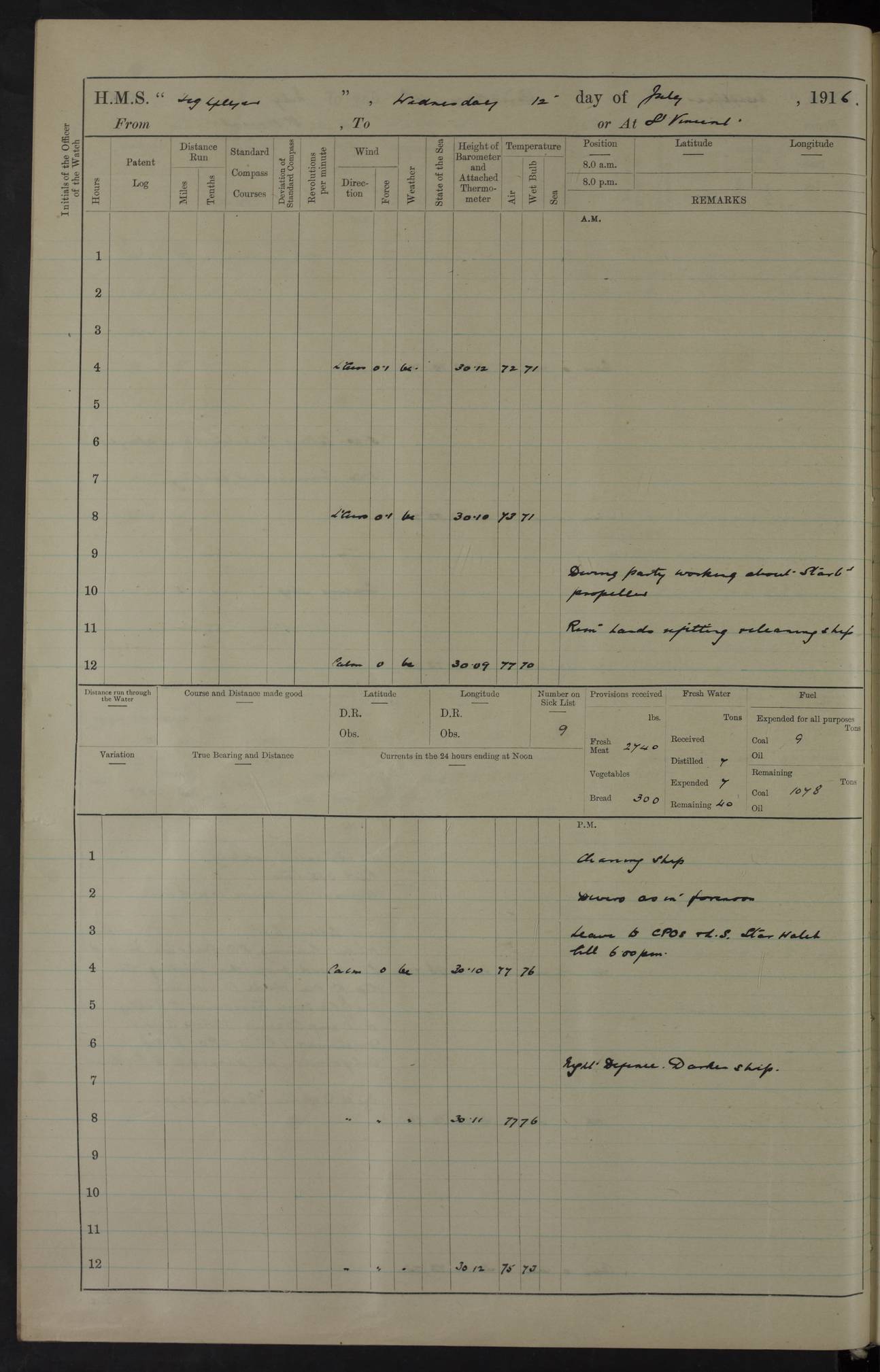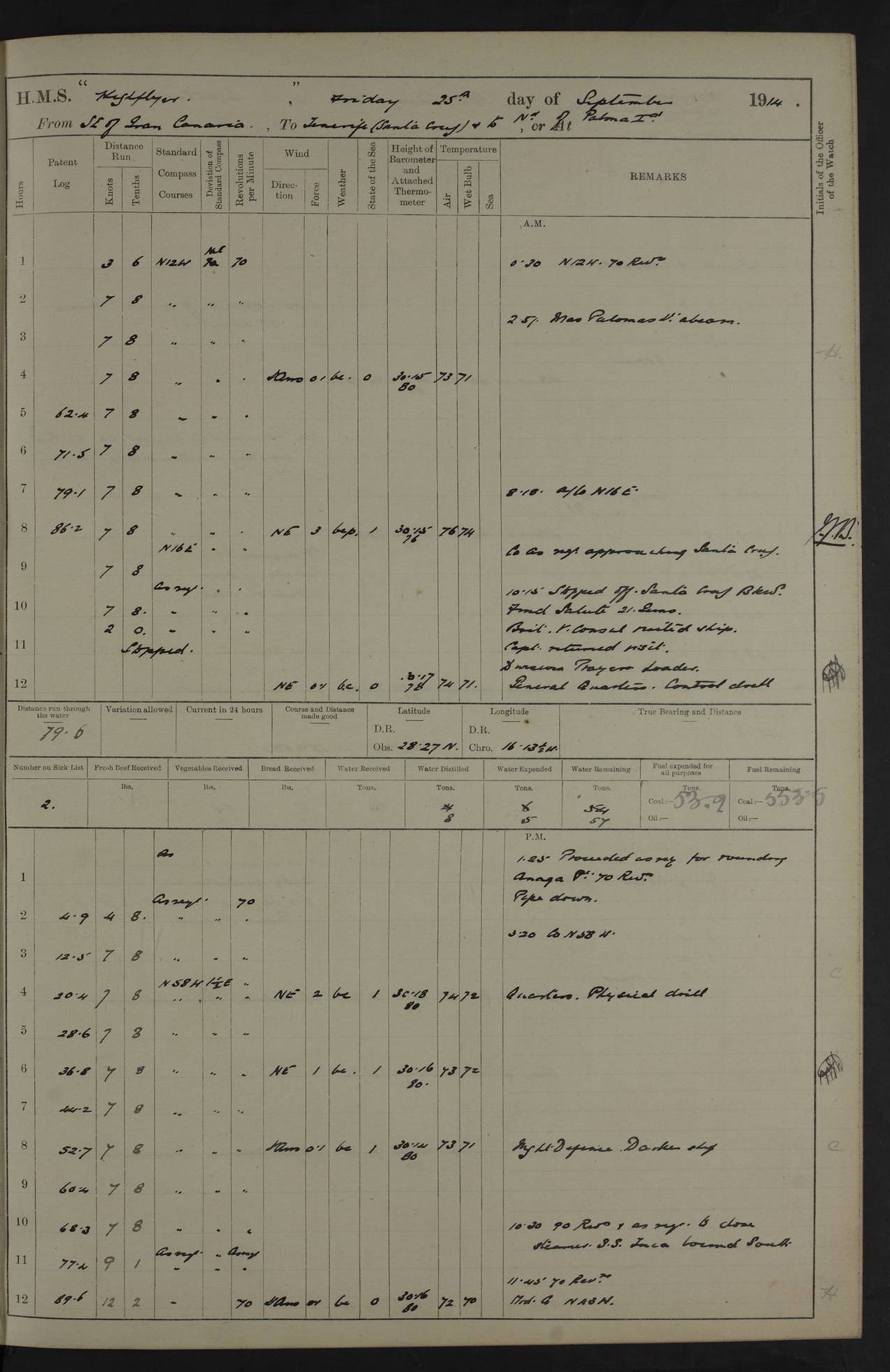 4f961154a2fc8e2def000869: (http://s3.amazonaws.com/oldweather/ADM53-44303/ADM 53-44303-011_0.jpg) 12 February 1916 Patrolling S American trade route to northward Lat 3.9, Long -29.9 7.38am: Stopped, boarded SS REINLAND (Dutch) bound southward Lat 3.13.4N, 30.01W. 4f961155a2fc8e2def00086a: (http://s3.amazonaws.com/oldweather/ADM53-44303/ADM 53-44303-011_1.jpg) 13 February 1916 Patrolling S American trade routes to northward Lat 7.8, Long -28.3 9.00am: Held Divine Service. 4f961155a2fc8e2def00086b: (http://s3.amazonaws.com/oldweather/ADM53-44303/ADM 53-44303-012_0.jpg) 14 February 1916 Patrolling trade routes. to northward Lat 11.4, Long -27.0 9.40am: 90 revs. Course as requisite for aiming rifle practice. 4f961155a2fc8e2def00086c: (http://s3.amazonaws.com/oldweather/ADM53-44303/ADM 53-44303-012_1.jpg) 15 February 1916 Towards Brava Id. Lat 14.2, Long -25.3 9.25am: Stopped, dropped target. Course and speed as requisite to carry out heavy gun practice. 4.00pm: Sighted Brava Id. vis. 1½ miles. Passed W side. 4f961156a2fc8e2def00086d: (http://s3.amazonaws.com/oldweather/ADM53-44303/ADM 53-44303-013_0.jpg) 16 February 1916 St. Vincent Lat 16.8828, Long -25.0106 7.35am: Land ahead visibility 1½’ San Antonio. 8.30am: Course as requisite for entering harbour. 11.00am: Preparing for coaling. 4f961156a2fc8e2def00086e: (http://s3.amazonaws.com/oldweather/ADM53-44303/ADM 53-44303-013_1.jpg) 17 February 1916 St. Vincent Lat 16.8828, Long -25.0106 6.00am: Collier SS PENHALE came alongside. 6.45am: Commenced coaling. 4f961156a2fc8e2def00086f: (http://s3.amazonaws.com/oldweather/ADM53-44303/ADM 53-44303-014_0.jpg) 18 February 1916 St. Vincent Lat 16.8828, Long -25.0106 Cleaning ship. 2.30pm: Drawing new fenders from SS TAMPLIN. 4f961157a2fc8e2def000870: (http://s3.amazonaws.com/oldweather/ADM53-44303/ADM 53-44303-014_1.jpg) 19 February 1916 St. Vincent Lat 16.8828, Long -25.0106 10.30am: Diving party sent to SS TAMPLIN. 4f961157a2fc8e2def000871: (http://s3.amazonaws.com/oldweather/ADM53-44303/ADM 53-44303-015_0.jpg) 20 February 1916 St. Vincent Lat 16.8828, Long -25.0106 7.00am: Sent diving party to TAMPLIN. 4f961157a2fc8e2def000872: (http://s3.amazonaws.com/oldweather/ADM53-44303/ADM 53-44303-015_1.jpg) 21 February 1916 St. Vincent to patrol Lat 16.8828, Long -25.0106 8.30am: Diving party sent to SS TAMPLIN. 6.40pm: Weighed and proceeded as requisite out of harbour. 8.30pm: Bull Point Lt. Ho. N24W, 6000 yds. 4f961158a2fc8e2def000873: (http://s3.amazonaws.com/oldweather/ADM53-44303/ADM 53-44303-016_0.jpg) 22 February 1916 Patrolling northward off San Antonio Id. Lat 18.1, Long -25.3 Painting ship and as requisite. 7.00pm: Western point San Antonio abeam 10’. 4f961158a2fc8e2def000874: (http://s3.amazonaws.com/oldweather/ADM53-44303/ADM 53-44303-016_1.jpg) 23 February 1916 Off San Antonio and St. Vincent to Tarrafal Bay Lat 16.8, Long -25.2 12.00pm: Spoke SS JASON, Brit., bound St. Vincent. 1.12pm: Boarded SS WILLEM VAN DREIL (Dutch) bound St. Vincent. 3.35pm: Stopped, came to with SB, in 33 fathoms. 4f961158a2fc8e2def000875: (http://s3.amazonaws.com/oldweather/ADM53-44303/ADM 53-44303-017_0.jpg) 24 February 1916 Tarrafal Bay, San Antonio Id. to St. Vincent Lat 16.8828, Long -25.0106 9.43 am; Proceeded. Course as requisite to St. Vincent round S end San Antonio 120 revs. 11.17am: Came to with SB in 11 fathoms. 4f961159a2fc8e2def000876: (http://s3.amazonaws.com/oldweather/ADM53-44303/ADM 53-44303-017_1.jpg) 25 February 1916 St. Vincent Lat 16.8828, Long -25.0106 Painting ship. Boys and OS at instruction. Control party at drill. 4f961159a2fc8e2def000877: (http://s3.amazonaws.com/oldweather/ADM53-44303/ADM 53-44303-018_0.jpg) 26 February 1916 St. Vincent Lat 16.8828, Long -25.0106 Cleaning ship. 4f961159a2fc8e2def000878: (http://s3.amazonaws.com/oldweather/ADM53-44303/ADM 53-44303-018_1.jpg) 27 February 1916 St. Vincent Lat 16.8828, Long -25.0106 9.30am: Held Divine Service. 4f96115aa2fc8e2def000879: (http://s3.amazonaws.com/oldweather/ADM53-44303/ADM 53-44303-019_0.jpg) 28 February 1916 St. Vincent Lat 16.8828, Long -25.0106 Boys and OS at instruction. Control party at drill. Remainder preparing for coaling. 2.00pm: Diving party at SS TAMPLIN. 4f96115aa2fc8e2def00087a: (http://s3.amazonaws.com/oldweather/ADM53-44303/ADM 53-44303-019_1.jpg) 29 February 1916 St. Vincent Lat 16.8828, Long -25.0106 7.15am: Commenced coaling from lighter. 8.00am: HMS SWIFTSURE arrived. USS CHESTER arrived. 4f96115aa2fc8e2def00087b: (http://s3.amazonaws.com/oldweather/ADM53-44303/ADM 53-44303-020_0.jpg) 4f96115ba2fc8e2def00087c: (http://s3.amazonaws.com/oldweather/ADM53-44303/ADM 53-44303-020_1.jpg) 4f96115ba2fc8e2def00087d: (http://s3.amazonaws.com/oldweather/ADM53-44303/ADM 53-44303-021_0.jpg) 4f96115ba2fc8e2def00087e: (http://s3.amazonaws.com/oldweather/ADM53-44303/ADM 53-44303-021_1.jpg) LOGS FOR MARCH 1916 4f96115ca2fc8e2def00087f: (http://s3.amazonaws.com/oldweather/ADM53-44304/ADM 53-44304-001_0.jpg) 4f96115ca2fc8e2def000880: (http://s3.amazonaws.com/oldweather/ADM53-44304/ADM 53-44304-001_1.jpg) 4f96115ca2fc8e2def000881: (http://s3.amazonaws.com/oldweather/ADM53-44304/ADM 53-44304-002_0.jpg) 4f96115da2fc8e2def000882: (http://s3.amazonaws.com/oldweather/ADM53-44304/ADM 53-44304-002_1.jpg) 4f96115da2fc8e2def000883: (http://s3.amazonaws.com/oldweather/ADM53-44304/ADM 53-44304-003_0.jpg) 4f96115da2fc8e2def000884: (http://s3.amazonaws.com/oldweather/ADM53-44304/ADM 53-44304-003_1.jpg) 4f96115da2fc8e2def000885: (http://s3.amazonaws.com/oldweather/ADM53-44304/ADM 53-44304-004_0.jpg) 4f96115ea2fc8e2def000886: (http://s3.amazonaws.com/oldweather/ADM53-44304/ADM 53-44304-004_1.jpg) 4f96115ea2fc8e2def000887: (http://s3.amazonaws.com/oldweather/ADM53-44304/ADM 53-44304-005_0.jpg) 4f96115ea2fc8e2def000888: (http://s3.amazonaws.com/oldweather/ADM53-44304/ADM 53-44304-005_1.jpg) 1 March 1916 St. Vincent Lat 16.8828, Long -25.0106 9.30pm: Discharged 1 Officer and 1 Tel. Rating to SS NORTHWAITE. 10.00pm: Surgeon Hobbs joined ship fro