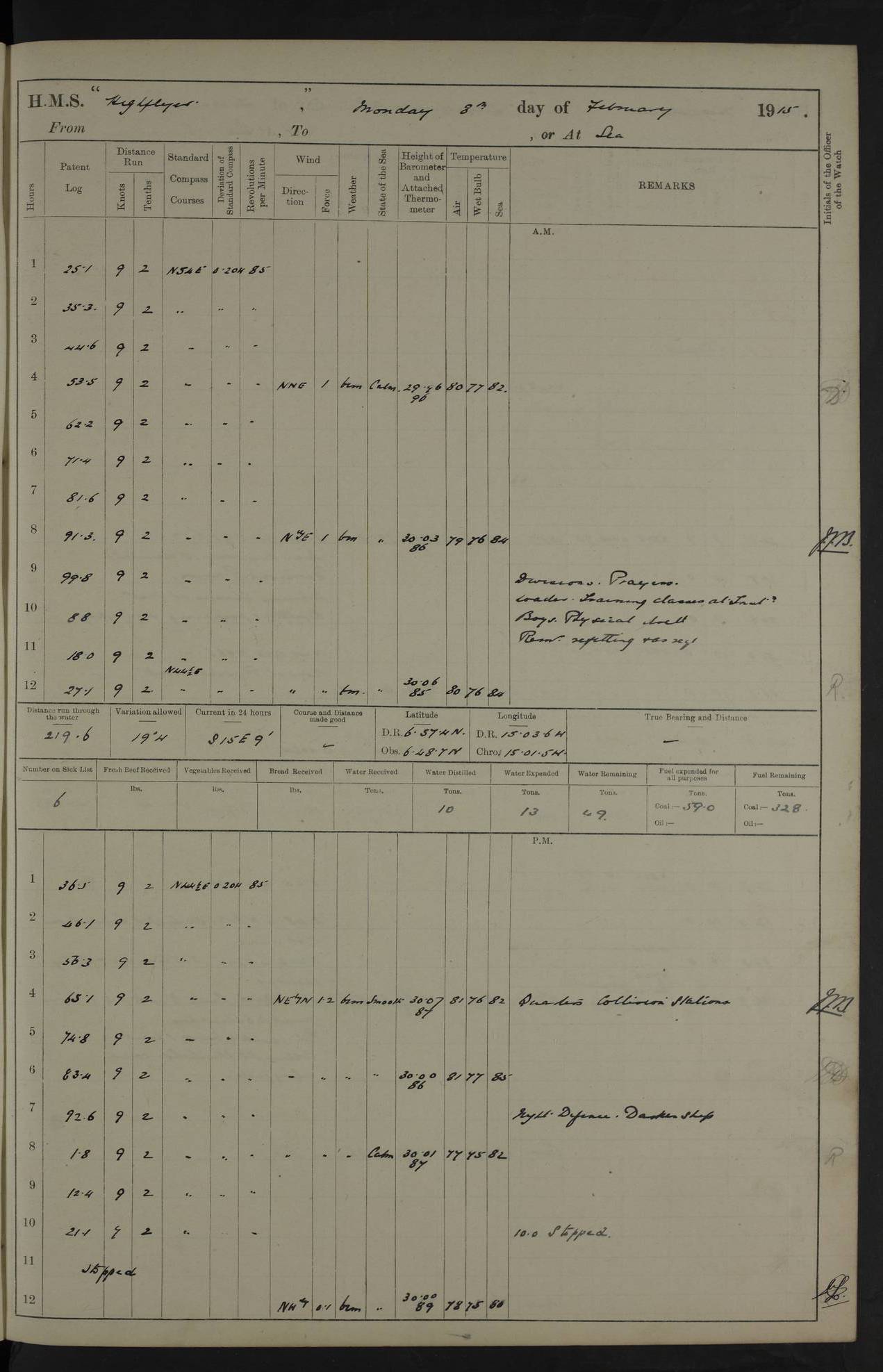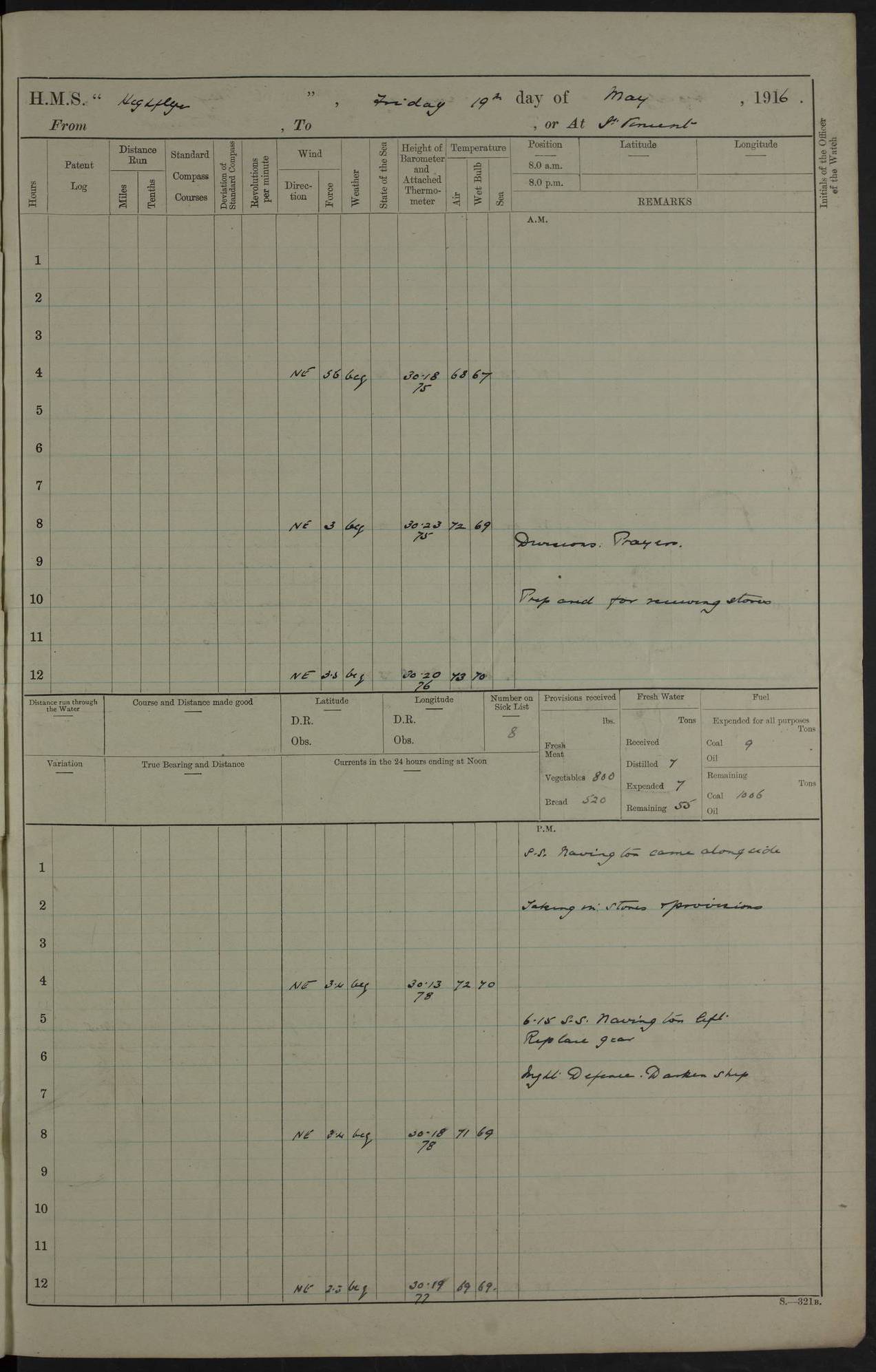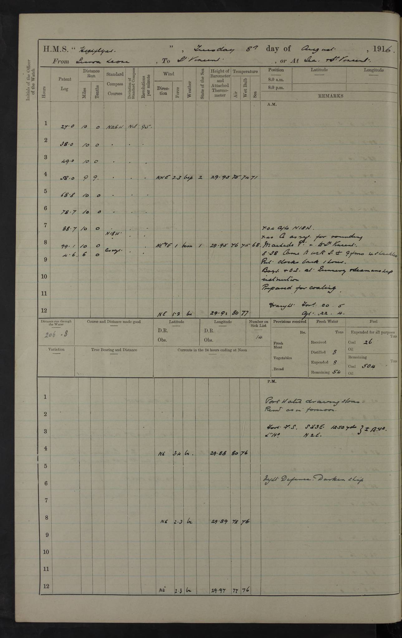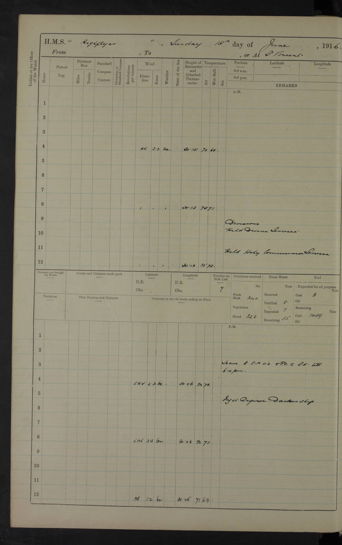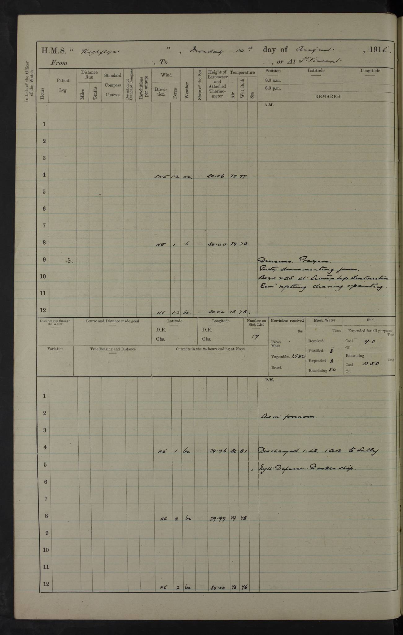 4f961154a2fc8e2def000869: (http://s3.amazonaws.com/oldweather/ADM53-44303/ADM 53-44303-011_0.jpg) 12 February 1916 Patrolling S American trade route to northward Lat 3.9, Long -29.9 7.38am: Stopped, boarded SS REINLAND (Dutch) bound southward Lat 3.13.4N, 30.01W. 4f961155a2fc8e2def00086a: (http://s3.amazonaws.com/oldweather/ADM53-44303/ADM 53-44303-011_1.jpg) 13 February 1916 Patrolling S American trade routes to northward Lat 7.8, Long -28.3 9.00am: Held Divine Service. 4f961155a2fc8e2def00086b: (http://s3.amazonaws.com/oldweather/ADM53-44303/ADM 53-44303-012_0.jpg) 14 February 1916 Patrolling trade routes. to northward Lat 11.4, Long -27.0 9.40am: 90 revs. Course as requisite for aiming rifle practice. 4f961155a2fc8e2def00086c: (http://s3.amazonaws.com/oldweather/ADM53-44303/ADM 53-44303-012_1.jpg) 15 February 1916 Towards Brava Id. Lat 14.2, Long -25.3 9.25am: Stopped, dropped target. Course and speed as requisite to carry out heavy gun practice. 4.00pm: Sighted Brava Id. vis. 1½ miles. Passed W side. 4f961156a2fc8e2def00086d: (http://s3.amazonaws.com/oldweather/ADM53-44303/ADM 53-44303-013_0.jpg) 16 February 1916 St. Vincent Lat 16.8828, Long -25.0106 7.35am: Land ahead visibility 1½’ San Antonio. 8.30am: Course as requisite for entering harbour. 11.00am: Preparing for coaling. 4f961156a2fc8e2def00086e: (http://s3.amazonaws.com/oldweather/ADM53-44303/ADM 53-44303-013_1.jpg) 17 February 1916 St. Vincent Lat 16.8828, Long -25.0106 6.00am: Collier SS PENHALE came alongside. 6.45am: Commenced coaling. 4f961156a2fc8e2def00086f: (http://s3.amazonaws.com/oldweather/ADM53-44303/ADM 53-44303-014_0.jpg) 18 February 1916 St. Vincent Lat 16.8828, Long -25.0106 Cleaning ship. 2.30pm: Drawing new fenders from SS TAMPLIN. 4f961157a2fc8e2def000870: (http://s3.amazonaws.com/oldweather/ADM53-44303/ADM 53-44303-014_1.jpg) 19 February 1916 St. Vincent Lat 16.8828, Long -25.0106 10.30am: Diving party sent to SS TAMPLIN. 4f961157a2fc8e2def000871: (http://s3.amazonaws.com/oldweather/ADM53-44303/ADM 53-44303-015_0.jpg) 20 February 1916 St. Vincent Lat 16.8828, Long -25.0106 7.00am: Sent diving party to TAMPLIN. 4f961157a2fc8e2def000872: (http://s3.amazonaws.com/oldweather/ADM53-44303/ADM 53-44303-015_1.jpg) 21 February 1916 St. Vincent to patrol Lat 16.8828, Long -25.0106 8.30am: Diving party sent to SS TAMPLIN. 6.40pm: Weighed and proceeded as requisite out of harbour. 8.30pm: Bull Point Lt. Ho. N24W, 6000 yds. 4f961158a2fc8e2def000873: (http://s3.amazonaws.com/oldweather/ADM53-44303/ADM 53-44303-016_0.jpg) 22 February 1916 Patrolling northward off San Antonio Id. Lat 18.1, Long -25.3 Painting ship and as requisite. 7.00pm: Western point San Antonio abeam 10’. 4f961158a2fc8e2def000874: (http://s3.amazonaws.com/oldweather/ADM53-44303/ADM 53-44303-016_1.jpg) 23 February 1916 Off San Antonio and St. Vincent to Tarrafal Bay Lat 16.8, Long -25.2 12.00pm: Spoke SS JASON, Brit., bound St. Vincent. 1.12pm: Boarded SS WILLEM VAN DREIL (Dutch) bound St. Vincent. 3.35pm: Stopped, came to with SB, in 33 fathoms. 4f961158a2fc8e2def000875: (http://s3.amazonaws.com/oldweather/ADM53-44303/ADM 53-44303-017_0.jpg) 24 February 1916 Tarrafal Bay, San Antonio Id. to St. Vincent Lat 16.8828, Long -25.0106 9.43 am; Proceeded. Course as requisite to St. Vincent round S end San Antonio 120 revs. 11.17am: Came to with SB in 11 fathoms. 4f961159a2fc8e2def000876: (http://s3.amazonaws.com/oldweather/ADM53-44303/ADM 53-44303-017_1.jpg) 25 February 1916 St. Vincent Lat 16.8828, Long -25.0106 Painting ship. Boys and OS at instruction. Control party at drill. 4f961159a2fc8e2def000877: (http://s3.amazonaws.com/oldweather/ADM53-44303/ADM 53-44303-018_0.jpg) 26 February 1916 St. Vincent Lat 16.8828, Long -25.0106 Cleaning ship. 4f961159a2fc8e2def000878: (http://s3.amazonaws.com/oldweather/ADM53-44303/ADM 53-44303-018_1.jpg) 27 February 1916 St. Vincent Lat 16.8828, Long -25.0106 9.30am: Held Divine Service. 4f96115aa2fc8e2def000879: (http://s3.amazonaws.com/oldweather/ADM53-44303/ADM 53-44303-019_0.jpg) 28 February 1916 St. Vincent Lat 16.8828, Long -25.0106 Boys and OS at instruction. Control party at drill. Remainder preparing for coaling. 2.00pm: Diving party at SS TAMPLIN. 4f96115aa2fc8e2def00087a: (http://s3.amazonaws.com/oldweather/ADM53-44303/ADM 53-44303-019_1.jpg) 29 February 1916 St. Vincent Lat 16.8828, Long -25.0106 7.15am: Commenced coaling from lighter. 8.00am: HMS SWIFTSURE arrived. USS CHESTER arrived. 4f96115aa2fc8e2def00087b: (http://s3.amazonaws.com/oldweather/ADM53-44303/ADM 53-44303-020_0.jpg) 4f96115ba2fc8e2def00087c: (http://s3.amazonaws.com/oldweather/ADM53-44303/ADM 53-44303-020_1.jpg) 4f96115ba2fc8e2def00087d: (http://s3.amazonaws.com/oldweather/ADM53-44303/ADM 53-44303-021_0.jpg) 4f96115ba2fc8e2def00087e: (http://s3.amazonaws.com/oldweather/ADM53-44303/ADM 53-44303-021_1.jpg) LOGS FOR MARCH 1916 4f96115ca2fc8e2def00087f: (http://s3.amazonaws.com/oldweather/ADM53-44304/ADM 53-44304-001_0.jpg) 4f96115ca2fc8e2def000880: (http://s3.amazonaws.com/oldweather/ADM53-44304/ADM 53-44304-001_1.jpg) 4f96115ca2fc8e2def000881: (http://s3.amazonaws.com/oldweather/ADM53-44304/ADM 53-44304-002_0.jpg) 4f96115da2fc8e2def000882: (http://s3.amazonaws.com/oldweather/ADM53-44304/ADM 53-44304-002_1.jpg) 4f96115da2fc8e2def000883: (http://s3.amazonaws.com/oldweather/ADM53-44304/ADM 53-44304-003_0.jpg) 4f96115da2fc8e2def000884: (http://s3.amazonaws.com/oldweather/ADM53-44304/ADM 53-44304-003_1.jpg) 4f96115da2fc8e2def000885: (http://s3.amazonaws.com/oldweather/ADM53-44304/ADM 53-44304-004_0.jpg) 4f96115ea2fc8e2def000886: (http://s3.amazonaws.com/oldweather/ADM53-44304/ADM 53-44304-004_1.jpg) 4f96115ea2fc8e2def000887: (http://s3.amazonaws.com/oldweather/ADM53-44304/ADM 53-44304-005_0.jpg) 4f96115ea2fc8e2def000888: (http://s3.amazonaws.com/oldweather/ADM53-44304/ADM 53-44304-005_1.jpg) 1 March 1916 St. Vincent Lat 16.8828, Long -25.0106 9.30pm: Discharged 1 Officer and 1 Tel. Rating to SS NORTHWAITE. 10.00pm: Surgeon Hobbs joined ship fro