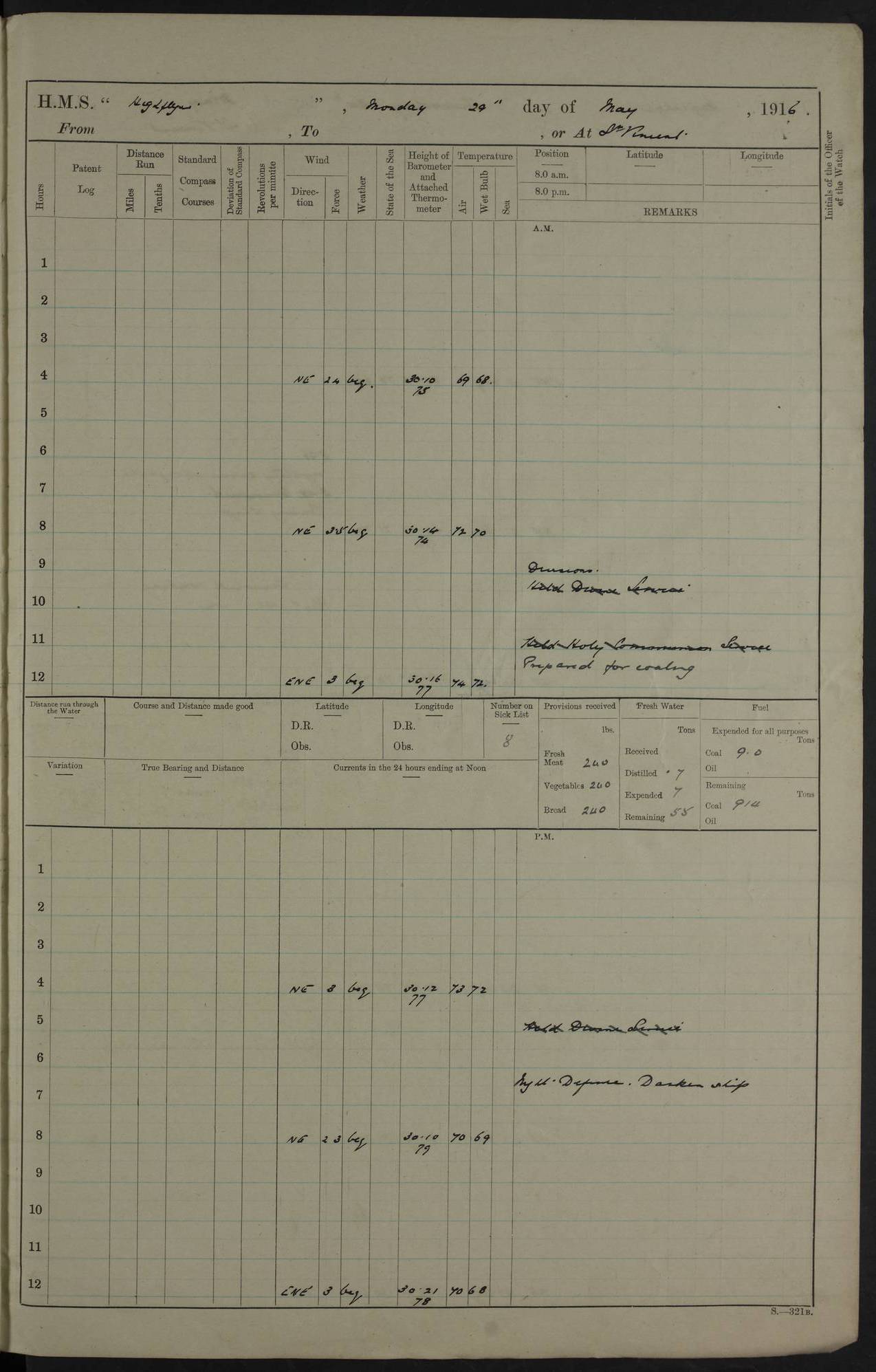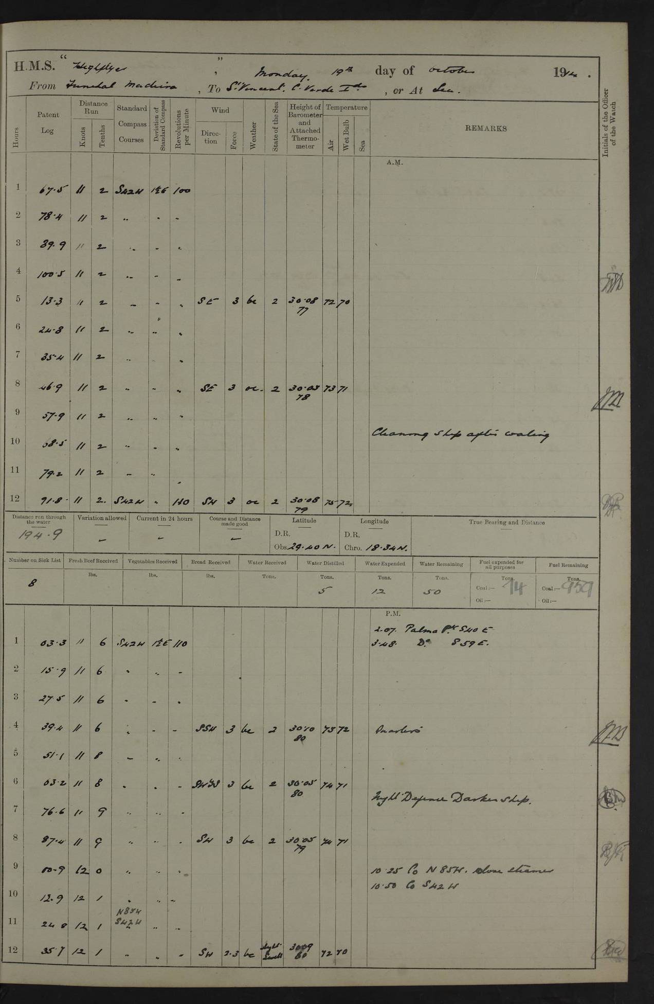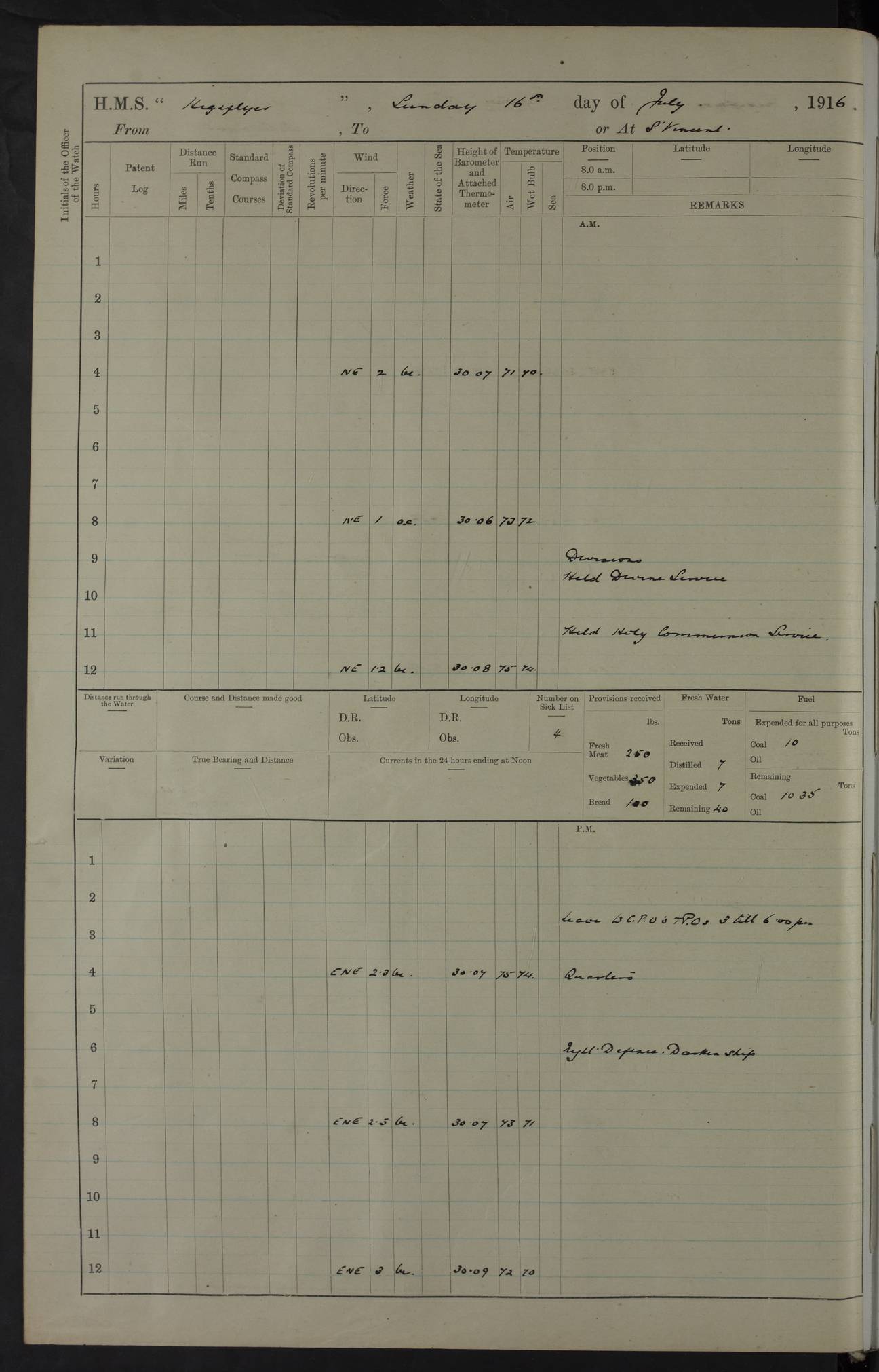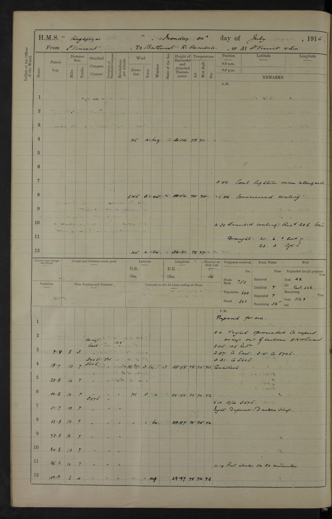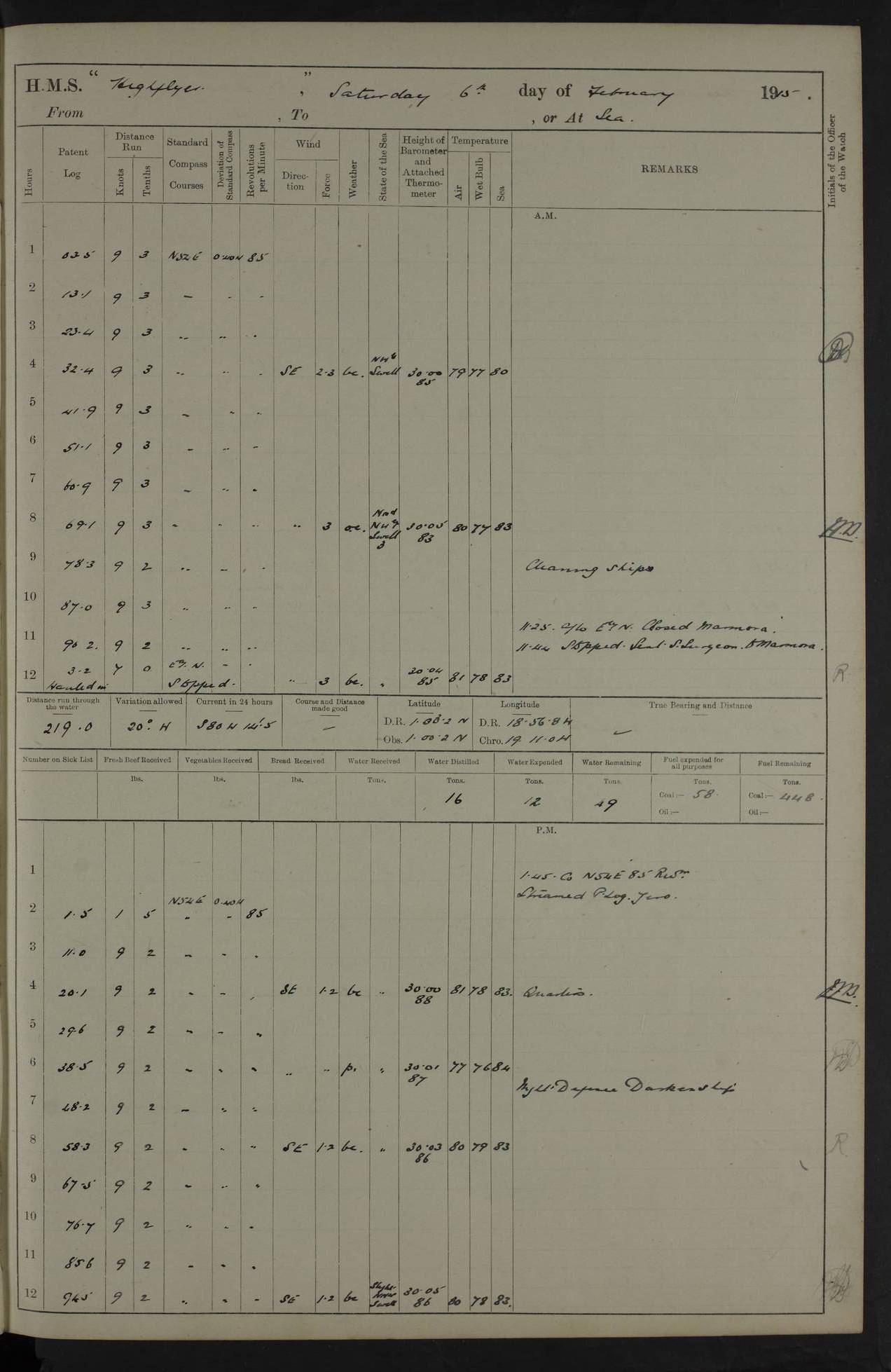 4f961154a2fc8e2def000869: (http://s3.amazonaws.com/oldweather/ADM53-44303/ADM 53-44303-011_0.jpg) 12 February 1916 Patrolling S American trade route to northward Lat 3.9, Long -29.9 7.38am: Stopped, boarded SS REINLAND (Dutch) bound southward Lat 3.13.4N, 30.01W. 4f961155a2fc8e2def00086a: (http://s3.amazonaws.com/oldweather/ADM53-44303/ADM 53-44303-011_1.jpg) 13 February 1916 Patrolling S American trade routes to northward Lat 7.8, Long -28.3 9.00am: Held Divine Service. 4f961155a2fc8e2def00086b: (http://s3.amazonaws.com/oldweather/ADM53-44303/ADM 53-44303-012_0.jpg) 14 February 1916 Patrolling trade routes. to northward Lat 11.4, Long -27.0 9.40am: 90 revs. Course as requisite for aiming rifle practice. 4f961155a2fc8e2def00086c: (http://s3.amazonaws.com/oldweather/ADM53-44303/ADM 53-44303-012_1.jpg) 15 February 1916 Towards Brava Id. Lat 14.2, Long -25.3 9.25am: Stopped, dropped target. Course and speed as requisite to carry out heavy gun practice. 4.00pm: Sighted Brava Id. vis. 1½ miles. Passed W side. 4f961156a2fc8e2def00086d: (http://s3.amazonaws.com/oldweather/ADM53-44303/ADM 53-44303-013_0.jpg) 16 February 1916 St. Vincent Lat 16.8828, Long -25.0106 7.35am: Land ahead visibility 1½’ San Antonio. 8.30am: Course as requisite for entering harbour. 11.00am: Preparing for coaling. 4f961156a2fc8e2def00086e: (http://s3.amazonaws.com/oldweather/ADM53-44303/ADM 53-44303-013_1.jpg) 17 February 1916 St. Vincent Lat 16.8828, Long -25.0106 6.00am: Collier SS PENHALE came alongside. 6.45am: Commenced coaling. 4f961156a2fc8e2def00086f: (http://s3.amazonaws.com/oldweather/ADM53-44303/ADM 53-44303-014_0.jpg) 18 February 1916 St. Vincent Lat 16.8828, Long -25.0106 Cleaning ship. 2.30pm: Drawing new fenders from SS TAMPLIN. 4f961157a2fc8e2def000870: (http://s3.amazonaws.com/oldweather/ADM53-44303/ADM 53-44303-014_1.jpg) 19 February 1916 St. Vincent Lat 16.8828, Long -25.0106 10.30am: Diving party sent to SS TAMPLIN. 4f961157a2fc8e2def000871: (http://s3.amazonaws.com/oldweather/ADM53-44303/ADM 53-44303-015_0.jpg) 20 February 1916 St. Vincent Lat 16.8828, Long -25.0106 7.00am: Sent diving party to TAMPLIN. 4f961157a2fc8e2def000872: (http://s3.amazonaws.com/oldweather/ADM53-44303/ADM 53-44303-015_1.jpg) 21 February 1916 St. Vincent to patrol Lat 16.8828, Long -25.0106 8.30am: Diving party sent to SS TAMPLIN. 6.40pm: Weighed and proceeded as requisite out of harbour. 8.30pm: Bull Point Lt. Ho. N24W, 6000 yds. 4f961158a2fc8e2def000873: (http://s3.amazonaws.com/oldweather/ADM53-44303/ADM 53-44303-016_0.jpg) 22 February 1916 Patrolling northward off San Antonio Id. Lat 18.1, Long -25.3 Painting ship and as requisite. 7.00pm: Western point San Antonio abeam 10’. 4f961158a2fc8e2def000874: (http://s3.amazonaws.com/oldweather/ADM53-44303/ADM 53-44303-016_1.jpg) 23 February 1916 Off San Antonio and St. Vincent to Tarrafal Bay Lat 16.8, Long -25.2 12.00pm: Spoke SS JASON, Brit., bound St. Vincent. 1.12pm: Boarded SS WILLEM VAN DREIL (Dutch) bound St. Vincent. 3.35pm: Stopped, came to with SB, in 33 fathoms. 4f961158a2fc8e2def000875: (http://s3.amazonaws.com/oldweather/ADM53-44303/ADM 53-44303-017_0.jpg) 24 February 1916 Tarrafal Bay, San Antonio Id. to St. Vincent Lat 16.8828, Long -25.0106 9.43 am; Proceeded. Course as requisite to St. Vincent round S end San Antonio 120 revs. 11.17am: Came to with SB in 11 fathoms. 4f961159a2fc8e2def000876: (http://s3.amazonaws.com/oldweather/ADM53-44303/ADM 53-44303-017_1.jpg) 25 February 1916 St. Vincent Lat 16.8828, Long -25.0106 Painting ship. Boys and OS at instruction. Control party at drill. 4f961159a2fc8e2def000877: (http://s3.amazonaws.com/oldweather/ADM53-44303/ADM 53-44303-018_0.jpg) 26 February 1916 St. Vincent Lat 16.8828, Long -25.0106 Cleaning ship. 4f961159a2fc8e2def000878: (http://s3.amazonaws.com/oldweather/ADM53-44303/ADM 53-44303-018_1.jpg) 27 February 1916 St. Vincent Lat 16.8828, Long -25.0106 9.30am: Held Divine Service. 4f96115aa2fc8e2def000879: (http://s3.amazonaws.com/oldweather/ADM53-44303/ADM 53-44303-019_0.jpg) 28 February 1916 St. Vincent Lat 16.8828, Long -25.0106 Boys and OS at instruction. Control party at drill. Remainder preparing for coaling. 2.00pm: Diving party at SS TAMPLIN. 4f96115aa2fc8e2def00087a: (http://s3.amazonaws.com/oldweather/ADM53-44303/ADM 53-44303-019_1.jpg) 29 February 1916 St. Vincent Lat 16.8828, Long -25.0106 7.15am: Commenced coaling from lighter. 8.00am: HMS SWIFTSURE arrived. USS CHESTER arrived. 4f96115aa2fc8e2def00087b: (http://s3.amazonaws.com/oldweather/ADM53-44303/ADM 53-44303-020_0.jpg) 4f96115ba2fc8e2def00087c: (http://s3.amazonaws.com/oldweather/ADM53-44303/ADM 53-44303-020_1.jpg) 4f96115ba2fc8e2def00087d: (http://s3.amazonaws.com/oldweather/ADM53-44303/ADM 53-44303-021_0.jpg) 4f96115ba2fc8e2def00087e: (http://s3.amazonaws.com/oldweather/ADM53-44303/ADM 53-44303-021_1.jpg) LOGS FOR MARCH 1916 4f96115ca2fc8e2def00087f: (http://s3.amazonaws.com/oldweather/ADM53-44304/ADM 53-44304-001_0.jpg) 4f96115ca2fc8e2def000880: (http://s3.amazonaws.com/oldweather/ADM53-44304/ADM 53-44304-001_1.jpg) 4f96115ca2fc8e2def000881: (http://s3.amazonaws.com/oldweather/ADM53-44304/ADM 53-44304-002_0.jpg) 4f96115da2fc8e2def000882: (http://s3.amazonaws.com/oldweather/ADM53-44304/ADM 53-44304-002_1.jpg) 4f96115da2fc8e2def000883: (http://s3.amazonaws.com/oldweather/ADM53-44304/ADM 53-44304-003_0.jpg) 4f96115da2fc8e2def000884: (http://s3.amazonaws.com/oldweather/ADM53-44304/ADM 53-44304-003_1.jpg) 4f96115da2fc8e2def000885: (http://s3.amazonaws.com/oldweather/ADM53-44304/ADM 53-44304-004_0.jpg) 4f96115ea2fc8e2def000886: (http://s3.amazonaws.com/oldweather/ADM53-44304/ADM 53-44304-004_1.jpg) 4f96115ea2fc8e2def000887: (http://s3.amazonaws.com/oldweather/ADM53-44304/ADM 53-44304-005_0.jpg) 4f96115ea2fc8e2def000888: (http://s3.amazonaws.com/oldweather/ADM53-44304/ADM 53-44304-005_1.jpg) 1 March 1916 St. Vincent Lat 16.8828, Long -25.0106 9.30pm: Discharged 1 Officer and 1 Tel. Rating to SS NORTHWAITE. 10.00pm: Surgeon Hobbs joined ship fro