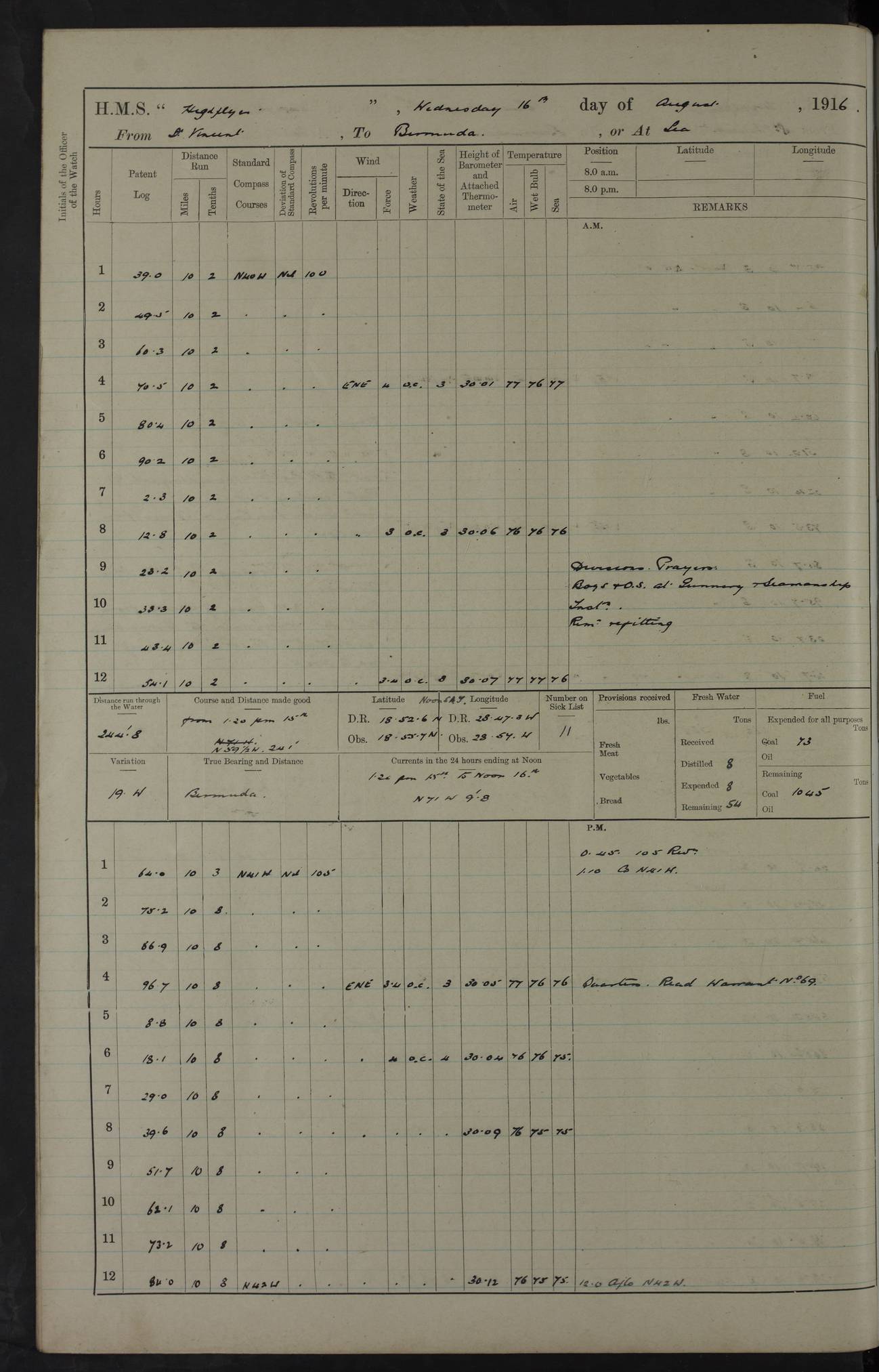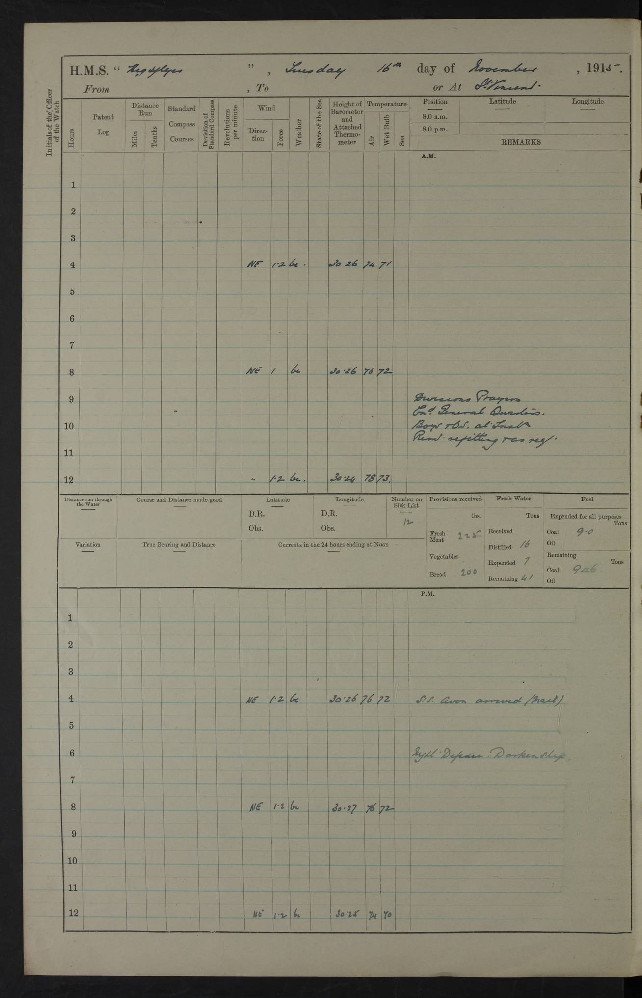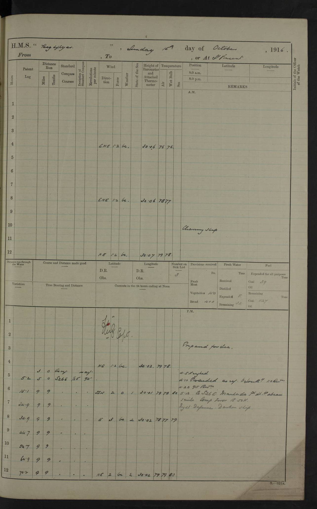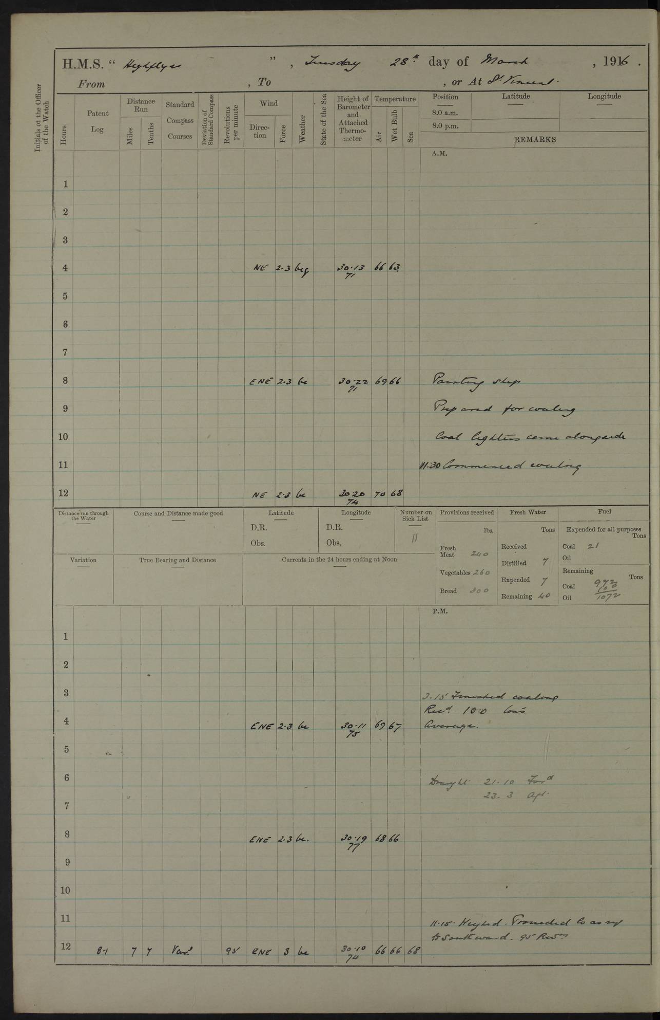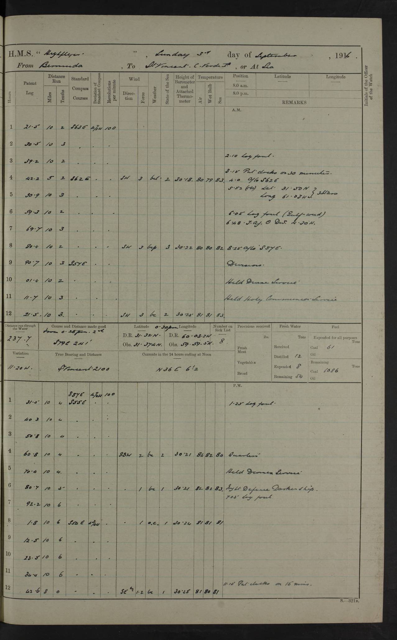 4f961154a2fc8e2def000869: (http://s3.amazonaws.com/oldweather/ADM53-44303/ADM 53-44303-011_0.jpg) 12 February 1916 Patrolling S American trade route to northward Lat 3.9, Long -29.9 7.38am: Stopped, boarded SS REINLAND (Dutch) bound southward Lat 3.13.4N, 30.01W. 4f961155a2fc8e2def00086a: (http://s3.amazonaws.com/oldweather/ADM53-44303/ADM 53-44303-011_1.jpg) 13 February 1916 Patrolling S American trade routes to northward Lat 7.8, Long -28.3 9.00am: Held Divine Service. 4f961155a2fc8e2def00086b: (http://s3.amazonaws.com/oldweather/ADM53-44303/ADM 53-44303-012_0.jpg) 14 February 1916 Patrolling trade routes. to northward Lat 11.4, Long -27.0 9.40am: 90 revs. Course as requisite for aiming rifle practice. 4f961155a2fc8e2def00086c: (http://s3.amazonaws.com/oldweather/ADM53-44303/ADM 53-44303-012_1.jpg) 15 February 1916 Towards Brava Id. Lat 14.2, Long -25.3 9.25am: Stopped, dropped target. Course and speed as requisite to carry out heavy gun practice. 4.00pm: Sighted Brava Id. vis. 1½ miles. Passed W side. 4f961156a2fc8e2def00086d: (http://s3.amazonaws.com/oldweather/ADM53-44303/ADM 53-44303-013_0.jpg) 16 February 1916 St. Vincent Lat 16.8828, Long -25.0106 7.35am: Land ahead visibility 1½’ San Antonio. 8.30am: Course as requisite for entering harbour. 11.00am: Preparing for coaling. 4f961156a2fc8e2def00086e: (http://s3.amazonaws.com/oldweather/ADM53-44303/ADM 53-44303-013_1.jpg) 17 February 1916 St. Vincent Lat 16.8828, Long -25.0106 6.00am: Collier SS PENHALE came alongside. 6.45am: Commenced coaling. 4f961156a2fc8e2def00086f: (http://s3.amazonaws.com/oldweather/ADM53-44303/ADM 53-44303-014_0.jpg) 18 February 1916 St. Vincent Lat 16.8828, Long -25.0106 Cleaning ship. 2.30pm: Drawing new fenders from SS TAMPLIN. 4f961157a2fc8e2def000870: (http://s3.amazonaws.com/oldweather/ADM53-44303/ADM 53-44303-014_1.jpg) 19 February 1916 St. Vincent Lat 16.8828, Long -25.0106 10.30am: Diving party sent to SS TAMPLIN. 4f961157a2fc8e2def000871: (http://s3.amazonaws.com/oldweather/ADM53-44303/ADM 53-44303-015_0.jpg) 20 February 1916 St. Vincent Lat 16.8828, Long -25.0106 7.00am: Sent diving party to TAMPLIN. 4f961157a2fc8e2def000872: (http://s3.amazonaws.com/oldweather/ADM53-44303/ADM 53-44303-015_1.jpg) 21 February 1916 St. Vincent to patrol Lat 16.8828, Long -25.0106 8.30am: Diving party sent to SS TAMPLIN. 6.40pm: Weighed and proceeded as requisite out of harbour. 8.30pm: Bull Point Lt. Ho. N24W, 6000 yds. 4f961158a2fc8e2def000873: (http://s3.amazonaws.com/oldweather/ADM53-44303/ADM 53-44303-016_0.jpg) 22 February 1916 Patrolling northward off San Antonio Id. Lat 18.1, Long -25.3 Painting ship and as requisite. 7.00pm: Western point San Antonio abeam 10’. 4f961158a2fc8e2def000874: (http://s3.amazonaws.com/oldweather/ADM53-44303/ADM 53-44303-016_1.jpg) 23 February 1916 Off San Antonio and St. Vincent to Tarrafal Bay Lat 16.8, Long -25.2 12.00pm: Spoke SS JASON, Brit., bound St. Vincent. 1.12pm: Boarded SS WILLEM VAN DREIL (Dutch) bound St. Vincent. 3.35pm: Stopped, came to with SB, in 33 fathoms. 4f961158a2fc8e2def000875: (http://s3.amazonaws.com/oldweather/ADM53-44303/ADM 53-44303-017_0.jpg) 24 February 1916 Tarrafal Bay, San Antonio Id. to St. Vincent Lat 16.8828, Long -25.0106 9.43 am; Proceeded. Course as requisite to St. Vincent round S end San Antonio 120 revs. 11.17am: Came to with SB in 11 fathoms. 4f961159a2fc8e2def000876: (http://s3.amazonaws.com/oldweather/ADM53-44303/ADM 53-44303-017_1.jpg) 25 February 1916 St. Vincent Lat 16.8828, Long -25.0106 Painting ship. Boys and OS at instruction. Control party at drill. 4f961159a2fc8e2def000877: (http://s3.amazonaws.com/oldweather/ADM53-44303/ADM 53-44303-018_0.jpg) 26 February 1916 St. Vincent Lat 16.8828, Long -25.0106 Cleaning ship. 4f961159a2fc8e2def000878: (http://s3.amazonaws.com/oldweather/ADM53-44303/ADM 53-44303-018_1.jpg) 27 February 1916 St. Vincent Lat 16.8828, Long -25.0106 9.30am: Held Divine Service. 4f96115aa2fc8e2def000879: (http://s3.amazonaws.com/oldweather/ADM53-44303/ADM 53-44303-019_0.jpg) 28 February 1916 St. Vincent Lat 16.8828, Long -25.0106 Boys and OS at instruction. Control party at drill. Remainder preparing for coaling. 2.00pm: Diving party at SS TAMPLIN. 4f96115aa2fc8e2def00087a: (http://s3.amazonaws.com/oldweather/ADM53-44303/ADM 53-44303-019_1.jpg) 29 February 1916 St. Vincent Lat 16.8828, Long -25.0106 7.15am: Commenced coaling from lighter. 8.00am: HMS SWIFTSURE arrived. USS CHESTER arrived. 4f96115aa2fc8e2def00087b: (http://s3.amazonaws.com/oldweather/ADM53-44303/ADM 53-44303-020_0.jpg) 4f96115ba2fc8e2def00087c: (http://s3.amazonaws.com/oldweather/ADM53-44303/ADM 53-44303-020_1.jpg) 4f96115ba2fc8e2def00087d: (http://s3.amazonaws.com/oldweather/ADM53-44303/ADM 53-44303-021_0.jpg) 4f96115ba2fc8e2def00087e: (http://s3.amazonaws.com/oldweather/ADM53-44303/ADM 53-44303-021_1.jpg) LOGS FOR MARCH 1916 4f96115ca2fc8e2def00087f: (http://s3.amazonaws.com/oldweather/ADM53-44304/ADM 53-44304-001_0.jpg) 4f96115ca2fc8e2def000880: (http://s3.amazonaws.com/oldweather/ADM53-44304/ADM 53-44304-001_1.jpg) 4f96115ca2fc8e2def000881: (http://s3.amazonaws.com/oldweather/ADM53-44304/ADM 53-44304-002_0.jpg) 4f96115da2fc8e2def000882: (http://s3.amazonaws.com/oldweather/ADM53-44304/ADM 53-44304-002_1.jpg) 4f96115da2fc8e2def000883: (http://s3.amazonaws.com/oldweather/ADM53-44304/ADM 53-44304-003_0.jpg) 4f96115da2fc8e2def000884: (http://s3.amazonaws.com/oldweather/ADM53-44304/ADM 53-44304-003_1.jpg) 4f96115da2fc8e2def000885: (http://s3.amazonaws.com/oldweather/ADM53-44304/ADM 53-44304-004_0.jpg) 4f96115ea2fc8e2def000886: (http://s3.amazonaws.com/oldweather/ADM53-44304/ADM 53-44304-004_1.jpg) 4f96115ea2fc8e2def000887: (http://s3.amazonaws.com/oldweather/ADM53-44304/ADM 53-44304-005_0.jpg) 4f96115ea2fc8e2def000888: (http://s3.amazonaws.com/oldweather/ADM53-44304/ADM 53-44304-005_1.jpg) 1 March 1916 St. Vincent Lat 16.8828, Long -25.0106 9.30pm: Discharged 1 Officer and 1 Tel. Rating to SS NORTHWAITE. 10.00pm: Surgeon Hobbs joined ship fro