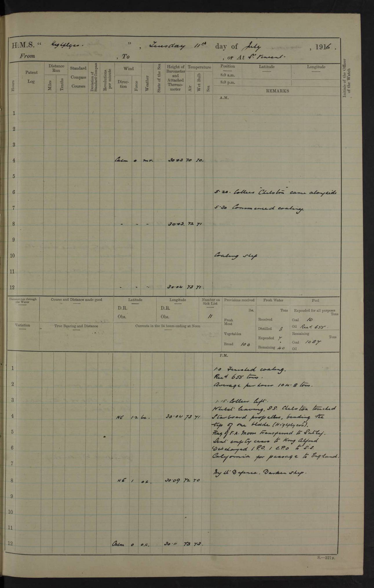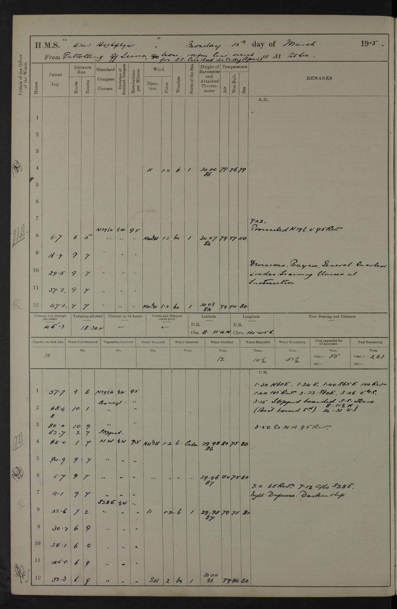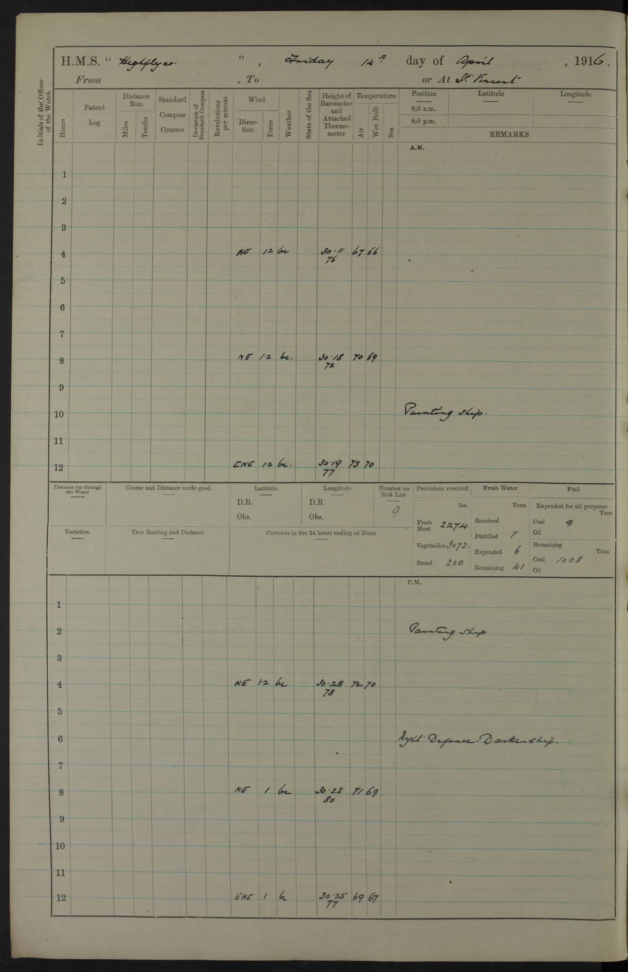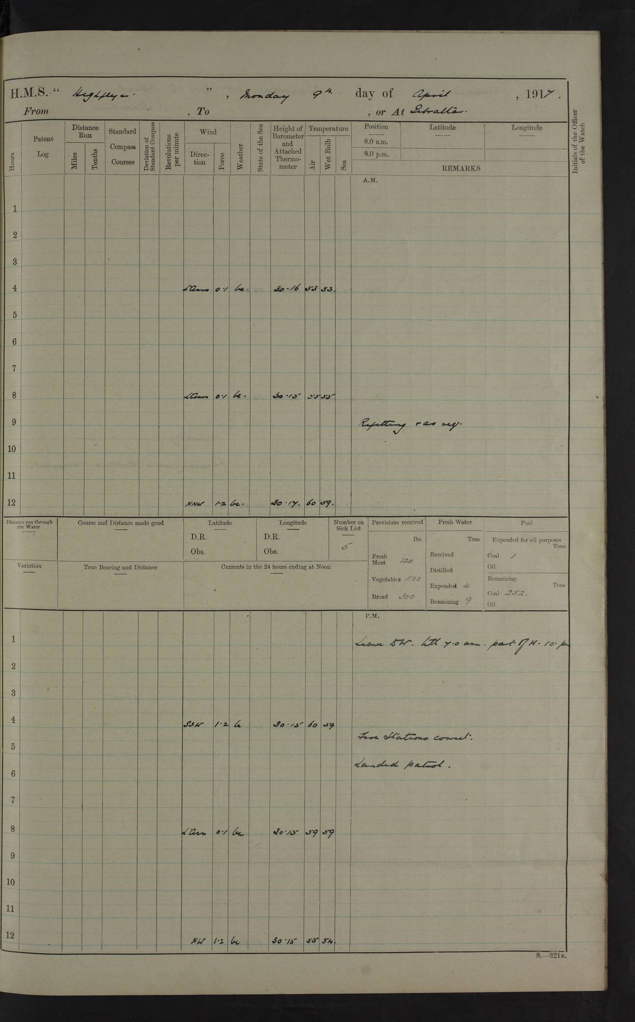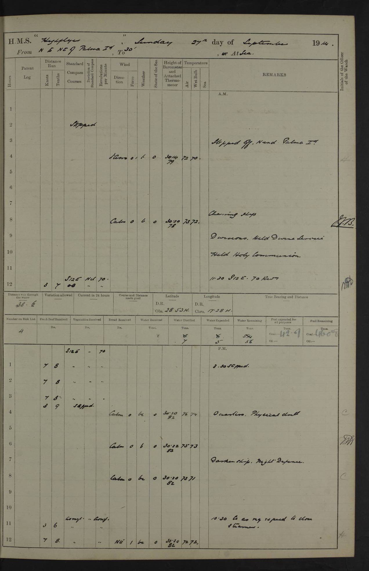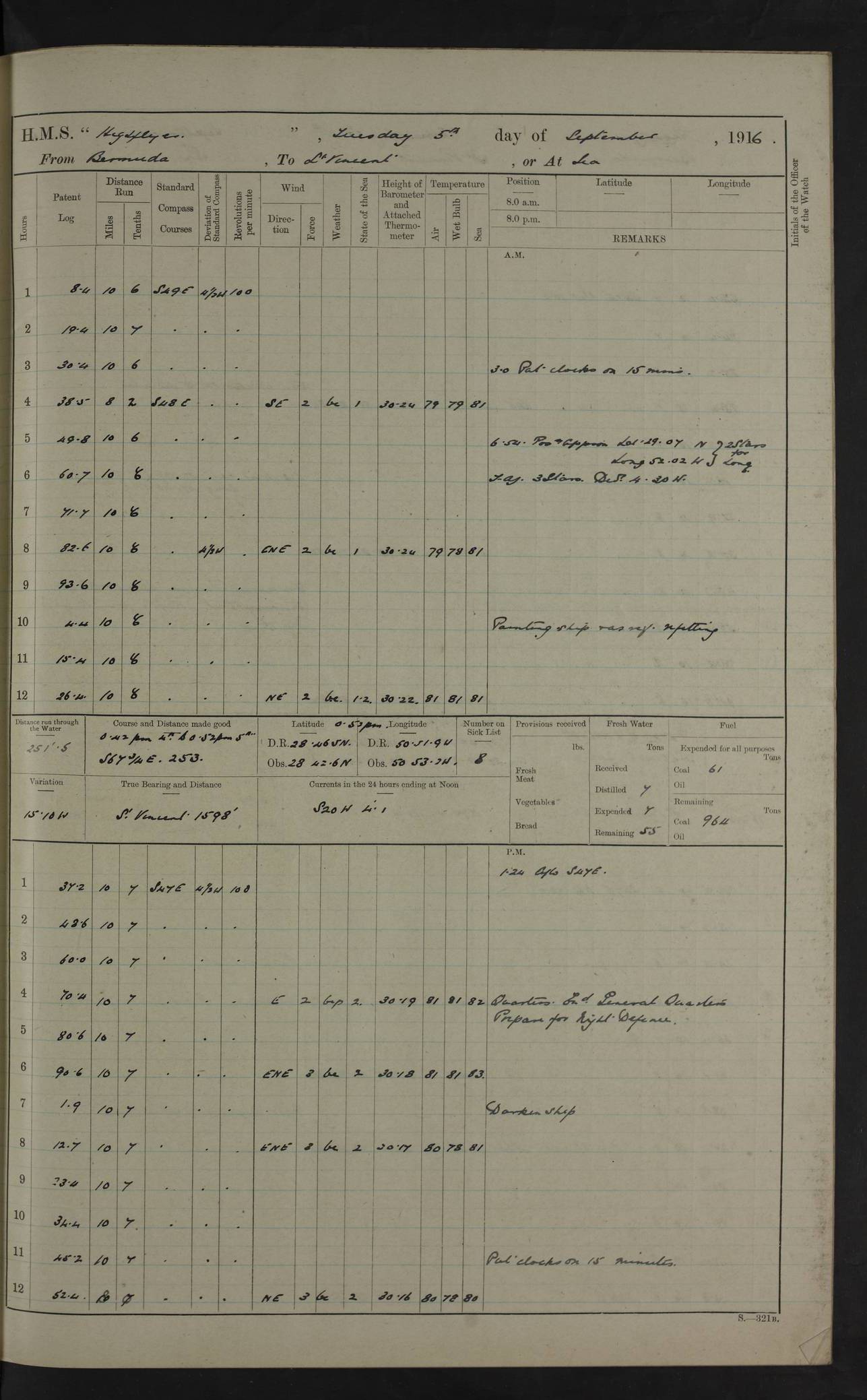 4f961154a2fc8e2def000869: (http://s3.amazonaws.com/oldweather/ADM53-44303/ADM 53-44303-011_0.jpg) 12 February 1916 Patrolling S American trade route to northward Lat 3.9, Long -29.9 7.38am: Stopped, boarded SS REINLAND (Dutch) bound southward Lat 3.13.4N, 30.01W. 4f961155a2fc8e2def00086a: (http://s3.amazonaws.com/oldweather/ADM53-44303/ADM 53-44303-011_1.jpg) 13 February 1916 Patrolling S American trade routes to northward Lat 7.8, Long -28.3 9.00am: Held Divine Service. 4f961155a2fc8e2def00086b: (http://s3.amazonaws.com/oldweather/ADM53-44303/ADM 53-44303-012_0.jpg) 14 February 1916 Patrolling trade routes. to northward Lat 11.4, Long -27.0 9.40am: 90 revs. Course as requisite for aiming rifle practice. 4f961155a2fc8e2def00086c: (http://s3.amazonaws.com/oldweather/ADM53-44303/ADM 53-44303-012_1.jpg) 15 February 1916 Towards Brava Id. Lat 14.2, Long -25.3 9.25am: Stopped, dropped target. Course and speed as requisite to carry out heavy gun practice. 4.00pm: Sighted Brava Id. vis. 1½ miles. Passed W side. 4f961156a2fc8e2def00086d: (http://s3.amazonaws.com/oldweather/ADM53-44303/ADM 53-44303-013_0.jpg) 16 February 1916 St. Vincent Lat 16.8828, Long -25.0106 7.35am: Land ahead visibility 1½’ San Antonio. 8.30am: Course as requisite for entering harbour. 11.00am: Preparing for coaling. 4f961156a2fc8e2def00086e: (http://s3.amazonaws.com/oldweather/ADM53-44303/ADM 53-44303-013_1.jpg) 17 February 1916 St. Vincent Lat 16.8828, Long -25.0106 6.00am: Collier SS PENHALE came alongside. 6.45am: Commenced coaling. 4f961156a2fc8e2def00086f: (http://s3.amazonaws.com/oldweather/ADM53-44303/ADM 53-44303-014_0.jpg) 18 February 1916 St. Vincent Lat 16.8828, Long -25.0106 Cleaning ship. 2.30pm: Drawing new fenders from SS TAMPLIN. 4f961157a2fc8e2def000870: (http://s3.amazonaws.com/oldweather/ADM53-44303/ADM 53-44303-014_1.jpg) 19 February 1916 St. Vincent Lat 16.8828, Long -25.0106 10.30am: Diving party sent to SS TAMPLIN. 4f961157a2fc8e2def000871: (http://s3.amazonaws.com/oldweather/ADM53-44303/ADM 53-44303-015_0.jpg) 20 February 1916 St. Vincent Lat 16.8828, Long -25.0106 7.00am: Sent diving party to TAMPLIN. 4f961157a2fc8e2def000872: (http://s3.amazonaws.com/oldweather/ADM53-44303/ADM 53-44303-015_1.jpg) 21 February 1916 St. Vincent to patrol Lat 16.8828, Long -25.0106 8.30am: Diving party sent to SS TAMPLIN. 6.40pm: Weighed and proceeded as requisite out of harbour. 8.30pm: Bull Point Lt. Ho. N24W, 6000 yds. 4f961158a2fc8e2def000873: (http://s3.amazonaws.com/oldweather/ADM53-44303/ADM 53-44303-016_0.jpg) 22 February 1916 Patrolling northward off San Antonio Id. Lat 18.1, Long -25.3 Painting ship and as requisite. 7.00pm: Western point San Antonio abeam 10’. 4f961158a2fc8e2def000874: (http://s3.amazonaws.com/oldweather/ADM53-44303/ADM 53-44303-016_1.jpg) 23 February 1916 Off San Antonio and St. Vincent to Tarrafal Bay Lat 16.8, Long -25.2 12.00pm: Spoke SS JASON, Brit., bound St. Vincent. 1.12pm: Boarded SS WILLEM VAN DREIL (Dutch) bound St. Vincent. 3.35pm: Stopped, came to with SB, in 33 fathoms. 4f961158a2fc8e2def000875: (http://s3.amazonaws.com/oldweather/ADM53-44303/ADM 53-44303-017_0.jpg) 24 February 1916 Tarrafal Bay, San Antonio Id. to St. Vincent Lat 16.8828, Long -25.0106 9.43 am; Proceeded. Course as requisite to St. Vincent round S end San Antonio 120 revs. 11.17am: Came to with SB in 11 fathoms. 4f961159a2fc8e2def000876: (http://s3.amazonaws.com/oldweather/ADM53-44303/ADM 53-44303-017_1.jpg) 25 February 1916 St. Vincent Lat 16.8828, Long -25.0106 Painting ship. Boys and OS at instruction. Control party at drill. 4f961159a2fc8e2def000877: (http://s3.amazonaws.com/oldweather/ADM53-44303/ADM 53-44303-018_0.jpg) 26 February 1916 St. Vincent Lat 16.8828, Long -25.0106 Cleaning ship. 4f961159a2fc8e2def000878: (http://s3.amazonaws.com/oldweather/ADM53-44303/ADM 53-44303-018_1.jpg) 27 February 1916 St. Vincent Lat 16.8828, Long -25.0106 9.30am: Held Divine Service. 4f96115aa2fc8e2def000879: (http://s3.amazonaws.com/oldweather/ADM53-44303/ADM 53-44303-019_0.jpg) 28 February 1916 St. Vincent Lat 16.8828, Long -25.0106 Boys and OS at instruction. Control party at drill. Remainder preparing for coaling. 2.00pm: Diving party at SS TAMPLIN. 4f96115aa2fc8e2def00087a: (http://s3.amazonaws.com/oldweather/ADM53-44303/ADM 53-44303-019_1.jpg) 29 February 1916 St. Vincent Lat 16.8828, Long -25.0106 7.15am: Commenced coaling from lighter. 8.00am: HMS SWIFTSURE arrived. USS CHESTER arrived. 4f96115aa2fc8e2def00087b: (http://s3.amazonaws.com/oldweather/ADM53-44303/ADM 53-44303-020_0.jpg) 4f96115ba2fc8e2def00087c: (http://s3.amazonaws.com/oldweather/ADM53-44303/ADM 53-44303-020_1.jpg) 4f96115ba2fc8e2def00087d: (http://s3.amazonaws.com/oldweather/ADM53-44303/ADM 53-44303-021_0.jpg) 4f96115ba2fc8e2def00087e: (http://s3.amazonaws.com/oldweather/ADM53-44303/ADM 53-44303-021_1.jpg) LOGS FOR MARCH 1916 4f96115ca2fc8e2def00087f: (http://s3.amazonaws.com/oldweather/ADM53-44304/ADM 53-44304-001_0.jpg) 4f96115ca2fc8e2def000880: (http://s3.amazonaws.com/oldweather/ADM53-44304/ADM 53-44304-001_1.jpg) 4f96115ca2fc8e2def000881: (http://s3.amazonaws.com/oldweather/ADM53-44304/ADM 53-44304-002_0.jpg) 4f96115da2fc8e2def000882: (http://s3.amazonaws.com/oldweather/ADM53-44304/ADM 53-44304-002_1.jpg) 4f96115da2fc8e2def000883: (http://s3.amazonaws.com/oldweather/ADM53-44304/ADM 53-44304-003_0.jpg) 4f96115da2fc8e2def000884: (http://s3.amazonaws.com/oldweather/ADM53-44304/ADM 53-44304-003_1.jpg) 4f96115da2fc8e2def000885: (http://s3.amazonaws.com/oldweather/ADM53-44304/ADM 53-44304-004_0.jpg) 4f96115ea2fc8e2def000886: (http://s3.amazonaws.com/oldweather/ADM53-44304/ADM 53-44304-004_1.jpg) 4f96115ea2fc8e2def000887: (http://s3.amazonaws.com/oldweather/ADM53-44304/ADM 53-44304-005_0.jpg) 4f96115ea2fc8e2def000888: (http://s3.amazonaws.com/oldweather/ADM53-44304/ADM 53-44304-005_1.jpg) 1 March 1916 St. Vincent Lat 16.8828, Long -25.0106 9.30pm: Discharged 1 Officer and 1 Tel. Rating to SS NORTHWAITE. 10.00pm: Surgeon Hobbs joined ship fro