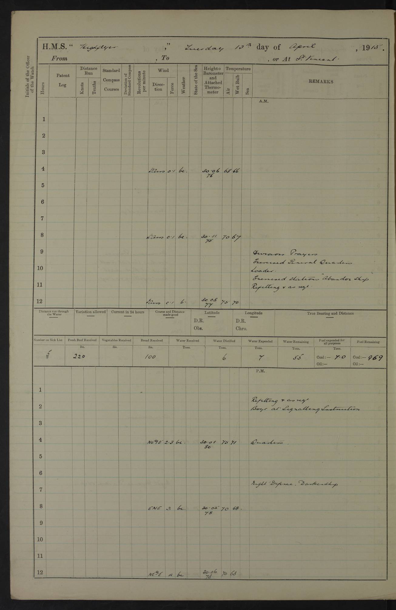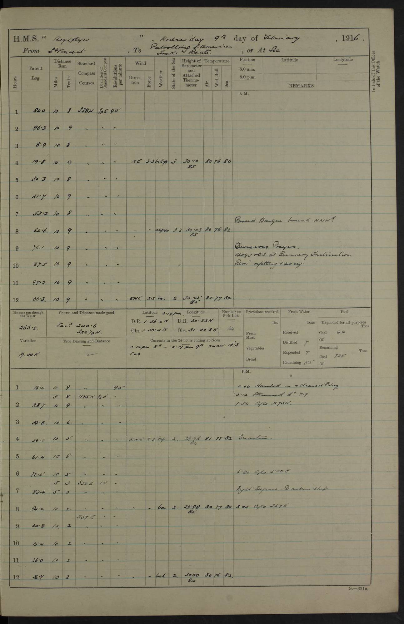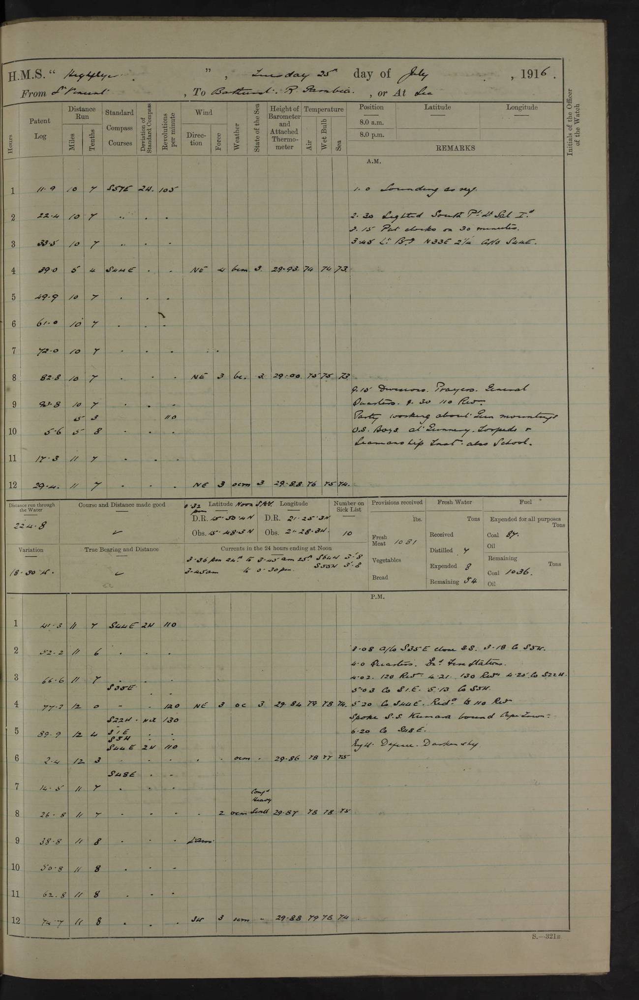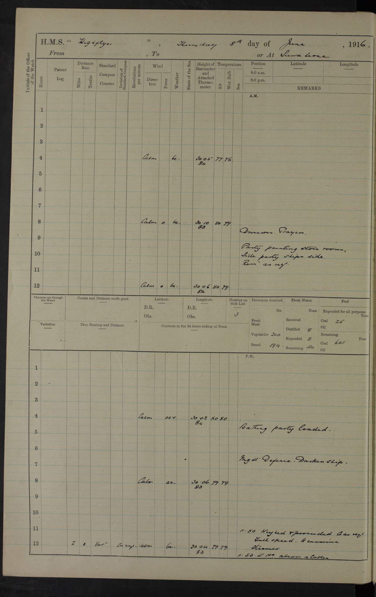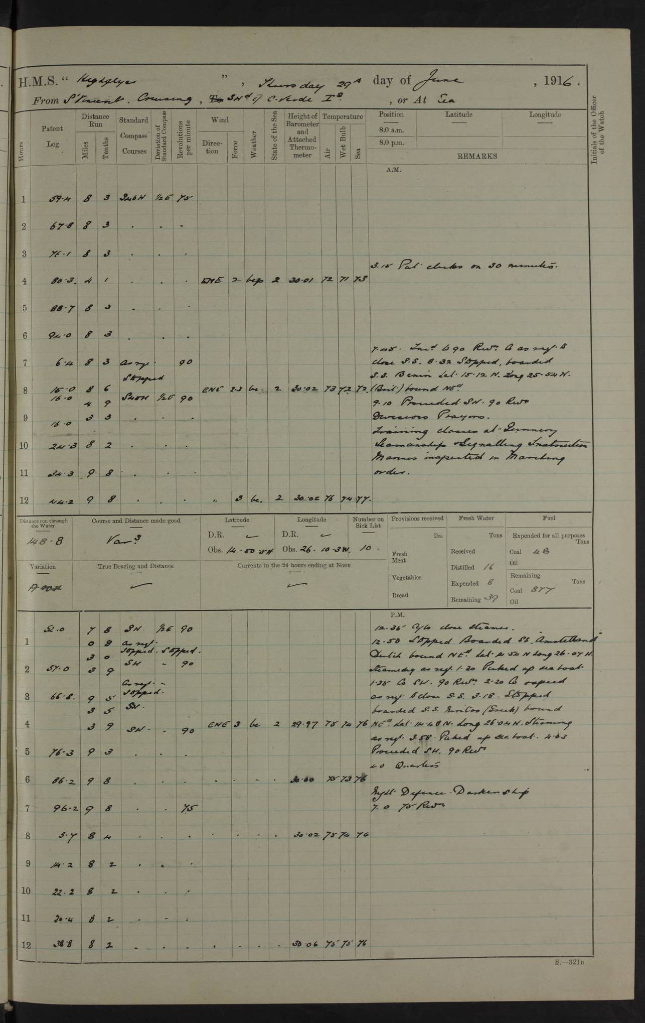 4f961154a2fc8e2def000869: (http://s3.amazonaws.com/oldweather/ADM53-44303/ADM 53-44303-011_0.jpg) 12 February 1916 Patrolling S American trade route to northward Lat 3.9, Long -29.9 7.38am: Stopped, boarded SS REINLAND (Dutch) bound southward Lat 3.13.4N, 30.01W. 4f961155a2fc8e2def00086a: (http://s3.amazonaws.com/oldweather/ADM53-44303/ADM 53-44303-011_1.jpg) 13 February 1916 Patrolling S American trade routes to northward Lat 7.8, Long -28.3 9.00am: Held Divine Service. 4f961155a2fc8e2def00086b: (http://s3.amazonaws.com/oldweather/ADM53-44303/ADM 53-44303-012_0.jpg) 14 February 1916 Patrolling trade routes. to northward Lat 11.4, Long -27.0 9.40am: 90 revs. Course as requisite for aiming rifle practice. 4f961155a2fc8e2def00086c: (http://s3.amazonaws.com/oldweather/ADM53-44303/ADM 53-44303-012_1.jpg) 15 February 1916 Towards Brava Id. Lat 14.2, Long -25.3 9.25am: Stopped, dropped target. Course and speed as requisite to carry out heavy gun practice. 4.00pm: Sighted Brava Id. vis. 1½ miles. Passed W side. 4f961156a2fc8e2def00086d: (http://s3.amazonaws.com/oldweather/ADM53-44303/ADM 53-44303-013_0.jpg) 16 February 1916 St. Vincent Lat 16.8828, Long -25.0106 7.35am: Land ahead visibility 1½’ San Antonio. 8.30am: Course as requisite for entering harbour. 11.00am: Preparing for coaling. 4f961156a2fc8e2def00086e: (http://s3.amazonaws.com/oldweather/ADM53-44303/ADM 53-44303-013_1.jpg) 17 February 1916 St. Vincent Lat 16.8828, Long -25.0106 6.00am: Collier SS PENHALE came alongside. 6.45am: Commenced coaling. 4f961156a2fc8e2def00086f: (http://s3.amazonaws.com/oldweather/ADM53-44303/ADM 53-44303-014_0.jpg) 18 February 1916 St. Vincent Lat 16.8828, Long -25.0106 Cleaning ship. 2.30pm: Drawing new fenders from SS TAMPLIN. 4f961157a2fc8e2def000870: (http://s3.amazonaws.com/oldweather/ADM53-44303/ADM 53-44303-014_1.jpg) 19 February 1916 St. Vincent Lat 16.8828, Long -25.0106 10.30am: Diving party sent to SS TAMPLIN. 4f961157a2fc8e2def000871: (http://s3.amazonaws.com/oldweather/ADM53-44303/ADM 53-44303-015_0.jpg) 20 February 1916 St. Vincent Lat 16.8828, Long -25.0106 7.00am: Sent diving party to TAMPLIN. 4f961157a2fc8e2def000872: (http://s3.amazonaws.com/oldweather/ADM53-44303/ADM 53-44303-015_1.jpg) 21 February 1916 St. Vincent to patrol Lat 16.8828, Long -25.0106 8.30am: Diving party sent to SS TAMPLIN. 6.40pm: Weighed and proceeded as requisite out of harbour. 8.30pm: Bull Point Lt. Ho. N24W, 6000 yds. 4f961158a2fc8e2def000873: (http://s3.amazonaws.com/oldweather/ADM53-44303/ADM 53-44303-016_0.jpg) 22 February 1916 Patrolling northward off San Antonio Id. Lat 18.1, Long -25.3 Painting ship and as requisite. 7.00pm: Western point San Antonio abeam 10’. 4f961158a2fc8e2def000874: (http://s3.amazonaws.com/oldweather/ADM53-44303/ADM 53-44303-016_1.jpg) 23 February 1916 Off San Antonio and St. Vincent to Tarrafal Bay Lat 16.8, Long -25.2 12.00pm: Spoke SS JASON, Brit., bound St. Vincent. 1.12pm: Boarded SS WILLEM VAN DREIL (Dutch) bound St. Vincent. 3.35pm: Stopped, came to with SB, in 33 fathoms. 4f961158a2fc8e2def000875: (http://s3.amazonaws.com/oldweather/ADM53-44303/ADM 53-44303-017_0.jpg) 24 February 1916 Tarrafal Bay, San Antonio Id. to St. Vincent Lat 16.8828, Long -25.0106 9.43 am; Proceeded. Course as requisite to St. Vincent round S end San Antonio 120 revs. 11.17am: Came to with SB in 11 fathoms. 4f961159a2fc8e2def000876: (http://s3.amazonaws.com/oldweather/ADM53-44303/ADM 53-44303-017_1.jpg) 25 February 1916 St. Vincent Lat 16.8828, Long -25.0106 Painting ship. Boys and OS at instruction. Control party at drill. 4f961159a2fc8e2def000877: (http://s3.amazonaws.com/oldweather/ADM53-44303/ADM 53-44303-018_0.jpg) 26 February 1916 St. Vincent Lat 16.8828, Long -25.0106 Cleaning ship. 4f961159a2fc8e2def000878: (http://s3.amazonaws.com/oldweather/ADM53-44303/ADM 53-44303-018_1.jpg) 27 February 1916 St. Vincent Lat 16.8828, Long -25.0106 9.30am: Held Divine Service. 4f96115aa2fc8e2def000879: (http://s3.amazonaws.com/oldweather/ADM53-44303/ADM 53-44303-019_0.jpg) 28 February 1916 St. Vincent Lat 16.8828, Long -25.0106 Boys and OS at instruction. Control party at drill. Remainder preparing for coaling. 2.00pm: Diving party at SS TAMPLIN. 4f96115aa2fc8e2def00087a: (http://s3.amazonaws.com/oldweather/ADM53-44303/ADM 53-44303-019_1.jpg) 29 February 1916 St. Vincent Lat 16.8828, Long -25.0106 7.15am: Commenced coaling from lighter. 8.00am: HMS SWIFTSURE arrived. USS CHESTER arrived. 4f96115aa2fc8e2def00087b: (http://s3.amazonaws.com/oldweather/ADM53-44303/ADM 53-44303-020_0.jpg) 4f96115ba2fc8e2def00087c: (http://s3.amazonaws.com/oldweather/ADM53-44303/ADM 53-44303-020_1.jpg) 4f96115ba2fc8e2def00087d: (http://s3.amazonaws.com/oldweather/ADM53-44303/ADM 53-44303-021_0.jpg) 4f96115ba2fc8e2def00087e: (http://s3.amazonaws.com/oldweather/ADM53-44303/ADM 53-44303-021_1.jpg) LOGS FOR MARCH 1916 4f96115ca2fc8e2def00087f: (http://s3.amazonaws.com/oldweather/ADM53-44304/ADM 53-44304-001_0.jpg) 4f96115ca2fc8e2def000880: (http://s3.amazonaws.com/oldweather/ADM53-44304/ADM 53-44304-001_1.jpg) 4f96115ca2fc8e2def000881: (http://s3.amazonaws.com/oldweather/ADM53-44304/ADM 53-44304-002_0.jpg) 4f96115da2fc8e2def000882: (http://s3.amazonaws.com/oldweather/ADM53-44304/ADM 53-44304-002_1.jpg) 4f96115da2fc8e2def000883: (http://s3.amazonaws.com/oldweather/ADM53-44304/ADM 53-44304-003_0.jpg) 4f96115da2fc8e2def000884: (http://s3.amazonaws.com/oldweather/ADM53-44304/ADM 53-44304-003_1.jpg) 4f96115da2fc8e2def000885: (http://s3.amazonaws.com/oldweather/ADM53-44304/ADM 53-44304-004_0.jpg) 4f96115ea2fc8e2def000886: (http://s3.amazonaws.com/oldweather/ADM53-44304/ADM 53-44304-004_1.jpg) 4f96115ea2fc8e2def000887: (http://s3.amazonaws.com/oldweather/ADM53-44304/ADM 53-44304-005_0.jpg) 4f96115ea2fc8e2def000888: (http://s3.amazonaws.com/oldweather/ADM53-44304/ADM 53-44304-005_1.jpg) 1 March 1916 St. Vincent Lat 16.8828, Long -25.0106 9.30pm: Discharged 1 Officer and 1 Tel. Rating to SS NORTHWAITE. 10.00pm: Surgeon Hobbs joined ship fro