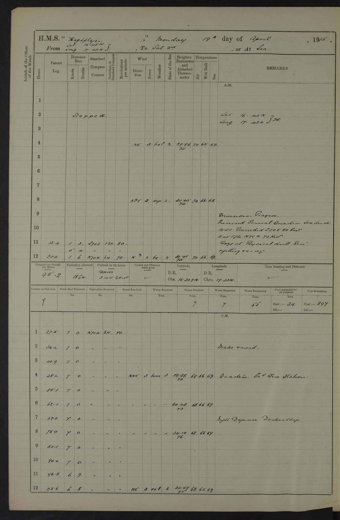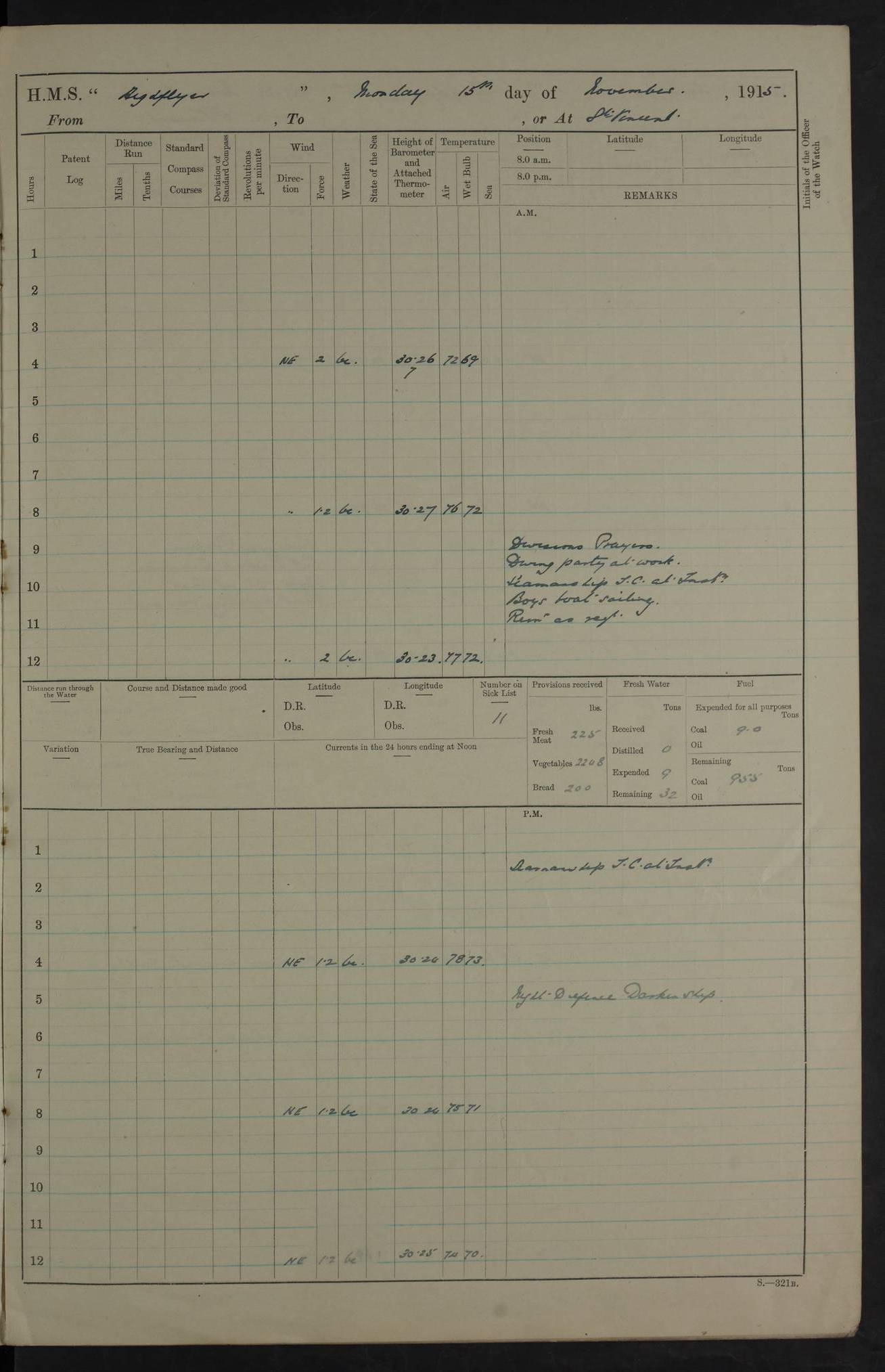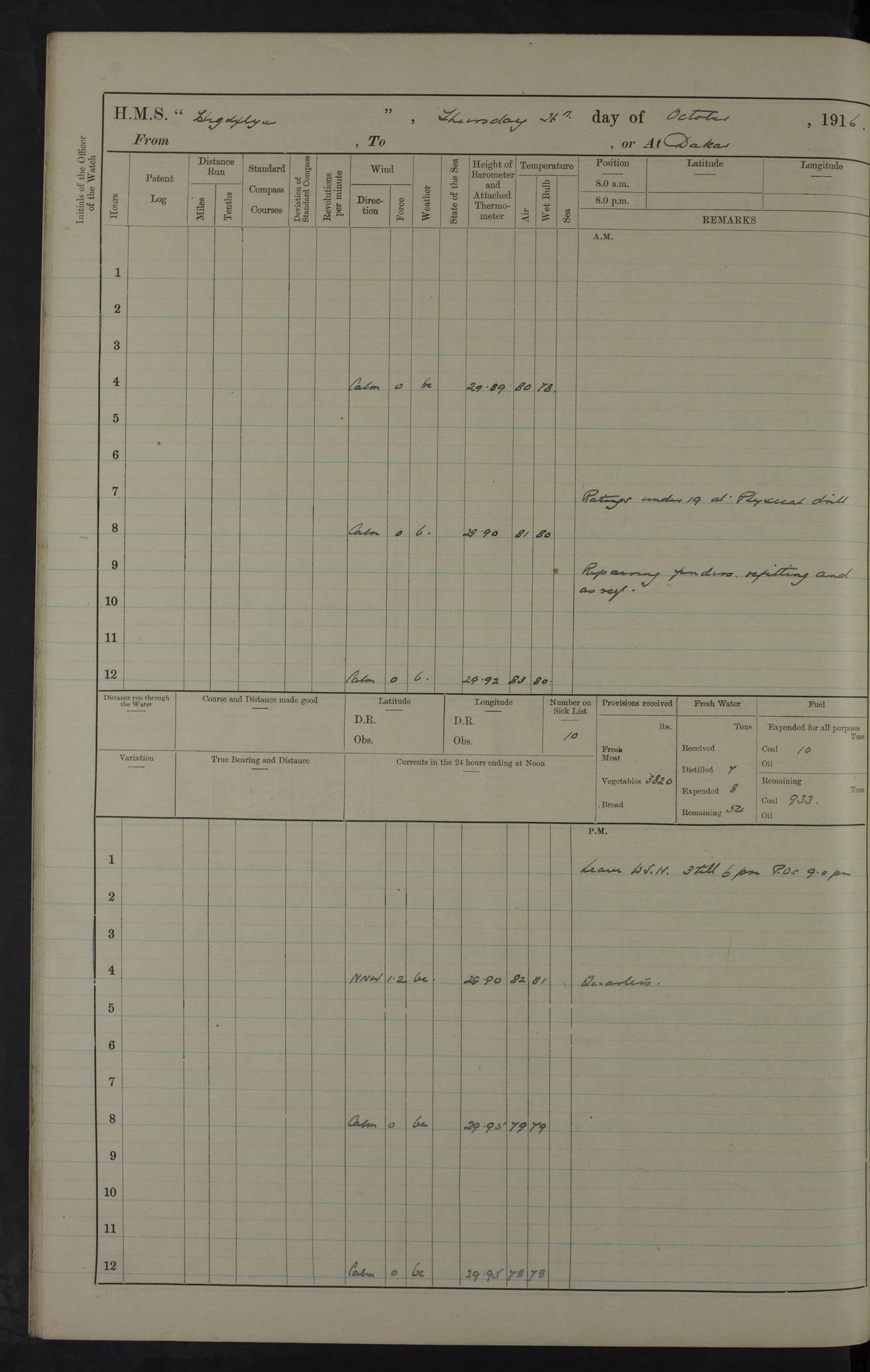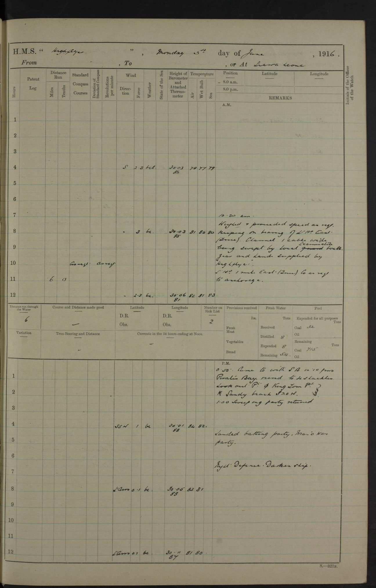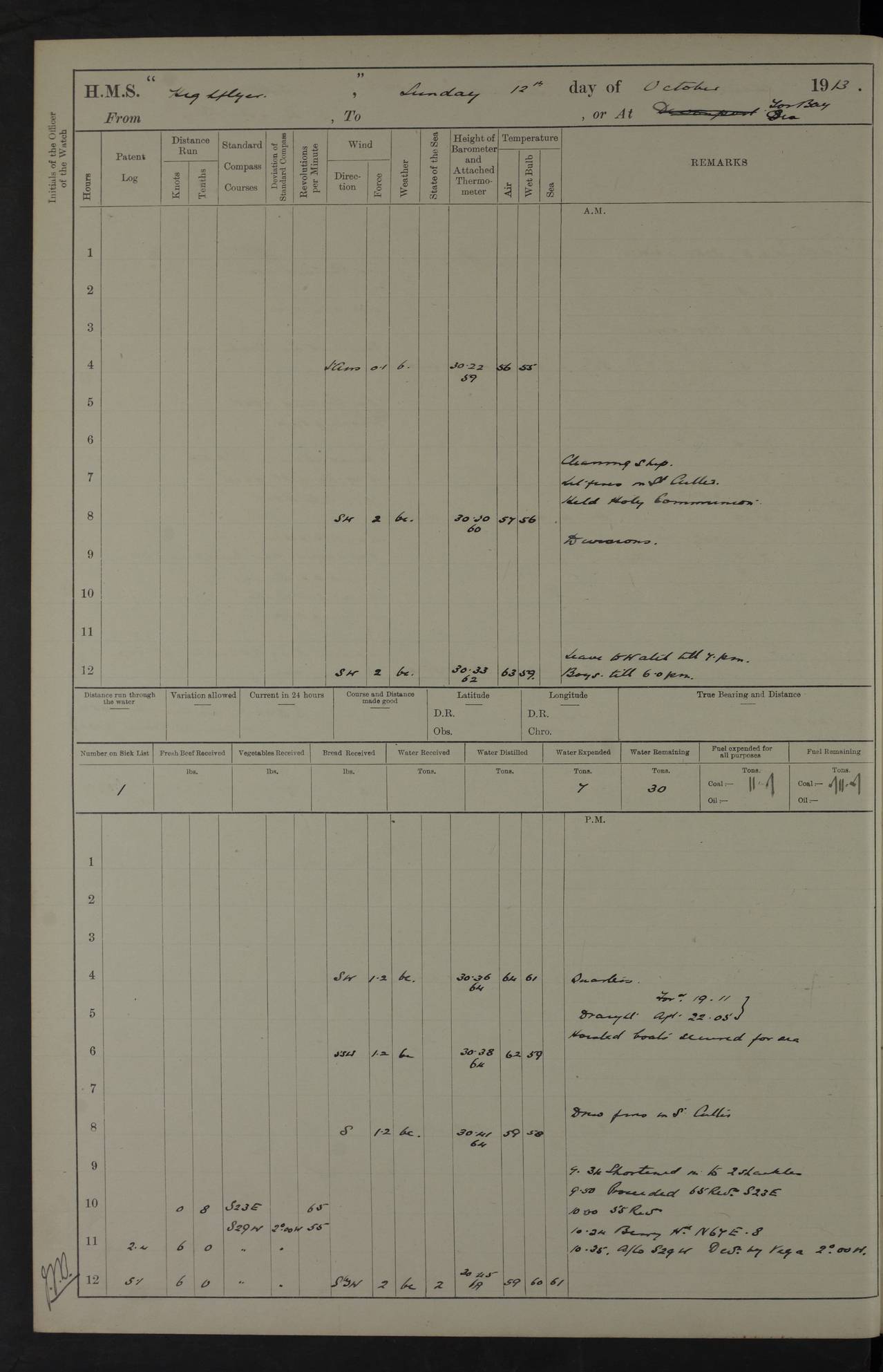 4f961154a2fc8e2def000869: (http://s3.amazonaws.com/oldweather/ADM53-44303/ADM 53-44303-011_0.jpg) 12 February 1916 Patrolling S American trade route to northward Lat 3.9, Long -29.9 7.38am: Stopped, boarded SS REINLAND (Dutch) bound southward Lat 3.13.4N, 30.01W. 4f961155a2fc8e2def00086a: (http://s3.amazonaws.com/oldweather/ADM53-44303/ADM 53-44303-011_1.jpg) 13 February 1916 Patrolling S American trade routes to northward Lat 7.8, Long -28.3 9.00am: Held Divine Service. 4f961155a2fc8e2def00086b: (http://s3.amazonaws.com/oldweather/ADM53-44303/ADM 53-44303-012_0.jpg) 14 February 1916 Patrolling trade routes. to northward Lat 11.4, Long -27.0 9.40am: 90 revs. Course as requisite for aiming rifle practice. 4f961155a2fc8e2def00086c: (http://s3.amazonaws.com/oldweather/ADM53-44303/ADM 53-44303-012_1.jpg) 15 February 1916 Towards Brava Id. Lat 14.2, Long -25.3 9.25am: Stopped, dropped target. Course and speed as requisite to carry out heavy gun practice. 4.00pm: Sighted Brava Id. vis. 1½ miles. Passed W side. 4f961156a2fc8e2def00086d: (http://s3.amazonaws.com/oldweather/ADM53-44303/ADM 53-44303-013_0.jpg) 16 February 1916 St. Vincent Lat 16.8828, Long -25.0106 7.35am: Land ahead visibility 1½’ San Antonio. 8.30am: Course as requisite for entering harbour. 11.00am: Preparing for coaling. 4f961156a2fc8e2def00086e: (http://s3.amazonaws.com/oldweather/ADM53-44303/ADM 53-44303-013_1.jpg) 17 February 1916 St. Vincent Lat 16.8828, Long -25.0106 6.00am: Collier SS PENHALE came alongside. 6.45am: Commenced coaling. 4f961156a2fc8e2def00086f: (http://s3.amazonaws.com/oldweather/ADM53-44303/ADM 53-44303-014_0.jpg) 18 February 1916 St. Vincent Lat 16.8828, Long -25.0106 Cleaning ship. 2.30pm: Drawing new fenders from SS TAMPLIN. 4f961157a2fc8e2def000870: (http://s3.amazonaws.com/oldweather/ADM53-44303/ADM 53-44303-014_1.jpg) 19 February 1916 St. Vincent Lat 16.8828, Long -25.0106 10.30am: Diving party sent to SS TAMPLIN. 4f961157a2fc8e2def000871: (http://s3.amazonaws.com/oldweather/ADM53-44303/ADM 53-44303-015_0.jpg) 20 February 1916 St. Vincent Lat 16.8828, Long -25.0106 7.00am: Sent diving party to TAMPLIN. 4f961157a2fc8e2def000872: (http://s3.amazonaws.com/oldweather/ADM53-44303/ADM 53-44303-015_1.jpg) 21 February 1916 St. Vincent to patrol Lat 16.8828, Long -25.0106 8.30am: Diving party sent to SS TAMPLIN. 6.40pm: Weighed and proceeded as requisite out of harbour. 8.30pm: Bull Point Lt. Ho. N24W, 6000 yds. 4f961158a2fc8e2def000873: (http://s3.amazonaws.com/oldweather/ADM53-44303/ADM 53-44303-016_0.jpg) 22 February 1916 Patrolling northward off San Antonio Id. Lat 18.1, Long -25.3 Painting ship and as requisite. 7.00pm: Western point San Antonio abeam 10’. 4f961158a2fc8e2def000874: (http://s3.amazonaws.com/oldweather/ADM53-44303/ADM 53-44303-016_1.jpg) 23 February 1916 Off San Antonio and St. Vincent to Tarrafal Bay Lat 16.8, Long -25.2 12.00pm: Spoke SS JASON, Brit., bound St. Vincent. 1.12pm: Boarded SS WILLEM VAN DREIL (Dutch) bound St. Vincent. 3.35pm: Stopped, came to with SB, in 33 fathoms. 4f961158a2fc8e2def000875: (http://s3.amazonaws.com/oldweather/ADM53-44303/ADM 53-44303-017_0.jpg) 24 February 1916 Tarrafal Bay, San Antonio Id. to St. Vincent Lat 16.8828, Long -25.0106 9.43 am; Proceeded. Course as requisite to St. Vincent round S end San Antonio 120 revs. 11.17am: Came to with SB in 11 fathoms. 4f961159a2fc8e2def000876: (http://s3.amazonaws.com/oldweather/ADM53-44303/ADM 53-44303-017_1.jpg) 25 February 1916 St. Vincent Lat 16.8828, Long -25.0106 Painting ship. Boys and OS at instruction. Control party at drill. 4f961159a2fc8e2def000877: (http://s3.amazonaws.com/oldweather/ADM53-44303/ADM 53-44303-018_0.jpg) 26 February 1916 St. Vincent Lat 16.8828, Long -25.0106 Cleaning ship. 4f961159a2fc8e2def000878: (http://s3.amazonaws.com/oldweather/ADM53-44303/ADM 53-44303-018_1.jpg) 27 February 1916 St. Vincent Lat 16.8828, Long -25.0106 9.30am: Held Divine Service. 4f96115aa2fc8e2def000879: (http://s3.amazonaws.com/oldweather/ADM53-44303/ADM 53-44303-019_0.jpg) 28 February 1916 St. Vincent Lat 16.8828, Long -25.0106 Boys and OS at instruction. Control party at drill. Remainder preparing for coaling. 2.00pm: Diving party at SS TAMPLIN. 4f96115aa2fc8e2def00087a: (http://s3.amazonaws.com/oldweather/ADM53-44303/ADM 53-44303-019_1.jpg) 29 February 1916 St. Vincent Lat 16.8828, Long -25.0106 7.15am: Commenced coaling from lighter. 8.00am: HMS SWIFTSURE arrived. USS CHESTER arrived. 4f96115aa2fc8e2def00087b: (http://s3.amazonaws.com/oldweather/ADM53-44303/ADM 53-44303-020_0.jpg) 4f96115ba2fc8e2def00087c: (http://s3.amazonaws.com/oldweather/ADM53-44303/ADM 53-44303-020_1.jpg) 4f96115ba2fc8e2def00087d: (http://s3.amazonaws.com/oldweather/ADM53-44303/ADM 53-44303-021_0.jpg) 4f96115ba2fc8e2def00087e: (http://s3.amazonaws.com/oldweather/ADM53-44303/ADM 53-44303-021_1.jpg) LOGS FOR MARCH 1916 4f96115ca2fc8e2def00087f: (http://s3.amazonaws.com/oldweather/ADM53-44304/ADM 53-44304-001_0.jpg) 4f96115ca2fc8e2def000880: (http://s3.amazonaws.com/oldweather/ADM53-44304/ADM 53-44304-001_1.jpg) 4f96115ca2fc8e2def000881: (http://s3.amazonaws.com/oldweather/ADM53-44304/ADM 53-44304-002_0.jpg) 4f96115da2fc8e2def000882: (http://s3.amazonaws.com/oldweather/ADM53-44304/ADM 53-44304-002_1.jpg) 4f96115da2fc8e2def000883: (http://s3.amazonaws.com/oldweather/ADM53-44304/ADM 53-44304-003_0.jpg) 4f96115da2fc8e2def000884: (http://s3.amazonaws.com/oldweather/ADM53-44304/ADM 53-44304-003_1.jpg) 4f96115da2fc8e2def000885: (http://s3.amazonaws.com/oldweather/ADM53-44304/ADM 53-44304-004_0.jpg) 4f96115ea2fc8e2def000886: (http://s3.amazonaws.com/oldweather/ADM53-44304/ADM 53-44304-004_1.jpg) 4f96115ea2fc8e2def000887: (http://s3.amazonaws.com/oldweather/ADM53-44304/ADM 53-44304-005_0.jpg) 4f96115ea2fc8e2def000888: (http://s3.amazonaws.com/oldweather/ADM53-44304/ADM 53-44304-005_1.jpg) 1 March 1916 St. Vincent Lat 16.8828, Long -25.0106 9.30pm: Discharged 1 Officer and 1 Tel. Rating to SS NORTHWAITE. 10.00pm: Surgeon Hobbs joined ship fro