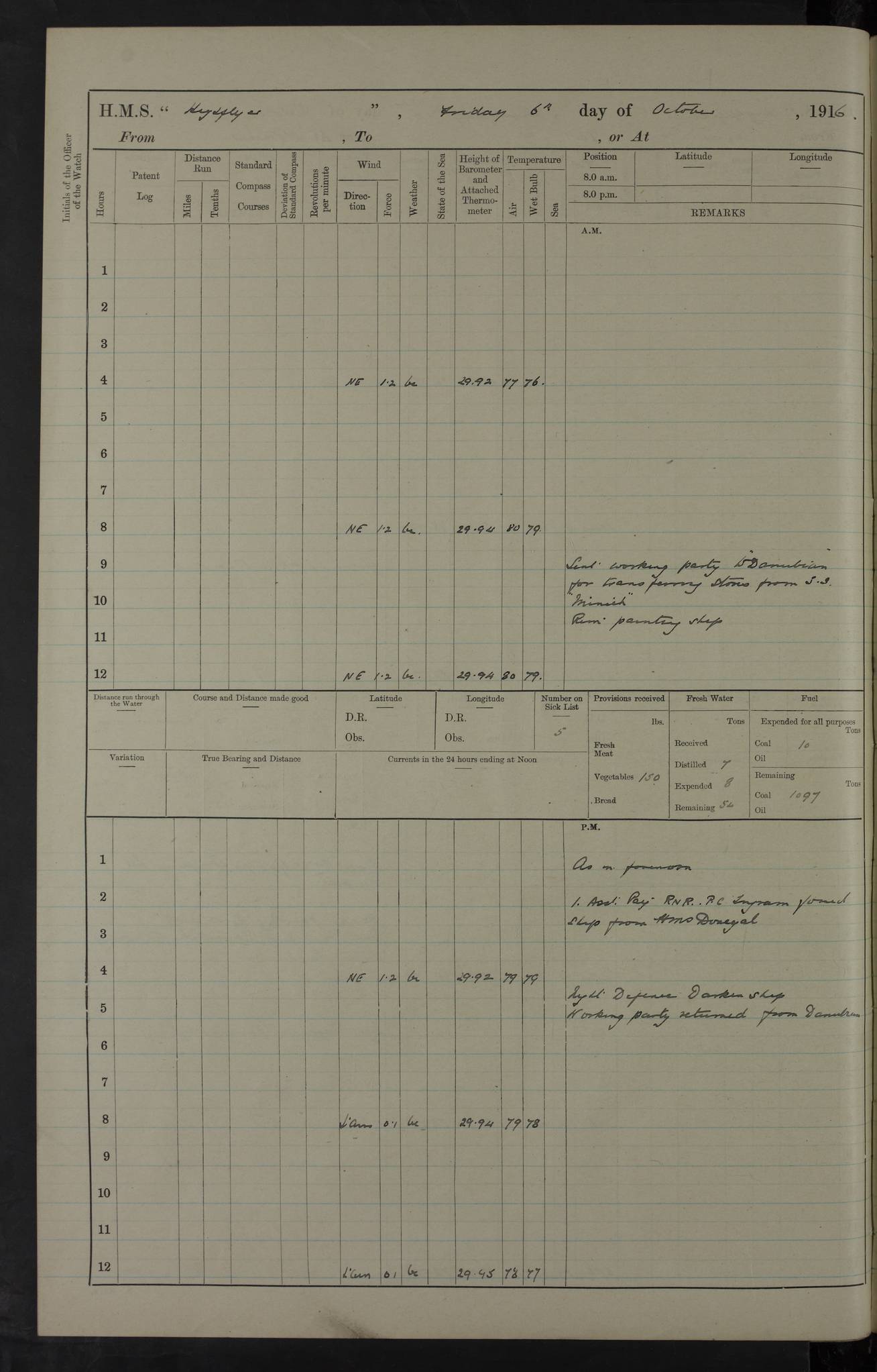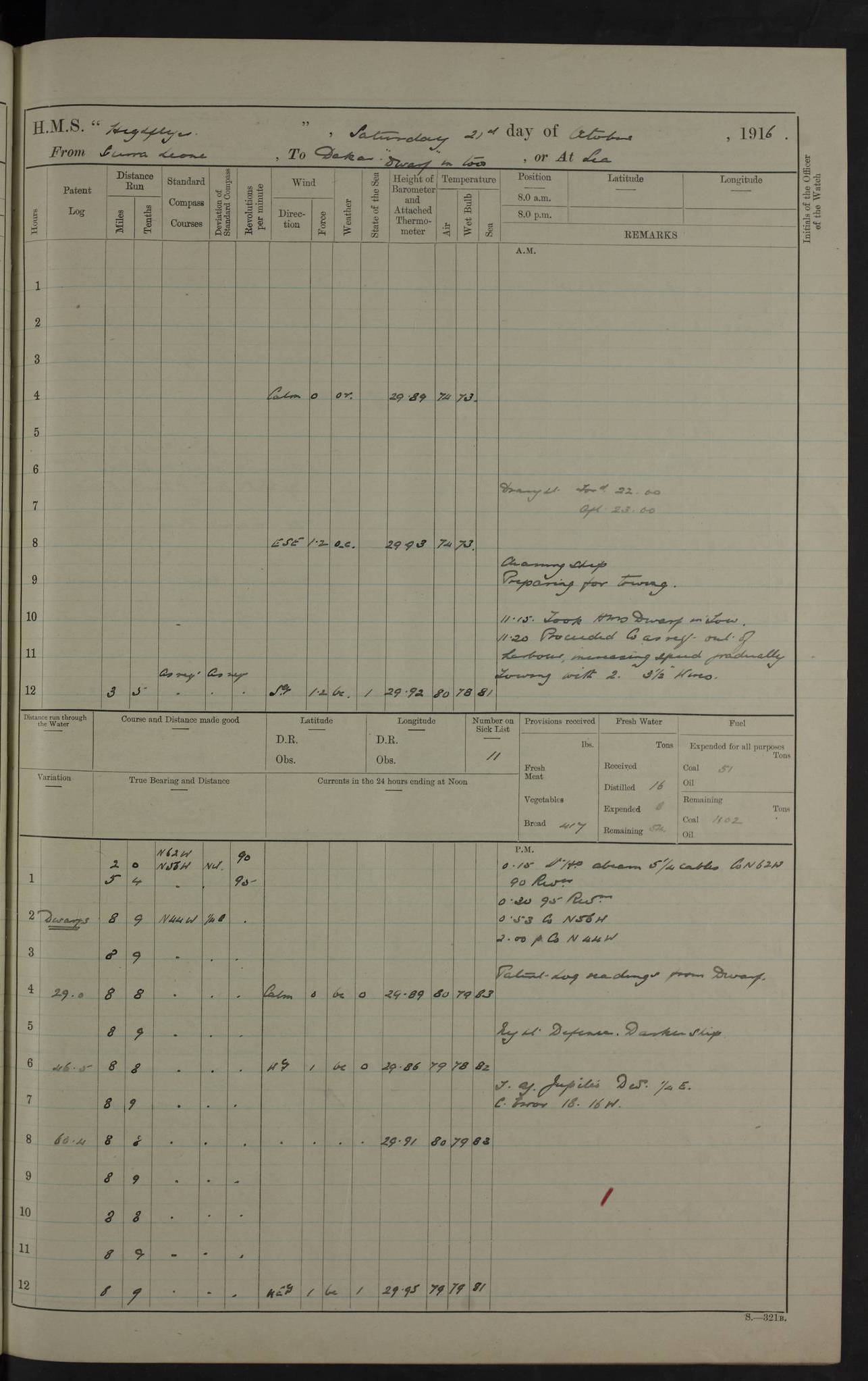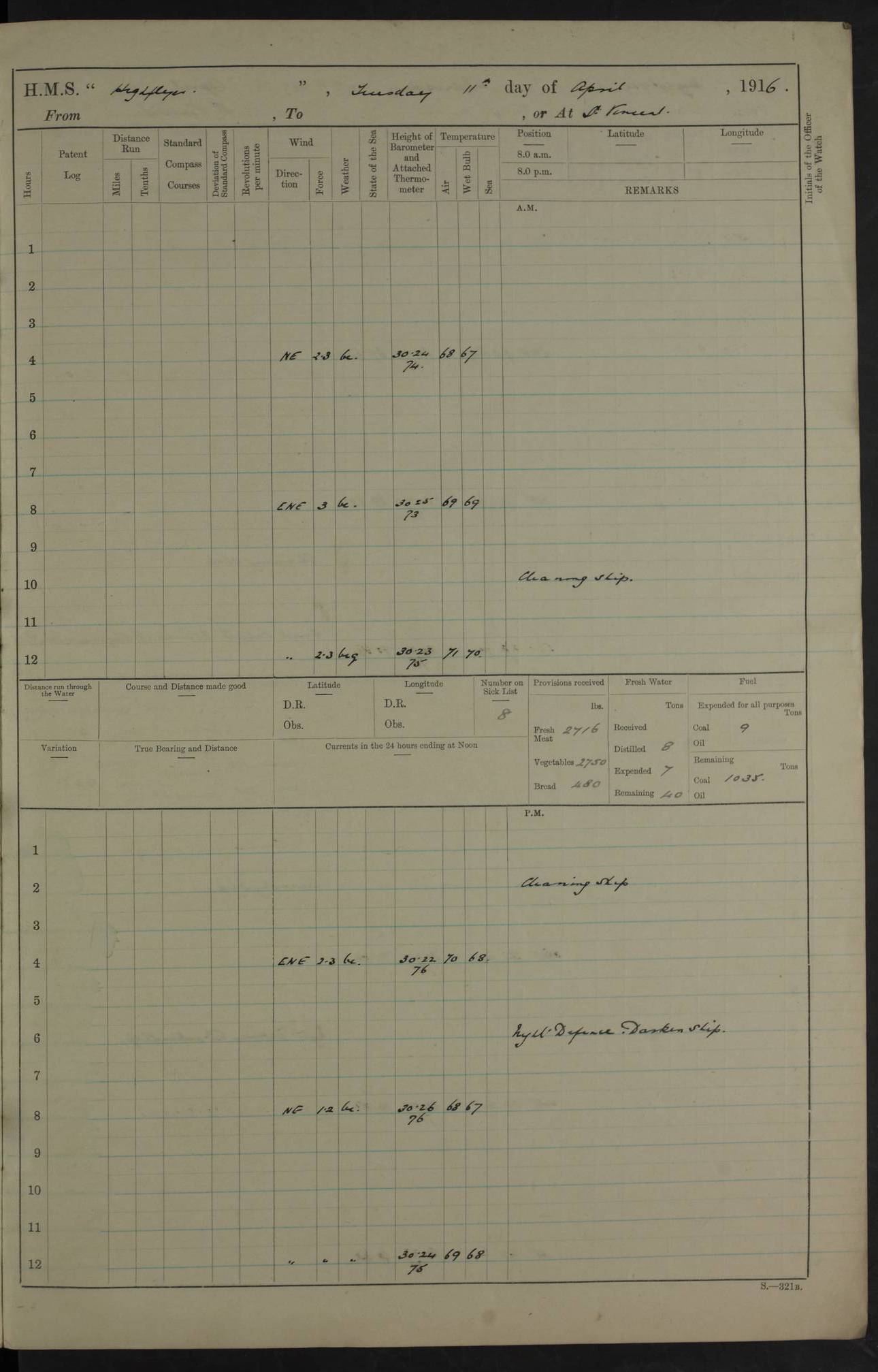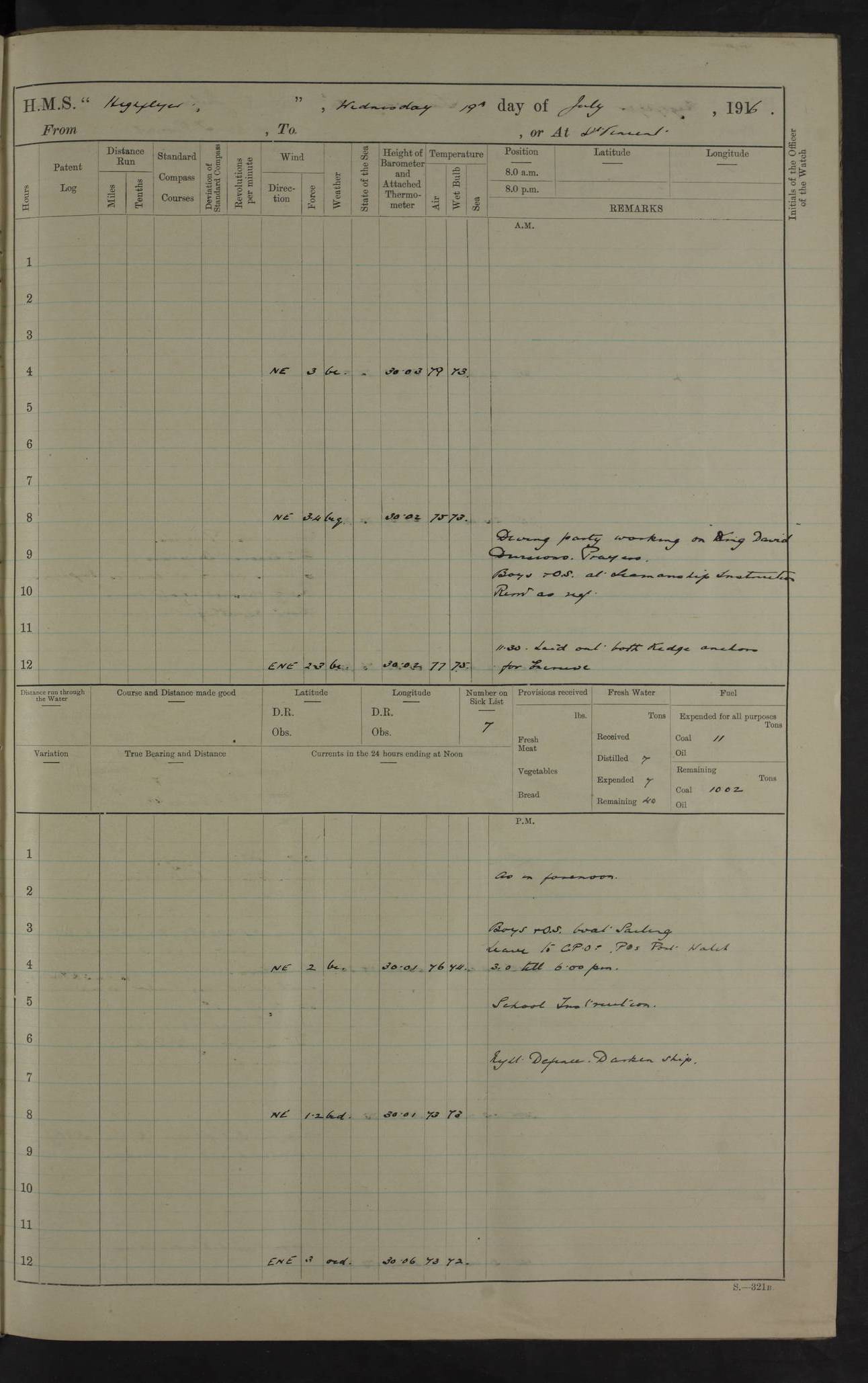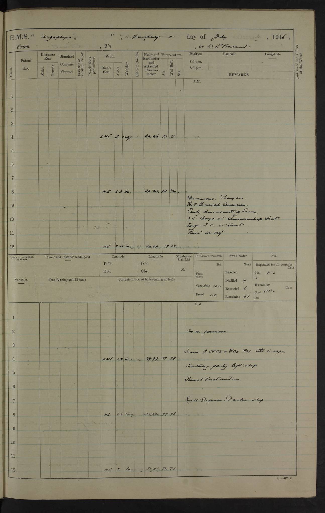4f961154a2fc8e2def000869: (http://s3.amazonaws.com/oldweather/ADM53-44303/ADM 53-44303-011_0.jpg) 12 February 1916 Patrolling S American trade route to northward Lat 3.9, Long -29.9 7.38am: Stopped, boarded SS REINLAND (Dutch) bound southward Lat 3.13.4N, 30.01W. 4f961155a2fc8e2def00086a: (http://s3.amazonaws.com/oldweather/ADM53-44303/ADM 53-44303-011_1.jpg) 13 February 1916 Patrolling S American trade routes to northward Lat 7.8, Long -28.3 9.00am: Held Divine Service. 4f961155a2fc8e2def00086b: (http://s3.amazonaws.com/oldweather/ADM53-44303/ADM 53-44303-012_0.jpg) 14 February 1916 Patrolling trade routes. to northward Lat 11.4, Long -27.0 9.40am: 90 revs. Course as requisite for aiming rifle practice. 4f961155a2fc8e2def00086c: (http://s3.amazonaws.com/oldweather/ADM53-44303/ADM 53-44303-012_1.jpg) 15 February 1916 Towards Brava Id. Lat 14.2, Long -25.3 9.25am: Stopped, dropped target. Course and speed as requisite to carry out heavy gun practice. 4.00pm: Sighted Brava Id. vis. 1½ miles. Passed W side. 4f961156a2fc8e2def00086d: (http://s3.amazonaws.com/oldweather/ADM53-44303/ADM 53-44303-013_0.jpg) 16 February 1916 St. Vincent Lat 16.8828, Long -25.0106 7.35am: Land ahead visibility 1½’ San Antonio. 8.30am: Course as requisite for entering harbour. 11.00am: Preparing for coaling. 4f961156a2fc8e2def00086e: (http://s3.amazonaws.com/oldweather/ADM53-44303/ADM 53-44303-013_1.jpg) 17 February 1916 St. Vincent Lat 16.8828, Long -25.0106 6.00am: Collier SS PENHALE came alongside. 6.45am: Commenced coaling. 4f961156a2fc8e2def00086f: (http://s3.amazonaws.com/oldweather/ADM53-44303/ADM 53-44303-014_0.jpg) 18 February 1916 St. Vincent Lat 16.8828, Long -25.0106 Cleaning ship. 2.30pm: Drawing new fenders from SS TAMPLIN. 4f961157a2fc8e2def000870: (http://s3.amazonaws.com/oldweather/ADM53-44303/ADM 53-44303-014_1.jpg) 19 February 1916 St. Vincent Lat 16.8828, Long -25.0106 10.30am: Diving party sent to SS TAMPLIN. 4f961157a2fc8e2def000871: (http://s3.amazonaws.com/oldweather/ADM53-44303/ADM 53-44303-015_0.jpg) 20 February 1916 St. Vincent Lat 16.8828, Long -25.0106 7.00am: Sent diving party to TAMPLIN. 4f961157a2fc8e2def000872: (http://s3.amazonaws.com/oldweather/ADM53-44303/ADM 53-44303-015_1.jpg) 21 February 1916 St. Vincent to patrol Lat 16.8828, Long -25.0106 8.30am: Diving party sent to SS TAMPLIN. 6.40pm: Weighed and proceeded as requisite out of harbour. 8.30pm: Bull Point Lt. Ho. N24W, 6000 yds. 4f961158a2fc8e2def000873: (http://s3.amazonaws.com/oldweather/ADM53-44303/ADM 53-44303-016_0.jpg) 22 February 1916 Patrolling northward off San Antonio Id. Lat 18.1, Long -25.3 Painting ship and as requisite. 7.00pm: Western point San Antonio abeam 10’. 4f961158a2fc8e2def000874: (http://s3.amazonaws.com/oldweather/ADM53-44303/ADM 53-44303-016_1.jpg) 23 February 1916 Off San Antonio and St. Vincent to Tarrafal Bay Lat 16.8, Long -25.2 12.00pm: Spoke SS JASON, Brit., bound St. Vincent. 1.12pm: Boarded SS WILLEM VAN DREIL (Dutch) bound St. Vincent. 3.35pm: Stopped, came to with SB, in 33 fathoms. 4f961158a2fc8e2def000875: (http://s3.amazonaws.com/oldweather/ADM53-44303/ADM 53-44303-017_0.jpg) 24 February 1916 Tarrafal Bay, San Antonio Id. to St. Vincent Lat 16.8828, Long -25.0106 9.43 am; Proceeded. Course as requisite to St. Vincent round S end San Antonio 120 revs. 11.17am: Came to with SB in 11 fathoms. 4f961159a2fc8e2def000876: (http://s3.amazonaws.com/oldweather/ADM53-44303/ADM 53-44303-017_1.jpg) 25 February 1916 St. Vincent Lat 16.8828, Long -25.0106 Painting ship. Boys and OS at instruction. Control party at drill. 4f961159a2fc8e2def000877: (http://s3.amazonaws.com/oldweather/ADM53-44303/ADM 53-44303-018_0.jpg) 26 February 1916 St. Vincent Lat 16.8828, Long -25.0106 Cleaning ship. 4f961159a2fc8e2def000878: (http://s3.amazonaws.com/oldweather/ADM53-44303/ADM 53-44303-018_1.jpg) 27 February 1916 St. Vincent Lat 16.8828, Long -25.0106 9.30am: Held Divine Service. 4f96115aa2fc8e2def000879: (http://s3.amazonaws.com/oldweather/ADM53-44303/ADM 53-44303-019_0.jpg) 28 February 1916 St. Vincent Lat 16.8828, Long -25.0106 Boys and OS at instruction. Control party at drill. Remainder preparing for coaling. 2.00pm: Diving party at SS TAMPLIN. 4f96115aa2fc8e2def00087a: (http://s3.amazonaws.com/oldweather/ADM53-44303/ADM 53-44303-019_1.jpg) 29 February 1916 St. Vincent Lat 16.8828, Long -25.0106 7.15am: Commenced coaling from lighter. 8.00am: HMS SWIFTSURE arrived. USS CHESTER arrived. 4f96115aa2fc8e2def00087b: (http://s3.amazonaws.com/oldweather/ADM53-44303/ADM 53-44303-020_0.jpg) 4f96115ba2fc8e2def00087c: (http://s3.amazonaws.com/oldweather/ADM53-44303/ADM 53-44303-020_1.jpg) 4f96115ba2fc8e2def00087d: (http://s3.amazonaws.com/oldweather/ADM53-44303/ADM 53-44303-021_0.jpg) 4f96115ba2fc8e2def00087e: (http://s3.amazonaws.com/oldweather/ADM53-44303/ADM 53-44303-021_1.jpg) LOGS FOR MARCH 1916 4f96115ca2fc8e2def00087f: (http://s3.amazonaws.com/oldweather/ADM53-44304/ADM 53-44304-001_0.jpg) 4f96115ca2fc8e2def000880: (http://s3.amazonaws.com/oldweather/ADM53-44304/ADM 53-44304-001_1.jpg) 4f96115ca2fc8e2def000881: (http://s3.amazonaws.com/oldweather/ADM53-44304/ADM 53-44304-002_0.jpg) 4f96115da2fc8e2def000882: (http://s3.amazonaws.com/oldweather/ADM53-44304/ADM 53-44304-002_1.jpg) 4f96115da2fc8e2def000883: (http://s3.amazonaws.com/oldweather/ADM53-44304/ADM 53-44304-003_0.jpg) 4f96115da2fc8e2def000884: (http://s3.amazonaws.com/oldweather/ADM53-44304/ADM 53-44304-003_1.jpg) 4f96115da2fc8e2def000885: (http://s3.amazonaws.com/oldweather/ADM53-44304/ADM 53-44304-004_0.jpg) 4f96115ea2fc8e2def000886: (http://s3.amazonaws.com/oldweather/ADM53-44304/ADM 53-44304-004_1.jpg) 4f96115ea2fc8e2def000887: (http://s3.amazonaws.com/oldweather/ADM53-44304/ADM 53-44304-005_0.jpg) 4f96115ea2fc8e2def000888: (http://s3.amazonaws.com/oldweather/ADM53-44304/ADM 53-44304-005_1.jpg) 1 March 1916 St. Vincent Lat 16.8828, Long -25.0106 9.30pm: Discharged 1 Officer and 1 Tel. Rating to SS NORTHWAITE. 10.00pm: Surgeon Hobbs joined ship fro