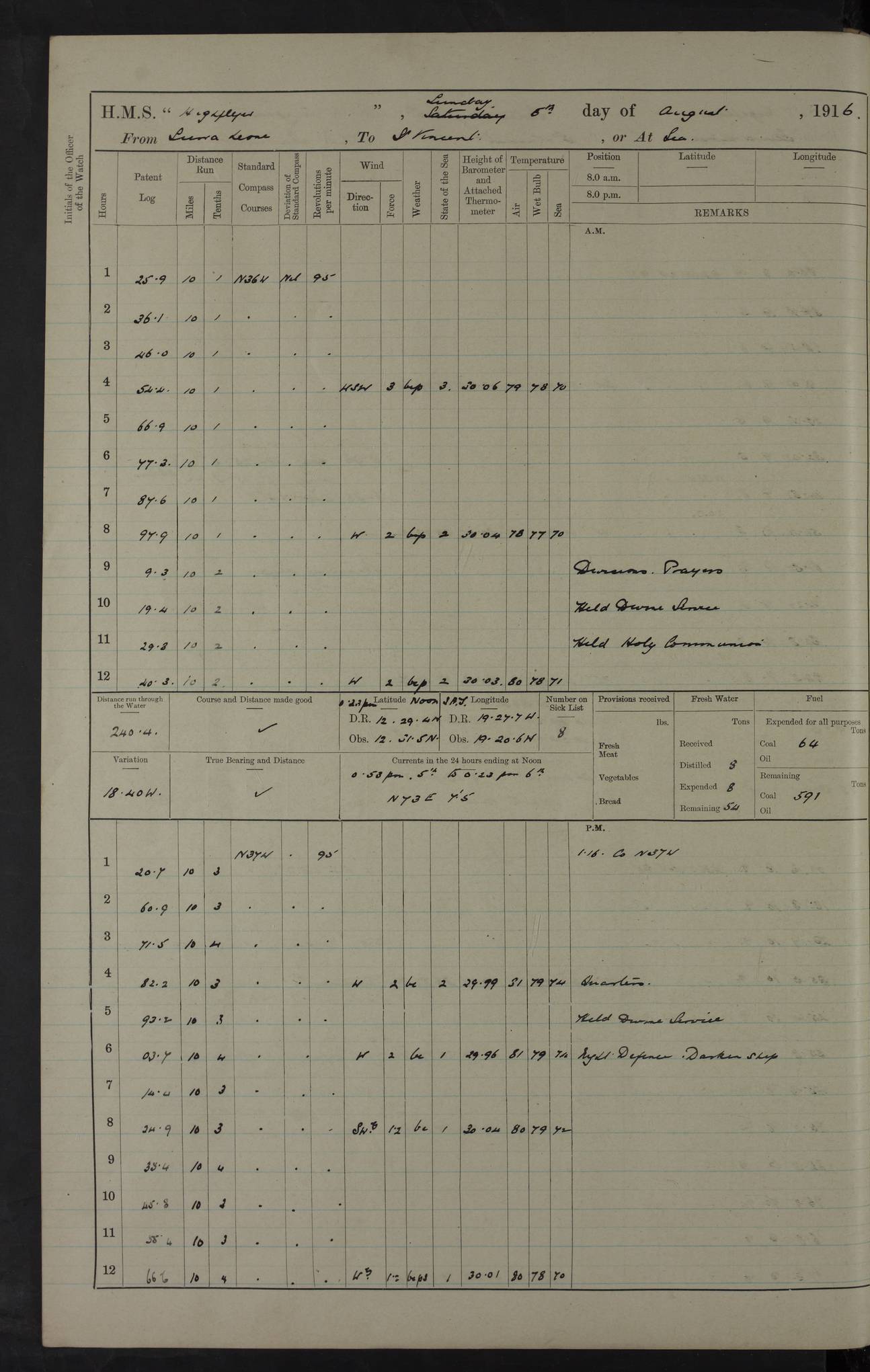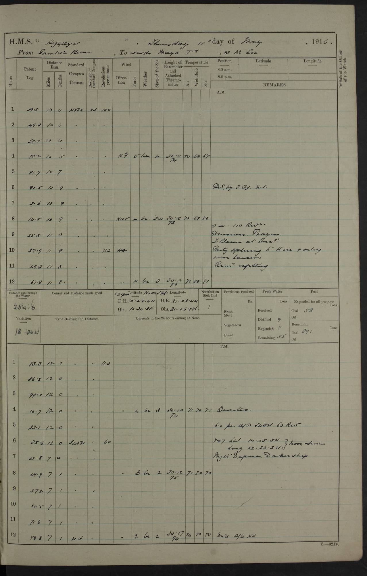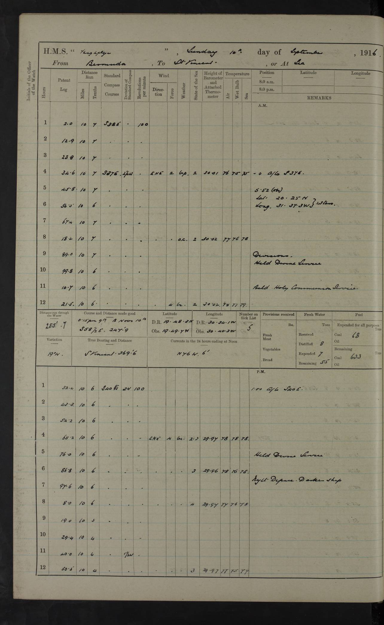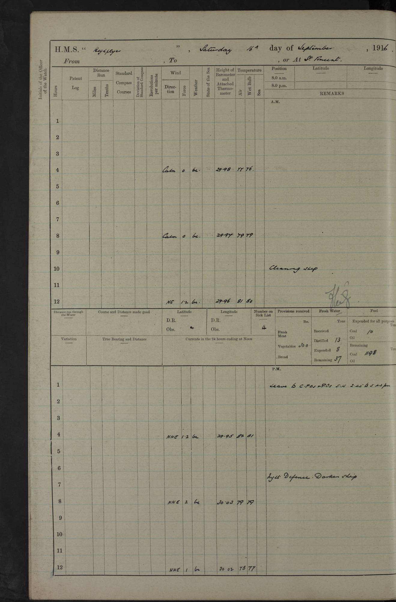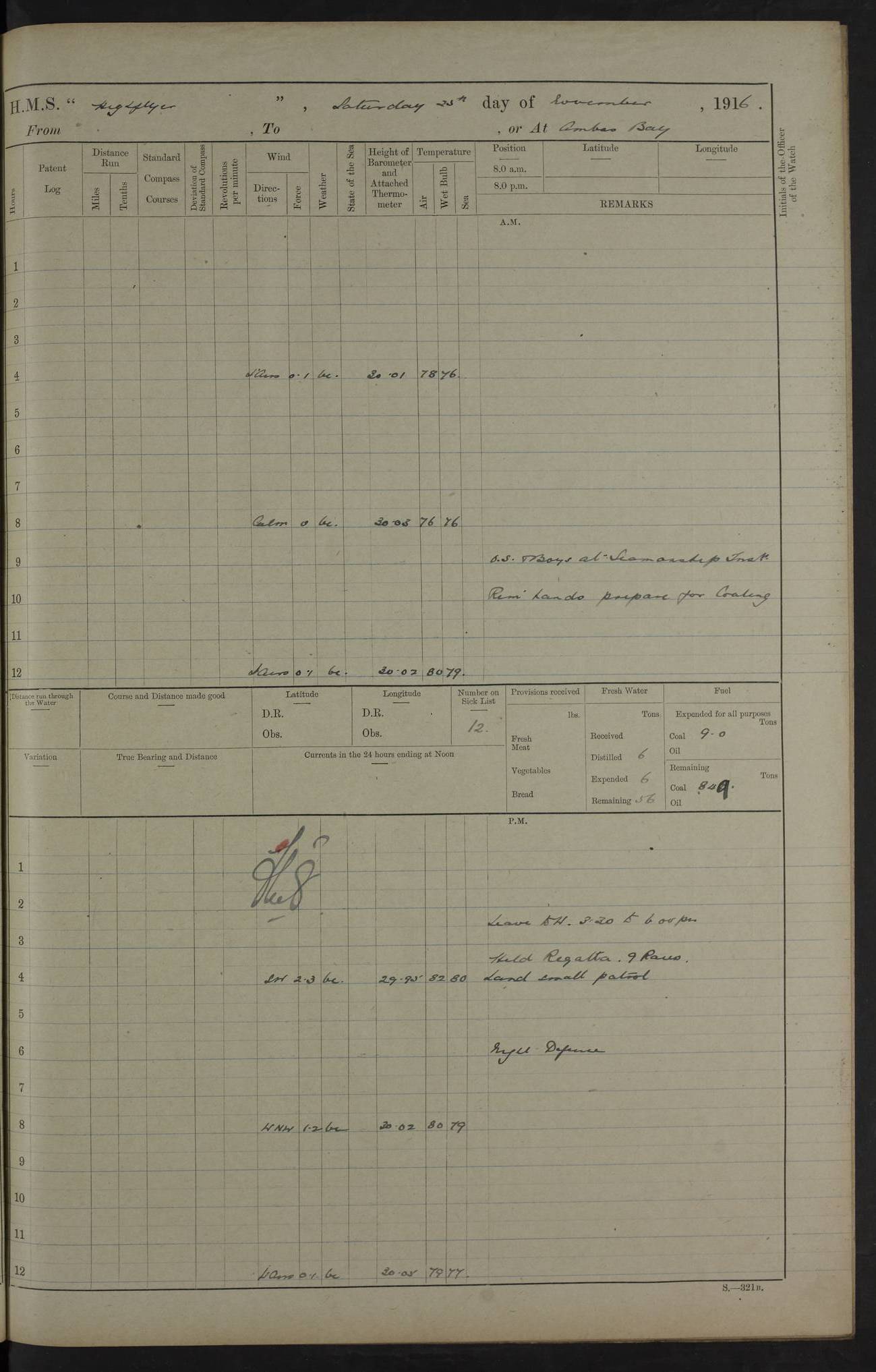 4f961154a2fc8e2def000869: (http://s3.amazonaws.com/oldweather/ADM53-44303/ADM 53-44303-011_0.jpg) 12 February 1916 Patrolling S American trade route to northward Lat 3.9, Long -29.9 7.38am: Stopped, boarded SS REINLAND (Dutch) bound southward Lat 3.13.4N, 30.01W. 4f961155a2fc8e2def00086a: (http://s3.amazonaws.com/oldweather/ADM53-44303/ADM 53-44303-011_1.jpg) 13 February 1916 Patrolling S American trade routes to northward Lat 7.8, Long -28.3 9.00am: Held Divine Service. 4f961155a2fc8e2def00086b: (http://s3.amazonaws.com/oldweather/ADM53-44303/ADM 53-44303-012_0.jpg) 14 February 1916 Patrolling trade routes. to northward Lat 11.4, Long -27.0 9.40am: 90 revs. Course as requisite for aiming rifle practice. 4f961155a2fc8e2def00086c: (http://s3.amazonaws.com/oldweather/ADM53-44303/ADM 53-44303-012_1.jpg) 15 February 1916 Towards Brava Id. Lat 14.2, Long -25.3 9.25am: Stopped, dropped target. Course and speed as requisite to carry out heavy gun practice. 4.00pm: Sighted Brava Id. vis. 1½ miles. Passed W side. 4f961156a2fc8e2def00086d: (http://s3.amazonaws.com/oldweather/ADM53-44303/ADM 53-44303-013_0.jpg) 16 February 1916 St. Vincent Lat 16.8828, Long -25.0106 7.35am: Land ahead visibility 1½’ San Antonio. 8.30am: Course as requisite for entering harbour. 11.00am: Preparing for coaling. 4f961156a2fc8e2def00086e: (http://s3.amazonaws.com/oldweather/ADM53-44303/ADM 53-44303-013_1.jpg) 17 February 1916 St. Vincent Lat 16.8828, Long -25.0106 6.00am: Collier SS PENHALE came alongside. 6.45am: Commenced coaling. 4f961156a2fc8e2def00086f: (http://s3.amazonaws.com/oldweather/ADM53-44303/ADM 53-44303-014_0.jpg) 18 February 1916 St. Vincent Lat 16.8828, Long -25.0106 Cleaning ship. 2.30pm: Drawing new fenders from SS TAMPLIN. 4f961157a2fc8e2def000870: (http://s3.amazonaws.com/oldweather/ADM53-44303/ADM 53-44303-014_1.jpg) 19 February 1916 St. Vincent Lat 16.8828, Long -25.0106 10.30am: Diving party sent to SS TAMPLIN. 4f961157a2fc8e2def000871: (http://s3.amazonaws.com/oldweather/ADM53-44303/ADM 53-44303-015_0.jpg) 20 February 1916 St. Vincent Lat 16.8828, Long -25.0106 7.00am: Sent diving party to TAMPLIN. 4f961157a2fc8e2def000872: (http://s3.amazonaws.com/oldweather/ADM53-44303/ADM 53-44303-015_1.jpg) 21 February 1916 St. Vincent to patrol Lat 16.8828, Long -25.0106 8.30am: Diving party sent to SS TAMPLIN. 6.40pm: Weighed and proceeded as requisite out of harbour. 8.30pm: Bull Point Lt. Ho. N24W, 6000 yds. 4f961158a2fc8e2def000873: (http://s3.amazonaws.com/oldweather/ADM53-44303/ADM 53-44303-016_0.jpg) 22 February 1916 Patrolling northward off San Antonio Id. Lat 18.1, Long -25.3 Painting ship and as requisite. 7.00pm: Western point San Antonio abeam 10’. 4f961158a2fc8e2def000874: (http://s3.amazonaws.com/oldweather/ADM53-44303/ADM 53-44303-016_1.jpg) 23 February 1916 Off San Antonio and St. Vincent to Tarrafal Bay Lat 16.8, Long -25.2 12.00pm: Spoke SS JASON, Brit., bound St. Vincent. 1.12pm: Boarded SS WILLEM VAN DREIL (Dutch) bound St. Vincent. 3.35pm: Stopped, came to with SB, in 33 fathoms. 4f961158a2fc8e2def000875: (http://s3.amazonaws.com/oldweather/ADM53-44303/ADM 53-44303-017_0.jpg) 24 February 1916 Tarrafal Bay, San Antonio Id. to St. Vincent Lat 16.8828, Long -25.0106 9.43 am; Proceeded. Course as requisite to St. Vincent round S end San Antonio 120 revs. 11.17am: Came to with SB in 11 fathoms. 4f961159a2fc8e2def000876: (http://s3.amazonaws.com/oldweather/ADM53-44303/ADM 53-44303-017_1.jpg) 25 February 1916 St. Vincent Lat 16.8828, Long -25.0106 Painting ship. Boys and OS at instruction. Control party at drill. 4f961159a2fc8e2def000877: (http://s3.amazonaws.com/oldweather/ADM53-44303/ADM 53-44303-018_0.jpg) 26 February 1916 St. Vincent Lat 16.8828, Long -25.0106 Cleaning ship. 4f961159a2fc8e2def000878: (http://s3.amazonaws.com/oldweather/ADM53-44303/ADM 53-44303-018_1.jpg) 27 February 1916 St. Vincent Lat 16.8828, Long -25.0106 9.30am: Held Divine Service. 4f96115aa2fc8e2def000879: (http://s3.amazonaws.com/oldweather/ADM53-44303/ADM 53-44303-019_0.jpg) 28 February 1916 St. Vincent Lat 16.8828, Long -25.0106 Boys and OS at instruction. Control party at drill. Remainder preparing for coaling. 2.00pm: Diving party at SS TAMPLIN. 4f96115aa2fc8e2def00087a: (http://s3.amazonaws.com/oldweather/ADM53-44303/ADM 53-44303-019_1.jpg) 29 February 1916 St. Vincent Lat 16.8828, Long -25.0106 7.15am: Commenced coaling from lighter. 8.00am: HMS SWIFTSURE arrived. USS CHESTER arrived. 4f96115aa2fc8e2def00087b: (http://s3.amazonaws.com/oldweather/ADM53-44303/ADM 53-44303-020_0.jpg) 4f96115ba2fc8e2def00087c: (http://s3.amazonaws.com/oldweather/ADM53-44303/ADM 53-44303-020_1.jpg) 4f96115ba2fc8e2def00087d: (http://s3.amazonaws.com/oldweather/ADM53-44303/ADM 53-44303-021_0.jpg) 4f96115ba2fc8e2def00087e: (http://s3.amazonaws.com/oldweather/ADM53-44303/ADM 53-44303-021_1.jpg) LOGS FOR MARCH 1916 4f96115ca2fc8e2def00087f: (http://s3.amazonaws.com/oldweather/ADM53-44304/ADM 53-44304-001_0.jpg) 4f96115ca2fc8e2def000880: (http://s3.amazonaws.com/oldweather/ADM53-44304/ADM 53-44304-001_1.jpg) 4f96115ca2fc8e2def000881: (http://s3.amazonaws.com/oldweather/ADM53-44304/ADM 53-44304-002_0.jpg) 4f96115da2fc8e2def000882: (http://s3.amazonaws.com/oldweather/ADM53-44304/ADM 53-44304-002_1.jpg) 4f96115da2fc8e2def000883: (http://s3.amazonaws.com/oldweather/ADM53-44304/ADM 53-44304-003_0.jpg) 4f96115da2fc8e2def000884: (http://s3.amazonaws.com/oldweather/ADM53-44304/ADM 53-44304-003_1.jpg) 4f96115da2fc8e2def000885: (http://s3.amazonaws.com/oldweather/ADM53-44304/ADM 53-44304-004_0.jpg) 4f96115ea2fc8e2def000886: (http://s3.amazonaws.com/oldweather/ADM53-44304/ADM 53-44304-004_1.jpg) 4f96115ea2fc8e2def000887: (http://s3.amazonaws.com/oldweather/ADM53-44304/ADM 53-44304-005_0.jpg) 4f96115ea2fc8e2def000888: (http://s3.amazonaws.com/oldweather/ADM53-44304/ADM 53-44304-005_1.jpg) 1 March 1916 St. Vincent Lat 16.8828, Long -25.0106 9.30pm: Discharged 1 Officer and 1 Tel. Rating to SS NORTHWAITE. 10.00pm: Surgeon Hobbs joined ship fro