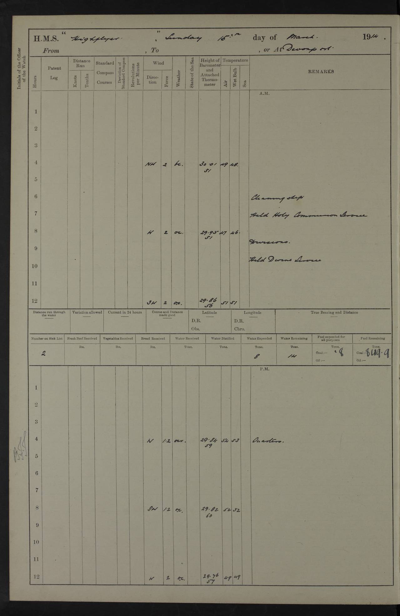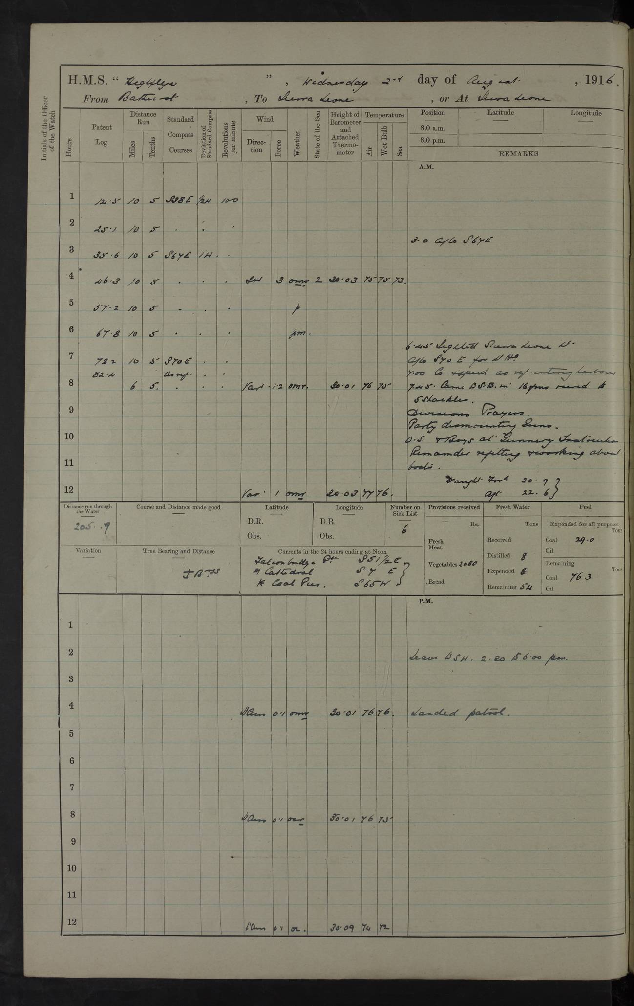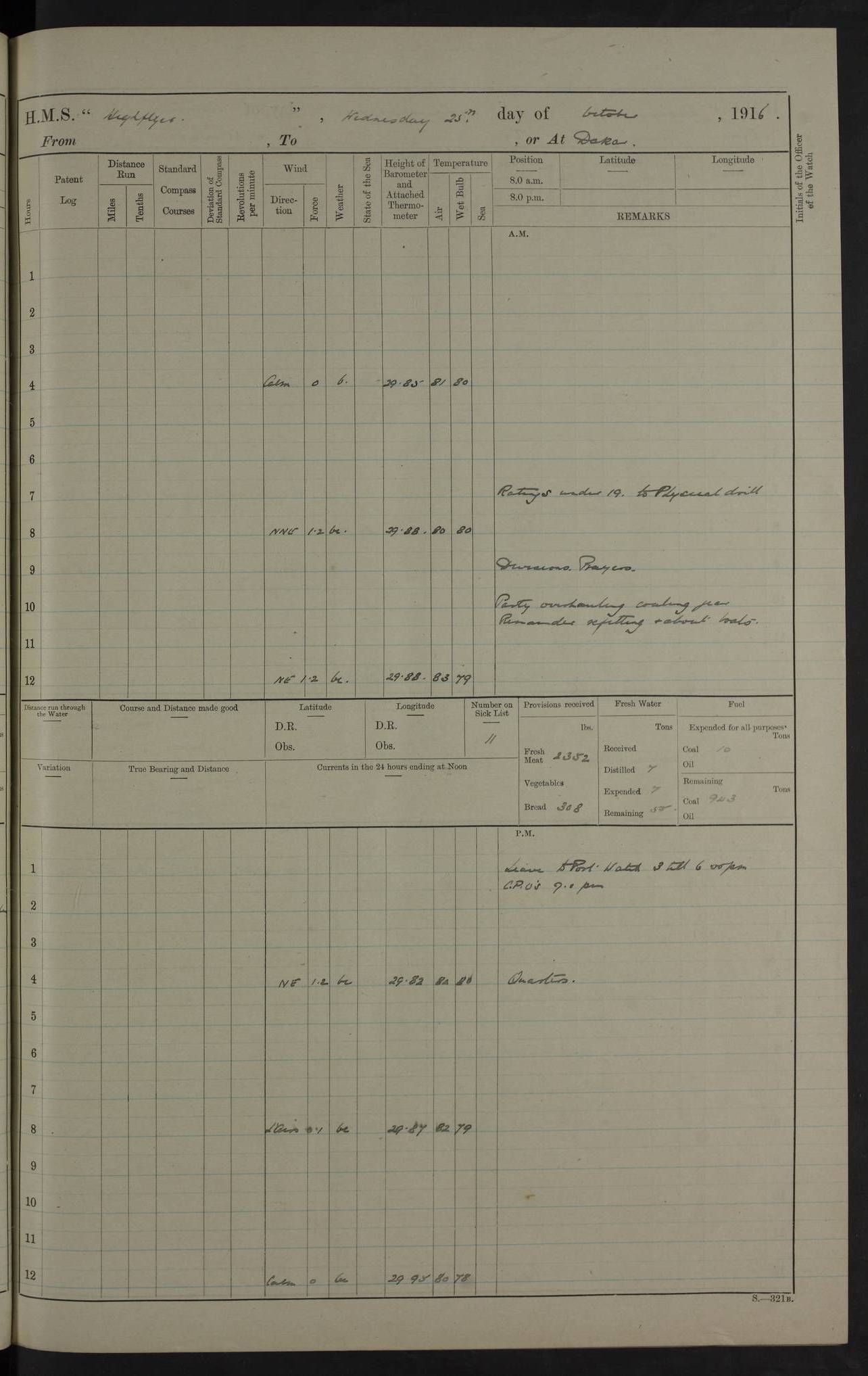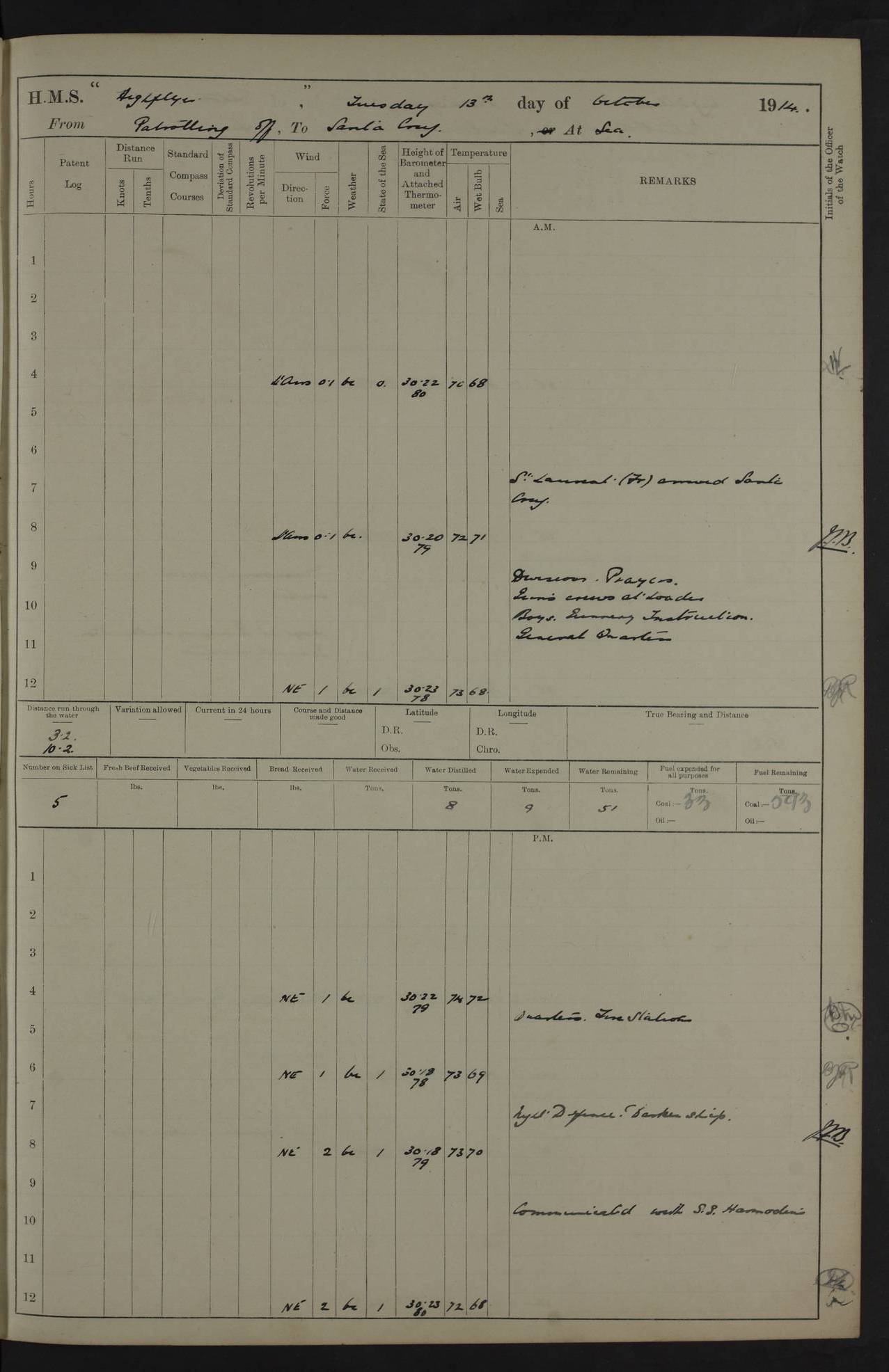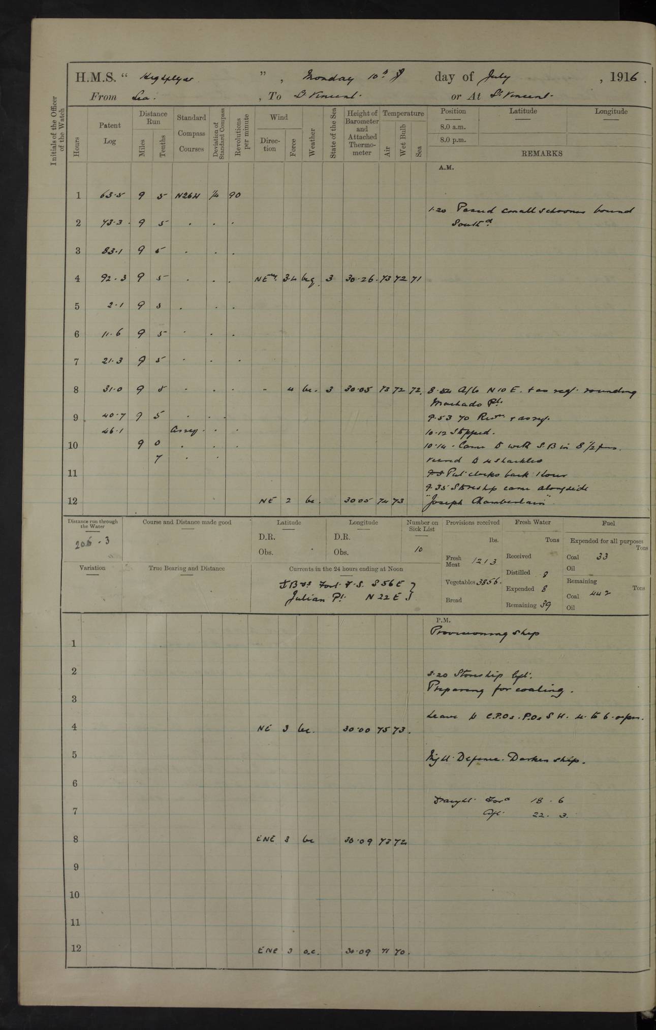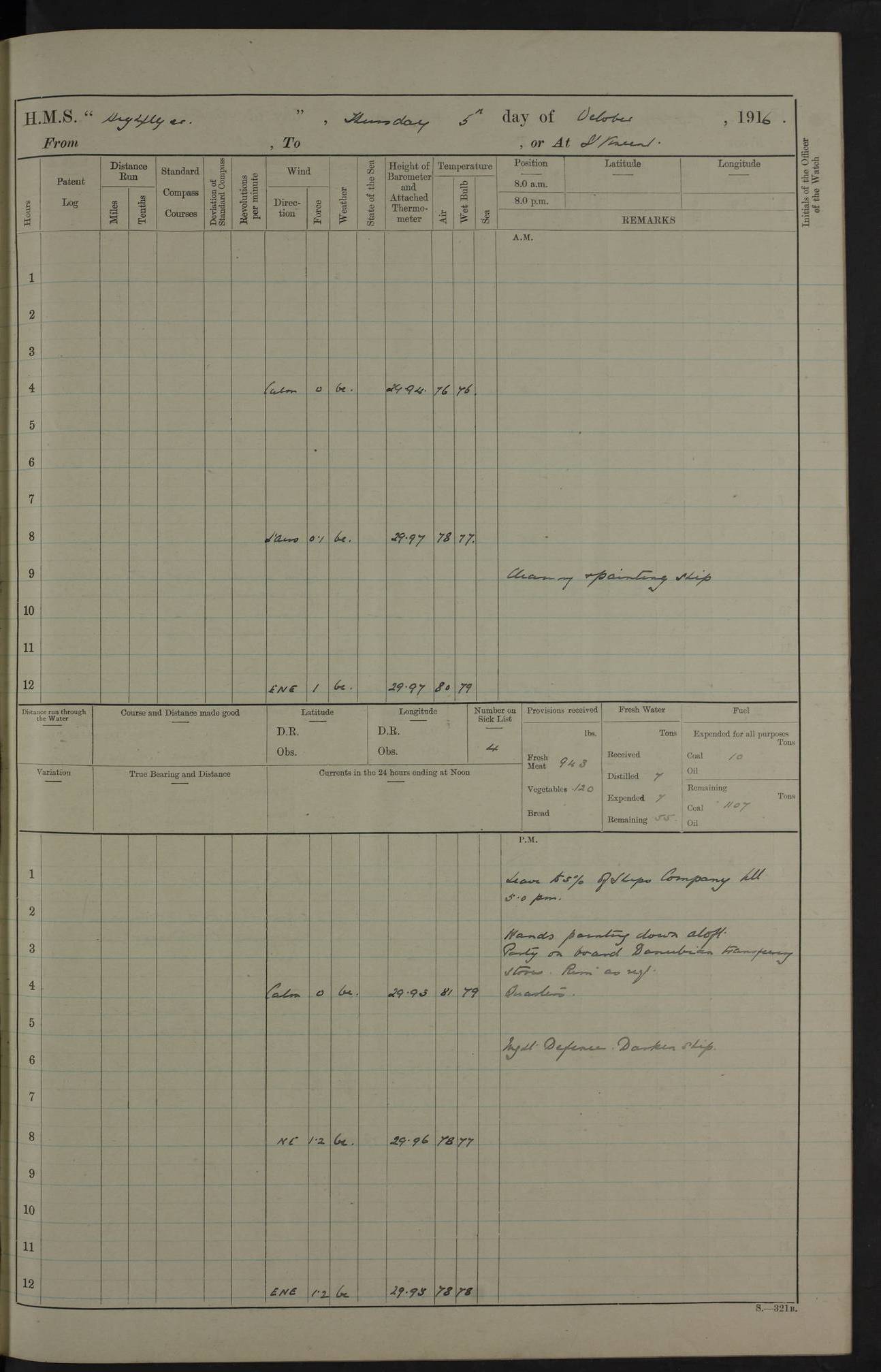 4f961154a2fc8e2def000869: (http://s3.amazonaws.com/oldweather/ADM53-44303/ADM 53-44303-011_0.jpg) 12 February 1916 Patrolling S American trade route to northward Lat 3.9, Long -29.9 7.38am: Stopped, boarded SS REINLAND (Dutch) bound southward Lat 3.13.4N, 30.01W. 4f961155a2fc8e2def00086a: (http://s3.amazonaws.com/oldweather/ADM53-44303/ADM 53-44303-011_1.jpg) 13 February 1916 Patrolling S American trade routes to northward Lat 7.8, Long -28.3 9.00am: Held Divine Service. 4f961155a2fc8e2def00086b: (http://s3.amazonaws.com/oldweather/ADM53-44303/ADM 53-44303-012_0.jpg) 14 February 1916 Patrolling trade routes. to northward Lat 11.4, Long -27.0 9.40am: 90 revs. Course as requisite for aiming rifle practice. 4f961155a2fc8e2def00086c: (http://s3.amazonaws.com/oldweather/ADM53-44303/ADM 53-44303-012_1.jpg) 15 February 1916 Towards Brava Id. Lat 14.2, Long -25.3 9.25am: Stopped, dropped target. Course and speed as requisite to carry out heavy gun practice. 4.00pm: Sighted Brava Id. vis. 1½ miles. Passed W side. 4f961156a2fc8e2def00086d: (http://s3.amazonaws.com/oldweather/ADM53-44303/ADM 53-44303-013_0.jpg) 16 February 1916 St. Vincent Lat 16.8828, Long -25.0106 7.35am: Land ahead visibility 1½’ San Antonio. 8.30am: Course as requisite for entering harbour. 11.00am: Preparing for coaling. 4f961156a2fc8e2def00086e: (http://s3.amazonaws.com/oldweather/ADM53-44303/ADM 53-44303-013_1.jpg) 17 February 1916 St. Vincent Lat 16.8828, Long -25.0106 6.00am: Collier SS PENHALE came alongside. 6.45am: Commenced coaling. 4f961156a2fc8e2def00086f: (http://s3.amazonaws.com/oldweather/ADM53-44303/ADM 53-44303-014_0.jpg) 18 February 1916 St. Vincent Lat 16.8828, Long -25.0106 Cleaning ship. 2.30pm: Drawing new fenders from SS TAMPLIN. 4f961157a2fc8e2def000870: (http://s3.amazonaws.com/oldweather/ADM53-44303/ADM 53-44303-014_1.jpg) 19 February 1916 St. Vincent Lat 16.8828, Long -25.0106 10.30am: Diving party sent to SS TAMPLIN. 4f961157a2fc8e2def000871: (http://s3.amazonaws.com/oldweather/ADM53-44303/ADM 53-44303-015_0.jpg) 20 February 1916 St. Vincent Lat 16.8828, Long -25.0106 7.00am: Sent diving party to TAMPLIN. 4f961157a2fc8e2def000872: (http://s3.amazonaws.com/oldweather/ADM53-44303/ADM 53-44303-015_1.jpg) 21 February 1916 St. Vincent to patrol Lat 16.8828, Long -25.0106 8.30am: Diving party sent to SS TAMPLIN. 6.40pm: Weighed and proceeded as requisite out of harbour. 8.30pm: Bull Point Lt. Ho. N24W, 6000 yds. 4f961158a2fc8e2def000873: (http://s3.amazonaws.com/oldweather/ADM53-44303/ADM 53-44303-016_0.jpg) 22 February 1916 Patrolling northward off San Antonio Id. Lat 18.1, Long -25.3 Painting ship and as requisite. 7.00pm: Western point San Antonio abeam 10’. 4f961158a2fc8e2def000874: (http://s3.amazonaws.com/oldweather/ADM53-44303/ADM 53-44303-016_1.jpg) 23 February 1916 Off San Antonio and St. Vincent to Tarrafal Bay Lat 16.8, Long -25.2 12.00pm: Spoke SS JASON, Brit., bound St. Vincent. 1.12pm: Boarded SS WILLEM VAN DREIL (Dutch) bound St. Vincent. 3.35pm: Stopped, came to with SB, in 33 fathoms. 4f961158a2fc8e2def000875: (http://s3.amazonaws.com/oldweather/ADM53-44303/ADM 53-44303-017_0.jpg) 24 February 1916 Tarrafal Bay, San Antonio Id. to St. Vincent Lat 16.8828, Long -25.0106 9.43 am; Proceeded. Course as requisite to St. Vincent round S end San Antonio 120 revs. 11.17am: Came to with SB in 11 fathoms. 4f961159a2fc8e2def000876: (http://s3.amazonaws.com/oldweather/ADM53-44303/ADM 53-44303-017_1.jpg) 25 February 1916 St. Vincent Lat 16.8828, Long -25.0106 Painting ship. Boys and OS at instruction. Control party at drill. 4f961159a2fc8e2def000877: (http://s3.amazonaws.com/oldweather/ADM53-44303/ADM 53-44303-018_0.jpg) 26 February 1916 St. Vincent Lat 16.8828, Long -25.0106 Cleaning ship. 4f961159a2fc8e2def000878: (http://s3.amazonaws.com/oldweather/ADM53-44303/ADM 53-44303-018_1.jpg) 27 February 1916 St. Vincent Lat 16.8828, Long -25.0106 9.30am: Held Divine Service. 4f96115aa2fc8e2def000879: (http://s3.amazonaws.com/oldweather/ADM53-44303/ADM 53-44303-019_0.jpg) 28 February 1916 St. Vincent Lat 16.8828, Long -25.0106 Boys and OS at instruction. Control party at drill. Remainder preparing for coaling. 2.00pm: Diving party at SS TAMPLIN. 4f96115aa2fc8e2def00087a: (http://s3.amazonaws.com/oldweather/ADM53-44303/ADM 53-44303-019_1.jpg) 29 February 1916 St. Vincent Lat 16.8828, Long -25.0106 7.15am: Commenced coaling from lighter. 8.00am: HMS SWIFTSURE arrived. USS CHESTER arrived. 4f96115aa2fc8e2def00087b: (http://s3.amazonaws.com/oldweather/ADM53-44303/ADM 53-44303-020_0.jpg) 4f96115ba2fc8e2def00087c: (http://s3.amazonaws.com/oldweather/ADM53-44303/ADM 53-44303-020_1.jpg) 4f96115ba2fc8e2def00087d: (http://s3.amazonaws.com/oldweather/ADM53-44303/ADM 53-44303-021_0.jpg) 4f96115ba2fc8e2def00087e: (http://s3.amazonaws.com/oldweather/ADM53-44303/ADM 53-44303-021_1.jpg) LOGS FOR MARCH 1916 4f96115ca2fc8e2def00087f: (http://s3.amazonaws.com/oldweather/ADM53-44304/ADM 53-44304-001_0.jpg) 4f96115ca2fc8e2def000880: (http://s3.amazonaws.com/oldweather/ADM53-44304/ADM 53-44304-001_1.jpg) 4f96115ca2fc8e2def000881: (http://s3.amazonaws.com/oldweather/ADM53-44304/ADM 53-44304-002_0.jpg) 4f96115da2fc8e2def000882: (http://s3.amazonaws.com/oldweather/ADM53-44304/ADM 53-44304-002_1.jpg) 4f96115da2fc8e2def000883: (http://s3.amazonaws.com/oldweather/ADM53-44304/ADM 53-44304-003_0.jpg) 4f96115da2fc8e2def000884: (http://s3.amazonaws.com/oldweather/ADM53-44304/ADM 53-44304-003_1.jpg) 4f96115da2fc8e2def000885: (http://s3.amazonaws.com/oldweather/ADM53-44304/ADM 53-44304-004_0.jpg) 4f96115ea2fc8e2def000886: (http://s3.amazonaws.com/oldweather/ADM53-44304/ADM 53-44304-004_1.jpg) 4f96115ea2fc8e2def000887: (http://s3.amazonaws.com/oldweather/ADM53-44304/ADM 53-44304-005_0.jpg) 4f96115ea2fc8e2def000888: (http://s3.amazonaws.com/oldweather/ADM53-44304/ADM 53-44304-005_1.jpg) 1 March 1916 St. Vincent Lat 16.8828, Long -25.0106 9.30pm: Discharged 1 Officer and 1 Tel. Rating to SS NORTHWAITE. 10.00pm: Surgeon Hobbs joined ship fro