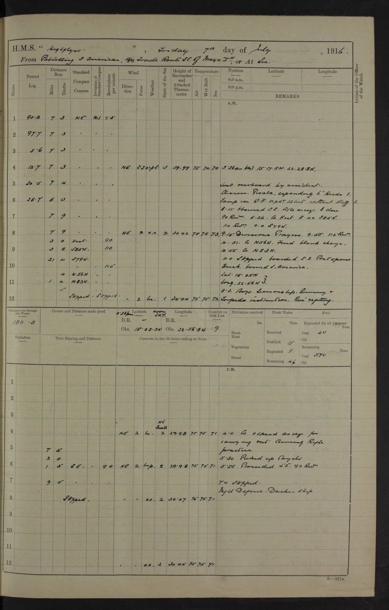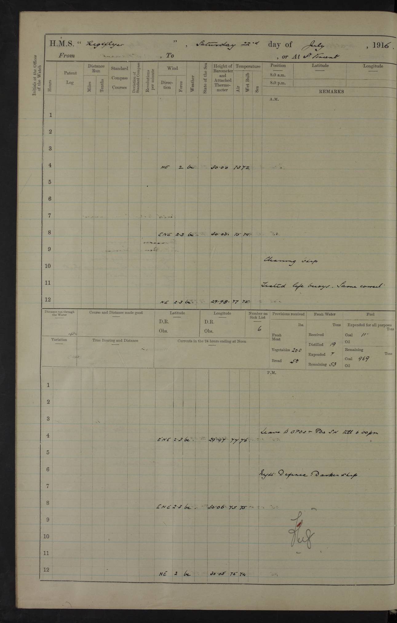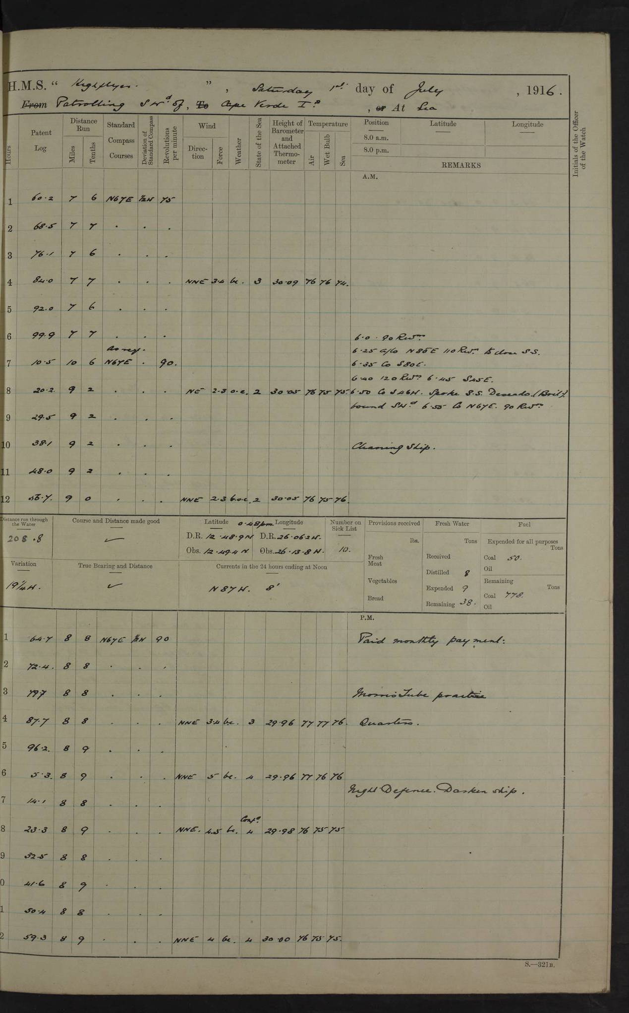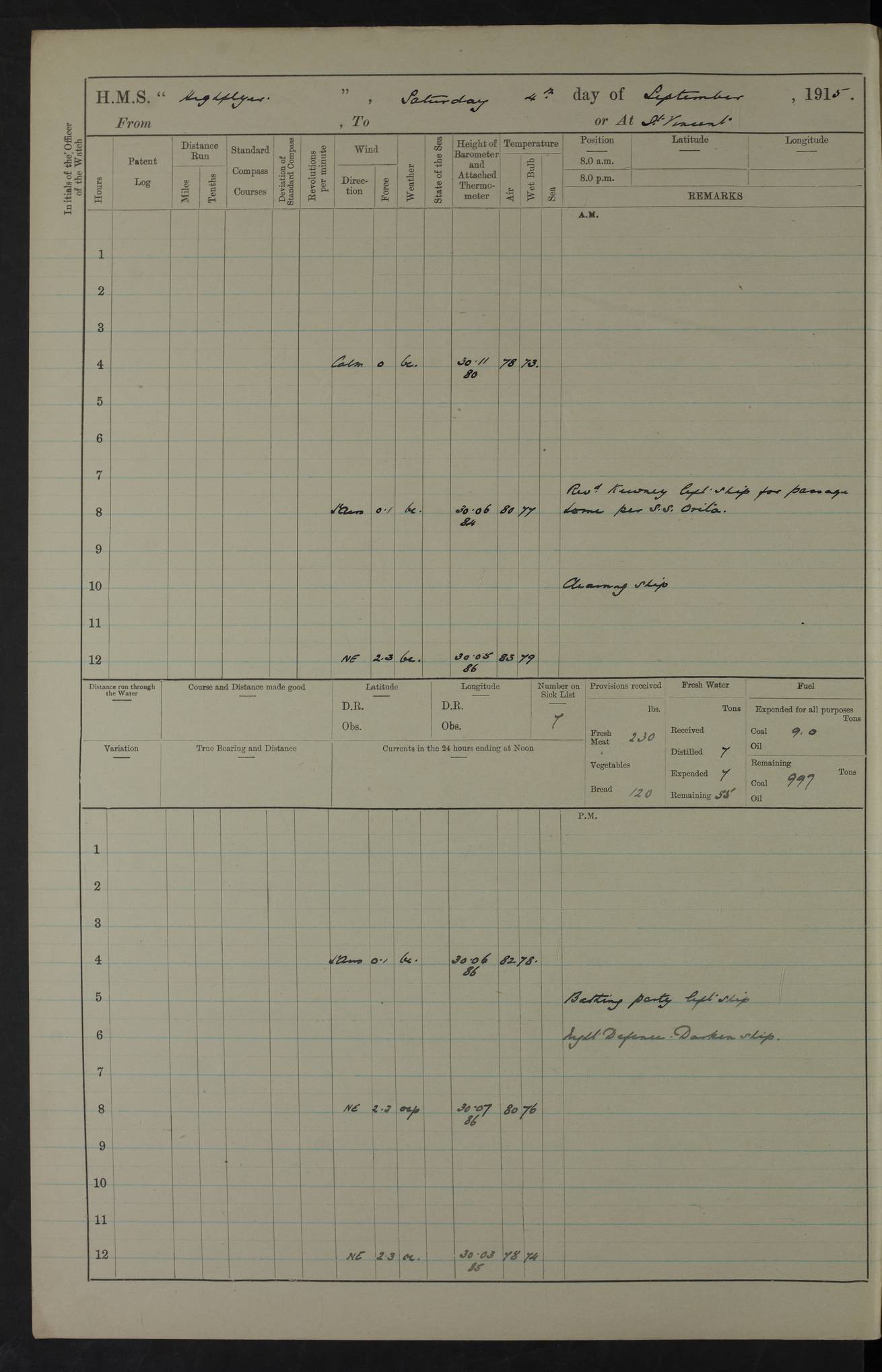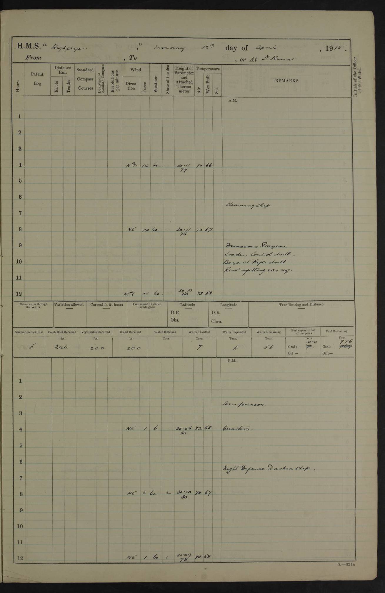 4f961154a2fc8e2def000869: (http://s3.amazonaws.com/oldweather/ADM53-44303/ADM 53-44303-011_0.jpg) 12 February 1916 Patrolling S American trade route to northward Lat 3.9, Long -29.9 7.38am: Stopped, boarded SS REINLAND (Dutch) bound southward Lat 3.13.4N, 30.01W. 4f961155a2fc8e2def00086a: (http://s3.amazonaws.com/oldweather/ADM53-44303/ADM 53-44303-011_1.jpg) 13 February 1916 Patrolling S American trade routes to northward Lat 7.8, Long -28.3 9.00am: Held Divine Service. 4f961155a2fc8e2def00086b: (http://s3.amazonaws.com/oldweather/ADM53-44303/ADM 53-44303-012_0.jpg) 14 February 1916 Patrolling trade routes. to northward Lat 11.4, Long -27.0 9.40am: 90 revs. Course as requisite for aiming rifle practice. 4f961155a2fc8e2def00086c: (http://s3.amazonaws.com/oldweather/ADM53-44303/ADM 53-44303-012_1.jpg) 15 February 1916 Towards Brava Id. Lat 14.2, Long -25.3 9.25am: Stopped, dropped target. Course and speed as requisite to carry out heavy gun practice. 4.00pm: Sighted Brava Id. vis. 1½ miles. Passed W side. 4f961156a2fc8e2def00086d: (http://s3.amazonaws.com/oldweather/ADM53-44303/ADM 53-44303-013_0.jpg) 16 February 1916 St. Vincent Lat 16.8828, Long -25.0106 7.35am: Land ahead visibility 1½’ San Antonio. 8.30am: Course as requisite for entering harbour. 11.00am: Preparing for coaling. 4f961156a2fc8e2def00086e: (http://s3.amazonaws.com/oldweather/ADM53-44303/ADM 53-44303-013_1.jpg) 17 February 1916 St. Vincent Lat 16.8828, Long -25.0106 6.00am: Collier SS PENHALE came alongside. 6.45am: Commenced coaling. 4f961156a2fc8e2def00086f: (http://s3.amazonaws.com/oldweather/ADM53-44303/ADM 53-44303-014_0.jpg) 18 February 1916 St. Vincent Lat 16.8828, Long -25.0106 Cleaning ship. 2.30pm: Drawing new fenders from SS TAMPLIN. 4f961157a2fc8e2def000870: (http://s3.amazonaws.com/oldweather/ADM53-44303/ADM 53-44303-014_1.jpg) 19 February 1916 St. Vincent Lat 16.8828, Long -25.0106 10.30am: Diving party sent to SS TAMPLIN. 4f961157a2fc8e2def000871: (http://s3.amazonaws.com/oldweather/ADM53-44303/ADM 53-44303-015_0.jpg) 20 February 1916 St. Vincent Lat 16.8828, Long -25.0106 7.00am: Sent diving party to TAMPLIN. 4f961157a2fc8e2def000872: (http://s3.amazonaws.com/oldweather/ADM53-44303/ADM 53-44303-015_1.jpg) 21 February 1916 St. Vincent to patrol Lat 16.8828, Long -25.0106 8.30am: Diving party sent to SS TAMPLIN. 6.40pm: Weighed and proceeded as requisite out of harbour. 8.30pm: Bull Point Lt. Ho. N24W, 6000 yds. 4f961158a2fc8e2def000873: (http://s3.amazonaws.com/oldweather/ADM53-44303/ADM 53-44303-016_0.jpg) 22 February 1916 Patrolling northward off San Antonio Id. Lat 18.1, Long -25.3 Painting ship and as requisite. 7.00pm: Western point San Antonio abeam 10’. 4f961158a2fc8e2def000874: (http://s3.amazonaws.com/oldweather/ADM53-44303/ADM 53-44303-016_1.jpg) 23 February 1916 Off San Antonio and St. Vincent to Tarrafal Bay Lat 16.8, Long -25.2 12.00pm: Spoke SS JASON, Brit., bound St. Vincent. 1.12pm: Boarded SS WILLEM VAN DREIL (Dutch) bound St. Vincent. 3.35pm: Stopped, came to with SB, in 33 fathoms. 4f961158a2fc8e2def000875: (http://s3.amazonaws.com/oldweather/ADM53-44303/ADM 53-44303-017_0.jpg) 24 February 1916 Tarrafal Bay, San Antonio Id. to St. Vincent Lat 16.8828, Long -25.0106 9.43 am; Proceeded. Course as requisite to St. Vincent round S end San Antonio 120 revs. 11.17am: Came to with SB in 11 fathoms. 4f961159a2fc8e2def000876: (http://s3.amazonaws.com/oldweather/ADM53-44303/ADM 53-44303-017_1.jpg) 25 February 1916 St. Vincent Lat 16.8828, Long -25.0106 Painting ship. Boys and OS at instruction. Control party at drill. 4f961159a2fc8e2def000877: (http://s3.amazonaws.com/oldweather/ADM53-44303/ADM 53-44303-018_0.jpg) 26 February 1916 St. Vincent Lat 16.8828, Long -25.0106 Cleaning ship. 4f961159a2fc8e2def000878: (http://s3.amazonaws.com/oldweather/ADM53-44303/ADM 53-44303-018_1.jpg) 27 February 1916 St. Vincent Lat 16.8828, Long -25.0106 9.30am: Held Divine Service. 4f96115aa2fc8e2def000879: (http://s3.amazonaws.com/oldweather/ADM53-44303/ADM 53-44303-019_0.jpg) 28 February 1916 St. Vincent Lat 16.8828, Long -25.0106 Boys and OS at instruction. Control party at drill. Remainder preparing for coaling. 2.00pm: Diving party at SS TAMPLIN. 4f96115aa2fc8e2def00087a: (http://s3.amazonaws.com/oldweather/ADM53-44303/ADM 53-44303-019_1.jpg) 29 February 1916 St. Vincent Lat 16.8828, Long -25.0106 7.15am: Commenced coaling from lighter. 8.00am: HMS SWIFTSURE arrived. USS CHESTER arrived. 4f96115aa2fc8e2def00087b: (http://s3.amazonaws.com/oldweather/ADM53-44303/ADM 53-44303-020_0.jpg) 4f96115ba2fc8e2def00087c: (http://s3.amazonaws.com/oldweather/ADM53-44303/ADM 53-44303-020_1.jpg) 4f96115ba2fc8e2def00087d: (http://s3.amazonaws.com/oldweather/ADM53-44303/ADM 53-44303-021_0.jpg) 4f96115ba2fc8e2def00087e: (http://s3.amazonaws.com/oldweather/ADM53-44303/ADM 53-44303-021_1.jpg) LOGS FOR MARCH 1916 4f96115ca2fc8e2def00087f: (http://s3.amazonaws.com/oldweather/ADM53-44304/ADM 53-44304-001_0.jpg) 4f96115ca2fc8e2def000880: (http://s3.amazonaws.com/oldweather/ADM53-44304/ADM 53-44304-001_1.jpg) 4f96115ca2fc8e2def000881: (http://s3.amazonaws.com/oldweather/ADM53-44304/ADM 53-44304-002_0.jpg) 4f96115da2fc8e2def000882: (http://s3.amazonaws.com/oldweather/ADM53-44304/ADM 53-44304-002_1.jpg) 4f96115da2fc8e2def000883: (http://s3.amazonaws.com/oldweather/ADM53-44304/ADM 53-44304-003_0.jpg) 4f96115da2fc8e2def000884: (http://s3.amazonaws.com/oldweather/ADM53-44304/ADM 53-44304-003_1.jpg) 4f96115da2fc8e2def000885: (http://s3.amazonaws.com/oldweather/ADM53-44304/ADM 53-44304-004_0.jpg) 4f96115ea2fc8e2def000886: (http://s3.amazonaws.com/oldweather/ADM53-44304/ADM 53-44304-004_1.jpg) 4f96115ea2fc8e2def000887: (http://s3.amazonaws.com/oldweather/ADM53-44304/ADM 53-44304-005_0.jpg) 4f96115ea2fc8e2def000888: (http://s3.amazonaws.com/oldweather/ADM53-44304/ADM 53-44304-005_1.jpg) 1 March 1916 St. Vincent Lat 16.8828, Long -25.0106 9.30pm: Discharged 1 Officer and 1 Tel. Rating to SS NORTHWAITE. 10.00pm: Surgeon Hobbs joined ship fro