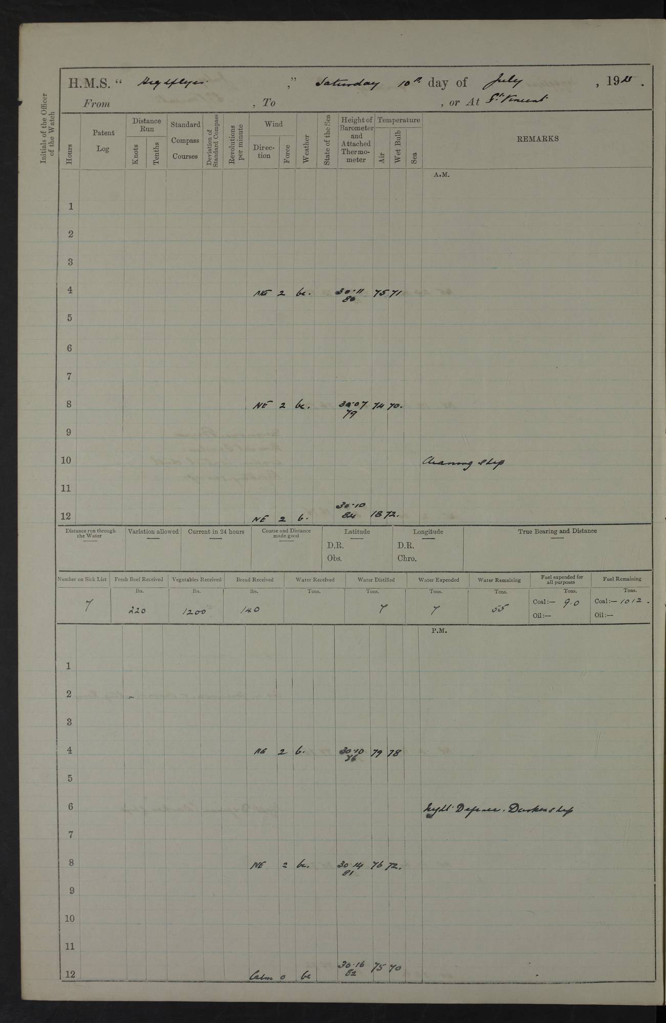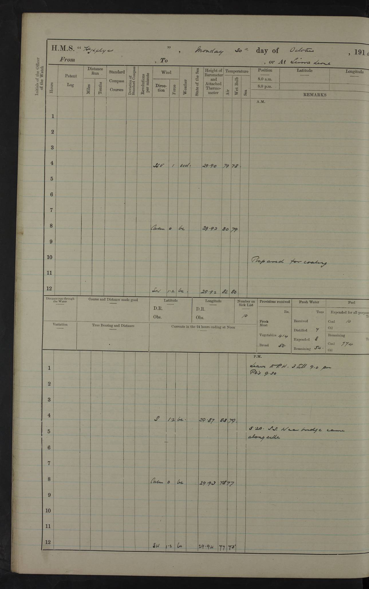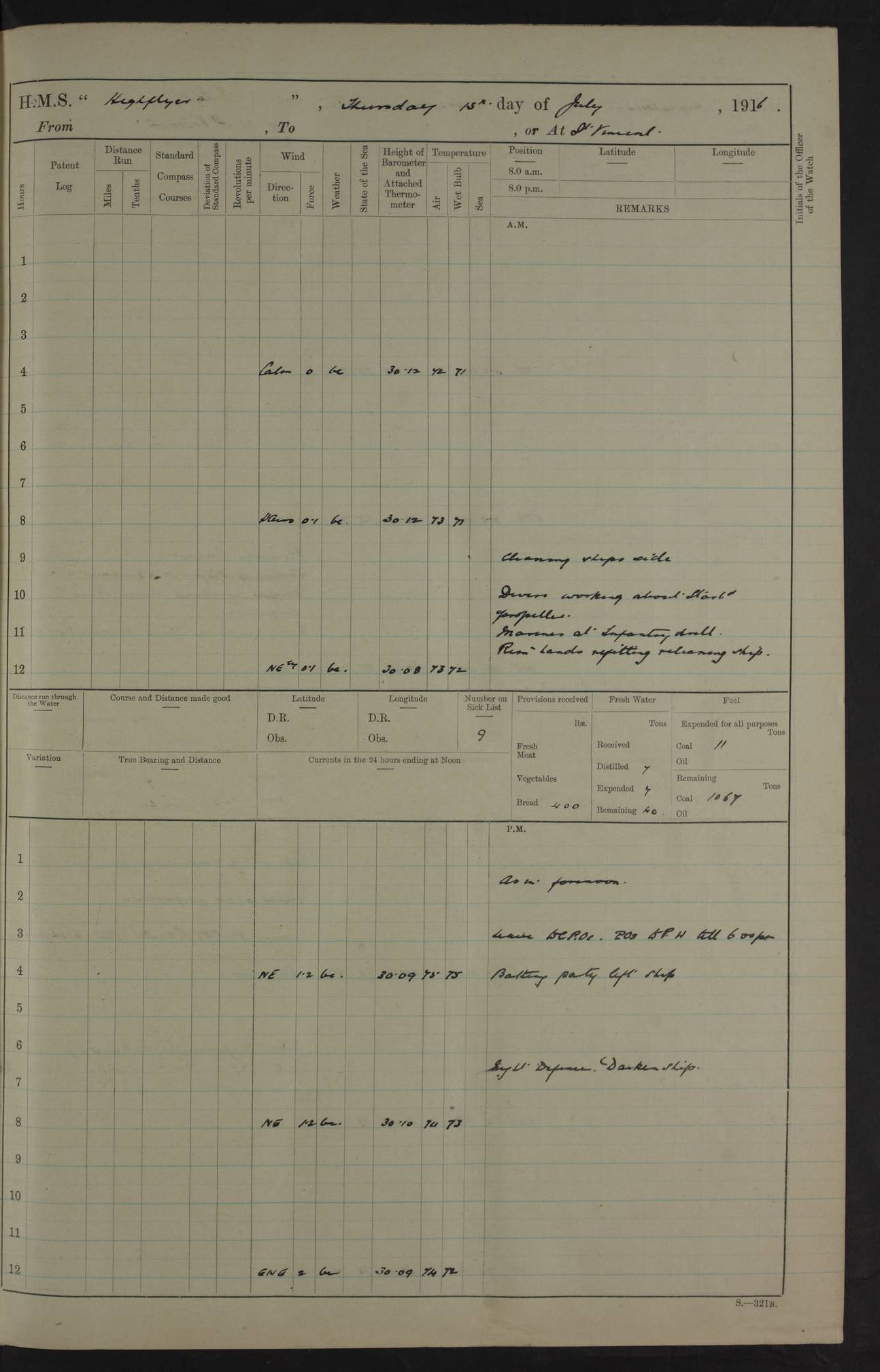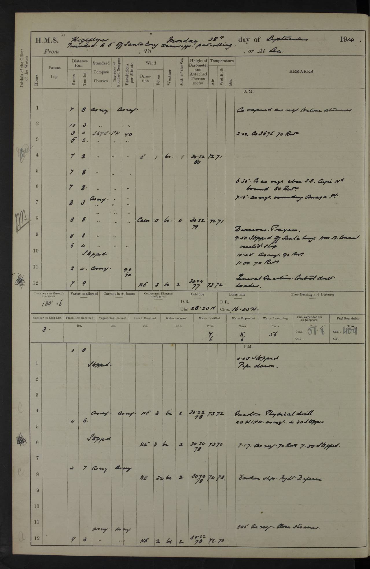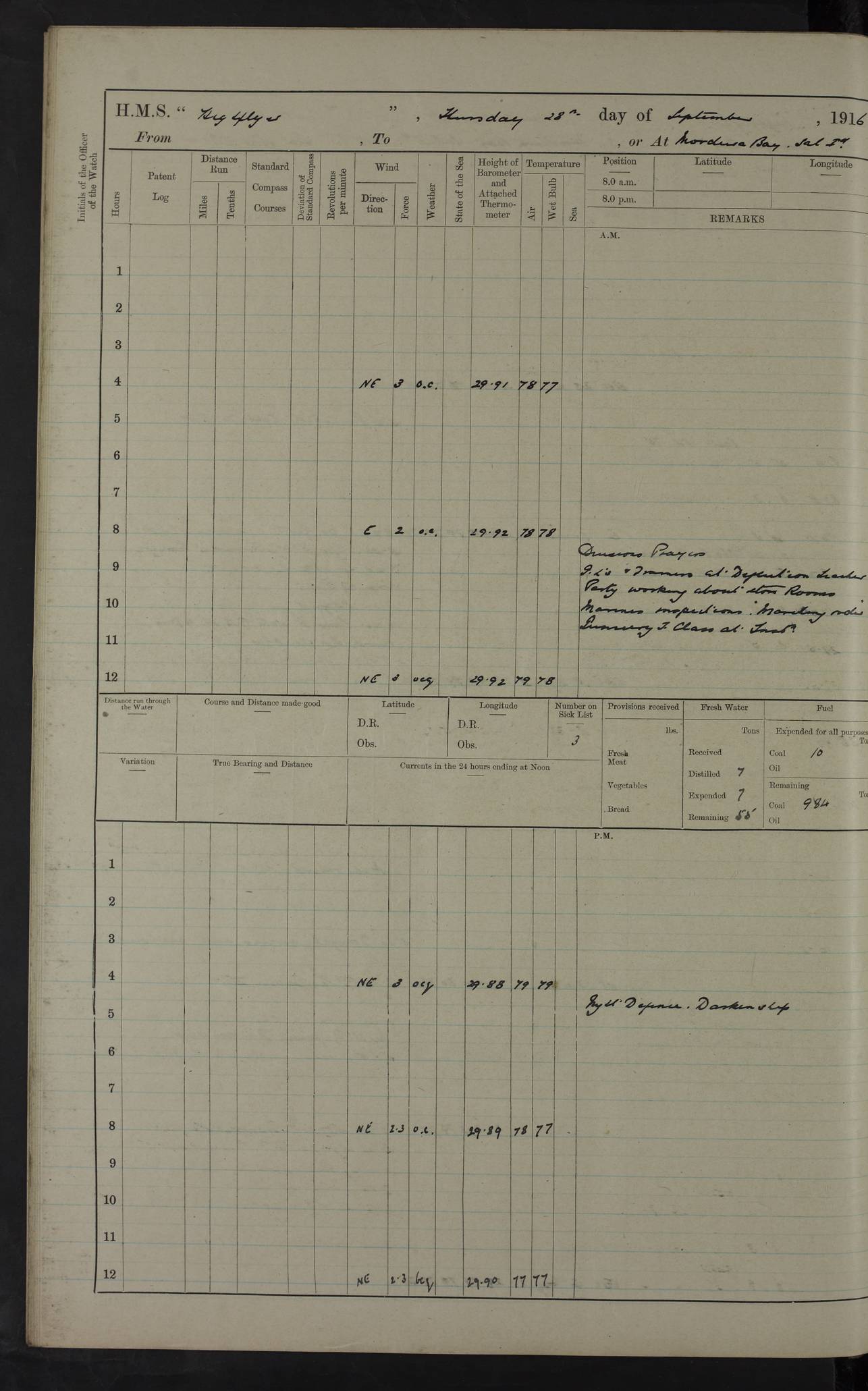 4f961154a2fc8e2def000869: (http://s3.amazonaws.com/oldweather/ADM53-44303/ADM 53-44303-011_0.jpg) 12 February 1916 Patrolling S American trade route to northward Lat 3.9, Long -29.9 7.38am: Stopped, boarded SS REINLAND (Dutch) bound southward Lat 3.13.4N, 30.01W. 4f961155a2fc8e2def00086a: (http://s3.amazonaws.com/oldweather/ADM53-44303/ADM 53-44303-011_1.jpg) 13 February 1916 Patrolling S American trade routes to northward Lat 7.8, Long -28.3 9.00am: Held Divine Service. 4f961155a2fc8e2def00086b: (http://s3.amazonaws.com/oldweather/ADM53-44303/ADM 53-44303-012_0.jpg) 14 February 1916 Patrolling trade routes. to northward Lat 11.4, Long -27.0 9.40am: 90 revs. Course as requisite for aiming rifle practice. 4f961155a2fc8e2def00086c: (http://s3.amazonaws.com/oldweather/ADM53-44303/ADM 53-44303-012_1.jpg) 15 February 1916 Towards Brava Id. Lat 14.2, Long -25.3 9.25am: Stopped, dropped target. Course and speed as requisite to carry out heavy gun practice. 4.00pm: Sighted Brava Id. vis. 1½ miles. Passed W side. 4f961156a2fc8e2def00086d: (http://s3.amazonaws.com/oldweather/ADM53-44303/ADM 53-44303-013_0.jpg) 16 February 1916 St. Vincent Lat 16.8828, Long -25.0106 7.35am: Land ahead visibility 1½’ San Antonio. 8.30am: Course as requisite for entering harbour. 11.00am: Preparing for coaling. 4f961156a2fc8e2def00086e: (http://s3.amazonaws.com/oldweather/ADM53-44303/ADM 53-44303-013_1.jpg) 17 February 1916 St. Vincent Lat 16.8828, Long -25.0106 6.00am: Collier SS PENHALE came alongside. 6.45am: Commenced coaling. 4f961156a2fc8e2def00086f: (http://s3.amazonaws.com/oldweather/ADM53-44303/ADM 53-44303-014_0.jpg) 18 February 1916 St. Vincent Lat 16.8828, Long -25.0106 Cleaning ship. 2.30pm: Drawing new fenders from SS TAMPLIN. 4f961157a2fc8e2def000870: (http://s3.amazonaws.com/oldweather/ADM53-44303/ADM 53-44303-014_1.jpg) 19 February 1916 St. Vincent Lat 16.8828, Long -25.0106 10.30am: Diving party sent to SS TAMPLIN. 4f961157a2fc8e2def000871: (http://s3.amazonaws.com/oldweather/ADM53-44303/ADM 53-44303-015_0.jpg) 20 February 1916 St. Vincent Lat 16.8828, Long -25.0106 7.00am: Sent diving party to TAMPLIN. 4f961157a2fc8e2def000872: (http://s3.amazonaws.com/oldweather/ADM53-44303/ADM 53-44303-015_1.jpg) 21 February 1916 St. Vincent to patrol Lat 16.8828, Long -25.0106 8.30am: Diving party sent to SS TAMPLIN. 6.40pm: Weighed and proceeded as requisite out of harbour. 8.30pm: Bull Point Lt. Ho. N24W, 6000 yds. 4f961158a2fc8e2def000873: (http://s3.amazonaws.com/oldweather/ADM53-44303/ADM 53-44303-016_0.jpg) 22 February 1916 Patrolling northward off San Antonio Id. Lat 18.1, Long -25.3 Painting ship and as requisite. 7.00pm: Western point San Antonio abeam 10’. 4f961158a2fc8e2def000874: (http://s3.amazonaws.com/oldweather/ADM53-44303/ADM 53-44303-016_1.jpg) 23 February 1916 Off San Antonio and St. Vincent to Tarrafal Bay Lat 16.8, Long -25.2 12.00pm: Spoke SS JASON, Brit., bound St. Vincent. 1.12pm: Boarded SS WILLEM VAN DREIL (Dutch) bound St. Vincent. 3.35pm: Stopped, came to with SB, in 33 fathoms. 4f961158a2fc8e2def000875: (http://s3.amazonaws.com/oldweather/ADM53-44303/ADM 53-44303-017_0.jpg) 24 February 1916 Tarrafal Bay, San Antonio Id. to St. Vincent Lat 16.8828, Long -25.0106 9.43 am; Proceeded. Course as requisite to St. Vincent round S end San Antonio 120 revs. 11.17am: Came to with SB in 11 fathoms. 4f961159a2fc8e2def000876: (http://s3.amazonaws.com/oldweather/ADM53-44303/ADM 53-44303-017_1.jpg) 25 February 1916 St. Vincent Lat 16.8828, Long -25.0106 Painting ship. Boys and OS at instruction. Control party at drill. 4f961159a2fc8e2def000877: (http://s3.amazonaws.com/oldweather/ADM53-44303/ADM 53-44303-018_0.jpg) 26 February 1916 St. Vincent Lat 16.8828, Long -25.0106 Cleaning ship. 4f961159a2fc8e2def000878: (http://s3.amazonaws.com/oldweather/ADM53-44303/ADM 53-44303-018_1.jpg) 27 February 1916 St. Vincent Lat 16.8828, Long -25.0106 9.30am: Held Divine Service. 4f96115aa2fc8e2def000879: (http://s3.amazonaws.com/oldweather/ADM53-44303/ADM 53-44303-019_0.jpg) 28 February 1916 St. Vincent Lat 16.8828, Long -25.0106 Boys and OS at instruction. Control party at drill. Remainder preparing for coaling. 2.00pm: Diving party at SS TAMPLIN. 4f96115aa2fc8e2def00087a: (http://s3.amazonaws.com/oldweather/ADM53-44303/ADM 53-44303-019_1.jpg) 29 February 1916 St. Vincent Lat 16.8828, Long -25.0106 7.15am: Commenced coaling from lighter. 8.00am: HMS SWIFTSURE arrived. USS CHESTER arrived. 4f96115aa2fc8e2def00087b: (http://s3.amazonaws.com/oldweather/ADM53-44303/ADM 53-44303-020_0.jpg) 4f96115ba2fc8e2def00087c: (http://s3.amazonaws.com/oldweather/ADM53-44303/ADM 53-44303-020_1.jpg) 4f96115ba2fc8e2def00087d: (http://s3.amazonaws.com/oldweather/ADM53-44303/ADM 53-44303-021_0.jpg) 4f96115ba2fc8e2def00087e: (http://s3.amazonaws.com/oldweather/ADM53-44303/ADM 53-44303-021_1.jpg) LOGS FOR MARCH 1916 4f96115ca2fc8e2def00087f: (http://s3.amazonaws.com/oldweather/ADM53-44304/ADM 53-44304-001_0.jpg) 4f96115ca2fc8e2def000880: (http://s3.amazonaws.com/oldweather/ADM53-44304/ADM 53-44304-001_1.jpg) 4f96115ca2fc8e2def000881: (http://s3.amazonaws.com/oldweather/ADM53-44304/ADM 53-44304-002_0.jpg) 4f96115da2fc8e2def000882: (http://s3.amazonaws.com/oldweather/ADM53-44304/ADM 53-44304-002_1.jpg) 4f96115da2fc8e2def000883: (http://s3.amazonaws.com/oldweather/ADM53-44304/ADM 53-44304-003_0.jpg) 4f96115da2fc8e2def000884: (http://s3.amazonaws.com/oldweather/ADM53-44304/ADM 53-44304-003_1.jpg) 4f96115da2fc8e2def000885: (http://s3.amazonaws.com/oldweather/ADM53-44304/ADM 53-44304-004_0.jpg) 4f96115ea2fc8e2def000886: (http://s3.amazonaws.com/oldweather/ADM53-44304/ADM 53-44304-004_1.jpg) 4f96115ea2fc8e2def000887: (http://s3.amazonaws.com/oldweather/ADM53-44304/ADM 53-44304-005_0.jpg) 4f96115ea2fc8e2def000888: (http://s3.amazonaws.com/oldweather/ADM53-44304/ADM 53-44304-005_1.jpg) 1 March 1916 St. Vincent Lat 16.8828, Long -25.0106 9.30pm: Discharged 1 Officer and 1 Tel. Rating to SS NORTHWAITE. 10.00pm: Surgeon Hobbs joined ship fro