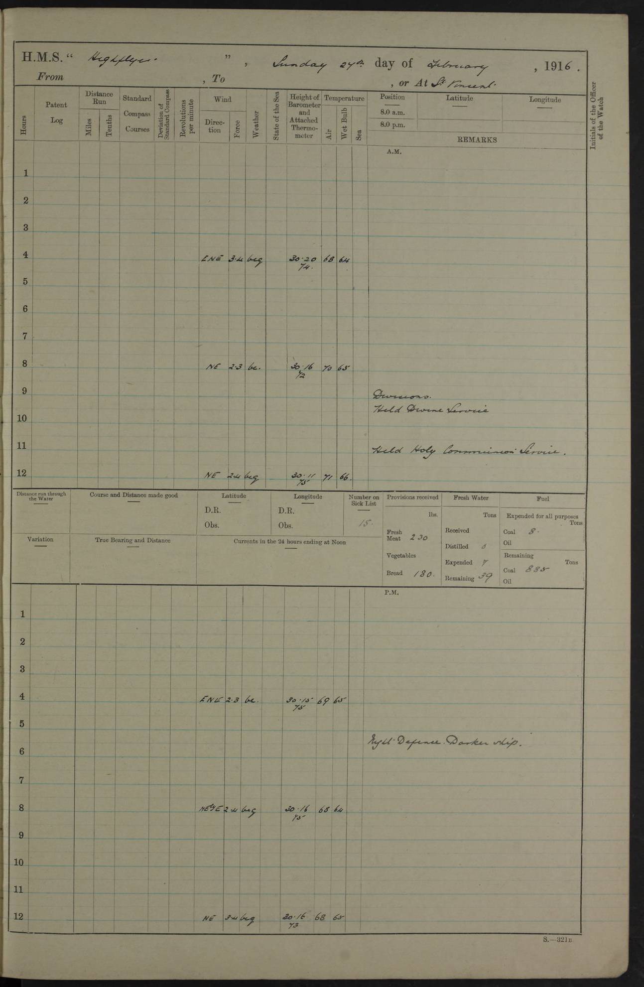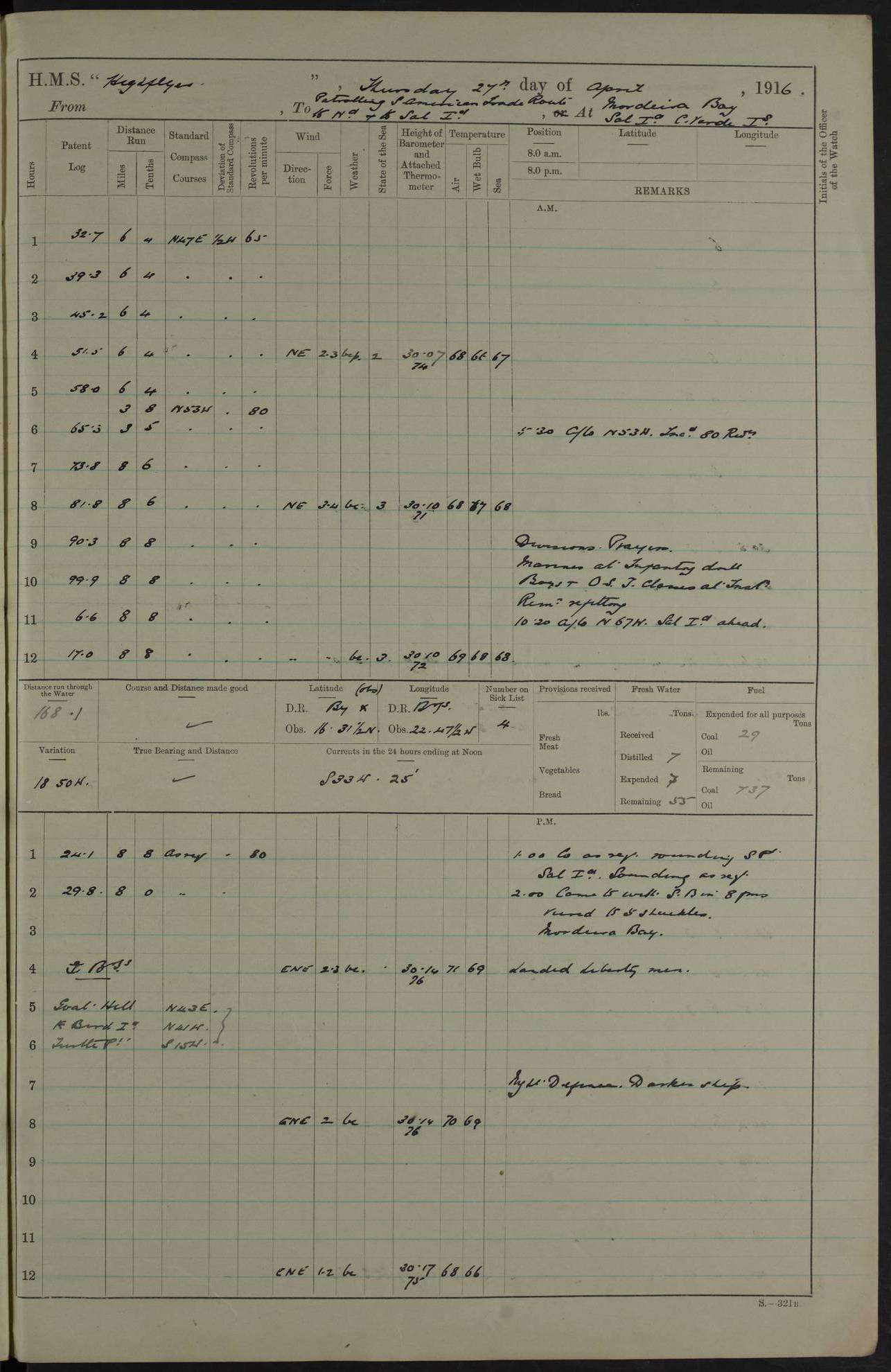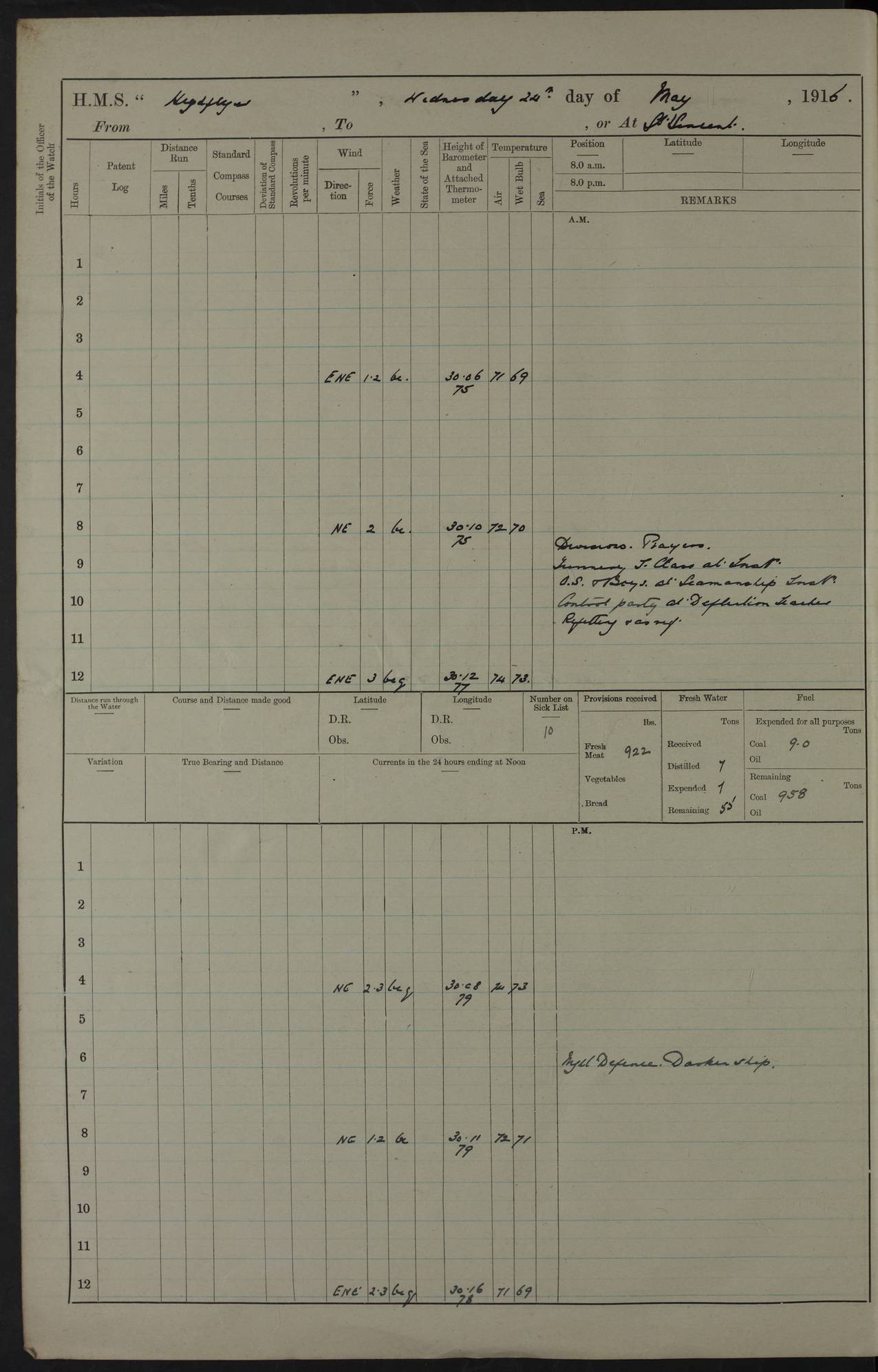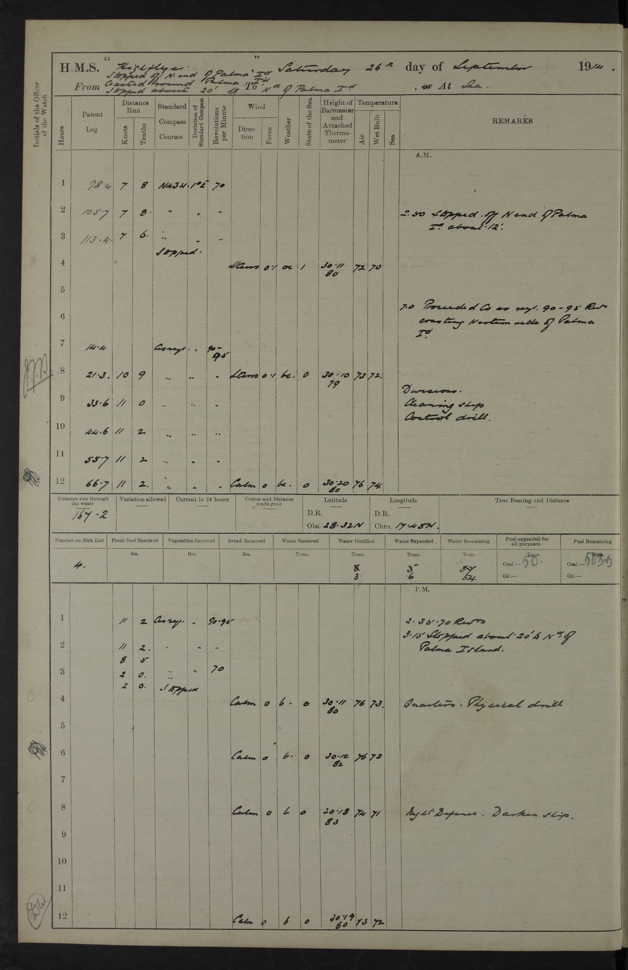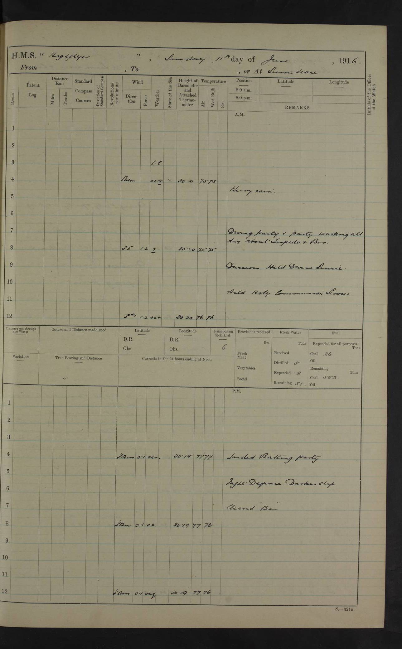 4f961154a2fc8e2def000869: (http://s3.amazonaws.com/oldweather/ADM53-44303/ADM 53-44303-011_0.jpg) 12 February 1916 Patrolling S American trade route to northward Lat 3.9, Long -29.9 7.38am: Stopped, boarded SS REINLAND (Dutch) bound southward Lat 3.13.4N, 30.01W. 4f961155a2fc8e2def00086a: (http://s3.amazonaws.com/oldweather/ADM53-44303/ADM 53-44303-011_1.jpg) 13 February 1916 Patrolling S American trade routes to northward Lat 7.8, Long -28.3 9.00am: Held Divine Service. 4f961155a2fc8e2def00086b: (http://s3.amazonaws.com/oldweather/ADM53-44303/ADM 53-44303-012_0.jpg) 14 February 1916 Patrolling trade routes. to northward Lat 11.4, Long -27.0 9.40am: 90 revs. Course as requisite for aiming rifle practice. 4f961155a2fc8e2def00086c: (http://s3.amazonaws.com/oldweather/ADM53-44303/ADM 53-44303-012_1.jpg) 15 February 1916 Towards Brava Id. Lat 14.2, Long -25.3 9.25am: Stopped, dropped target. Course and speed as requisite to carry out heavy gun practice. 4.00pm: Sighted Brava Id. vis. 1½ miles. Passed W side. 4f961156a2fc8e2def00086d: (http://s3.amazonaws.com/oldweather/ADM53-44303/ADM 53-44303-013_0.jpg) 16 February 1916 St. Vincent Lat 16.8828, Long -25.0106 7.35am: Land ahead visibility 1½’ San Antonio. 8.30am: Course as requisite for entering harbour. 11.00am: Preparing for coaling. 4f961156a2fc8e2def00086e: (http://s3.amazonaws.com/oldweather/ADM53-44303/ADM 53-44303-013_1.jpg) 17 February 1916 St. Vincent Lat 16.8828, Long -25.0106 6.00am: Collier SS PENHALE came alongside. 6.45am: Commenced coaling. 4f961156a2fc8e2def00086f: (http://s3.amazonaws.com/oldweather/ADM53-44303/ADM 53-44303-014_0.jpg) 18 February 1916 St. Vincent Lat 16.8828, Long -25.0106 Cleaning ship. 2.30pm: Drawing new fenders from SS TAMPLIN. 4f961157a2fc8e2def000870: (http://s3.amazonaws.com/oldweather/ADM53-44303/ADM 53-44303-014_1.jpg) 19 February 1916 St. Vincent Lat 16.8828, Long -25.0106 10.30am: Diving party sent to SS TAMPLIN. 4f961157a2fc8e2def000871: (http://s3.amazonaws.com/oldweather/ADM53-44303/ADM 53-44303-015_0.jpg) 20 February 1916 St. Vincent Lat 16.8828, Long -25.0106 7.00am: Sent diving party to TAMPLIN. 4f961157a2fc8e2def000872: (http://s3.amazonaws.com/oldweather/ADM53-44303/ADM 53-44303-015_1.jpg) 21 February 1916 St. Vincent to patrol Lat 16.8828, Long -25.0106 8.30am: Diving party sent to SS TAMPLIN. 6.40pm: Weighed and proceeded as requisite out of harbour. 8.30pm: Bull Point Lt. Ho. N24W, 6000 yds. 4f961158a2fc8e2def000873: (http://s3.amazonaws.com/oldweather/ADM53-44303/ADM 53-44303-016_0.jpg) 22 February 1916 Patrolling northward off San Antonio Id. Lat 18.1, Long -25.3 Painting ship and as requisite. 7.00pm: Western point San Antonio abeam 10’. 4f961158a2fc8e2def000874: (http://s3.amazonaws.com/oldweather/ADM53-44303/ADM 53-44303-016_1.jpg) 23 February 1916 Off San Antonio and St. Vincent to Tarrafal Bay Lat 16.8, Long -25.2 12.00pm: Spoke SS JASON, Brit., bound St. Vincent. 1.12pm: Boarded SS WILLEM VAN DREIL (Dutch) bound St. Vincent. 3.35pm: Stopped, came to with SB, in 33 fathoms. 4f961158a2fc8e2def000875: (http://s3.amazonaws.com/oldweather/ADM53-44303/ADM 53-44303-017_0.jpg) 24 February 1916 Tarrafal Bay, San Antonio Id. to St. Vincent Lat 16.8828, Long -25.0106 9.43 am; Proceeded. Course as requisite to St. Vincent round S end San Antonio 120 revs. 11.17am: Came to with SB in 11 fathoms. 4f961159a2fc8e2def000876: (http://s3.amazonaws.com/oldweather/ADM53-44303/ADM 53-44303-017_1.jpg) 25 February 1916 St. Vincent Lat 16.8828, Long -25.0106 Painting ship. Boys and OS at instruction. Control party at drill. 4f961159a2fc8e2def000877: (http://s3.amazonaws.com/oldweather/ADM53-44303/ADM 53-44303-018_0.jpg) 26 February 1916 St. Vincent Lat 16.8828, Long -25.0106 Cleaning ship. 4f961159a2fc8e2def000878: (http://s3.amazonaws.com/oldweather/ADM53-44303/ADM 53-44303-018_1.jpg) 27 February 1916 St. Vincent Lat 16.8828, Long -25.0106 9.30am: Held Divine Service. 4f96115aa2fc8e2def000879: (http://s3.amazonaws.com/oldweather/ADM53-44303/ADM 53-44303-019_0.jpg) 28 February 1916 St. Vincent Lat 16.8828, Long -25.0106 Boys and OS at instruction. Control party at drill. Remainder preparing for coaling. 2.00pm: Diving party at SS TAMPLIN. 4f96115aa2fc8e2def00087a: (http://s3.amazonaws.com/oldweather/ADM53-44303/ADM 53-44303-019_1.jpg) 29 February 1916 St. Vincent Lat 16.8828, Long -25.0106 7.15am: Commenced coaling from lighter. 8.00am: HMS SWIFTSURE arrived. USS CHESTER arrived. 4f96115aa2fc8e2def00087b: (http://s3.amazonaws.com/oldweather/ADM53-44303/ADM 53-44303-020_0.jpg) 4f96115ba2fc8e2def00087c: (http://s3.amazonaws.com/oldweather/ADM53-44303/ADM 53-44303-020_1.jpg) 4f96115ba2fc8e2def00087d: (http://s3.amazonaws.com/oldweather/ADM53-44303/ADM 53-44303-021_0.jpg) 4f96115ba2fc8e2def00087e: (http://s3.amazonaws.com/oldweather/ADM53-44303/ADM 53-44303-021_1.jpg) LOGS FOR MARCH 1916 4f96115ca2fc8e2def00087f: (http://s3.amazonaws.com/oldweather/ADM53-44304/ADM 53-44304-001_0.jpg) 4f96115ca2fc8e2def000880: (http://s3.amazonaws.com/oldweather/ADM53-44304/ADM 53-44304-001_1.jpg) 4f96115ca2fc8e2def000881: (http://s3.amazonaws.com/oldweather/ADM53-44304/ADM 53-44304-002_0.jpg) 4f96115da2fc8e2def000882: (http://s3.amazonaws.com/oldweather/ADM53-44304/ADM 53-44304-002_1.jpg) 4f96115da2fc8e2def000883: (http://s3.amazonaws.com/oldweather/ADM53-44304/ADM 53-44304-003_0.jpg) 4f96115da2fc8e2def000884: (http://s3.amazonaws.com/oldweather/ADM53-44304/ADM 53-44304-003_1.jpg) 4f96115da2fc8e2def000885: (http://s3.amazonaws.com/oldweather/ADM53-44304/ADM 53-44304-004_0.jpg) 4f96115ea2fc8e2def000886: (http://s3.amazonaws.com/oldweather/ADM53-44304/ADM 53-44304-004_1.jpg) 4f96115ea2fc8e2def000887: (http://s3.amazonaws.com/oldweather/ADM53-44304/ADM 53-44304-005_0.jpg) 4f96115ea2fc8e2def000888: (http://s3.amazonaws.com/oldweather/ADM53-44304/ADM 53-44304-005_1.jpg) 1 March 1916 St. Vincent Lat 16.8828, Long -25.0106 9.30pm: Discharged 1 Officer and 1 Tel. Rating to SS NORTHWAITE. 10.00pm: Surgeon Hobbs joined ship fro