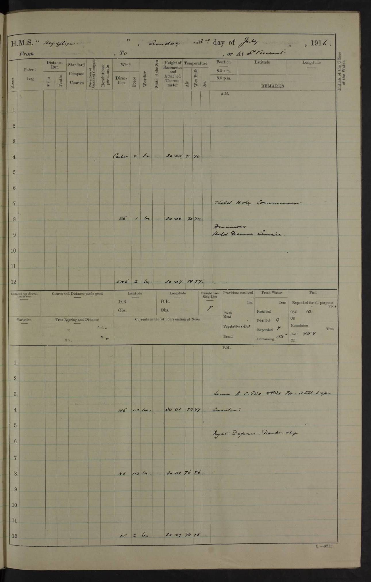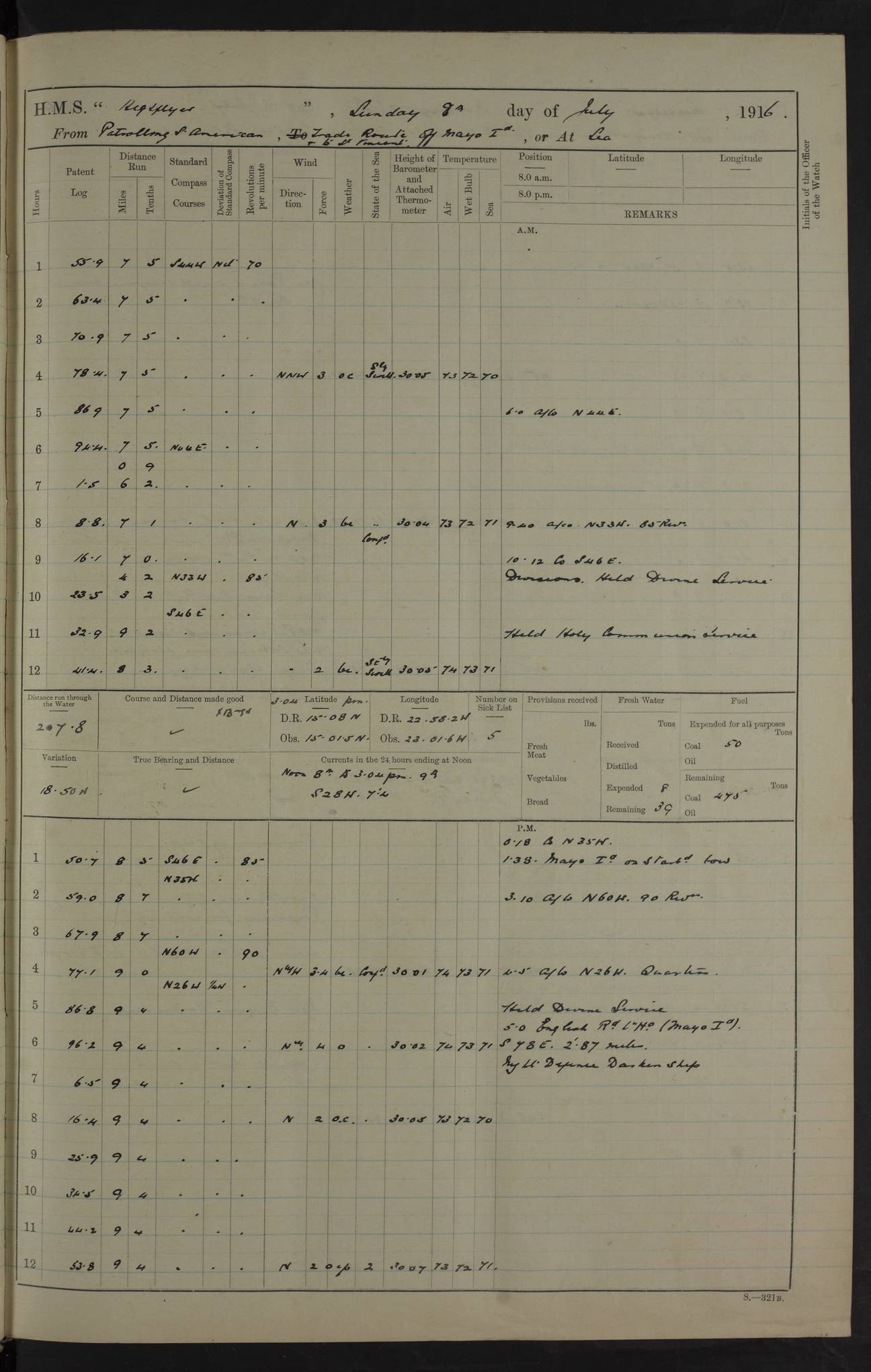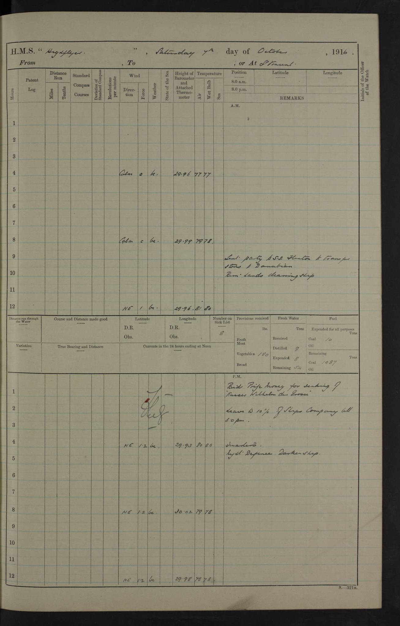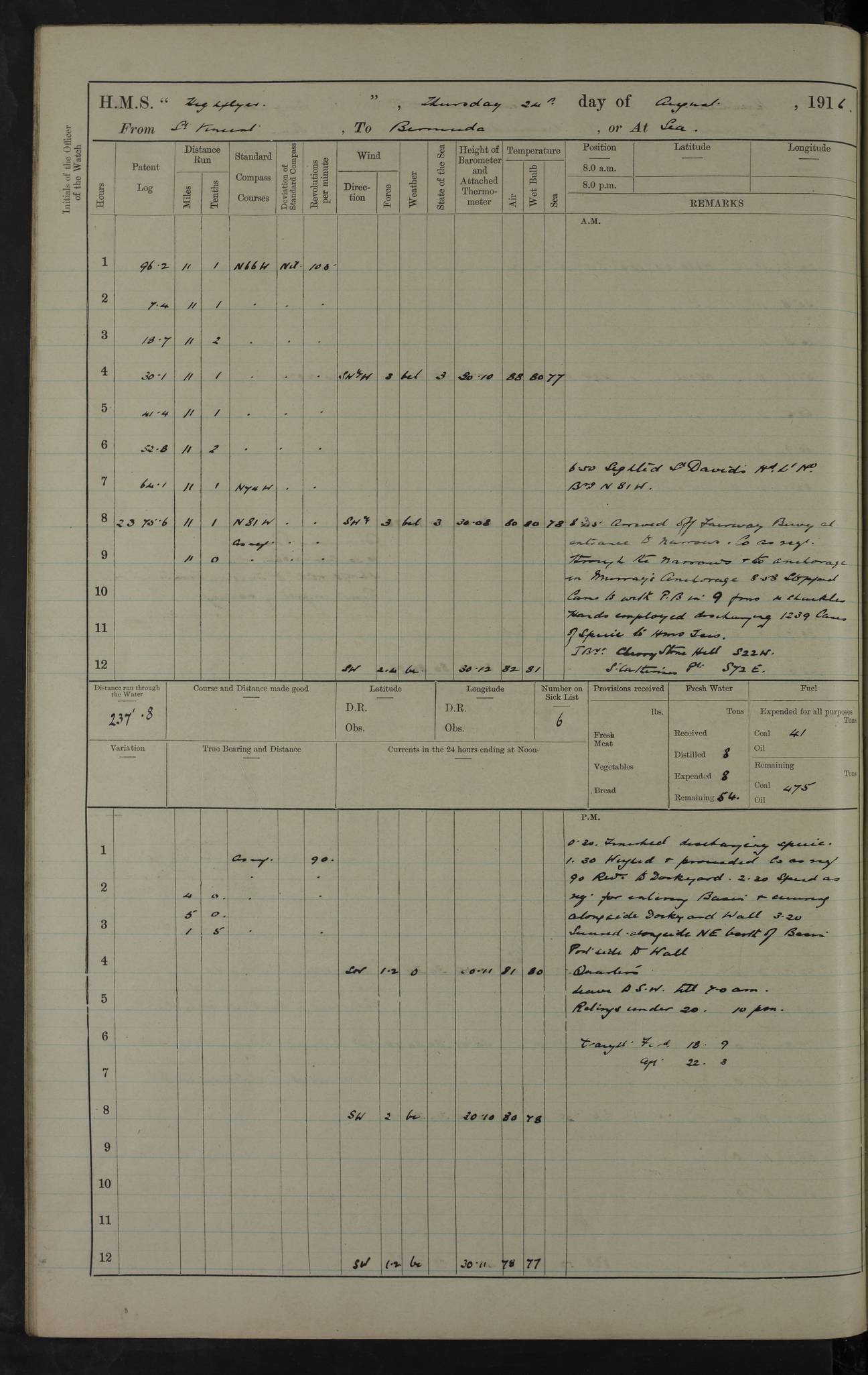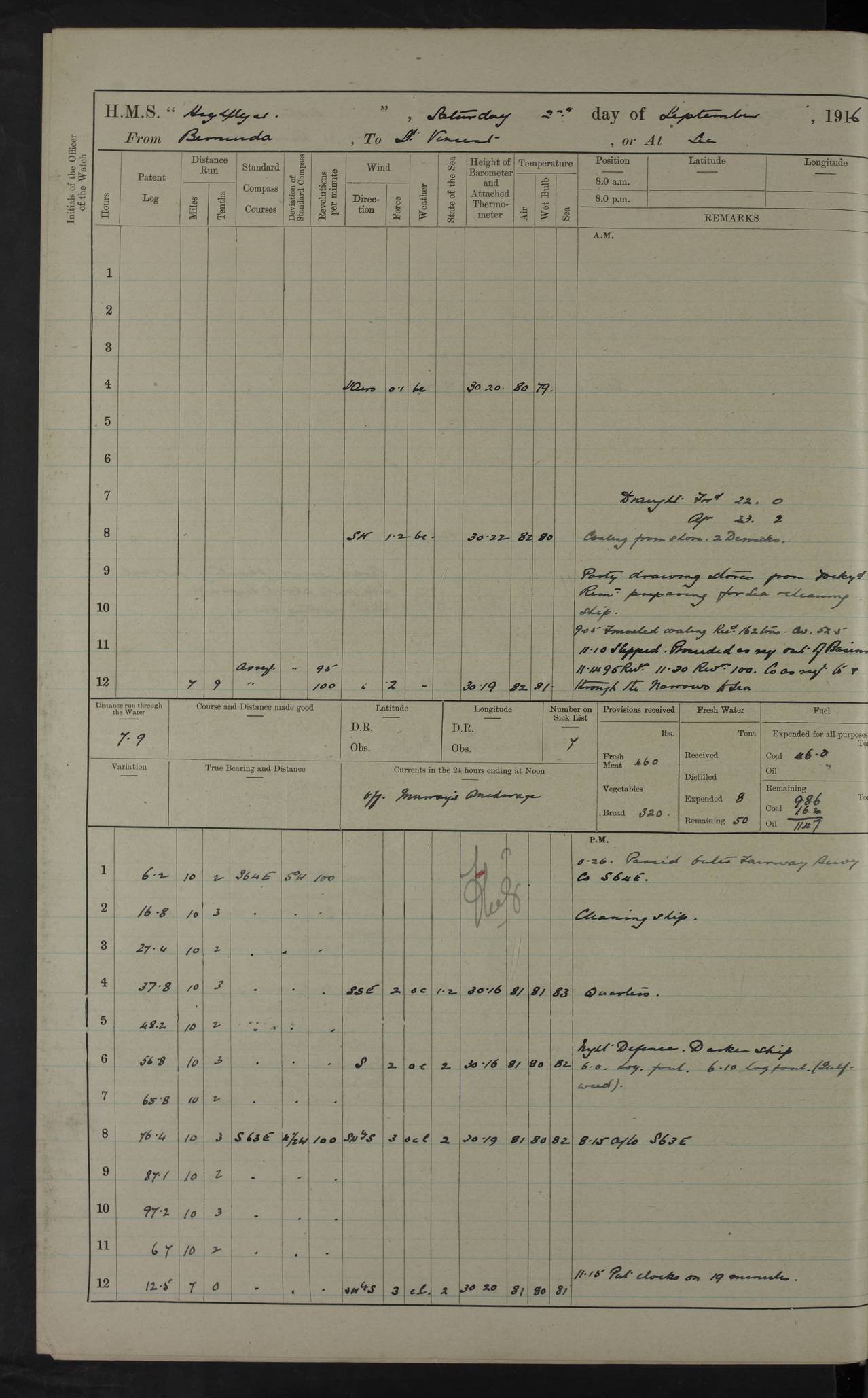 4f961154a2fc8e2def000869: (http://s3.amazonaws.com/oldweather/ADM53-44303/ADM 53-44303-011_0.jpg) 12 February 1916 Patrolling S American trade route to northward Lat 3.9, Long -29.9 7.38am: Stopped, boarded SS REINLAND (Dutch) bound southward Lat 3.13.4N, 30.01W. 4f961155a2fc8e2def00086a: (http://s3.amazonaws.com/oldweather/ADM53-44303/ADM 53-44303-011_1.jpg) 13 February 1916 Patrolling S American trade routes to northward Lat 7.8, Long -28.3 9.00am: Held Divine Service. 4f961155a2fc8e2def00086b: (http://s3.amazonaws.com/oldweather/ADM53-44303/ADM 53-44303-012_0.jpg) 14 February 1916 Patrolling trade routes. to northward Lat 11.4, Long -27.0 9.40am: 90 revs. Course as requisite for aiming rifle practice. 4f961155a2fc8e2def00086c: (http://s3.amazonaws.com/oldweather/ADM53-44303/ADM 53-44303-012_1.jpg) 15 February 1916 Towards Brava Id. Lat 14.2, Long -25.3 9.25am: Stopped, dropped target. Course and speed as requisite to carry out heavy gun practice. 4.00pm: Sighted Brava Id. vis. 1½ miles. Passed W side. 4f961156a2fc8e2def00086d: (http://s3.amazonaws.com/oldweather/ADM53-44303/ADM 53-44303-013_0.jpg) 16 February 1916 St. Vincent Lat 16.8828, Long -25.0106 7.35am: Land ahead visibility 1½’ San Antonio. 8.30am: Course as requisite for entering harbour. 11.00am: Preparing for coaling. 4f961156a2fc8e2def00086e: (http://s3.amazonaws.com/oldweather/ADM53-44303/ADM 53-44303-013_1.jpg) 17 February 1916 St. Vincent Lat 16.8828, Long -25.0106 6.00am: Collier SS PENHALE came alongside. 6.45am: Commenced coaling. 4f961156a2fc8e2def00086f: (http://s3.amazonaws.com/oldweather/ADM53-44303/ADM 53-44303-014_0.jpg) 18 February 1916 St. Vincent Lat 16.8828, Long -25.0106 Cleaning ship. 2.30pm: Drawing new fenders from SS TAMPLIN. 4f961157a2fc8e2def000870: (http://s3.amazonaws.com/oldweather/ADM53-44303/ADM 53-44303-014_1.jpg) 19 February 1916 St. Vincent Lat 16.8828, Long -25.0106 10.30am: Diving party sent to SS TAMPLIN. 4f961157a2fc8e2def000871: (http://s3.amazonaws.com/oldweather/ADM53-44303/ADM 53-44303-015_0.jpg) 20 February 1916 St. Vincent Lat 16.8828, Long -25.0106 7.00am: Sent diving party to TAMPLIN. 4f961157a2fc8e2def000872: (http://s3.amazonaws.com/oldweather/ADM53-44303/ADM 53-44303-015_1.jpg) 21 February 1916 St. Vincent to patrol Lat 16.8828, Long -25.0106 8.30am: Diving party sent to SS TAMPLIN. 6.40pm: Weighed and proceeded as requisite out of harbour. 8.30pm: Bull Point Lt. Ho. N24W, 6000 yds. 4f961158a2fc8e2def000873: (http://s3.amazonaws.com/oldweather/ADM53-44303/ADM 53-44303-016_0.jpg) 22 February 1916 Patrolling northward off San Antonio Id. Lat 18.1, Long -25.3 Painting ship and as requisite. 7.00pm: Western point San Antonio abeam 10’. 4f961158a2fc8e2def000874: (http://s3.amazonaws.com/oldweather/ADM53-44303/ADM 53-44303-016_1.jpg) 23 February 1916 Off San Antonio and St. Vincent to Tarrafal Bay Lat 16.8, Long -25.2 12.00pm: Spoke SS JASON, Brit., bound St. Vincent. 1.12pm: Boarded SS WILLEM VAN DREIL (Dutch) bound St. Vincent. 3.35pm: Stopped, came to with SB, in 33 fathoms. 4f961158a2fc8e2def000875: (http://s3.amazonaws.com/oldweather/ADM53-44303/ADM 53-44303-017_0.jpg) 24 February 1916 Tarrafal Bay, San Antonio Id. to St. Vincent Lat 16.8828, Long -25.0106 9.43 am; Proceeded. Course as requisite to St. Vincent round S end San Antonio 120 revs. 11.17am: Came to with SB in 11 fathoms. 4f961159a2fc8e2def000876: (http://s3.amazonaws.com/oldweather/ADM53-44303/ADM 53-44303-017_1.jpg) 25 February 1916 St. Vincent Lat 16.8828, Long -25.0106 Painting ship. Boys and OS at instruction. Control party at drill. 4f961159a2fc8e2def000877: (http://s3.amazonaws.com/oldweather/ADM53-44303/ADM 53-44303-018_0.jpg) 26 February 1916 St. Vincent Lat 16.8828, Long -25.0106 Cleaning ship. 4f961159a2fc8e2def000878: (http://s3.amazonaws.com/oldweather/ADM53-44303/ADM 53-44303-018_1.jpg) 27 February 1916 St. Vincent Lat 16.8828, Long -25.0106 9.30am: Held Divine Service. 4f96115aa2fc8e2def000879: (http://s3.amazonaws.com/oldweather/ADM53-44303/ADM 53-44303-019_0.jpg) 28 February 1916 St. Vincent Lat 16.8828, Long -25.0106 Boys and OS at instruction. Control party at drill. Remainder preparing for coaling. 2.00pm: Diving party at SS TAMPLIN. 4f96115aa2fc8e2def00087a: (http://s3.amazonaws.com/oldweather/ADM53-44303/ADM 53-44303-019_1.jpg) 29 February 1916 St. Vincent Lat 16.8828, Long -25.0106 7.15am: Commenced coaling from lighter. 8.00am: HMS SWIFTSURE arrived. USS CHESTER arrived. 4f96115aa2fc8e2def00087b: (http://s3.amazonaws.com/oldweather/ADM53-44303/ADM 53-44303-020_0.jpg) 4f96115ba2fc8e2def00087c: (http://s3.amazonaws.com/oldweather/ADM53-44303/ADM 53-44303-020_1.jpg) 4f96115ba2fc8e2def00087d: (http://s3.amazonaws.com/oldweather/ADM53-44303/ADM 53-44303-021_0.jpg) 4f96115ba2fc8e2def00087e: (http://s3.amazonaws.com/oldweather/ADM53-44303/ADM 53-44303-021_1.jpg) LOGS FOR MARCH 1916 4f96115ca2fc8e2def00087f: (http://s3.amazonaws.com/oldweather/ADM53-44304/ADM 53-44304-001_0.jpg) 4f96115ca2fc8e2def000880: (http://s3.amazonaws.com/oldweather/ADM53-44304/ADM 53-44304-001_1.jpg) 4f96115ca2fc8e2def000881: (http://s3.amazonaws.com/oldweather/ADM53-44304/ADM 53-44304-002_0.jpg) 4f96115da2fc8e2def000882: (http://s3.amazonaws.com/oldweather/ADM53-44304/ADM 53-44304-002_1.jpg) 4f96115da2fc8e2def000883: (http://s3.amazonaws.com/oldweather/ADM53-44304/ADM 53-44304-003_0.jpg) 4f96115da2fc8e2def000884: (http://s3.amazonaws.com/oldweather/ADM53-44304/ADM 53-44304-003_1.jpg) 4f96115da2fc8e2def000885: (http://s3.amazonaws.com/oldweather/ADM53-44304/ADM 53-44304-004_0.jpg) 4f96115ea2fc8e2def000886: (http://s3.amazonaws.com/oldweather/ADM53-44304/ADM 53-44304-004_1.jpg) 4f96115ea2fc8e2def000887: (http://s3.amazonaws.com/oldweather/ADM53-44304/ADM 53-44304-005_0.jpg) 4f96115ea2fc8e2def000888: (http://s3.amazonaws.com/oldweather/ADM53-44304/ADM 53-44304-005_1.jpg) 1 March 1916 St. Vincent Lat 16.8828, Long -25.0106 9.30pm: Discharged 1 Officer and 1 Tel. Rating to SS NORTHWAITE. 10.00pm: Surgeon Hobbs joined ship fro