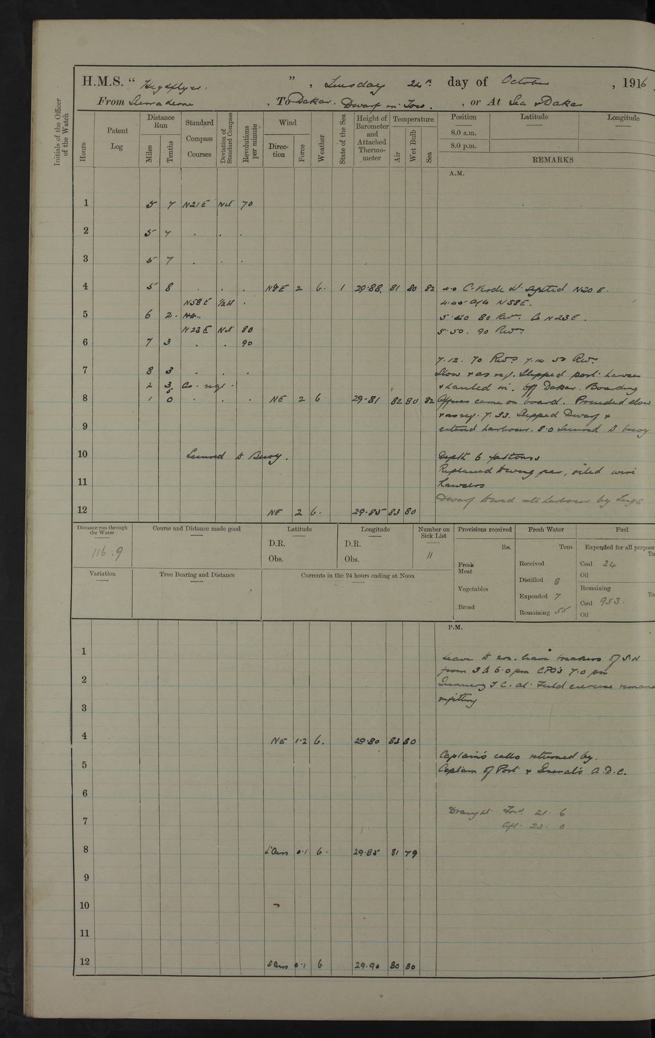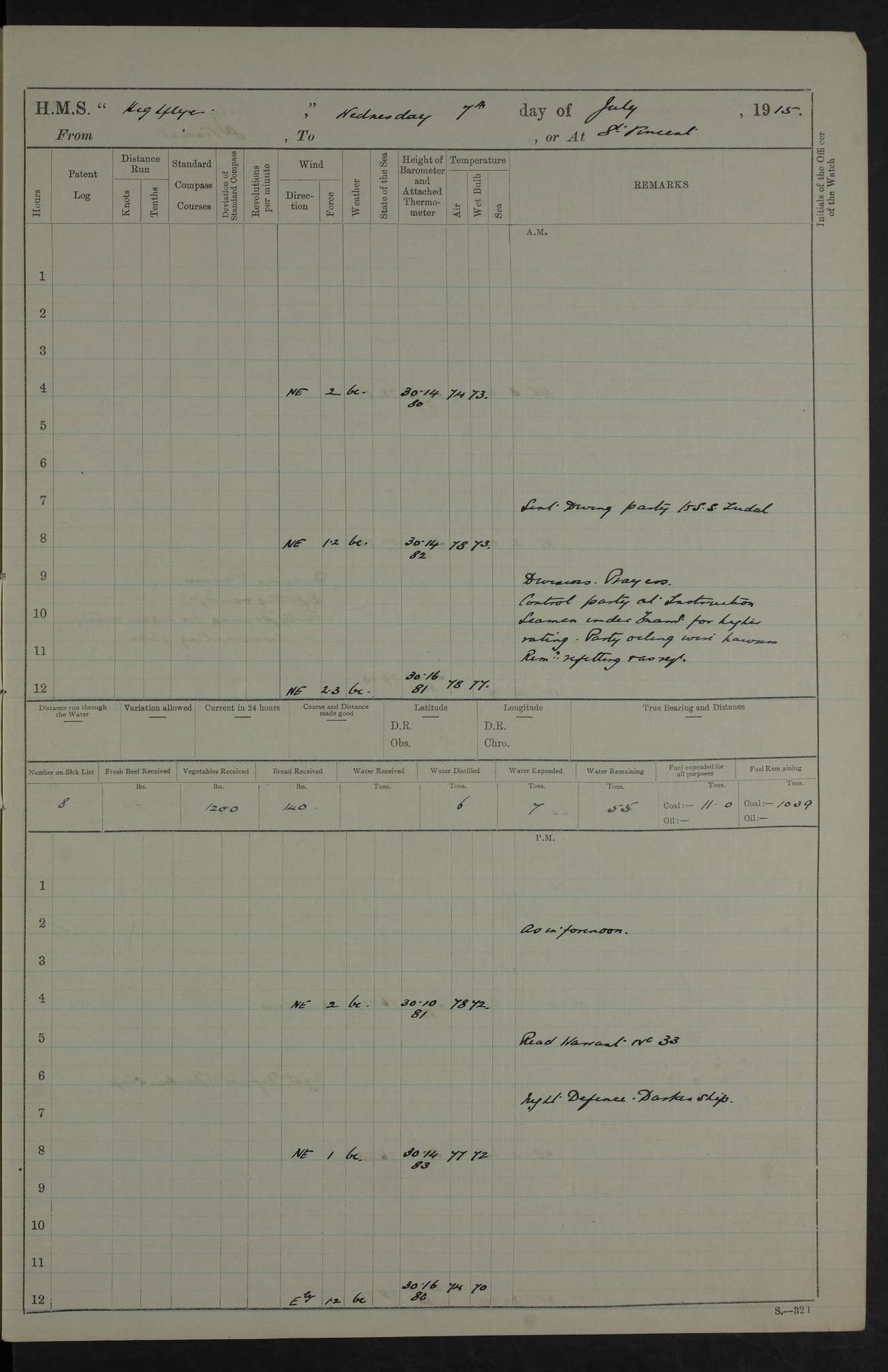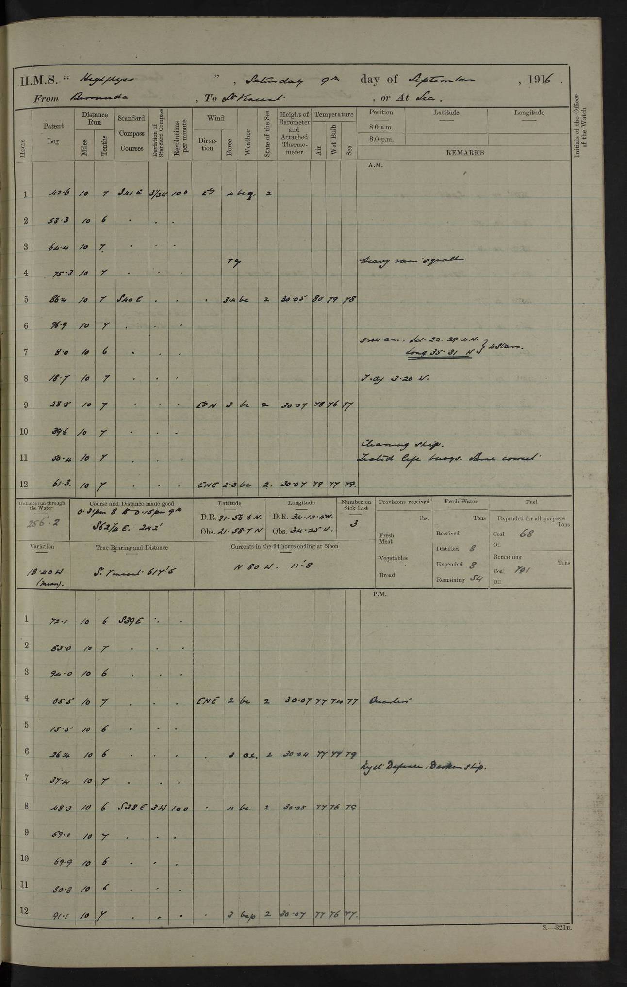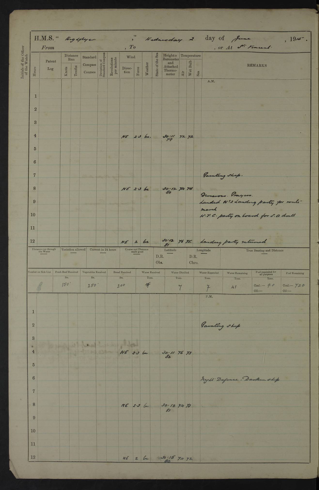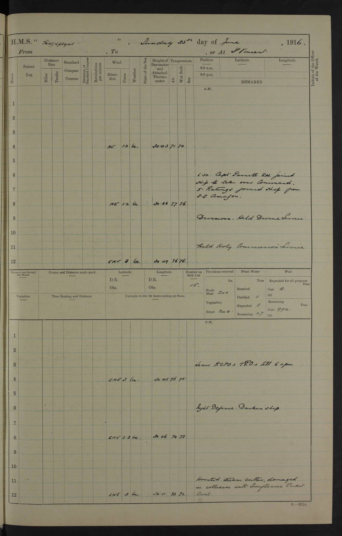 4f961154a2fc8e2def000869: (http://s3.amazonaws.com/oldweather/ADM53-44303/ADM 53-44303-011_0.jpg) 12 February 1916 Patrolling S American trade route to northward Lat 3.9, Long -29.9 7.38am: Stopped, boarded SS REINLAND (Dutch) bound southward Lat 3.13.4N, 30.01W. 4f961155a2fc8e2def00086a: (http://s3.amazonaws.com/oldweather/ADM53-44303/ADM 53-44303-011_1.jpg) 13 February 1916 Patrolling S American trade routes to northward Lat 7.8, Long -28.3 9.00am: Held Divine Service. 4f961155a2fc8e2def00086b: (http://s3.amazonaws.com/oldweather/ADM53-44303/ADM 53-44303-012_0.jpg) 14 February 1916 Patrolling trade routes. to northward Lat 11.4, Long -27.0 9.40am: 90 revs. Course as requisite for aiming rifle practice. 4f961155a2fc8e2def00086c: (http://s3.amazonaws.com/oldweather/ADM53-44303/ADM 53-44303-012_1.jpg) 15 February 1916 Towards Brava Id. Lat 14.2, Long -25.3 9.25am: Stopped, dropped target. Course and speed as requisite to carry out heavy gun practice. 4.00pm: Sighted Brava Id. vis. 1½ miles. Passed W side. 4f961156a2fc8e2def00086d: (http://s3.amazonaws.com/oldweather/ADM53-44303/ADM 53-44303-013_0.jpg) 16 February 1916 St. Vincent Lat 16.8828, Long -25.0106 7.35am: Land ahead visibility 1½’ San Antonio. 8.30am: Course as requisite for entering harbour. 11.00am: Preparing for coaling. 4f961156a2fc8e2def00086e: (http://s3.amazonaws.com/oldweather/ADM53-44303/ADM 53-44303-013_1.jpg) 17 February 1916 St. Vincent Lat 16.8828, Long -25.0106 6.00am: Collier SS PENHALE came alongside. 6.45am: Commenced coaling. 4f961156a2fc8e2def00086f: (http://s3.amazonaws.com/oldweather/ADM53-44303/ADM 53-44303-014_0.jpg) 18 February 1916 St. Vincent Lat 16.8828, Long -25.0106 Cleaning ship. 2.30pm: Drawing new fenders from SS TAMPLIN. 4f961157a2fc8e2def000870: (http://s3.amazonaws.com/oldweather/ADM53-44303/ADM 53-44303-014_1.jpg) 19 February 1916 St. Vincent Lat 16.8828, Long -25.0106 10.30am: Diving party sent to SS TAMPLIN. 4f961157a2fc8e2def000871: (http://s3.amazonaws.com/oldweather/ADM53-44303/ADM 53-44303-015_0.jpg) 20 February 1916 St. Vincent Lat 16.8828, Long -25.0106 7.00am: Sent diving party to TAMPLIN. 4f961157a2fc8e2def000872: (http://s3.amazonaws.com/oldweather/ADM53-44303/ADM 53-44303-015_1.jpg) 21 February 1916 St. Vincent to patrol Lat 16.8828, Long -25.0106 8.30am: Diving party sent to SS TAMPLIN. 6.40pm: Weighed and proceeded as requisite out of harbour. 8.30pm: Bull Point Lt. Ho. N24W, 6000 yds. 4f961158a2fc8e2def000873: (http://s3.amazonaws.com/oldweather/ADM53-44303/ADM 53-44303-016_0.jpg) 22 February 1916 Patrolling northward off San Antonio Id. Lat 18.1, Long -25.3 Painting ship and as requisite. 7.00pm: Western point San Antonio abeam 10’. 4f961158a2fc8e2def000874: (http://s3.amazonaws.com/oldweather/ADM53-44303/ADM 53-44303-016_1.jpg) 23 February 1916 Off San Antonio and St. Vincent to Tarrafal Bay Lat 16.8, Long -25.2 12.00pm: Spoke SS JASON, Brit., bound St. Vincent. 1.12pm: Boarded SS WILLEM VAN DREIL (Dutch) bound St. Vincent. 3.35pm: Stopped, came to with SB, in 33 fathoms. 4f961158a2fc8e2def000875: (http://s3.amazonaws.com/oldweather/ADM53-44303/ADM 53-44303-017_0.jpg) 24 February 1916 Tarrafal Bay, San Antonio Id. to St. Vincent Lat 16.8828, Long -25.0106 9.43 am; Proceeded. Course as requisite to St. Vincent round S end San Antonio 120 revs. 11.17am: Came to with SB in 11 fathoms. 4f961159a2fc8e2def000876: (http://s3.amazonaws.com/oldweather/ADM53-44303/ADM 53-44303-017_1.jpg) 25 February 1916 St. Vincent Lat 16.8828, Long -25.0106 Painting ship. Boys and OS at instruction. Control party at drill. 4f961159a2fc8e2def000877: (http://s3.amazonaws.com/oldweather/ADM53-44303/ADM 53-44303-018_0.jpg) 26 February 1916 St. Vincent Lat 16.8828, Long -25.0106 Cleaning ship. 4f961159a2fc8e2def000878: (http://s3.amazonaws.com/oldweather/ADM53-44303/ADM 53-44303-018_1.jpg) 27 February 1916 St. Vincent Lat 16.8828, Long -25.0106 9.30am: Held Divine Service. 4f96115aa2fc8e2def000879: (http://s3.amazonaws.com/oldweather/ADM53-44303/ADM 53-44303-019_0.jpg) 28 February 1916 St. Vincent Lat 16.8828, Long -25.0106 Boys and OS at instruction. Control party at drill. Remainder preparing for coaling. 2.00pm: Diving party at SS TAMPLIN. 4f96115aa2fc8e2def00087a: (http://s3.amazonaws.com/oldweather/ADM53-44303/ADM 53-44303-019_1.jpg) 29 February 1916 St. Vincent Lat 16.8828, Long -25.0106 7.15am: Commenced coaling from lighter. 8.00am: HMS SWIFTSURE arrived. USS CHESTER arrived. 4f96115aa2fc8e2def00087b: (http://s3.amazonaws.com/oldweather/ADM53-44303/ADM 53-44303-020_0.jpg) 4f96115ba2fc8e2def00087c: (http://s3.amazonaws.com/oldweather/ADM53-44303/ADM 53-44303-020_1.jpg) 4f96115ba2fc8e2def00087d: (http://s3.amazonaws.com/oldweather/ADM53-44303/ADM 53-44303-021_0.jpg) 4f96115ba2fc8e2def00087e: (http://s3.amazonaws.com/oldweather/ADM53-44303/ADM 53-44303-021_1.jpg) LOGS FOR MARCH 1916 4f96115ca2fc8e2def00087f: (http://s3.amazonaws.com/oldweather/ADM53-44304/ADM 53-44304-001_0.jpg) 4f96115ca2fc8e2def000880: (http://s3.amazonaws.com/oldweather/ADM53-44304/ADM 53-44304-001_1.jpg) 4f96115ca2fc8e2def000881: (http://s3.amazonaws.com/oldweather/ADM53-44304/ADM 53-44304-002_0.jpg) 4f96115da2fc8e2def000882: (http://s3.amazonaws.com/oldweather/ADM53-44304/ADM 53-44304-002_1.jpg) 4f96115da2fc8e2def000883: (http://s3.amazonaws.com/oldweather/ADM53-44304/ADM 53-44304-003_0.jpg) 4f96115da2fc8e2def000884: (http://s3.amazonaws.com/oldweather/ADM53-44304/ADM 53-44304-003_1.jpg) 4f96115da2fc8e2def000885: (http://s3.amazonaws.com/oldweather/ADM53-44304/ADM 53-44304-004_0.jpg) 4f96115ea2fc8e2def000886: (http://s3.amazonaws.com/oldweather/ADM53-44304/ADM 53-44304-004_1.jpg) 4f96115ea2fc8e2def000887: (http://s3.amazonaws.com/oldweather/ADM53-44304/ADM 53-44304-005_0.jpg) 4f96115ea2fc8e2def000888: (http://s3.amazonaws.com/oldweather/ADM53-44304/ADM 53-44304-005_1.jpg) 1 March 1916 St. Vincent Lat 16.8828, Long -25.0106 9.30pm: Discharged 1 Officer and 1 Tel. Rating to SS NORTHWAITE. 10.00pm: Surgeon Hobbs joined ship fro