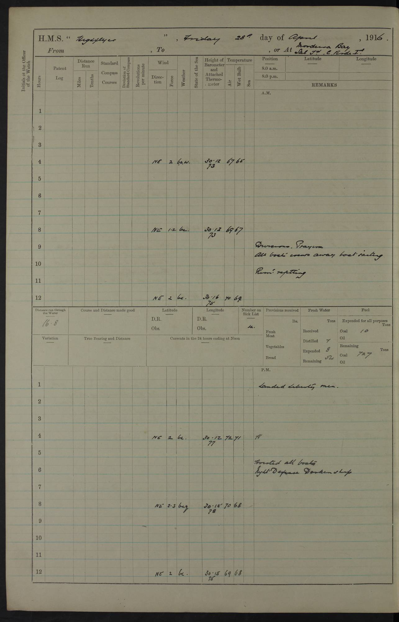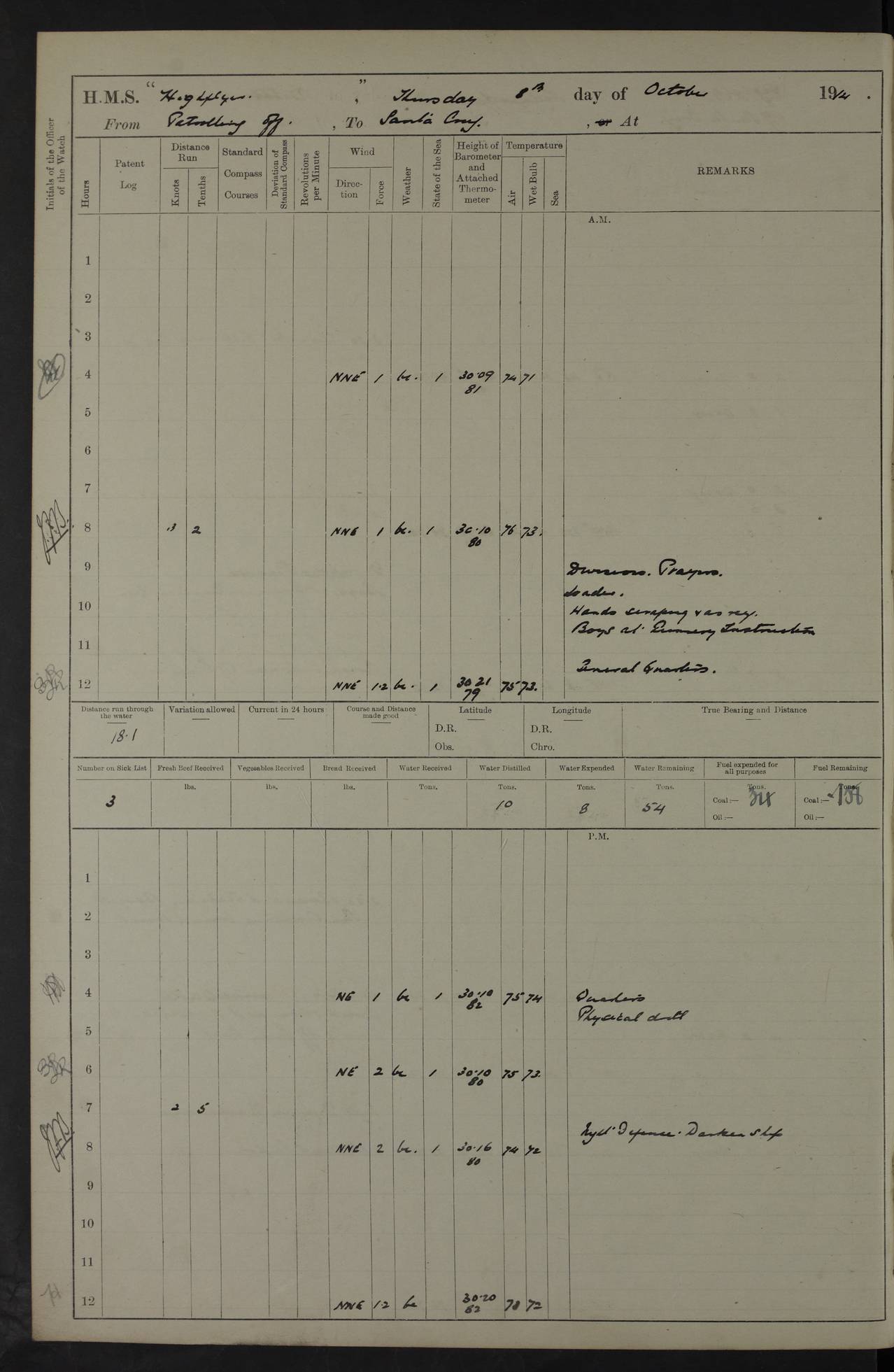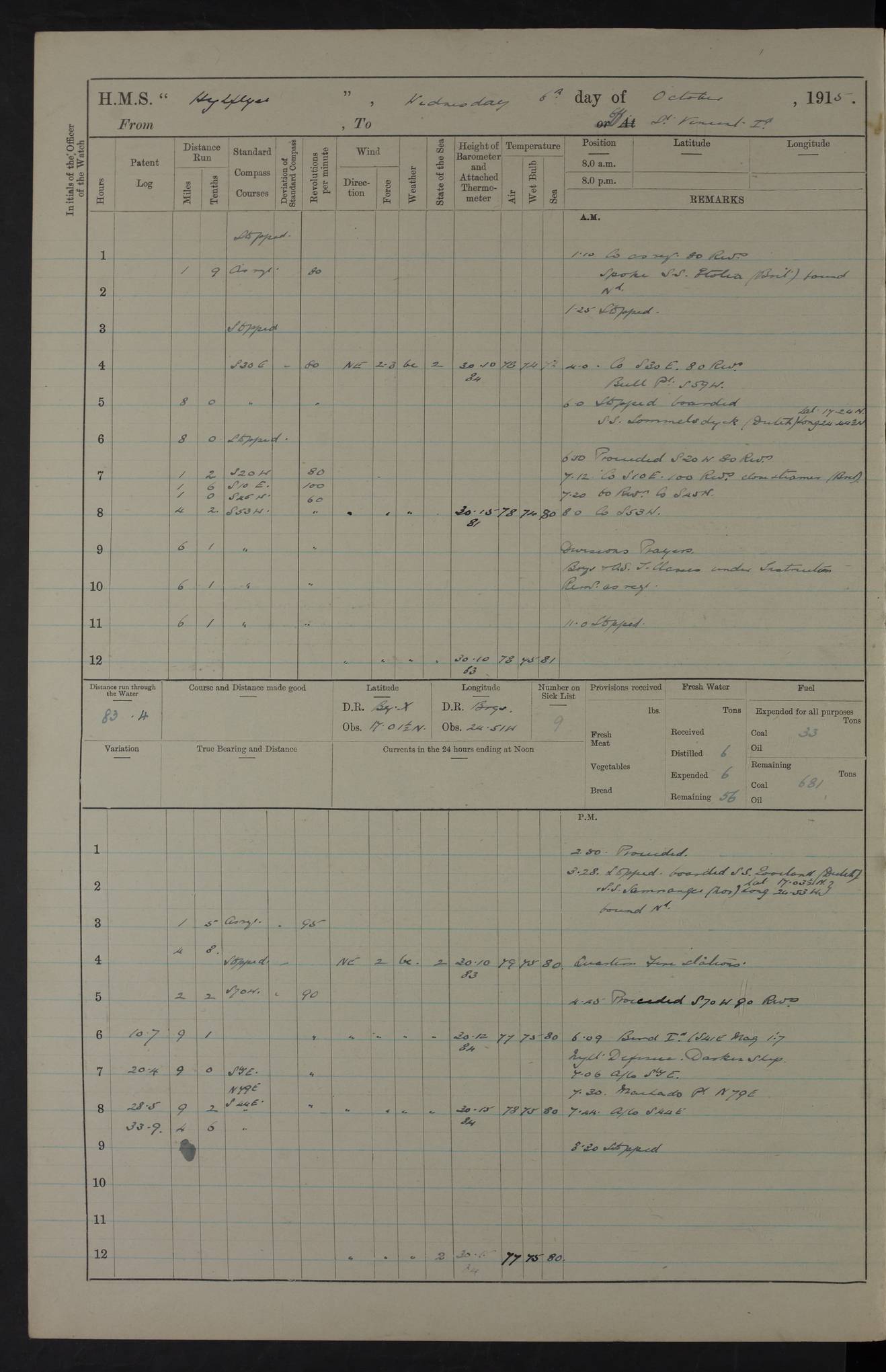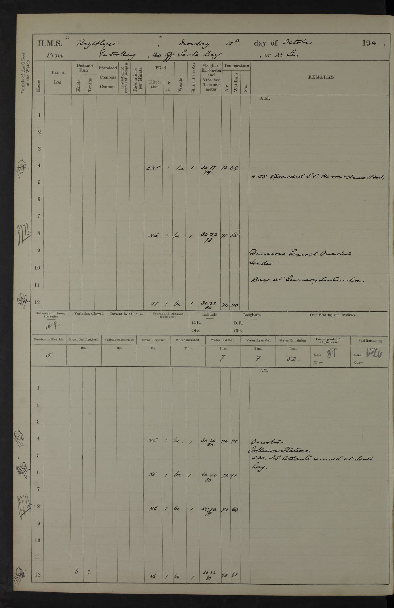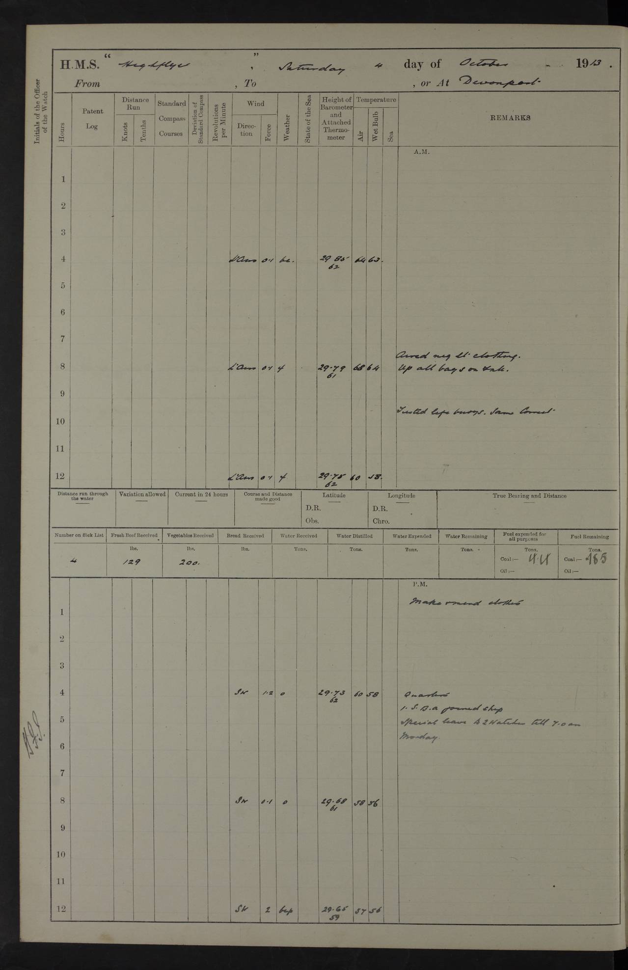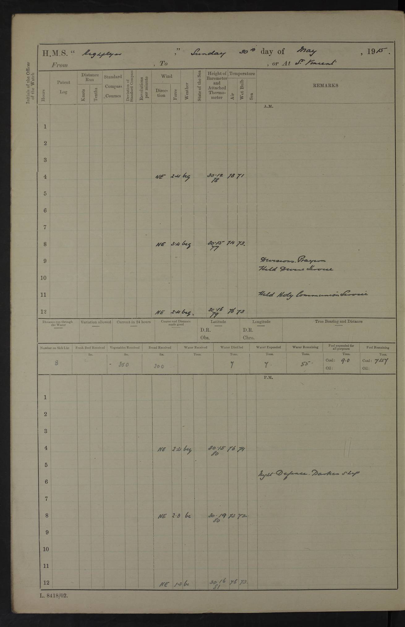 4f961154a2fc8e2def000869: (http://s3.amazonaws.com/oldweather/ADM53-44303/ADM 53-44303-011_0.jpg) 12 February 1916 Patrolling S American trade route to northward Lat 3.9, Long -29.9 7.38am: Stopped, boarded SS REINLAND (Dutch) bound southward Lat 3.13.4N, 30.01W. 4f961155a2fc8e2def00086a: (http://s3.amazonaws.com/oldweather/ADM53-44303/ADM 53-44303-011_1.jpg) 13 February 1916 Patrolling S American trade routes to northward Lat 7.8, Long -28.3 9.00am: Held Divine Service. 4f961155a2fc8e2def00086b: (http://s3.amazonaws.com/oldweather/ADM53-44303/ADM 53-44303-012_0.jpg) 14 February 1916 Patrolling trade routes. to northward Lat 11.4, Long -27.0 9.40am: 90 revs. Course as requisite for aiming rifle practice. 4f961155a2fc8e2def00086c: (http://s3.amazonaws.com/oldweather/ADM53-44303/ADM 53-44303-012_1.jpg) 15 February 1916 Towards Brava Id. Lat 14.2, Long -25.3 9.25am: Stopped, dropped target. Course and speed as requisite to carry out heavy gun practice. 4.00pm: Sighted Brava Id. vis. 1½ miles. Passed W side. 4f961156a2fc8e2def00086d: (http://s3.amazonaws.com/oldweather/ADM53-44303/ADM 53-44303-013_0.jpg) 16 February 1916 St. Vincent Lat 16.8828, Long -25.0106 7.35am: Land ahead visibility 1½’ San Antonio. 8.30am: Course as requisite for entering harbour. 11.00am: Preparing for coaling. 4f961156a2fc8e2def00086e: (http://s3.amazonaws.com/oldweather/ADM53-44303/ADM 53-44303-013_1.jpg) 17 February 1916 St. Vincent Lat 16.8828, Long -25.0106 6.00am: Collier SS PENHALE came alongside. 6.45am: Commenced coaling. 4f961156a2fc8e2def00086f: (http://s3.amazonaws.com/oldweather/ADM53-44303/ADM 53-44303-014_0.jpg) 18 February 1916 St. Vincent Lat 16.8828, Long -25.0106 Cleaning ship. 2.30pm: Drawing new fenders from SS TAMPLIN. 4f961157a2fc8e2def000870: (http://s3.amazonaws.com/oldweather/ADM53-44303/ADM 53-44303-014_1.jpg) 19 February 1916 St. Vincent Lat 16.8828, Long -25.0106 10.30am: Diving party sent to SS TAMPLIN. 4f961157a2fc8e2def000871: (http://s3.amazonaws.com/oldweather/ADM53-44303/ADM 53-44303-015_0.jpg) 20 February 1916 St. Vincent Lat 16.8828, Long -25.0106 7.00am: Sent diving party to TAMPLIN. 4f961157a2fc8e2def000872: (http://s3.amazonaws.com/oldweather/ADM53-44303/ADM 53-44303-015_1.jpg) 21 February 1916 St. Vincent to patrol Lat 16.8828, Long -25.0106 8.30am: Diving party sent to SS TAMPLIN. 6.40pm: Weighed and proceeded as requisite out of harbour. 8.30pm: Bull Point Lt. Ho. N24W, 6000 yds. 4f961158a2fc8e2def000873: (http://s3.amazonaws.com/oldweather/ADM53-44303/ADM 53-44303-016_0.jpg) 22 February 1916 Patrolling northward off San Antonio Id. Lat 18.1, Long -25.3 Painting ship and as requisite. 7.00pm: Western point San Antonio abeam 10’. 4f961158a2fc8e2def000874: (http://s3.amazonaws.com/oldweather/ADM53-44303/ADM 53-44303-016_1.jpg) 23 February 1916 Off San Antonio and St. Vincent to Tarrafal Bay Lat 16.8, Long -25.2 12.00pm: Spoke SS JASON, Brit., bound St. Vincent. 1.12pm: Boarded SS WILLEM VAN DREIL (Dutch) bound St. Vincent. 3.35pm: Stopped, came to with SB, in 33 fathoms. 4f961158a2fc8e2def000875: (http://s3.amazonaws.com/oldweather/ADM53-44303/ADM 53-44303-017_0.jpg) 24 February 1916 Tarrafal Bay, San Antonio Id. to St. Vincent Lat 16.8828, Long -25.0106 9.43 am; Proceeded. Course as requisite to St. Vincent round S end San Antonio 120 revs. 11.17am: Came to with SB in 11 fathoms. 4f961159a2fc8e2def000876: (http://s3.amazonaws.com/oldweather/ADM53-44303/ADM 53-44303-017_1.jpg) 25 February 1916 St. Vincent Lat 16.8828, Long -25.0106 Painting ship. Boys and OS at instruction. Control party at drill. 4f961159a2fc8e2def000877: (http://s3.amazonaws.com/oldweather/ADM53-44303/ADM 53-44303-018_0.jpg) 26 February 1916 St. Vincent Lat 16.8828, Long -25.0106 Cleaning ship. 4f961159a2fc8e2def000878: (http://s3.amazonaws.com/oldweather/ADM53-44303/ADM 53-44303-018_1.jpg) 27 February 1916 St. Vincent Lat 16.8828, Long -25.0106 9.30am: Held Divine Service. 4f96115aa2fc8e2def000879: (http://s3.amazonaws.com/oldweather/ADM53-44303/ADM 53-44303-019_0.jpg) 28 February 1916 St. Vincent Lat 16.8828, Long -25.0106 Boys and OS at instruction. Control party at drill. Remainder preparing for coaling. 2.00pm: Diving party at SS TAMPLIN. 4f96115aa2fc8e2def00087a: (http://s3.amazonaws.com/oldweather/ADM53-44303/ADM 53-44303-019_1.jpg) 29 February 1916 St. Vincent Lat 16.8828, Long -25.0106 7.15am: Commenced coaling from lighter. 8.00am: HMS SWIFTSURE arrived. USS CHESTER arrived. 4f96115aa2fc8e2def00087b: (http://s3.amazonaws.com/oldweather/ADM53-44303/ADM 53-44303-020_0.jpg) 4f96115ba2fc8e2def00087c: (http://s3.amazonaws.com/oldweather/ADM53-44303/ADM 53-44303-020_1.jpg) 4f96115ba2fc8e2def00087d: (http://s3.amazonaws.com/oldweather/ADM53-44303/ADM 53-44303-021_0.jpg) 4f96115ba2fc8e2def00087e: (http://s3.amazonaws.com/oldweather/ADM53-44303/ADM 53-44303-021_1.jpg) LOGS FOR MARCH 1916 4f96115ca2fc8e2def00087f: (http://s3.amazonaws.com/oldweather/ADM53-44304/ADM 53-44304-001_0.jpg) 4f96115ca2fc8e2def000880: (http://s3.amazonaws.com/oldweather/ADM53-44304/ADM 53-44304-001_1.jpg) 4f96115ca2fc8e2def000881: (http://s3.amazonaws.com/oldweather/ADM53-44304/ADM 53-44304-002_0.jpg) 4f96115da2fc8e2def000882: (http://s3.amazonaws.com/oldweather/ADM53-44304/ADM 53-44304-002_1.jpg) 4f96115da2fc8e2def000883: (http://s3.amazonaws.com/oldweather/ADM53-44304/ADM 53-44304-003_0.jpg) 4f96115da2fc8e2def000884: (http://s3.amazonaws.com/oldweather/ADM53-44304/ADM 53-44304-003_1.jpg) 4f96115da2fc8e2def000885: (http://s3.amazonaws.com/oldweather/ADM53-44304/ADM 53-44304-004_0.jpg) 4f96115ea2fc8e2def000886: (http://s3.amazonaws.com/oldweather/ADM53-44304/ADM 53-44304-004_1.jpg) 4f96115ea2fc8e2def000887: (http://s3.amazonaws.com/oldweather/ADM53-44304/ADM 53-44304-005_0.jpg) 4f96115ea2fc8e2def000888: (http://s3.amazonaws.com/oldweather/ADM53-44304/ADM 53-44304-005_1.jpg) 1 March 1916 St. Vincent Lat 16.8828, Long -25.0106 9.30pm: Discharged 1 Officer and 1 Tel. Rating to SS NORTHWAITE. 10.00pm: Surgeon Hobbs joined ship fro