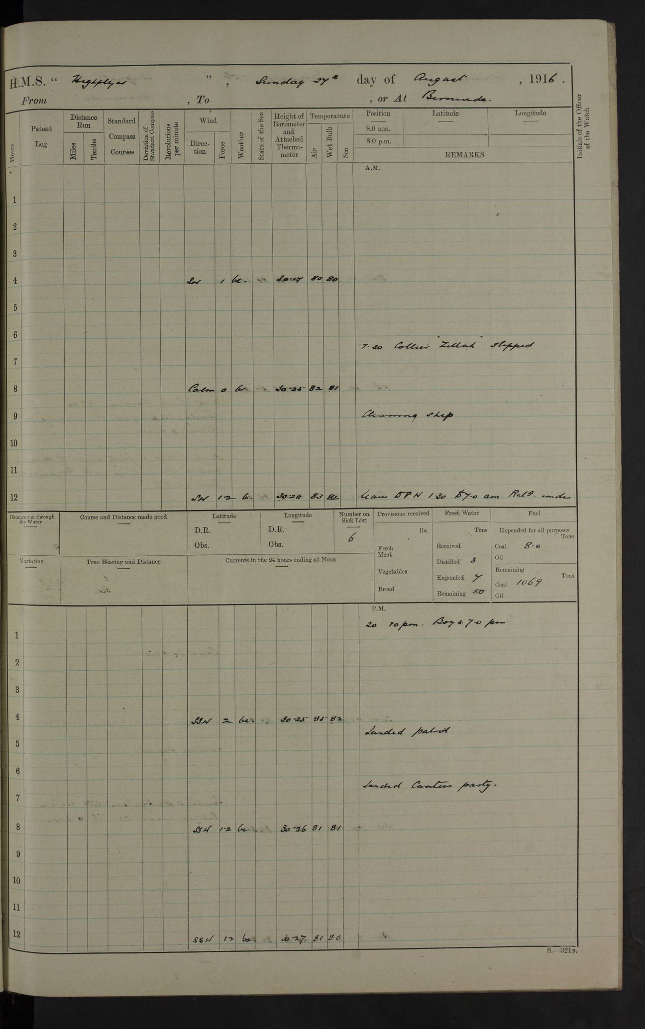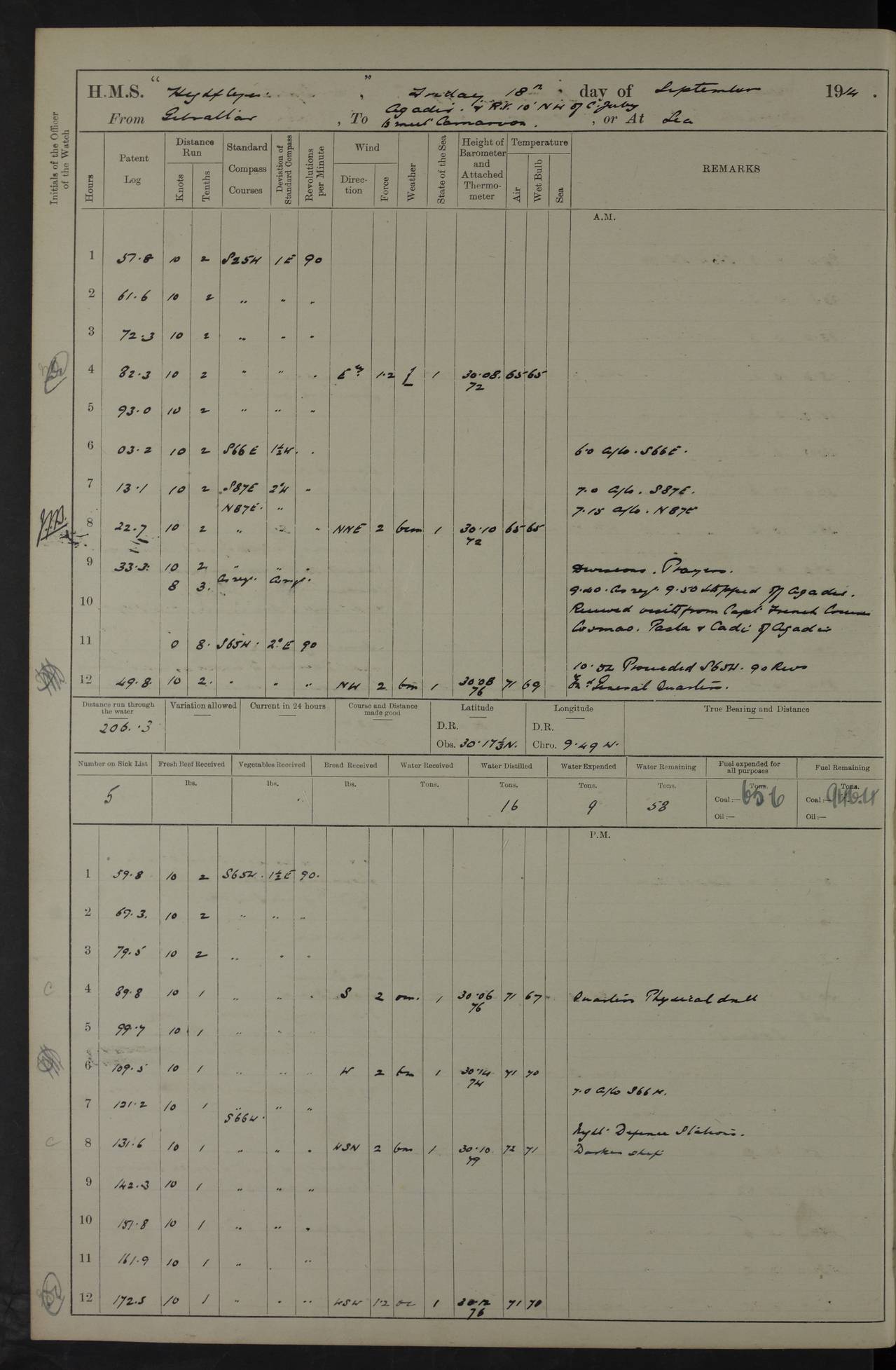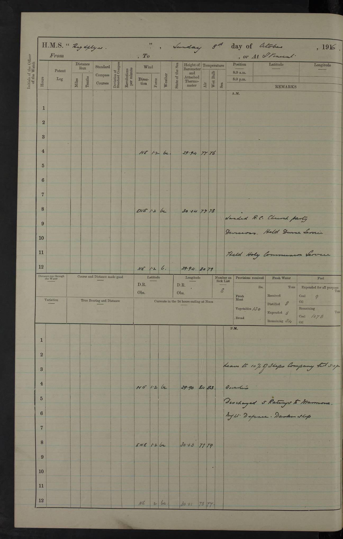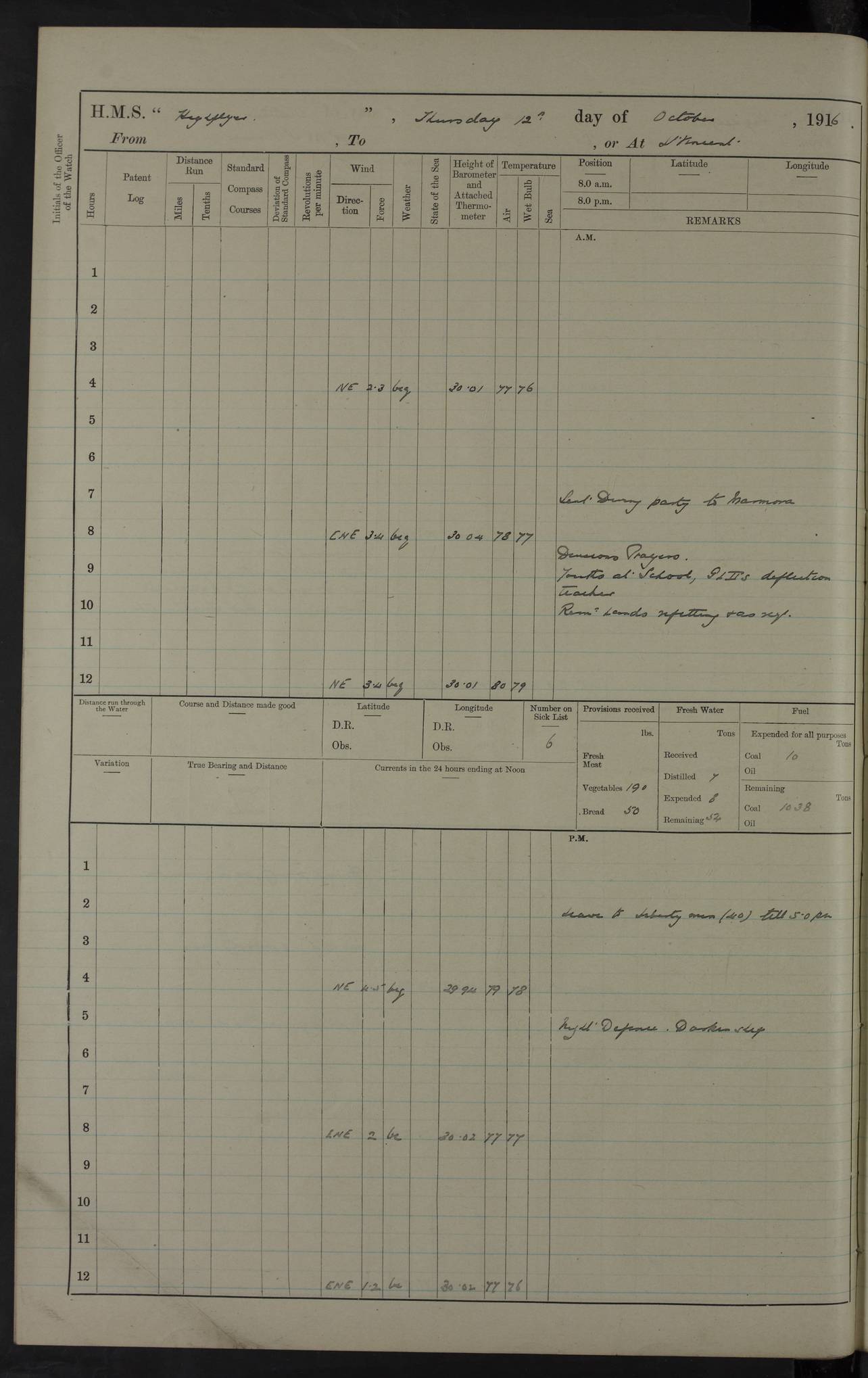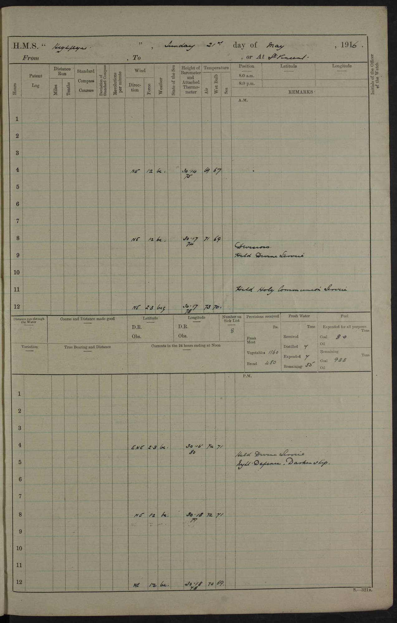 4f961154a2fc8e2def000869: (http://s3.amazonaws.com/oldweather/ADM53-44303/ADM 53-44303-011_0.jpg) 12 February 1916 Patrolling S American trade route to northward Lat 3.9, Long -29.9 7.38am: Stopped, boarded SS REINLAND (Dutch) bound southward Lat 3.13.4N, 30.01W. 4f961155a2fc8e2def00086a: (http://s3.amazonaws.com/oldweather/ADM53-44303/ADM 53-44303-011_1.jpg) 13 February 1916 Patrolling S American trade routes to northward Lat 7.8, Long -28.3 9.00am: Held Divine Service. 4f961155a2fc8e2def00086b: (http://s3.amazonaws.com/oldweather/ADM53-44303/ADM 53-44303-012_0.jpg) 14 February 1916 Patrolling trade routes. to northward Lat 11.4, Long -27.0 9.40am: 90 revs. Course as requisite for aiming rifle practice. 4f961155a2fc8e2def00086c: (http://s3.amazonaws.com/oldweather/ADM53-44303/ADM 53-44303-012_1.jpg) 15 February 1916 Towards Brava Id. Lat 14.2, Long -25.3 9.25am: Stopped, dropped target. Course and speed as requisite to carry out heavy gun practice. 4.00pm: Sighted Brava Id. vis. 1½ miles. Passed W side. 4f961156a2fc8e2def00086d: (http://s3.amazonaws.com/oldweather/ADM53-44303/ADM 53-44303-013_0.jpg) 16 February 1916 St. Vincent Lat 16.8828, Long -25.0106 7.35am: Land ahead visibility 1½’ San Antonio. 8.30am: Course as requisite for entering harbour. 11.00am: Preparing for coaling. 4f961156a2fc8e2def00086e: (http://s3.amazonaws.com/oldweather/ADM53-44303/ADM 53-44303-013_1.jpg) 17 February 1916 St. Vincent Lat 16.8828, Long -25.0106 6.00am: Collier SS PENHALE came alongside. 6.45am: Commenced coaling. 4f961156a2fc8e2def00086f: (http://s3.amazonaws.com/oldweather/ADM53-44303/ADM 53-44303-014_0.jpg) 18 February 1916 St. Vincent Lat 16.8828, Long -25.0106 Cleaning ship. 2.30pm: Drawing new fenders from SS TAMPLIN. 4f961157a2fc8e2def000870: (http://s3.amazonaws.com/oldweather/ADM53-44303/ADM 53-44303-014_1.jpg) 19 February 1916 St. Vincent Lat 16.8828, Long -25.0106 10.30am: Diving party sent to SS TAMPLIN. 4f961157a2fc8e2def000871: (http://s3.amazonaws.com/oldweather/ADM53-44303/ADM 53-44303-015_0.jpg) 20 February 1916 St. Vincent Lat 16.8828, Long -25.0106 7.00am: Sent diving party to TAMPLIN. 4f961157a2fc8e2def000872: (http://s3.amazonaws.com/oldweather/ADM53-44303/ADM 53-44303-015_1.jpg) 21 February 1916 St. Vincent to patrol Lat 16.8828, Long -25.0106 8.30am: Diving party sent to SS TAMPLIN. 6.40pm: Weighed and proceeded as requisite out of harbour. 8.30pm: Bull Point Lt. Ho. N24W, 6000 yds. 4f961158a2fc8e2def000873: (http://s3.amazonaws.com/oldweather/ADM53-44303/ADM 53-44303-016_0.jpg) 22 February 1916 Patrolling northward off San Antonio Id. Lat 18.1, Long -25.3 Painting ship and as requisite. 7.00pm: Western point San Antonio abeam 10’. 4f961158a2fc8e2def000874: (http://s3.amazonaws.com/oldweather/ADM53-44303/ADM 53-44303-016_1.jpg) 23 February 1916 Off San Antonio and St. Vincent to Tarrafal Bay Lat 16.8, Long -25.2 12.00pm: Spoke SS JASON, Brit., bound St. Vincent. 1.12pm: Boarded SS WILLEM VAN DREIL (Dutch) bound St. Vincent. 3.35pm: Stopped, came to with SB, in 33 fathoms. 4f961158a2fc8e2def000875: (http://s3.amazonaws.com/oldweather/ADM53-44303/ADM 53-44303-017_0.jpg) 24 February 1916 Tarrafal Bay, San Antonio Id. to St. Vincent Lat 16.8828, Long -25.0106 9.43 am; Proceeded. Course as requisite to St. Vincent round S end San Antonio 120 revs. 11.17am: Came to with SB in 11 fathoms. 4f961159a2fc8e2def000876: (http://s3.amazonaws.com/oldweather/ADM53-44303/ADM 53-44303-017_1.jpg) 25 February 1916 St. Vincent Lat 16.8828, Long -25.0106 Painting ship. Boys and OS at instruction. Control party at drill. 4f961159a2fc8e2def000877: (http://s3.amazonaws.com/oldweather/ADM53-44303/ADM 53-44303-018_0.jpg) 26 February 1916 St. Vincent Lat 16.8828, Long -25.0106 Cleaning ship. 4f961159a2fc8e2def000878: (http://s3.amazonaws.com/oldweather/ADM53-44303/ADM 53-44303-018_1.jpg) 27 February 1916 St. Vincent Lat 16.8828, Long -25.0106 9.30am: Held Divine Service. 4f96115aa2fc8e2def000879: (http://s3.amazonaws.com/oldweather/ADM53-44303/ADM 53-44303-019_0.jpg) 28 February 1916 St. Vincent Lat 16.8828, Long -25.0106 Boys and OS at instruction. Control party at drill. Remainder preparing for coaling. 2.00pm: Diving party at SS TAMPLIN. 4f96115aa2fc8e2def00087a: (http://s3.amazonaws.com/oldweather/ADM53-44303/ADM 53-44303-019_1.jpg) 29 February 1916 St. Vincent Lat 16.8828, Long -25.0106 7.15am: Commenced coaling from lighter. 8.00am: HMS SWIFTSURE arrived. USS CHESTER arrived. 4f96115aa2fc8e2def00087b: (http://s3.amazonaws.com/oldweather/ADM53-44303/ADM 53-44303-020_0.jpg) 4f96115ba2fc8e2def00087c: (http://s3.amazonaws.com/oldweather/ADM53-44303/ADM 53-44303-020_1.jpg) 4f96115ba2fc8e2def00087d: (http://s3.amazonaws.com/oldweather/ADM53-44303/ADM 53-44303-021_0.jpg) 4f96115ba2fc8e2def00087e: (http://s3.amazonaws.com/oldweather/ADM53-44303/ADM 53-44303-021_1.jpg) LOGS FOR MARCH 1916 4f96115ca2fc8e2def00087f: (http://s3.amazonaws.com/oldweather/ADM53-44304/ADM 53-44304-001_0.jpg) 4f96115ca2fc8e2def000880: (http://s3.amazonaws.com/oldweather/ADM53-44304/ADM 53-44304-001_1.jpg) 4f96115ca2fc8e2def000881: (http://s3.amazonaws.com/oldweather/ADM53-44304/ADM 53-44304-002_0.jpg) 4f96115da2fc8e2def000882: (http://s3.amazonaws.com/oldweather/ADM53-44304/ADM 53-44304-002_1.jpg) 4f96115da2fc8e2def000883: (http://s3.amazonaws.com/oldweather/ADM53-44304/ADM 53-44304-003_0.jpg) 4f96115da2fc8e2def000884: (http://s3.amazonaws.com/oldweather/ADM53-44304/ADM 53-44304-003_1.jpg) 4f96115da2fc8e2def000885: (http://s3.amazonaws.com/oldweather/ADM53-44304/ADM 53-44304-004_0.jpg) 4f96115ea2fc8e2def000886: (http://s3.amazonaws.com/oldweather/ADM53-44304/ADM 53-44304-004_1.jpg) 4f96115ea2fc8e2def000887: (http://s3.amazonaws.com/oldweather/ADM53-44304/ADM 53-44304-005_0.jpg) 4f96115ea2fc8e2def000888: (http://s3.amazonaws.com/oldweather/ADM53-44304/ADM 53-44304-005_1.jpg) 1 March 1916 St. Vincent Lat 16.8828, Long -25.0106 9.30pm: Discharged 1 Officer and 1 Tel. Rating to SS NORTHWAITE. 10.00pm: Surgeon Hobbs joined ship fro