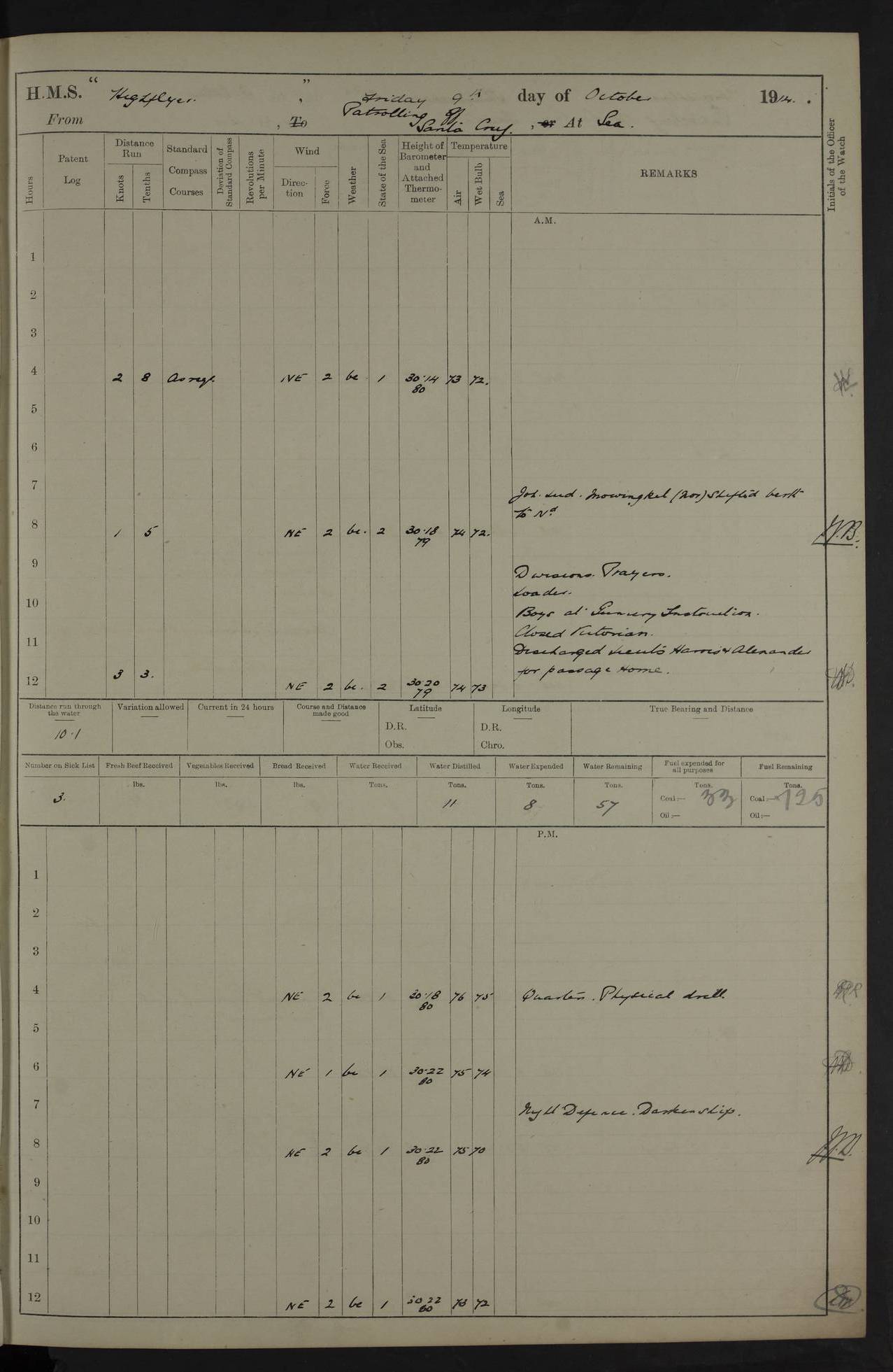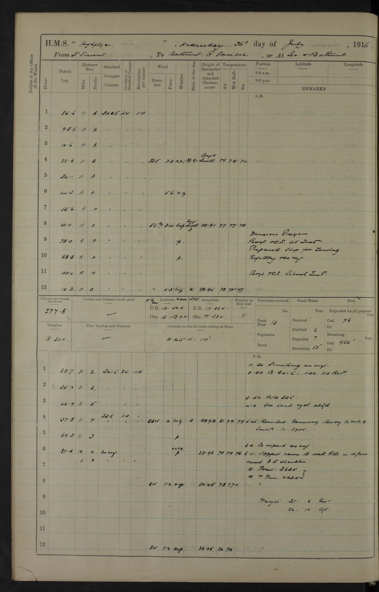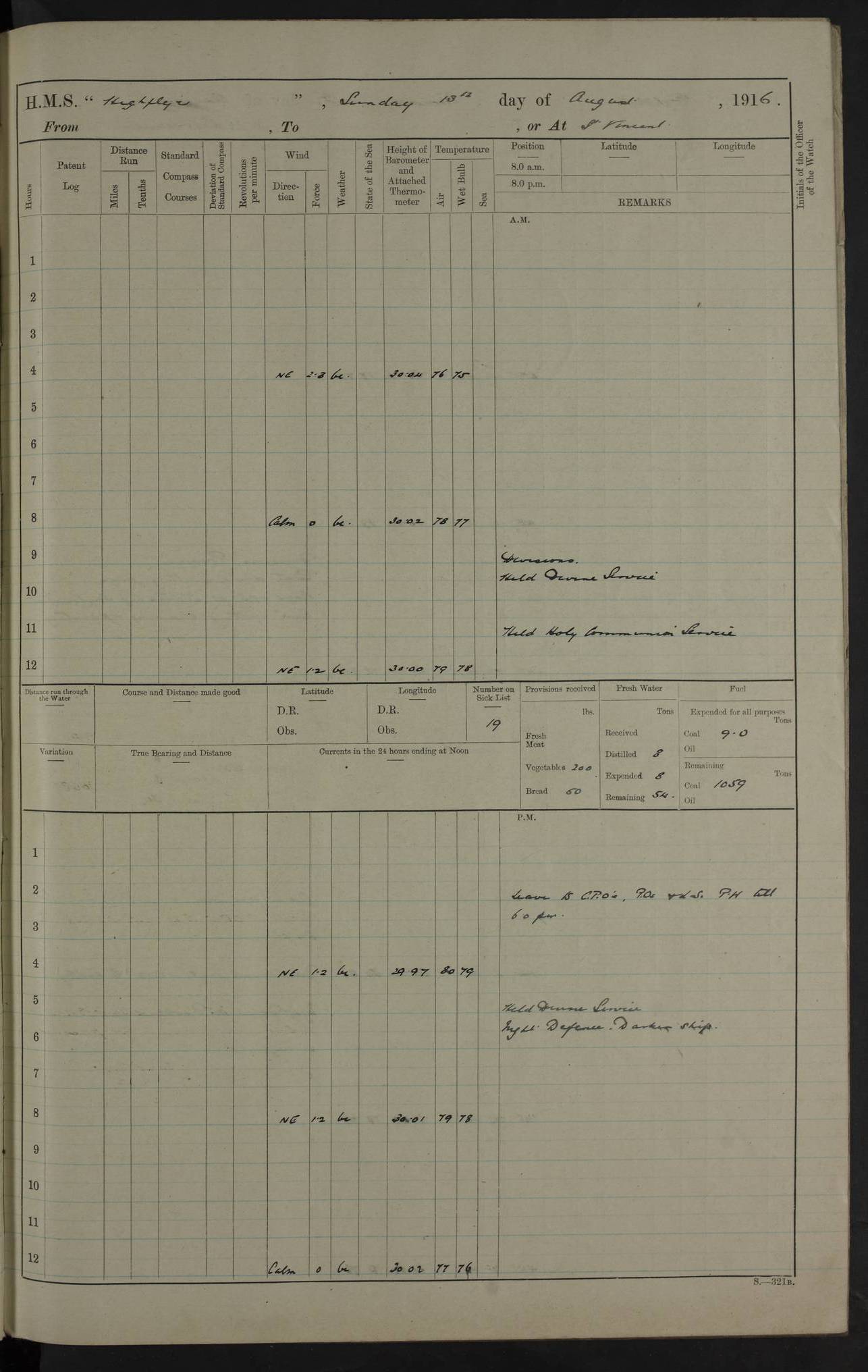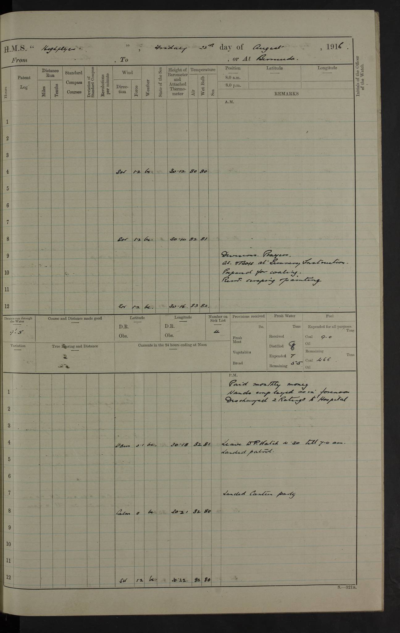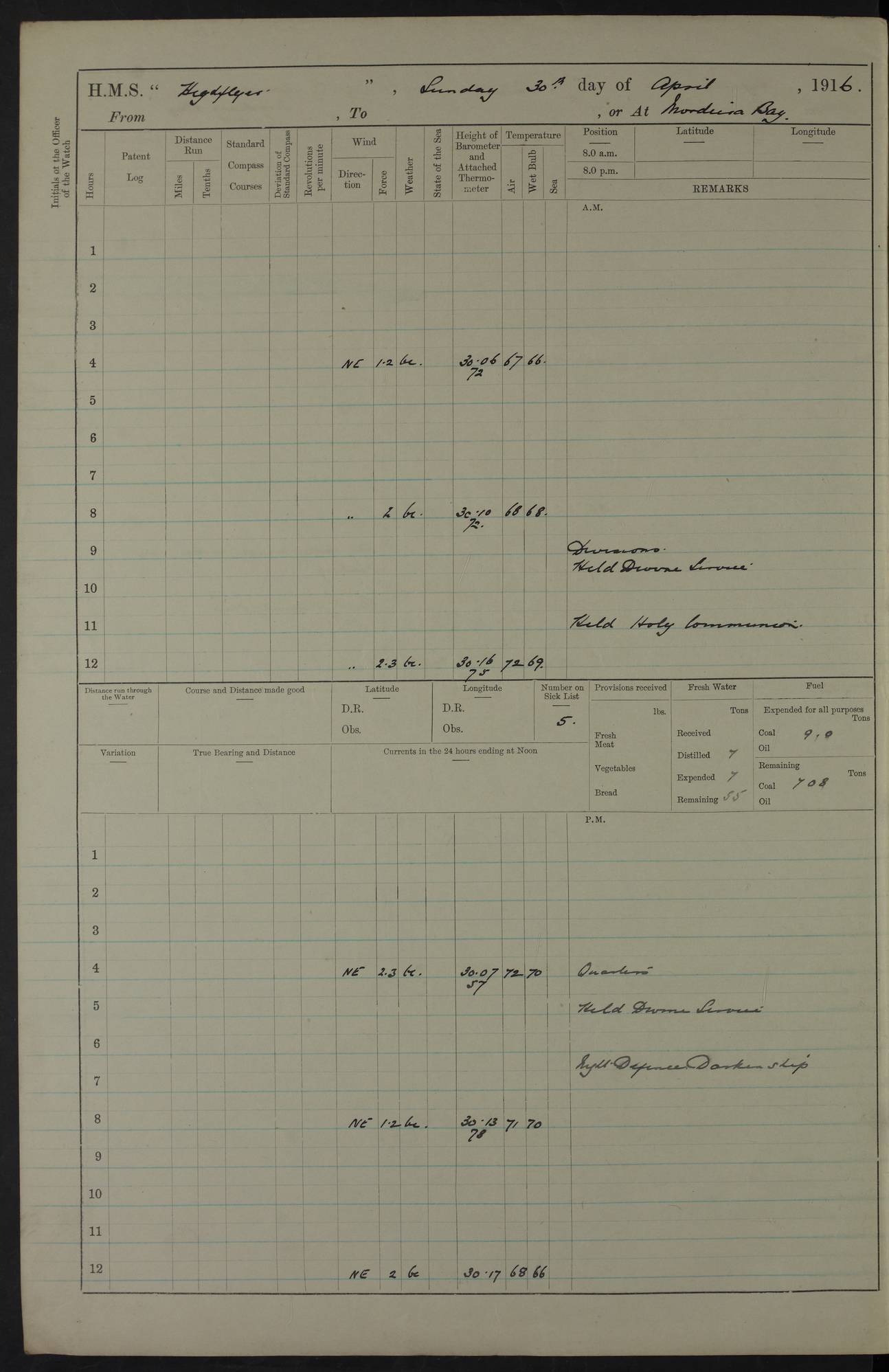 4f961154a2fc8e2def000869: (http://s3.amazonaws.com/oldweather/ADM53-44303/ADM 53-44303-011_0.jpg) 12 February 1916 Patrolling S American trade route to northward Lat 3.9, Long -29.9 7.38am: Stopped, boarded SS REINLAND (Dutch) bound southward Lat 3.13.4N, 30.01W. 4f961155a2fc8e2def00086a: (http://s3.amazonaws.com/oldweather/ADM53-44303/ADM 53-44303-011_1.jpg) 13 February 1916 Patrolling S American trade routes to northward Lat 7.8, Long -28.3 9.00am: Held Divine Service. 4f961155a2fc8e2def00086b: (http://s3.amazonaws.com/oldweather/ADM53-44303/ADM 53-44303-012_0.jpg) 14 February 1916 Patrolling trade routes. to northward Lat 11.4, Long -27.0 9.40am: 90 revs. Course as requisite for aiming rifle practice. 4f961155a2fc8e2def00086c: (http://s3.amazonaws.com/oldweather/ADM53-44303/ADM 53-44303-012_1.jpg) 15 February 1916 Towards Brava Id. Lat 14.2, Long -25.3 9.25am: Stopped, dropped target. Course and speed as requisite to carry out heavy gun practice. 4.00pm: Sighted Brava Id. vis. 1½ miles. Passed W side. 4f961156a2fc8e2def00086d: (http://s3.amazonaws.com/oldweather/ADM53-44303/ADM 53-44303-013_0.jpg) 16 February 1916 St. Vincent Lat 16.8828, Long -25.0106 7.35am: Land ahead visibility 1½’ San Antonio. 8.30am: Course as requisite for entering harbour. 11.00am: Preparing for coaling. 4f961156a2fc8e2def00086e: (http://s3.amazonaws.com/oldweather/ADM53-44303/ADM 53-44303-013_1.jpg) 17 February 1916 St. Vincent Lat 16.8828, Long -25.0106 6.00am: Collier SS PENHALE came alongside. 6.45am: Commenced coaling. 4f961156a2fc8e2def00086f: (http://s3.amazonaws.com/oldweather/ADM53-44303/ADM 53-44303-014_0.jpg) 18 February 1916 St. Vincent Lat 16.8828, Long -25.0106 Cleaning ship. 2.30pm: Drawing new fenders from SS TAMPLIN. 4f961157a2fc8e2def000870: (http://s3.amazonaws.com/oldweather/ADM53-44303/ADM 53-44303-014_1.jpg) 19 February 1916 St. Vincent Lat 16.8828, Long -25.0106 10.30am: Diving party sent to SS TAMPLIN. 4f961157a2fc8e2def000871: (http://s3.amazonaws.com/oldweather/ADM53-44303/ADM 53-44303-015_0.jpg) 20 February 1916 St. Vincent Lat 16.8828, Long -25.0106 7.00am: Sent diving party to TAMPLIN. 4f961157a2fc8e2def000872: (http://s3.amazonaws.com/oldweather/ADM53-44303/ADM 53-44303-015_1.jpg) 21 February 1916 St. Vincent to patrol Lat 16.8828, Long -25.0106 8.30am: Diving party sent to SS TAMPLIN. 6.40pm: Weighed and proceeded as requisite out of harbour. 8.30pm: Bull Point Lt. Ho. N24W, 6000 yds. 4f961158a2fc8e2def000873: (http://s3.amazonaws.com/oldweather/ADM53-44303/ADM 53-44303-016_0.jpg) 22 February 1916 Patrolling northward off San Antonio Id. Lat 18.1, Long -25.3 Painting ship and as requisite. 7.00pm: Western point San Antonio abeam 10’. 4f961158a2fc8e2def000874: (http://s3.amazonaws.com/oldweather/ADM53-44303/ADM 53-44303-016_1.jpg) 23 February 1916 Off San Antonio and St. Vincent to Tarrafal Bay Lat 16.8, Long -25.2 12.00pm: Spoke SS JASON, Brit., bound St. Vincent. 1.12pm: Boarded SS WILLEM VAN DREIL (Dutch) bound St. Vincent. 3.35pm: Stopped, came to with SB, in 33 fathoms. 4f961158a2fc8e2def000875: (http://s3.amazonaws.com/oldweather/ADM53-44303/ADM 53-44303-017_0.jpg) 24 February 1916 Tarrafal Bay, San Antonio Id. to St. Vincent Lat 16.8828, Long -25.0106 9.43 am; Proceeded. Course as requisite to St. Vincent round S end San Antonio 120 revs. 11.17am: Came to with SB in 11 fathoms. 4f961159a2fc8e2def000876: (http://s3.amazonaws.com/oldweather/ADM53-44303/ADM 53-44303-017_1.jpg) 25 February 1916 St. Vincent Lat 16.8828, Long -25.0106 Painting ship. Boys and OS at instruction. Control party at drill. 4f961159a2fc8e2def000877: (http://s3.amazonaws.com/oldweather/ADM53-44303/ADM 53-44303-018_0.jpg) 26 February 1916 St. Vincent Lat 16.8828, Long -25.0106 Cleaning ship. 4f961159a2fc8e2def000878: (http://s3.amazonaws.com/oldweather/ADM53-44303/ADM 53-44303-018_1.jpg) 27 February 1916 St. Vincent Lat 16.8828, Long -25.0106 9.30am: Held Divine Service. 4f96115aa2fc8e2def000879: (http://s3.amazonaws.com/oldweather/ADM53-44303/ADM 53-44303-019_0.jpg) 28 February 1916 St. Vincent Lat 16.8828, Long -25.0106 Boys and OS at instruction. Control party at drill. Remainder preparing for coaling. 2.00pm: Diving party at SS TAMPLIN. 4f96115aa2fc8e2def00087a: (http://s3.amazonaws.com/oldweather/ADM53-44303/ADM 53-44303-019_1.jpg) 29 February 1916 St. Vincent Lat 16.8828, Long -25.0106 7.15am: Commenced coaling from lighter. 8.00am: HMS SWIFTSURE arrived. USS CHESTER arrived. 4f96115aa2fc8e2def00087b: (http://s3.amazonaws.com/oldweather/ADM53-44303/ADM 53-44303-020_0.jpg) 4f96115ba2fc8e2def00087c: (http://s3.amazonaws.com/oldweather/ADM53-44303/ADM 53-44303-020_1.jpg) 4f96115ba2fc8e2def00087d: (http://s3.amazonaws.com/oldweather/ADM53-44303/ADM 53-44303-021_0.jpg) 4f96115ba2fc8e2def00087e: (http://s3.amazonaws.com/oldweather/ADM53-44303/ADM 53-44303-021_1.jpg) LOGS FOR MARCH 1916 4f96115ca2fc8e2def00087f: (http://s3.amazonaws.com/oldweather/ADM53-44304/ADM 53-44304-001_0.jpg) 4f96115ca2fc8e2def000880: (http://s3.amazonaws.com/oldweather/ADM53-44304/ADM 53-44304-001_1.jpg) 4f96115ca2fc8e2def000881: (http://s3.amazonaws.com/oldweather/ADM53-44304/ADM 53-44304-002_0.jpg) 4f96115da2fc8e2def000882: (http://s3.amazonaws.com/oldweather/ADM53-44304/ADM 53-44304-002_1.jpg) 4f96115da2fc8e2def000883: (http://s3.amazonaws.com/oldweather/ADM53-44304/ADM 53-44304-003_0.jpg) 4f96115da2fc8e2def000884: (http://s3.amazonaws.com/oldweather/ADM53-44304/ADM 53-44304-003_1.jpg) 4f96115da2fc8e2def000885: (http://s3.amazonaws.com/oldweather/ADM53-44304/ADM 53-44304-004_0.jpg) 4f96115ea2fc8e2def000886: (http://s3.amazonaws.com/oldweather/ADM53-44304/ADM 53-44304-004_1.jpg) 4f96115ea2fc8e2def000887: (http://s3.amazonaws.com/oldweather/ADM53-44304/ADM 53-44304-005_0.jpg) 4f96115ea2fc8e2def000888: (http://s3.amazonaws.com/oldweather/ADM53-44304/ADM 53-44304-005_1.jpg) 1 March 1916 St. Vincent Lat 16.8828, Long -25.0106 9.30pm: Discharged 1 Officer and 1 Tel. Rating to SS NORTHWAITE. 10.00pm: Surgeon Hobbs joined ship fro