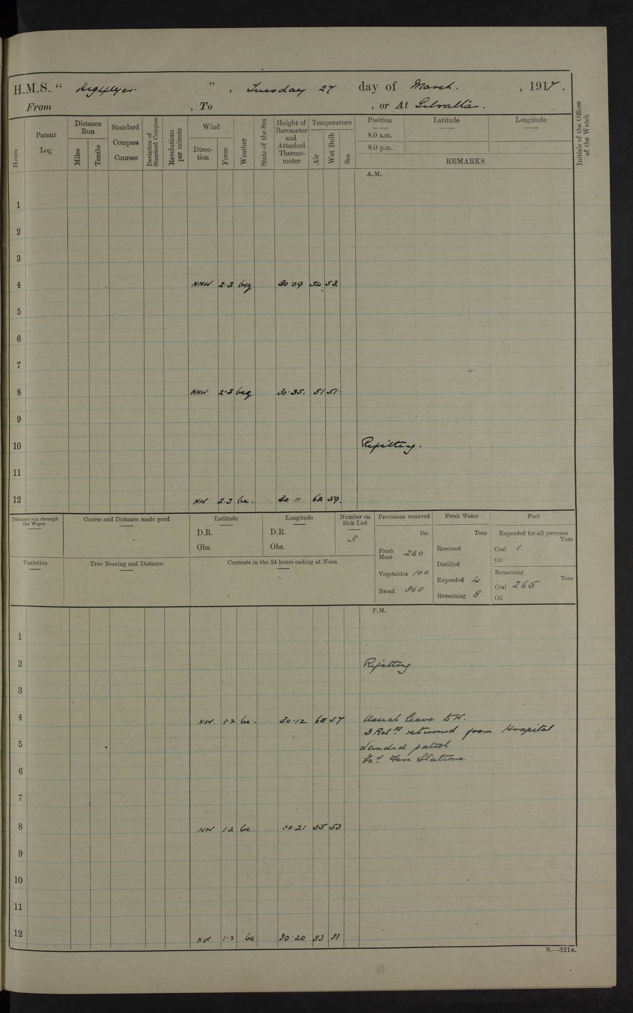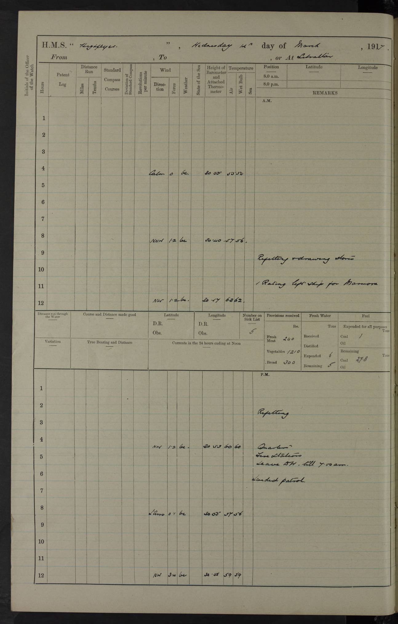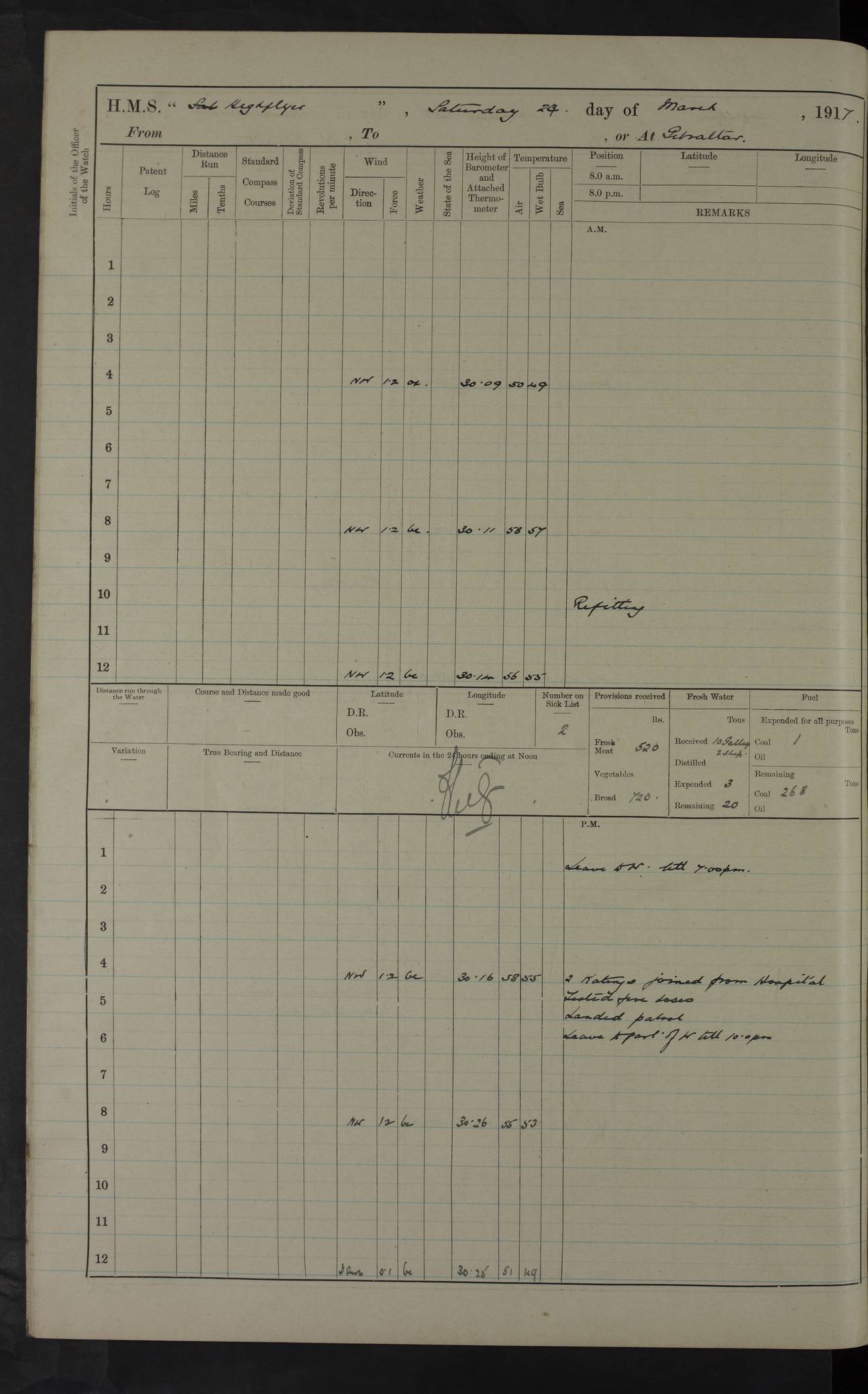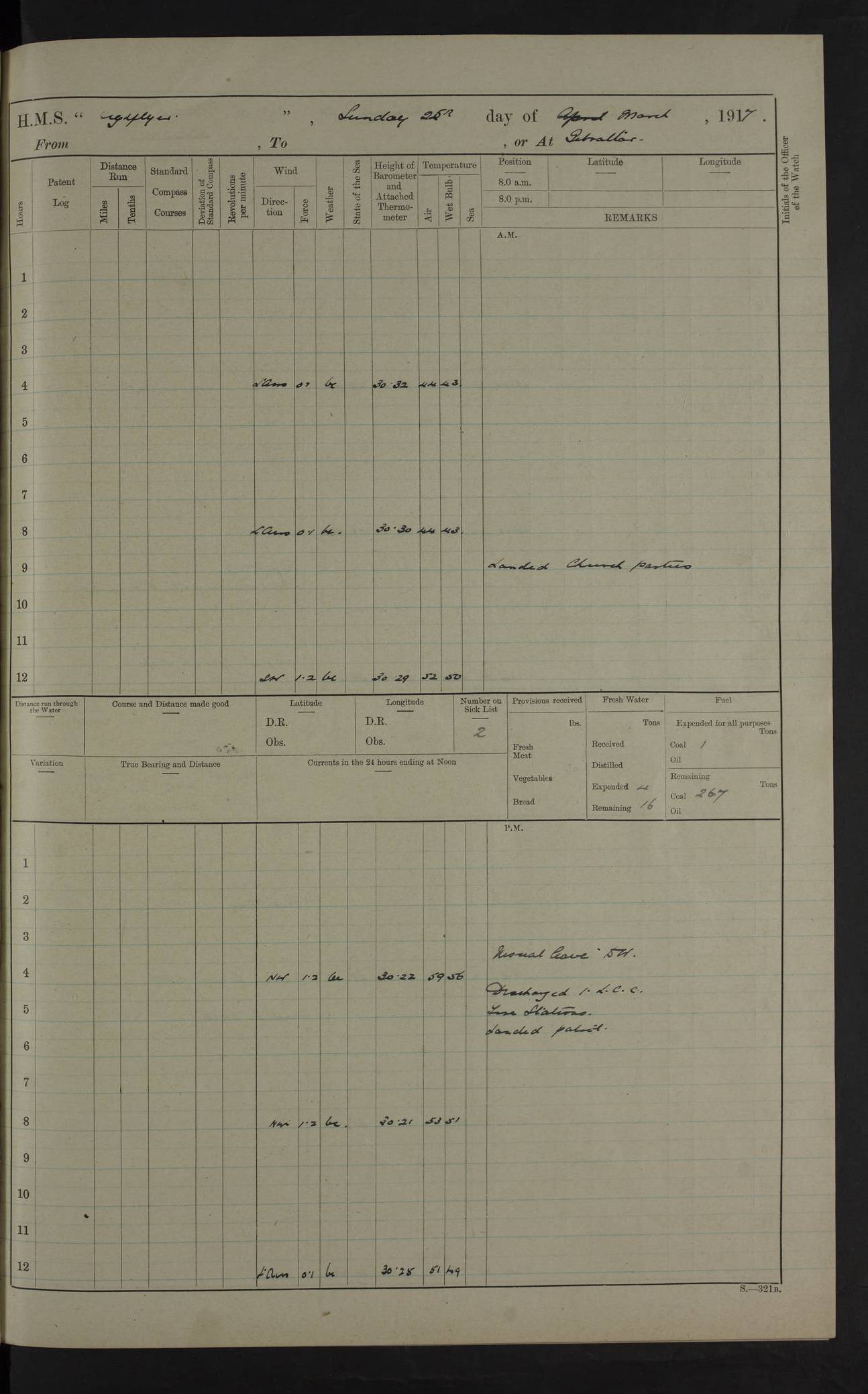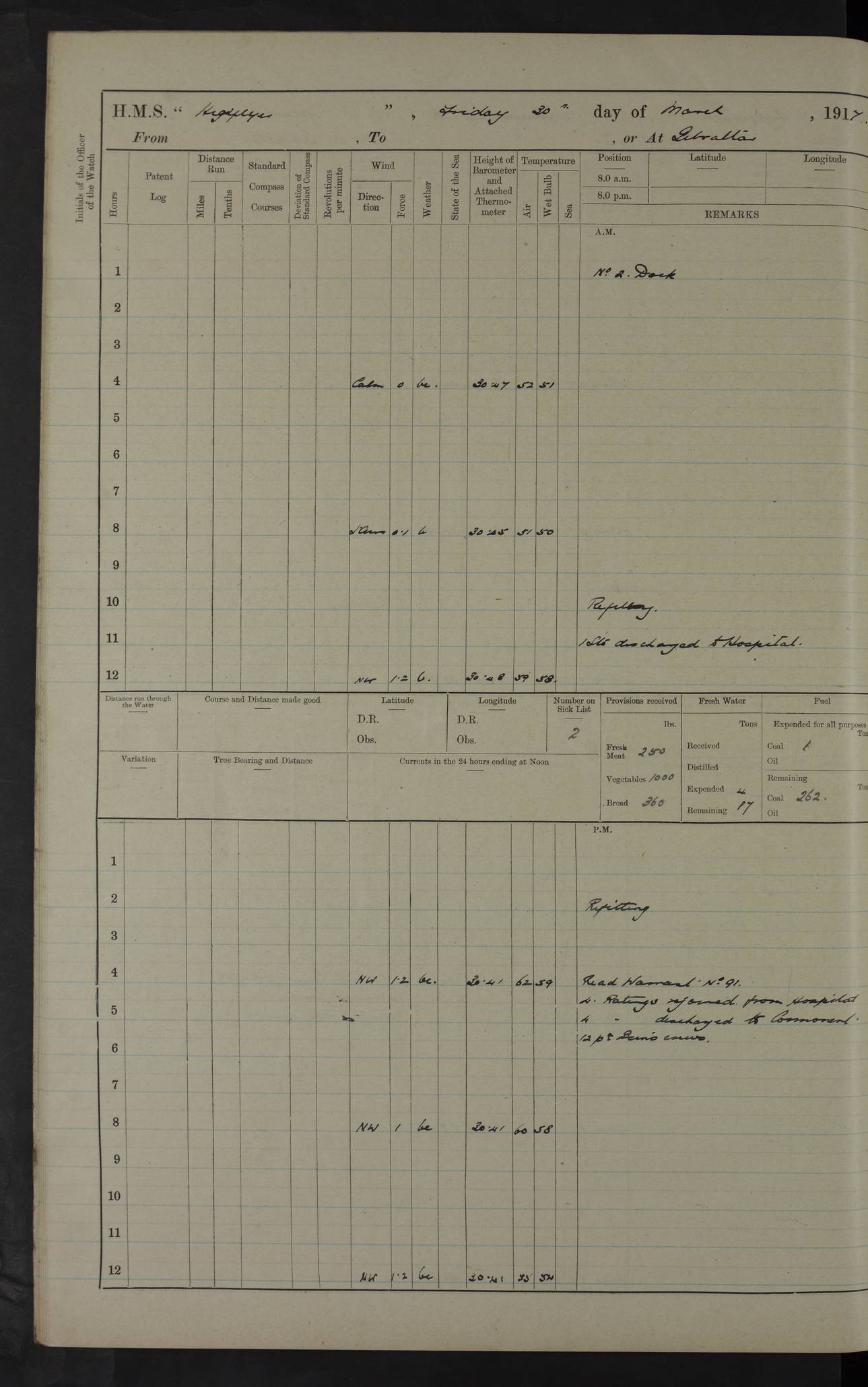 4ef4f325e53e0a0c91000961: (https://s3.amazonaws.com:443/oldweather/ADM53-44307/ADM 53-44307-177_0.jpg) 24 March 1917 Gibraltar Lat 36.1, Long -5.3 Refitting. 4.00pm: 2 Ratings joined from hospital. 5.00pm: Landed patrol. 4ef4f325e53e0a0c91000962: (https://s3.amazonaws.com:443/oldweather/ADM53-44307/ADM 53-44307-177_1.jpg) 25 March 1917 Gibraltar Lat 36.1, Long -5.3 9.00am: Landed church parties. 4.30pm: Discharged 1 LCC. 4ef4f325e53e0a0c91000963: (https://s3.amazonaws.com:443/oldweather/ADM53-44307/ADM 53-44307-178_0.jpg) 26 March 1917 Gibraltar Lat 36.1, Long -5.3 9.30am: 1 Stoker discharged to hospital. 11.30am: 1 Shipwright joined ship. 5.00pm: Landed patrol. 4ef4f325e53e0a0c91000964: (https://s3.amazonaws.com:443/oldweather/ADM53-44307/ADM 53-44307-178_1.jpg) 27 March 1917 Gibraltar Lat 36.1, Long -5.3 4.30pm: 3 Ratings returned from hospital. 5.00pm: Landed patrol. 4ef4f325e53e0a0c91000965: (https://s3.amazonaws.com:443/oldweather/ADM53-44307/ADM 53-44307-179_0.jpg) 28 March 1917 Gibraltar Lat 36.1, Long -5.3 Refitting. 4.30pm: Landed patrol. 4ef4f325e53e0a0c91000966: (https://s3.amazonaws.com:443/oldweather/ADM53-44307/ADM 53-44307-179_1.jpg) 29 March 1917 Gibraltar Lat 36.1, Long -5.3 4.30pm: Landed patrol. 4ef4f325e53e0a0c91000967: (https://s3.amazonaws.com:443/oldweather/ADM53-44307/ADM 53-44307-180_0.jpg) 30 March 1917 Gibraltar Lat 36.1, Long -5.3 11.00am: 1 Stoker discharged to hospital. 4.00pm: Read Warrant No 91. 4.30pm: 4 Ratings rejoined from hospital. 5.00pm: 4 Ratings discharged to CORMORANT 12 pdr. Guns’ crews. 4ef4f325e53e0a0c91000968: (https://s3.amazonaws.com:443/oldweather/ADM53-44307/ADM 53-44307-180_1.jpg) 31 March 1917 Gibraltar Lat 36.1, Long -5.3 Refitting. 5.00pm: Tested fire hoses.