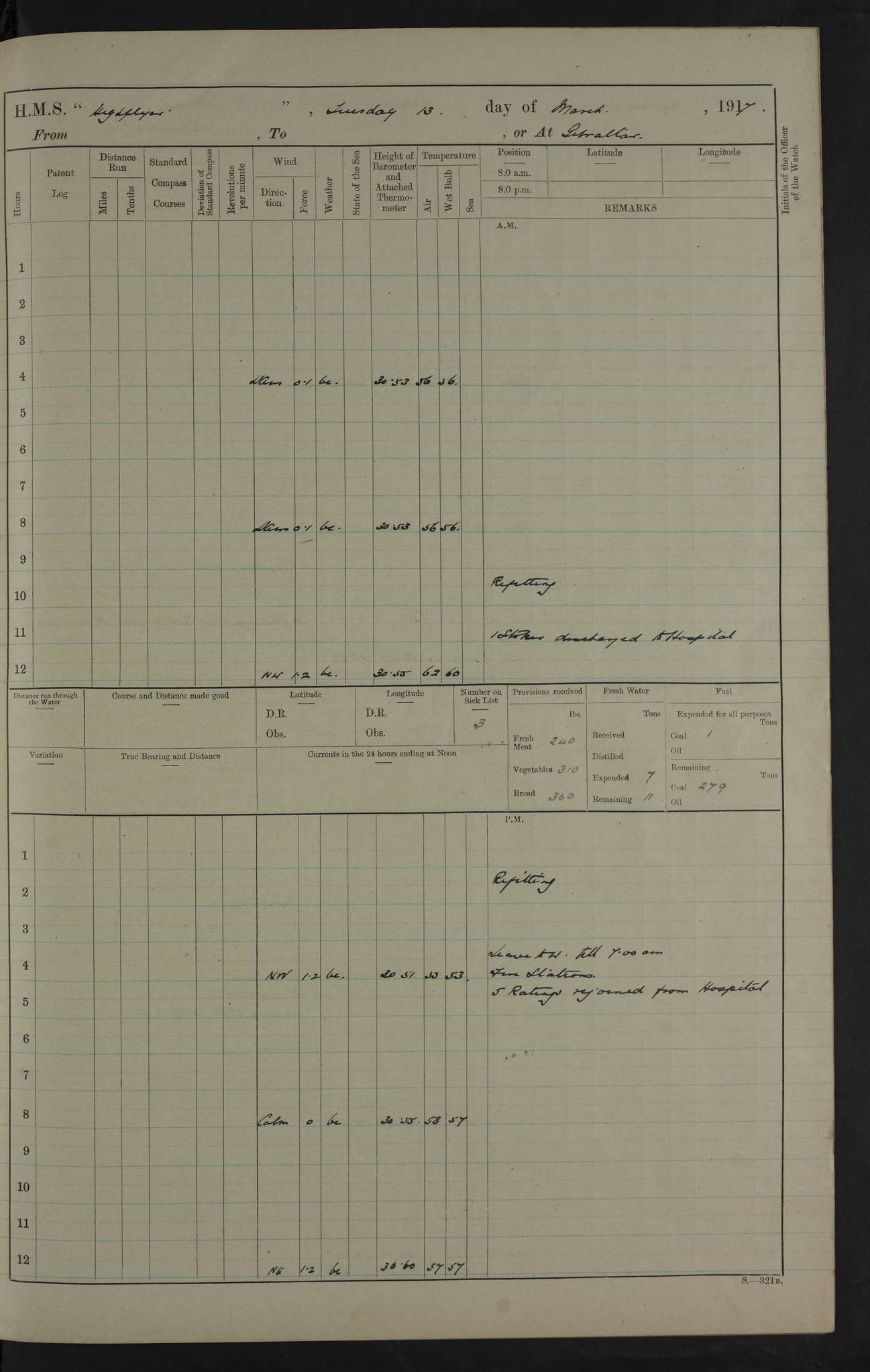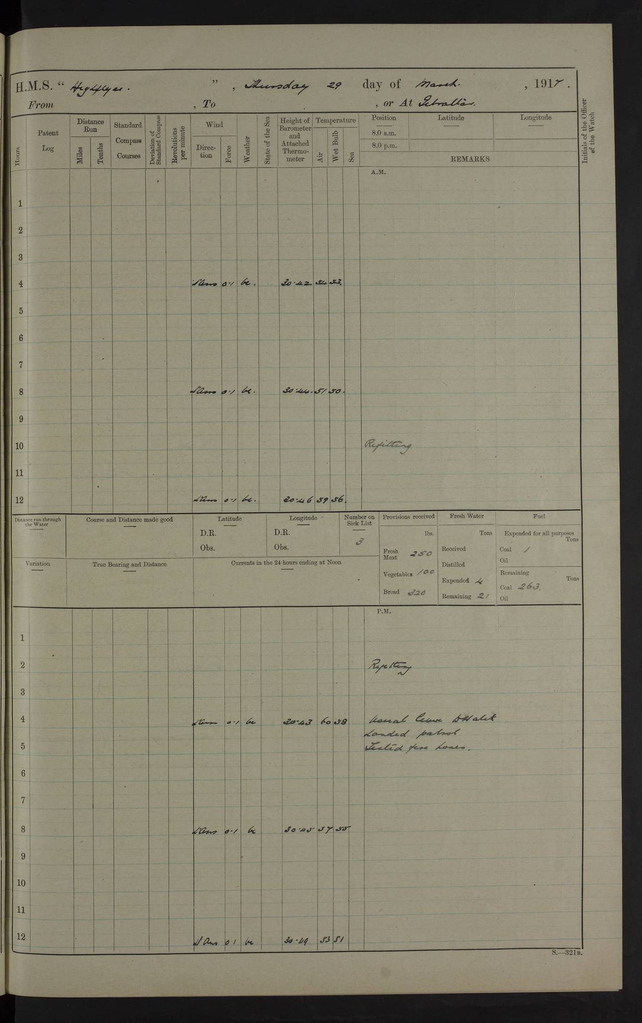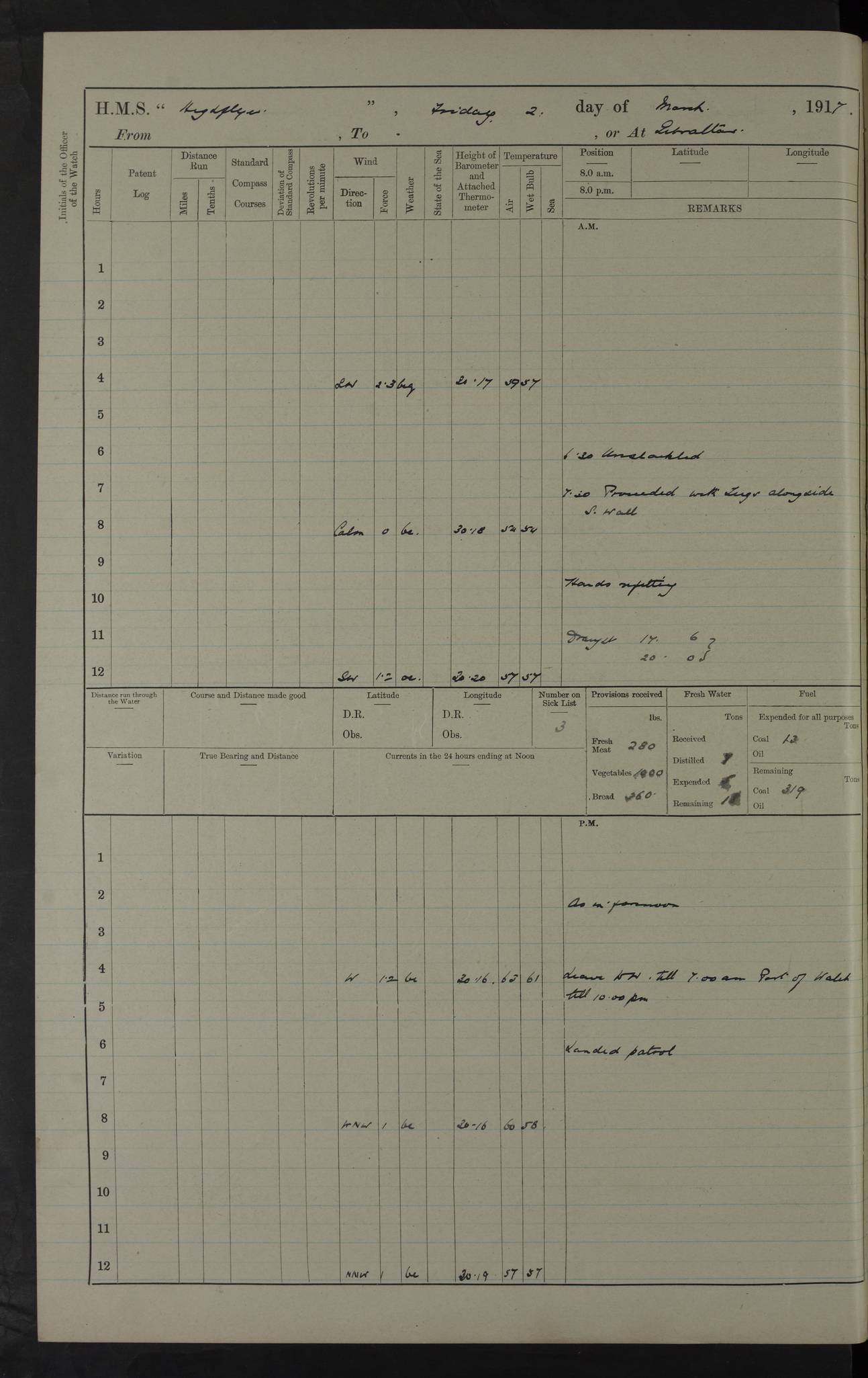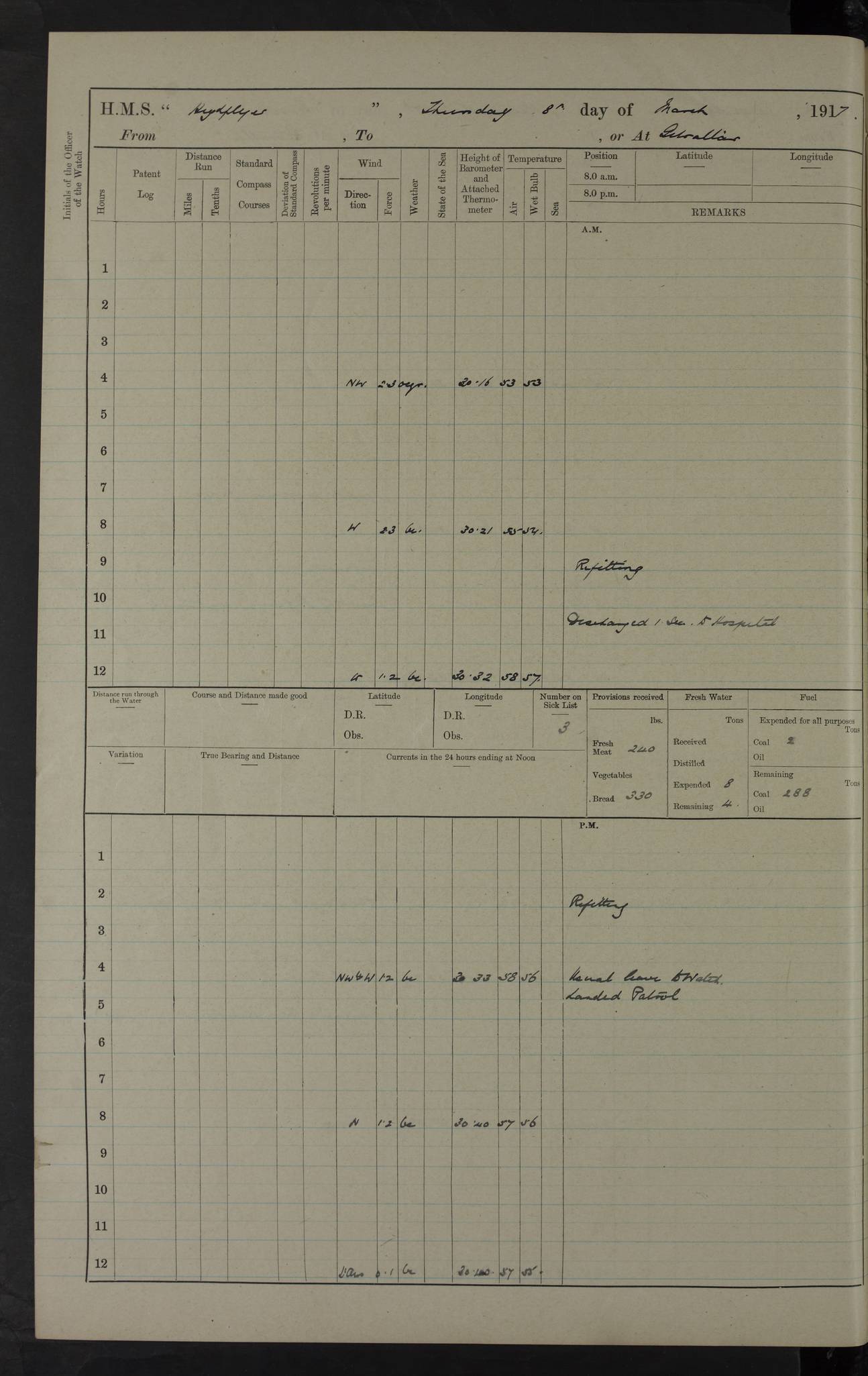 4ef4f325e53e0a0c91000961: (https://s3.amazonaws.com:443/oldweather/ADM53-44307/ADM 53-44307-177_0.jpg) 24 March 1917 Gibraltar Lat 36.1, Long -5.3 Refitting. 4.00pm: 2 Ratings joined from hospital. 5.00pm: Landed patrol. 4ef4f325e53e0a0c91000962: (https://s3.amazonaws.com:443/oldweather/ADM53-44307/ADM 53-44307-177_1.jpg) 25 March 1917 Gibraltar Lat 36.1, Long -5.3 9.00am: Landed church parties. 4.30pm: Discharged 1 LCC. 4ef4f325e53e0a0c91000963: (https://s3.amazonaws.com:443/oldweather/ADM53-44307/ADM 53-44307-178_0.jpg) 26 March 1917 Gibraltar Lat 36.1, Long -5.3 9.30am: 1 Stoker discharged to hospital. 11.30am: 1 Shipwright joined ship. 5.00pm: Landed patrol. 4ef4f325e53e0a0c91000964: (https://s3.amazonaws.com:443/oldweather/ADM53-44307/ADM 53-44307-178_1.jpg) 27 March 1917 Gibraltar Lat 36.1, Long -5.3 4.30pm: 3 Ratings returned from hospital. 5.00pm: Landed patrol. 4ef4f325e53e0a0c91000965: (https://s3.amazonaws.com:443/oldweather/ADM53-44307/ADM 53-44307-179_0.jpg) 28 March 1917 Gibraltar Lat 36.1, Long -5.3 Refitting. 4.30pm: Landed patrol. 4ef4f325e53e0a0c91000966: (https://s3.amazonaws.com:443/oldweather/ADM53-44307/ADM 53-44307-179_1.jpg) 29 March 1917 Gibraltar Lat 36.1, Long -5.3 4.30pm: Landed patrol. 4ef4f325e53e0a0c91000967: (https://s3.amazonaws.com:443/oldweather/ADM53-44307/ADM 53-44307-180_0.jpg) 30 March 1917 Gibraltar Lat 36.1, Long -5.3 11.00am: 1 Stoker discharged to hospital. 4.00pm: Read Warrant No 91. 4.30pm: 4 Ratings rejoined from hospital. 5.00pm: 4 Ratings discharged to CORMORANT 12 pdr. Guns’ crews. 4ef4f325e53e0a0c91000968: (https://s3.amazonaws.com:443/oldweather/ADM53-44307/ADM 53-44307-180_1.jpg) 31 March 1917 Gibraltar Lat 36.1, Long -5.3 Refitting. 5.00pm: Tested fire hoses.