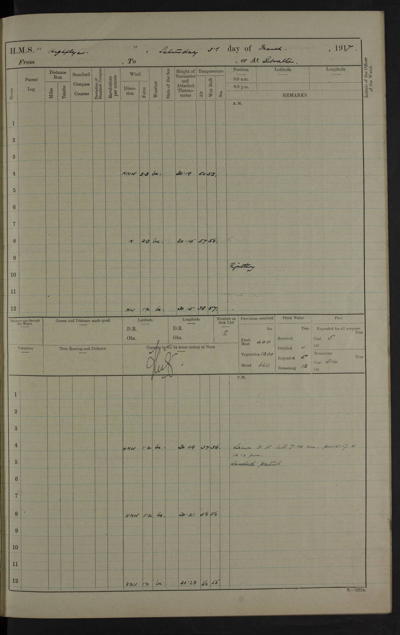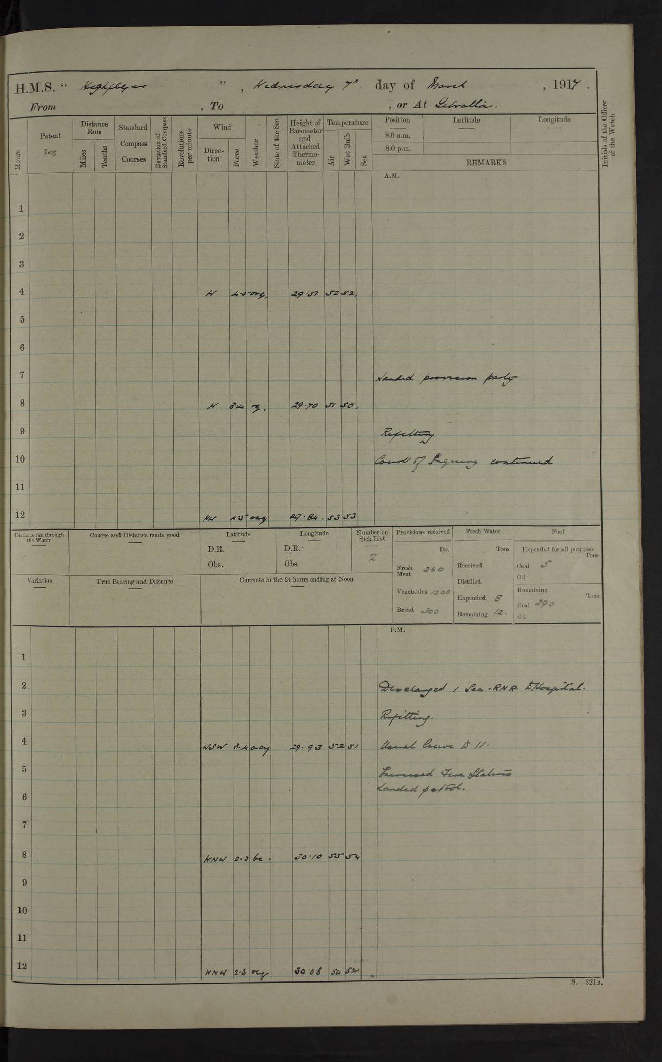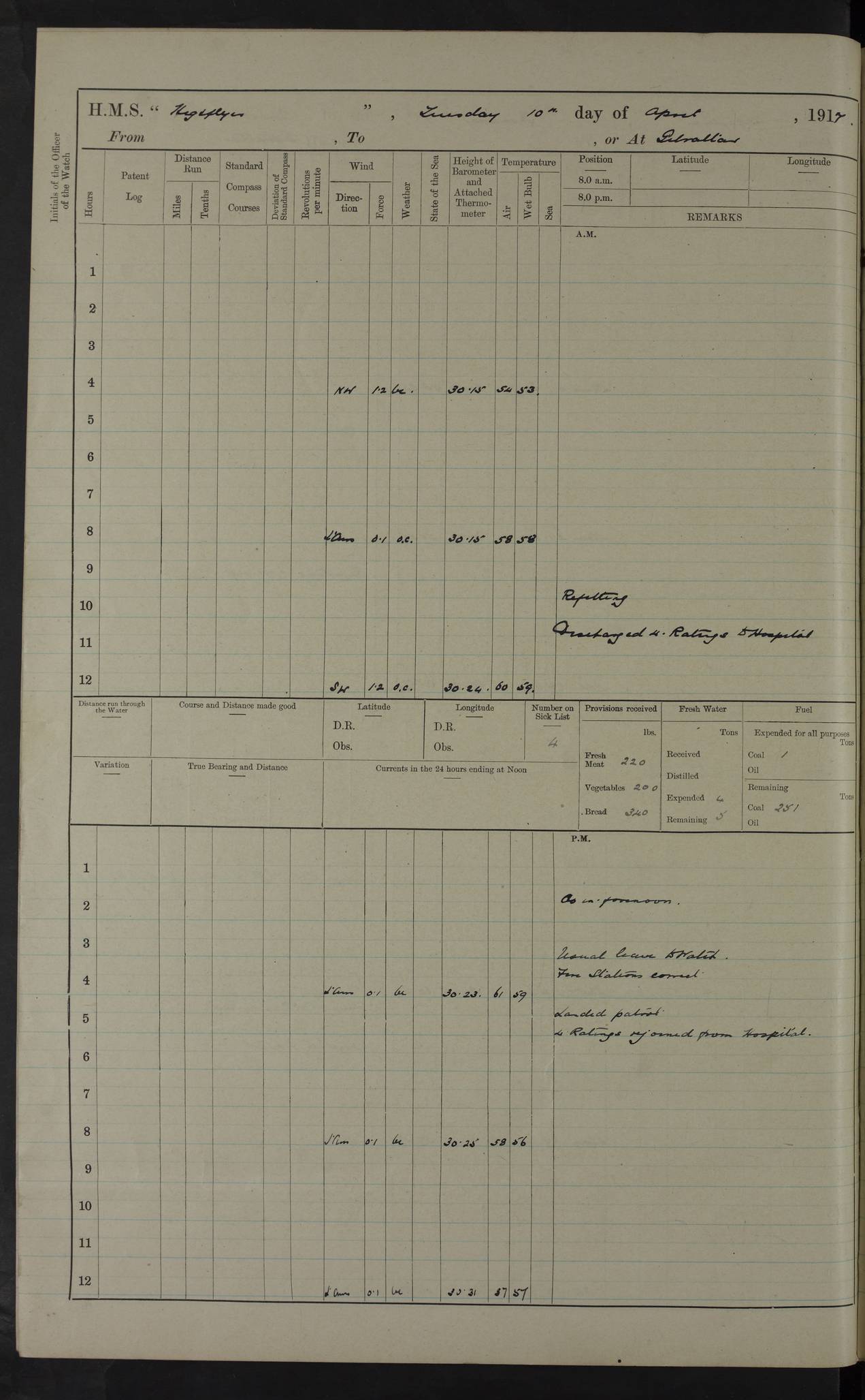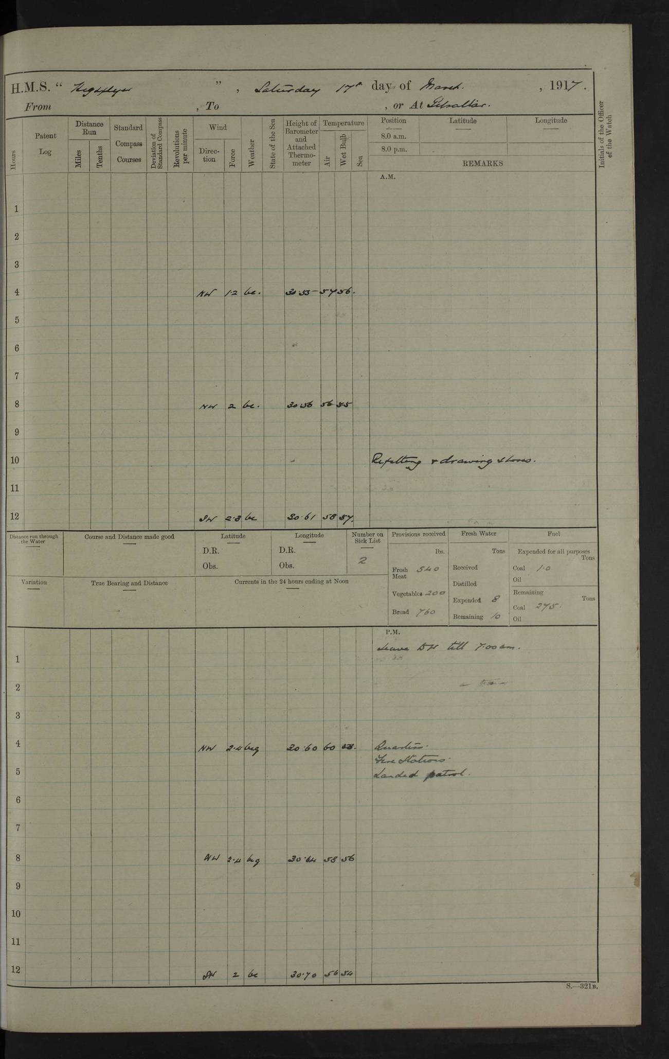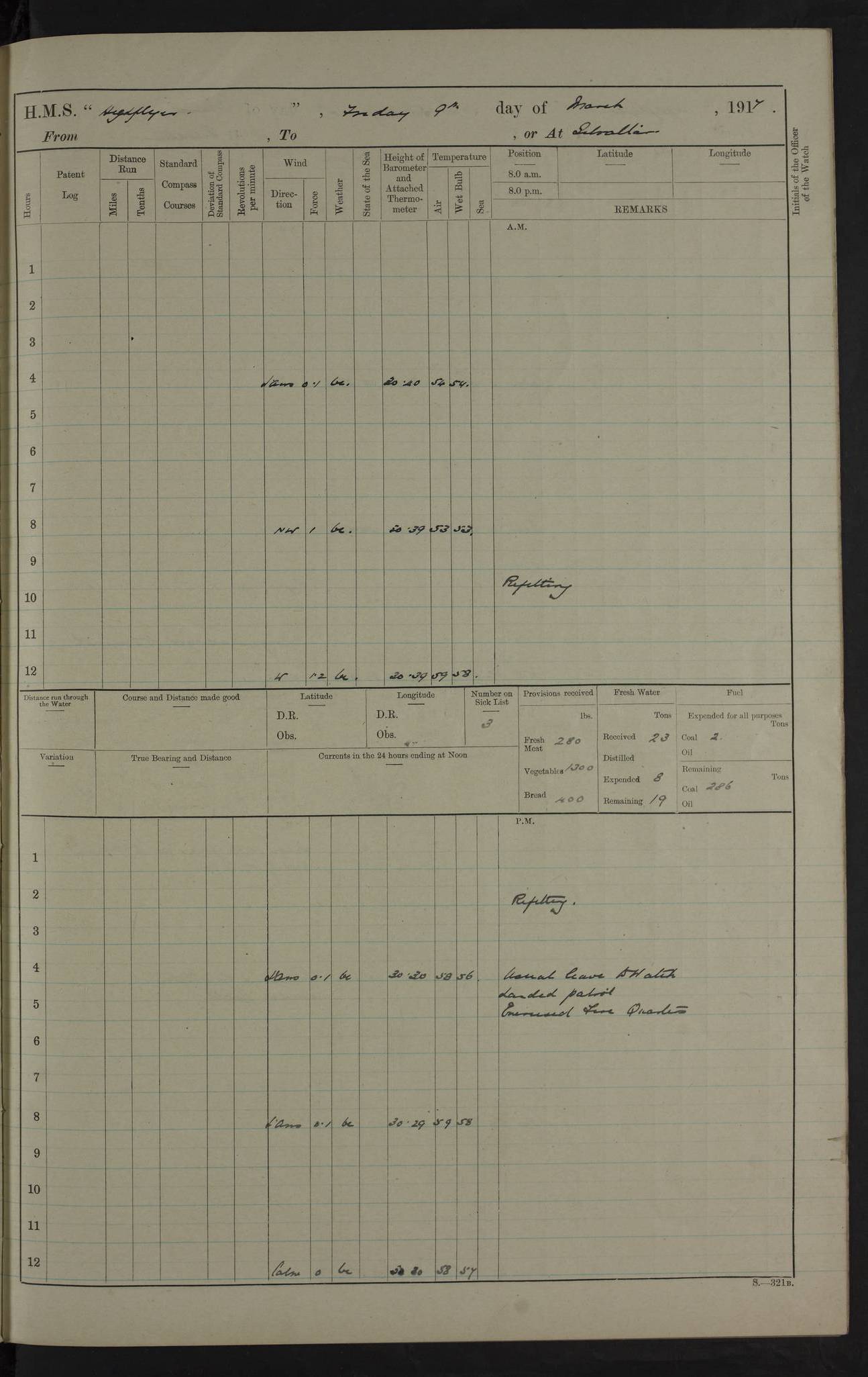 4ef4f325e53e0a0c91000961: (https://s3.amazonaws.com:443/oldweather/ADM53-44307/ADM 53-44307-177_0.jpg) 24 March 1917 Gibraltar Lat 36.1, Long -5.3 Refitting. 4.00pm: 2 Ratings joined from hospital. 5.00pm: Landed patrol. 4ef4f325e53e0a0c91000962: (https://s3.amazonaws.com:443/oldweather/ADM53-44307/ADM 53-44307-177_1.jpg) 25 March 1917 Gibraltar Lat 36.1, Long -5.3 9.00am: Landed church parties. 4.30pm: Discharged 1 LCC. 4ef4f325e53e0a0c91000963: (https://s3.amazonaws.com:443/oldweather/ADM53-44307/ADM 53-44307-178_0.jpg) 26 March 1917 Gibraltar Lat 36.1, Long -5.3 9.30am: 1 Stoker discharged to hospital. 11.30am: 1 Shipwright joined ship. 5.00pm: Landed patrol. 4ef4f325e53e0a0c91000964: (https://s3.amazonaws.com:443/oldweather/ADM53-44307/ADM 53-44307-178_1.jpg) 27 March 1917 Gibraltar Lat 36.1, Long -5.3 4.30pm: 3 Ratings returned from hospital. 5.00pm: Landed patrol. 4ef4f325e53e0a0c91000965: (https://s3.amazonaws.com:443/oldweather/ADM53-44307/ADM 53-44307-179_0.jpg) 28 March 1917 Gibraltar Lat 36.1, Long -5.3 Refitting. 4.30pm: Landed patrol. 4ef4f325e53e0a0c91000966: (https://s3.amazonaws.com:443/oldweather/ADM53-44307/ADM 53-44307-179_1.jpg) 29 March 1917 Gibraltar Lat 36.1, Long -5.3 4.30pm: Landed patrol. 4ef4f325e53e0a0c91000967: (https://s3.amazonaws.com:443/oldweather/ADM53-44307/ADM 53-44307-180_0.jpg) 30 March 1917 Gibraltar Lat 36.1, Long -5.3 11.00am: 1 Stoker discharged to hospital. 4.00pm: Read Warrant No 91. 4.30pm: 4 Ratings rejoined from hospital. 5.00pm: 4 Ratings discharged to CORMORANT 12 pdr. Guns’ crews. 4ef4f325e53e0a0c91000968: (https://s3.amazonaws.com:443/oldweather/ADM53-44307/ADM 53-44307-180_1.jpg) 31 March 1917 Gibraltar Lat 36.1, Long -5.3 Refitting. 5.00pm: Tested fire hoses.