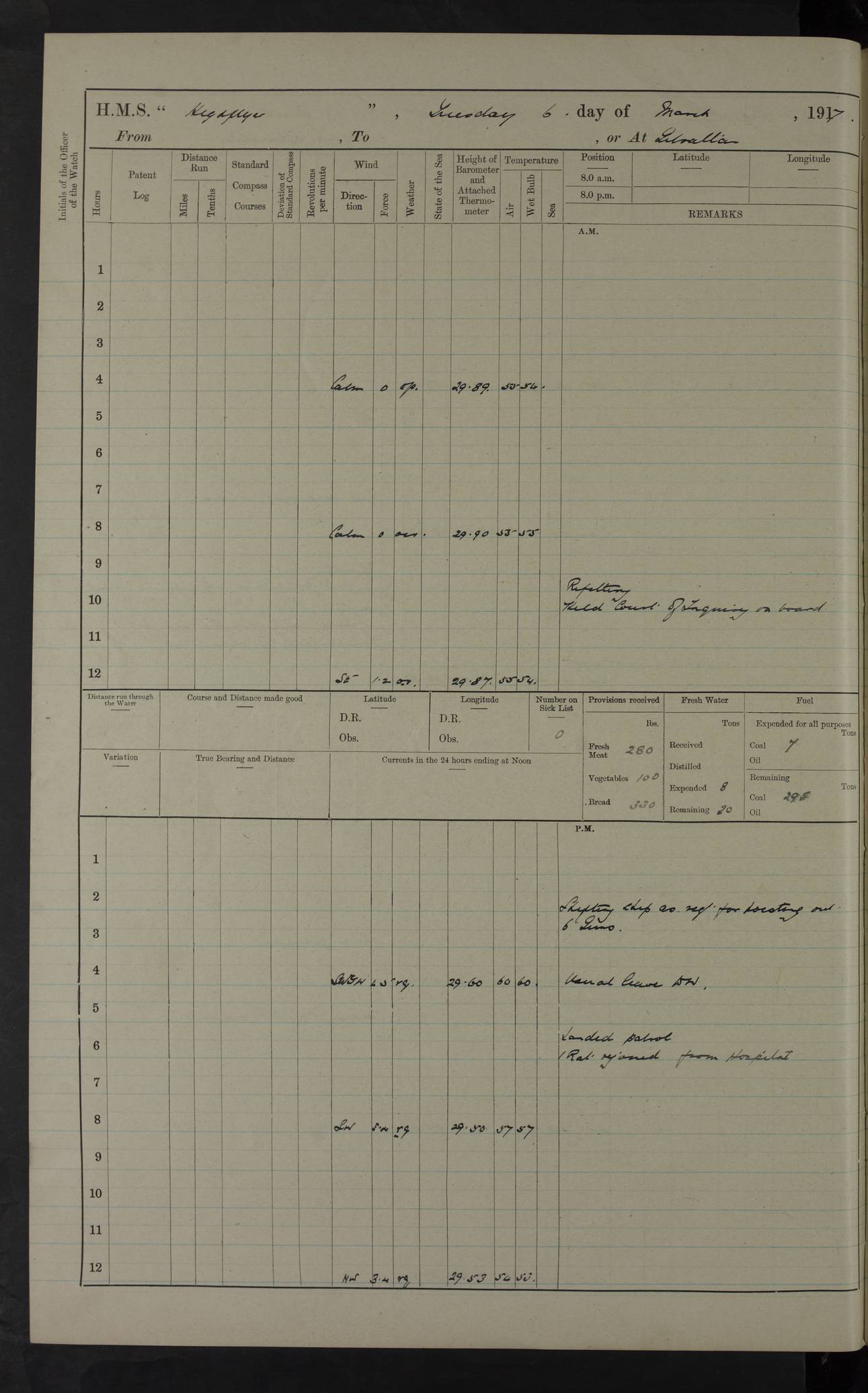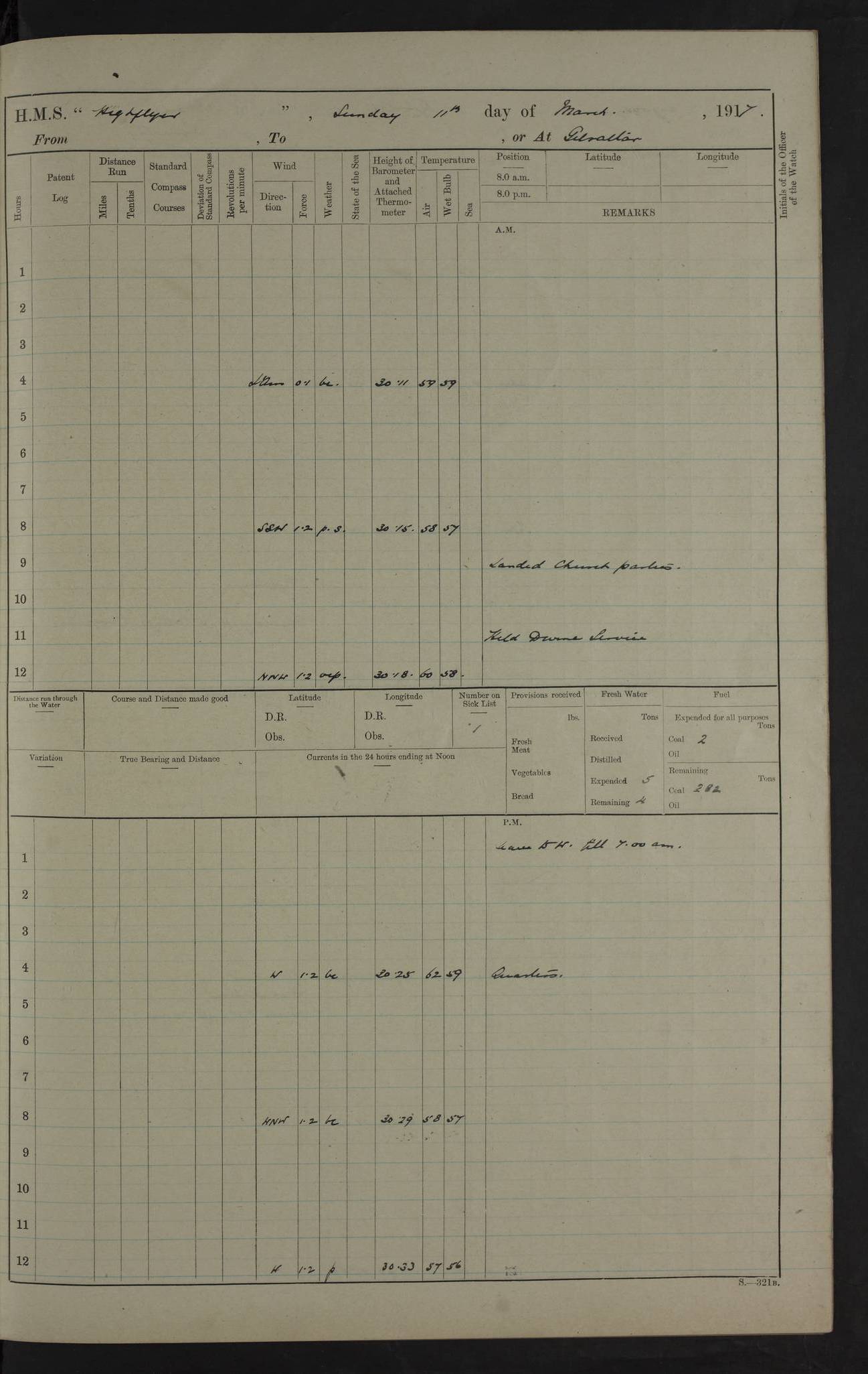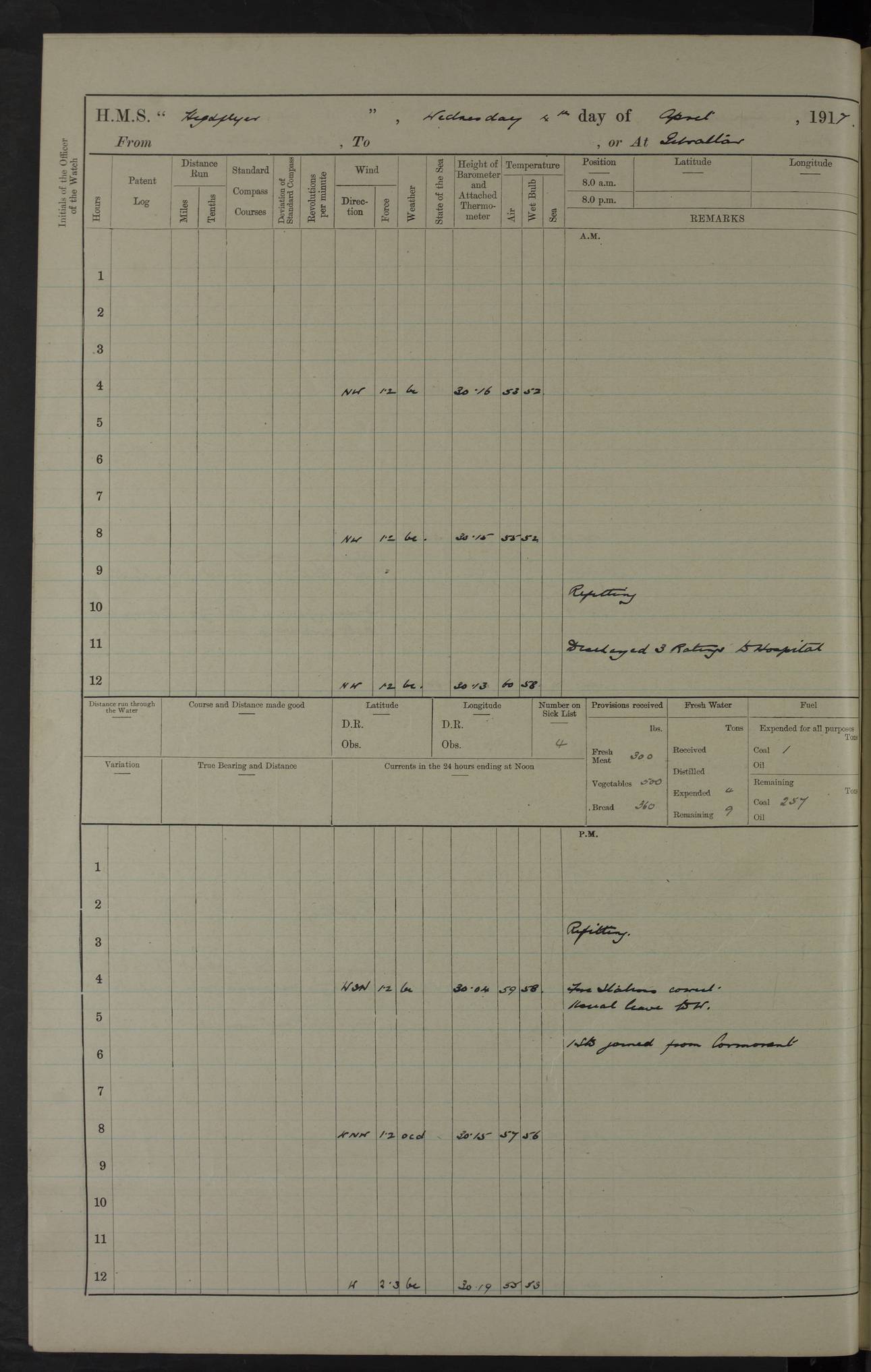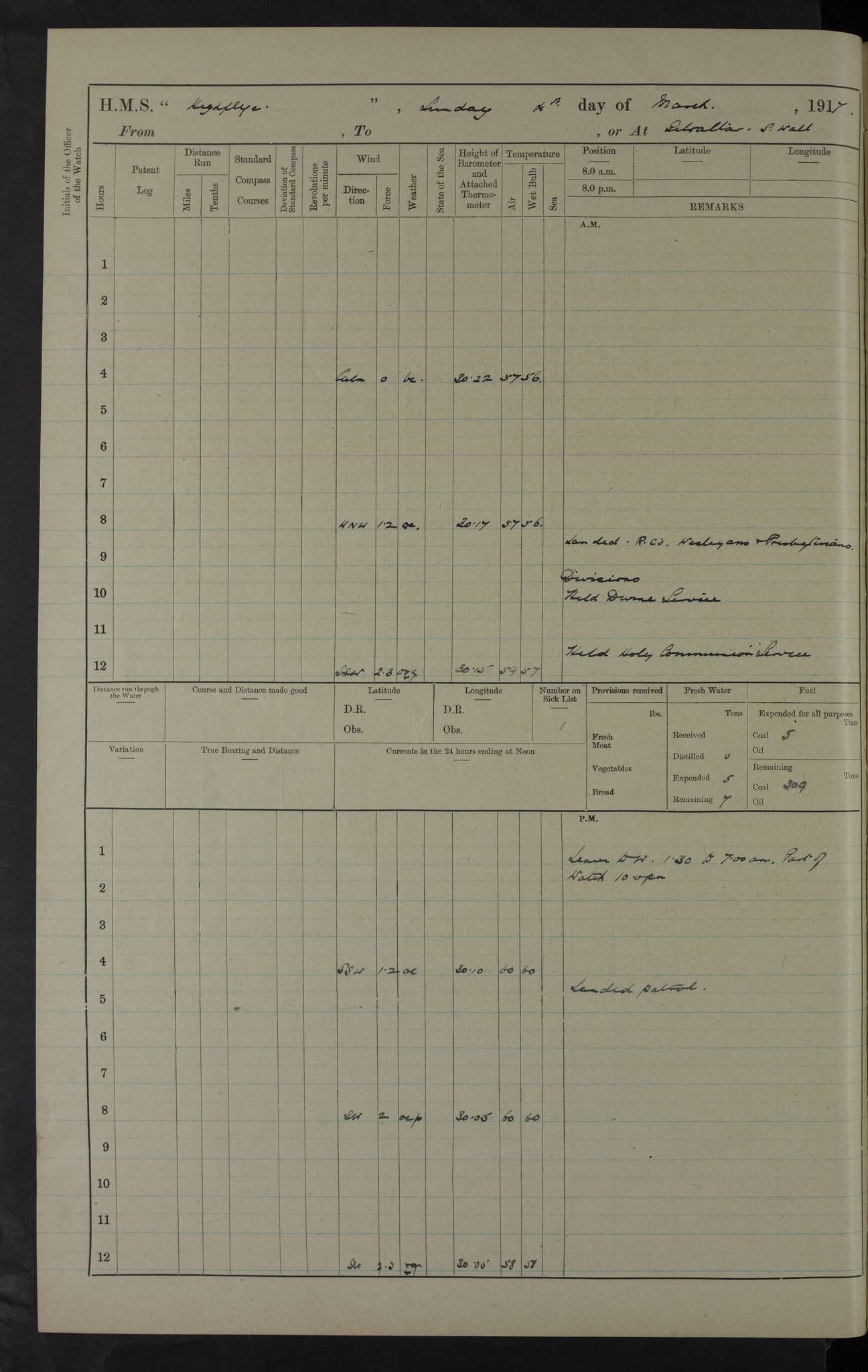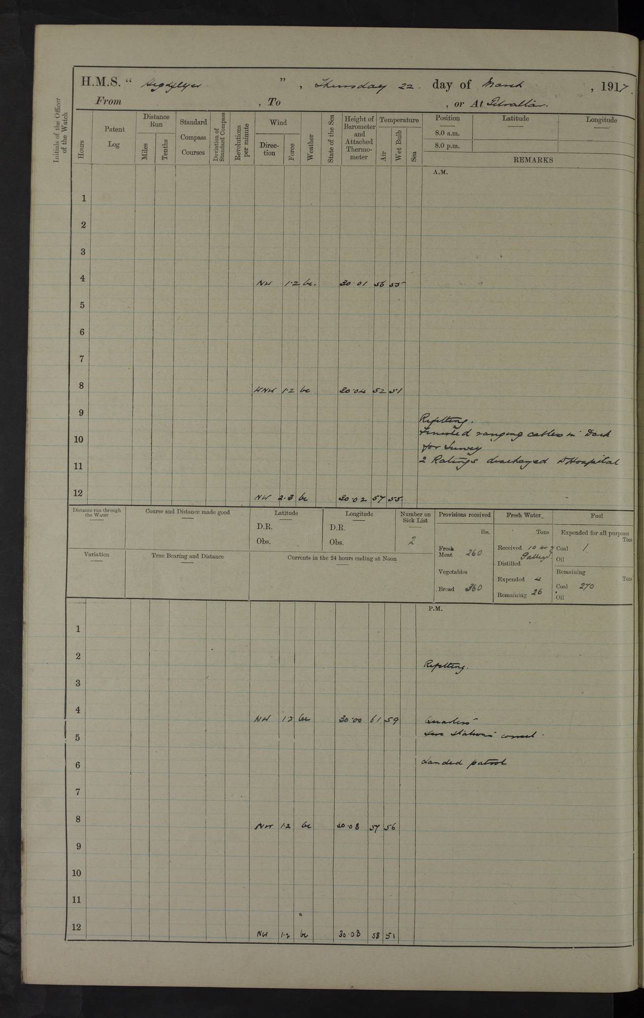 4ef4f325e53e0a0c91000961: (https://s3.amazonaws.com:443/oldweather/ADM53-44307/ADM 53-44307-177_0.jpg) 24 March 1917 Gibraltar Lat 36.1, Long -5.3 Refitting. 4.00pm: 2 Ratings joined from hospital. 5.00pm: Landed patrol. 4ef4f325e53e0a0c91000962: (https://s3.amazonaws.com:443/oldweather/ADM53-44307/ADM 53-44307-177_1.jpg) 25 March 1917 Gibraltar Lat 36.1, Long -5.3 9.00am: Landed church parties. 4.30pm: Discharged 1 LCC. 4ef4f325e53e0a0c91000963: (https://s3.amazonaws.com:443/oldweather/ADM53-44307/ADM 53-44307-178_0.jpg) 26 March 1917 Gibraltar Lat 36.1, Long -5.3 9.30am: 1 Stoker discharged to hospital. 11.30am: 1 Shipwright joined ship. 5.00pm: Landed patrol. 4ef4f325e53e0a0c91000964: (https://s3.amazonaws.com:443/oldweather/ADM53-44307/ADM 53-44307-178_1.jpg) 27 March 1917 Gibraltar Lat 36.1, Long -5.3 4.30pm: 3 Ratings returned from hospital. 5.00pm: Landed patrol. 4ef4f325e53e0a0c91000965: (https://s3.amazonaws.com:443/oldweather/ADM53-44307/ADM 53-44307-179_0.jpg) 28 March 1917 Gibraltar Lat 36.1, Long -5.3 Refitting. 4.30pm: Landed patrol. 4ef4f325e53e0a0c91000966: (https://s3.amazonaws.com:443/oldweather/ADM53-44307/ADM 53-44307-179_1.jpg) 29 March 1917 Gibraltar Lat 36.1, Long -5.3 4.30pm: Landed patrol. 4ef4f325e53e0a0c91000967: (https://s3.amazonaws.com:443/oldweather/ADM53-44307/ADM 53-44307-180_0.jpg) 30 March 1917 Gibraltar Lat 36.1, Long -5.3 11.00am: 1 Stoker discharged to hospital. 4.00pm: Read Warrant No 91. 4.30pm: 4 Ratings rejoined from hospital. 5.00pm: 4 Ratings discharged to CORMORANT 12 pdr. Guns’ crews. 4ef4f325e53e0a0c91000968: (https://s3.amazonaws.com:443/oldweather/ADM53-44307/ADM 53-44307-180_1.jpg) 31 March 1917 Gibraltar Lat 36.1, Long -5.3 Refitting. 5.00pm: Tested fire hoses.