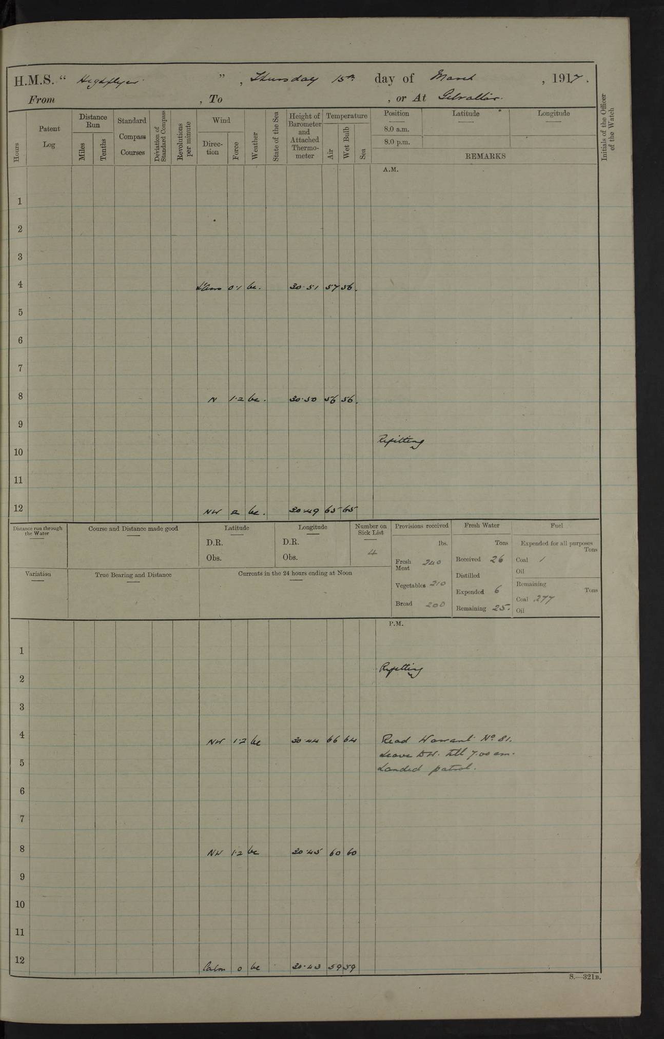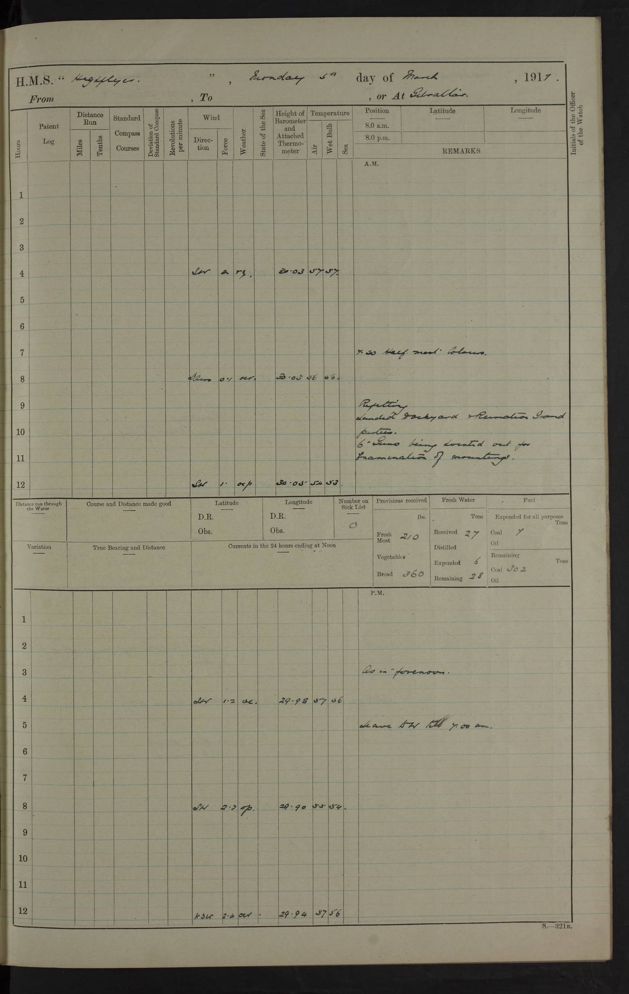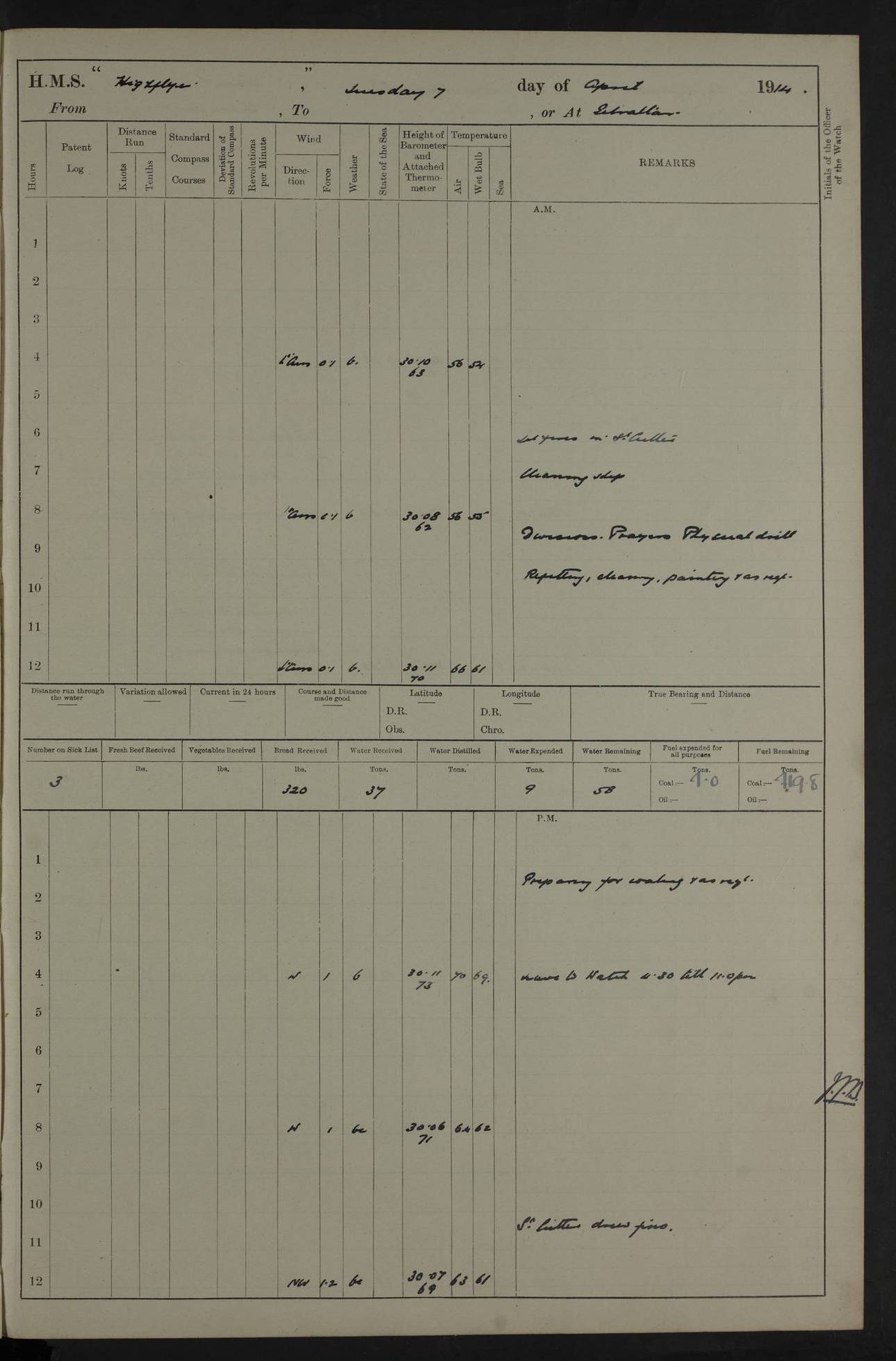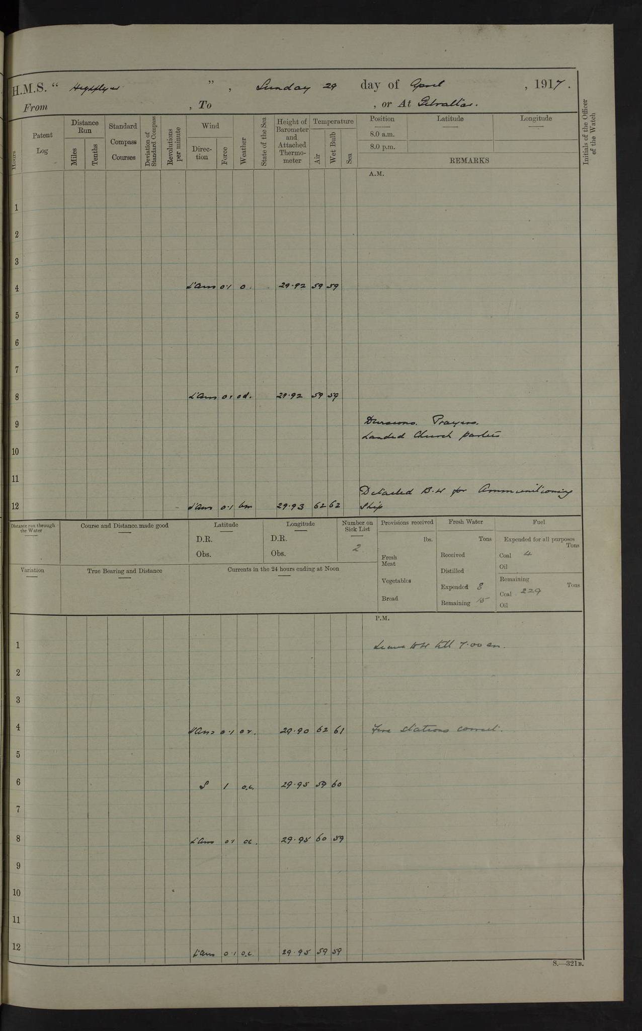 4ef4f325e53e0a0c91000961: (https://s3.amazonaws.com:443/oldweather/ADM53-44307/ADM 53-44307-177_0.jpg) 24 March 1917 Gibraltar Lat 36.1, Long -5.3 Refitting. 4.00pm: 2 Ratings joined from hospital. 5.00pm: Landed patrol. 4ef4f325e53e0a0c91000962: (https://s3.amazonaws.com:443/oldweather/ADM53-44307/ADM 53-44307-177_1.jpg) 25 March 1917 Gibraltar Lat 36.1, Long -5.3 9.00am: Landed church parties. 4.30pm: Discharged 1 LCC. 4ef4f325e53e0a0c91000963: (https://s3.amazonaws.com:443/oldweather/ADM53-44307/ADM 53-44307-178_0.jpg) 26 March 1917 Gibraltar Lat 36.1, Long -5.3 9.30am: 1 Stoker discharged to hospital. 11.30am: 1 Shipwright joined ship. 5.00pm: Landed patrol. 4ef4f325e53e0a0c91000964: (https://s3.amazonaws.com:443/oldweather/ADM53-44307/ADM 53-44307-178_1.jpg) 27 March 1917 Gibraltar Lat 36.1, Long -5.3 4.30pm: 3 Ratings returned from hospital. 5.00pm: Landed patrol. 4ef4f325e53e0a0c91000965: (https://s3.amazonaws.com:443/oldweather/ADM53-44307/ADM 53-44307-179_0.jpg) 28 March 1917 Gibraltar Lat 36.1, Long -5.3 Refitting. 4.30pm: Landed patrol. 4ef4f325e53e0a0c91000966: (https://s3.amazonaws.com:443/oldweather/ADM53-44307/ADM 53-44307-179_1.jpg) 29 March 1917 Gibraltar Lat 36.1, Long -5.3 4.30pm: Landed patrol. 4ef4f325e53e0a0c91000967: (https://s3.amazonaws.com:443/oldweather/ADM53-44307/ADM 53-44307-180_0.jpg) 30 March 1917 Gibraltar Lat 36.1, Long -5.3 11.00am: 1 Stoker discharged to hospital. 4.00pm: Read Warrant No 91. 4.30pm: 4 Ratings rejoined from hospital. 5.00pm: 4 Ratings discharged to CORMORANT 12 pdr. Guns’ crews. 4ef4f325e53e0a0c91000968: (https://s3.amazonaws.com:443/oldweather/ADM53-44307/ADM 53-44307-180_1.jpg) 31 March 1917 Gibraltar Lat 36.1, Long -5.3 Refitting. 5.00pm: Tested fire hoses.