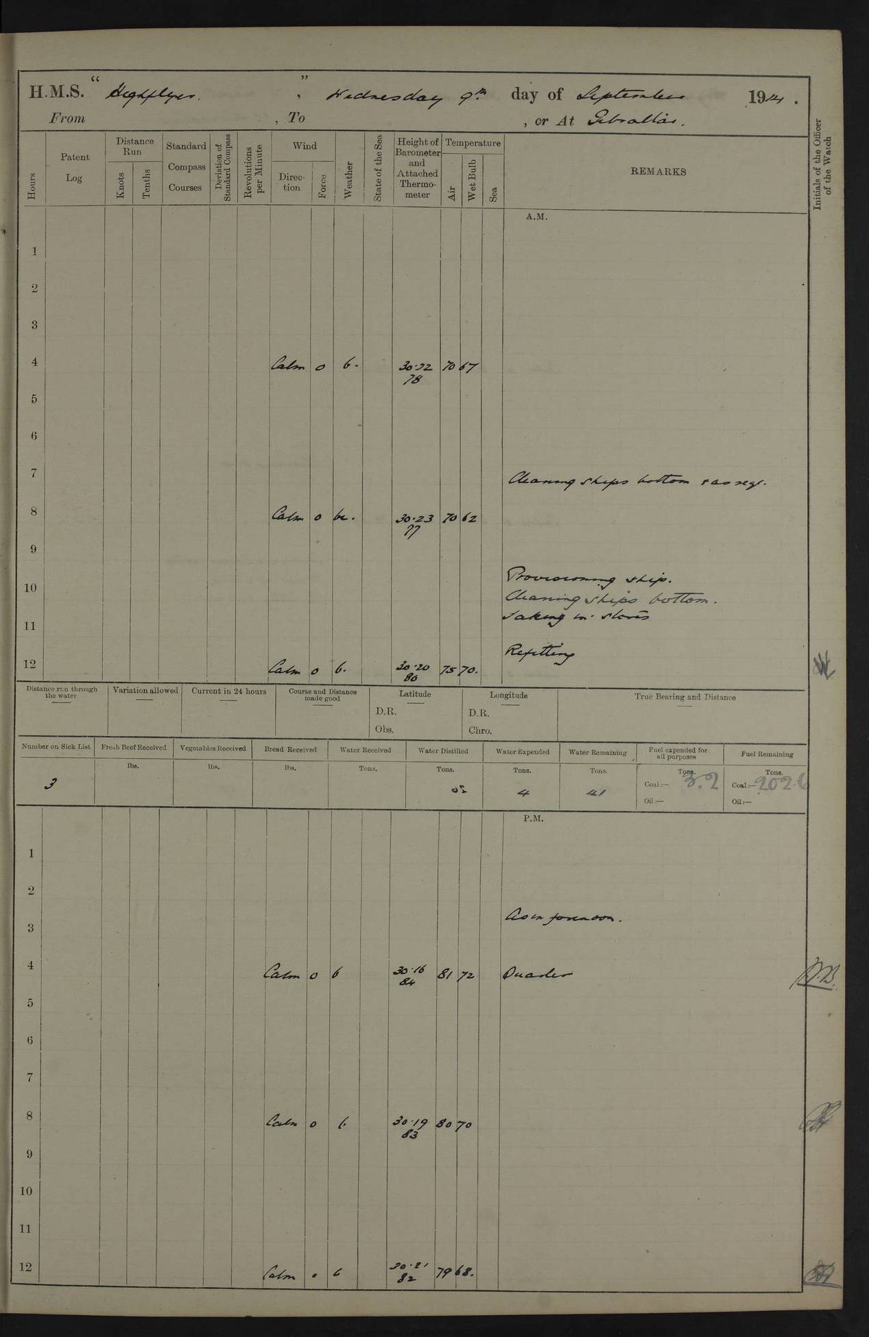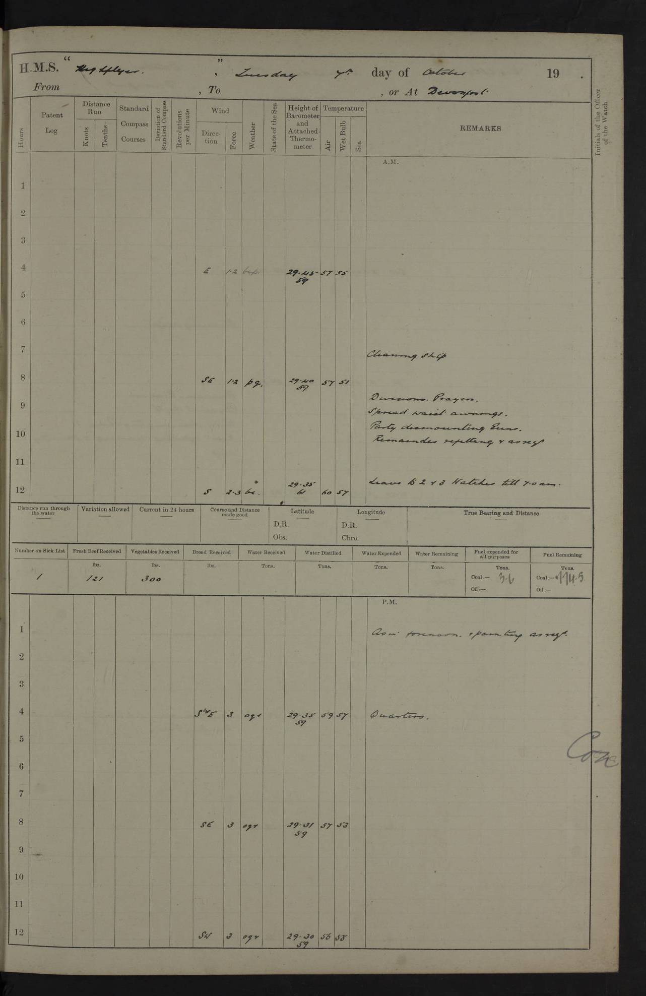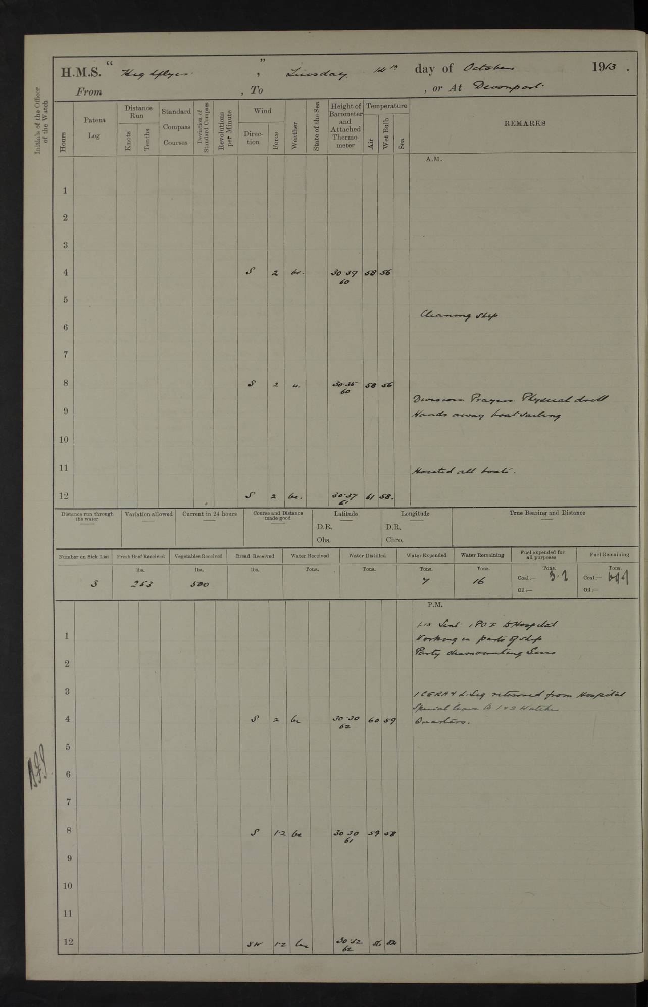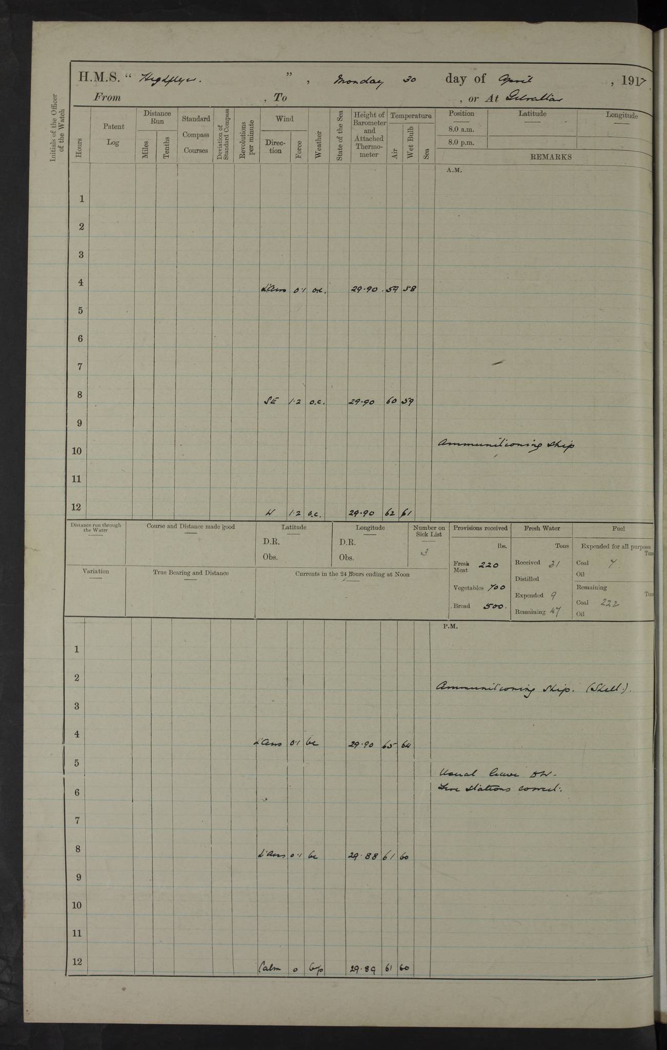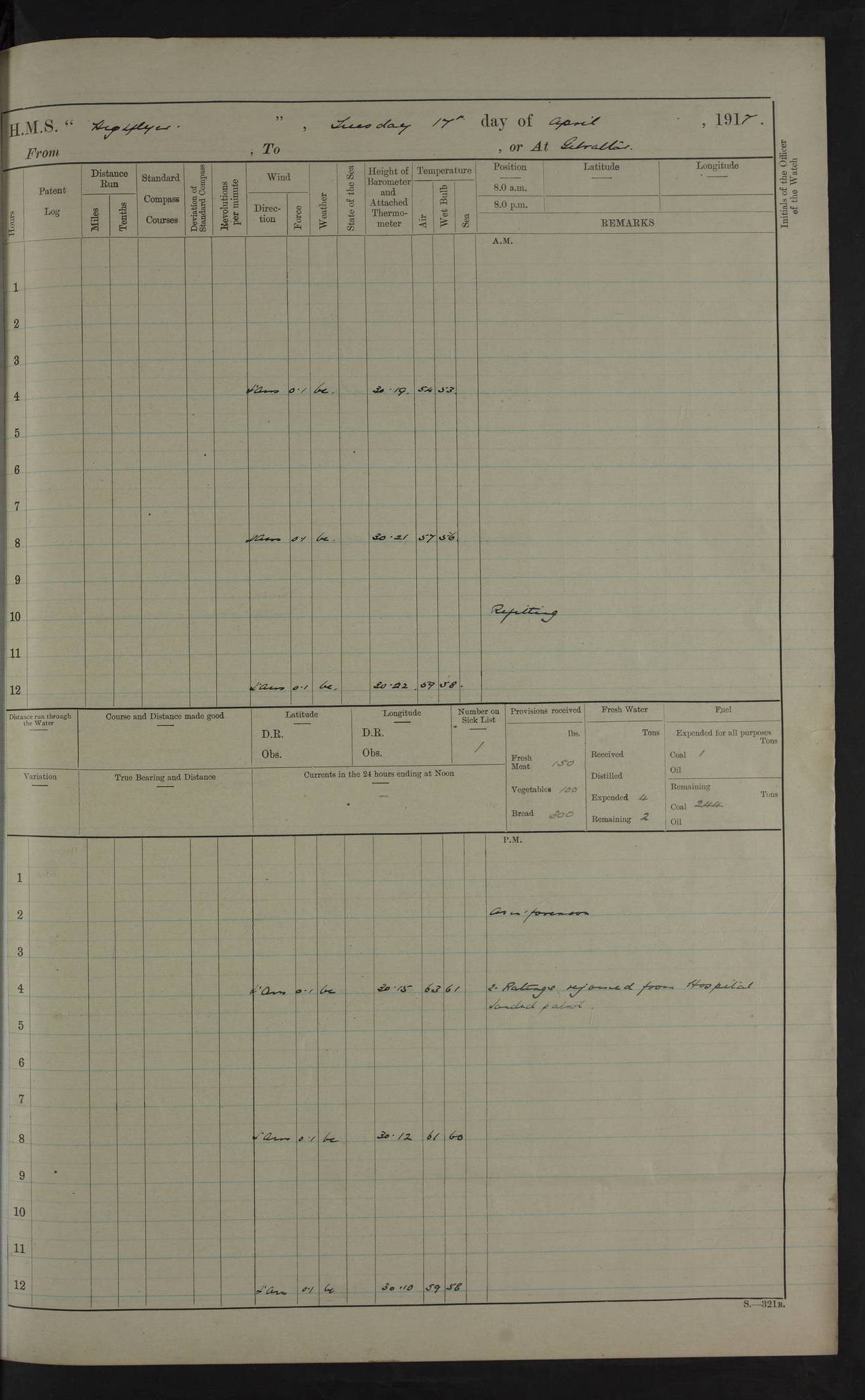 4ef4f325e53e0a0c91000961: (https://s3.amazonaws.com:443/oldweather/ADM53-44307/ADM 53-44307-177_0.jpg) 24 March 1917 Gibraltar Lat 36.1, Long -5.3 Refitting. 4.00pm: 2 Ratings joined from hospital. 5.00pm: Landed patrol. 4ef4f325e53e0a0c91000962: (https://s3.amazonaws.com:443/oldweather/ADM53-44307/ADM 53-44307-177_1.jpg) 25 March 1917 Gibraltar Lat 36.1, Long -5.3 9.00am: Landed church parties. 4.30pm: Discharged 1 LCC. 4ef4f325e53e0a0c91000963: (https://s3.amazonaws.com:443/oldweather/ADM53-44307/ADM 53-44307-178_0.jpg) 26 March 1917 Gibraltar Lat 36.1, Long -5.3 9.30am: 1 Stoker discharged to hospital. 11.30am: 1 Shipwright joined ship. 5.00pm: Landed patrol. 4ef4f325e53e0a0c91000964: (https://s3.amazonaws.com:443/oldweather/ADM53-44307/ADM 53-44307-178_1.jpg) 27 March 1917 Gibraltar Lat 36.1, Long -5.3 4.30pm: 3 Ratings returned from hospital. 5.00pm: Landed patrol. 4ef4f325e53e0a0c91000965: (https://s3.amazonaws.com:443/oldweather/ADM53-44307/ADM 53-44307-179_0.jpg) 28 March 1917 Gibraltar Lat 36.1, Long -5.3 Refitting. 4.30pm: Landed patrol. 4ef4f325e53e0a0c91000966: (https://s3.amazonaws.com:443/oldweather/ADM53-44307/ADM 53-44307-179_1.jpg) 29 March 1917 Gibraltar Lat 36.1, Long -5.3 4.30pm: Landed patrol. 4ef4f325e53e0a0c91000967: (https://s3.amazonaws.com:443/oldweather/ADM53-44307/ADM 53-44307-180_0.jpg) 30 March 1917 Gibraltar Lat 36.1, Long -5.3 11.00am: 1 Stoker discharged to hospital. 4.00pm: Read Warrant No 91. 4.30pm: 4 Ratings rejoined from hospital. 5.00pm: 4 Ratings discharged to CORMORANT 12 pdr. Guns’ crews. 4ef4f325e53e0a0c91000968: (https://s3.amazonaws.com:443/oldweather/ADM53-44307/ADM 53-44307-180_1.jpg) 31 March 1917 Gibraltar Lat 36.1, Long -5.3 Refitting. 5.00pm: Tested fire hoses.