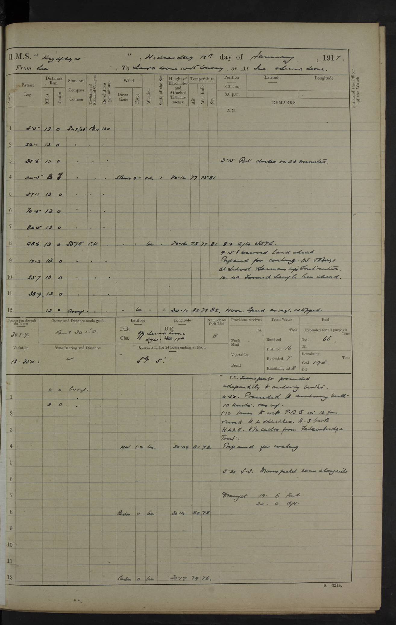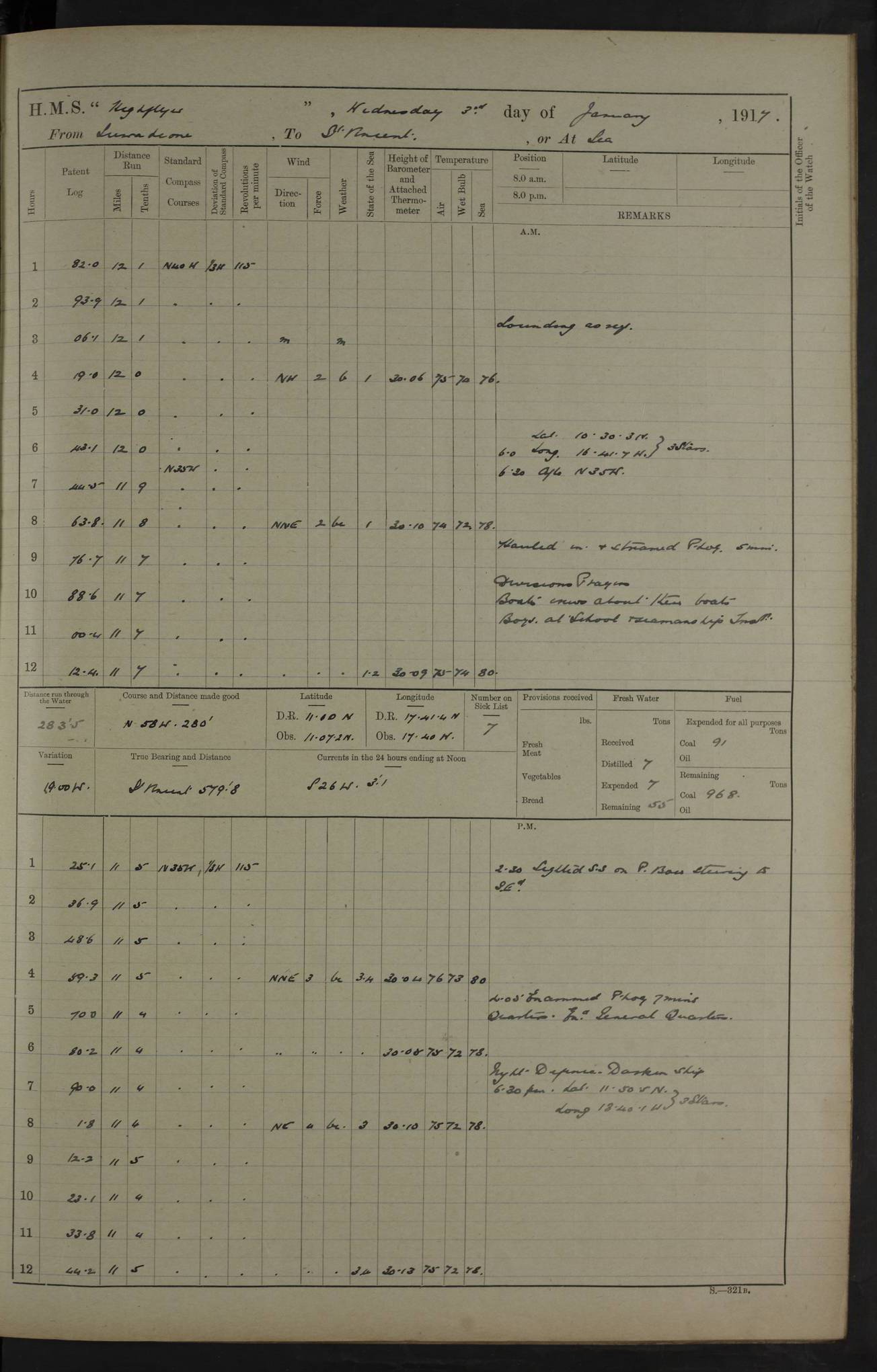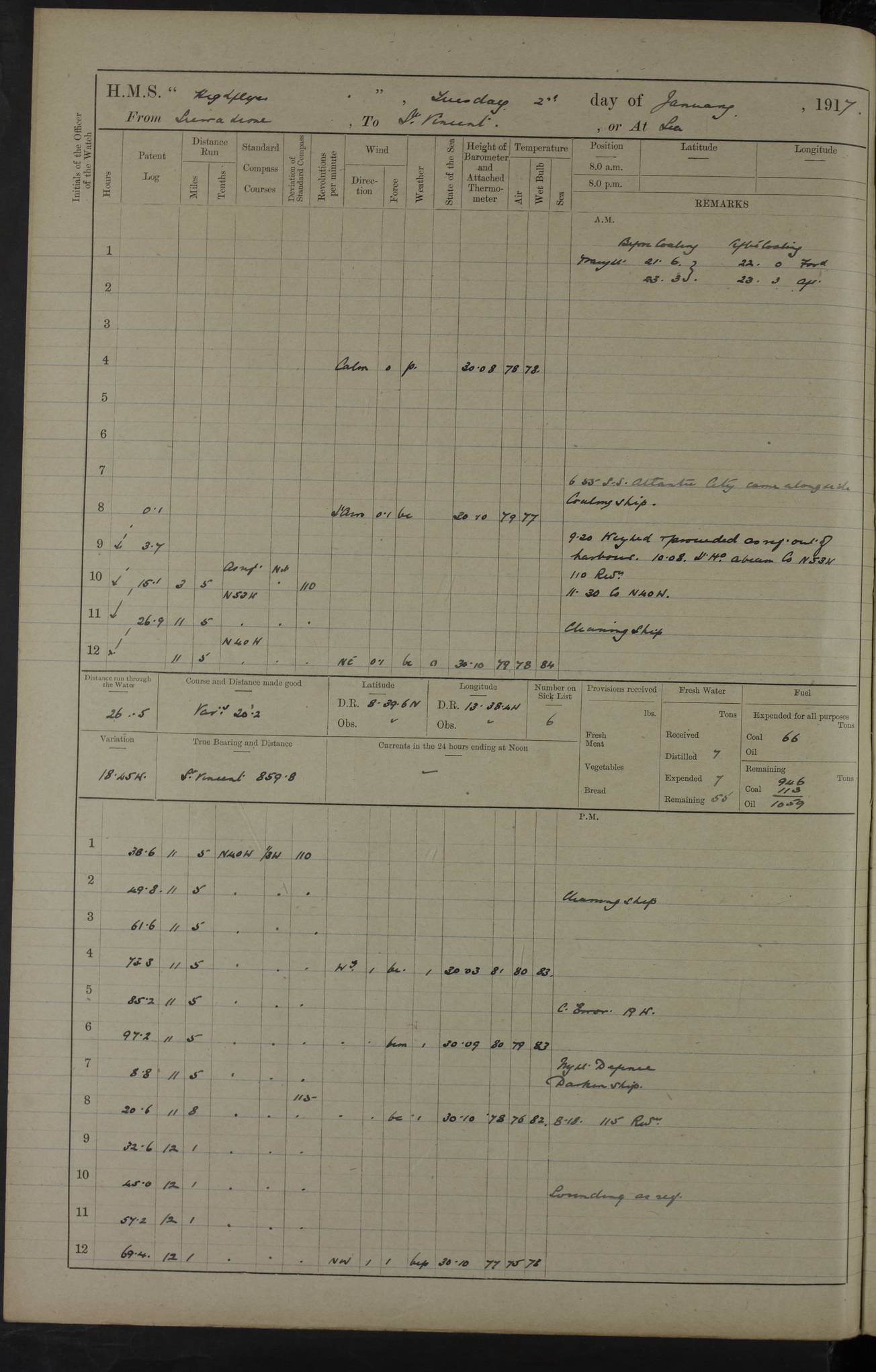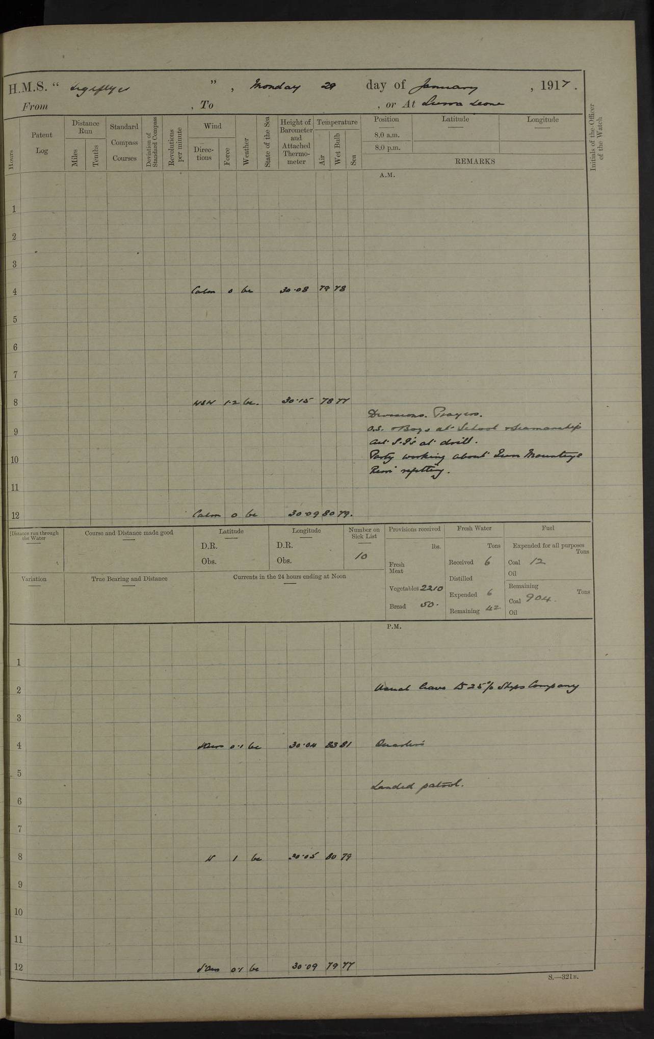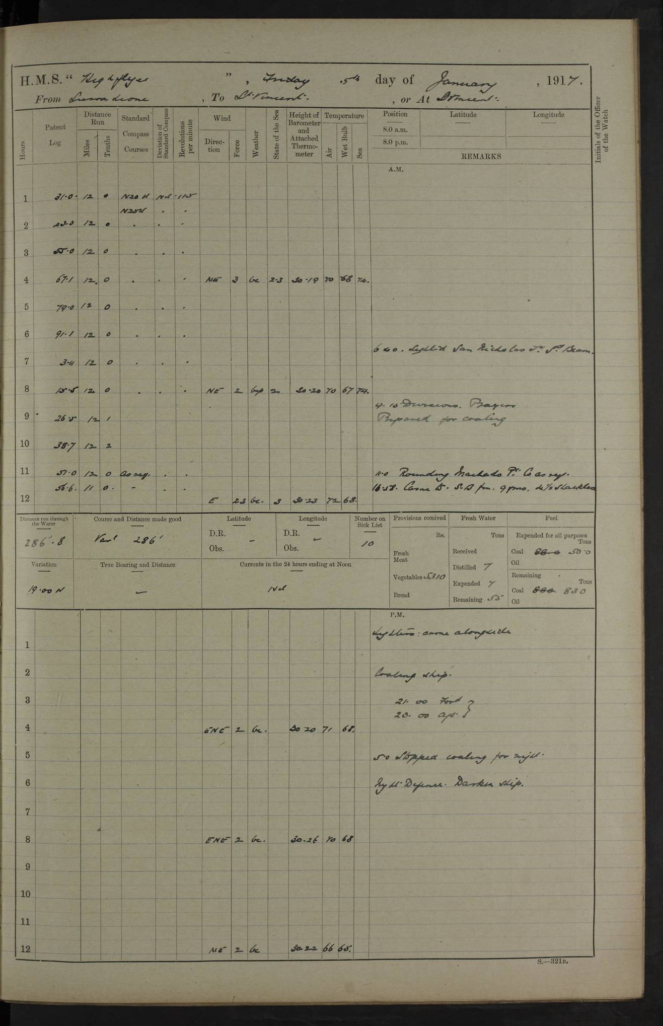 LOGS FOR JANUARY 1917 4ef4f321e53e0a0c91000902: (https://s3.amazonaws.com:443/oldweather/ADM53-44307/ADM 53-44307-129_1.jpg) 4ef4f321e53e0a0c91000903: (https://s3.amazonaws.com:443/oldweather/ADM53-44307/ADM 53-44307-130_0.jpg) 4ef4f321e53e0a0c91000904: (https://s3.amazonaws.com:443/oldweather/ADM53-44307/ADM 53-44307-130_1.jpg) 4ef4f321e53e0a0c91000905: (https://s3.amazonaws.com:443/oldweather/ADM53-44307/ADM 53-44307-131_0.jpg) 4ef4f321e53e0a0c91000906: (https://s3.amazonaws.com:443/oldweather/ADM53-44307/ADM 53-44307-131_1.jpg) 1 January 1917 Sierra Leone Lat 8.5, Long -13.2 6.30am: Party transferring provisions to DONEGAL. 10.00am: Party working on board SS VIRENT dismounting gun. 4ef4f321e53e0a0c91000907: (https://s3.amazonaws.com:443/oldweather/ADM53-44307/ADM 53-44307-132_0.jpg) 2 January 1917 Sierra Leone to St. Vincent Lat 8.7, Long -13.6 6.55am: SS ATLANTIC CITY came alongside. Coaling ship. 9.20am: Weighed and proceeded as requisite out of harbour. 4ef4f321e53e0a0c91000908: (https://s3.amazonaws.com:443/oldweather/ADM53-44307/ADM 53-44307-132_1.jpg) 3 January 1917 Sierra Leone to St. Vincent Lat 11.1, Long -17.7 2.30pm: Sighted SS on P bow steering to SE’d. 4ef4f321e53e0a0c91000909: (https://s3.amazonaws.com:443/oldweather/ADM53-44307/ADM 53-44307-133_0.jpg) 4 January 1917 Sierra Leone to St. Vincent Lat 13.8, Long -21.5 Boys and OS at school and seamanship instruction. Marines at drill. 11.30pm: Passing between St. Jago and Mayo Id. 4ef4f321e53e0a0c9100090a: (https://s3.amazonaws.com:443/oldweather/ADM53-44307/ADM 53-44307-133_1.jpg) 5 January 1917 Sierra Leone to St. Vincent Lat 16.8828, Long -25.0106 6.40am: Sighted San Nicholas Id. abeam. 11.58am: Came to SB 9 fathoms, 4½ shackles. 12.30pm: Lighters came alongside. 2.00pm: Coaling ship. 5.00pm: Stopped coaling for night. 4ef4f321e53e0a0c9100090b: (https://s3.amazonaws.com:443/oldweather/ADM53-44307/ADM 53-44307-134_0.jpg) 6 January 1917 St. Vincent Lat 16.8828, Long -25.0106 6.30am: Coaling ship from lighters. 12.30pm: Finished coaling; received 433 tons including deck cargo. 2.00pm: Prepared for sea. 4ef4f321e53e0a0c9100090c: (https://s3.amazonaws.com:443/oldweather/ADM53-44307/ADM 53-44307-134_1.jpg) 7 January 1917 St. Vincent to rendezvous to meet HMS Shannon and convoy Lat 17.4, Long -25.5 6.35am: Weighed and proceeded as requisite, 100 revs, to southward by San Antonio. 4ef4f321e53e0a0c9100090d: (https://s3.amazonaws.com:443/oldweather/ADM53-44307/ADM 53-44307-135_0.jpg) 8 January 1917 St. Vincent to meet HMS Shannon and convoy Lat 21.2, Long -26.3 9.30am: Party striking down coal. 4ef4f321e53e0a0c9100090e: (https://s3.amazonaws.com:443/oldweather/ADM53-44307/ADM 53-44307-135_1.jpg) 9 January 1917 St. Vincent to meet HMS Shannon and convoy Lat 23.9, Long -25.5 Cleaning ship. 9.00pm: Group closed up exercised during watch. 4ef4f322e53e0a0c9100090f: (https://s3.amazonaws.com:443/oldweather/ADM53-44307/ADM 53-44307-136_0.jpg) 10 January 1917 St. Vincent to meet HMS Shannon and convoy Lat 27.4, Long -25.1 2.00am: Groups closed up, exercised frequently during each watch. 6.30am: Sighted SS on southward beam steering NE’d. 4ef4f322e53e0a0c91000910: (https://s3.amazonaws.com:443/oldweather/ADM53-44307/ADM 53-44307-136_1.jpg) 11 January 1917 St. Vincent to meet HMS Shannon and convoy and to Sierra Leone Lat 29.7, Long -24.7 2.00am: Groups closed up, exercised frequently during each watch. 5.20am: Sighted SHANNON and convoy ahead – CARONIA, EMPRESS OF BRITAIN, WALMER CASTLE, TYNDAREUS, PAKEHA, NESTOR, CORINTHIC. 6.13am: Stopped. Communicated by boat with SHANNON. 6.25am: Course S17W. 115 rev. SHANNON proceeded NE’d., course as requisite to take up station with convoy. [A sketch is included showing the position of the ships. HIGHFLYER is in the middle of the front row with PAKEHA 10 cables to port and WALMER CASTLE 10 cables to starboard. NESTOR, then TYNDAREUS, follow PAKEHA. EMPRESS OF BRITAIN, then CARONIA, follow WALMER CASTLE. CORINTHIC is evenly spaced between TYNDAREUS and CARONIA.] 4ef4f322e53e0a0c91000911: (https://s3.amazonaws.com:443/oldweather/ADM53-44307/ADM 53-44307-137_0.jpg) 12 January 1917 To Sierra Leone with convoy Lat 23.9, Long -26.3 Guns’ crews closed up exercised frequently during day. Boys and OS to school and seamanship instruction. 4ef4f322e53e0a0c91000912: (https://s3.amazonaws.com:443/oldweather/ADM53-44307/ADM 53-44307-137_1.jpg) 13 January 1917 To Sierra Leone with convoy Lat 19.3, Long -28.0 3.57am: 80 rev. to allow TYNDAREUS to remedy engine defect. 4ef4f322e53e0a0c91000913: (https://s3.amazonaws.com:443/oldweather/ADM53-44307/ADM 53-44307-138_0.jpg) 14 January 1917 To Sierra Leone with convoy Lat 14.7, Long -26.9 9.00am: Mustered by Open List. 10.00am: Held Divine Service. 4ef4f322e53e0a0c91000914: (https://s3.amazonaws.com:443/oldweather/ADM53-44307/ADM 53-44307-138_1.jpg) 15 January 1917 To Sierra Leone with convoy Lat 12.3, Long -23.7 Party in stokehold trimming. 4ef4f322e53e0a0c91000915: (https://s3.amazonaws.com:443/oldweather/ADM53-44307/ADM 53-44307-139_0.jpg) 16 January 1917 To Sierra Leone with convoy Lat 10.4, Long -18.1 1.00pm: Hoisted colours half-mast. (Death on board EMPRESS OF BRITAIN.) 4ef4f322e53e0a0c91000916: (https://s3.amazonaws.com:443/oldweather/ADM53-44307/ADM 53-44307-139_1.jpg) 17 January 1917 To Sierra Leone with convoy Lat 8.5, Long -13.2 9.15am: Observed land ahead. Prepared for coaling. 10.40am: Formed single line ahead. 12.30pm: Transports proceeded independently to anchoring berths. 1.12pm: Came to with PB anchor in 10 fathoms, veered to 4 shackles, A3 berth. 5.30pm: SS MANSFIELD came alongside. 4ef4f322e53e0a0c91000917: (https://s3.amazonaws.com:443/oldweather/ADM53-44307/ADM 53-44307-140_0.jpg) 18 January 1917 Sierra Leone Lat 8.5, Long -13.2 6.00am: Commenced coaling. 2.15pm: Finished coaling; received 840 tons. 4ef4f322e53e0a0c91000918: (https://s3.amazonaws.com:443/oldweather/ADM53-44307/ADM 53-44307-140_1.jpg) 19 January 1917 Sierra Leone Lat 8.5, 