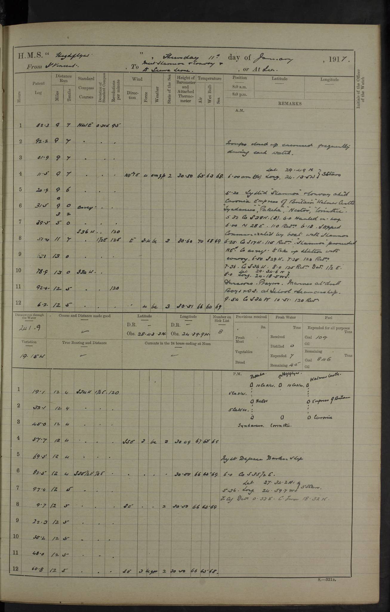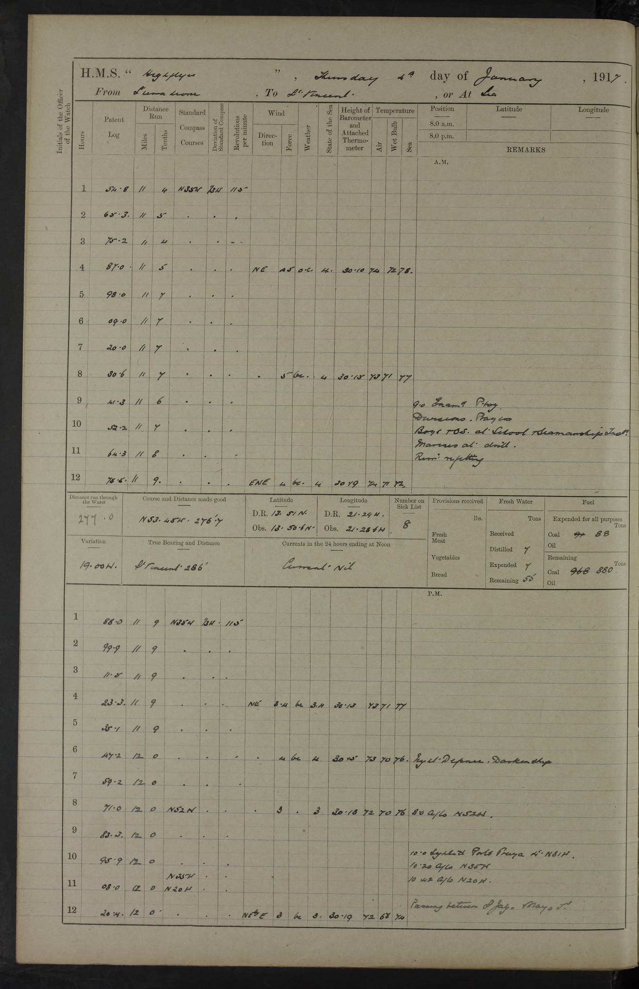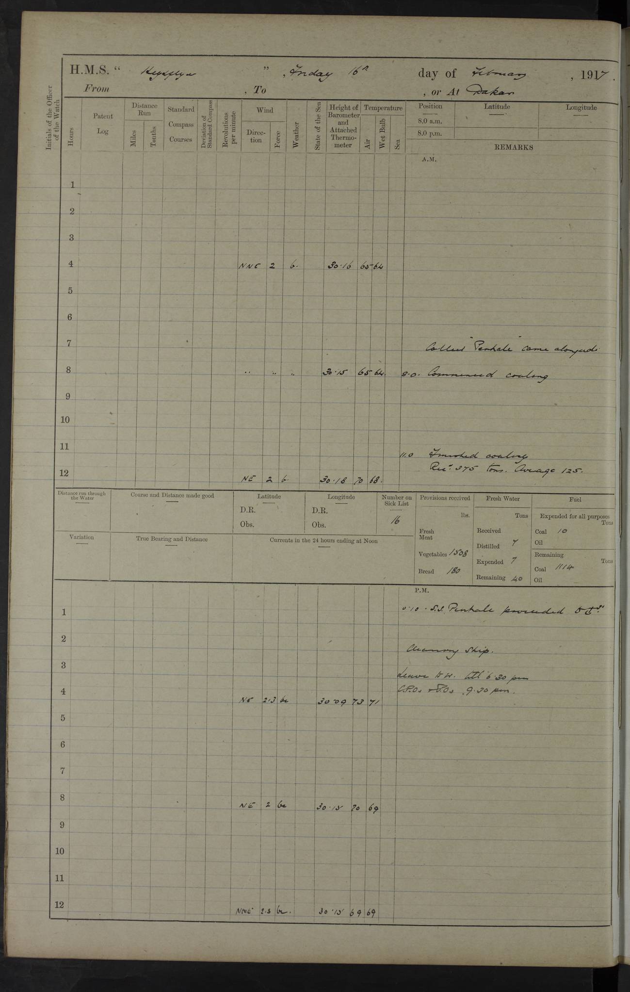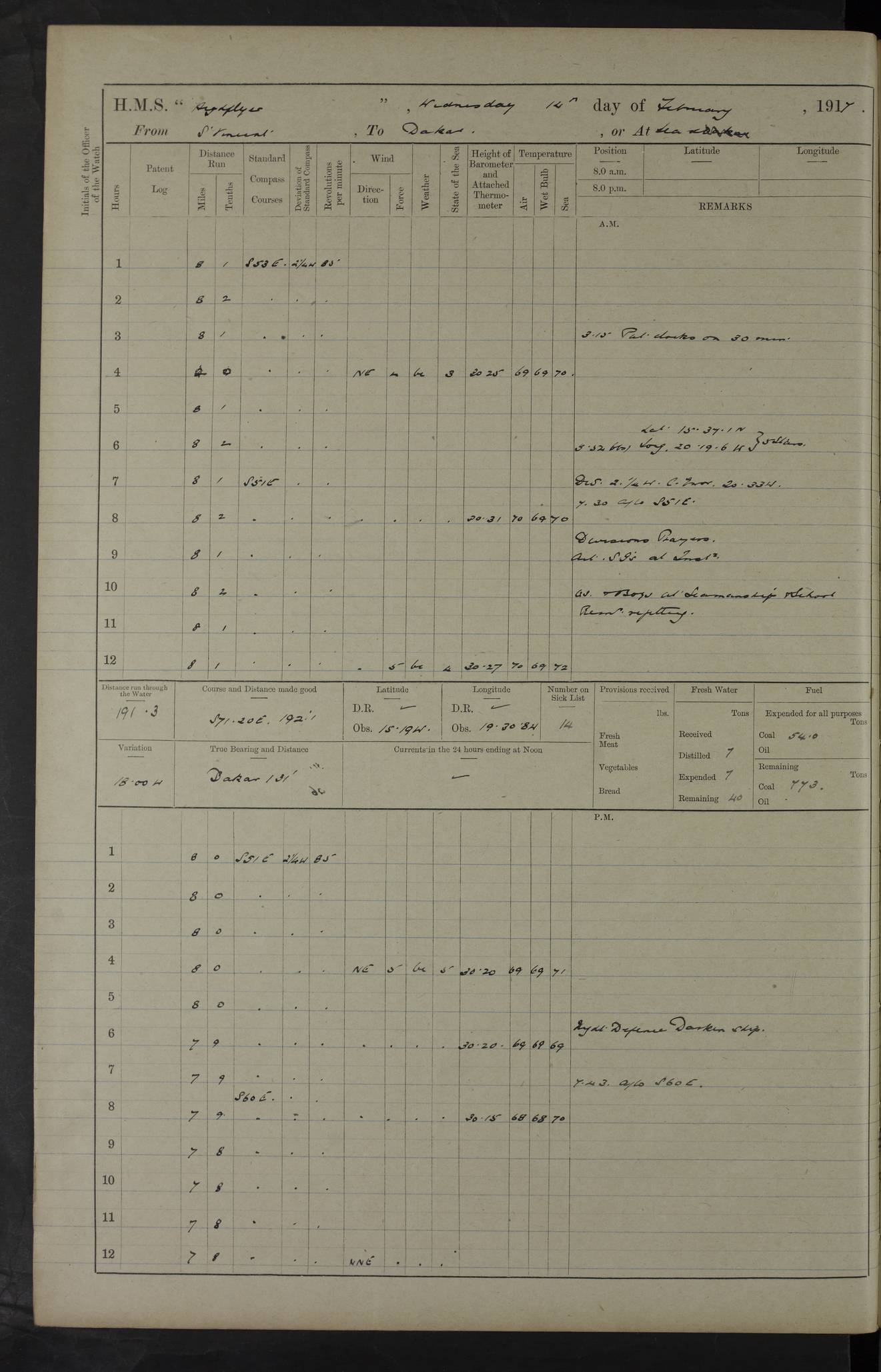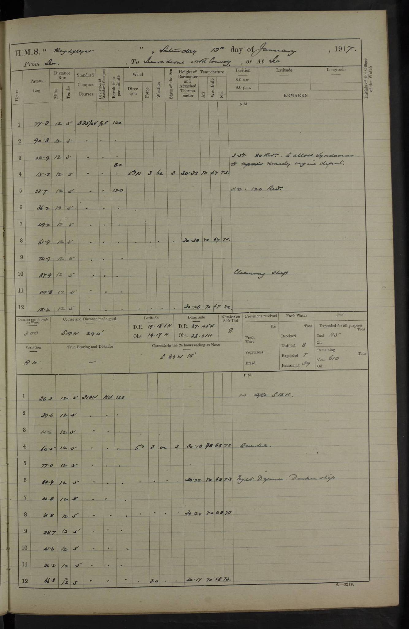 LOGS FOR JANUARY 1917 4ef4f321e53e0a0c91000902: (https://s3.amazonaws.com:443/oldweather/ADM53-44307/ADM 53-44307-129_1.jpg) 4ef4f321e53e0a0c91000903: (https://s3.amazonaws.com:443/oldweather/ADM53-44307/ADM 53-44307-130_0.jpg) 4ef4f321e53e0a0c91000904: (https://s3.amazonaws.com:443/oldweather/ADM53-44307/ADM 53-44307-130_1.jpg) 4ef4f321e53e0a0c91000905: (https://s3.amazonaws.com:443/oldweather/ADM53-44307/ADM 53-44307-131_0.jpg) 4ef4f321e53e0a0c91000906: (https://s3.amazonaws.com:443/oldweather/ADM53-44307/ADM 53-44307-131_1.jpg) 1 January 1917 Sierra Leone Lat 8.5, Long -13.2 6.30am: Party transferring provisions to DONEGAL. 10.00am: Party working on board SS VIRENT dismounting gun. 4ef4f321e53e0a0c91000907: (https://s3.amazonaws.com:443/oldweather/ADM53-44307/ADM 53-44307-132_0.jpg) 2 January 1917 Sierra Leone to St. Vincent Lat 8.7, Long -13.6 6.55am: SS ATLANTIC CITY came alongside. Coaling ship. 9.20am: Weighed and proceeded as requisite out of harbour. 4ef4f321e53e0a0c91000908: (https://s3.amazonaws.com:443/oldweather/ADM53-44307/ADM 53-44307-132_1.jpg) 3 January 1917 Sierra Leone to St. Vincent Lat 11.1, Long -17.7 2.30pm: Sighted SS on P bow steering to SE’d. 4ef4f321e53e0a0c91000909: (https://s3.amazonaws.com:443/oldweather/ADM53-44307/ADM 53-44307-133_0.jpg) 4 January 1917 Sierra Leone to St. Vincent Lat 13.8, Long -21.5 Boys and OS at school and seamanship instruction. Marines at drill. 11.30pm: Passing between St. Jago and Mayo Id. 4ef4f321e53e0a0c9100090a: (https://s3.amazonaws.com:443/oldweather/ADM53-44307/ADM 53-44307-133_1.jpg) 5 January 1917 Sierra Leone to St. Vincent Lat 16.8828, Long -25.0106 6.40am: Sighted San Nicholas Id. abeam. 11.58am: Came to SB 9 fathoms, 4½ shackles. 12.30pm: Lighters came alongside. 2.00pm: Coaling ship. 5.00pm: Stopped coaling for night. 4ef4f321e53e0a0c9100090b: (https://s3.amazonaws.com:443/oldweather/ADM53-44307/ADM 53-44307-134_0.jpg) 6 January 1917 St. Vincent Lat 16.8828, Long -25.0106 6.30am: Coaling ship from lighters. 12.30pm: Finished coaling; received 433 tons including deck cargo. 2.00pm: Prepared for sea. 4ef4f321e53e0a0c9100090c: (https://s3.amazonaws.com:443/oldweather/ADM53-44307/ADM 53-44307-134_1.jpg) 7 January 1917 St. Vincent to rendezvous to meet HMS Shannon and convoy Lat 17.4, Long -25.5 6.35am: Weighed and proceeded as requisite, 100 revs, to southward by San Antonio. 4ef4f321e53e0a0c9100090d: (https://s3.amazonaws.com:443/oldweather/ADM53-44307/ADM 53-44307-135_0.jpg) 8 January 1917 St. Vincent to meet HMS Shannon and convoy Lat 21.2, Long -26.3 9.30am: Party striking down coal. 4ef4f321e53e0a0c9100090e: (https://s3.amazonaws.com:443/oldweather/ADM53-44307/ADM 53-44307-135_1.jpg) 9 January 1917 St. Vincent to meet HMS Shannon and convoy Lat 23.9, Long -25.5 Cleaning ship. 9.00pm: Group closed up exercised during watch. 4ef4f322e53e0a0c9100090f: (https://s3.amazonaws.com:443/oldweather/ADM53-44307/ADM 53-44307-136_0.jpg) 10 January 1917 St. Vincent to meet HMS Shannon and convoy Lat 27.4, Long -25.1 2.00am: Groups closed up, exercised frequently during each watch. 6.30am: Sighted SS on southward beam steering NE’d. 4ef4f322e53e0a0c91000910: (https://s3.amazonaws.com:443/oldweather/ADM53-44307/ADM 53-44307-136_1.jpg) 11 January 1917 St. Vincent to meet HMS Shannon and convoy and to Sierra Leone Lat 29.7, Long -24.7 2.00am: Groups closed up, exercised frequently during each watch. 5.20am: Sighted SHANNON and convoy ahead – CARONIA, EMPRESS OF BRITAIN, WALMER CASTLE, TYNDAREUS, PAKEHA, NESTOR, CORINTHIC. 6.13am: Stopped. Communicated by boat with SHANNON. 6.25am: Course S17W. 115 rev. SHANNON proceeded NE’d., course as requisite to take up station with convoy. [A sketch is included showing the position of the ships. HIGHFLYER is in the middle of the front row with PAKEHA 10 cables to port and WALMER CASTLE 10 cables to starboard. NESTOR, then TYNDAREUS, follow PAKEHA. EMPRESS OF BRITAIN, then CARONIA, follow WALMER CASTLE. CORINTHIC is evenly spaced between TYNDAREUS and CARONIA.] 4ef4f322e53e0a0c91000911: (https://s3.amazonaws.com:443/oldweather/ADM53-44307/ADM 53-44307-137_0.jpg) 12 January 1917 To Sierra Leone with convoy Lat 23.9, Long -26.3 Guns’ crews closed up exercised frequently during day. Boys and OS to school and seamanship instruction. 4ef4f322e53e0a0c91000912: (https://s3.amazonaws.com:443/oldweather/ADM53-44307/ADM 53-44307-137_1.jpg) 13 January 1917 To Sierra Leone with convoy Lat 19.3, Long -28.0 3.57am: 80 rev. to allow TYNDAREUS to remedy engine defect. 4ef4f322e53e0a0c91000913: (https://s3.amazonaws.com:443/oldweather/ADM53-44307/ADM 53-44307-138_0.jpg) 14 January 1917 To Sierra Leone with convoy Lat 14.7, Long -26.9 9.00am: Mustered by Open List. 10.00am: Held Divine Service. 4ef4f322e53e0a0c91000914: (https://s3.amazonaws.com:443/oldweather/ADM53-44307/ADM 53-44307-138_1.jpg) 15 January 1917 To Sierra Leone with convoy Lat 12.3, Long -23.7 Party in stokehold trimming. 4ef4f322e53e0a0c91000915: (https://s3.amazonaws.com:443/oldweather/ADM53-44307/ADM 53-44307-139_0.jpg) 16 January 1917 To Sierra Leone with convoy Lat 10.4, Long -18.1 1.00pm: Hoisted colours half-mast. (Death on board EMPRESS OF BRITAIN.) 4ef4f322e53e0a0c91000916: (https://s3.amazonaws.com:443/oldweather/ADM53-44307/ADM 53-44307-139_1.jpg) 17 January 1917 To Sierra Leone with convoy Lat 8.5, Long -13.2 9.15am: Observed land ahead. Prepared for coaling. 10.40am: Formed single line ahead. 12.30pm: Transports proceeded independently to anchoring berths. 1.12pm: Came to with PB anchor in 10 fathoms, veered to 4 shackles, A3 berth. 5.30pm: SS MANSFIELD came alongside. 4ef4f322e53e0a0c91000917: (https://s3.amazonaws.com:443/oldweather/ADM53-44307/ADM 53-44307-140_0.jpg) 18 January 1917 Sierra Leone Lat 8.5, Long -13.2 6.00am: Commenced coaling. 2.15pm: Finished coaling; received 840 tons. 4ef4f322e53e0a0c91000918: (https://s3.amazonaws.com:443/oldweather/ADM53-44307/ADM 53-44307-140_1.jpg) 19 January 1917 Sierra Leone Lat 8.5, 