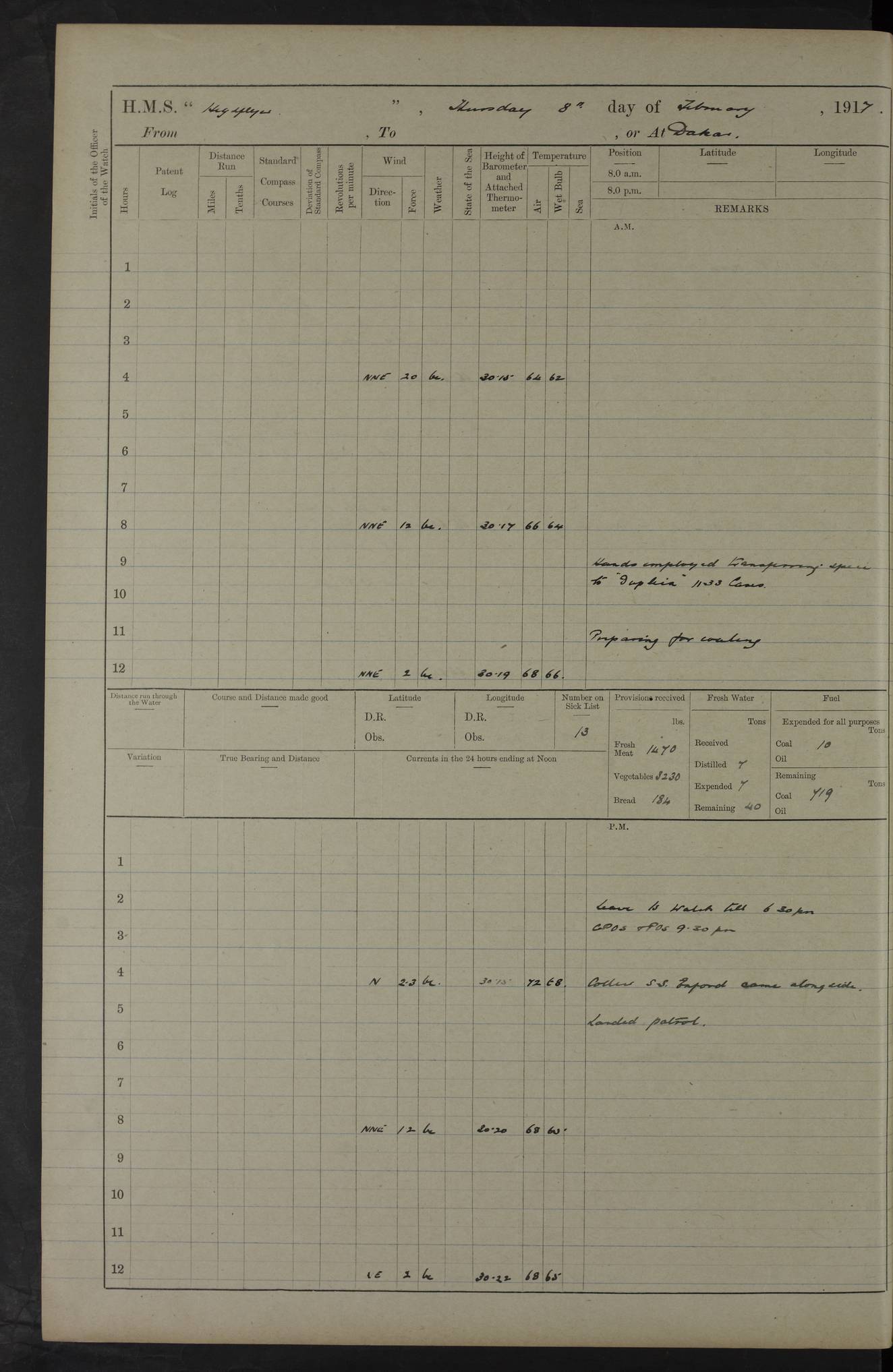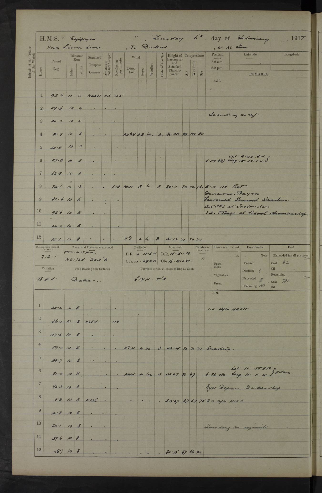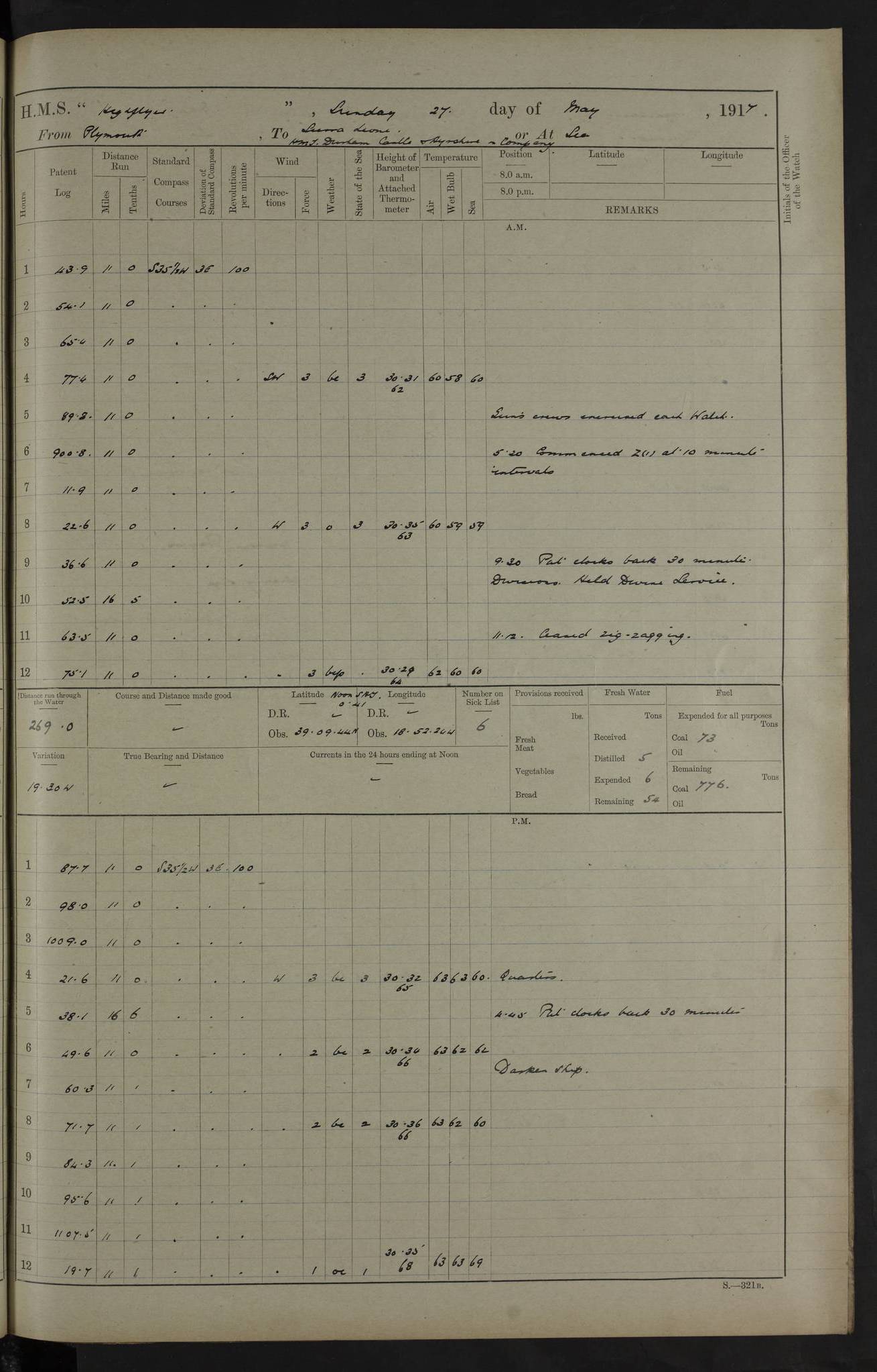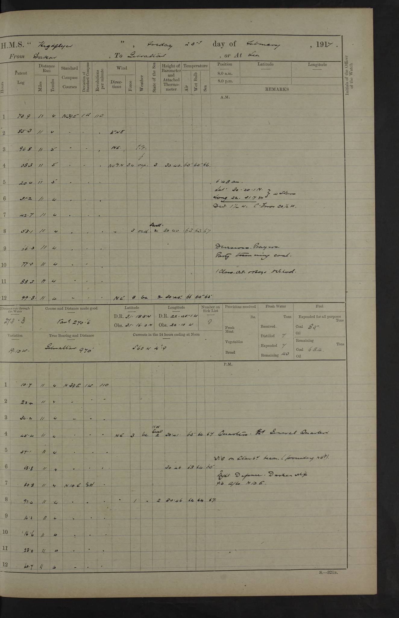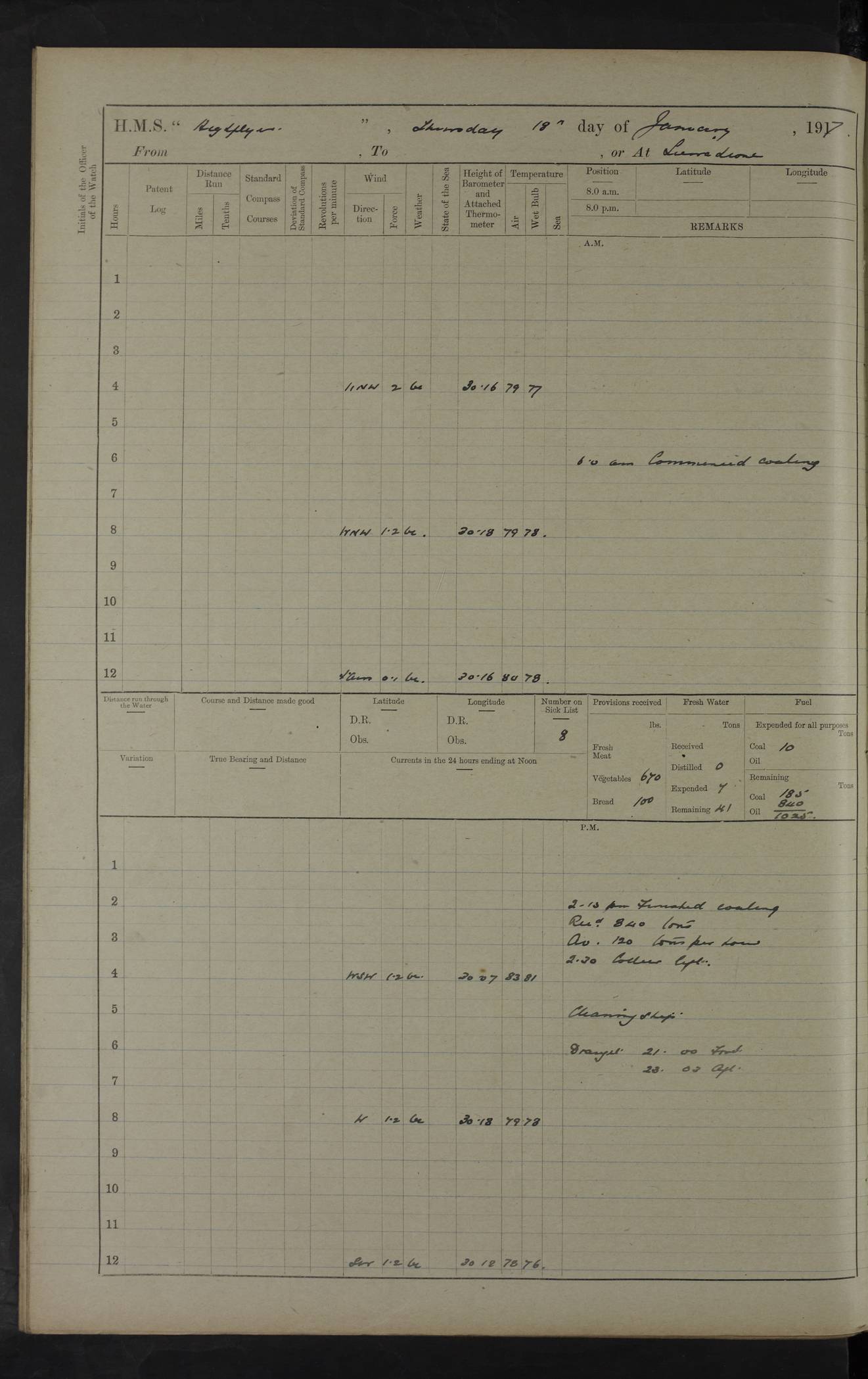 LOGS FOR JANUARY 1917 4ef4f321e53e0a0c91000902: (https://s3.amazonaws.com:443/oldweather/ADM53-44307/ADM 53-44307-129_1.jpg) 4ef4f321e53e0a0c91000903: (https://s3.amazonaws.com:443/oldweather/ADM53-44307/ADM 53-44307-130_0.jpg) 4ef4f321e53e0a0c91000904: (https://s3.amazonaws.com:443/oldweather/ADM53-44307/ADM 53-44307-130_1.jpg) 4ef4f321e53e0a0c91000905: (https://s3.amazonaws.com:443/oldweather/ADM53-44307/ADM 53-44307-131_0.jpg) 4ef4f321e53e0a0c91000906: (https://s3.amazonaws.com:443/oldweather/ADM53-44307/ADM 53-44307-131_1.jpg) 1 January 1917 Sierra Leone Lat 8.5, Long -13.2 6.30am: Party transferring provisions to DONEGAL. 10.00am: Party working on board SS VIRENT dismounting gun. 4ef4f321e53e0a0c91000907: (https://s3.amazonaws.com:443/oldweather/ADM53-44307/ADM 53-44307-132_0.jpg) 2 January 1917 Sierra Leone to St. Vincent Lat 8.7, Long -13.6 6.55am: SS ATLANTIC CITY came alongside. Coaling ship. 9.20am: Weighed and proceeded as requisite out of harbour. 4ef4f321e53e0a0c91000908: (https://s3.amazonaws.com:443/oldweather/ADM53-44307/ADM 53-44307-132_1.jpg) 3 January 1917 Sierra Leone to St. Vincent Lat 11.1, Long -17.7 2.30pm: Sighted SS on P bow steering to SE’d. 4ef4f321e53e0a0c91000909: (https://s3.amazonaws.com:443/oldweather/ADM53-44307/ADM 53-44307-133_0.jpg) 4 January 1917 Sierra Leone to St. Vincent Lat 13.8, Long -21.5 Boys and OS at school and seamanship instruction. Marines at drill. 11.30pm: Passing between St. Jago and Mayo Id. 4ef4f321e53e0a0c9100090a: (https://s3.amazonaws.com:443/oldweather/ADM53-44307/ADM 53-44307-133_1.jpg) 5 January 1917 Sierra Leone to St. Vincent Lat 16.8828, Long -25.0106 6.40am: Sighted San Nicholas Id. abeam. 11.58am: Came to SB 9 fathoms, 4½ shackles. 12.30pm: Lighters came alongside. 2.00pm: Coaling ship. 5.00pm: Stopped coaling for night. 4ef4f321e53e0a0c9100090b: (https://s3.amazonaws.com:443/oldweather/ADM53-44307/ADM 53-44307-134_0.jpg) 6 January 1917 St. Vincent Lat 16.8828, Long -25.0106 6.30am: Coaling ship from lighters. 12.30pm: Finished coaling; received 433 tons including deck cargo. 2.00pm: Prepared for sea. 4ef4f321e53e0a0c9100090c: (https://s3.amazonaws.com:443/oldweather/ADM53-44307/ADM 53-44307-134_1.jpg) 7 January 1917 St. Vincent to rendezvous to meet HMS Shannon and convoy Lat 17.4, Long -25.5 6.35am: Weighed and proceeded as requisite, 100 revs, to southward by San Antonio. 4ef4f321e53e0a0c9100090d: (https://s3.amazonaws.com:443/oldweather/ADM53-44307/ADM 53-44307-135_0.jpg) 8 January 1917 St. Vincent to meet HMS Shannon and convoy Lat 21.2, Long -26.3 9.30am: Party striking down coal. 4ef4f321e53e0a0c9100090e: (https://s3.amazonaws.com:443/oldweather/ADM53-44307/ADM 53-44307-135_1.jpg) 9 January 1917 St. Vincent to meet HMS Shannon and convoy Lat 23.9, Long -25.5 Cleaning ship. 9.00pm: Group closed up exercised during watch. 4ef4f322e53e0a0c9100090f: (https://s3.amazonaws.com:443/oldweather/ADM53-44307/ADM 53-44307-136_0.jpg) 10 January 1917 St. Vincent to meet HMS Shannon and convoy Lat 27.4, Long -25.1 2.00am: Groups closed up, exercised frequently during each watch. 6.30am: Sighted SS on southward beam steering NE’d. 4ef4f322e53e0a0c91000910: (https://s3.amazonaws.com:443/oldweather/ADM53-44307/ADM 53-44307-136_1.jpg) 11 January 1917 St. Vincent to meet HMS Shannon and convoy and to Sierra Leone Lat 29.7, Long -24.7 2.00am: Groups closed up, exercised frequently during each watch. 5.20am: Sighted SHANNON and convoy ahead – CARONIA, EMPRESS OF BRITAIN, WALMER CASTLE, TYNDAREUS, PAKEHA, NESTOR, CORINTHIC. 6.13am: Stopped. Communicated by boat with SHANNON. 6.25am: Course S17W. 115 rev. SHANNON proceeded NE’d., course as requisite to take up station with convoy. [A sketch is included showing the position of the ships. HIGHFLYER is in the middle of the front row with PAKEHA 10 cables to port and WALMER CASTLE 10 cables to starboard. NESTOR, then TYNDAREUS, follow PAKEHA. EMPRESS OF BRITAIN, then CARONIA, follow WALMER CASTLE. CORINTHIC is evenly spaced between TYNDAREUS and CARONIA.] 4ef4f322e53e0a0c91000911: (https://s3.amazonaws.com:443/oldweather/ADM53-44307/ADM 53-44307-137_0.jpg) 12 January 1917 To Sierra Leone with convoy Lat 23.9, Long -26.3 Guns’ crews closed up exercised frequently during day. Boys and OS to school and seamanship instruction. 4ef4f322e53e0a0c91000912: (https://s3.amazonaws.com:443/oldweather/ADM53-44307/ADM 53-44307-137_1.jpg) 13 January 1917 To Sierra Leone with convoy Lat 19.3, Long -28.0 3.57am: 80 rev. to allow TYNDAREUS to remedy engine defect. 4ef4f322e53e0a0c91000913: (https://s3.amazonaws.com:443/oldweather/ADM53-44307/ADM 53-44307-138_0.jpg) 14 January 1917 To Sierra Leone with convoy Lat 14.7, Long -26.9 9.00am: Mustered by Open List. 10.00am: Held Divine Service. 4ef4f322e53e0a0c91000914: (https://s3.amazonaws.com:443/oldweather/ADM53-44307/ADM 53-44307-138_1.jpg) 15 January 1917 To Sierra Leone with convoy Lat 12.3, Long -23.7 Party in stokehold trimming. 4ef4f322e53e0a0c91000915: (https://s3.amazonaws.com:443/oldweather/ADM53-44307/ADM 53-44307-139_0.jpg) 16 January 1917 To Sierra Leone with convoy Lat 10.4, Long -18.1 1.00pm: Hoisted colours half-mast. (Death on board EMPRESS OF BRITAIN.) 4ef4f322e53e0a0c91000916: (https://s3.amazonaws.com:443/oldweather/ADM53-44307/ADM 53-44307-139_1.jpg) 17 January 1917 To Sierra Leone with convoy Lat 8.5, Long -13.2 9.15am: Observed land ahead. Prepared for coaling. 10.40am: Formed single line ahead. 12.30pm: Transports proceeded independently to anchoring berths. 1.12pm: Came to with PB anchor in 10 fathoms, veered to 4 shackles, A3 berth. 5.30pm: SS MANSFIELD came alongside. 4ef4f322e53e0a0c91000917: (https://s3.amazonaws.com:443/oldweather/ADM53-44307/ADM 53-44307-140_0.jpg) 18 January 1917 Sierra Leone Lat 8.5, Long -13.2 6.00am: Commenced coaling. 2.15pm: Finished coaling; received 840 tons. 4ef4f322e53e0a0c91000918: (https://s3.amazonaws.com:443/oldweather/ADM53-44307/ADM 53-44307-140_1.jpg) 19 January 1917 Sierra Leone Lat 8.5, 