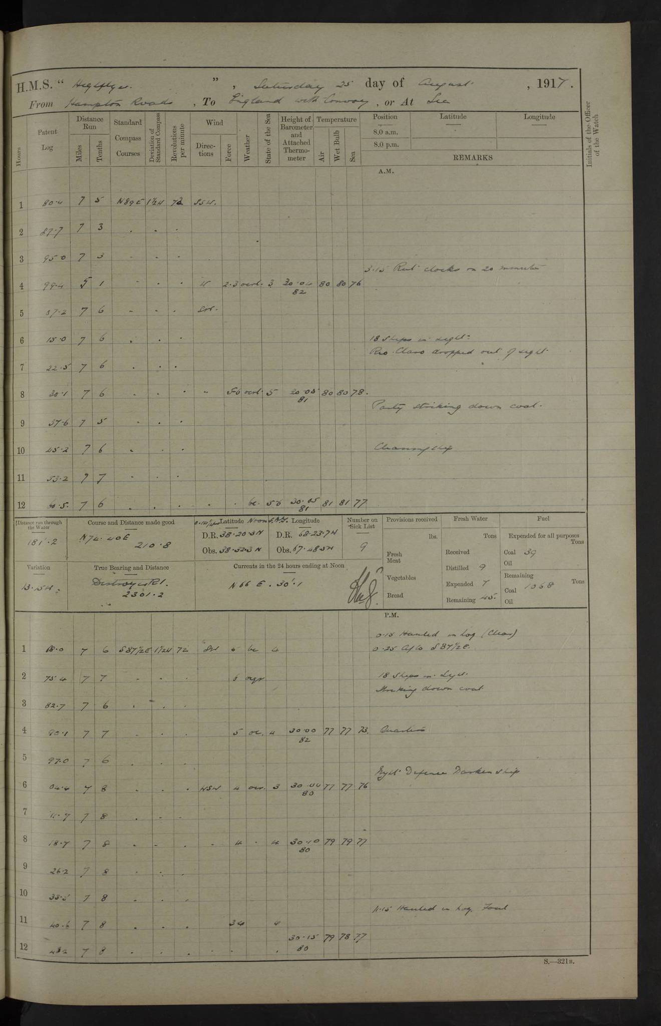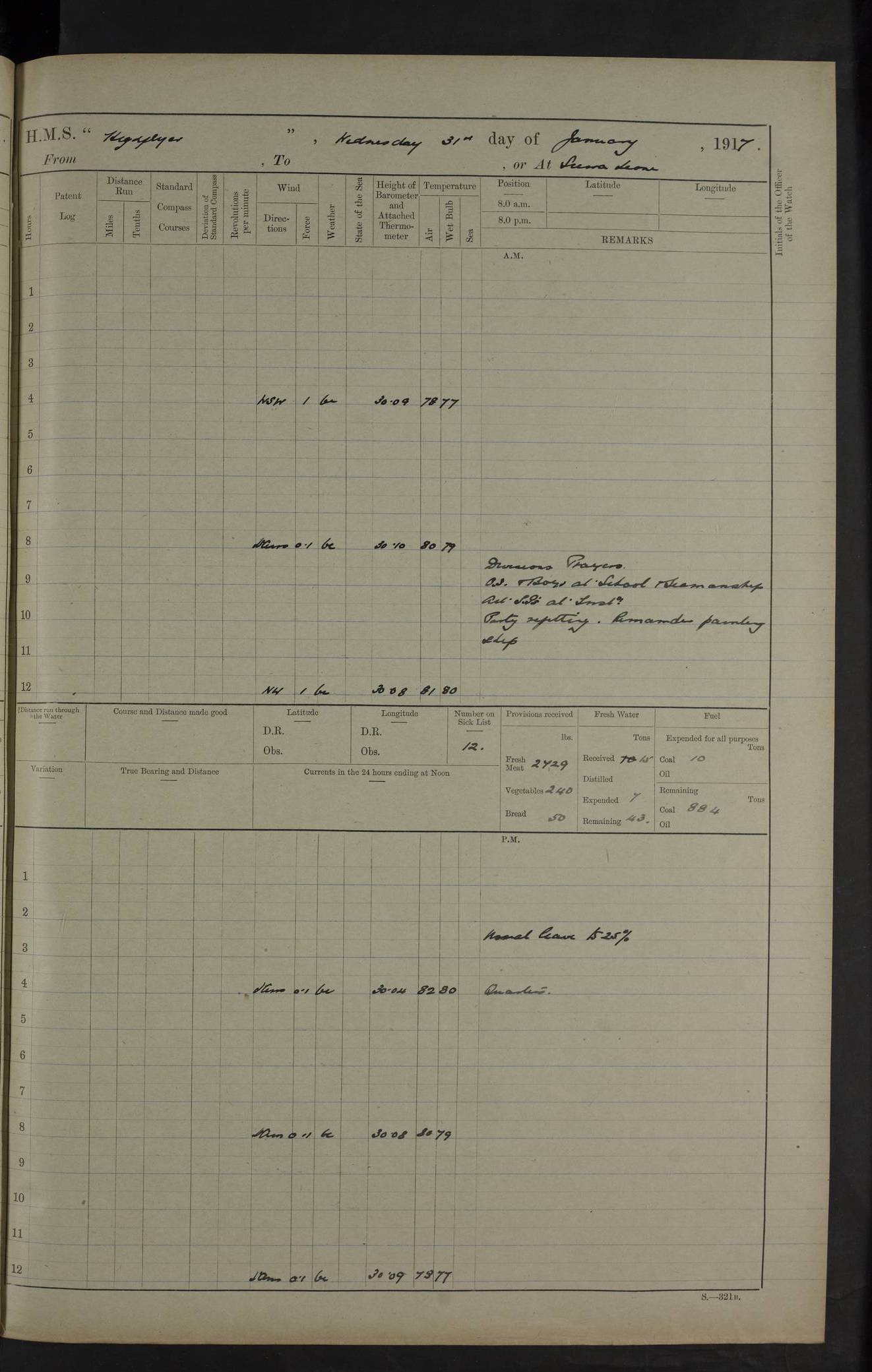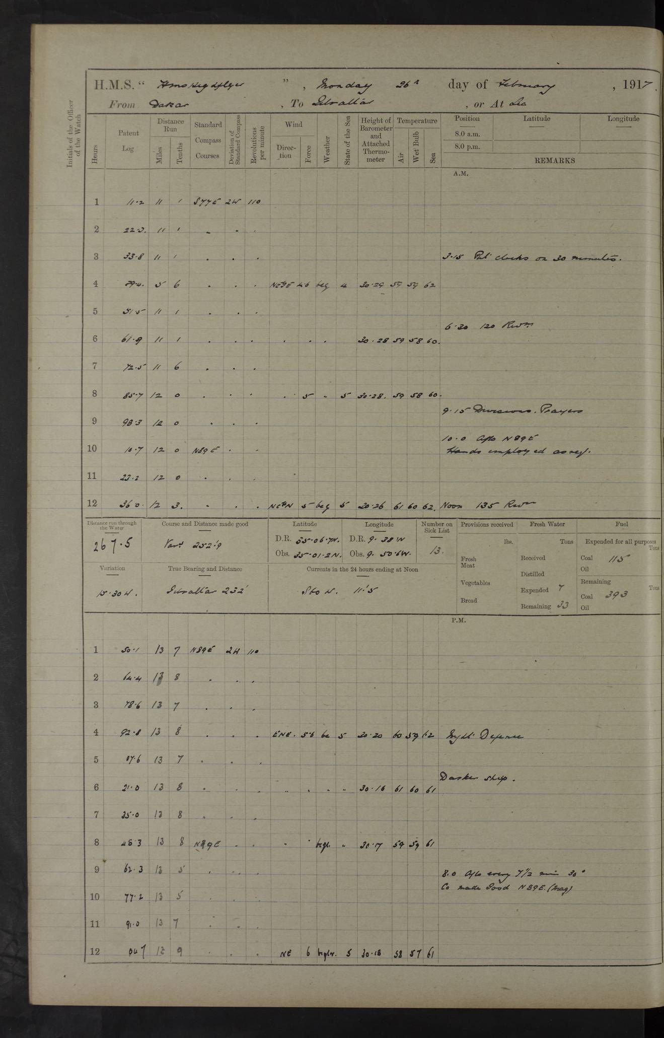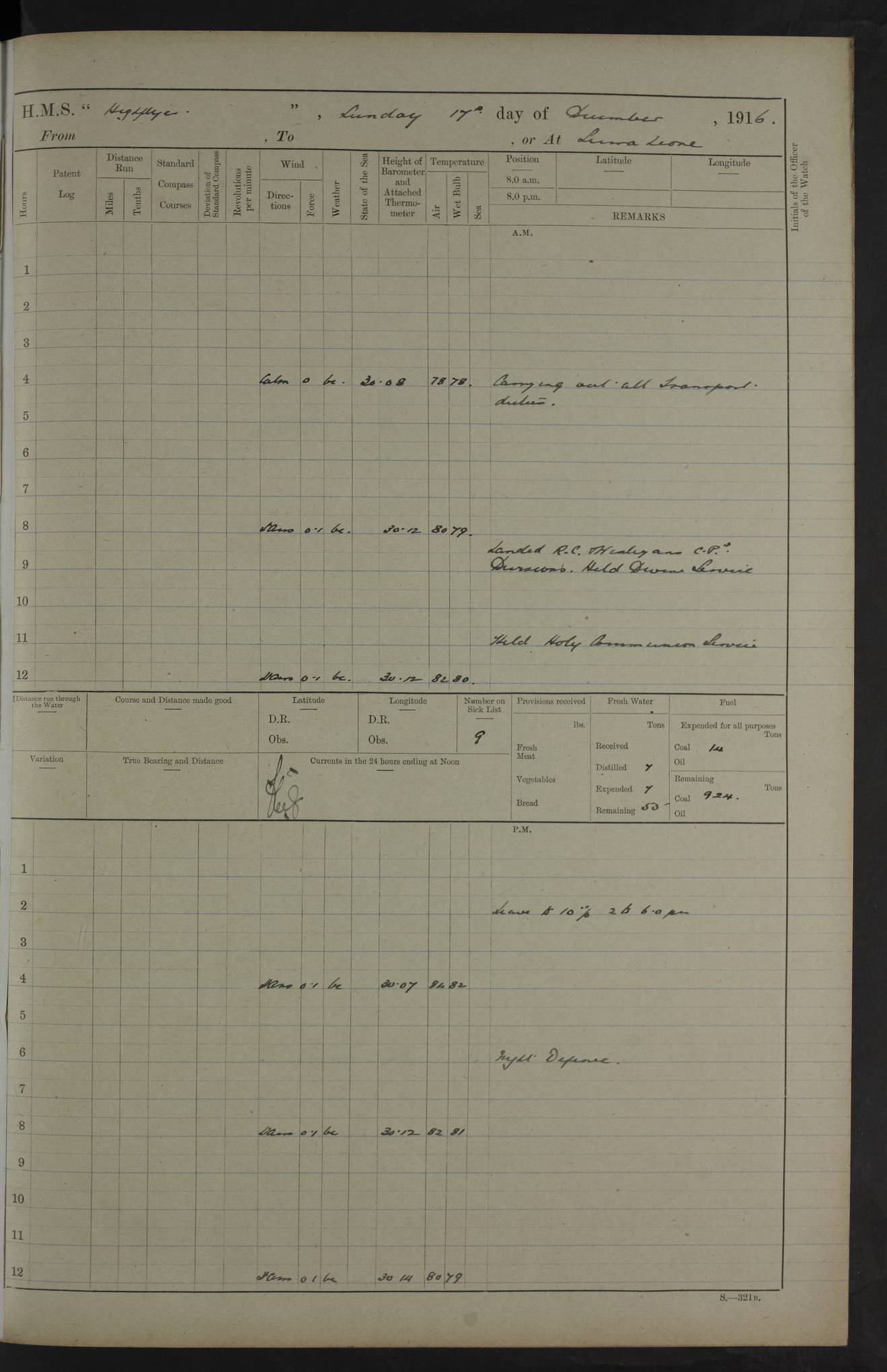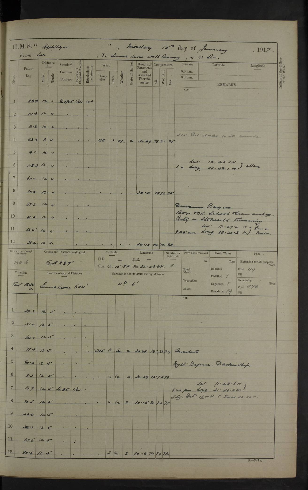 LOGS FOR JANUARY 1917 4ef4f321e53e0a0c91000902: (https://s3.amazonaws.com:443/oldweather/ADM53-44307/ADM 53-44307-129_1.jpg) 4ef4f321e53e0a0c91000903: (https://s3.amazonaws.com:443/oldweather/ADM53-44307/ADM 53-44307-130_0.jpg) 4ef4f321e53e0a0c91000904: (https://s3.amazonaws.com:443/oldweather/ADM53-44307/ADM 53-44307-130_1.jpg) 4ef4f321e53e0a0c91000905: (https://s3.amazonaws.com:443/oldweather/ADM53-44307/ADM 53-44307-131_0.jpg) 4ef4f321e53e0a0c91000906: (https://s3.amazonaws.com:443/oldweather/ADM53-44307/ADM 53-44307-131_1.jpg) 1 January 1917 Sierra Leone Lat 8.5, Long -13.2 6.30am: Party transferring provisions to DONEGAL. 10.00am: Party working on board SS VIRENT dismounting gun. 4ef4f321e53e0a0c91000907: (https://s3.amazonaws.com:443/oldweather/ADM53-44307/ADM 53-44307-132_0.jpg) 2 January 1917 Sierra Leone to St. Vincent Lat 8.7, Long -13.6 6.55am: SS ATLANTIC CITY came alongside. Coaling ship. 9.20am: Weighed and proceeded as requisite out of harbour. 4ef4f321e53e0a0c91000908: (https://s3.amazonaws.com:443/oldweather/ADM53-44307/ADM 53-44307-132_1.jpg) 3 January 1917 Sierra Leone to St. Vincent Lat 11.1, Long -17.7 2.30pm: Sighted SS on P bow steering to SE’d. 4ef4f321e53e0a0c91000909: (https://s3.amazonaws.com:443/oldweather/ADM53-44307/ADM 53-44307-133_0.jpg) 4 January 1917 Sierra Leone to St. Vincent Lat 13.8, Long -21.5 Boys and OS at school and seamanship instruction. Marines at drill. 11.30pm: Passing between St. Jago and Mayo Id. 4ef4f321e53e0a0c9100090a: (https://s3.amazonaws.com:443/oldweather/ADM53-44307/ADM 53-44307-133_1.jpg) 5 January 1917 Sierra Leone to St. Vincent Lat 16.8828, Long -25.0106 6.40am: Sighted San Nicholas Id. abeam. 11.58am: Came to SB 9 fathoms, 4½ shackles. 12.30pm: Lighters came alongside. 2.00pm: Coaling ship. 5.00pm: Stopped coaling for night. 4ef4f321e53e0a0c9100090b: (https://s3.amazonaws.com:443/oldweather/ADM53-44307/ADM 53-44307-134_0.jpg) 6 January 1917 St. Vincent Lat 16.8828, Long -25.0106 6.30am: Coaling ship from lighters. 12.30pm: Finished coaling; received 433 tons including deck cargo. 2.00pm: Prepared for sea. 4ef4f321e53e0a0c9100090c: (https://s3.amazonaws.com:443/oldweather/ADM53-44307/ADM 53-44307-134_1.jpg) 7 January 1917 St. Vincent to rendezvous to meet HMS Shannon and convoy Lat 17.4, Long -25.5 6.35am: Weighed and proceeded as requisite, 100 revs, to southward by San Antonio. 4ef4f321e53e0a0c9100090d: (https://s3.amazonaws.com:443/oldweather/ADM53-44307/ADM 53-44307-135_0.jpg) 8 January 1917 St. Vincent to meet HMS Shannon and convoy Lat 21.2, Long -26.3 9.30am: Party striking down coal. 4ef4f321e53e0a0c9100090e: (https://s3.amazonaws.com:443/oldweather/ADM53-44307/ADM 53-44307-135_1.jpg) 9 January 1917 St. Vincent to meet HMS Shannon and convoy Lat 23.9, Long -25.5 Cleaning ship. 9.00pm: Group closed up exercised during watch. 4ef4f322e53e0a0c9100090f: (https://s3.amazonaws.com:443/oldweather/ADM53-44307/ADM 53-44307-136_0.jpg) 10 January 1917 St. Vincent to meet HMS Shannon and convoy Lat 27.4, Long -25.1 2.00am: Groups closed up, exercised frequently during each watch. 6.30am: Sighted SS on southward beam steering NE’d. 4ef4f322e53e0a0c91000910: (https://s3.amazonaws.com:443/oldweather/ADM53-44307/ADM 53-44307-136_1.jpg) 11 January 1917 St. Vincent to meet HMS Shannon and convoy and to Sierra Leone Lat 29.7, Long -24.7 2.00am: Groups closed up, exercised frequently during each watch. 5.20am: Sighted SHANNON and convoy ahead – CARONIA, EMPRESS OF BRITAIN, WALMER CASTLE, TYNDAREUS, PAKEHA, NESTOR, CORINTHIC. 6.13am: Stopped. Communicated by boat with SHANNON. 6.25am: Course S17W. 115 rev. SHANNON proceeded NE’d., course as requisite to take up station with convoy. [A sketch is included showing the position of the ships. HIGHFLYER is in the middle of the front row with PAKEHA 10 cables to port and WALMER CASTLE 10 cables to starboard. NESTOR, then TYNDAREUS, follow PAKEHA. EMPRESS OF BRITAIN, then CARONIA, follow WALMER CASTLE. CORINTHIC is evenly spaced between TYNDAREUS and CARONIA.] 4ef4f322e53e0a0c91000911: (https://s3.amazonaws.com:443/oldweather/ADM53-44307/ADM 53-44307-137_0.jpg) 12 January 1917 To Sierra Leone with convoy Lat 23.9, Long -26.3 Guns’ crews closed up exercised frequently during day. Boys and OS to school and seamanship instruction. 4ef4f322e53e0a0c91000912: (https://s3.amazonaws.com:443/oldweather/ADM53-44307/ADM 53-44307-137_1.jpg) 13 January 1917 To Sierra Leone with convoy Lat 19.3, Long -28.0 3.57am: 80 rev. to allow TYNDAREUS to remedy engine defect. 4ef4f322e53e0a0c91000913: (https://s3.amazonaws.com:443/oldweather/ADM53-44307/ADM 53-44307-138_0.jpg) 14 January 1917 To Sierra Leone with convoy Lat 14.7, Long -26.9 9.00am: Mustered by Open List. 10.00am: Held Divine Service. 4ef4f322e53e0a0c91000914: (https://s3.amazonaws.com:443/oldweather/ADM53-44307/ADM 53-44307-138_1.jpg) 15 January 1917 To Sierra Leone with convoy Lat 12.3, Long -23.7 Party in stokehold trimming. 4ef4f322e53e0a0c91000915: (https://s3.amazonaws.com:443/oldweather/ADM53-44307/ADM 53-44307-139_0.jpg) 16 January 1917 To Sierra Leone with convoy Lat 10.4, Long -18.1 1.00pm: Hoisted colours half-mast. (Death on board EMPRESS OF BRITAIN.) 4ef4f322e53e0a0c91000916: (https://s3.amazonaws.com:443/oldweather/ADM53-44307/ADM 53-44307-139_1.jpg) 17 January 1917 To Sierra Leone with convoy Lat 8.5, Long -13.2 9.15am: Observed land ahead. Prepared for coaling. 10.40am: Formed single line ahead. 12.30pm: Transports proceeded independently to anchoring berths. 1.12pm: Came to with PB anchor in 10 fathoms, veered to 4 shackles, A3 berth. 5.30pm: SS MANSFIELD came alongside. 4ef4f322e53e0a0c91000917: (https://s3.amazonaws.com:443/oldweather/ADM53-44307/ADM 53-44307-140_0.jpg) 18 January 1917 Sierra Leone Lat 8.5, Long -13.2 6.00am: Commenced coaling. 2.15pm: Finished coaling; received 840 tons. 4ef4f322e53e0a0c91000918: (https://s3.amazonaws.com:443/oldweather/ADM53-44307/ADM 53-44307-140_1.jpg) 19 January 1917 Sierra Leone Lat 8.5, 