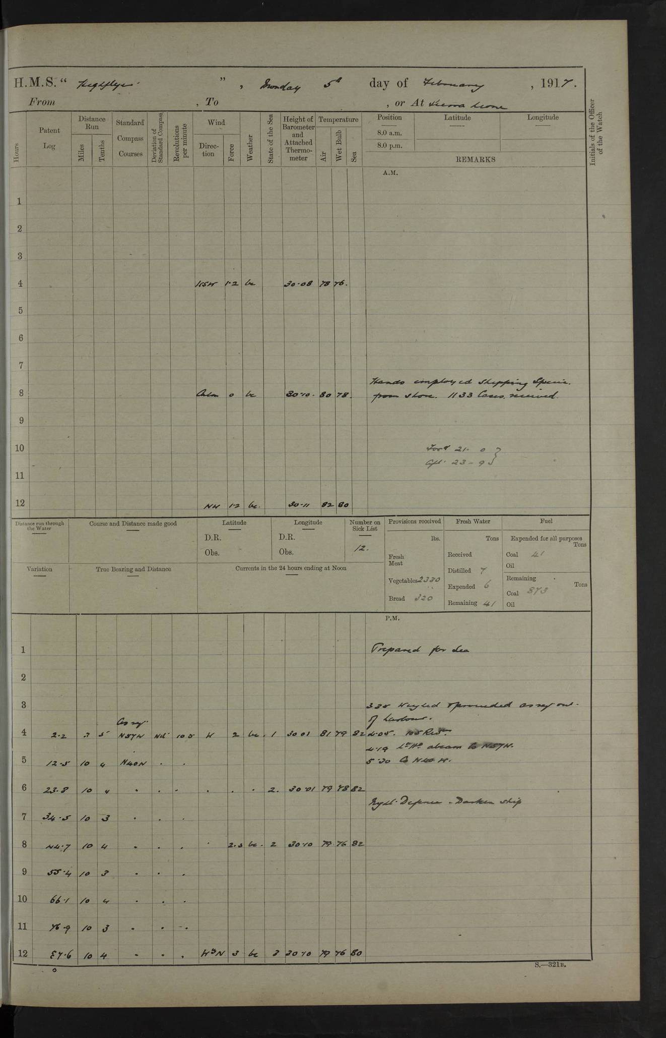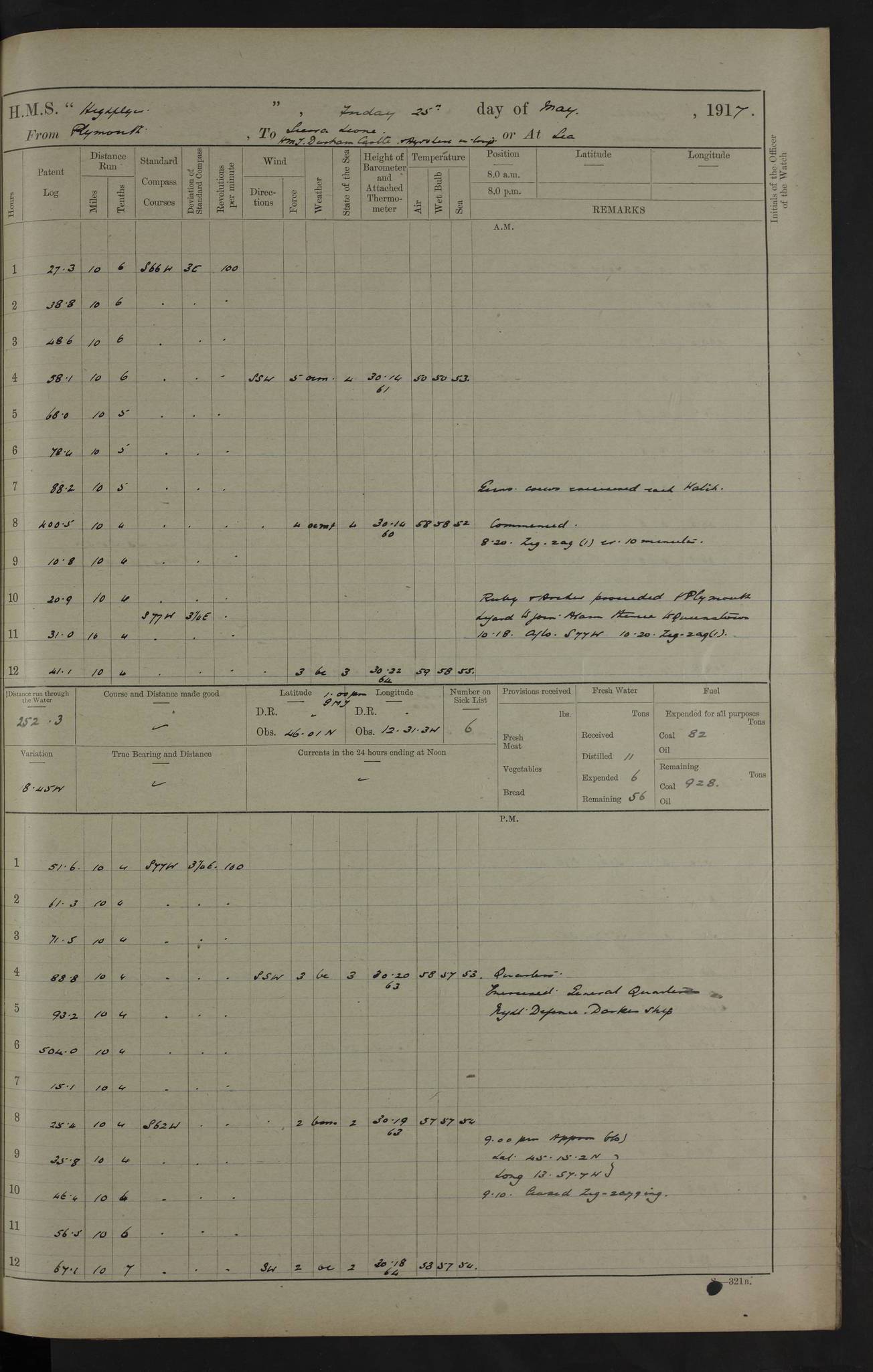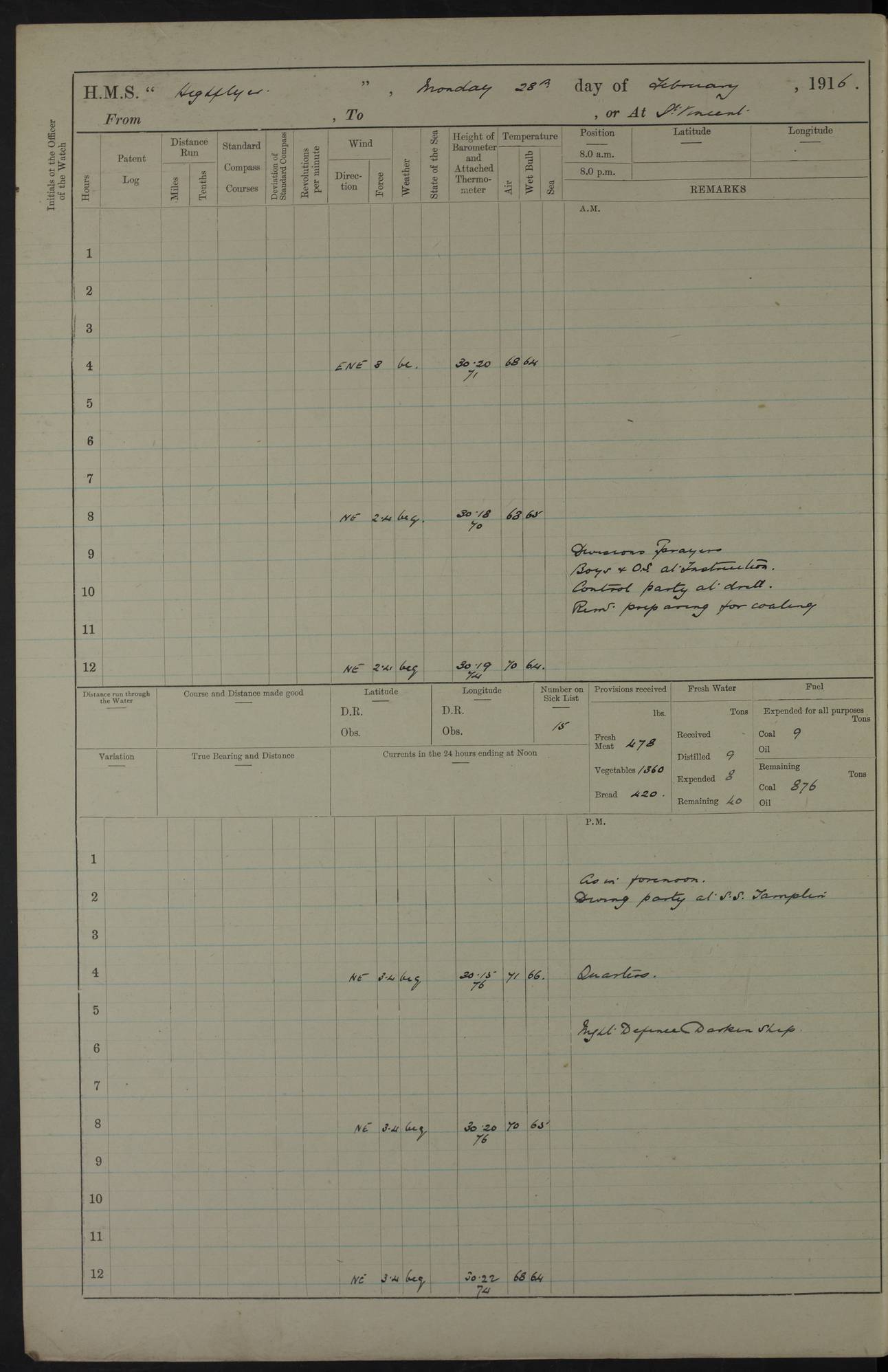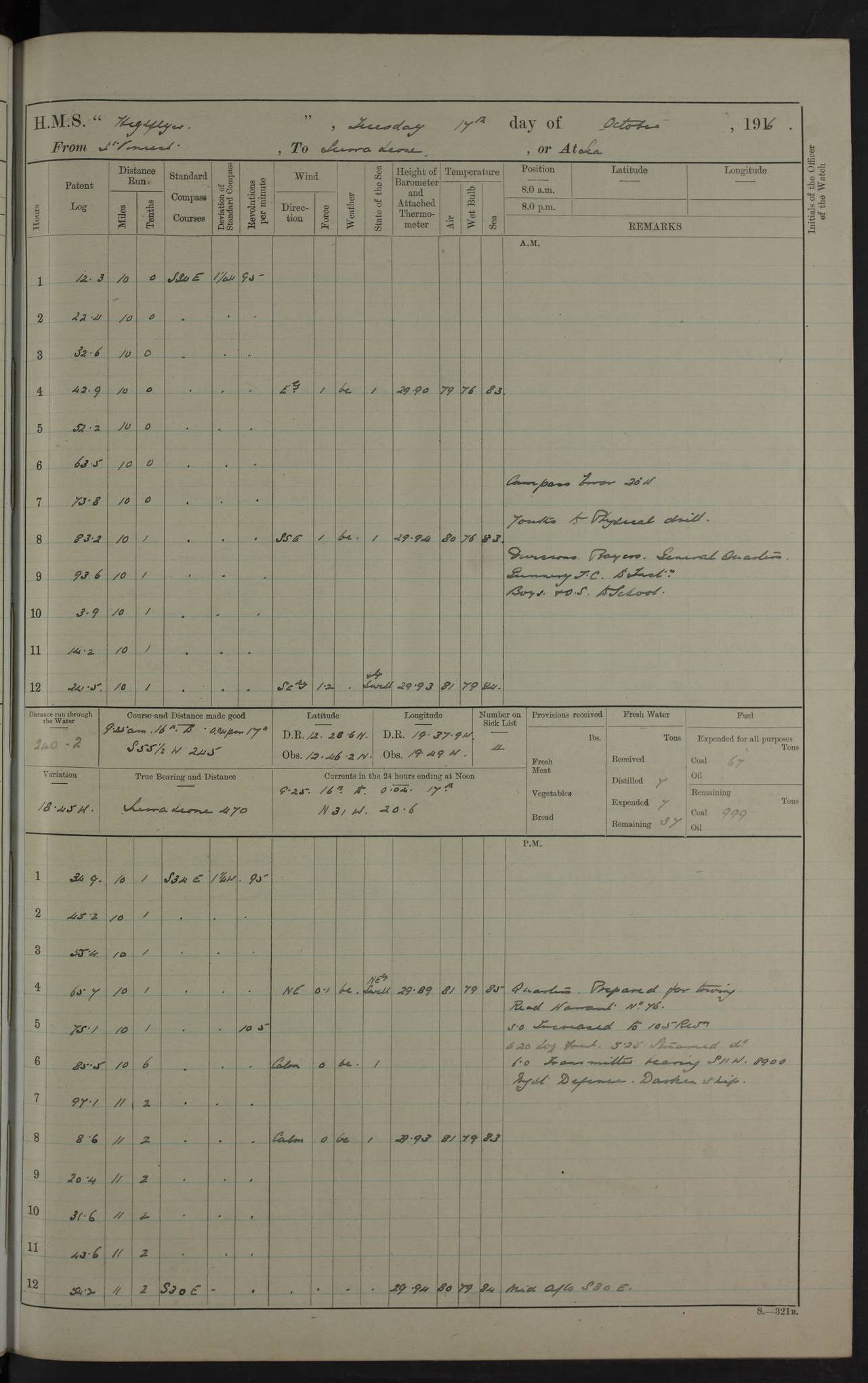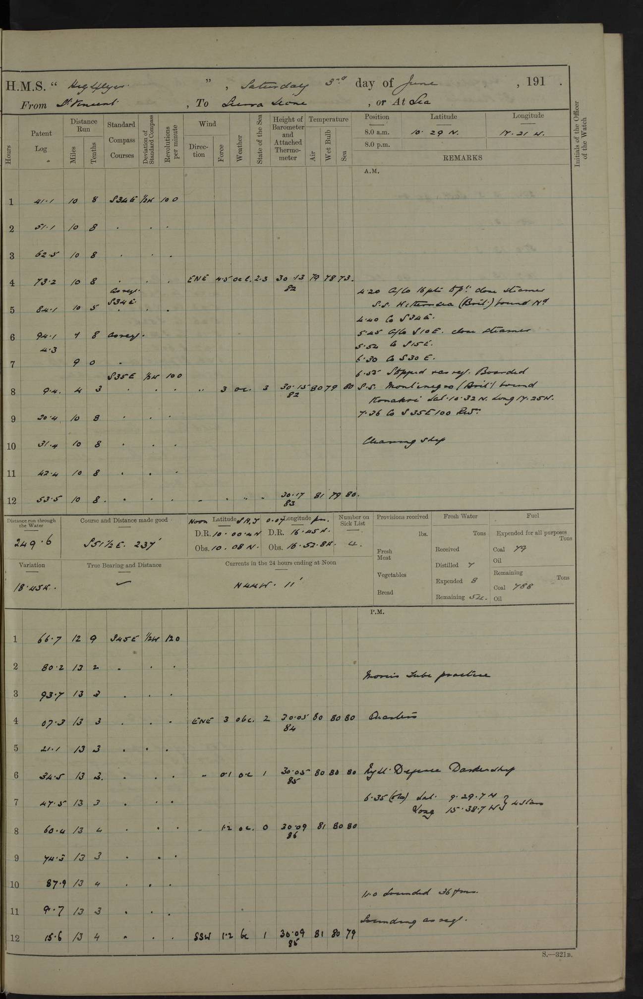 LOGS FOR JANUARY 1917 4ef4f321e53e0a0c91000902: (https://s3.amazonaws.com:443/oldweather/ADM53-44307/ADM 53-44307-129_1.jpg) 4ef4f321e53e0a0c91000903: (https://s3.amazonaws.com:443/oldweather/ADM53-44307/ADM 53-44307-130_0.jpg) 4ef4f321e53e0a0c91000904: (https://s3.amazonaws.com:443/oldweather/ADM53-44307/ADM 53-44307-130_1.jpg) 4ef4f321e53e0a0c91000905: (https://s3.amazonaws.com:443/oldweather/ADM53-44307/ADM 53-44307-131_0.jpg) 4ef4f321e53e0a0c91000906: (https://s3.amazonaws.com:443/oldweather/ADM53-44307/ADM 53-44307-131_1.jpg) 1 January 1917 Sierra Leone Lat 8.5, Long -13.2 6.30am: Party transferring provisions to DONEGAL. 10.00am: Party working on board SS VIRENT dismounting gun. 4ef4f321e53e0a0c91000907: (https://s3.amazonaws.com:443/oldweather/ADM53-44307/ADM 53-44307-132_0.jpg) 2 January 1917 Sierra Leone to St. Vincent Lat 8.7, Long -13.6 6.55am: SS ATLANTIC CITY came alongside. Coaling ship. 9.20am: Weighed and proceeded as requisite out of harbour. 4ef4f321e53e0a0c91000908: (https://s3.amazonaws.com:443/oldweather/ADM53-44307/ADM 53-44307-132_1.jpg) 3 January 1917 Sierra Leone to St. Vincent Lat 11.1, Long -17.7 2.30pm: Sighted SS on P bow steering to SE’d. 4ef4f321e53e0a0c91000909: (https://s3.amazonaws.com:443/oldweather/ADM53-44307/ADM 53-44307-133_0.jpg) 4 January 1917 Sierra Leone to St. Vincent Lat 13.8, Long -21.5 Boys and OS at school and seamanship instruction. Marines at drill. 11.30pm: Passing between St. Jago and Mayo Id. 4ef4f321e53e0a0c9100090a: (https://s3.amazonaws.com:443/oldweather/ADM53-44307/ADM 53-44307-133_1.jpg) 5 January 1917 Sierra Leone to St. Vincent Lat 16.8828, Long -25.0106 6.40am: Sighted San Nicholas Id. abeam. 11.58am: Came to SB 9 fathoms, 4½ shackles. 12.30pm: Lighters came alongside. 2.00pm: Coaling ship. 5.00pm: Stopped coaling for night. 4ef4f321e53e0a0c9100090b: (https://s3.amazonaws.com:443/oldweather/ADM53-44307/ADM 53-44307-134_0.jpg) 6 January 1917 St. Vincent Lat 16.8828, Long -25.0106 6.30am: Coaling ship from lighters. 12.30pm: Finished coaling; received 433 tons including deck cargo. 2.00pm: Prepared for sea. 4ef4f321e53e0a0c9100090c: (https://s3.amazonaws.com:443/oldweather/ADM53-44307/ADM 53-44307-134_1.jpg) 7 January 1917 St. Vincent to rendezvous to meet HMS Shannon and convoy Lat 17.4, Long -25.5 6.35am: Weighed and proceeded as requisite, 100 revs, to southward by San Antonio. 4ef4f321e53e0a0c9100090d: (https://s3.amazonaws.com:443/oldweather/ADM53-44307/ADM 53-44307-135_0.jpg) 8 January 1917 St. Vincent to meet HMS Shannon and convoy Lat 21.2, Long -26.3 9.30am: Party striking down coal. 4ef4f321e53e0a0c9100090e: (https://s3.amazonaws.com:443/oldweather/ADM53-44307/ADM 53-44307-135_1.jpg) 9 January 1917 St. Vincent to meet HMS Shannon and convoy Lat 23.9, Long -25.5 Cleaning ship. 9.00pm: Group closed up exercised during watch. 4ef4f322e53e0a0c9100090f: (https://s3.amazonaws.com:443/oldweather/ADM53-44307/ADM 53-44307-136_0.jpg) 10 January 1917 St. Vincent to meet HMS Shannon and convoy Lat 27.4, Long -25.1 2.00am: Groups closed up, exercised frequently during each watch. 6.30am: Sighted SS on southward beam steering NE’d. 4ef4f322e53e0a0c91000910: (https://s3.amazonaws.com:443/oldweather/ADM53-44307/ADM 53-44307-136_1.jpg) 11 January 1917 St. Vincent to meet HMS Shannon and convoy and to Sierra Leone Lat 29.7, Long -24.7 2.00am: Groups closed up, exercised frequently during each watch. 5.20am: Sighted SHANNON and convoy ahead – CARONIA, EMPRESS OF BRITAIN, WALMER CASTLE, TYNDAREUS, PAKEHA, NESTOR, CORINTHIC. 6.13am: Stopped. Communicated by boat with SHANNON. 6.25am: Course S17W. 115 rev. SHANNON proceeded NE’d., course as requisite to take up station with convoy. [A sketch is included showing the position of the ships. HIGHFLYER is in the middle of the front row with PAKEHA 10 cables to port and WALMER CASTLE 10 cables to starboard. NESTOR, then TYNDAREUS, follow PAKEHA. EMPRESS OF BRITAIN, then CARONIA, follow WALMER CASTLE. CORINTHIC is evenly spaced between TYNDAREUS and CARONIA.] 4ef4f322e53e0a0c91000911: (https://s3.amazonaws.com:443/oldweather/ADM53-44307/ADM 53-44307-137_0.jpg) 12 January 1917 To Sierra Leone with convoy Lat 23.9, Long -26.3 Guns’ crews closed up exercised frequently during day. Boys and OS to school and seamanship instruction. 4ef4f322e53e0a0c91000912: (https://s3.amazonaws.com:443/oldweather/ADM53-44307/ADM 53-44307-137_1.jpg) 13 January 1917 To Sierra Leone with convoy Lat 19.3, Long -28.0 3.57am: 80 rev. to allow TYNDAREUS to remedy engine defect. 4ef4f322e53e0a0c91000913: (https://s3.amazonaws.com:443/oldweather/ADM53-44307/ADM 53-44307-138_0.jpg) 14 January 1917 To Sierra Leone with convoy Lat 14.7, Long -26.9 9.00am: Mustered by Open List. 10.00am: Held Divine Service. 4ef4f322e53e0a0c91000914: (https://s3.amazonaws.com:443/oldweather/ADM53-44307/ADM 53-44307-138_1.jpg) 15 January 1917 To Sierra Leone with convoy Lat 12.3, Long -23.7 Party in stokehold trimming. 4ef4f322e53e0a0c91000915: (https://s3.amazonaws.com:443/oldweather/ADM53-44307/ADM 53-44307-139_0.jpg) 16 January 1917 To Sierra Leone with convoy Lat 10.4, Long -18.1 1.00pm: Hoisted colours half-mast. (Death on board EMPRESS OF BRITAIN.) 4ef4f322e53e0a0c91000916: (https://s3.amazonaws.com:443/oldweather/ADM53-44307/ADM 53-44307-139_1.jpg) 17 January 1917 To Sierra Leone with convoy Lat 8.5, Long -13.2 9.15am: Observed land ahead. Prepared for coaling. 10.40am: Formed single line ahead. 12.30pm: Transports proceeded independently to anchoring berths. 1.12pm: Came to with PB anchor in 10 fathoms, veered to 4 shackles, A3 berth. 5.30pm: SS MANSFIELD came alongside. 4ef4f322e53e0a0c91000917: (https://s3.amazonaws.com:443/oldweather/ADM53-44307/ADM 53-44307-140_0.jpg) 18 January 1917 Sierra Leone Lat 8.5, Long -13.2 6.00am: Commenced coaling. 2.15pm: Finished coaling; received 840 tons. 4ef4f322e53e0a0c91000918: (https://s3.amazonaws.com:443/oldweather/ADM53-44307/ADM 53-44307-140_1.jpg) 19 January 1917 Sierra Leone Lat 8.5, 