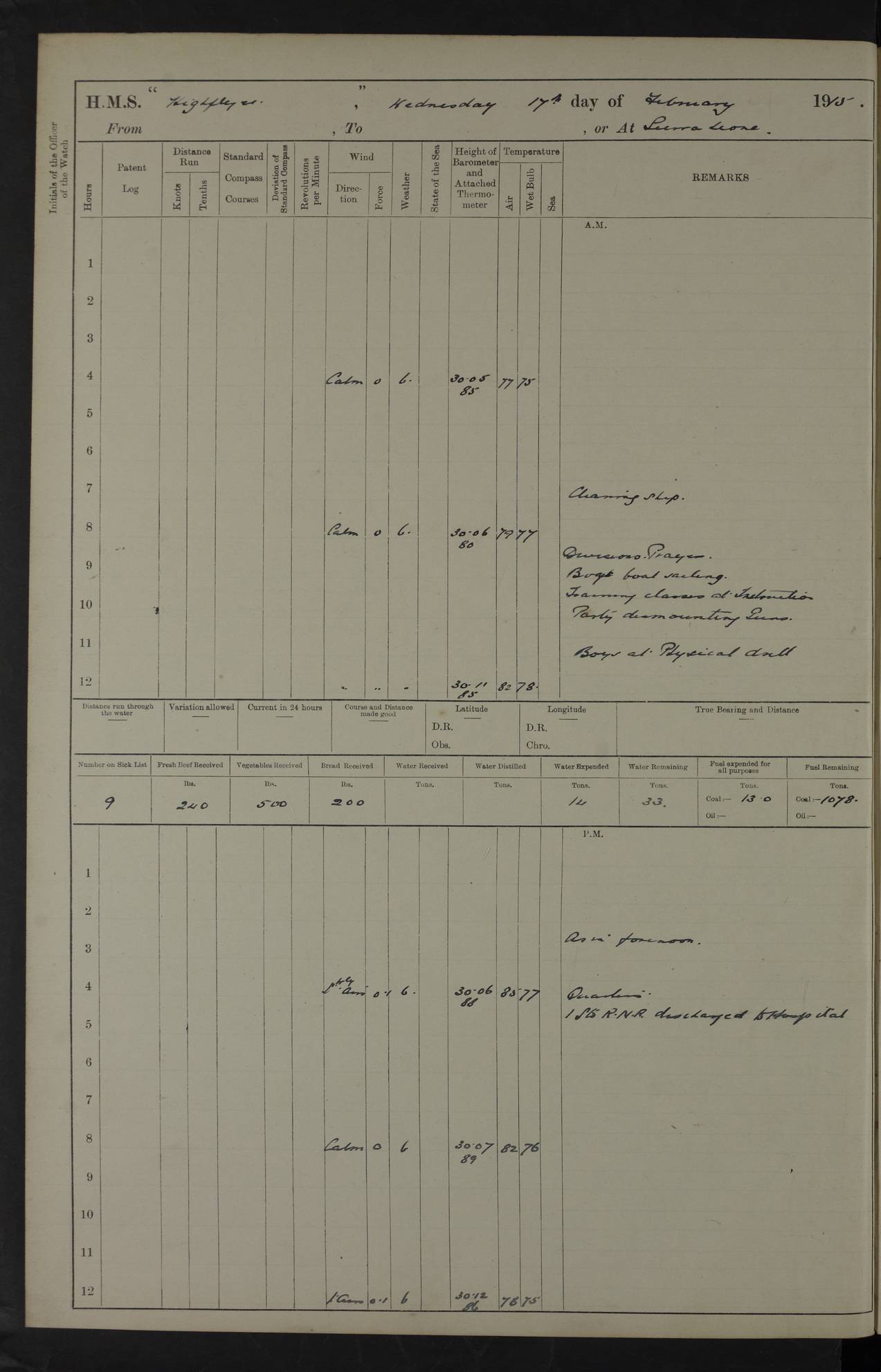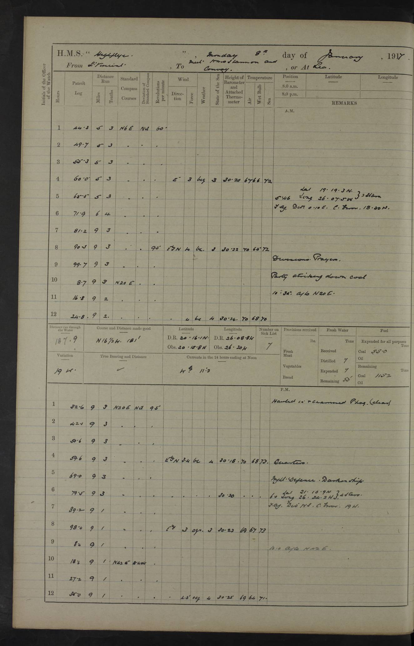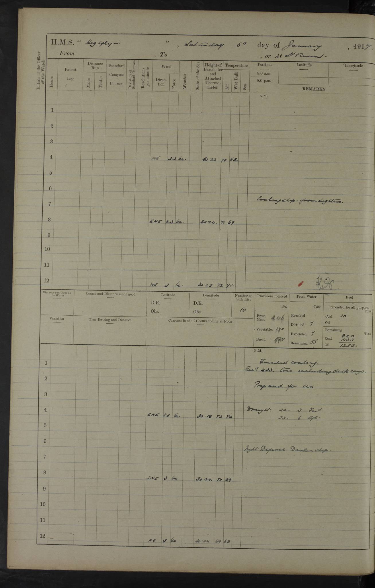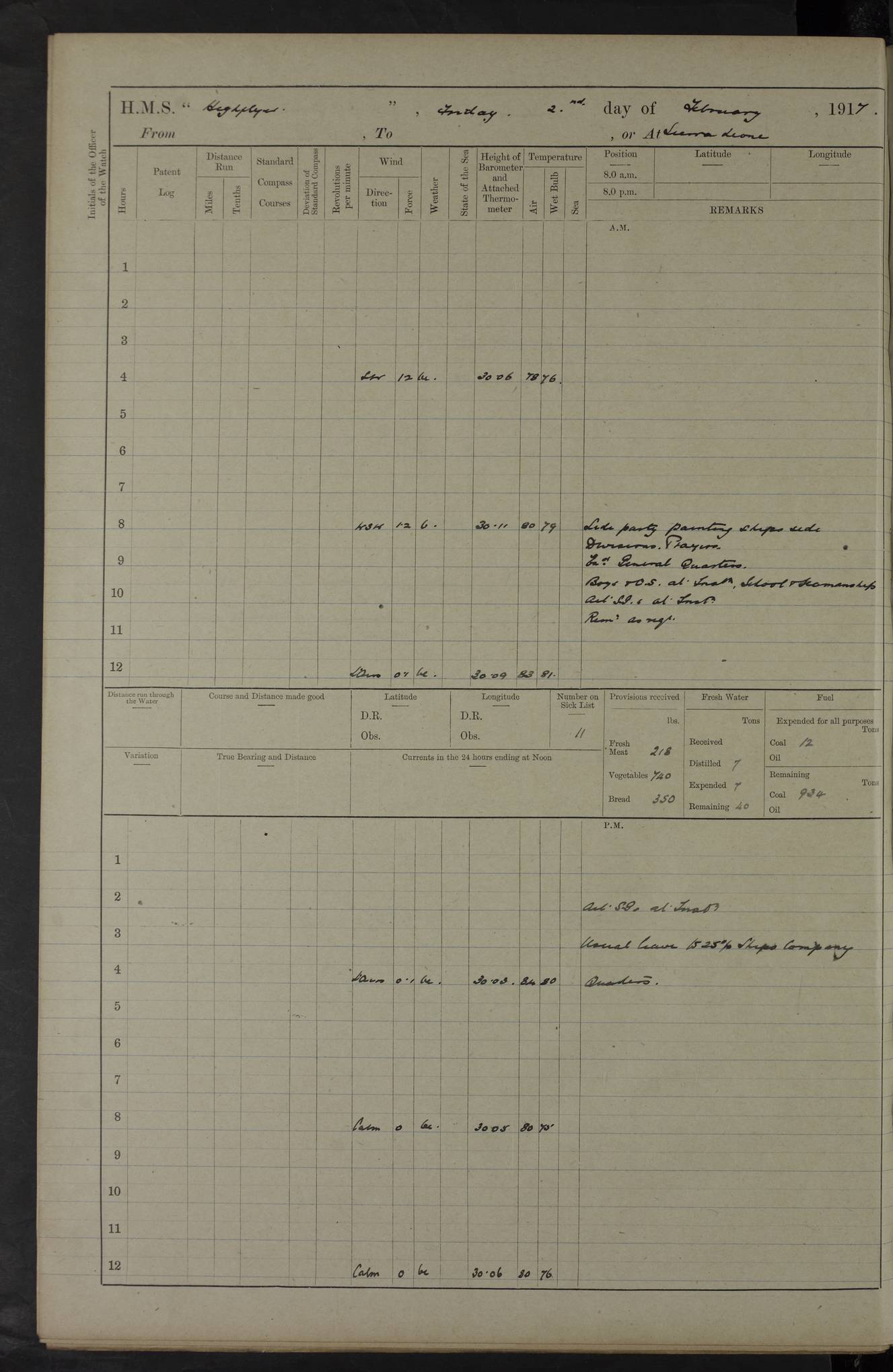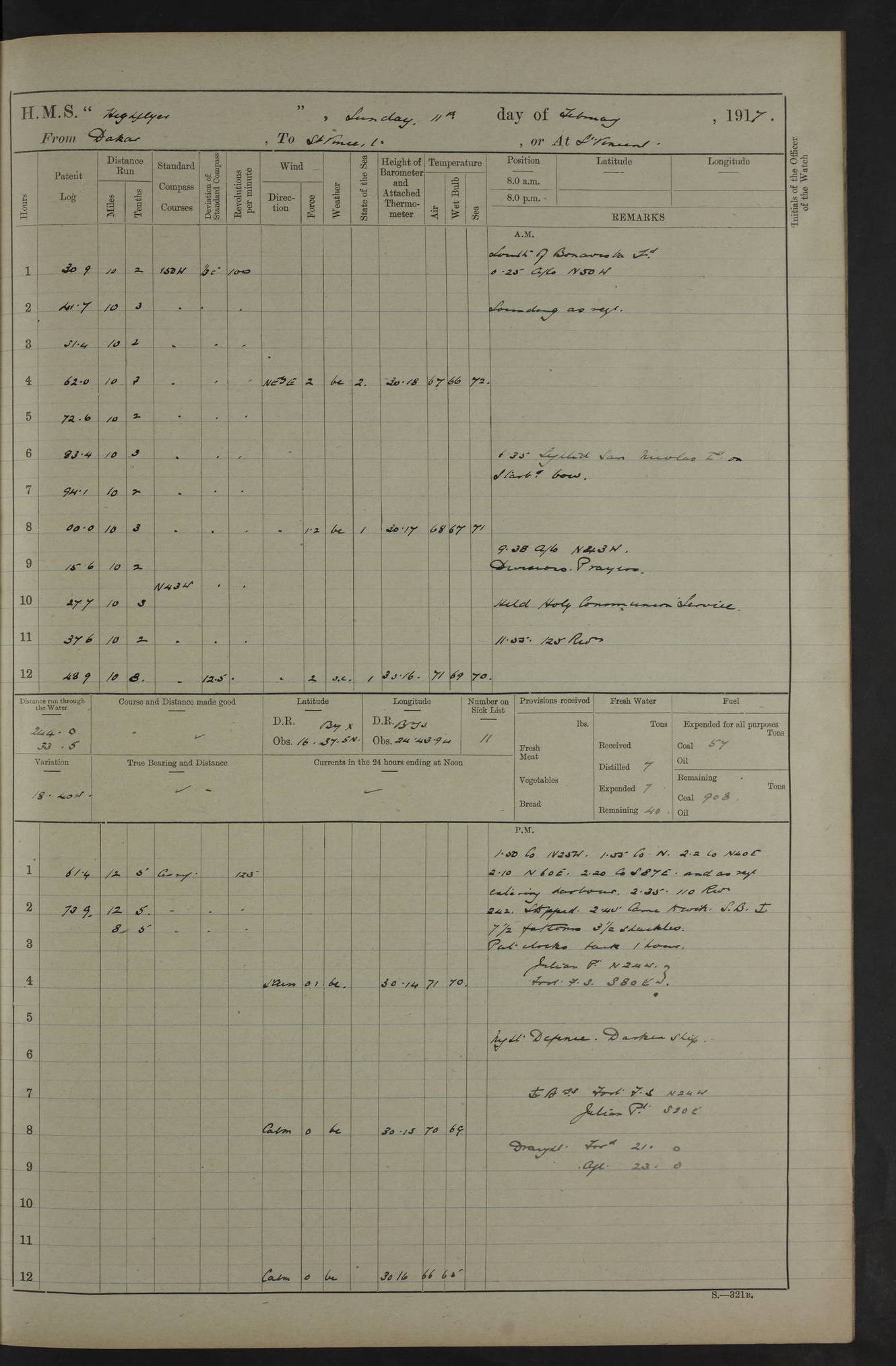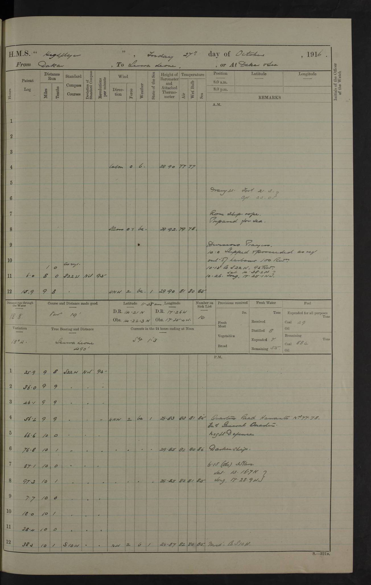 LOGS FOR JANUARY 1917 4ef4f321e53e0a0c91000902: (https://s3.amazonaws.com:443/oldweather/ADM53-44307/ADM 53-44307-129_1.jpg) 4ef4f321e53e0a0c91000903: (https://s3.amazonaws.com:443/oldweather/ADM53-44307/ADM 53-44307-130_0.jpg) 4ef4f321e53e0a0c91000904: (https://s3.amazonaws.com:443/oldweather/ADM53-44307/ADM 53-44307-130_1.jpg) 4ef4f321e53e0a0c91000905: (https://s3.amazonaws.com:443/oldweather/ADM53-44307/ADM 53-44307-131_0.jpg) 4ef4f321e53e0a0c91000906: (https://s3.amazonaws.com:443/oldweather/ADM53-44307/ADM 53-44307-131_1.jpg) 1 January 1917 Sierra Leone Lat 8.5, Long -13.2 6.30am: Party transferring provisions to DONEGAL. 10.00am: Party working on board SS VIRENT dismounting gun. 4ef4f321e53e0a0c91000907: (https://s3.amazonaws.com:443/oldweather/ADM53-44307/ADM 53-44307-132_0.jpg) 2 January 1917 Sierra Leone to St. Vincent Lat 8.7, Long -13.6 6.55am: SS ATLANTIC CITY came alongside. Coaling ship. 9.20am: Weighed and proceeded as requisite out of harbour. 4ef4f321e53e0a0c91000908: (https://s3.amazonaws.com:443/oldweather/ADM53-44307/ADM 53-44307-132_1.jpg) 3 January 1917 Sierra Leone to St. Vincent Lat 11.1, Long -17.7 2.30pm: Sighted SS on P bow steering to SE’d. 4ef4f321e53e0a0c91000909: (https://s3.amazonaws.com:443/oldweather/ADM53-44307/ADM 53-44307-133_0.jpg) 4 January 1917 Sierra Leone to St. Vincent Lat 13.8, Long -21.5 Boys and OS at school and seamanship instruction. Marines at drill. 11.30pm: Passing between St. Jago and Mayo Id. 4ef4f321e53e0a0c9100090a: (https://s3.amazonaws.com:443/oldweather/ADM53-44307/ADM 53-44307-133_1.jpg) 5 January 1917 Sierra Leone to St. Vincent Lat 16.8828, Long -25.0106 6.40am: Sighted San Nicholas Id. abeam. 11.58am: Came to SB 9 fathoms, 4½ shackles. 12.30pm: Lighters came alongside. 2.00pm: Coaling ship. 5.00pm: Stopped coaling for night. 4ef4f321e53e0a0c9100090b: (https://s3.amazonaws.com:443/oldweather/ADM53-44307/ADM 53-44307-134_0.jpg) 6 January 1917 St. Vincent Lat 16.8828, Long -25.0106 6.30am: Coaling ship from lighters. 12.30pm: Finished coaling; received 433 tons including deck cargo. 2.00pm: Prepared for sea. 4ef4f321e53e0a0c9100090c: (https://s3.amazonaws.com:443/oldweather/ADM53-44307/ADM 53-44307-134_1.jpg) 7 January 1917 St. Vincent to rendezvous to meet HMS Shannon and convoy Lat 17.4, Long -25.5 6.35am: Weighed and proceeded as requisite, 100 revs, to southward by San Antonio. 4ef4f321e53e0a0c9100090d: (https://s3.amazonaws.com:443/oldweather/ADM53-44307/ADM 53-44307-135_0.jpg) 8 January 1917 St. Vincent to meet HMS Shannon and convoy Lat 21.2, Long -26.3 9.30am: Party striking down coal. 4ef4f321e53e0a0c9100090e: (https://s3.amazonaws.com:443/oldweather/ADM53-44307/ADM 53-44307-135_1.jpg) 9 January 1917 St. Vincent to meet HMS Shannon and convoy Lat 23.9, Long -25.5 Cleaning ship. 9.00pm: Group closed up exercised during watch. 4ef4f322e53e0a0c9100090f: (https://s3.amazonaws.com:443/oldweather/ADM53-44307/ADM 53-44307-136_0.jpg) 10 January 1917 St. Vincent to meet HMS Shannon and convoy Lat 27.4, Long -25.1 2.00am: Groups closed up, exercised frequently during each watch. 6.30am: Sighted SS on southward beam steering NE’d. 4ef4f322e53e0a0c91000910: (https://s3.amazonaws.com:443/oldweather/ADM53-44307/ADM 53-44307-136_1.jpg) 11 January 1917 St. Vincent to meet HMS Shannon and convoy and to Sierra Leone Lat 29.7, Long -24.7 2.00am: Groups closed up, exercised frequently during each watch. 5.20am: Sighted SHANNON and convoy ahead – CARONIA, EMPRESS OF BRITAIN, WALMER CASTLE, TYNDAREUS, PAKEHA, NESTOR, CORINTHIC. 6.13am: Stopped. Communicated by boat with SHANNON. 6.25am: Course S17W. 115 rev. SHANNON proceeded NE’d., course as requisite to take up station with convoy. [A sketch is included showing the position of the ships. HIGHFLYER is in the middle of the front row with PAKEHA 10 cables to port and WALMER CASTLE 10 cables to starboard. NESTOR, then TYNDAREUS, follow PAKEHA. EMPRESS OF BRITAIN, then CARONIA, follow WALMER CASTLE. CORINTHIC is evenly spaced between TYNDAREUS and CARONIA.] 4ef4f322e53e0a0c91000911: (https://s3.amazonaws.com:443/oldweather/ADM53-44307/ADM 53-44307-137_0.jpg) 12 January 1917 To Sierra Leone with convoy Lat 23.9, Long -26.3 Guns’ crews closed up exercised frequently during day. Boys and OS to school and seamanship instruction. 4ef4f322e53e0a0c91000912: (https://s3.amazonaws.com:443/oldweather/ADM53-44307/ADM 53-44307-137_1.jpg) 13 January 1917 To Sierra Leone with convoy Lat 19.3, Long -28.0 3.57am: 80 rev. to allow TYNDAREUS to remedy engine defect. 4ef4f322e53e0a0c91000913: (https://s3.amazonaws.com:443/oldweather/ADM53-44307/ADM 53-44307-138_0.jpg) 14 January 1917 To Sierra Leone with convoy Lat 14.7, Long -26.9 9.00am: Mustered by Open List. 10.00am: Held Divine Service. 4ef4f322e53e0a0c91000914: (https://s3.amazonaws.com:443/oldweather/ADM53-44307/ADM 53-44307-138_1.jpg) 15 January 1917 To Sierra Leone with convoy Lat 12.3, Long -23.7 Party in stokehold trimming. 4ef4f322e53e0a0c91000915: (https://s3.amazonaws.com:443/oldweather/ADM53-44307/ADM 53-44307-139_0.jpg) 16 January 1917 To Sierra Leone with convoy Lat 10.4, Long -18.1 1.00pm: Hoisted colours half-mast. (Death on board EMPRESS OF BRITAIN.) 4ef4f322e53e0a0c91000916: (https://s3.amazonaws.com:443/oldweather/ADM53-44307/ADM 53-44307-139_1.jpg) 17 January 1917 To Sierra Leone with convoy Lat 8.5, Long -13.2 9.15am: Observed land ahead. Prepared for coaling. 10.40am: Formed single line ahead. 12.30pm: Transports proceeded independently to anchoring berths. 1.12pm: Came to with PB anchor in 10 fathoms, veered to 4 shackles, A3 berth. 5.30pm: SS MANSFIELD came alongside. 4ef4f322e53e0a0c91000917: (https://s3.amazonaws.com:443/oldweather/ADM53-44307/ADM 53-44307-140_0.jpg) 18 January 1917 Sierra Leone Lat 8.5, Long -13.2 6.00am: Commenced coaling. 2.15pm: Finished coaling; received 840 tons. 4ef4f322e53e0a0c91000918: (https://s3.amazonaws.com:443/oldweather/ADM53-44307/ADM 53-44307-140_1.jpg) 19 January 1917 Sierra Leone Lat 8.5, 